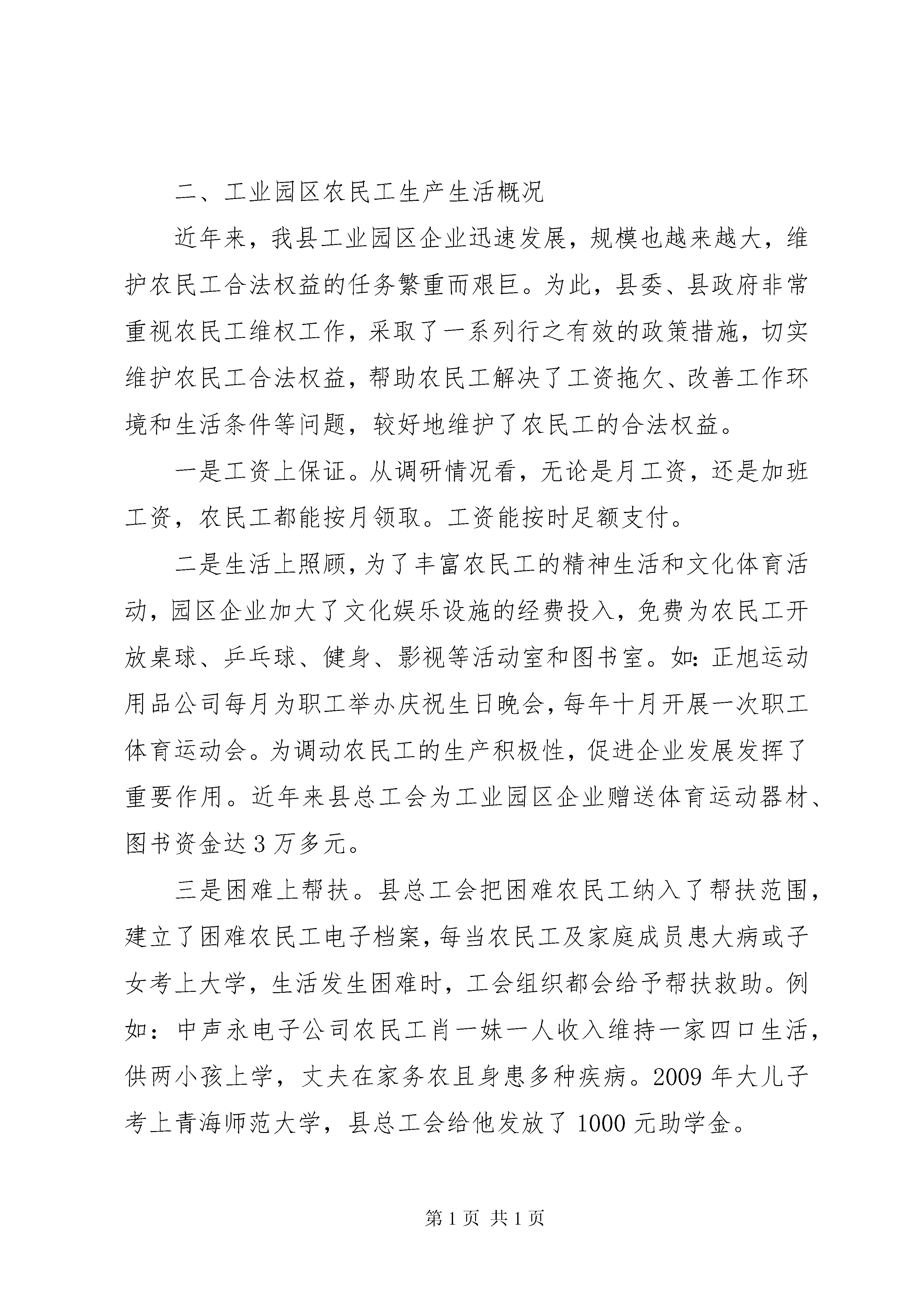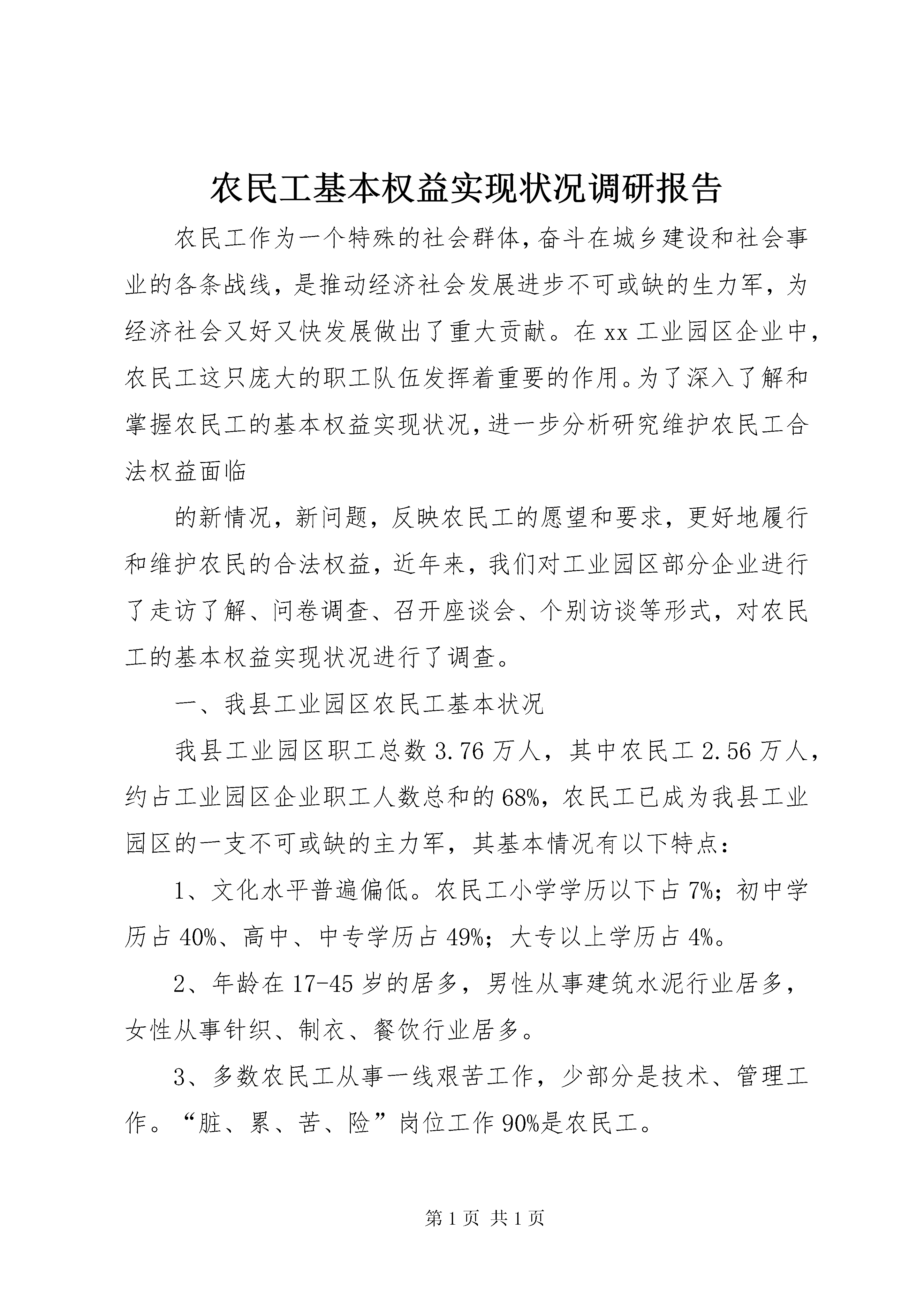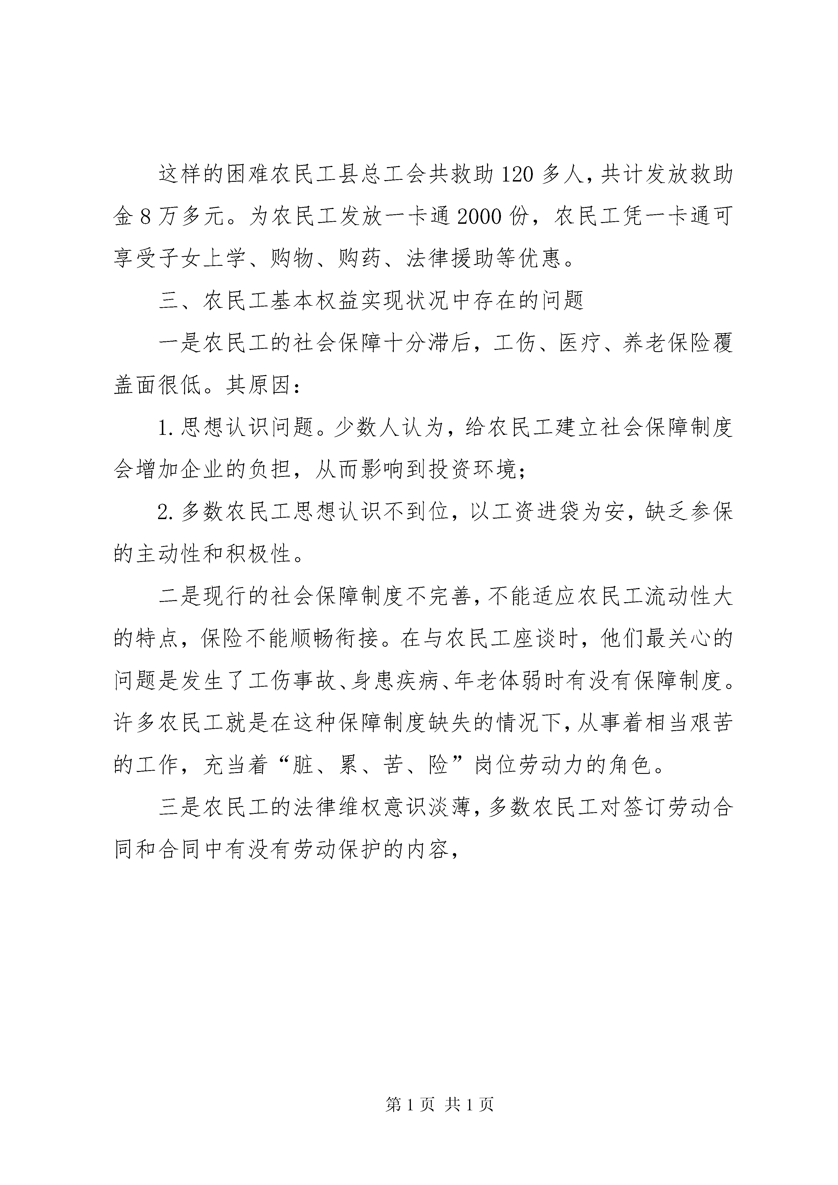 农民工基本权益实现状况调研报告农民工作为一个特殊的社会群体,奋斗在城乡建设和社会事业的各条战线,是推动经济社会发展进步不可或缺的生力军,为经济社会又好又快发展做出了重大贡献。在xx工业园区企业中,农民工这只庞大的职工队伍发挥着重要的作用。为了深入了解和掌握农民工的基本权益实现状况,进一步分析研究维护农民工合法权益面临的新情况,新问题,反映农民工的愿望和要求,更好地履行和维护农民的合法权益,近年来,我们对工业园区部分企业进行了走访了解、问卷调查、召开座谈会、个别访谈等形式,对农民工的基本权益实现状况进行了调查。一、我县工业园区农民工基本状况我县工业园区职工总数3.76万人,其中农民工2.56万人,约占工业园区企业职工人数总和的68%,农民工已成为我县工业园区的一支不可或缺的主力军,其基本情况有以下特点:1、文化水平普遍偏低。农民工小学学历以下占7%;初中学历占40%、高中、中专学历占49%;大专以上学历占4%。2、年龄在17-45岁的居多,男性从事建筑水泥行业居多,女性从事针织、制衣、餐饮行业居多。3、多数农民工从事一线艰苦工作,少部分是技术、管理工作。“脏、累、苦、险”岗位工作90%是农民工。二、工业园区农民工生产生活概况近年来,我县工业园区企业迅速发展,规模也越来越大,维护农民工合法权益的任务繁重而艰巨。为此,县委、县政府非常重视农民工维权工作,采取了一系列行之有效的政策措施,切实维护农民工合法权益,帮助农民工解决了工资拖欠、改善工作环境和生活条件等问题,较好地维护了农民工的合法权益。一是工资上保证。从调研情况看,无论是月工资,还是加班工资,农民工都能按月领取。工资能按时足额支付。二是生活上照顾,为了丰富农民工的精神生活和文化体育活动,园区企业加大了文化娱乐设施的经费投入,免费为农民工开放桌球、乒乓球、健身、影视等活动室和图书室。如:正旭运动用品公司每月为职工举办庆祝生日晚会,每年十月开展一次职工体育运动会。为调动农民工的生产积极性,促进企业发展发挥了重要作用。近年来县总工会为工业园区企业赠送体育运动器材、图书资金达3万多元。三是困难上帮扶。县总工会把困难农民工纳入了帮扶范围,建立了困难农民工电子档案,每当农民工及家庭成员患大病或子女考上大学,生活发生困难时,工会组织都会给予帮扶救助。例如:中声永电子公司农民工肖一妹一人收入维持一家四口生活,供两小孩上学,丈夫在家务农且身患多种疾病。2009年大儿子考上青海师范大学,县总工会给他发放了1000元助学金。这样的困难农民工县总工会共救助120多人,共计发放救助金8万多元。为农民工发放一卡通2000份,农民工凭一卡通可享受子女上学、购物、购药、法律援助等优惠。三、农民工基本权益实现状况中存在的问题一是农民工的社会保障十分滞后,工伤、医疗、养老保险覆盖面很低。其原因:1.思想认识问题。少数人认为,给农民工建立社会保障制度会增加企业的负担,从而影响到投资环境;2.多数农民工思想认识不到位,以工资进袋为安,缺乏参保的主动性和积极性。二是现行的社会保障制度不完善,不能适应农民工流动性大的特点,保险不能顺畅衔接。在与农民工座谈时,他们最关心的问题是发生了工伤事故、身患疾病、年老体弱时有没有保障制度。许多农民工就是在这种保障制度缺失的情况下,从事着相当艰苦的工作,充当着“脏、累、苦、险”岗位劳动力的角色。三是农民工的法律维权意识淡薄,多数农民工对签订劳动合同和合同中有没有劳动保护的内容,