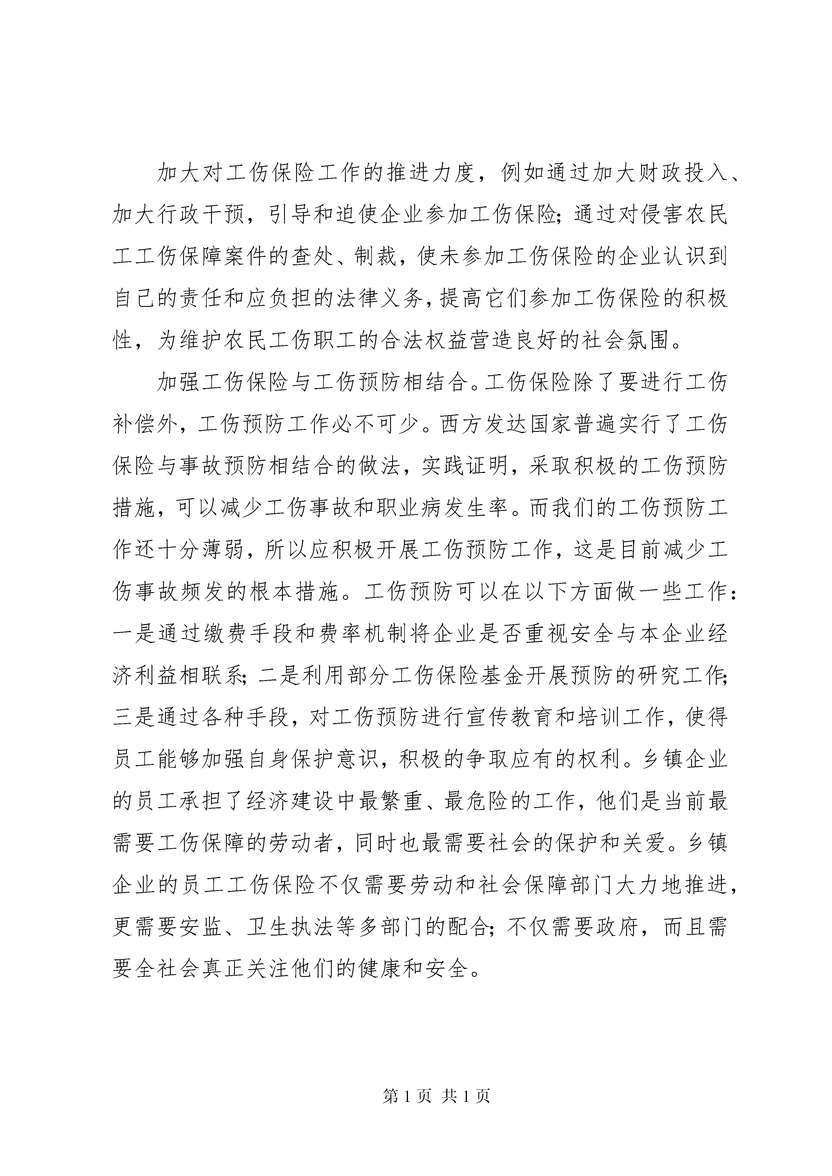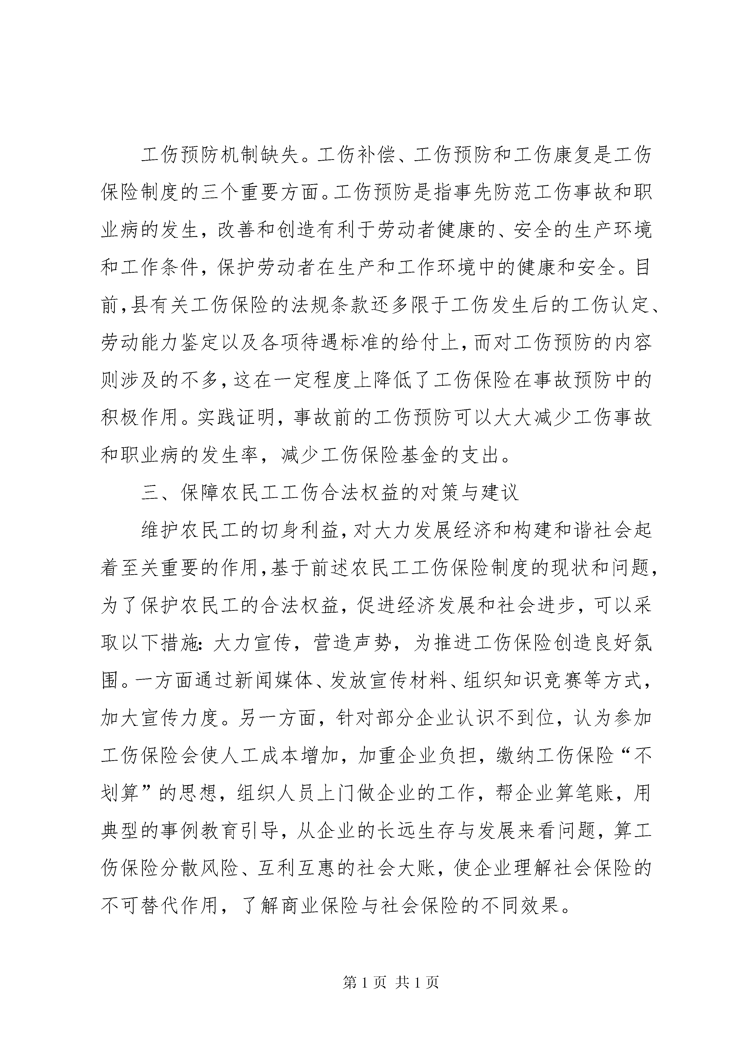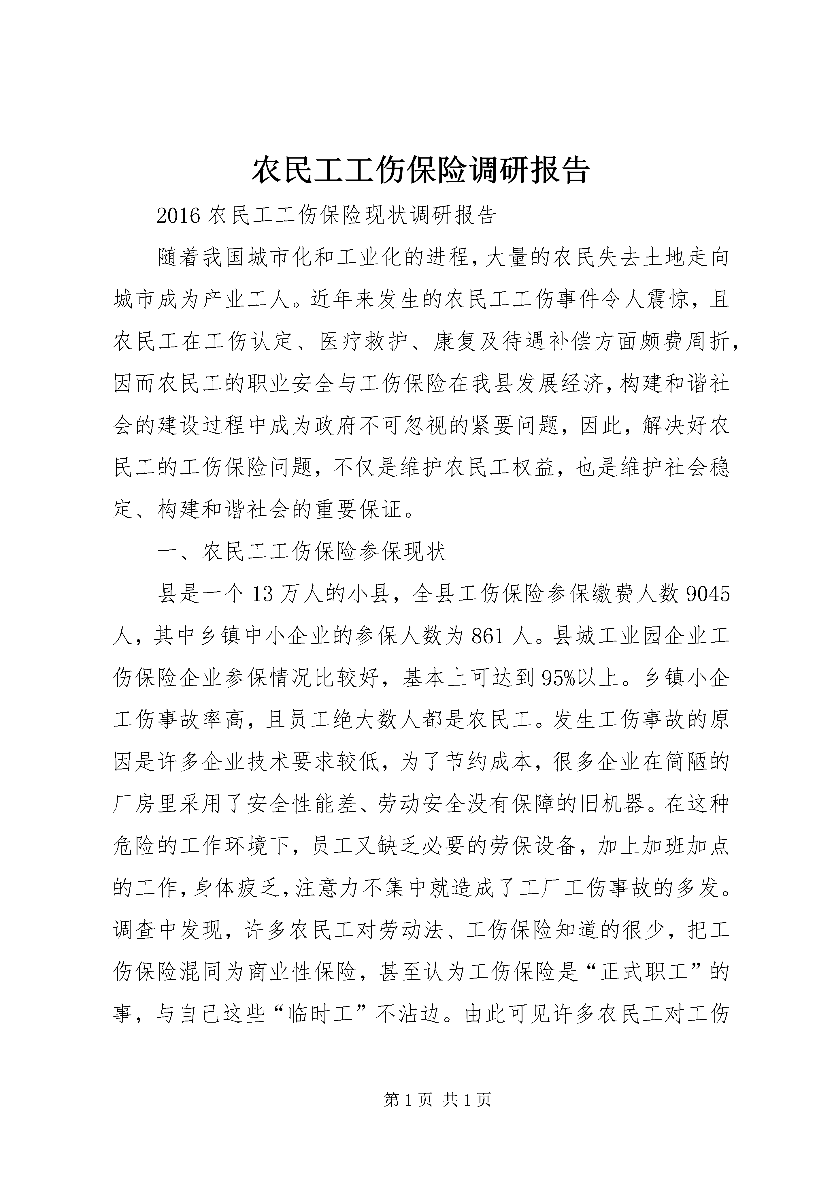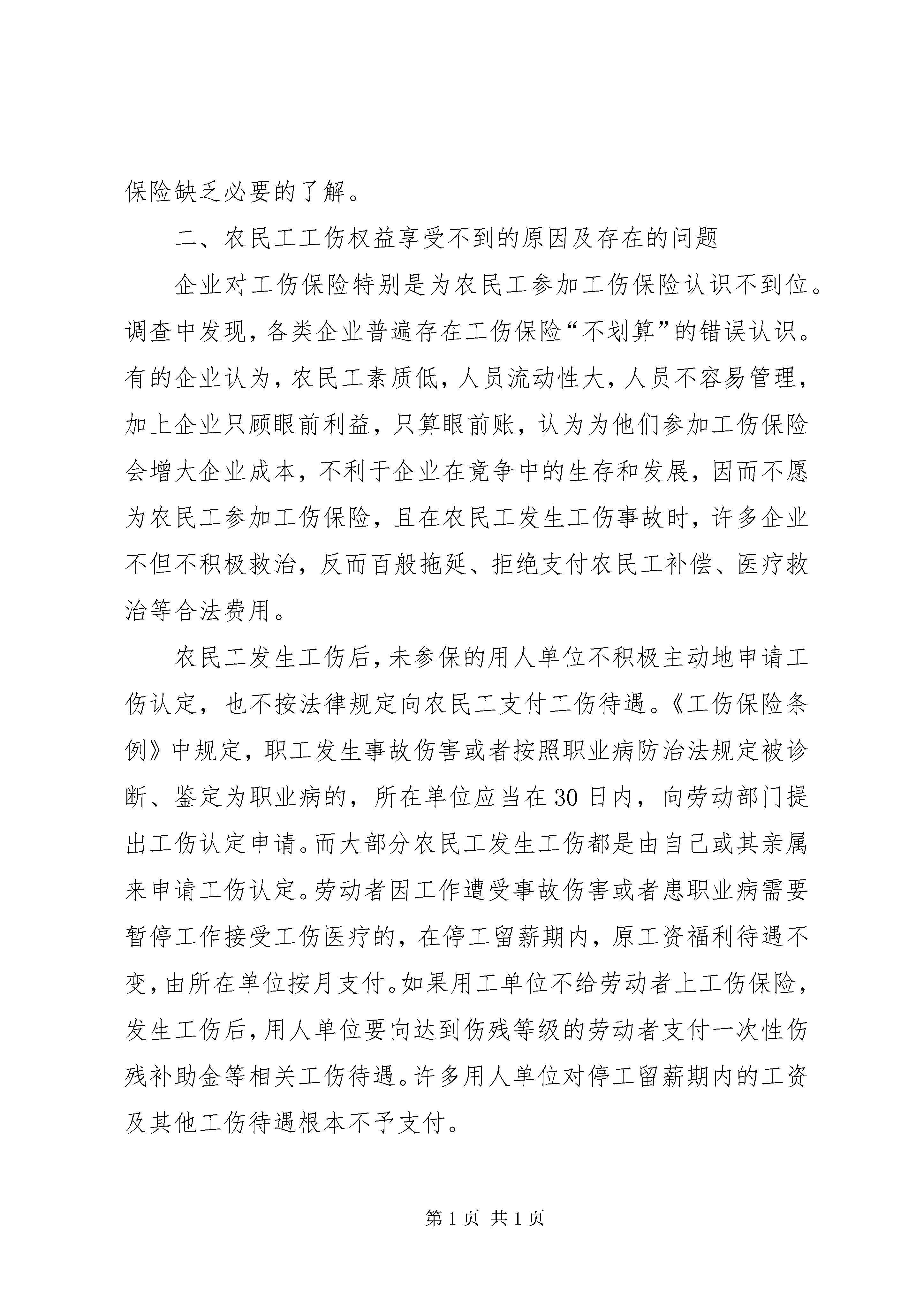 农民工工伤保险调研报告2016农民工工伤保险现状调研报告随着我国城市化和工业化的进程,大量的农民失去土地走向城市成为产业工人。近年来发生的农民工工伤事件令人震惊,且农民工在工伤认定、医疗救护、康复及待遇补偿方面颇费周折,因而农民工的职业安全与工伤保险在我县发展经济,构建和谐社会的建设过程中成为政府不可忽视的紧要问题,因此,解决好农民工的工伤保险问题,不仅是维护农民工权益,也是维护社会稳定、构建和谐社会的重要保证。一、农民工工伤保险参保现状县是一个13万人的小县,全县工伤保险参保缴费人数9045人,其中乡镇中小企业的参保人数为861人。县城工业园企业工伤保险企业参保情况比较好,基本上可达到95%以上。乡镇小企工伤事故率高,且员工绝大数人都是农民工。发生工伤事故的原因是许多企业技术要求较低,为了节约成本,很多企业在简陋的厂房里采用了安全性能差、劳动安全没有保障的旧机器。在这种危险的工作环境下,员工又缺乏必要的劳保设备,加上加班加点的工作,身体疲乏,注意力不集中就造成了工厂工伤事故的多发。调查中发现,许多农民工对劳动法、工伤保险知道的很少,把工伤保险混同为商业性保险,甚至认为工伤保险是“正式职工”的事,与自己这些“临时工”不沾边。由此可见许多农民工对工伤保险缺乏必要的了解。二、农民工工伤权益享受不到的原因及存在的问题企业对工伤保险特别是为农民工参加工伤保险认识不到位。调查中发现,各类企业普遍存在工伤保险“不划算”的错误认识。有的企业认为,农民工素质低,人员流动性大,人员不容易管理,加上企业只顾眼前利益,只算眼前账,认为为他们参加工伤保险会增大企业成本,不利于企业在竟争中的生存和发展,因而不愿为农民工参加工伤保险,且在农民工发生工伤事故时,许多企业不但不积极救治,反而百般拖延、拒绝支付农民工补偿、医疗救治等合法费用。农民工发生工伤后,未参保的用人单位不积极主动地申请工伤认定,也不按法律规定向农民工支付工伤待遇。《工伤保险条例》中规定,职工发生事故伤害或者按照职业病防治法规定被诊断、鉴定为职业病的,所在单位应当在30日内,向劳动部门提出工伤认定申请。而大部分农民工发生工伤都是由自己或其亲属来申请工伤认定。劳动者因工作遭受事故伤害或者患职业病需要暂停工作接受工伤医疗的,在停工留薪期内,原工资福利待遇不变,由所在单位按月支付。如果用工单位不给劳动者上工伤保险,发生工伤后,用人单位要向达到伤残等级的劳动者支付一次性伤残补助金等相关工伤待遇。许多用人单位对停工留薪期内的工资及其他工伤待遇根本不予支付。工伤预防机制缺失。工伤补偿、工伤预防和工伤康复是工伤保险制度的三个重要方面。工伤预防是指事先防范工伤事故和职业病的发生,改善和创造有利于劳动者健康的、安全的生产环境和工作条件,保护劳动者在生产和工作环境中的健康和安全。目前,县有关工伤保险的法规条款还多限于工伤发生后的工伤认定、劳动能力鉴定以及各项待遇标准的给付上,而对工伤预防的内容则涉及的不多,这在一定程度上降低了工伤保险在事故预防中的积极作用。实践证明,事故前的工伤预防可以大大减少工伤事故和职业病的发生率,减少工伤保险基金的支出。三、保障农民工工伤合法权益的对策与建议维护农民工的切身利益,对大力发展经济和构建和谐社会起着至关重要的作用,基于前述农民工工伤保险制度的现状和问题,为了保护农民工的合法权益,促进经济发展和社会进步,可以采取以下措施:大力宣传,营造声势,为推进工伤保险创造良好氛围。一方面通过新闻媒体、发放宣传材料、组织知识竞赛等方式,加大宣传力度。另一方面,针对部分企业认识不到位,认为参加工伤保险会使人工成本增加,加重企业负担,缴纳工伤保险“不划算”的思想,组织人员上门做企业的工作,帮企业算笔账,用典型的事例教育引导,从企业的长远生存与发展来看问题,算工伤保险分散风险、互利互惠的社会大账,使企业理解社会保险的不可替代作用,了解商业保险与社会保险的不同效果。加大对工伤保险工作的推进力度,例如通过加大财政投入、加大行政干预,引导和迫使企业参加工伤保险;通过对侵害农民工工伤保障案件的查处、制裁,使未参加工伤保险的企业认识到自己的责任和应负担的法律义务,提高它们参加工伤保险的积极性,为维护农民工伤职工的合法权益营造良好的社会氛围。加强工伤保险与工伤预防相结合。工伤保险除了要进行工伤补偿外,工伤预防工作必不可少。西方发达国家普遍实行了工伤保险与事故预防相结合的做法,实践证明,采取积极的工伤预防措施,可以减少工伤事故和职业病发生率。而我们的工伤预防工作还十分薄弱,所以应积极开展工伤预防工作,这是目前减少工伤事故频发的根本措施。工伤预防可以在以下方面做一些工作:一是通过缴费手段和费率机制将企业是否重视安全与本企业经济利益相联系;二是利用部分工伤保险基金开展预防的研究工作;三是