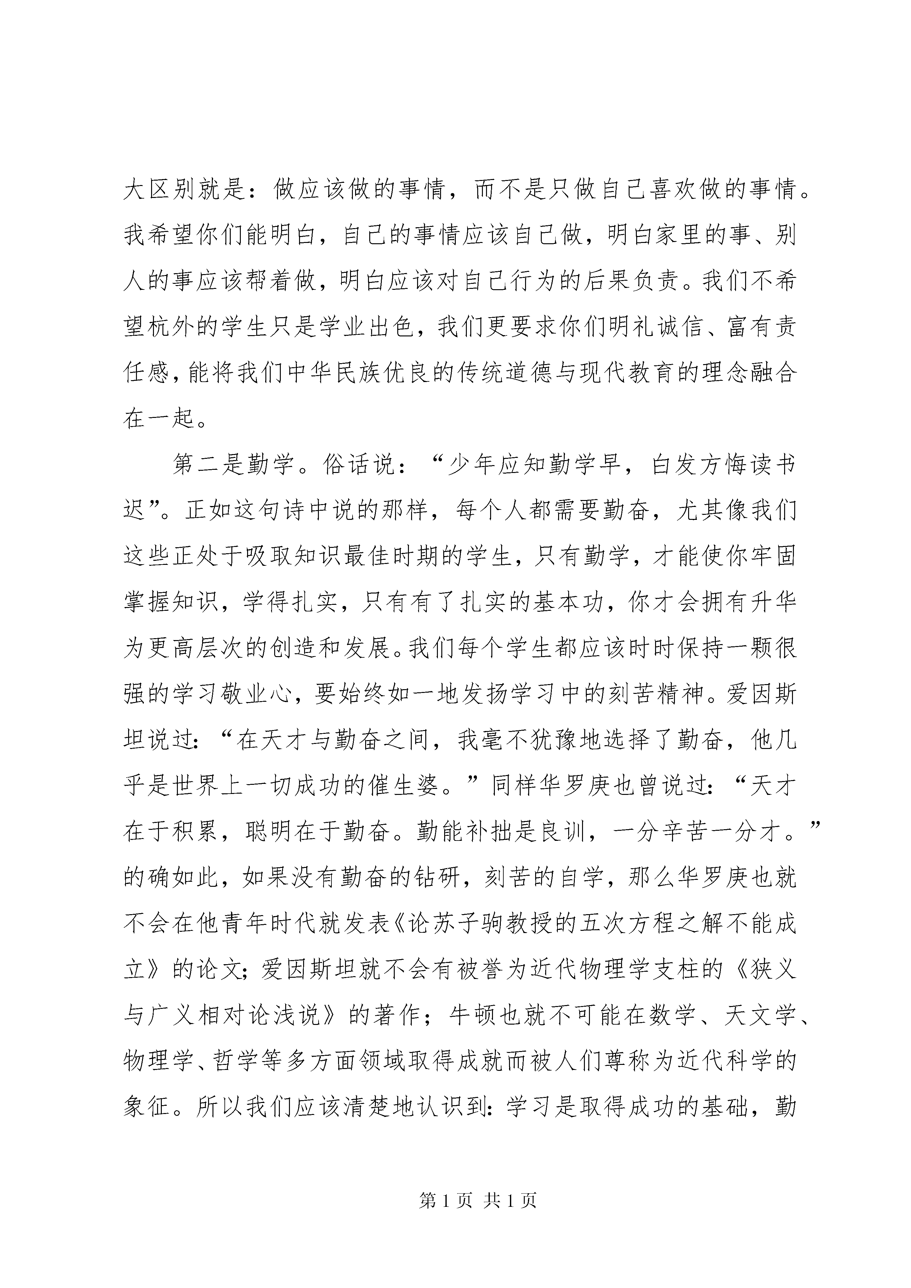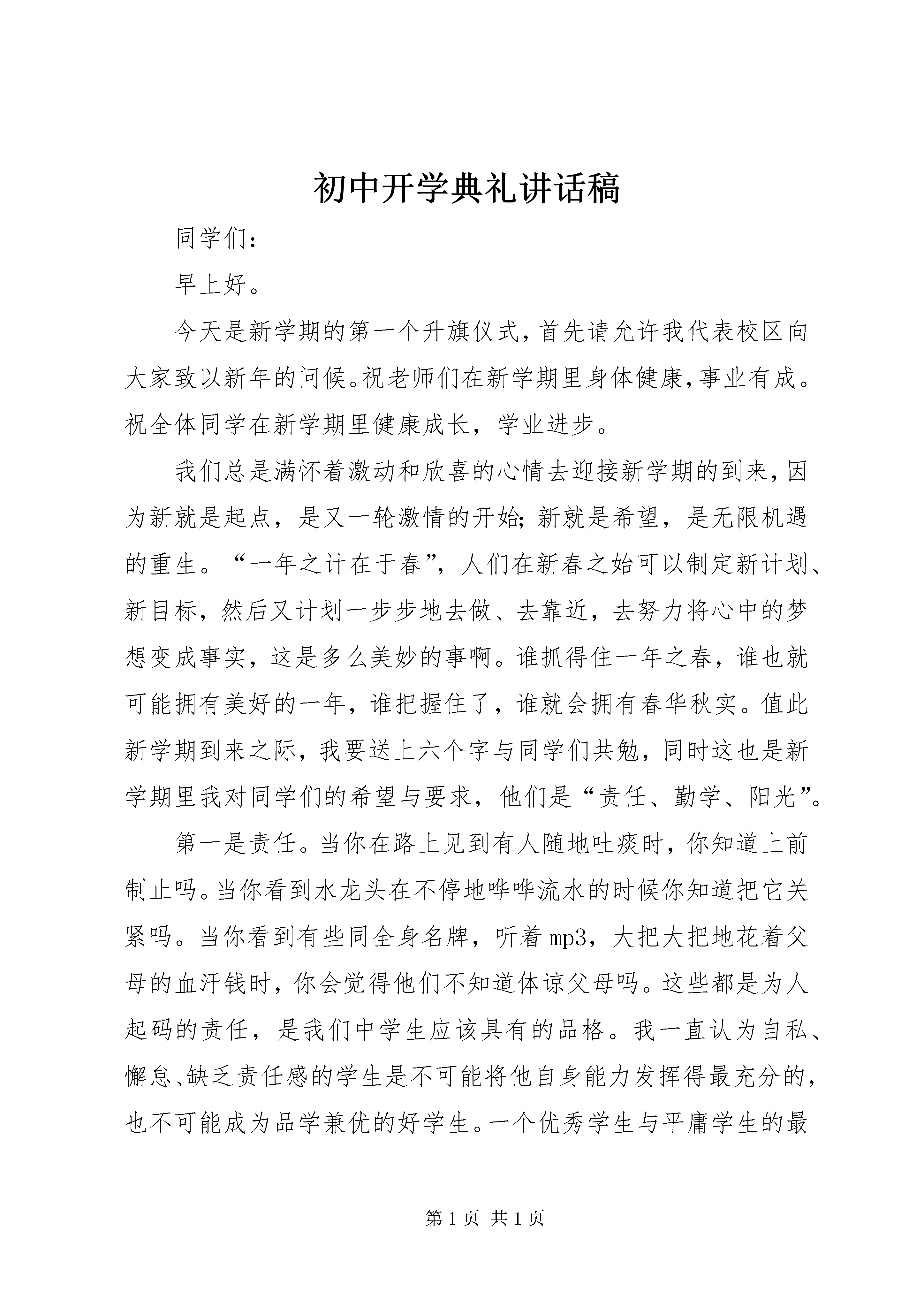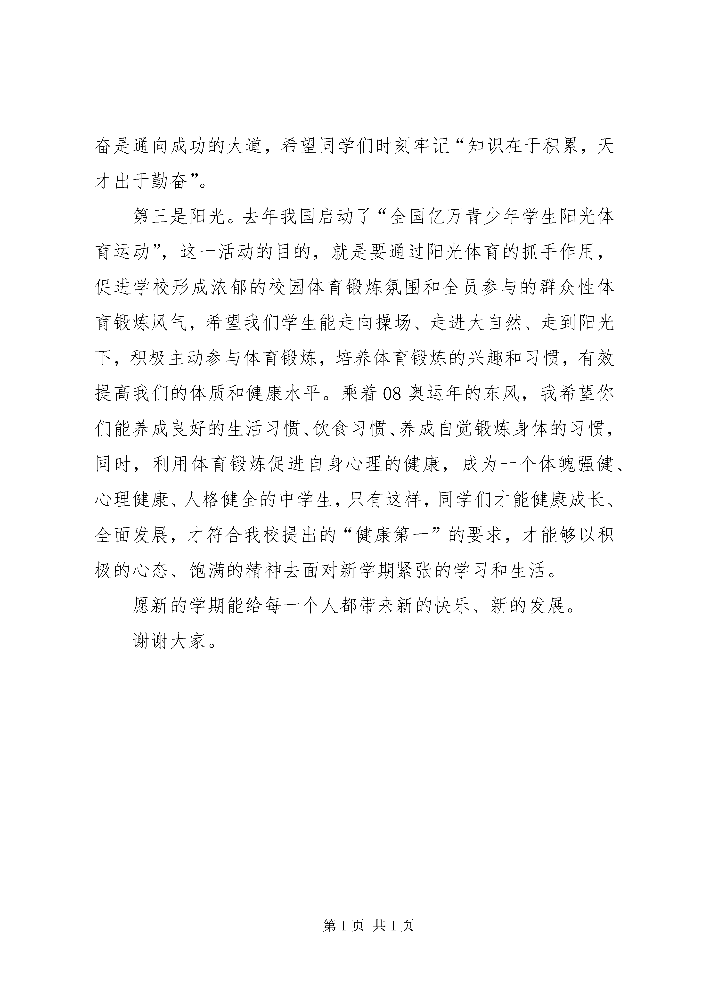 初中开学典礼讲话稿同学们:早上好。今天是新学期的第一个升旗仪式,首先请允许我代表校区向大家致以新年的问候。祝老师们在新学期里身体健康,事业有成。祝全体同学在新学期里健康成长,学业进步。我们总是满怀着激动和欣喜的心情去迎接新学期的到来,因为新就是起点,是又一轮激情的开始;新就是希望,是无限机遇的重生。“一年之计在于春”,人们在新春之始可以制定新计划、新目标,然后又计划一步步地去做、去靠近,去努力将心中的梦想变成事实,这是多么美妙的事啊。谁抓得住一年之春,谁也就可能拥有美好的一年,谁把握住了,谁就会拥有春华秋实。值此新学期到来之际,我要送上六个字与同学们共勉,同时这也是新学期里我对同学们的希望与要求,他们是“责任、勤学、阳光”。第一是责任。当你在路上见到有人随地吐痰时,你知道上前制止吗。当你看到水龙头在不停地哗哗流水的时候你知道把它关紧吗。当你看到有些同全身名牌,听着mp3,大把大把地花着父母的血汗钱时,你会觉得他们不知道体谅父母吗。这些都是为人起码的责任,是我们中学生应该具有的品格。我一直认为自私、懈怠、缺乏责任感的学生是不可能将他自身能力发挥得最充分的,也不可能成为品学兼优的好学生。一个优秀学生与平庸学生的最大区别就是:做应该做的事情,而不是只做自己喜欢做的事情。我希望你们能明白,自己的事情应该自己做,明白家里的事、别人的事应该帮着做,明白应该对自己行为的后果负责。我们不希望杭外的学生只是学业出色,我们更要求你们明礼诚信、富有责任感,能将我们中华民族优良的传统道德与现代教育的理念融合在一起。第二是勤学。俗话说:“少年应知勤学早,白发方悔读书迟”。正如这句诗中说的那样,每个人都需要勤奋,尤其像我们这些正处于吸取知识最佳时期的学生,只有勤学,才能使你牢固掌握知识,学得扎实,只有有了扎实的基本功,你才会拥有升华为更高层次的创造和发展。我们每个学生都应该时时保持一颗很强的学习敬业心,要始终如一地发扬学习中的刻苦精神。爱因斯坦说过:“在天才与勤奋之间,我毫不犹豫地选择了勤奋,他几乎是世界上一切成功的催生婆。”同样华罗庚也曾说过:“天才在于积累,聪明在于勤奋。勤能补拙是良训,一分辛苦一分才。”的确如此,如果没有勤奋的钻研,刻苦的自学,那么华罗庚也就不会在他青年时代就发表《论苏子驹教授的五次方程之解不能成立》的论文;爱因斯坦就不会有被誉为近代物理学支柱的《狭义与广义相对论浅说》的著作;牛顿也就不可能在数学、天文学、物理学、哲学等多方面领域取得成就而被人们尊称为近代科学的象征。所以我们应该清楚地认识到:学习是取得成功的基础,勤奋是通向成功的大道,希望同学们时刻牢记“知识在于积累,天才出于勤奋”。第三是阳光。去年我国启动了“全国亿万青少年学生阳光体育运动”,这一活动的目的,就是要通过阳光体育的抓手作用,促进学校形成浓郁的校园体育锻炼氛围和全员参与的群众性体育锻炼风气,希望我们学生能走向操场、走进大自然、走到阳光下,积极主动参与体育锻炼,培养体育锻炼的兴趣和习惯,有效提高我们的体质和健康水平。乘着08奥运年的东风,我希望你们能养成良好的生活习惯、饮食习惯、养成自觉锻炼身体的习惯,同时,利用体育锻炼促进自身心理的健康,成为一个体魄强健、心理健康、人格健全的中学生,只有这样,同学们才能健康成长、全面发展,才符合我校提出的“健康第一”的要求,才能够以积极的心态、饱满的精神去面对新学期紧张的学习和生活。愿新的学期能给每一个人都带来新的快乐、新的发展。谢谢大家。