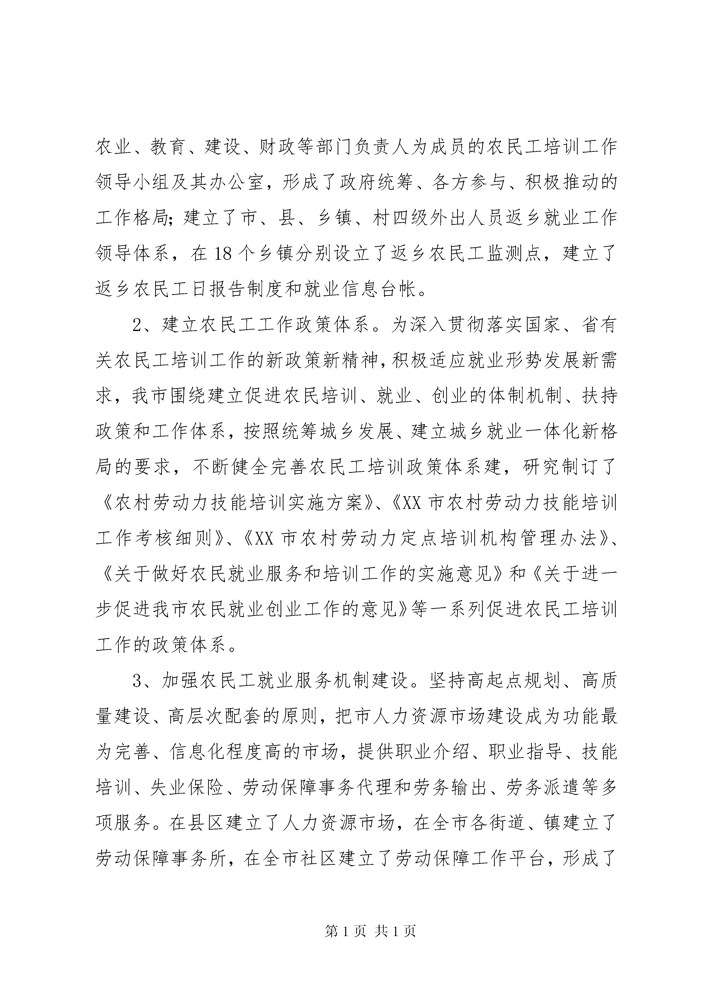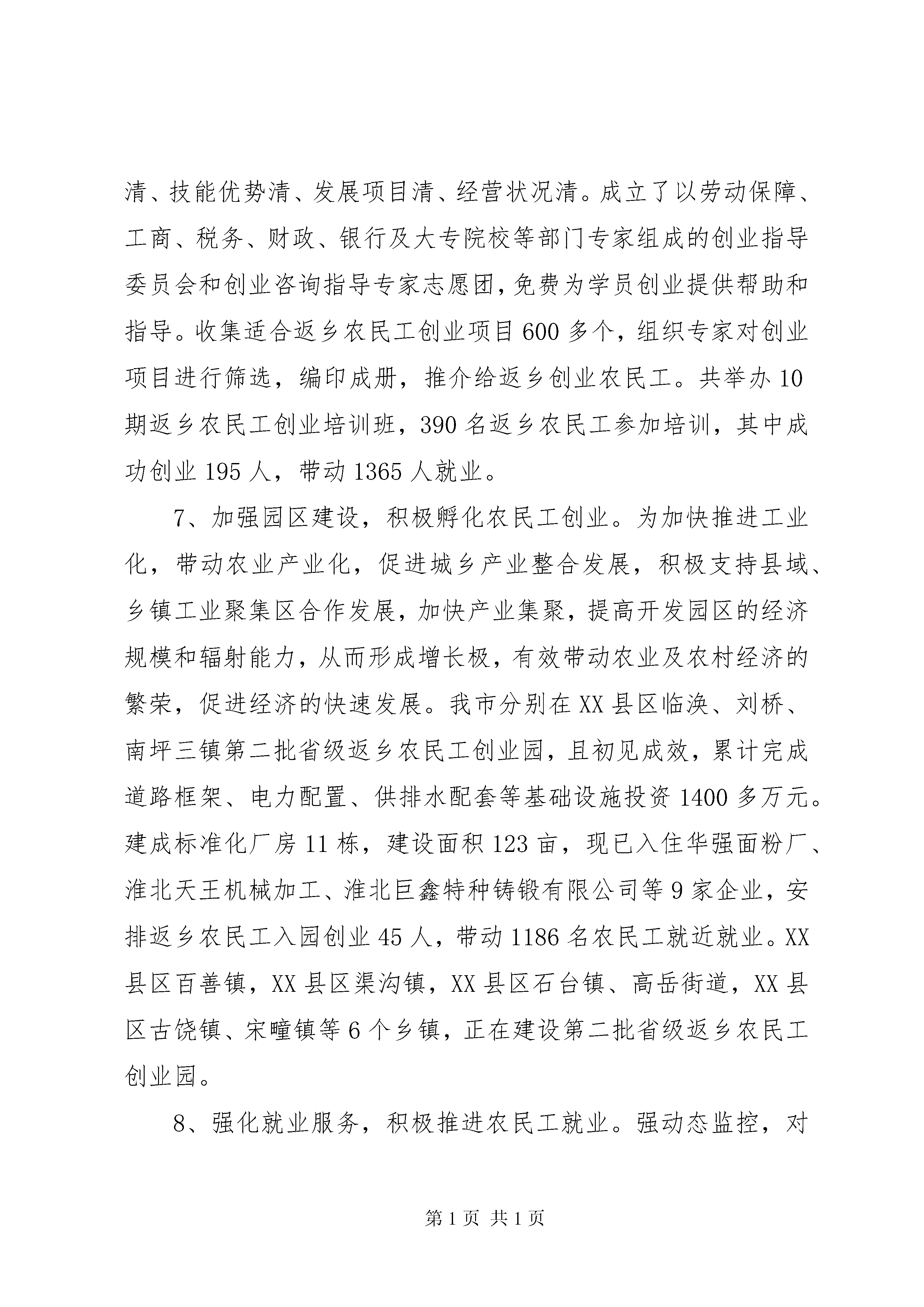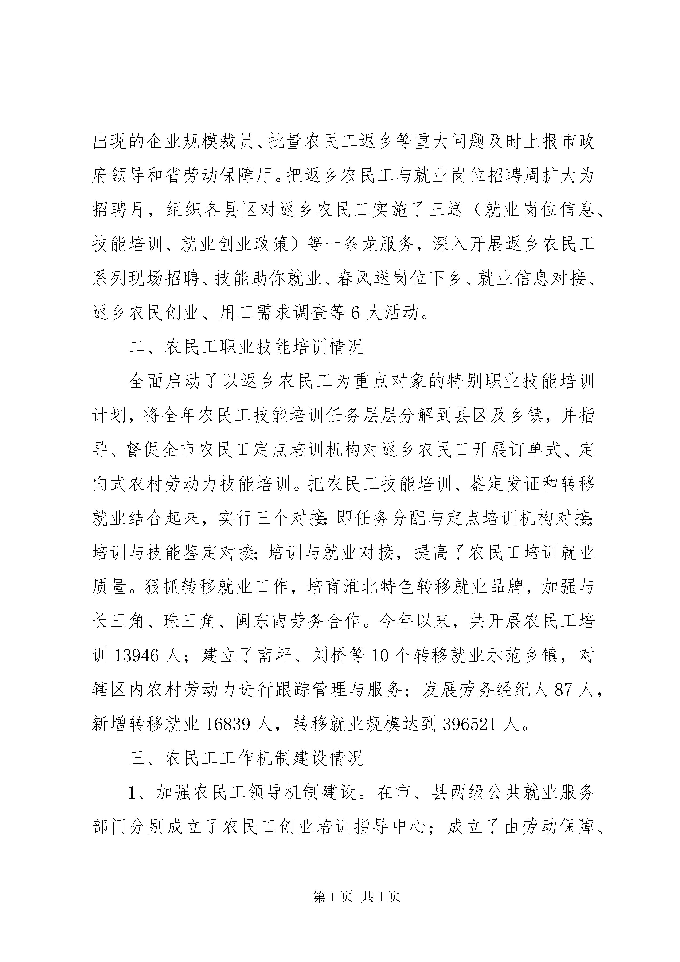 农民工工作的自查报告自接到市就业工作领导小组办公室《通知》后,我局高度重视,及时对开展农民工工作自查进行了研究与部署,并严格按照省农民工工作联席会议办公室《关于开展农民工工作自查的通知》要求与部署,对20XX年我局开展农民工工作情况进行了认真、深刻、细致地自查与自评。现就我局开展农民工工作自查情况报告如下:一、农民工就业创业管理服务情况1、加强领导,积极引导农民工创业就业。成立领导小组。去年,我市对就业工作领导小组成员进行调整和充实,成立了以市长任组长,36家单位主要负责人任成员的XX市就业工作领导小组,市劳动保障局抽6名专职人员从事扶持返乡农民工创业就业工作。按照市委毕美家书记的常年抓、抓常年重要批示精神,我市建立了市、县、乡镇、村四级外出人员返乡创业工作领导体系。2、制定优惠政策,积极扶持农民工创业就业。4月初我市以市委、市政府名义出台了《关于进一步做好促进就业工作的若干意见》,各部门结合工作实际,研究制定了具体的办法和措施,对于返乡农民工创办企业的享受招商引资企业同等优惠政策;对入园创业的享受下岗失业人员同等优惠政策;对创业农民初创的小企业,可适当放宽注册资本额度和注册资本到位期限等。切实从政策层面上支持和鼓励农民工返乡创业。3、强化目标管理,积极落实农民工工作责任。市目标办印发了《XX市20XX年就业工作目标任务分解和考核办法》,将扶持农民工创业就业等目标任务和责任层层分解下达,列入市、县区、乡镇(街道)三级政府目标责任考核重要内容,实行月报告、季调度、半年督查、年底考核制度。4、建立工作台帐,积极规范农民工工作程序。在18个乡镇分别设立了返乡农民工监测点,建立了返乡农民工日报告制度。各县区和乡镇劳动保障工作机构采取分片包干制的办法,组织专人深入村户,通过上门走访、发放问卷调查表、召开能人座谈会等形式,了解返乡农民工意愿和要求,建立了返乡农民工就业创业信息台帐。5、强化政策宣传,积极帮助农民工创业就业。市、县区劳动保障部门分别在服务大厅设立了宣传咨询窗口,在火车站、汽车站设立了宣传咨询台,深入开展了外出务工人员宣传咨询活动,发放各类宣传资料10万余份。国家广播电台、中国劳动保障报、安徽电视台等新闻媒体曾多次对我市返乡农民工创业就业工作进行宣传报道。6、加强创业扶持,积极促进农民工创业。分别在市、县区两级公共就业服务机构分别成立了农民工创业培训指导中心,建立了返乡农民工创业人员扶持档案,做到家庭住址清、联系方式清、技能优势清、发展项目清、经营状况清。成立了以劳动保障、工商、税务、财政、银行及大专院校等部门专家组成的创业指导委员会和创业咨询指导专家志愿团,免费为学员创业提供帮助和指导。收集适合返乡农民工创业项目600多个,组织专家对创业项目进行筛选,编印成册,推介给返乡创业农民工。共举办10期返乡农民工创业培训班,390名返乡农民工参加培训,其中成功创业195人,带动1365人就业。7、加强园区建设,积极孵化农民工创业。为加快推进工业化,带动农业产业化,促进城乡产业整合发展,积极支持县域、乡镇工业聚集区合作发展,加快产业集聚,提高开发园区的经济规模和辐射能力,从而形成增长极,有效带动农业及农村经济的繁荣,促进经济的快速发展。我市分别在XX县区临涣、刘桥、南坪三镇第二批省级返乡农民工创业园,且初见成效,累计完成道路框架、电力配置、供排水配套等基础设施投资1400多万元。建成标准化厂房11栋,建设面积123亩,现已入住华强面粉厂、淮北天王机械加工、淮北巨鑫特种铸锻有限公司等9家企业,安排返乡农民工入园创业45人,带动1186名农民工就近就业。XX县区百善镇,XX县区渠沟镇,XX县区石台镇、高岳街道,XX县区古饶镇、宋疃镇等6个乡镇,正在建设第二批省级返乡农民工创业园。8、强化就业服务,积极推进农民工就业。强动态监控,对出现的企业规模裁员、批量农民工返乡等重大问题及时上报市政府领导和省劳动保障厅。把返乡农民工与就业岗位招聘周扩大为招聘月,组织各县区对返乡农民工实施了三送(就业岗位信息、技能培训、就业创业政策)等一条龙服务,深入开展返乡农民工系列现场招聘、技能助你就业、春风送岗位下乡、就业信息对接、返乡农民创业、用工需求调查等6大活动。二、农民工职业技能培训情况全面启动了以返乡农民工为重点对象的特别职业技能培训计划,将全年农民工技能培训任务层层分解到县区及乡镇,并指导、督促全市农民工定点培训机构对返乡农民工开展订单式、定向式农村劳动力技能培训。把农民工技能培训、鉴定发证和转移就业结合起来,实行三个对接:即任务分配与定点培训机构对接;培训与技能鉴定对接;培训与就业对接,提高了农民工培训就业质量。狠抓转移就业工作,培育淮北特色转移就业品牌,加强与长三角、珠三角、闽东南劳务合作。今年以来,共开展农民工培训139