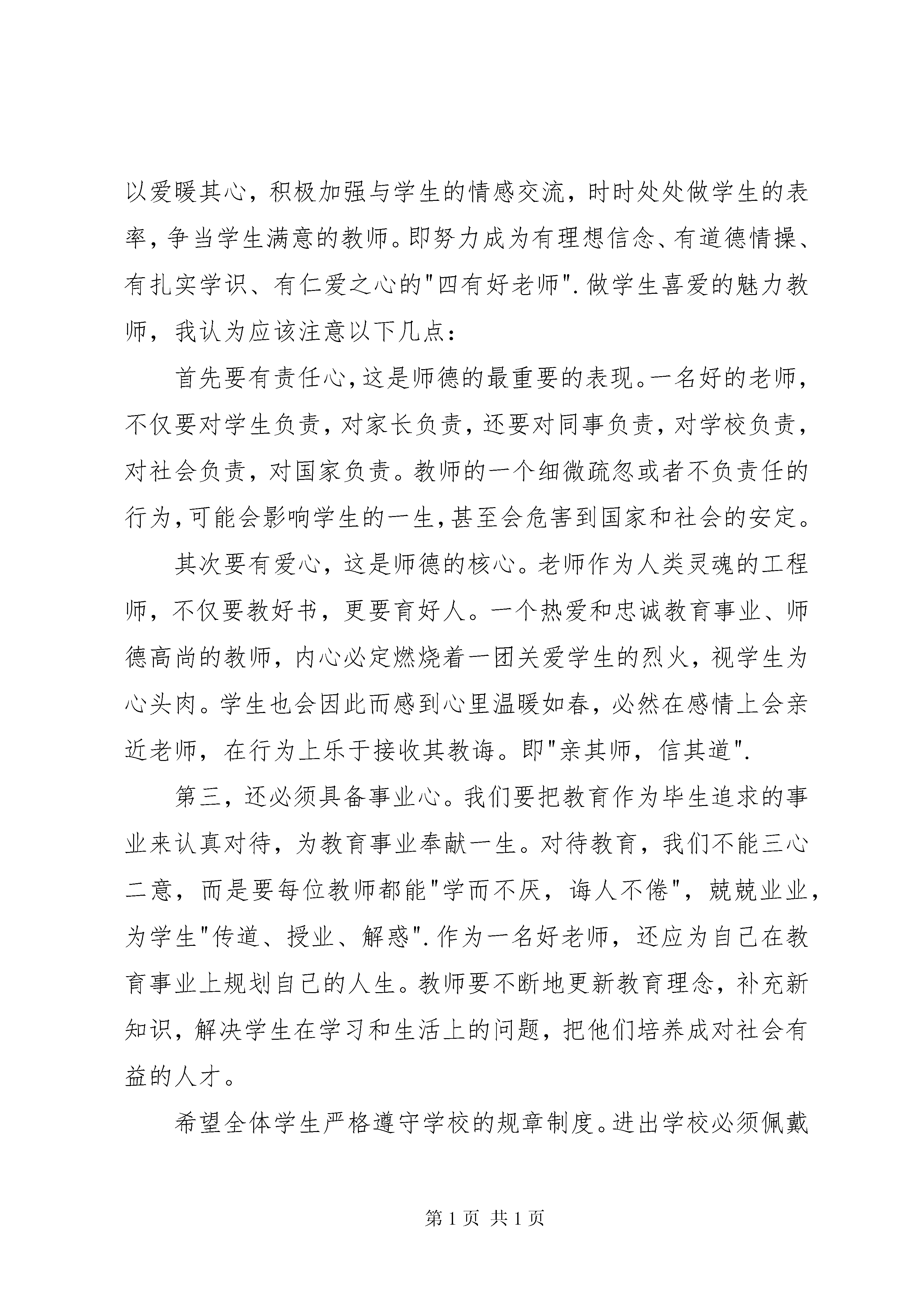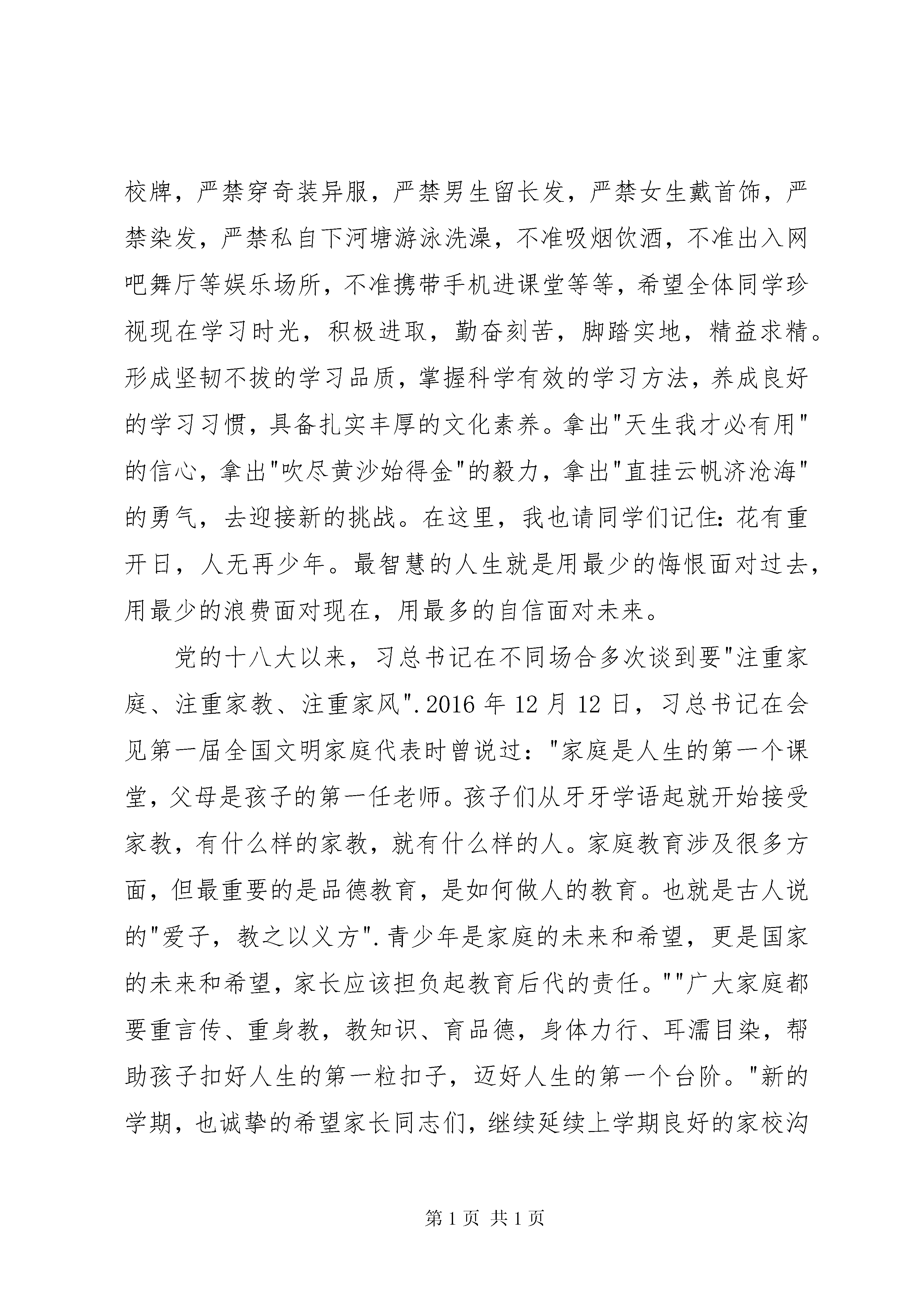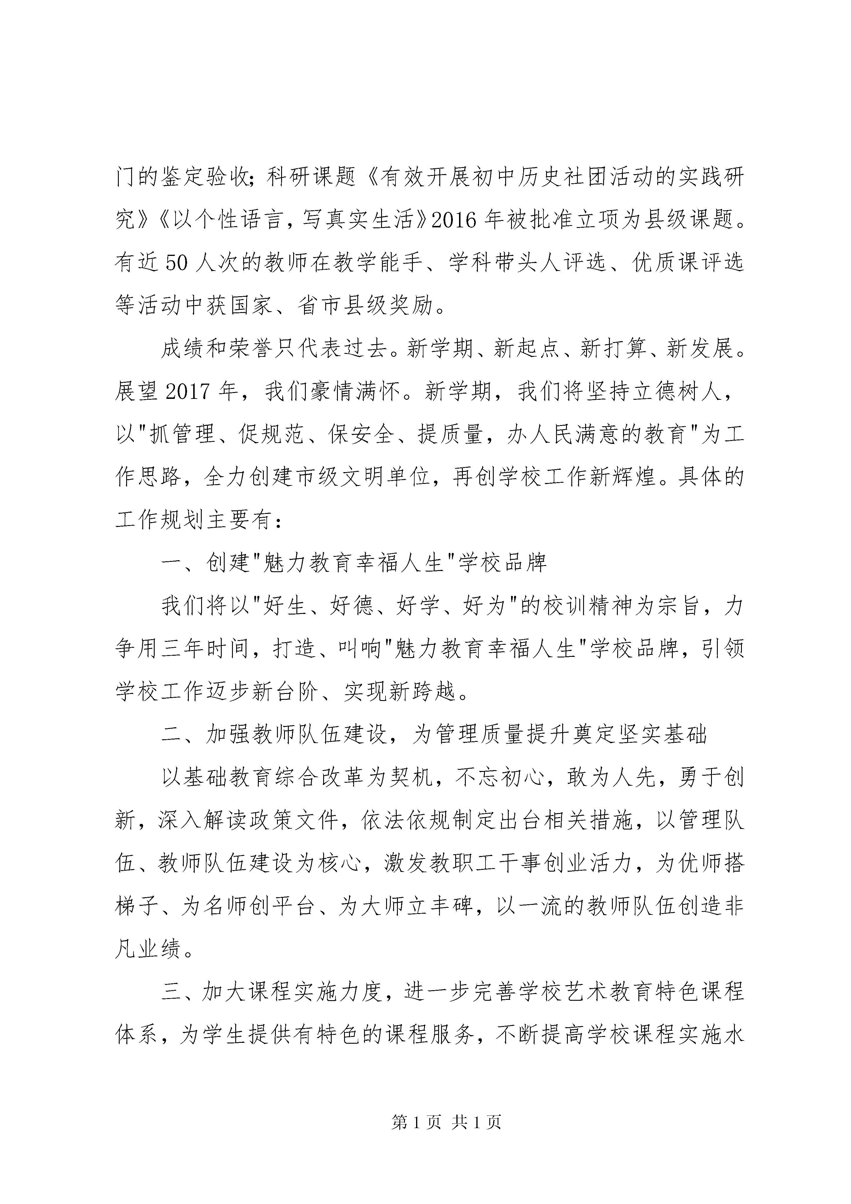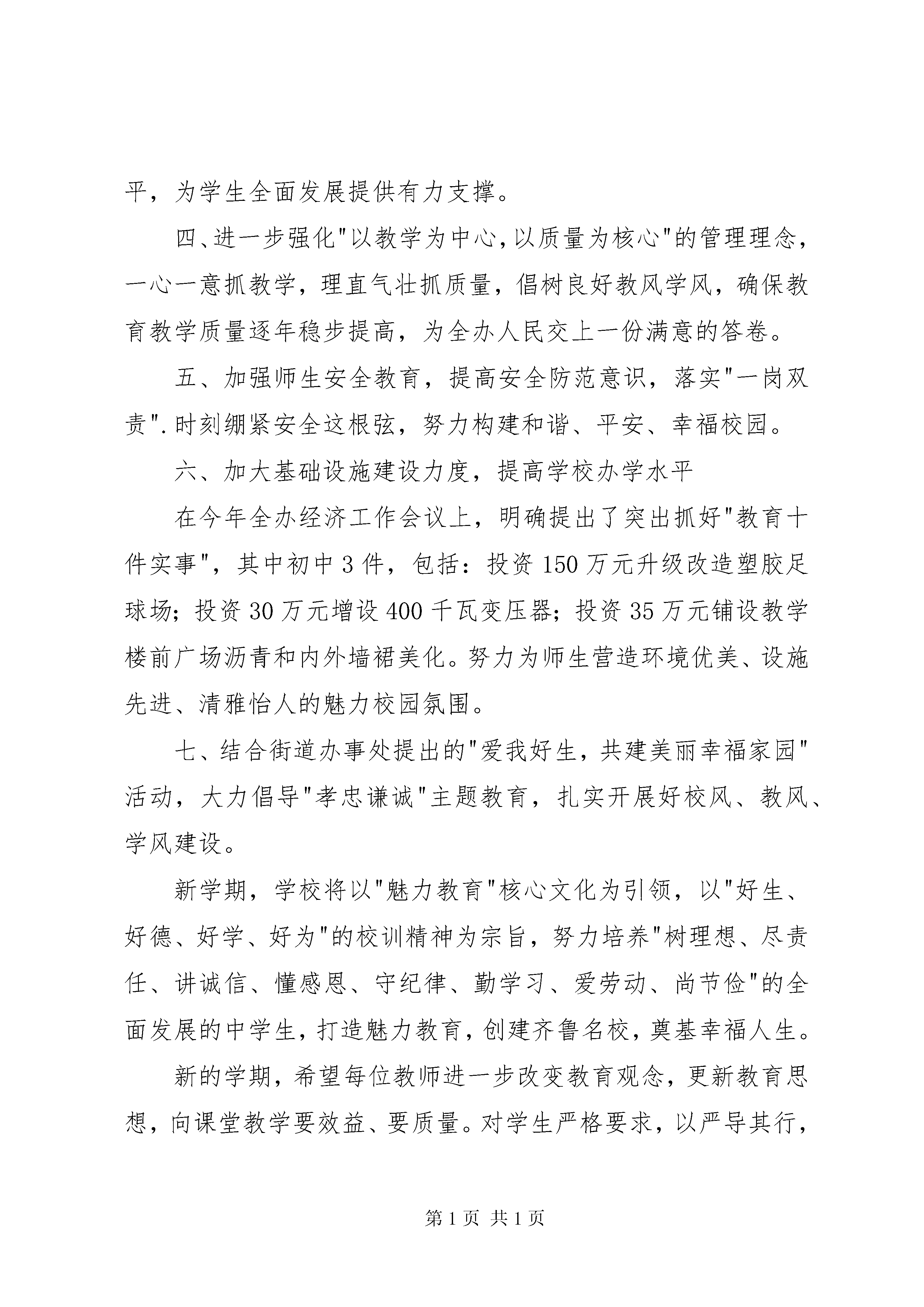初中春季开学典礼校长讲话稿(一)各位领导、各位家长、老师们、同学们:大家下午好。伴随着新学期的开始,我们满怀着新的希望迎来了又一个春天。在这春风送暖的时刻,我首先代表学校向辛勤工作并取得丰硕成果的全校教职工表示衷心的感谢。向努力学习并取得长足进步的同学们表达真诚的祝贺。向长期以来支持学校发展的家长朋友们道一声辛苦了。过去的2016年,是学校求稳定、求发展、求团结、求奋进的一年。一年来,在全校师生的共同努力下,学校先后荣获全国青少年普法教育优秀组织奖、XX县区平安校园建设先进单位、XX县区精神文明单位、好生街道办事处2016年度群众满意单位等荣誉称号。有两人入选XX县区第二批"三名工程"培养人选,赵媛媛、吕玲玲老师被评选为XX县区第三批教坛新星。课题研究成果丰硕。市级科研课题《农村初中学校文化与教育品牌建设研究》《农村初中青年教师培养创新机制研究》,县级科研课题《基于新课程标准下的英语高效课堂研究》《思想品德课堂教学中情境创设有效性的研究》均顺利通过市县课题管理部门的鉴定验收;科研课题《有效开展初中历史社团活动的实践研究》《以个性语言,写真实生活》2016年被批准立项为县级课题。有近50人次的教师在教学能手、学科带头人评选、优质课评选等活动中获国家、省市县级奖励。成绩和荣誉只代表过去。新学期、新起点、新打算、新发展。展望2017年,我们豪情满怀。新学期,我们将坚持立德树人,以"抓管理、促规范、保安全、提质量,办人民满意的教育"为工作思路,全力创建市级文明单位,再创学校工作新辉煌。具体的工作规划主要有:一、创建"魅力教育幸福人生"学校品牌我们将以"好生、好德、好学、好为"的校训精神为宗旨,力争用三年时间,打造、叫响"魅力教育幸福人生"学校品牌,引领学校工作迈步新台阶、实现新跨越。二、加强教师队伍建设,为管理质量提升奠定坚实基础以基础教育综合改革为契机,不忘初心,敢为人先,勇于创新,深入解读政策文件,依法依规制定出台相关措施,以管理队伍、教师队伍建设为核心,激发教职工干事创业活力,为优师搭梯子、为名师创平台、为大师立丰碑,以一流的教师队伍创造非凡业绩。三、加大课程实施力度,进一步完善学校艺术教育特色课程体系,为学生提供有特色的课程服务,不断提高学校课程实施水平,为学生全面发展提供有力支撑。四、进一步强化"以教学为中心,以质量为核心"的管理理念,一心一意抓教学,理直气壮抓质量,倡树良好教风学风,确保教育教学质量逐年稳步提高,为全办人民交上一份满意的答卷。五、加强师生安全教育,提高安全防范意识,落实"一岗双责".时刻绷紧安全这根弦,努力构建和谐、平安、幸福校园。六、加大基础设施建设力度,提高学校办学水平在今年全办经济工作会议上,明确提出了突出抓好"教育十件实事",其中初中3件,包括:投资150万元升级改造塑胶足球场;投资30万元增设400千瓦变压器;投资35万元铺设教学楼前广场沥青和内外墙裙美化。努力为师生营造环境优美、设施先进、清雅怡人的魅力校园氛围。七、结合街道办事处提出的"爱我好生,共建美丽幸福家园"活动,大力倡导"孝忠谦诚"主题教育,扎实开展好校风、教风、学风建设。新学期,学校将以"魅力教育"核心文化为引领,以"好生、好德、好学、好为"的校训精神为宗旨,努力培养"树理想、尽责任、讲诚信、懂感恩、守纪律、勤学习、爱劳动、尚节俭"的全面发展的中学生,打造魅力教育,创建齐鲁名校,奠基幸福人生。新的学期,希望每位教师进一步改变教育观念,更新教育思想,向课堂教学要效益、要质量。对学生严格要求,以严导其行,以爱暖其心,积极加强与学生的情感交流,时时处处做学生的表率,争当学生满意的教师。即努力成为有理想信念、有道德情操、有扎实学识、有仁爱之心的"四有好老师".做学生喜爱的魅力教师,我认为应该注意以下几点:首先要有责任心,这是师德的最重要的表现。一名好的老师,不仅要对学生负责,对家长负责,还要对同事负责,对学校负责,对社会负责,对国家负责。教师的一个细微疏忽或者不负责任的行为,可能会影响学生的一生,甚至会危害到国家和社会的安定。其次要有爱心,这是师德的核心。老师作为人类灵魂的工程师,不仅要教好书,更要育好人。一个热爱和忠诚教育事业、师德高尚的教师,内心必定燃烧着一团关爱学生的烈火,视学生为心头肉。学生也会因此而感到心里温暖如春,必然在感情上会亲近老师,在行为上乐于接收其教诲。即"亲其师,信其道".第三,还必须具备事业心。我们要把教育作为毕生追求的事业来认真对待,为教育事业奉献一生。对待教育,我们不能三心二意,而是要每位教师都能"学而不厌,诲人不倦",兢兢业业,为学生"传道、授业、解惑".作为一名好老师,还应为自己在教育事业上规划自己的人生。教师要不断地更新教育理念,补充新知识,解决学生在学习和生活上的问题,把他们培养成