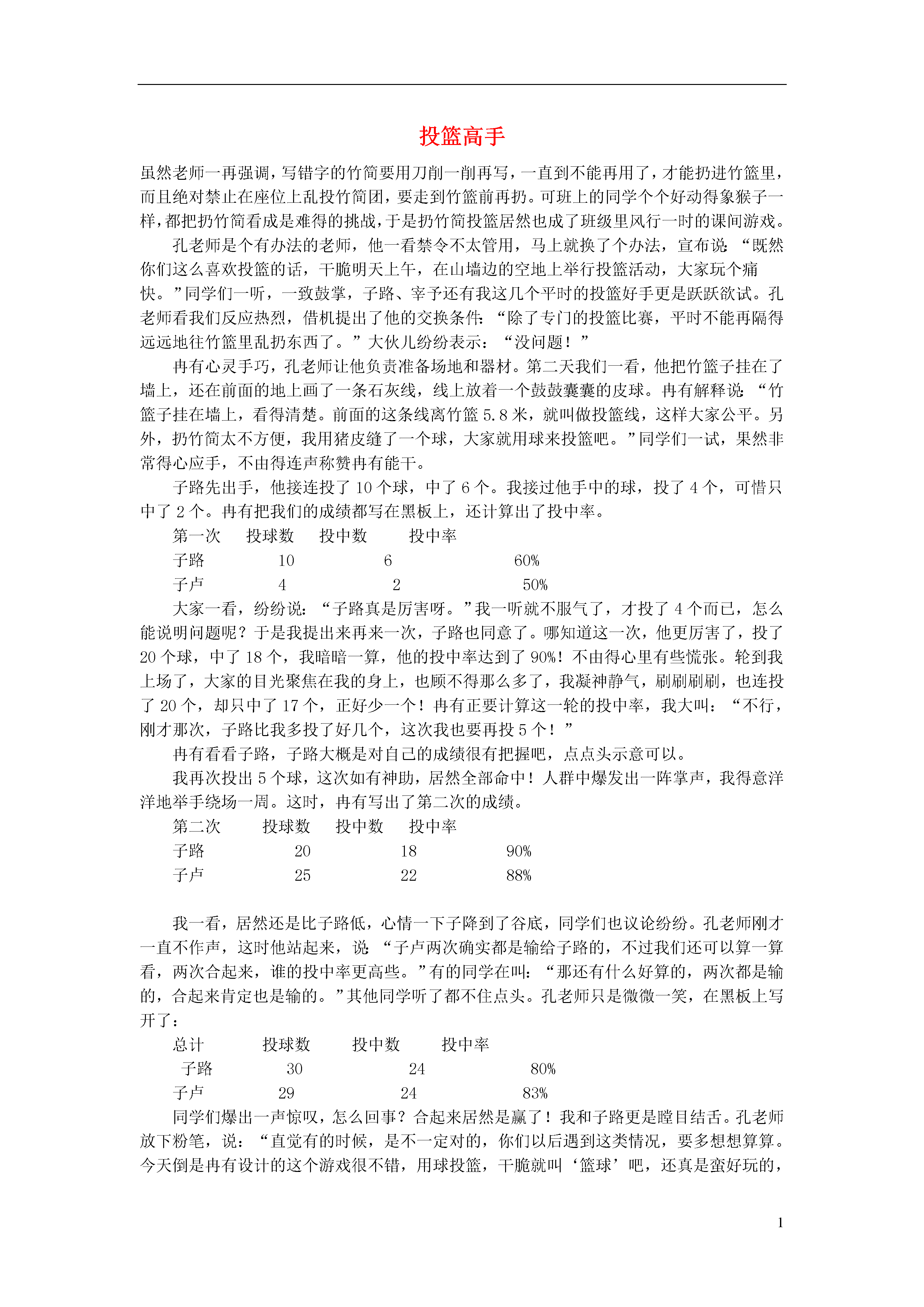 1投篮高手虽然老师一再强调,写错字的竹简要用刀削一削再写,一直到不能再用了,才能扔进竹篮里,而且绝对禁止在座位上乱投竹简团,要走到竹篮前再扔。可班上的同学个个好动得象猴子一样,都把扔竹简看成是难得的挑战,于是扔竹简投篮居然也成了班级里风行一时的课间游戏。孔老师是个有办法的老师,他一看禁令不太管用,马上就换了个办法,宣布说:“既然你们这么喜欢投篮的话,干脆明天上午,在山墙边的空地上举行投篮活动,大家玩个痛快。”同学们一听,一致鼓掌,子路、宰予还有我这几个平时的投篮好手更是跃跃欲试。孔老师看我们反应热烈,借机提出了他的交换条件:“除了专门的投篮比赛,平时不能再隔得远远地往竹篮里乱扔东西了。”大伙儿纷纷表示:“没问题!”冉有心灵手巧,孔老师让他负责准备场地和器材。第二天我们一看,他把竹篮子挂在了墙上,还在前面的地上画了一条石灰线,线上放着一个鼓鼓囊囊的皮球。冉有解释说:“竹篮子挂在墙上,看得清楚。前面的这条线离竹篮5.8米,就叫做投篮线,这样大家公平。另外,扔竹简太不方便,我用猪皮缝了一个球,大家就用球来投篮吧。”同学们一试,果然非常得心应手,不由得连声称赞冉有能干。子路先出手,他接连投了10个球,中了6个。我接过他手中的球,投了4个,可惜只中了2个。冉有把我们的成绩都写在黑板上,还计算出了投中率。第一次投球数投中数投中率子路10660%子卢4250%大家一看,纷纷说:“子路真是厉害呀。”我一听就不服气了,才投了4个而已,怎么能说明问题呢?于是我提出来再来一次,子路也同意了。哪知道这一次,他更厉害了,投了20个球,中了18个,我暗暗一算,他的投中率达到了90%!不由得心里有些慌张。轮到我上场了,大家的目光聚焦在我的身上,也顾不得那么多了,我凝神静气,刷刷刷刷,也连投了20个,却只中了17个,正好少一个!冉有正要计算这一轮的投中率,我大叫:“不行,刚才那次,子路比我多投了好几个,这次我也要再投5个!”冉有看看子路,子路大概是对自己的成绩很有把握吧,点点头示意可以。我再次投出5个球,这次如有神助,居然全部命中!人群中爆发出一阵掌声,我得意洋洋地举手绕场一周。这时,冉有写出了第二次的成绩。第二次投球数投中数投中率子路201890%子卢252288%我一看,居然还是比子路低,心情一下子降到了谷底,同学们也议论纷纷。孔老师刚才一直不作声,这时他站起来,说:“子卢两次确实都是输给子路的,不过我们还可以算一算看,两次合起来,谁的投中率更高些。”有的同学在叫:“那还有什么好算的,两次都是输的,合起来肯定也是输的。”其他同学听了都不住点头。孔老师只是微微一笑,在黑板上写开了:总计投球数投中数投中率子路302480%子卢292483%同学们爆出一声惊叹,怎么回事?合起来居然是赢了!我和子路更是瞠目结舌。孔老师放下粉笔,说:“直觉有的时候,是不一定对的,你们以后遇到这类情况,要多想想算算。今天倒是冉有设计的这个游戏很不错,用球投篮,干脆就叫‘篮球’吧,还真是蛮好玩的,看来即使是千年之后,这种游戏仍然会有许多人喜欢的。”我也觉得,孔老师的预言一定会成真。知识链接:百分数之类的比率是不能象简单的数字一样相加求和的。