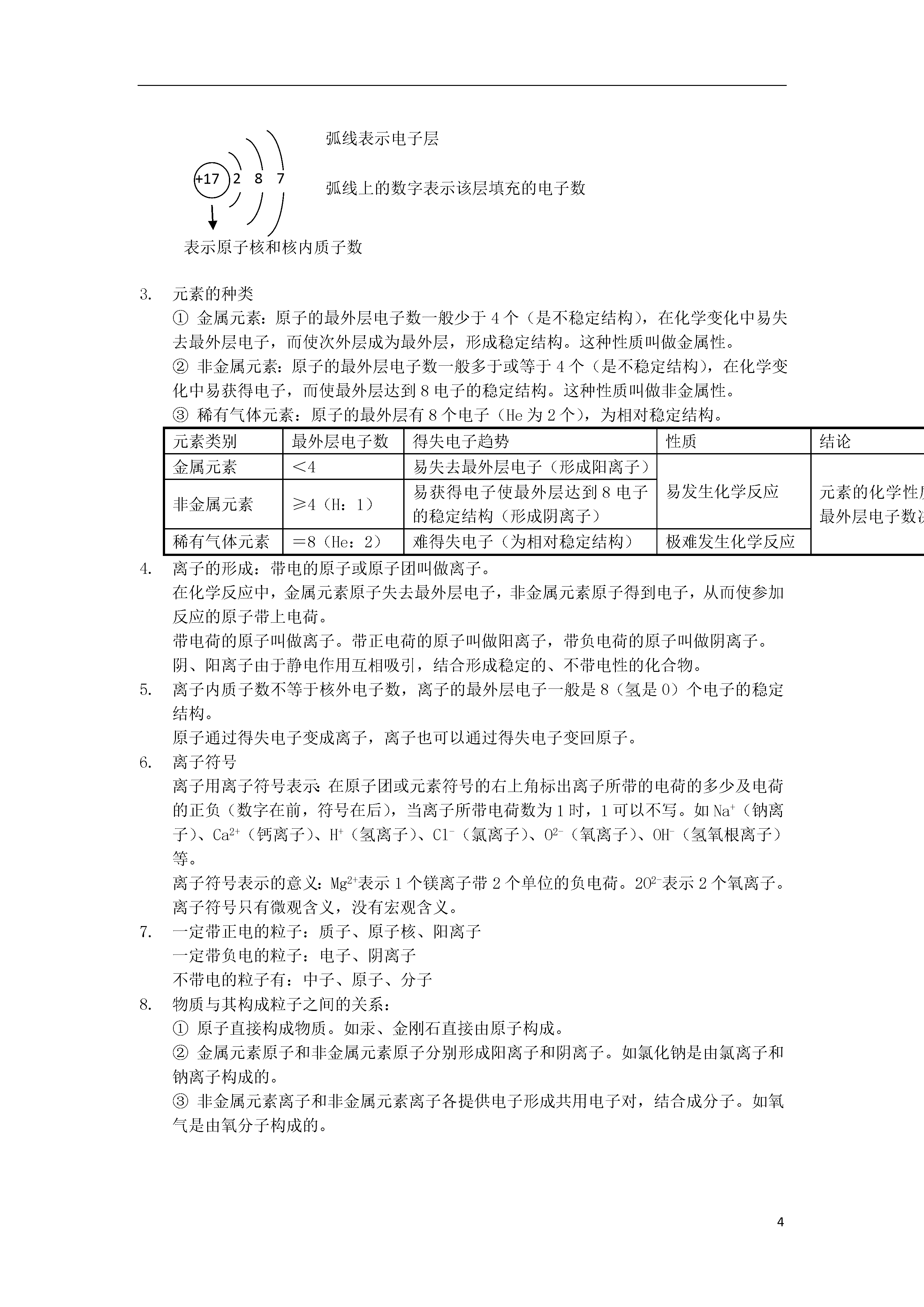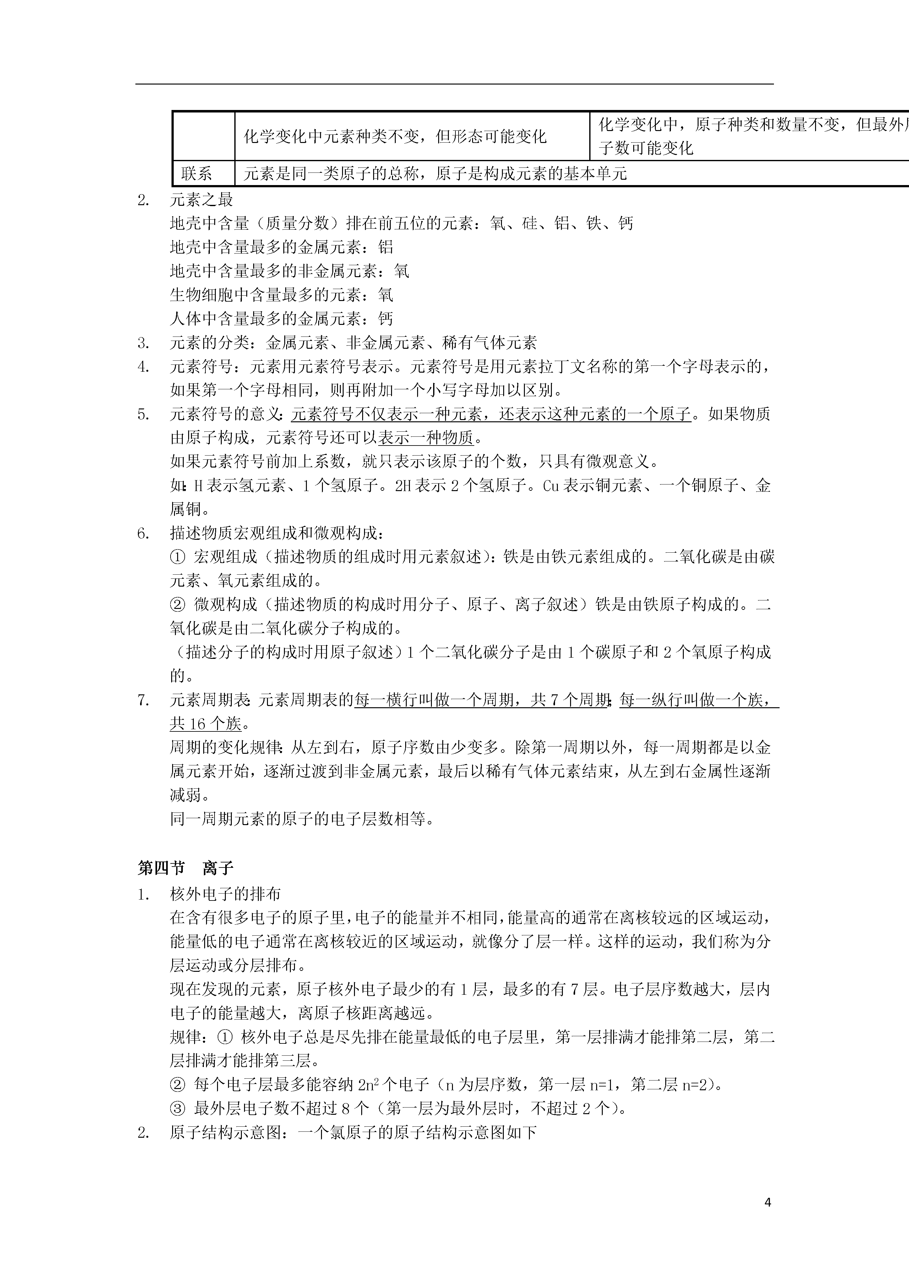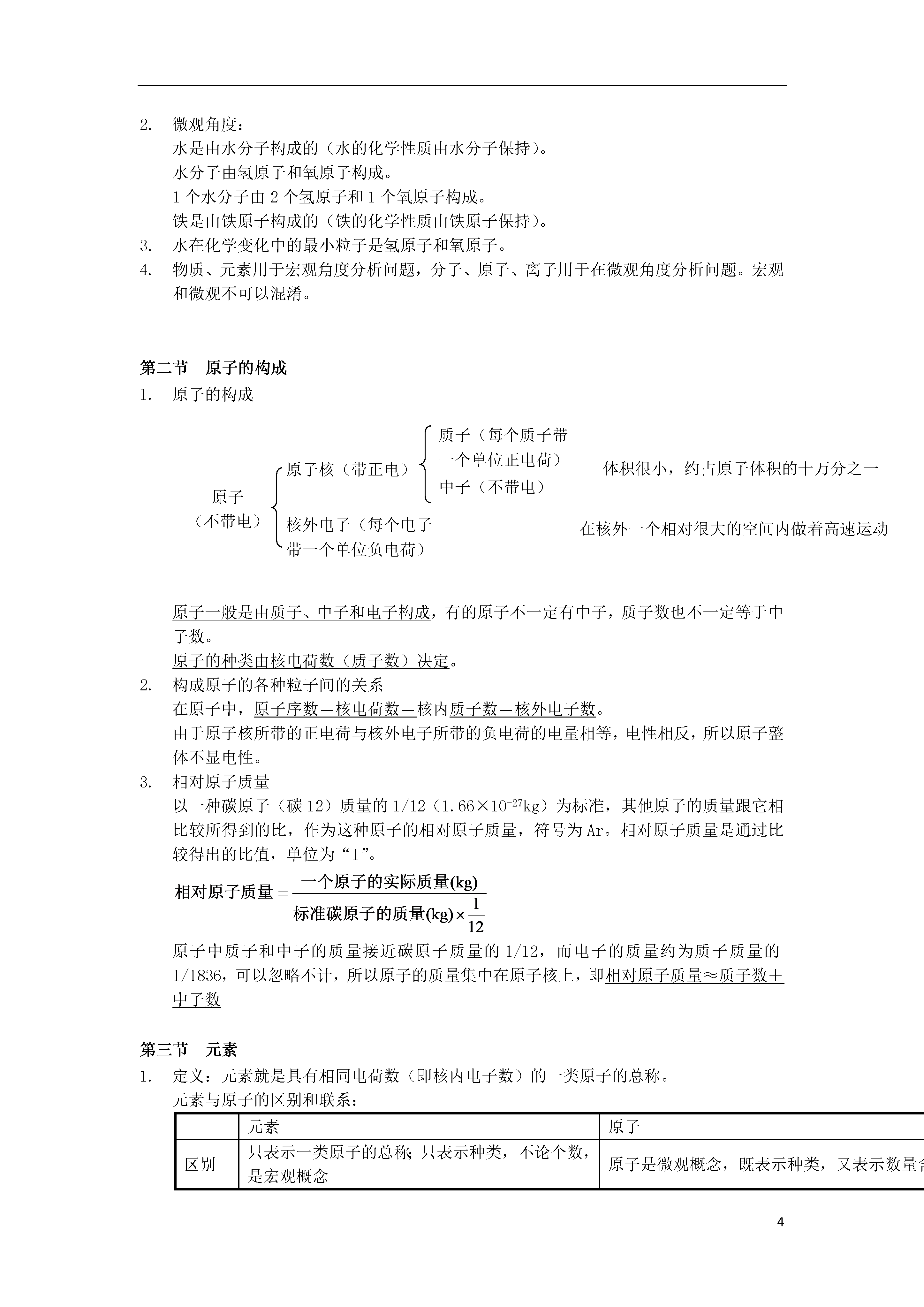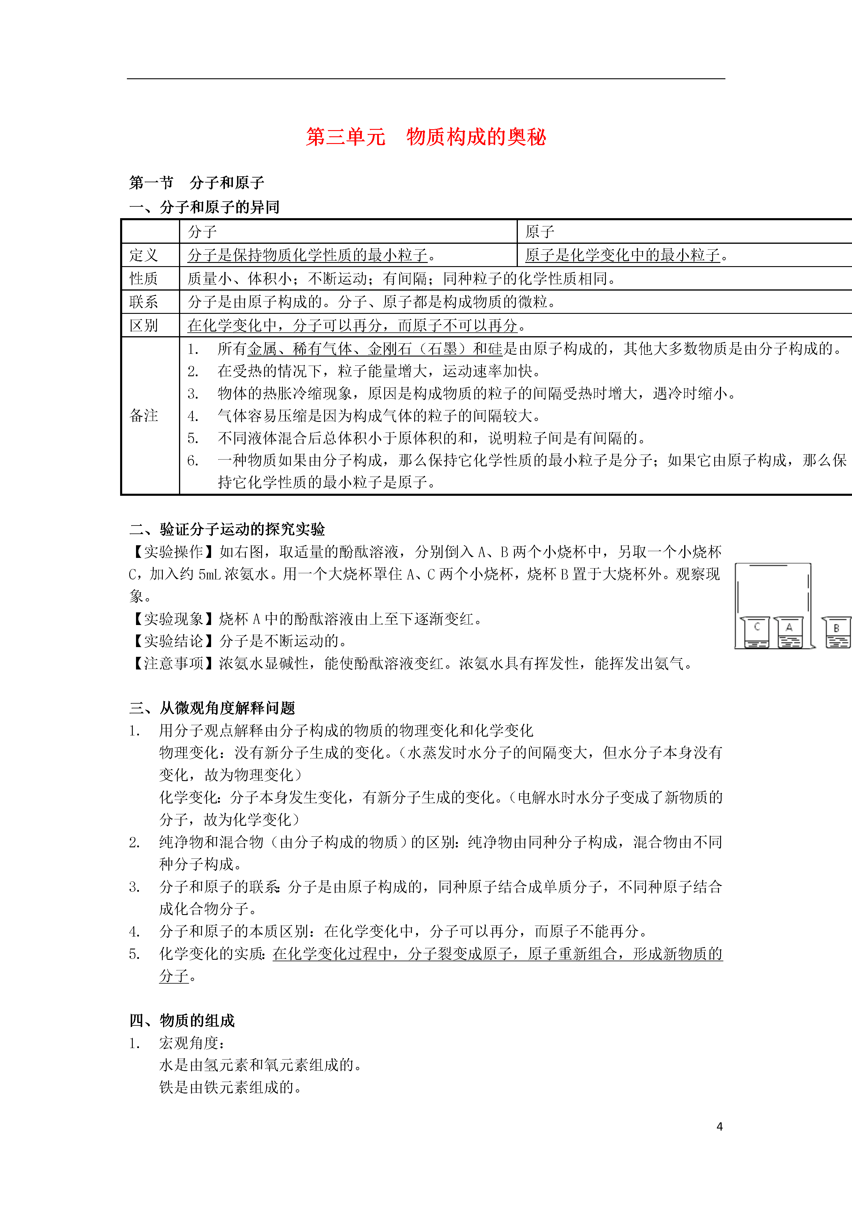 4第三单元物质构成的奥秘第一节分子和原子分子和原子的异同分子原子定义分子是保持物质化学性质的最小粒子。原子是化学变化中的最小粒子。性质质量小、体积小;不断运动;有间隔;同种粒子的化学性质相同。联系分子是由原子构成的。分子、原子都是构成物质的微粒。区别在化学变化中,分子可以再分,而原子不可以再分。备注所有金属、稀有气体、金刚石(石墨)和硅是由原子构成的,其他大多数物质是由分子构成的。在受热的情况下,粒子能量增大,运动速率加快。物体的热胀冷缩现象,原因是构成物质的粒子的间隔受热时增大,遇冷时缩小。气体容易压缩是因为构成气体的粒子的间隔较大。不同液体混合后总体积小于原体积的和,说明粒子间是有间隔的。一种物质如果由分子构成,那么保持它化学性质的最小粒子是分子;如果它由原子构成,那么保持它化学性质的最小粒子是原子。验证分子运动的探究实验【实验操作】如右图,取适量的酚酞溶液,分别倒入A、B两个小烧杯中,另取一个小烧杯C,加入约5mL浓氨水。用一个大烧杯罩住A、C两个小烧杯,烧杯B置于大烧杯外。观察现象。【实验现象】烧杯A中的酚酞溶液由上至下逐渐变红。【实验结论】分子是不断运动的。【注意事项】浓氨水显碱性,能使酚酞溶液变红。浓氨水具有挥发性,能挥发出氨气。从微观角度解释问题用分子观点解释由分子构成的物质的物理变化和化学变化物理变化:没有新分子生成的变化。(水蒸发时水分子的间隔变大,但水分子本身没有变化,故为物理变化)化学变化:分子本身发生变化,有新分子生成的变化。(电解水时水分子变成了新物质的分子,故为化学变化)纯净物和混合物(由分子构成的物质)的区别:纯净物由同种分子构成,混合物由不同种分子构成。分子和原子的联系:分子是由原子构成的,同种原子结合成单质分子,不同种原子结合成化合物分子。分子和原子的本质区别:在化学变化中,分子可以再分,而原子不能再分。化学变化的实质:在化学变化过程中,分子裂变成原子,原子重新组合,形成新物质的分子。物质的组成宏观角度:水是由氢元素和氧元素组成的。铁是由铁元素组成的。微观角度:水是由水分子构成的(水的化学性质由水分子保持)。水分子由氢原子和氧原子构成。1个水分子由2个氢原子和1个氧原子构成。铁是由铁原子构成的(铁的化学性质由铁原子保持)。水在化学变化中的最小粒子是氢原子和氧原子。物质、元素用于宏观角度分析问题,分子、原子、离子用于在微观角度分析问题。宏观和微观不可以混淆。第二节原子的构成原子的构成原子(不带电)原子核(带正电)核外电子(每个电子带一个单位负电荷)质子(每个质子带一个单位正电荷)中子(不带电)在核外一个相对很大的空间内做着高速运动体积很小,约占原子体积的十万分之一原子一般是由质子、中子和电子构成,有的原子不一定有中子,质子数也不一定等于中子数。原子的种类由核电荷数(质子数)决定。构成原子的各种粒子间的关系在原子中,原子序数=核电荷数=核内质子数=核外电子数。由于原子核所带的正电荷与核外电子所带的负电荷的电量相等,电性相反,所以原子整体不显电性。相对原子质量以一种碳原子(碳12)质量的1/12(1.66×10-27kg)为标准,其他原子的质量跟它相比较所得到的比,作为这种原子的相对原子质量,符号为Ar。相对原子质量是通过比较得出的比值,单位为“1”。原子中质子和中子的质量接近碳原子质量的1/12,而电子的质量约为质子质量的1/1836,可以忽略不计,所以原子的质量集中在原子核上,即相对原子质量≈质子数+中子数第三节元素定义:元素就是具有相同电荷数(即核内电子数)的一类原子的总称。元素与原子的区别和联系:元素原子区别只表示一类原子的总称;只表示种类,不论个数,是宏观概念原子是微观概念,既表示种类,又表示数量含义化学变化中元素种类不变,但形态可能变化化学变化中,原子种类和数量不变,但最外层电子数可能变化联系元素是同一类原子的总称,原子是构成元素的基本单元元素之最地壳中含量(质量分数)排在前五位的元素:氧、硅、铝、铁、钙地壳中含量最多的金属元素:铝地壳中含量最多的非金属元素:氧生物细胞中含量最多的元素:氧人体中含量最多的金属元素:钙元素的分类:金属元素、非金属元素、稀有气体元素元素符号:元素用元素符号表示。元素符号是用元素拉丁文名称的第一个字母表示的,如果第一个字母相同,则再附加一个小写字母加以区别。元素符号的意义:元素符号不仅表示一种元素,还表示这种元素的一个原子。如果物质由原子构成,元素符号还可以表示一种物质。如果元素符号前加上系数,就只表示该原子的个数,只具有微观意义。如:H表示氢元素、1个氢原子。2H表示2个氢原子。Cu表示铜元素、一个铜原子、金属铜。描述物质宏观组成和微观构成:①宏