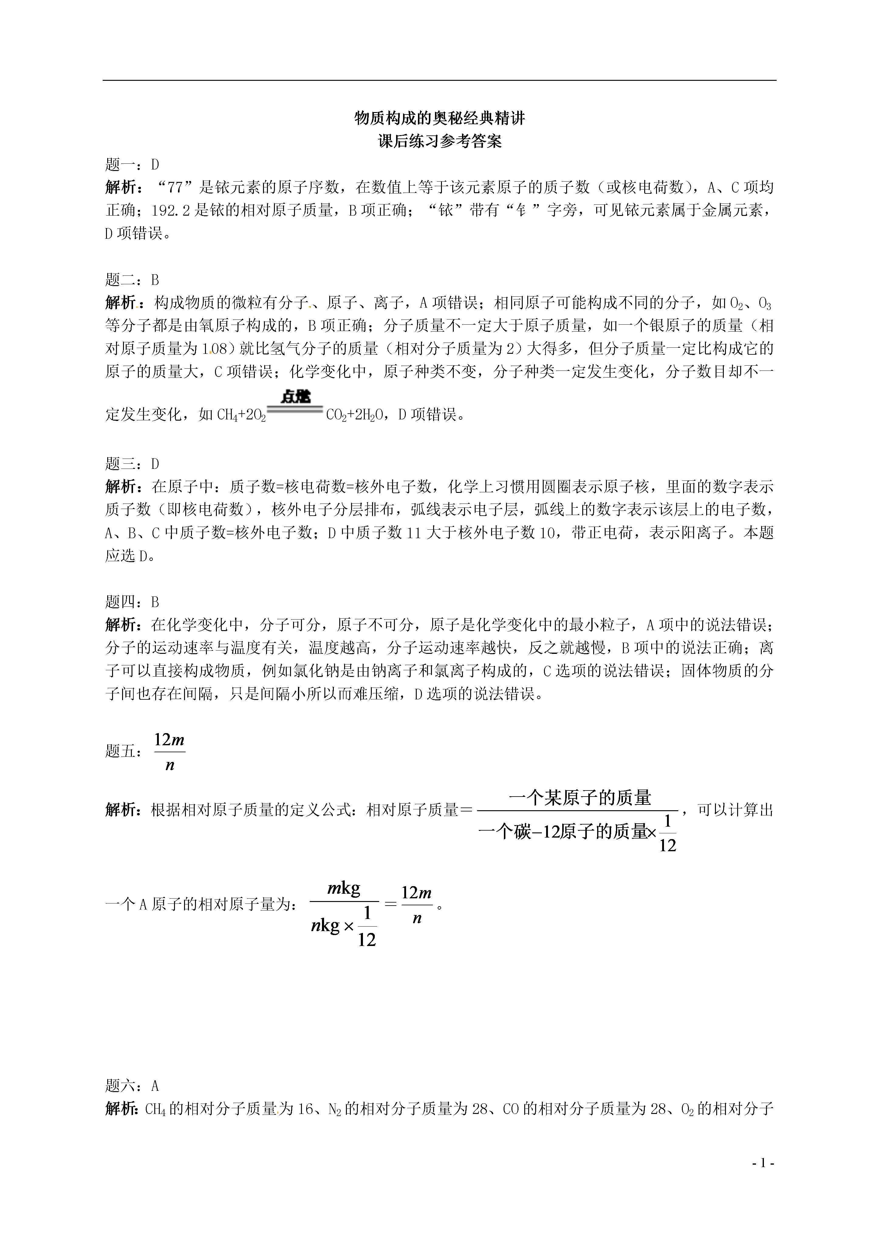 -1-物质构成的奥秘经典精讲课后练习(一)题一:不法商家在黄金中掺入了铱,损害了消费者的利益。由图中信息可知,下列说法中错误的是()A.铱的原子序数是77B.铱的相对原子质量是192.2C.铱的质子数是77D.铱属于非金属元素题二:关于分子和原子两种微粒的叙述正确的是()A.物质只能由分子构成B.相同原子可能构成不同的分子C.分子质量一定大于原子质量D.化学变化中分子数目一定发生变化题三:下列微粒结构示意图中,表示阳离子的是()A.B.C.D.题四:下列对分子、原子、离子的认识,正确的是()A.原子是最小的粒子,不可再分B.温度越高,分子运动速率越快C.离子不能直接构成物质D.固体难压缩,说明固体分子间无间隔题五:已知一个碳-12原子的质量为nkg,一个A原子的质量为mkg,则A原子的相对原子质量可表示为。题六:相同质量的下列气体中,所含原子数最多的是()A.CH4B.N2C.COD.O2题七:下列变化能证明分子可以再分的是()A.水蒸发B.石蜡熔化C.干冰升华D.水通电分解下列变化能证明分子可以再分的是()A.水蒸发B.石蜡熔化C.干冰升华D.水通电分解题八:今年4月20日,四川雅安发生7.0级大地震。“拯救生命是第一位的。”救援队是用搜救犬帮助搜救埋在废墟下的幸存者。搜救犬能根据人体发出的气味发现幸存者。从微观的角度分析搜救犬能发现幸存者的原因是A.分子的质量很小B.不同分子性质不同C.分子在不断运动D.分子间有间隔题九:下列原子结构示意图中,表示带两个单位正电荷的离子的是()288+20282+12+22+828A.B.C.D.题十:下列物质由原子构成的是()A.蒸馏水B.氯化钠C.金刚石D.C60题十一:下列图中,“”和“”分别表示不同元素的原子,则其中表示化合物的是()题十二:下图所示是钠与氯气(Cl2)反应生成氯化钠的模拟图。从图示可知下列说法不正确的是()A.反应中钠原子转移一个电子给氯原子B.反应中氯气分子分成氯原子C.核外电子在化学反应中起着重要作用D.氯化钠由氯化钠分子构成题十三:某粒子的结构示意图为,有关该粒子的说法错误的是()A.核内有14个质子B.表示阴离子C.核外有3个电子层D.最外层电子数为4题十四:根据下图有关信息判断,下列说法错误的是()286+16282+1216S硫32.0612Mg镁24.31A.镁离子(Mg2+)核内有12个质子B.镁的相对原子质量为24.31C.在化学反应中,硫原子容易失去2个电子D.镁离子与硫离子的最外层电子数相等物质构成的奥秘经典精讲课后练习参考答案题一:D解析:“77”是铱元素的原子序数,在数值上等于该元素原子的质子数(或核电荷数),A、C项均正确;192.2是铱的相对原子质量,B项正确;“铱”带有“钅”字旁,可见铱元素属于金属元素,D项错误。题二:B解析:构成物质的微粒有分子、原子、离子,A项错误;相同原子可能构成不同的分子,如O2、O3等分子都是由氧原子构成的,B项正确;分子质量不一定大于原子质量,如一个银原子的质量(相对原子质量为108)就比氢气分子的质量(相对分子质量为2)大得多,但分子质量一定比构成它的原子的质量大,C项错误;化学变化中,原子种类不变,分子种类一定发生变化,分子数目却不一定发生变化,如CH4+2O2CO2+2H2O,D项错误。题三:D解析:在原子中:质子数=核电荷数=核外电子数,化学上习惯用圆圈表示原子核,里面的数字表示质子数(即核电荷数),核外电子分层排布,弧线表示电子层,弧线上的数字表示该层上的电子数,A、B、C中质子数=核外电子数;D中质子数11大于核外电子数10,带正电荷,表示阳离子。本题应选D。题四:B解析:在化学变化中,分子可分,原子不可分,原子是化学变化中的最小粒子,A项中的说法错误;分子的运动速率与温度有关,温度越高,分子运动速率越快,反之就越慢,B项中的说法正确;离子可以直接构成物质,例如氯化钠是由钠离子和氯离子构成的,C选项的说法错误;固体物质的分子间也存在间隔,只是间隔小所以而难压缩,D选项的说法错误。题五:解析:根据相对原子质量的定义公式:相对原子质量=,可以计算出一个A原子的相对原子量为:=。题六:A解析:CH4的相对分子质量为16、N2的相对分子质量为28、CO的相对分子质量为28、O2的相对分子质量为32,同质量的气体中,相对分子质量越小的物质含的分子个数越多,且以上物质的分子中含的原子数目分别为5、2、2、2,据此可以确定本题应选A。下列变化能证明分子