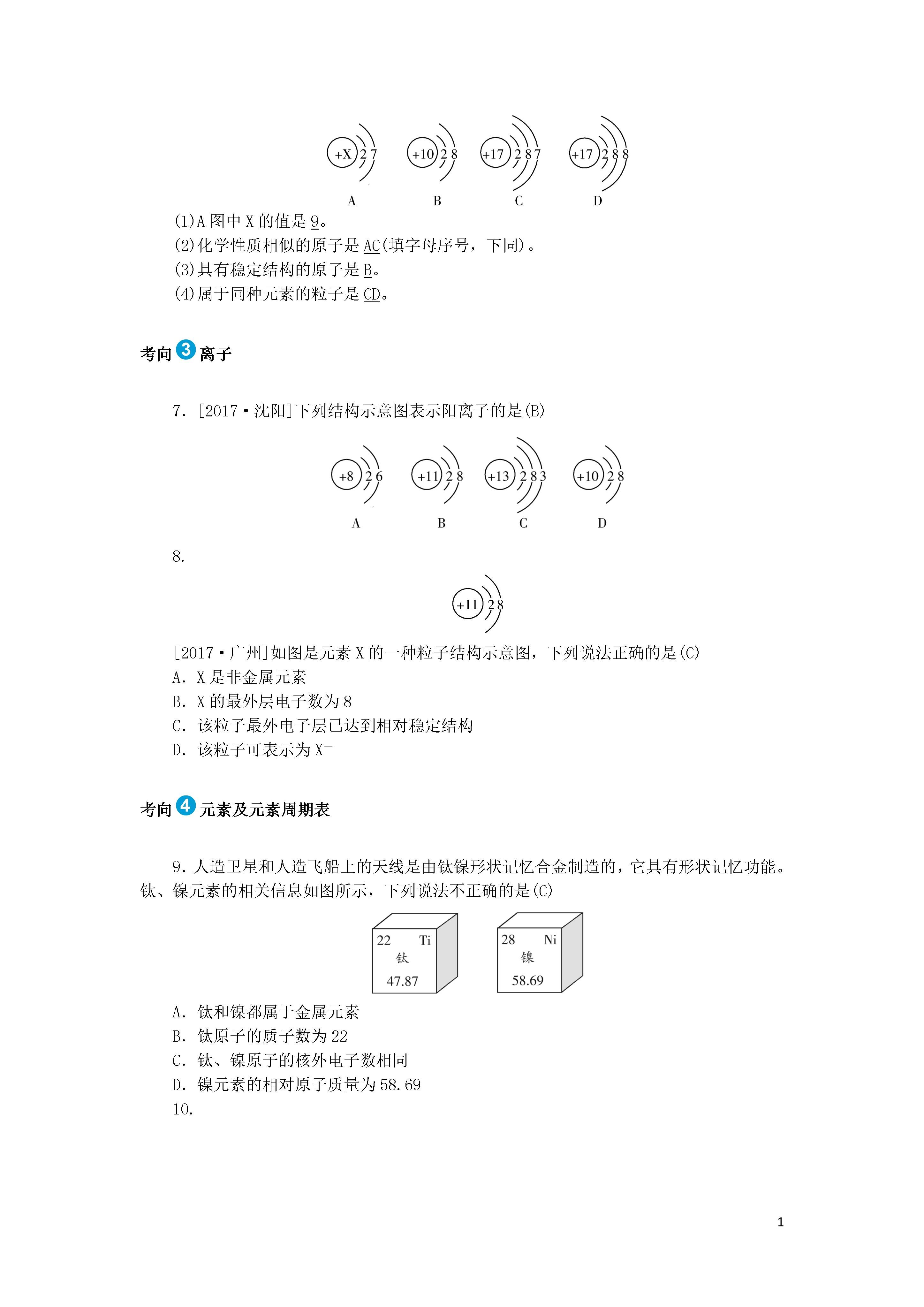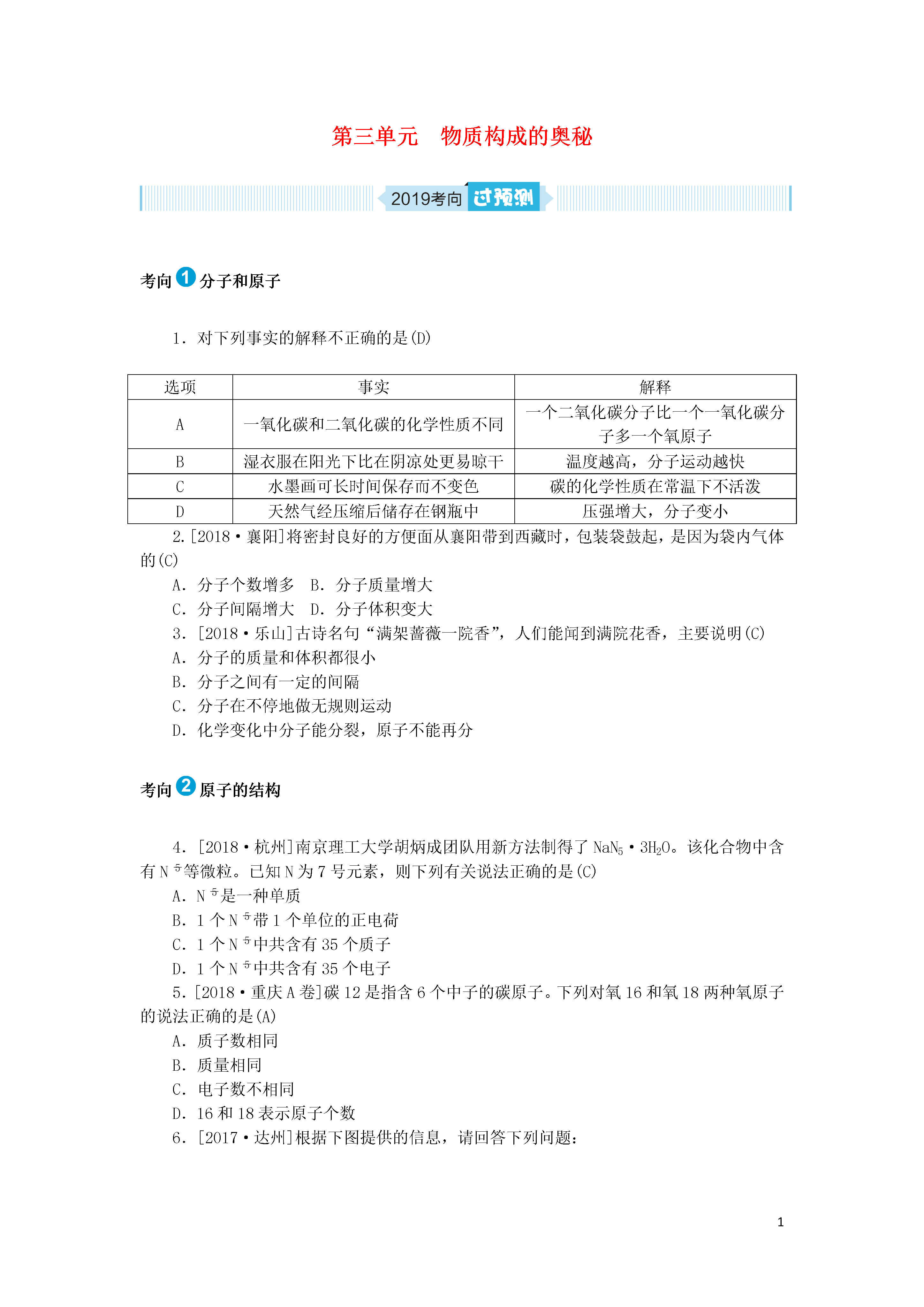 1第三单元物质构成的奥秘考向分子和原子1.对下列事实的解释不正确的是(D)选项事实解释A一氧化碳和二氧化碳的化学性质不同一个二氧化碳分子比一个一氧化碳分子多一个氧原子B湿衣服在阳光下比在阴凉处更易晾干温度越高,分子运动越快C水墨画可长时间保存而不变色碳的化学性质在常温下不活泼D天然气经压缩后储存在钢瓶中压强增大,分子变小2.[2018·襄阳]将密封良好的方便面从襄阳带到西藏时,包装袋鼓起,是因为袋内气体的(C)A.分子个数增多B.分子质量增大C.分子间隔增大D.分子体积变大3.[2018·乐山]古诗名句“满架蔷薇一院香”,人们能闻到满院花香,主要说明(C)A.分子的质量和体积都很小B.分子之间有一定的间隔C.分子在不停地做无规则运动D.化学变化中分子能分裂,原子不能再分考向原子的结构4.[2018·杭州]南京理工大学胡炳成团队用新方法制得了NaN5·3H2O。该化合物中含有Neq\o\al(-,5)等微粒。已知N为7号元素,则下列有关说法正确的是(C)A.Neq\o\al(-,5)是一种单质B.1个Neq\o\al(-,5)带1个单位的正电荷C.1个Neq\o\al(-,5)中共含有35个质子D.1个Neq\o\al(-,5)中共含有35个电子5.[2018·重庆A卷]碳12是指含6个中子的碳原子。下列对氧16和氧18两种氧原子的说法正确的是(A)A.质子数相同B.质量相同C.电子数不相同D.16和18表示原子个数6.[2017·达州]根据下图提供的信息,请回答下列问题:(1)A图中X的值是9。(2)化学性质相似的原子是AC(填字母序号,下同)。(3)具有稳定结构的原子是B。(4)属于同种元素的粒子是CD。考向离子7.[2017·沈阳]下列结构示意图表示阳离子的是(B)8.[2017·广州]如图是元素X的一种粒子结构示意图,下列说法正确的是(C)A.X是非金属元素B.X的最外层电子数为8C.该粒子最外电子层已达到相对稳定结构D.该粒子可表示为X-考向元素及元素周期表9.人造卫星和人造飞船上的天线是由钛镍形状记忆合金制造的,它具有形状记忆功能。钛、镍元素的相关信息如图所示,下列说法不正确的是(C)A.钛和镍都属于金属元素B.钛原子的质子数为22C.钛、镍原子的核外电子数相同D.镍元素的相对原子质量为58.6910.汽车尾气处理中使用了含钯催化剂,钯元素在元素周期表中的部分信息如图所示。下列有关钯的说法错误的是(D)A.元素符号为PdB.核外电子数为46C.属于金属元素D.相对原子质量为106.4g11.[2018·兰州]元素周期表中锌元素的某些信息如图所示。下列有关锌的说法错误的是(C)A.锌原子核外有30个电子B.锌是金属元素C.锌的相对原子质量为65.38gD.缺锌可能引起食欲不振,生长迟缓,发育不良12.[2018·河南]下列各组元素中,元素符号的第一个字母不相同的一组是(A)A.锰、钛B.氩、金C.铅、铂D.氦、汞