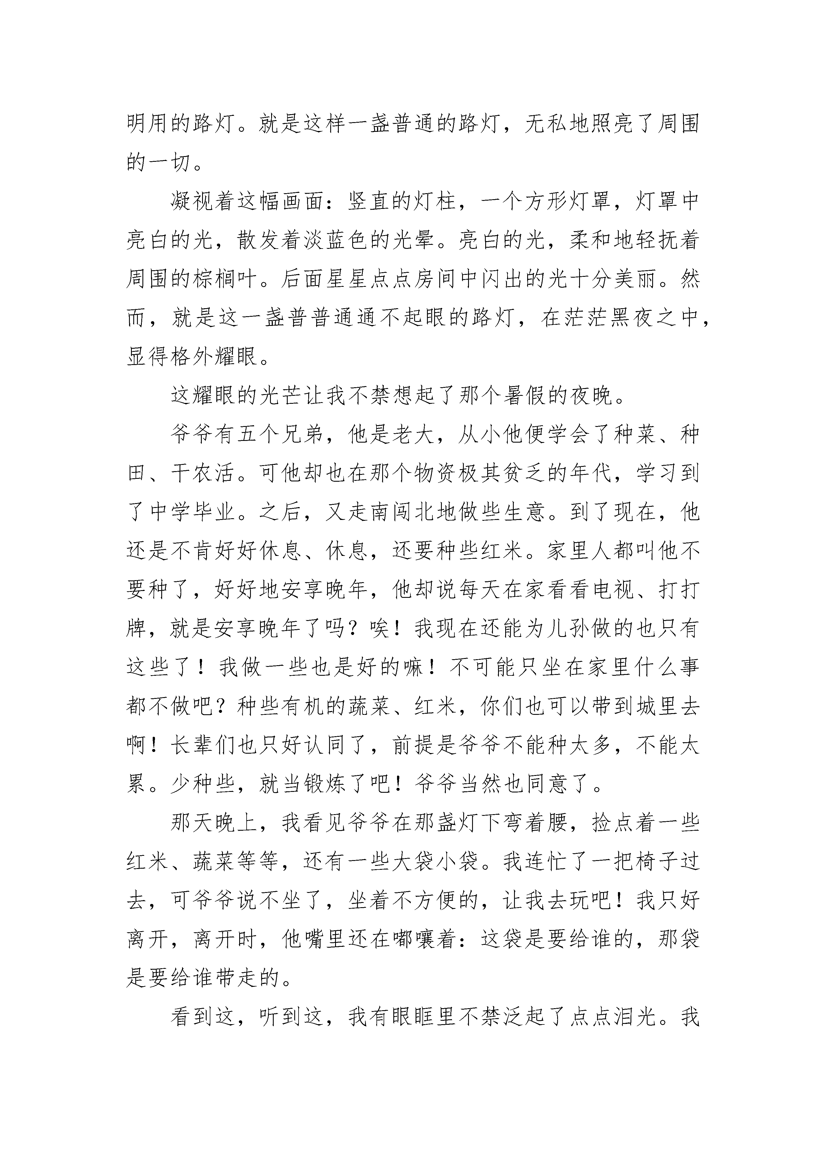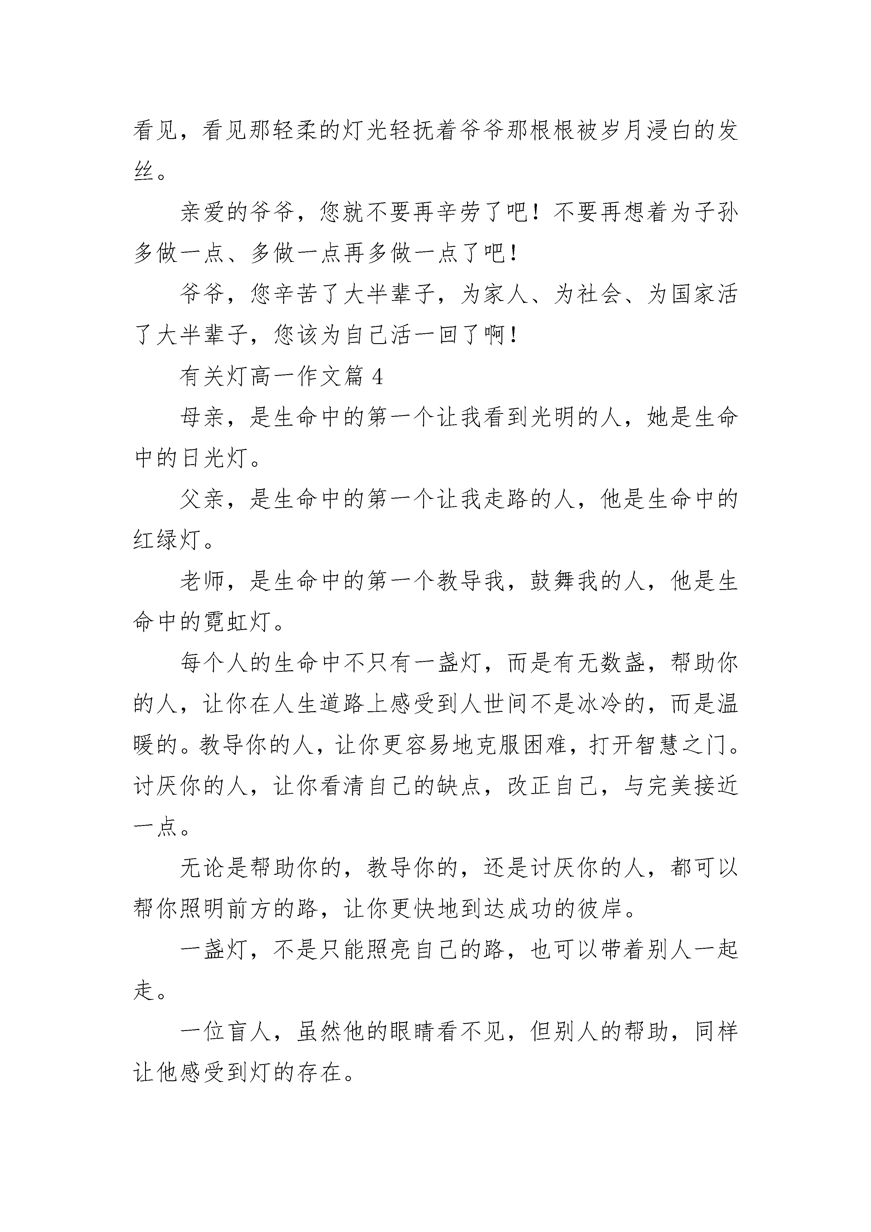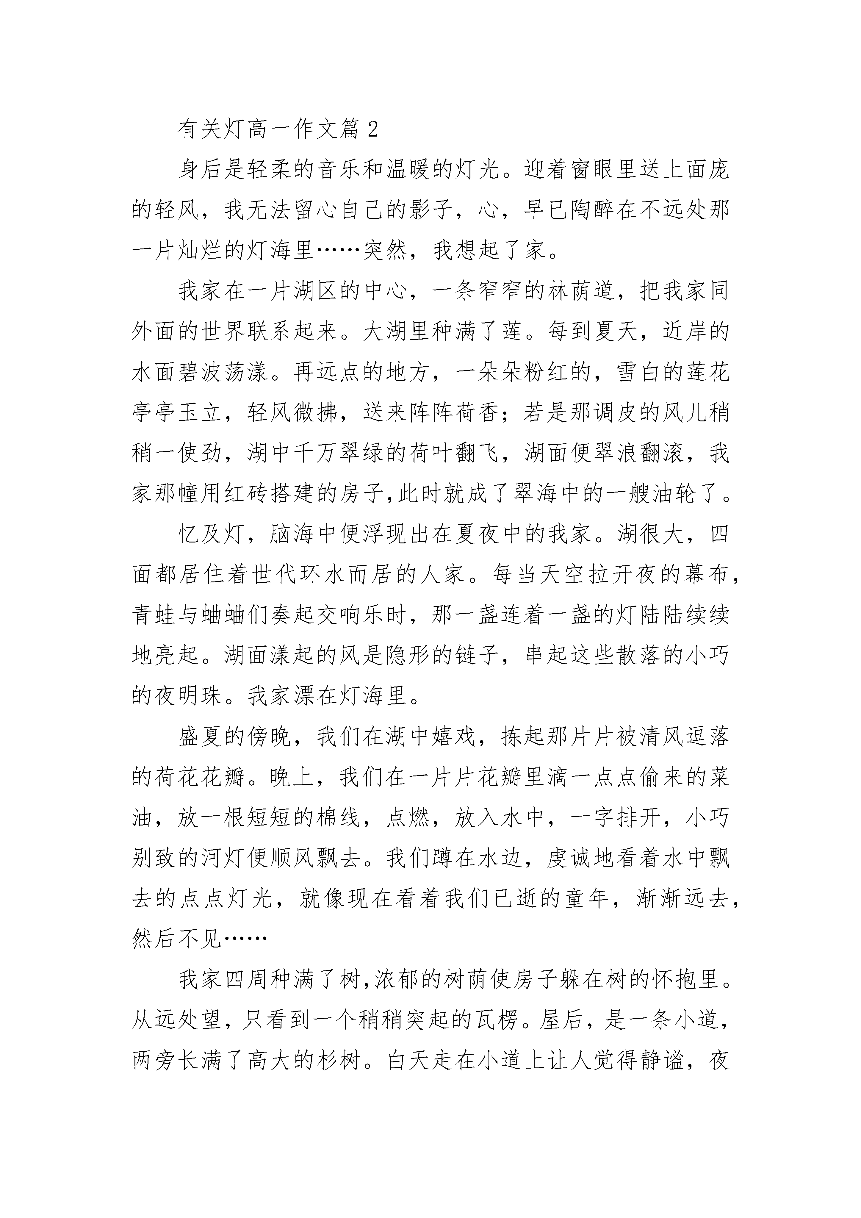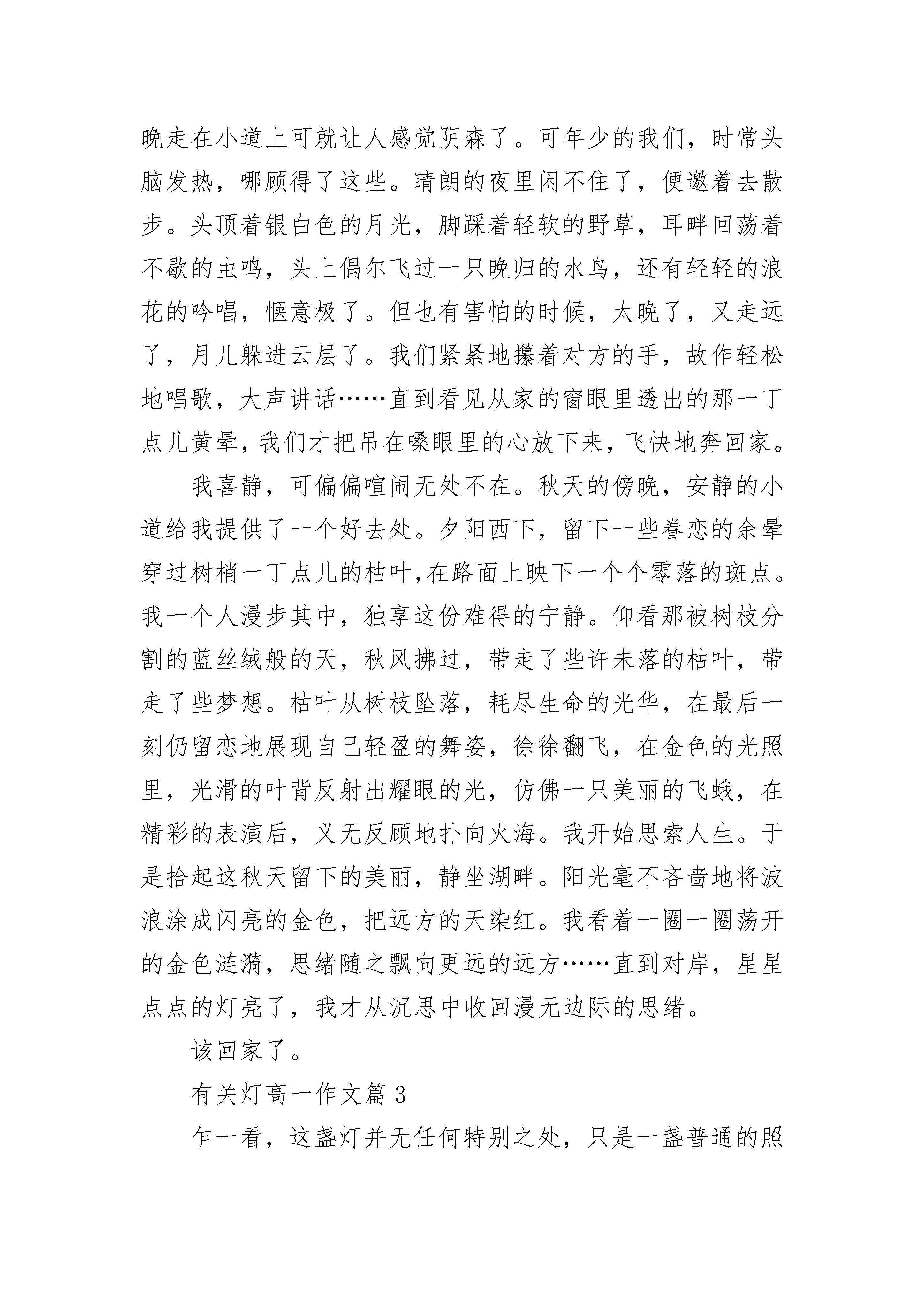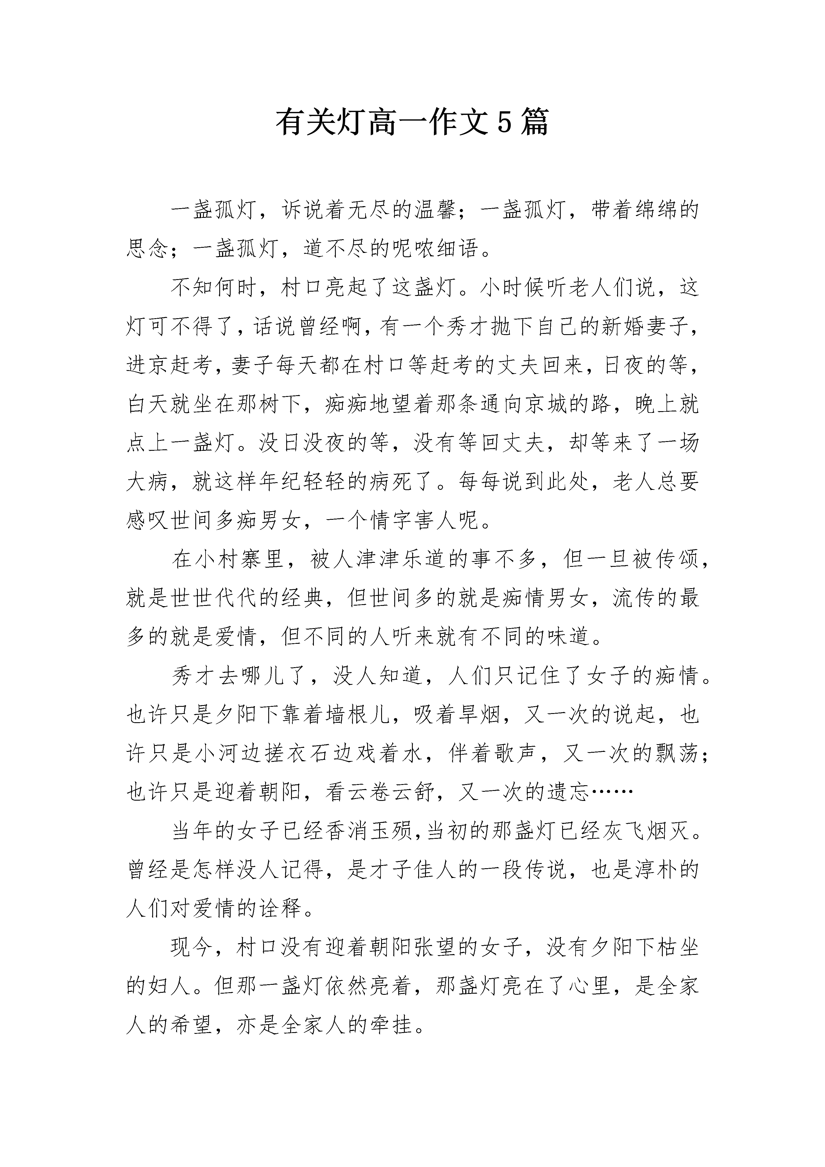 有关灯高一作文5篇一盏孤灯,诉说着无尽的温馨;一盏孤灯,带着绵绵的思念;一盏孤灯,道不尽的呢哝细语。不知何时,村口亮起了这盏灯。小时候听老人们说,这灯可不得了,话说曾经啊,有一个秀才抛下自己的新婚妻子,进京赶考,妻子每天都在村口等赶考的丈夫回来,日夜的等,白天就坐在那树下,痴痴地望着那条通向京城的路,晚上就点上一盏灯。没日没夜的等,没有等回丈夫,却等来了一场大病,就这样年纪轻轻的病死了。每每说到此处,老人总要感叹世间多痴男女,一个情字害人呢。在小村寨里,被人津津乐道的事不多,但一旦被传颂,就是世世代代的经典,但世间多的就是痴情男女,流传的最多的就是爱情,但不同的人听来就有不同的味道。秀才去哪儿了,没人知道,人们只记住了女子的痴情。也许只是夕阳下靠着墙根儿,吸着旱烟,又一次的说起,也许只是小河边搓衣石边戏着水,伴着歌声,又一次的飘荡;也许只是迎着朝阳,看云卷云舒,又一次的遗忘……当年的女子已经香消玉殒,当初的那盏灯已经灰飞烟灭。曾经是怎样没人记得,是才子佳人的一段传说,也是淳朴的人们对爱情的诠释。现今,村口没有迎着朝阳张望的女子,没有夕阳下枯坐的妇人。但那一盏灯依然亮着,那盏灯亮在了心里,是全家人的希望,亦是全家人的牵挂。有关灯高一作文篇2身后是轻柔的音乐和温暖的灯光。迎着窗眼里送上面庞的轻风,我无法留心自己的影子,心,早已陶醉在不远处那一片灿烂的灯海里……突然,我想起了家。我家在一片湖区的中心,一条窄窄的林荫道,把我家同外面的世界联系起来。大湖里种满了莲。每到夏天,近岸的水面碧波荡漾。再远点的地方,一朵朵粉红的,雪白的莲花亭亭玉立,轻风微拂,送来阵阵荷香;若是那调皮的风儿稍稍一使劲,湖中千万翠绿的荷叶翻飞,湖面便翠浪翻滚,我家那幢用红砖搭建的房子,此时就成了翠海中的一艘油轮了。忆及灯,脑海中便浮现出在夏夜中的我家。湖很大,四面都居住着世代环水而居的人家。每当天空拉开夜的幕布,青蛙与蛐蛐们奏起交响乐时,那一盏连着一盏的灯陆陆续续地亮起。湖面漾起的风是隐形的链子,串起这些散落的小巧的夜明珠。我家漂在灯海里。盛夏的傍晚,我们在湖中嬉戏,拣起那片片被清风逗落的荷花花瓣。晚上,我们在一片片花瓣里滴一点点偷来的菜油,放一根短短的棉线,点燃,放入水中,一字排开,小巧别致的河灯便顺风飘去。我们蹲在水边,虔诚地看着水中飘去的点点灯光,就像现在看着我们已逝的童年,渐渐远去,然后不见……我家四周种满了树,浓郁的树荫使房子躲在树的怀抱里。从远处望,只看到一个稍稍突起的瓦楞。屋后,是一条小道,两旁长满了高大的杉树。白天走在小道上让人觉得静谧,夜晚走在小道上可就让人感觉阴森了。可年少的我们,时常头脑发热,哪顾得了这些。睛朗的夜里闲不住了,便邀着去散步。头顶着银白色的月光,脚踩着轻软的野草,耳畔回荡着不歇的虫鸣,头上偶尔飞过一只晚归的水鸟,还有轻轻的浪花的吟唱,惬意极了。但也有害怕的时候,太晚了,又走远了,月儿躲进云层了。我们紧紧地攥着对方的手,故作轻松地唱歌,大声讲话……直到看见从家的窗眼里透出的那一丁点儿黄晕,我们才把吊在嗓眼里的心放下来,飞快地奔回家。我喜静,可偏偏喧闹无处不在。秋天的傍晚,安静的小道给我提供了一个好去处。夕阳西下,留下一些眷恋的余晕穿过树梢一丁点儿的枯叶,在路面上映下一个个零落的斑点。我一个人漫步其中,独享这份难得的宁静。仰看那被树枝分割的蓝丝绒般的天,秋风拂过,带走了些许未落的枯叶,带走了些梦想。枯叶从树枝坠落,耗尽生命的光华,在最后一刻仍留恋地展现自己轻盈的舞姿,徐徐翻飞,在金色的光照里,光滑的叶背反射出耀眼的光,仿佛一只美丽的飞蛾,在精彩的表演后,义无反顾地扑向火海。我开始思索人生。于是拾起这秋天留下的美丽,静坐湖畔。阳光毫不吝啬地将波浪涂成闪亮的金色,把远方的天染红。我看着一圈一圈荡开的金色涟漪,思绪随之飘向更远的远方……直到对岸,星星点点的灯亮了,我才从沉思中收回漫无边际的思绪。该回家了。有关灯高一作文篇3乍一看,这盏灯并无任何特别之处,只是一盏普通的照明用的路灯。就是这样一盏普通的路灯,无私地照亮了周围的一切。凝视着这幅画面:竖直的灯柱,一个方形灯罩,灯罩中亮白的光,散发着淡蓝色的光晕。亮白的光,柔和地轻抚着周围的棕榈叶。后面星星点点房间中闪出的光十分美丽。然而,就是这一盏普普通通不起眼的路灯,在茫茫黑夜之中,显得格外耀眼。这耀眼的光芒让我不禁想起了那个暑假的夜晚。爷爷有五个兄弟,他是老大,从小他便学会了种菜、种田、干农活。可他却也在那个物资极其贫乏的年代,学习到了中学毕业。之后,又走南闯北地做些生意。到了现在,他还是不肯好好休息、休息,还要种些红米。家里人都叫他不要种了,好好地安享晚年,他却说每天在家看看电视、打打牌,就是安享晚年了吗?唉!我现在还能为儿孙做的也只有这些了!我做一些也是好的嘛!不可能只坐在家里什么事