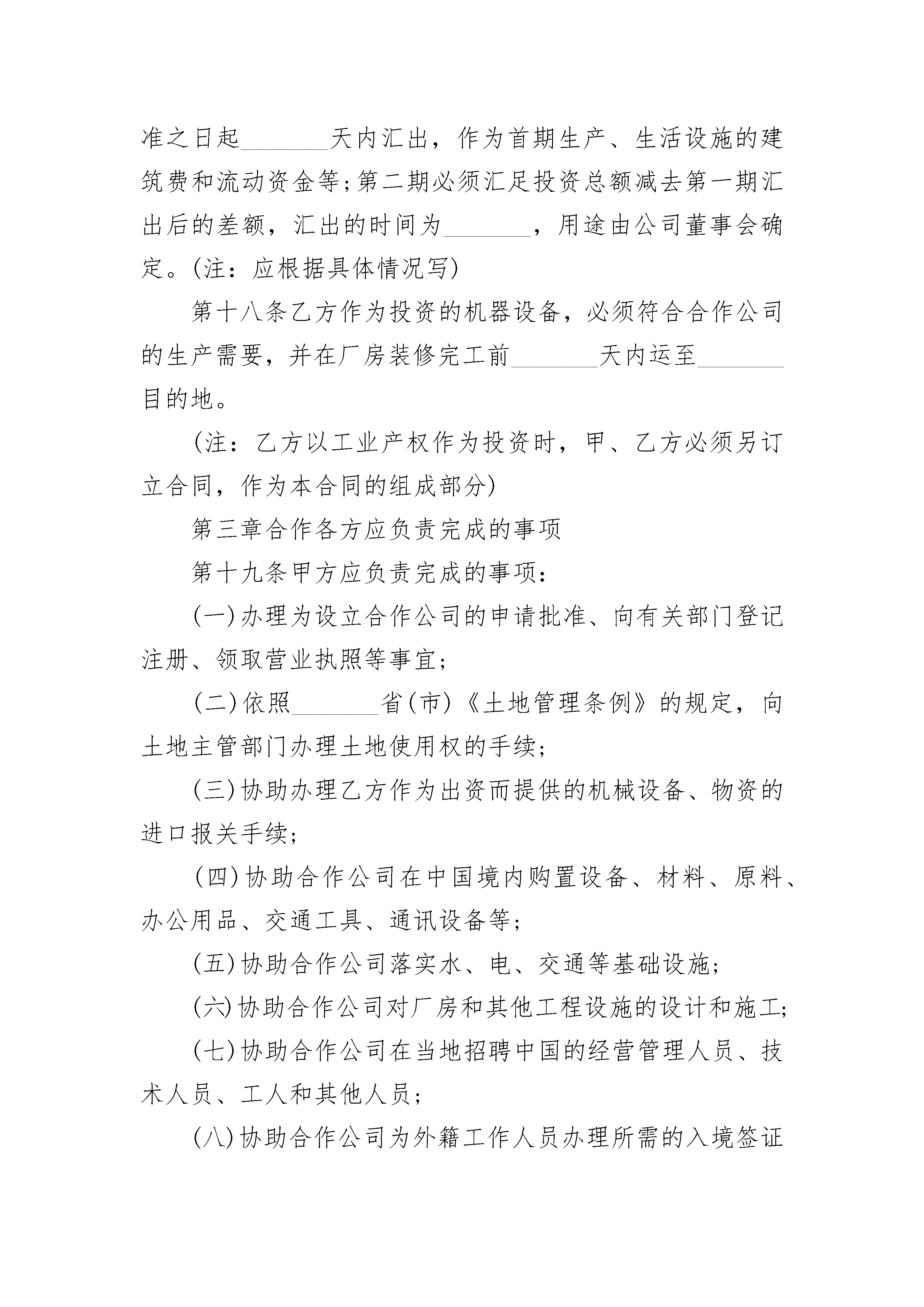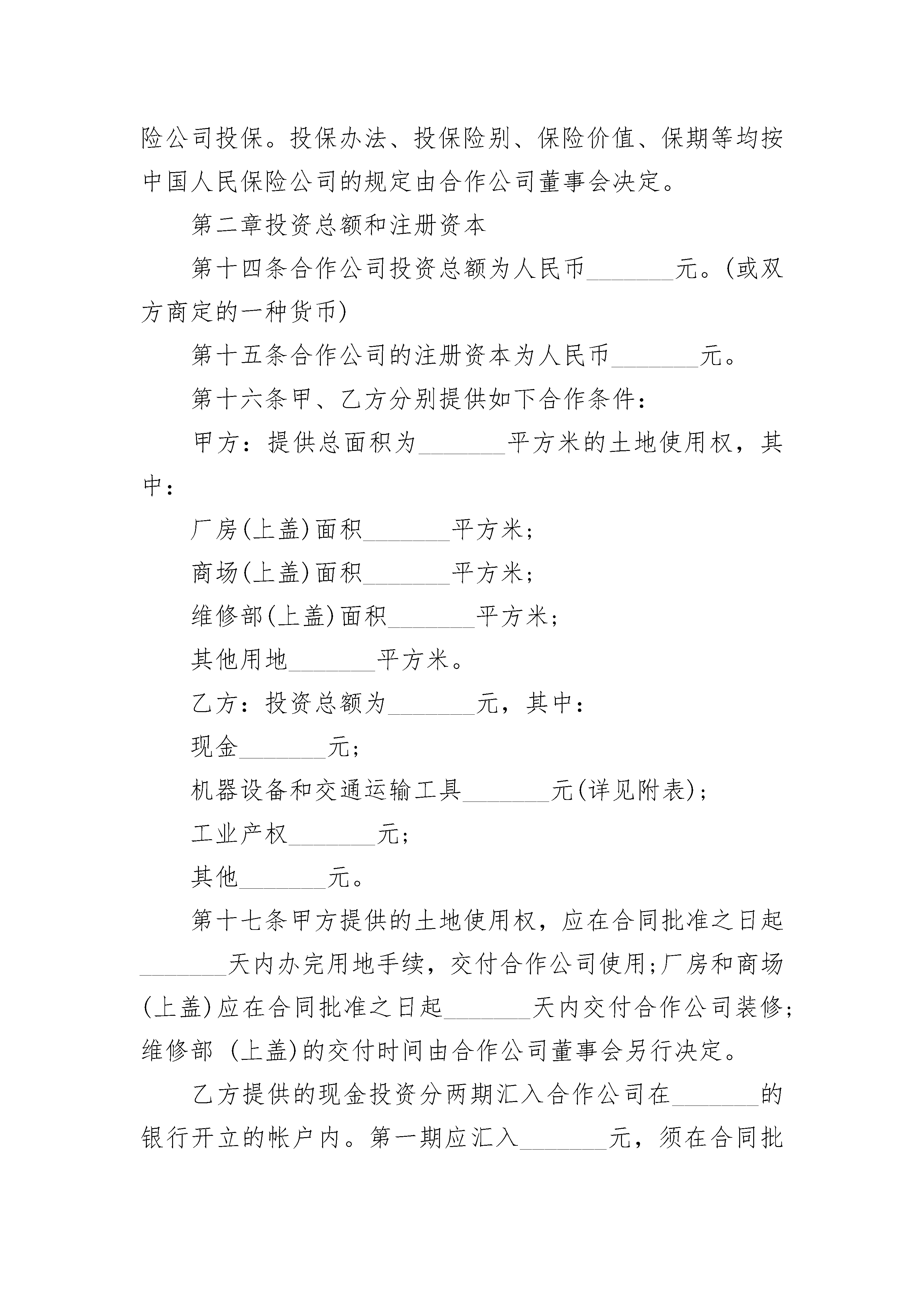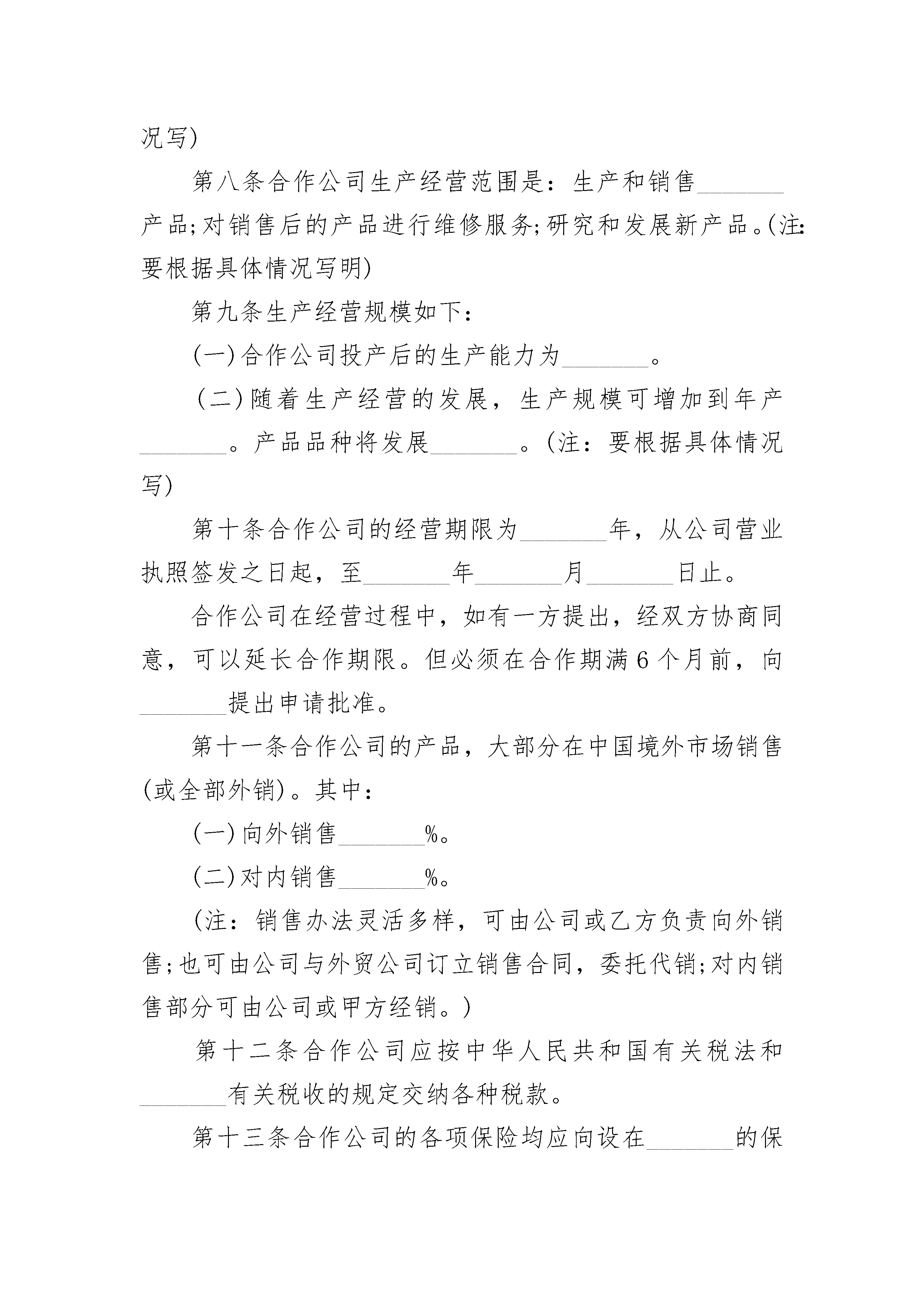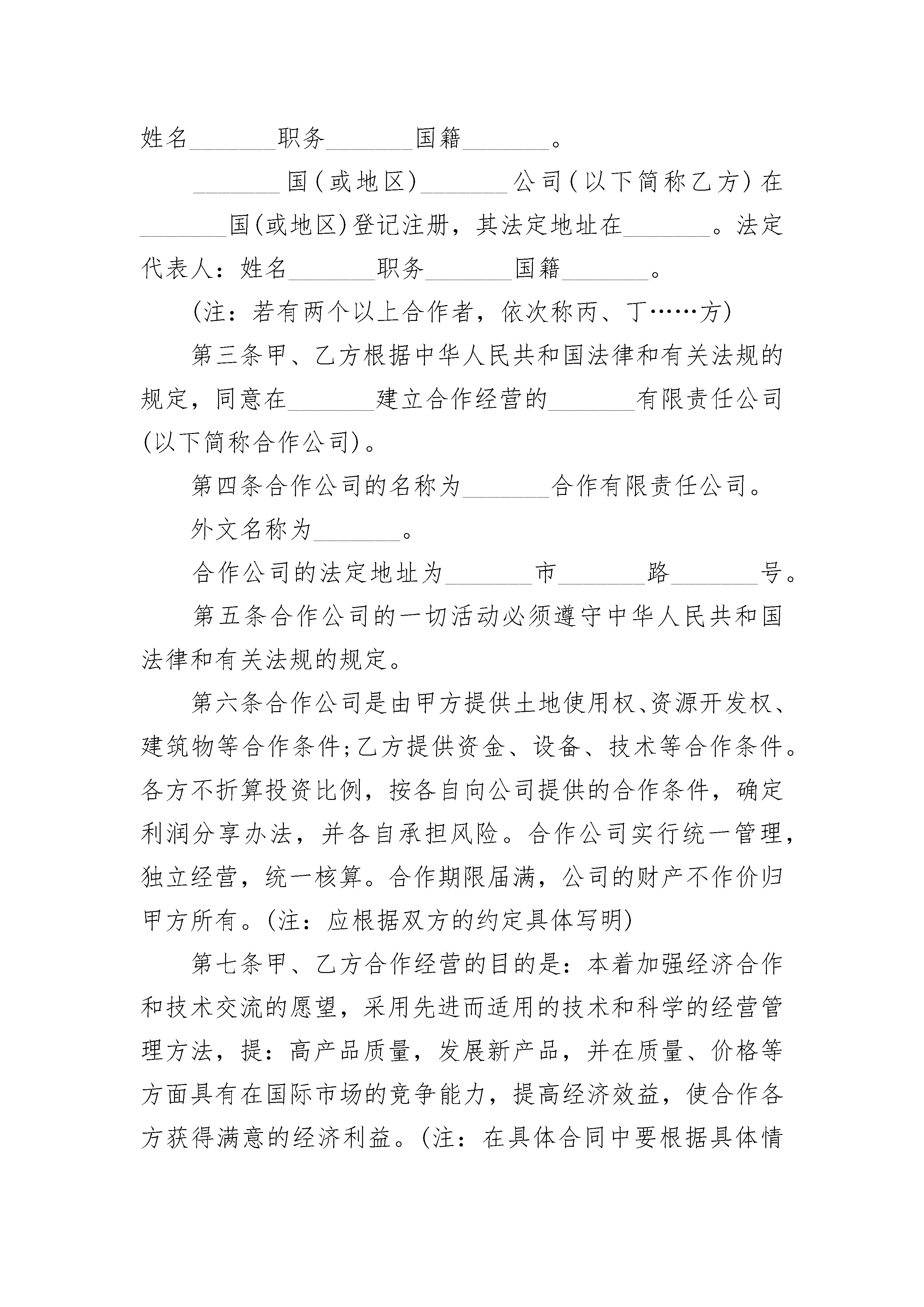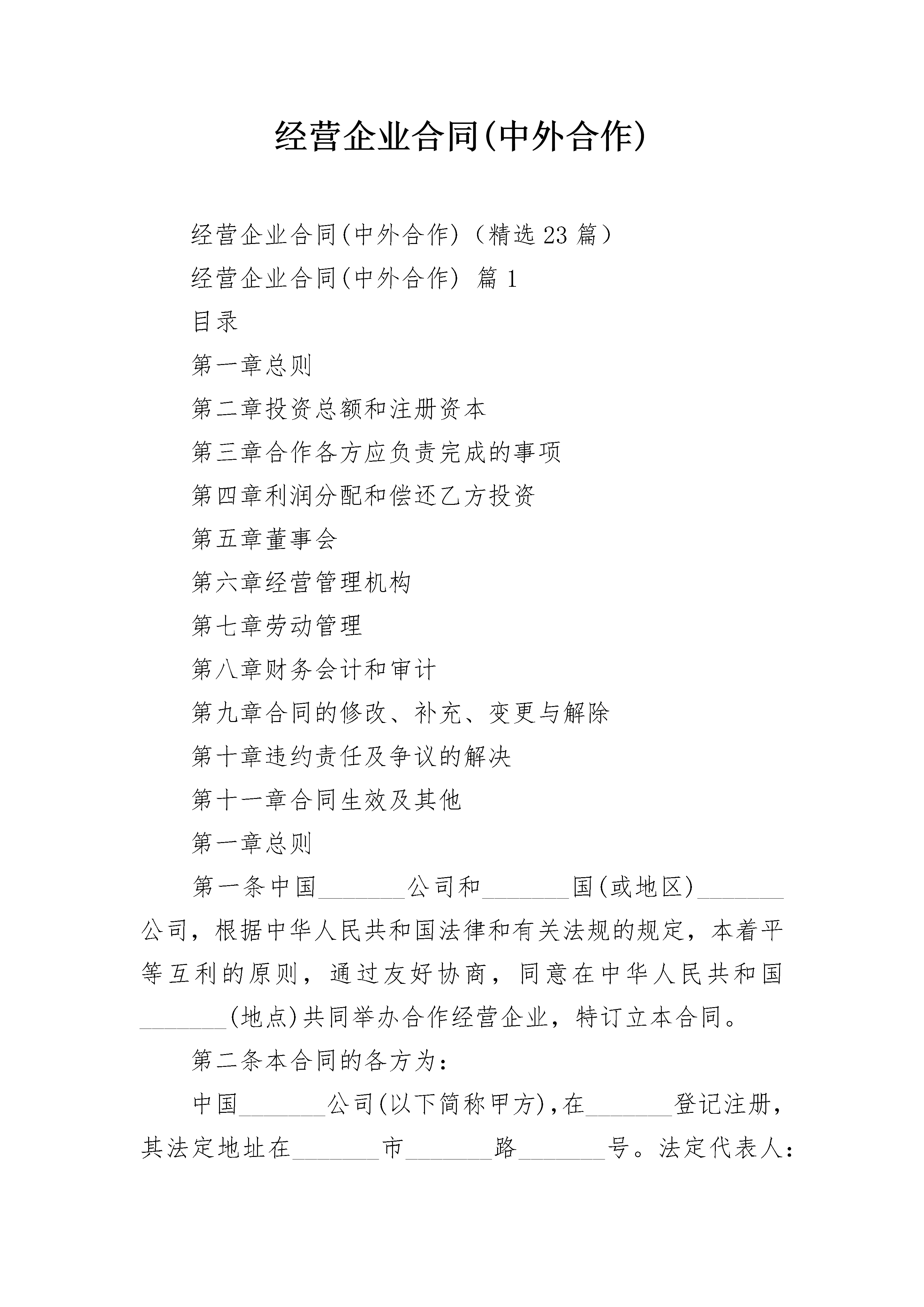 经营企业合同(中外合作)经营企业合同(中外合作)(精选23篇)经营企业合同(中外合作)篇1目录第一章总则第二章投资总额和注册资本第三章合作各方应负责完成的事项第四章利润分配和偿还乙方投资第五章董事会第六章经营管理机构第七章劳动管理第八章财务会计和审计第九章合同的修改、补充、变更与解除第十章违约责任及争议的解决第十一章合同生效及其他第一章总则第一条中国_______公司和_______国(或地区)_______公司,根据中华人民共和国法律和有关法规的规定,本着平等互利的原则,通过友好协商,同意在中华人民共和国_______(地点)共同举办合作经营企业,特订立本合同。第二条本合同的各方为:中国_______公司(以下简称甲方),在_______登记注册,其法定地址在_______市_______路_______号。法定代表人:姓名_______职务_______国籍_______。_______国(或地区)_______公司(以下简称乙方)在_______国(或地区)登记注册,其法定地址在_______。法定代表人:姓名_______职务_______国籍_______。(注:若有两个以上合作者,依次称丙、丁……方)第三条甲、乙方根据中华人民共和国法律和有关法规的规定,同意在_______建立合作经营的_______有限责任公司(以下简称合作公司)。第四条合作公司的名称为_______合作有限责任公司。外文名称为_______。合作公司的法定地址为_______市_______路_______号。第五条合作公司的一切活动必须遵守中华人民共和国法律和有关法规的规定。第六条合作公司是由甲方提供土地使用权、资源开发权、建筑物等合作条件;乙方提供资金、设备、技术等合作条件。各方不折算投资比例,按各自向公司提供的合作条件,确定利润分享办法,并各自承担风险。合作公司实行统一管理,独立经营,统一核算。合作期限届满,公司的财产不作价归甲方所有。(注:应根据双方的约定具体写明)第七条甲、乙方合作经营的目的是:本着加强经济合作和技术交流的愿望,采用先进而适用的技术和科学的经营管理方法,提:高产品质量,发展新产品,并在质量、价格等方面具有在国际市场的竞争能力,提高经济效益,使合作各方获得满意的经济利益。(注:在具体合同中要根据具体情况写)第八条合作公司生产经营范围是:生产和销售_______产品;对销售后的产品进行维修服务;研究和发展新产品。(注:要根据具体情况写明)第九条生产经营规模如下:(一)合作公司投产后的生产能力为_______。(二)随着生产经营的发展,生产规模可增加到年产_______。产品品种将发展_______。(注:要根据具体情况写)第十条合作公司的经营期限为_______年,从公司营业执照签发之日起,至_______年_______月_______日止。合作公司在经营过程中,如有一方提出,经双方协商同意,可以延长合作期限。但必须在合作期满6个月前,向_______提出申请批准。第十一条合作公司的产品,大部分在中国境外市场销售(或全部外销)。其中:(一)向外销售_______%。(二)对内销售_______%。(注:销售办法灵活多样,可由公司或乙方负责向外销售;也可由公司与外贸公司订立销售合同,委托代销;对内销售部分可由公司或甲方经销。)第十二条合作公司应按中华人民共和国有关税法和_______有关税收的规定交纳各种税款。第十三条合作公司的各项保险均应向设在_______的保险公司投保。投保办法、投保险别、保险价值、保期等均按中国人民保险公司的规定由合作公司董事会决定。第二章投资总额和注册资本第十四条合作公司投资总额为人民币_______元。(或双方商定的一种货币)第十五条合作公司的注册资本为人民币_______元。第十六条甲、乙方分别提供如下合作条件:甲方:提供总面积为_______平方米的土地使用权,其中:厂房(上盖)面积_______平方米;商场(上盖)面积_______平方米;维修部(上盖)面积_______平方米;其他用地_______平方米。乙方:投资总额为_______元,其中:现金_______元;机器设备和交通运输工具_______元(详见附表);工业产权_______元;其他_______元。第十七条甲方提供的土地使用权,应在合同批准之日起_______天内办完用地手续,交付合作公司使用;厂房和商场(上盖)应在合同批准之日起_______天内交付合作公司装修;维修部(上盖)的交付时间由合作公司董事会另行决定。乙方提供的现金投资分两期汇入合作公司在_______的银行开立的帐户内。第一期应汇入_______元,须在合同批准之日起_______天内汇出,作为首期生产、生活设施的建筑费和流动资金等;第二期必须汇足投资