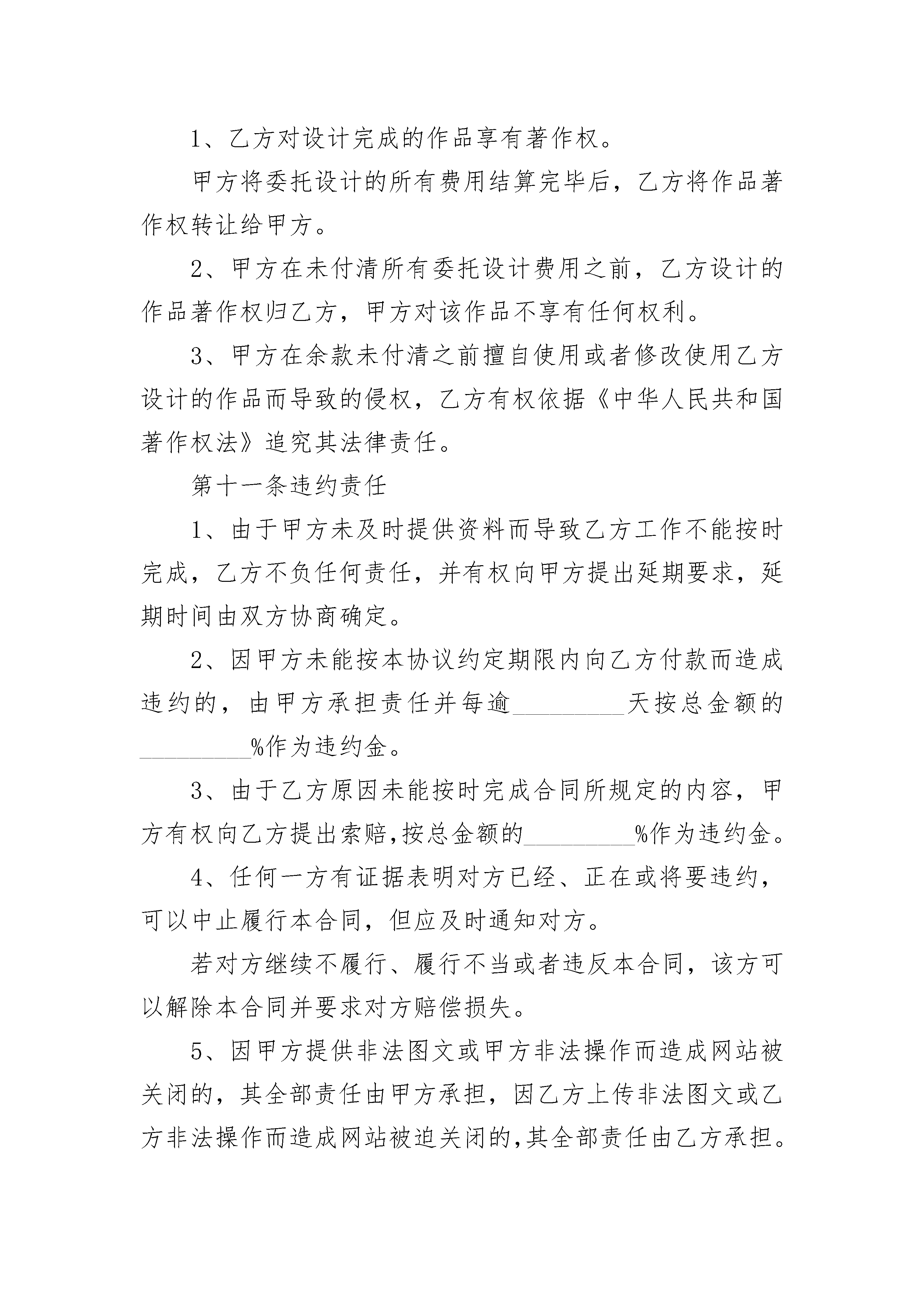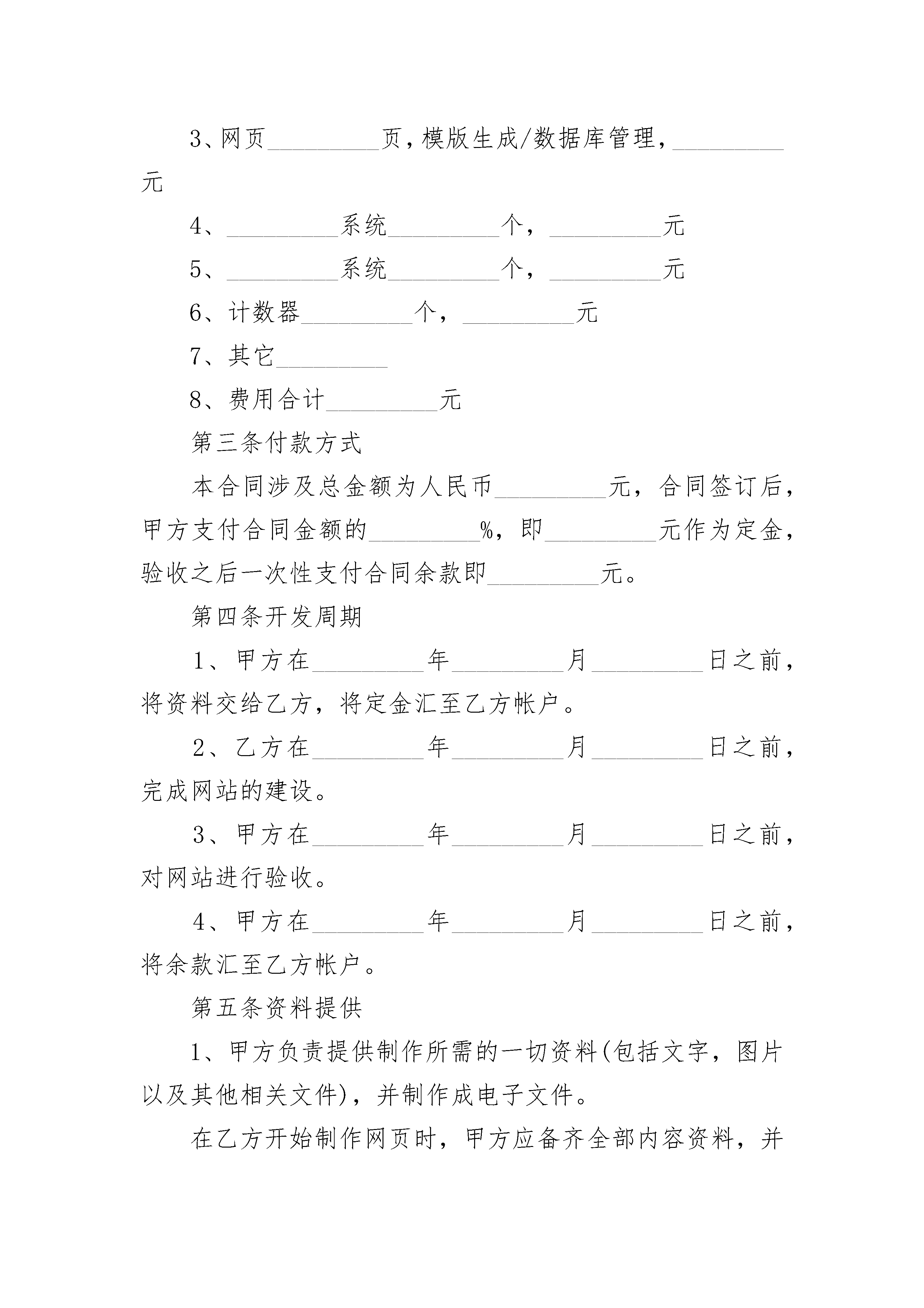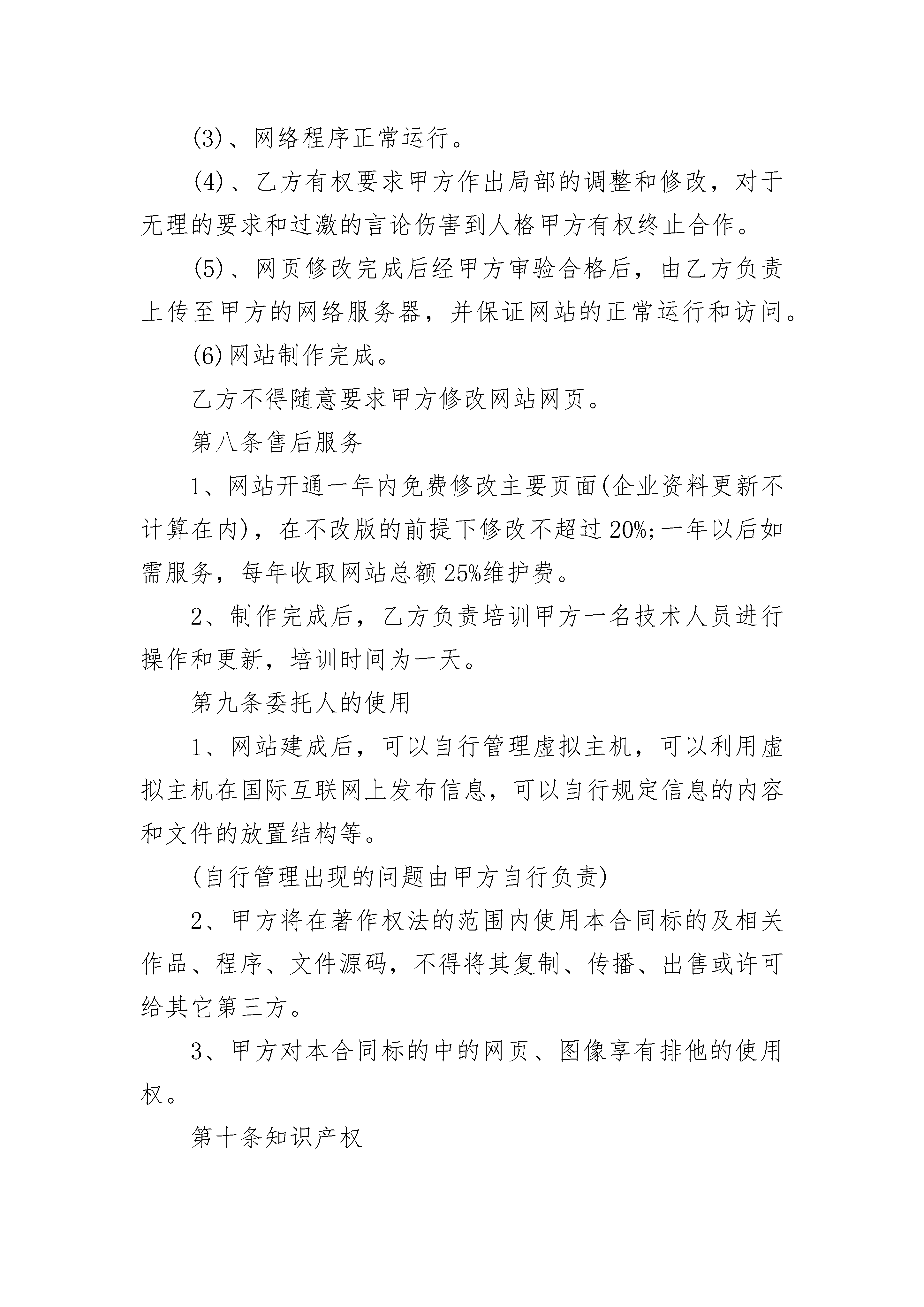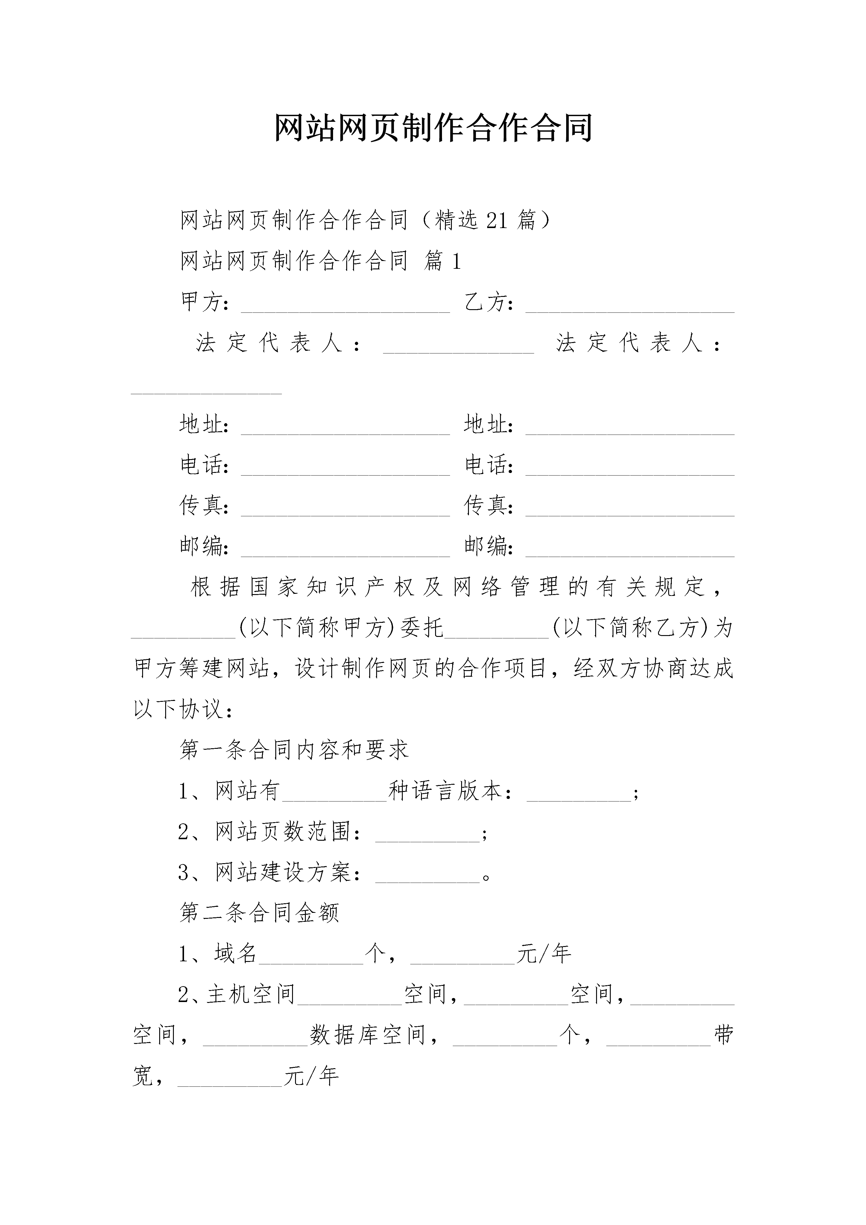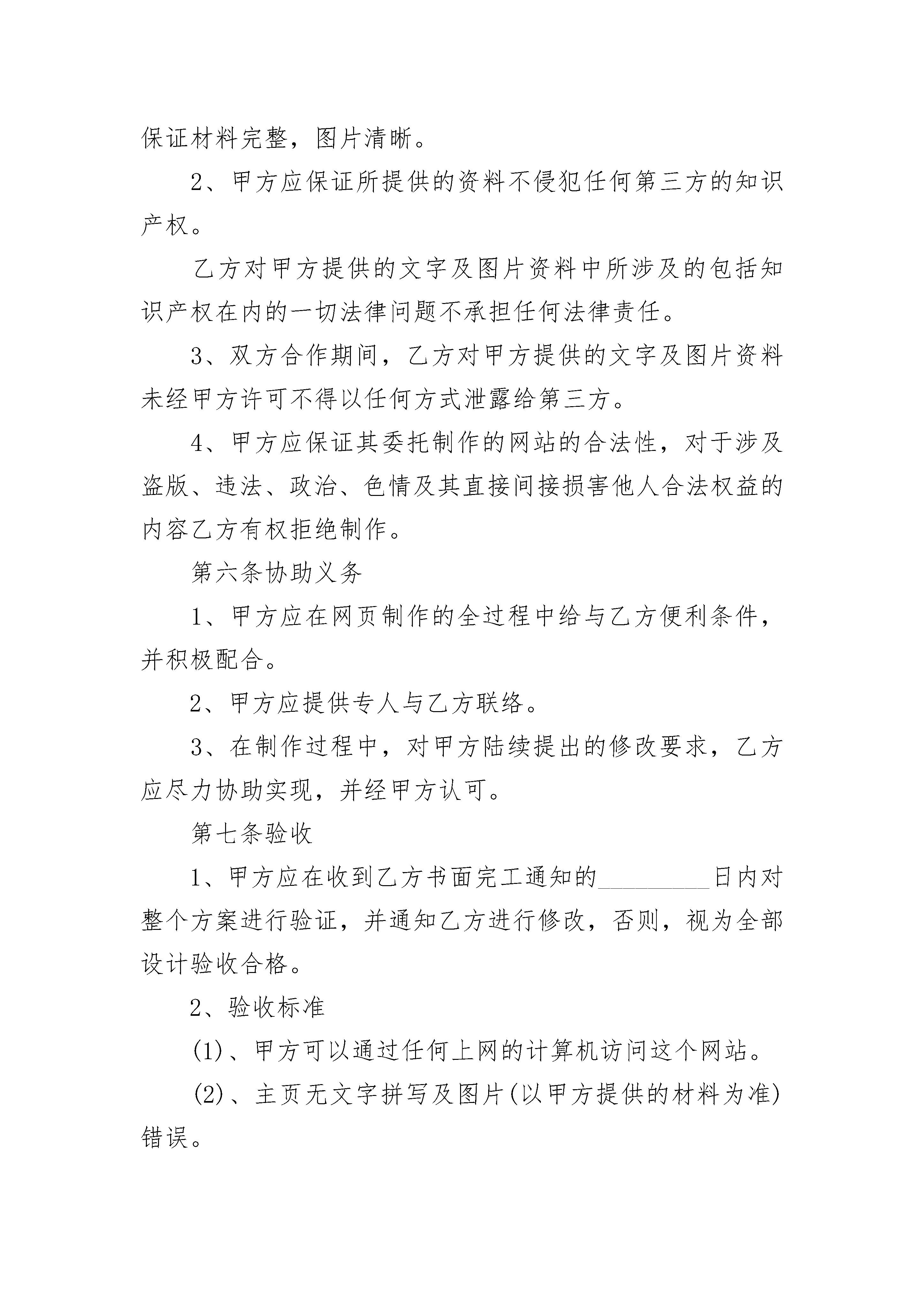 网站网页制作合作合同网站网页制作合作合同(精选21篇)网站网页制作合作合同篇1甲方:__________________乙方:__________________法定代表人:_____________法定代表人:_____________地址:__________________地址:__________________电话:__________________电话:__________________传真:__________________传真:__________________邮编:__________________邮编:__________________根据国家知识产权及网络管理的有关规定,_________(以下简称甲方)委托_________(以下简称乙方)为甲方筹建网站,设计制作网页的合作项目,经双方协商达成以下协议:第一条合同内容和要求1、网站有_________种语言版本:_________;2、网站页数范围:_________;3、网站建设方案:_________。第二条合同金额1、域名_________个,_________元/年2、主机空间_________空间,_________空间,_________空间,_________数据库空间,_________个,_________带宽,_________元/年3、网页_________页,模版生成/数据库管理,_________元4、_________系统_________个,_________元5、_________系统_________个,_________元6、计数器_________个,_________元7、其它_________8、费用合计_________元第三条付款方式本合同涉及总金额为人民币_________元,合同签订后,甲方支付合同金额的_________%,即_________元作为定金,验收之后一次性支付合同余款即_________元。第四条开发周期1、甲方在_________年_________月_________日之前,将资料交给乙方,将定金汇至乙方帐户。2、乙方在_________年_________月_________日之前,完成网站的建设。3、甲方在_________年_________月_________日之前,对网站进行验收。4、甲方在_________年_________月_________日之前,将余款汇至乙方帐户。第五条资料提供1、甲方负责提供制作所需的一切资料(包括文字,图片以及其他相关文件),并制作成电子文件。在乙方开始制作网页时,甲方应备齐全部内容资料,并保证材料完整,图片清晰。2、甲方应保证所提供的资料不侵犯任何第三方的知识产权。乙方对甲方提供的文字及图片资料中所涉及的包括知识产权在内的一切法律问题不承担任何法律责任。3、双方合作期间,乙方对甲方提供的文字及图片资料未经甲方许可不得以任何方式泄露给第三方。4、甲方应保证其委托制作的网站的合法性,对于涉及盗版、违法、政治、色情及其直接间接损害他人合法权益的内容乙方有权拒绝制作。第六条协助义务1、甲方应在网页制作的全过程中给与乙方便利条件,并积极配合。2、甲方应提供专人与乙方联络。3、在制作过程中,对甲方陆续提出的修改要求,乙方应尽力协助实现,并经甲方认可。第七条验收1、甲方应在收到乙方书面完工通知的_________日内对整个方案进行验证,并通知乙方进行修改,否则,视为全部设计验收合格。2、验收标准(1)、甲方可以通过任何上网的计算机访问这个网站。(2)、主页无文字拼写及图片(以甲方提供的材料为准)错误。(3)、网络程序正常运行。(4)、乙方有权要求甲方作出局部的调整和修改,对于无理的要求和过激的言论伤害到人格甲方有权终止合作。(5)、网页修改完成后经甲方审验合格后,由乙方负责上传至甲方的网络服务器,并保证网站的正常运行和访问。(6)网站制作完成。乙方不得随意要求甲方修改网站网页。第八条售后服务1、网站开通一年内免费修改主要页面(企业资料更新不计算在内),在不改版的前提下修改不超过20%;一年以后如需服务,每年收取网站总额25%维护费。2、制作完成后,乙方负责培训甲方一名技术人员进行操作和更新,培训时间为一天。第九条委托人的使用1、网站建成后,可以自行管理虚拟主机,可以利用虚拟主机在国际互联网上发布信息,可以自行规定信息的内容和文件的放置结构等。(自行管理出现的问题由甲方自行负责)2、甲方将在著作权法的范围内使用本合同标的及相关作品、程序、文件源码,不得将其复制、传播、出售或许可给其它第三方。3、甲方对本合同标的中的网页、图像享有排他的使用权。第十条知识产权1、乙方对设计完成的作品享有著作权。甲方将委托设计的所有费用结算完毕后,乙方将作品著作权