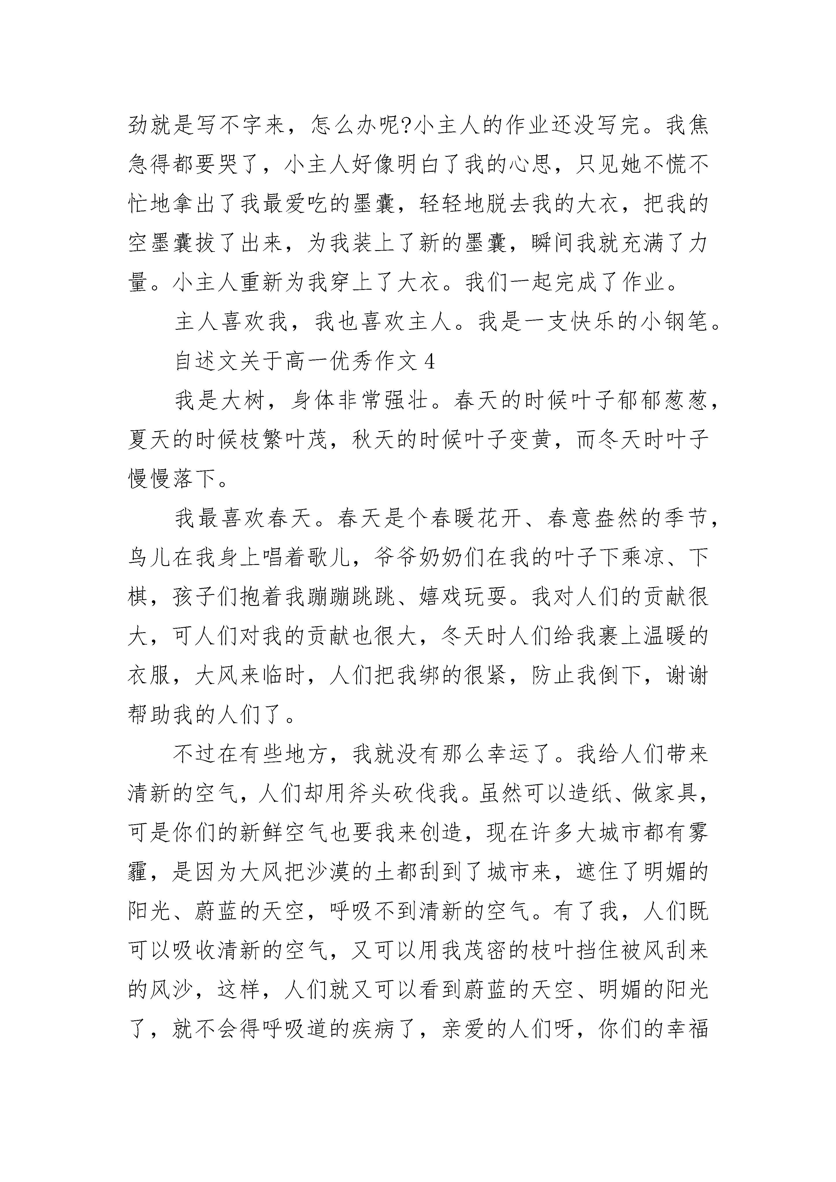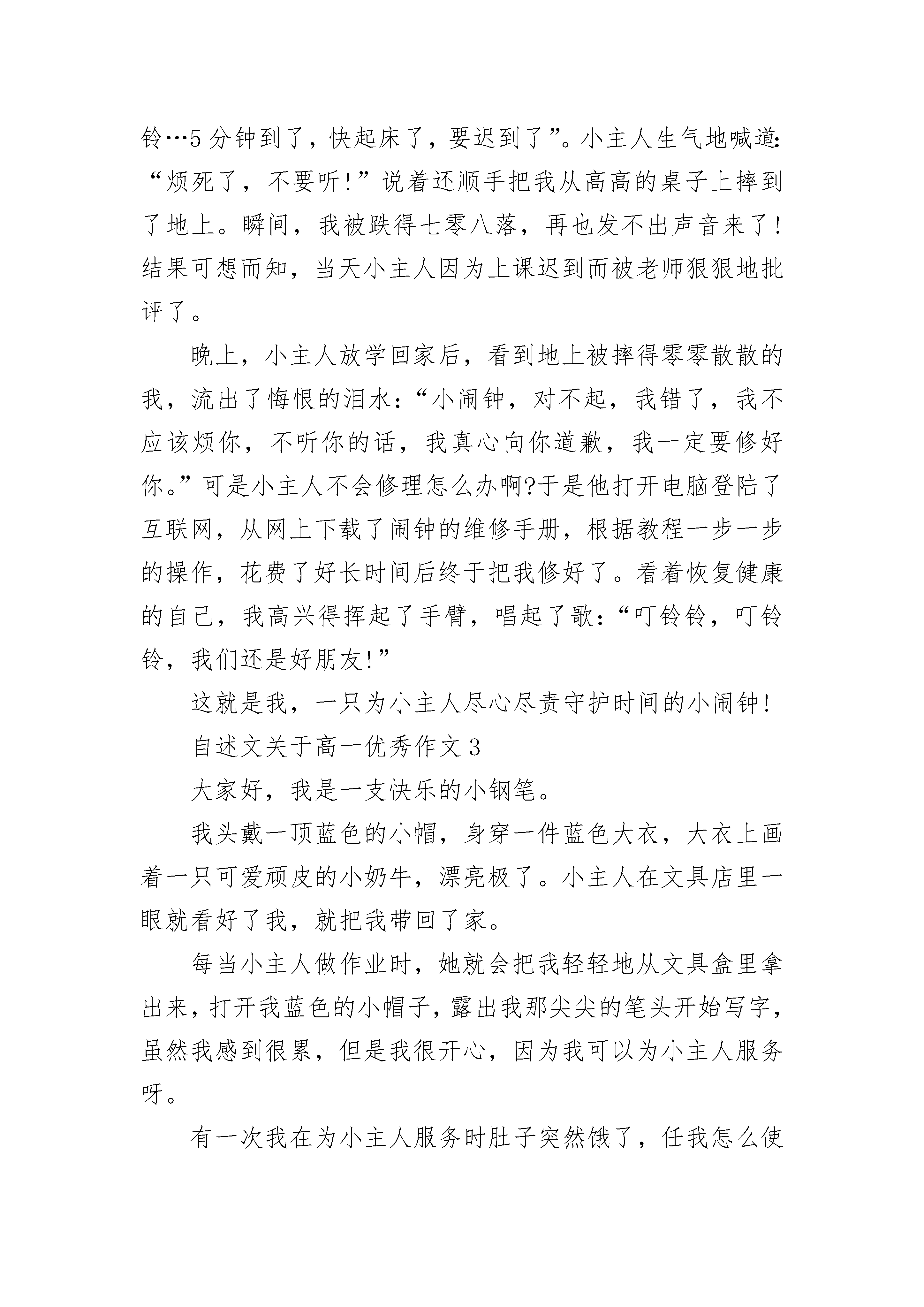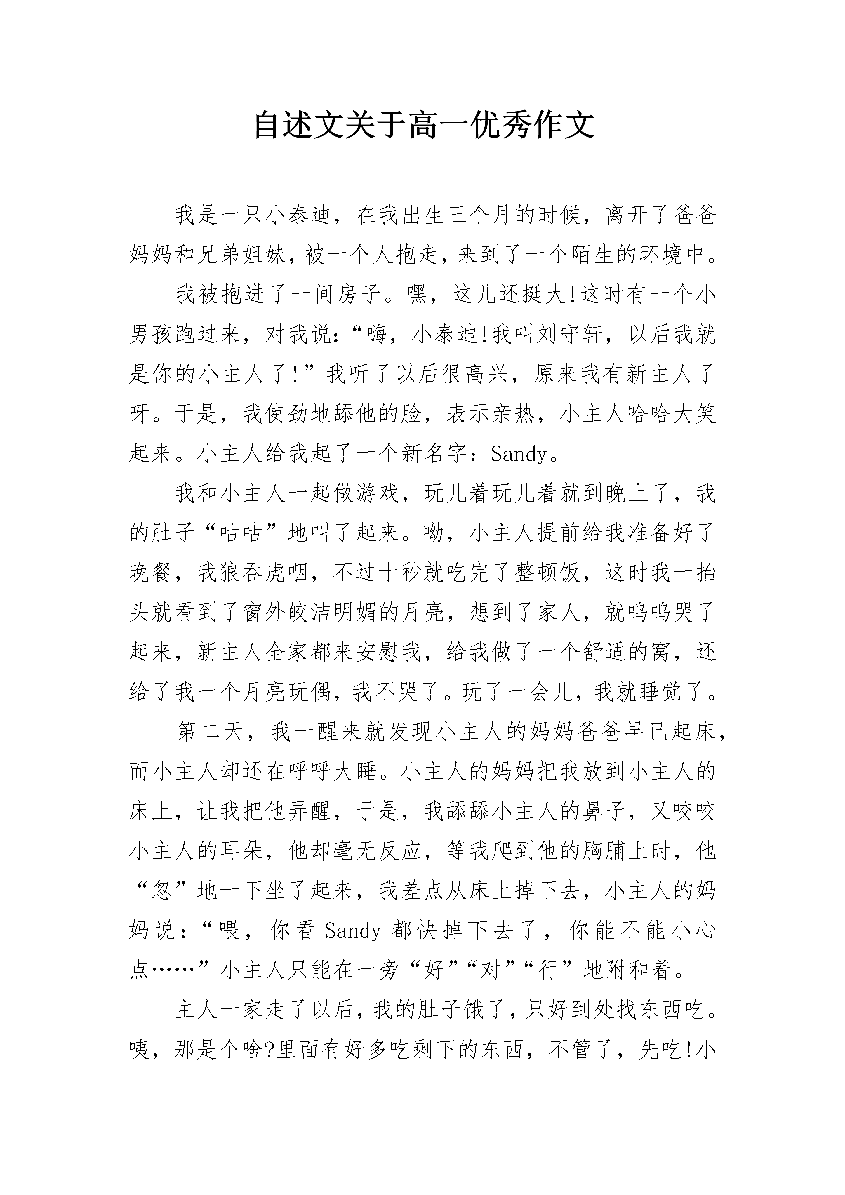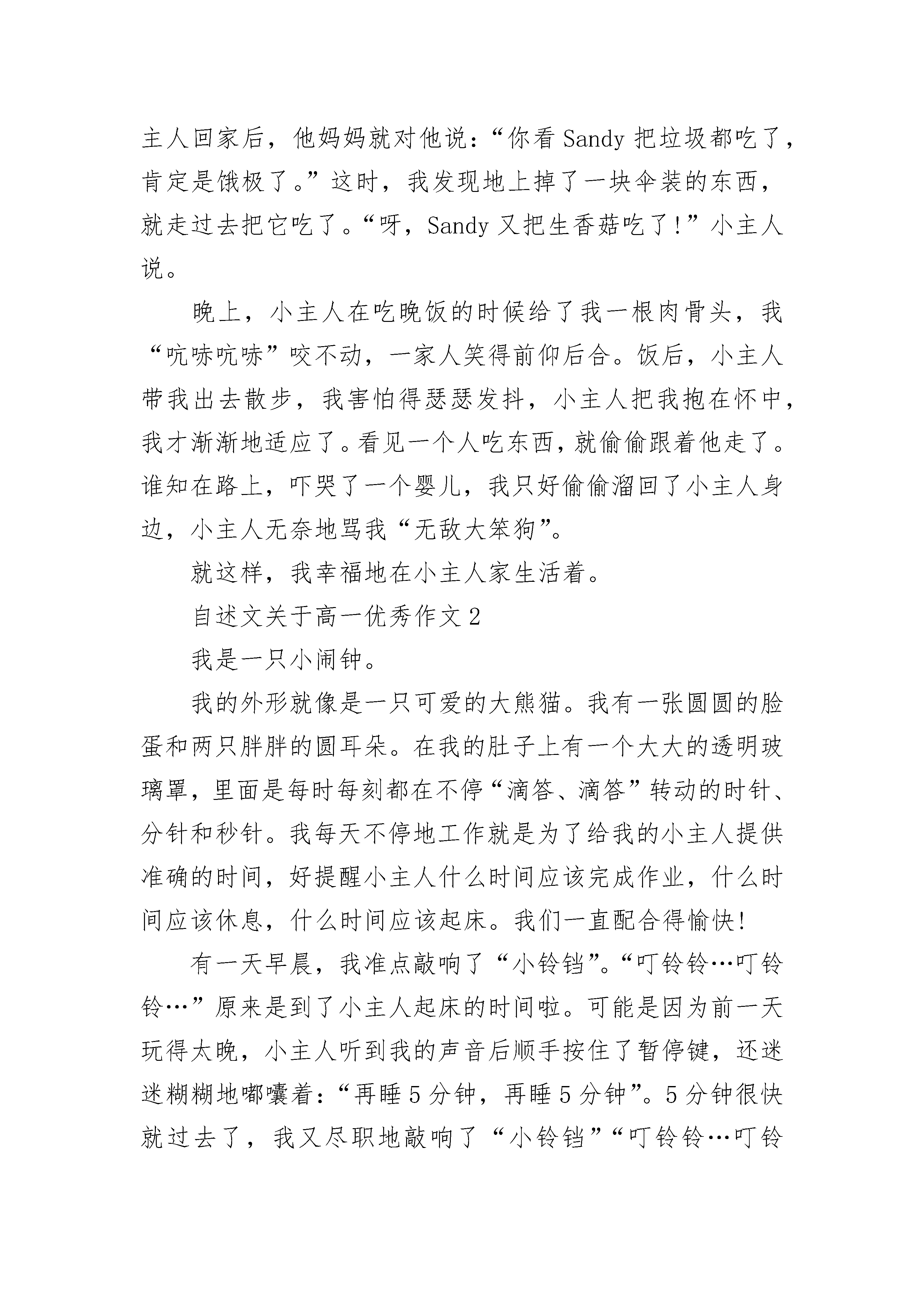 自述文关于高一优秀作文我是一只小泰迪,在我出生三个月的时候,离开了爸爸妈妈和兄弟姐妹,被一个人抱走,来到了一个陌生的环境中。我被抱进了一间房子。嘿,这儿还挺大!这时有一个小男孩跑过来,对我说:“嗨,小泰迪!我叫刘守轩,以后我就是你的小主人了!”我听了以后很高兴,原来我有新主人了呀。于是,我使劲地舔他的脸,表示亲热,小主人哈哈大笑起来。小主人给我起了一个新名字:Sandy。我和小主人一起做游戏,玩儿着玩儿着就到晚上了,我的肚子“咕咕”地叫了起来。呦,小主人提前给我准备好了晚餐,我狼吞虎咽,不过十秒就吃完了整顿饭,这时我一抬头就看到了窗外皎洁明媚的月亮,想到了家人,就呜呜哭了起来,新主人全家都来安慰我,给我做了一个舒适的窝,还给了我一个月亮玩偶,我不哭了。玩了一会儿,我就睡觉了。第二天,我一醒来就发现小主人的妈妈爸爸早已起床,而小主人却还在呼呼大睡。小主人的妈妈把我放到小主人的床上,让我把他弄醒,于是,我舔舔小主人的鼻子,又咬咬小主人的耳朵,他却毫无反应,等我爬到他的胸脯上时,他“忽”地一下坐了起来,我差点从床上掉下去,小主人的妈妈说:“喂,你看Sandy都快掉下去了,你能不能小心点……”小主人只能在一旁“好”“对”“行”地附和着。主人一家走了以后,我的肚子饿了,只好到处找东西吃。咦,那是个啥?里面有好多吃剩下的东西,不管了,先吃!小主人回家后,他妈妈就对他说:“你看Sandy把垃圾都吃了,肯定是饿极了。”这时,我发现地上掉了一块伞装的东西,就走过去把它吃了。“呀,Sandy又把生香菇吃了!”小主人说。晚上,小主人在吃晚饭的时候给了我一根肉骨头,我“吭哧吭哧”咬不动,一家人笑得前仰后合。饭后,小主人带我出去散步,我害怕得瑟瑟发抖,小主人把我抱在怀中,我才渐渐地适应了。看见一个人吃东西,就偷偷跟着他走了。谁知在路上,吓哭了一个婴儿,我只好偷偷溜回了小主人身边,小主人无奈地骂我“无敌大笨狗”。就这样,我幸福地在小主人家生活着。自述文关于高一优秀作文2我是一只小闹钟。我的外形就像是一只可爱的大熊猫。我有一张圆圆的脸蛋和两只胖胖的圆耳朵。在我的肚子上有一个大大的透明玻璃罩,里面是每时每刻都在不停“滴答、滴答”转动的时针、分针和秒针。我每天不停地工作就是为了给我的小主人提供准确的时间,好提醒小主人什么时间应该完成作业,什么时间应该休息,什么时间应该起床。我们一直配合得愉快!有一天早晨,我准点敲响了“小铃铛”。“叮铃铃…叮铃铃…”原来是到了小主人起床的时间啦。可能是因为前一天玩得太晚,小主人听到我的声音后顺手按住了暂停键,还迷迷糊糊地嘟囔着:“再睡5分钟,再睡5分钟”。5分钟很快就过去了,我又尽职地敲响了“小铃铛”“叮铃铃…叮铃铃…5分钟到了,快起床了,要迟到了”。小主人生气地喊道:“烦死了,不要听!”说着还顺手把我从高高的桌子上摔到了地上。瞬间,我被跌得七零八落,再也发不出声音来了!结果可想而知,当天小主人因为上课迟到而被老师狠狠地批评了。晚上,小主人放学回家后,看到地上被摔得零零散散的我,流出了悔恨的泪水:“小闹钟,对不起,我错了,我不应该烦你,不听你的话,我真心向你道歉,我一定要修好你。”可是小主人不会修理怎么办啊?于是他打开电脑登陆了互联网,从网上下载了闹钟的维修手册,根据教程一步一步的操作,花费了好长时间后终于把我修好了。看着恢复健康的自己,我高兴得挥起了手臂,唱起了歌:“叮铃铃,叮铃铃,我们还是好朋友!”这就是我,一只为小主人尽心尽责守护时间的小闹钟!自述文关于高一优秀作文3大家好,我是一支快乐的小钢笔。我头戴一顶蓝色的小帽,身穿一件蓝色大衣,大衣上画着一只可爱顽皮的小奶牛,漂亮极了。小主人在文具店里一眼就看好了我,就把我带回了家。每当小主人做作业时,她就会把我轻轻地从文具盒里拿出来,打开我蓝色的小帽子,露出我那尖尖的笔头开始写字,虽然我感到很累,但是我很开心,因为我可以为小主人服务呀。有一次我在为小主人服务时肚子突然饿了,任我怎么使劲就是写不字来,怎么办呢?小主人的作业还没写完。我焦急得都要哭了,小主人好像明白了我的心思,只见她不慌不忙地拿出了我最爱吃的墨囊,轻轻地脱去我的大衣,把我的空墨囊拔了出来,为我装上了新的墨囊,瞬间我就充满了力量。小主人重新为我穿上了大衣。我们一起完成了作业。主人喜欢我,我也喜欢主人。我是一支快乐的小钢笔。自述文关于高一优秀作文4我是大树,身体非常强壮。春天的时候叶子郁郁葱葱,夏天的时候枝繁叶茂,秋天的时候叶子变黄,而冬天时叶子慢慢落下。我最喜欢春天。春天是个春暖花开、春意盎然的季节,鸟儿在我身上唱着歌儿,爷爷奶奶们在我的叶子下乘凉、下棋,孩子们抱着我蹦蹦跳跳、嬉戏玩耍。我对人们的贡献很大,可人们对我的贡献也很大,冬天时人们给我裹上温暖的衣服,大风来临时,人们把我绑的很紧,防止我倒下,谢谢帮助我的人