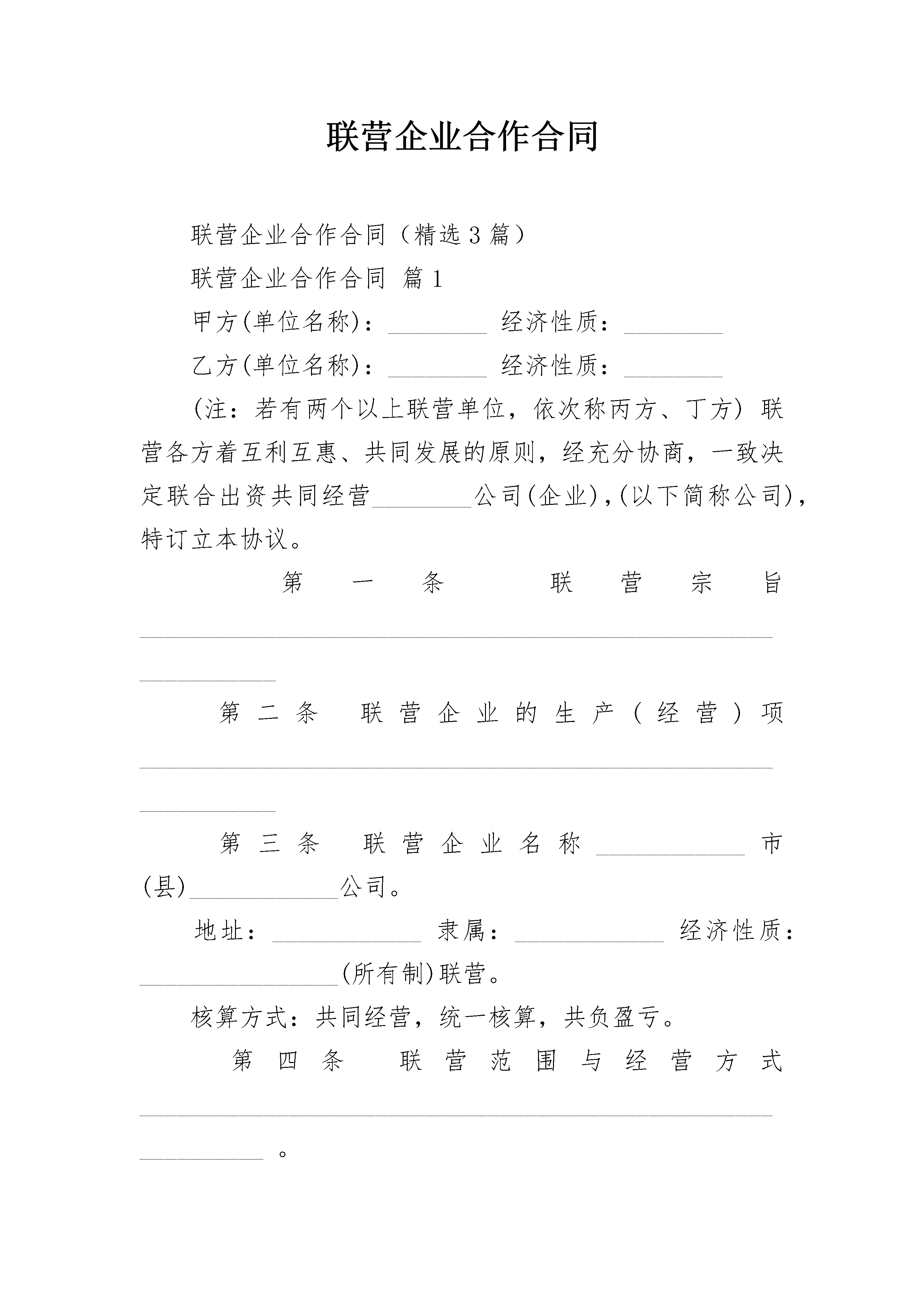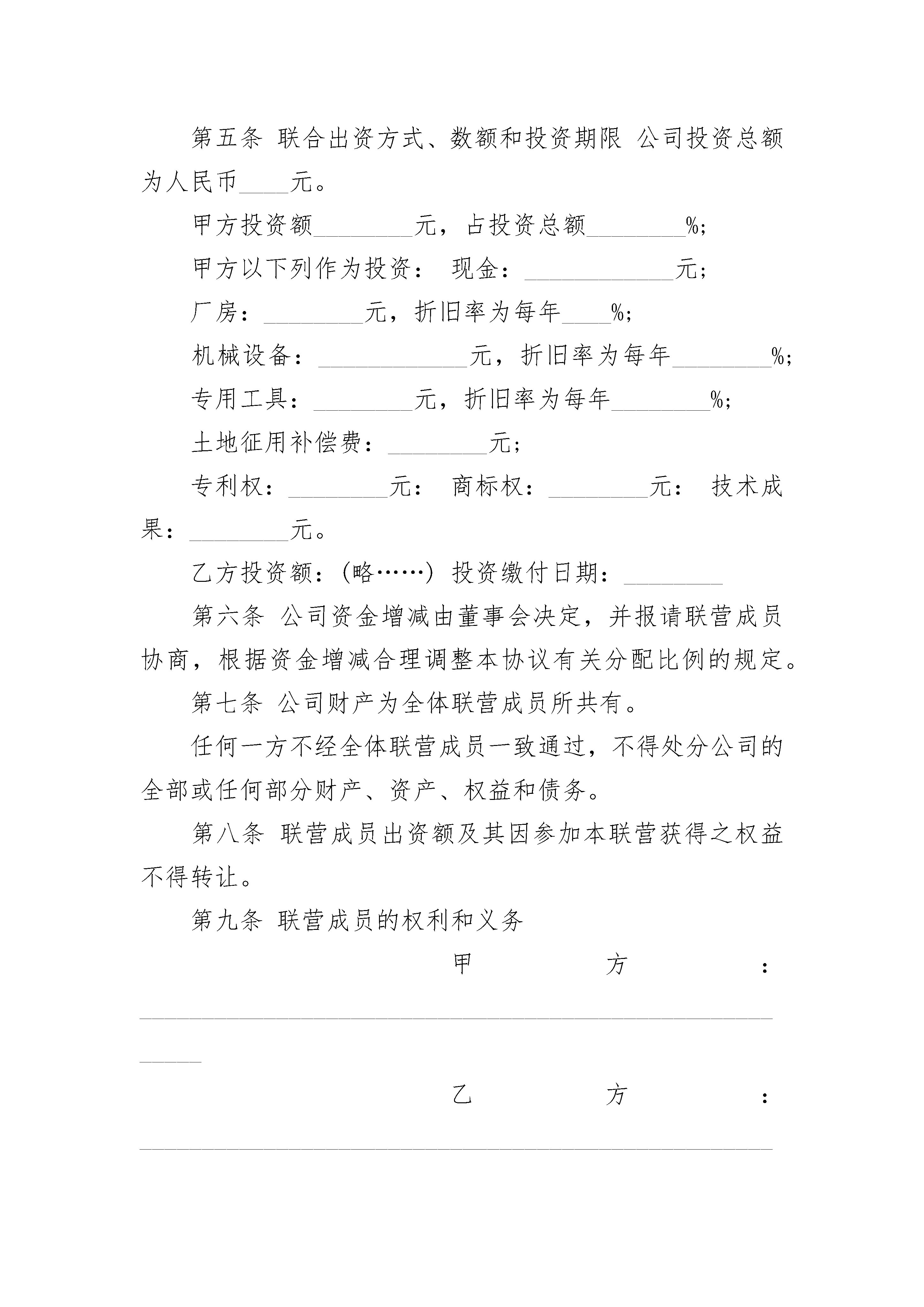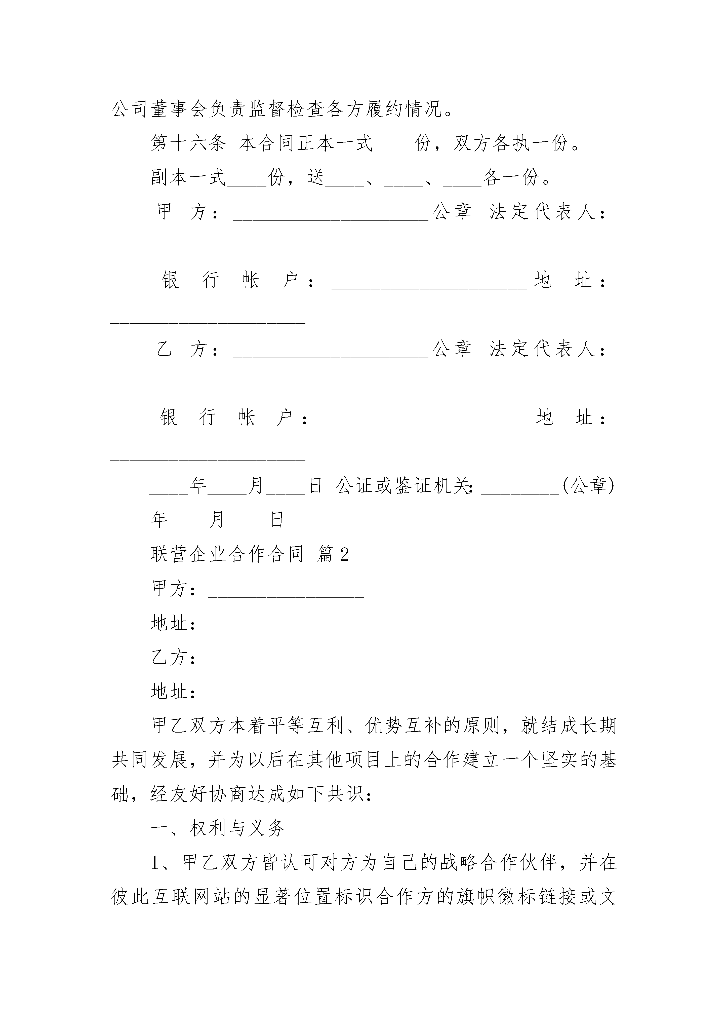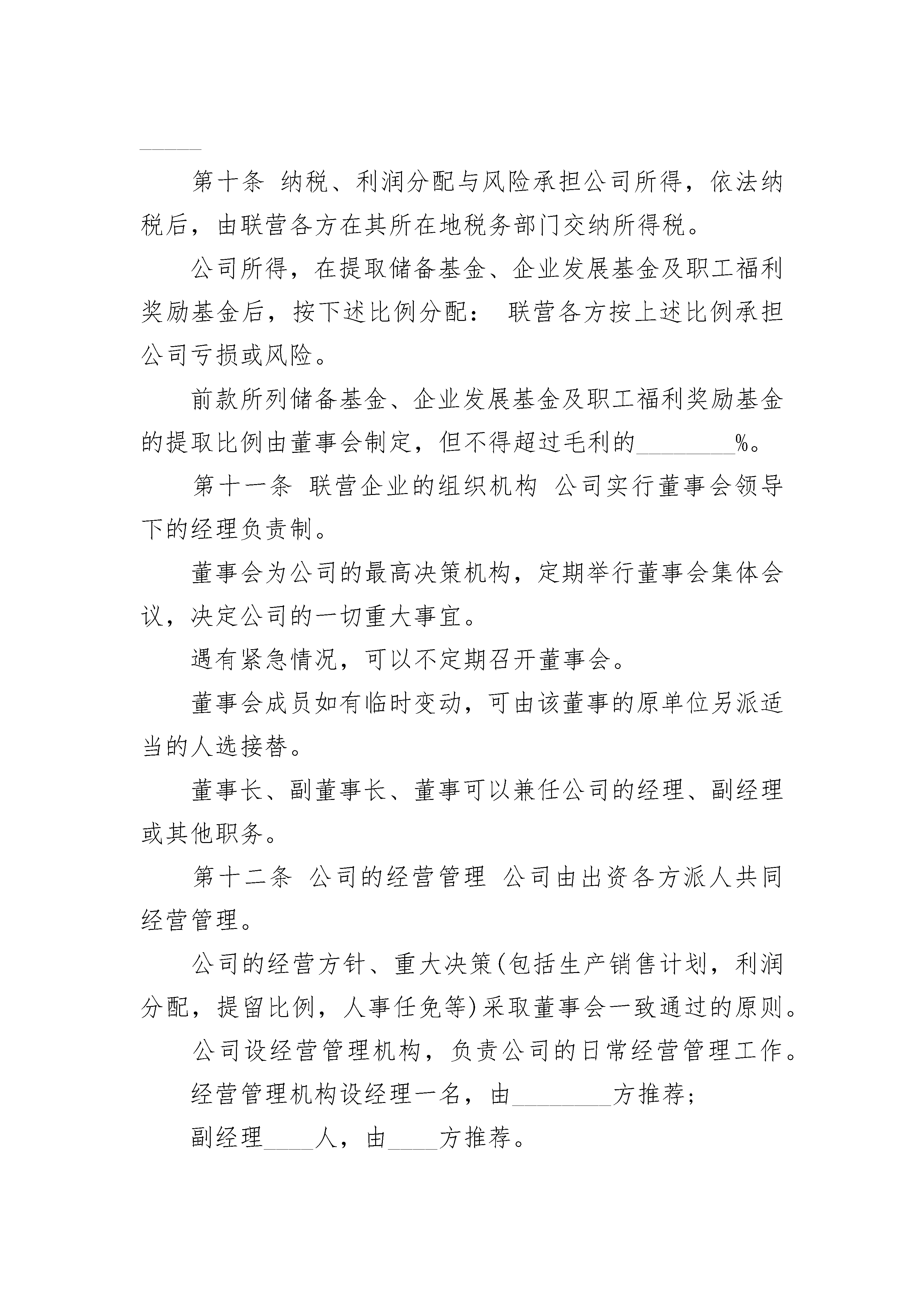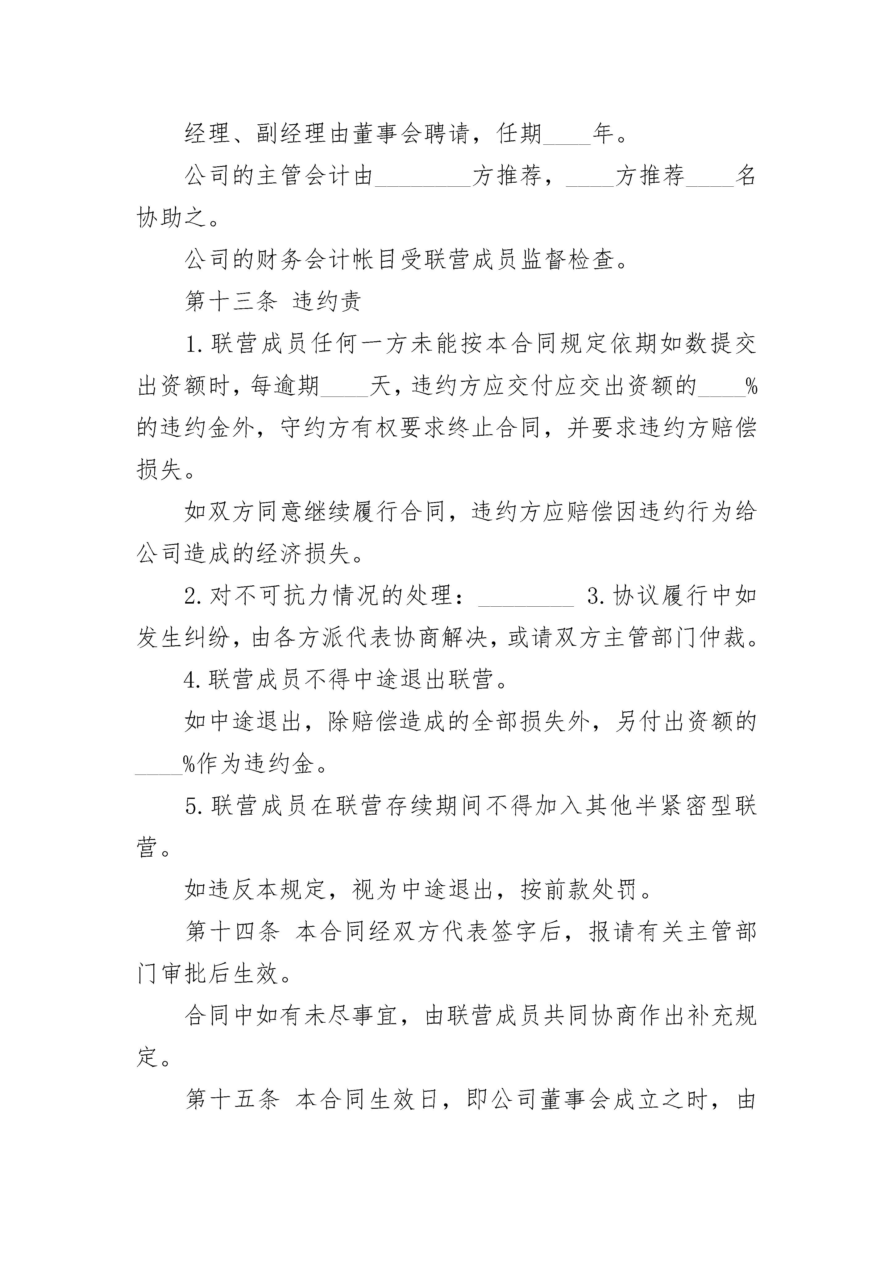 联营企业合作合同联营企业合作合同(精选3篇)联营企业合作合同篇1甲方(单位名称):________经济性质:________乙方(单位名称):________经济性质:________(注:若有两个以上联营单位,依次称丙方、丁方)联营各方着互利互惠、共同发展的原则,经充分协商,一致决定联合出资共同经营________公司(企业),(以下简称公司),特订立本协议。第一条联营宗旨______________________________________________________________第二条联营企业的生产(经营)项______________________________________________________________第三条联营企业名称____________市(县)____________公司。地址:____________隶属:____________经济性质:________________(所有制)联营。核算方式:共同经营,统一核算,共负盈亏。第四条联营范围与经营方式_____________________________________________________________。第五条联合出资方式、数额和投资期限公司投资总额为人民币____元。甲方投资额________元,占投资总额________%;甲方以下列作为投资:现金:____________元;厂房:________元,折旧率为每年____%;机械设备:____________元,折旧率为每年________%;专用工具:________元,折旧率为每年________%;土地征用补偿费:________元;专利权:________元:商标权:________元:技术成果:________元。乙方投资额:(略……)投资缴付日期:________第六条公司资金增减由董事会决定,并报请联营成员协商,根据资金增减合理调整本协议有关分配比例的规定。第七条公司财产为全体联营成员所共有。任何一方不经全体联营成员一致通过,不得处分公司的全部或任何部分财产、资产、权益和债务。第八条联营成员出资额及其因参加本联营获得之权益不得转让。第九条联营成员的权利和义务甲方:________________________________________________________乙方:________________________________________________________第十条纳税、利润分配与风险承担公司所得,依法纳税后,由联营各方在其所在地税务部门交纳所得税。公司所得,在提取储备基金、企业发展基金及职工福利奖励基金后,按下述比例分配:联营各方按上述比例承担公司亏损或风险。前款所列储备基金、企业发展基金及职工福利奖励基金的提取比例由董事会制定,但不得超过毛利的________%。第十一条联营企业的组织机构公司实行董事会领导下的经理负责制。董事会为公司的最高决策机构,定期举行董事会集体会议,决定公司的一切重大事宜。遇有紧急情况,可以不定期召开董事会。董事会成员如有临时变动,可由该董事的原单位另派适当的人选接替。董事长、副董事长、董事可以兼任公司的经理、副经理或其他职务。第十二条公司的经营管理公司由出资各方派人共同经营管理。公司的经营方针、重大决策(包括生产销售计划,利润分配,提留比例,人事任免等)采取董事会一致通过的原则。公司设经营管理机构,负责公司的日常经营管理工作。经营管理机构设经理一名,由________方推荐;副经理____人,由____方推荐。经理、副经理由董事会聘请,任期____年。公司的主管会计由________方推荐,____方推荐____名协助之。公司的财务会计帐目受联营成员监督检查。第十三条违约责1.联营成员任何一方未能按本合同规定依期如数提交出资额时,每逾期____天,违约方应交付应交出资额的____%的违约金外,守约方有权要求终止合同,并要求违约方赔偿损失。如双方同意继续履行合同,违约方应赔偿因违约行为给公司造成的经济损失。2.对不可抗力情况的处理:________3.协议履行中如发生纠纷,由各方派代表协商解决,或请双方主管部门仲裁。4.联营成员不得中途退出联营。如中途退出,除赔偿造成的全部损失外,另付出资额的____%作为违约金。5.联营成员在联营存续期间不得加入其他半紧密型联营。如违反本规定,视为中途退出,按前款处罚。第十四条本合同经双方代表签字后,报请有关主管部门审批后生效。合同中如有未尽事宜,由联营成员共同协商作出补充规定。第十五条本合同生效日,即公司董事会成立之时,由公司董事会负责监督检查各方履约情况。第十六条本合同正本一式____份,双方各执一份。副本一式____份,送____