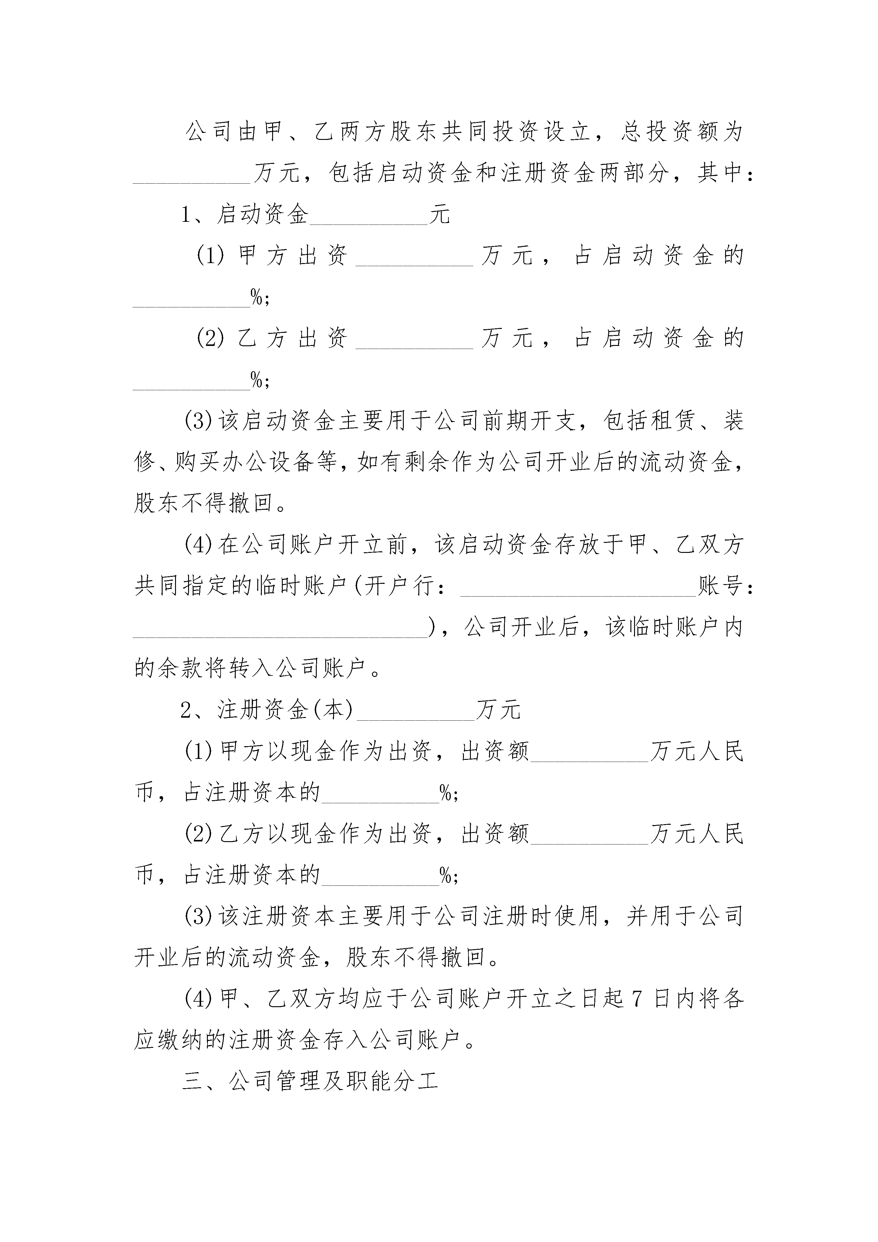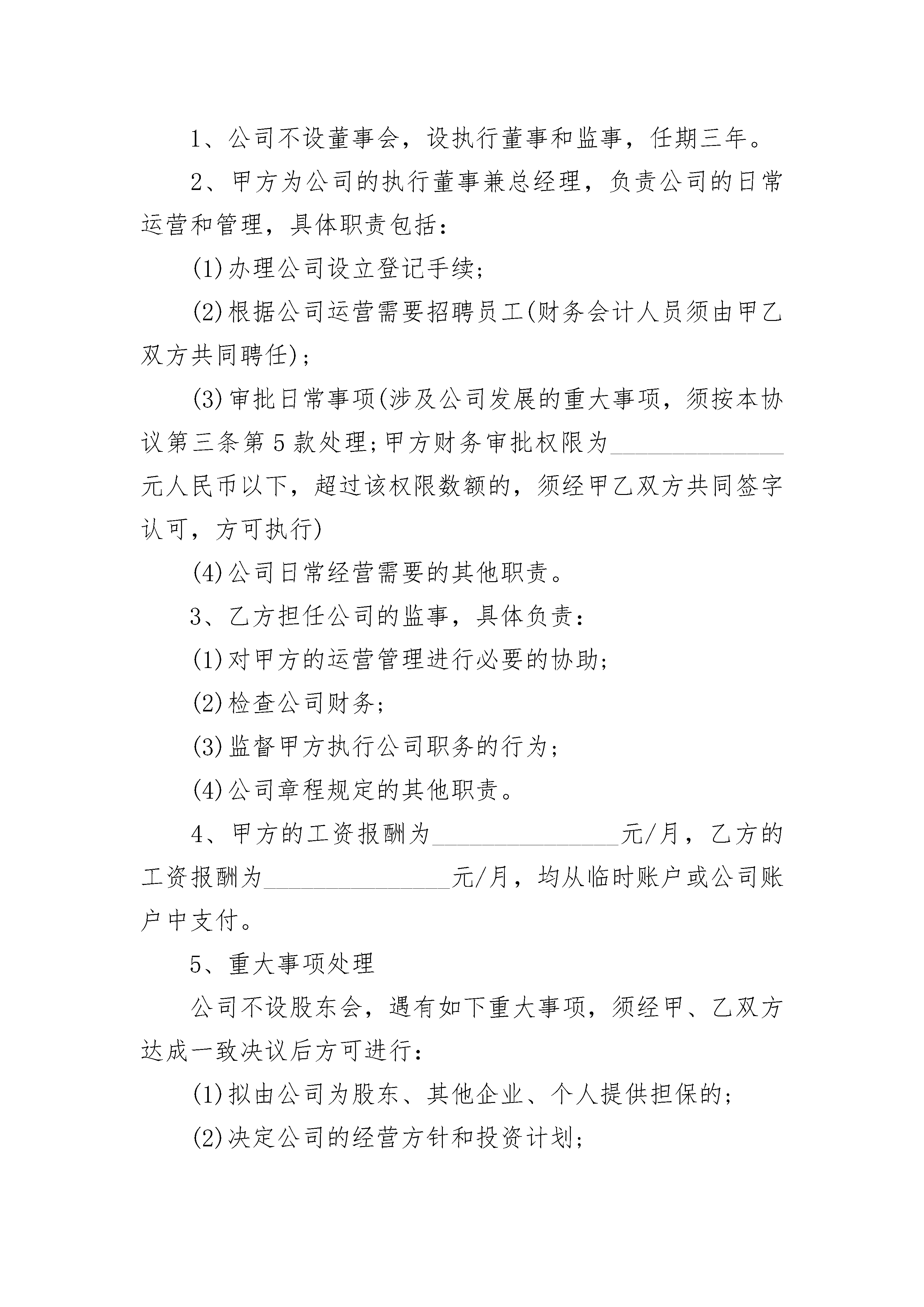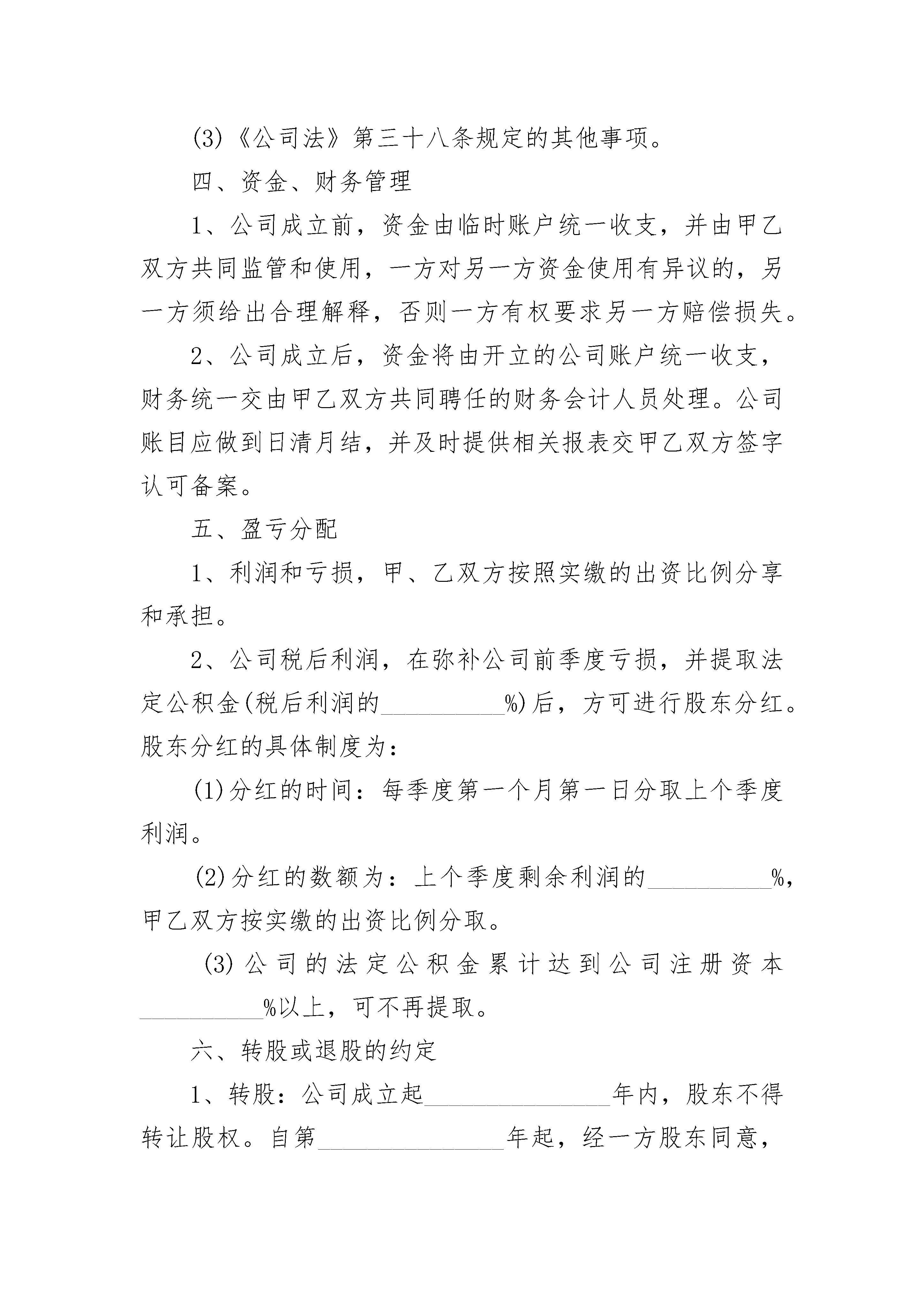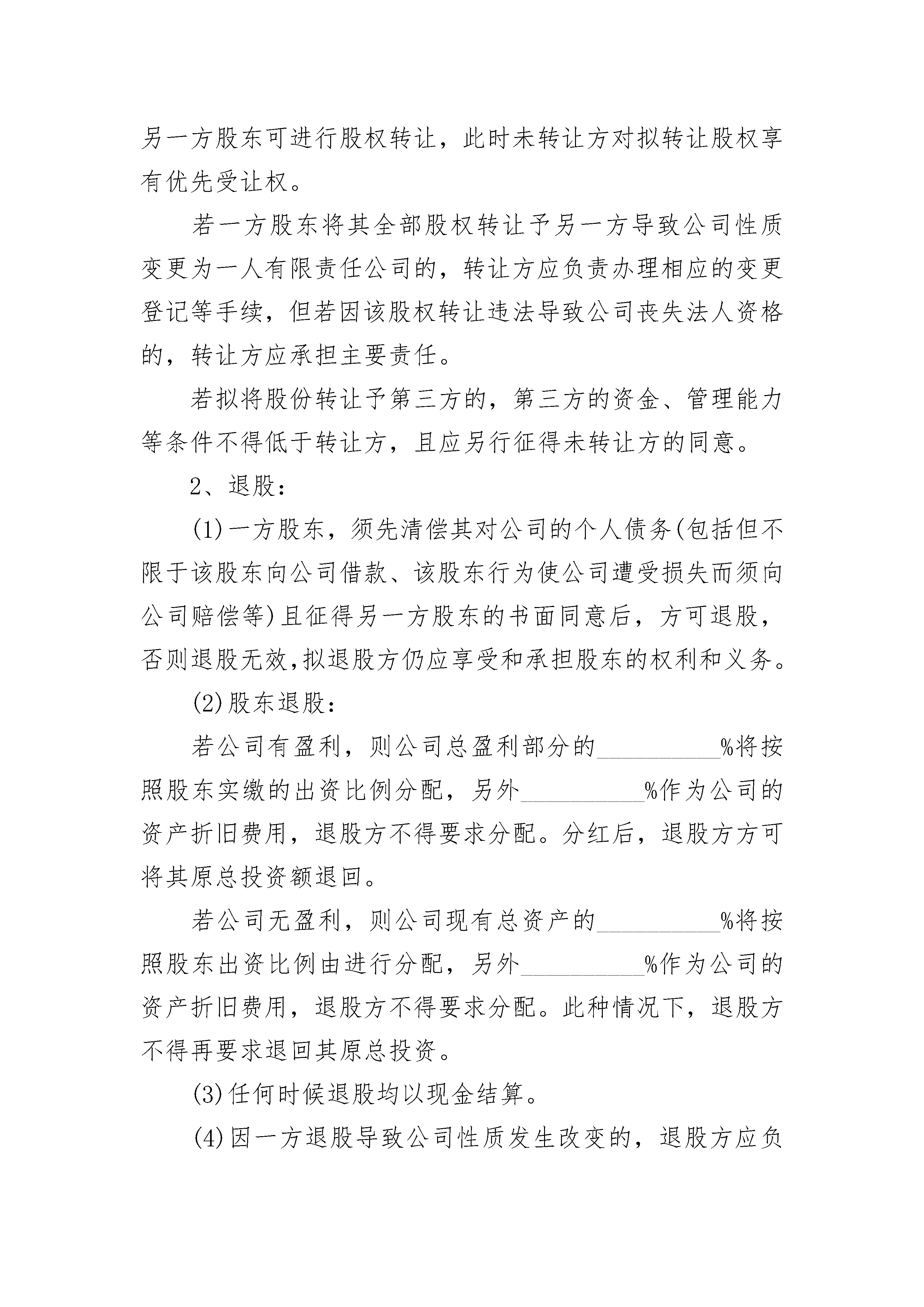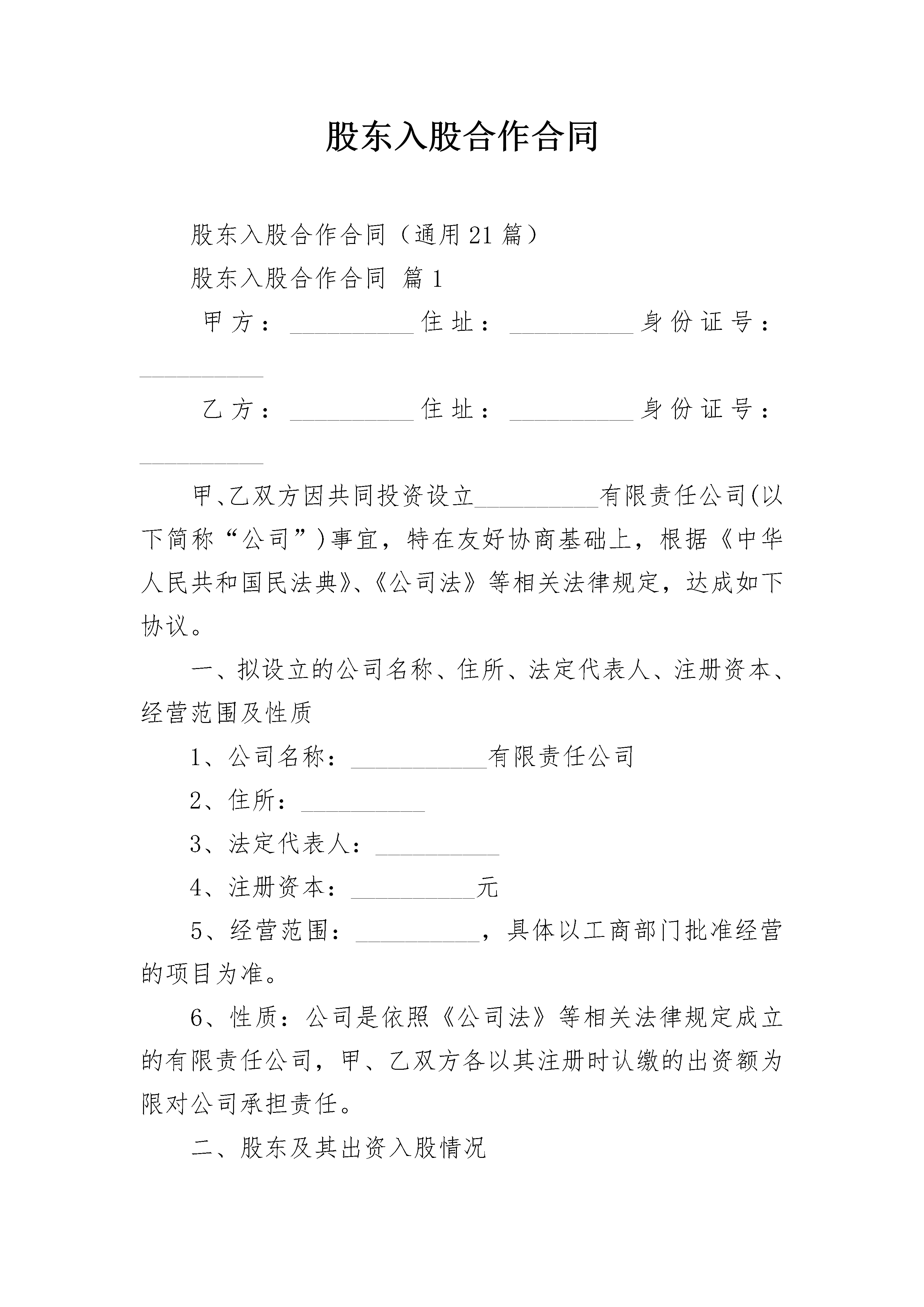 股东入股合作合同股东入股合作合同(通用21篇)股东入股合作合同篇1甲方:__________住址:__________身份证号:__________乙方:__________住址:__________身份证号:__________甲、乙双方因共同投资设立__________有限责任公司(以下简称“公司”)事宜,特在友好协商基础上,根据《中华人民共和国民法典》、《公司法》等相关法律规定,达成如下协议。一、拟设立的公司名称、住所、法定代表人、注册资本、经营范围及性质1、公司名称:___________有限责任公司2、住所:__________3、法定代表人:__________4、注册资本:__________元5、经营范围:__________,具体以工商部门批准经营的项目为准。6、性质:公司是依照《公司法》等相关法律规定成立的有限责任公司,甲、乙双方各以其注册时认缴的出资额为限对公司承担责任。二、股东及其出资入股情况公司由甲、乙两方股东共同投资设立,总投资额为__________万元,包括启动资金和注册资金两部分,其中:1、启动资金__________元(1)甲方出资__________万元,占启动资金的__________%;(2)乙方出资__________万元,占启动资金的__________%;(3)该启动资金主要用于公司前期开支,包括租赁、装修、购买办公设备等,如有剩余作为公司开业后的流动资金,股东不得撤回。(4)在公司账户开立前,该启动资金存放于甲、乙双方共同指定的临时账户(开户行:____________________账号:_________________________),公司开业后,该临时账户内的余款将转入公司账户。2、注册资金(本)__________万元(1)甲方以现金作为出资,出资额__________万元人民币,占注册资本的__________%;(2)乙方以现金作为出资,出资额__________万元人民币,占注册资本的__________%;(3)该注册资本主要用于公司注册时使用,并用于公司开业后的流动资金,股东不得撤回。(4)甲、乙双方均应于公司账户开立之日起7日内将各应缴纳的注册资金存入公司账户。三、公司管理及职能分工1、公司不设董事会,设执行董事和监事,任期三年。2、甲方为公司的执行董事兼总经理,负责公司的日常运营和管理,具体职责包括:(1)办理公司设立登记手续;(2)根据公司运营需要招聘员工(财务会计人员须由甲乙双方共同聘任);(3)审批日常事项(涉及公司发展的重大事项,须按本协议第三条第5款处理;甲方财务审批权限为______________元人民币以下,超过该权限数额的,须经甲乙双方共同签字认可,方可执行)(4)公司日常经营需要的其他职责。3、乙方担任公司的监事,具体负责:(1)对甲方的运营管理进行必要的协助;(2)检查公司财务;(3)监督甲方执行公司职务的行为;(4)公司章程规定的其他职责。4、甲方的工资报酬为_______________元/月,乙方的工资报酬为_______________元/月,均从临时账户或公司账户中支付。5、重大事项处理公司不设股东会,遇有如下重大事项,须经甲、乙双方达成一致决议后方可进行:(1)拟由公司为股东、其他企业、个人提供担保的;(2)决定公司的经营方针和投资计划;(3)《公司法》第三十八条规定的其他事项。四、资金、财务管理1、公司成立前,资金由临时账户统一收支,并由甲乙双方共同监管和使用,一方对另一方资金使用有异议的,另一方须给出合理解释,否则一方有权要求另一方赔偿损失。2、公司成立后,资金将由开立的公司账户统一收支,财务统一交由甲乙双方共同聘任的财务会计人员处理。公司账目应做到日清月结,并及时提供相关报表交甲乙双方签字认可备案。五、盈亏分配1、利润和亏损,甲、乙双方按照实缴的出资比例分享和承担。2、公司税后利润,在弥补公司前季度亏损,并提取法定公积金(税后利润的__________%)后,方可进行股东分红。股东分红的具体制度为:(1)分红的时间:每季度第一个月第一日分取上个季度利润。(2)分红的数额为:上个季度剩余利润的__________%,甲乙双方按实缴的出资比例分取。(3)公司的法定公积金累计达到公司注册资本__________%以上,可不再提取。六、转股或退股的约定1、转股:公司成立起_______________年内,股东不得转让股权。自第_______________年起,经一方股东同意,另一方股东可进行股权转让,此时未转让方对拟转让股权享有优先受让权。若一方股东将其全部股权转让予另一方导致公司性质变更为一人有限责任公司的,转让方应负责办理相应的变更登记等手续,但若因该股权转让违法导致公司丧失法人资格的,转让方应承担主要责任。