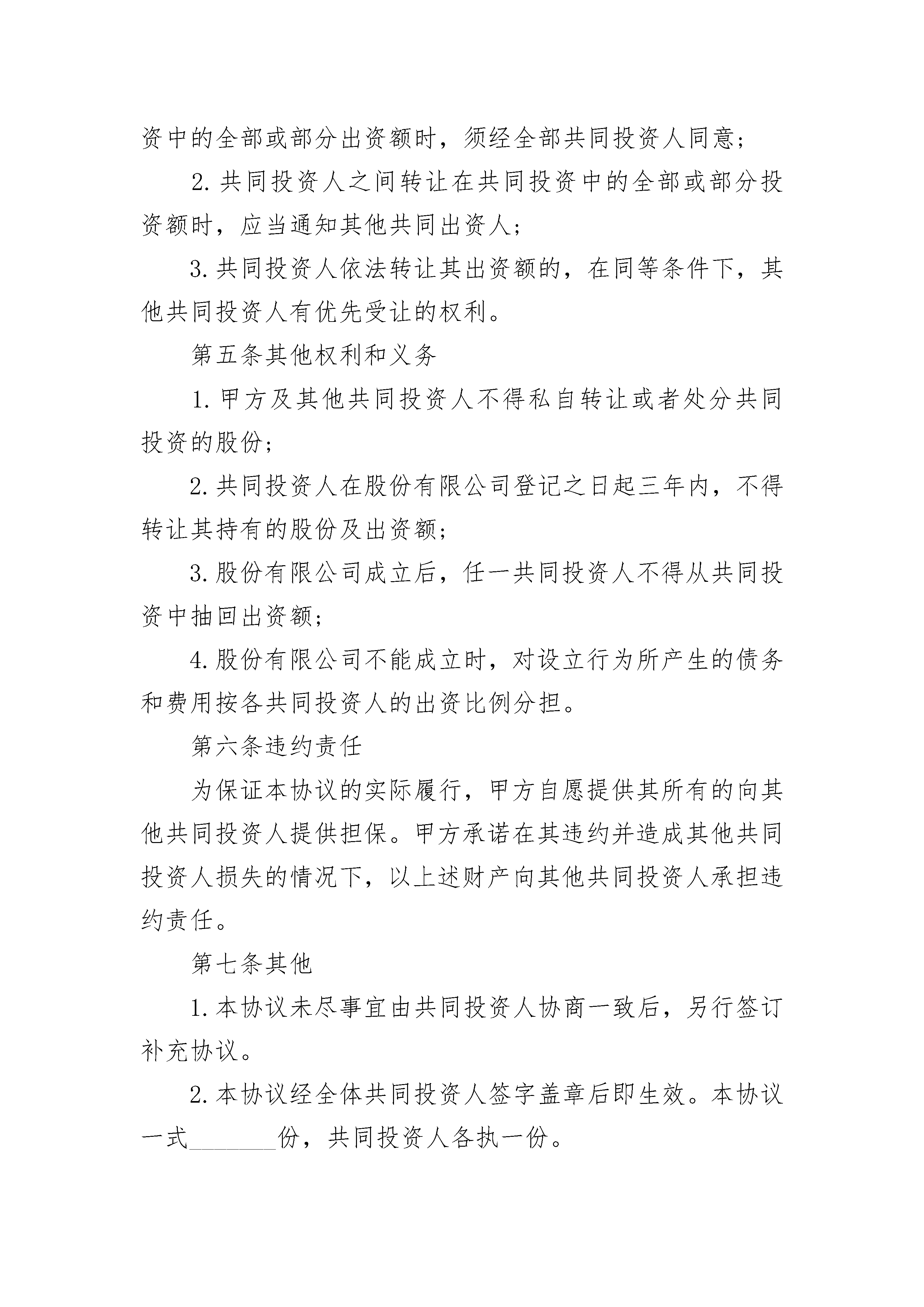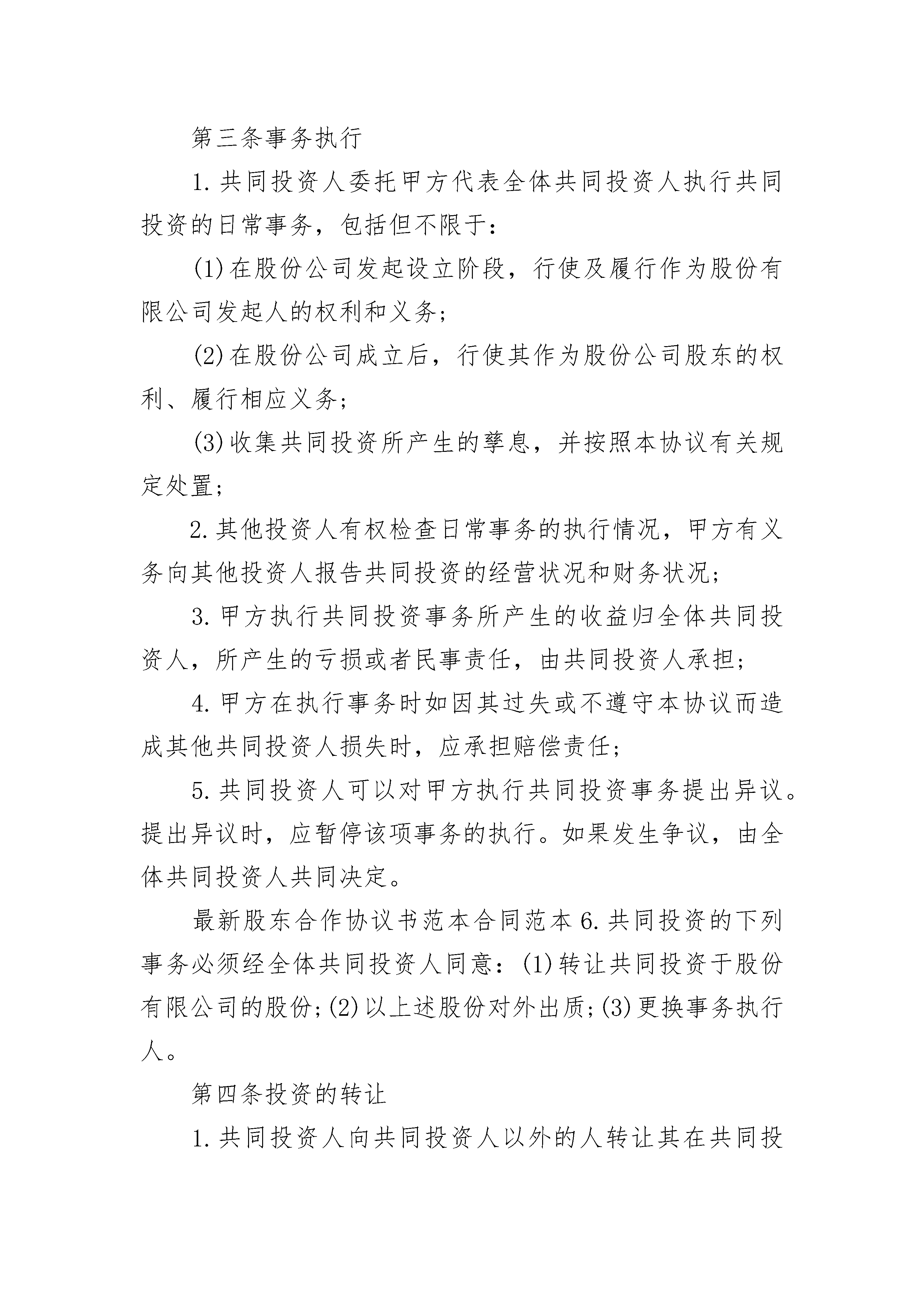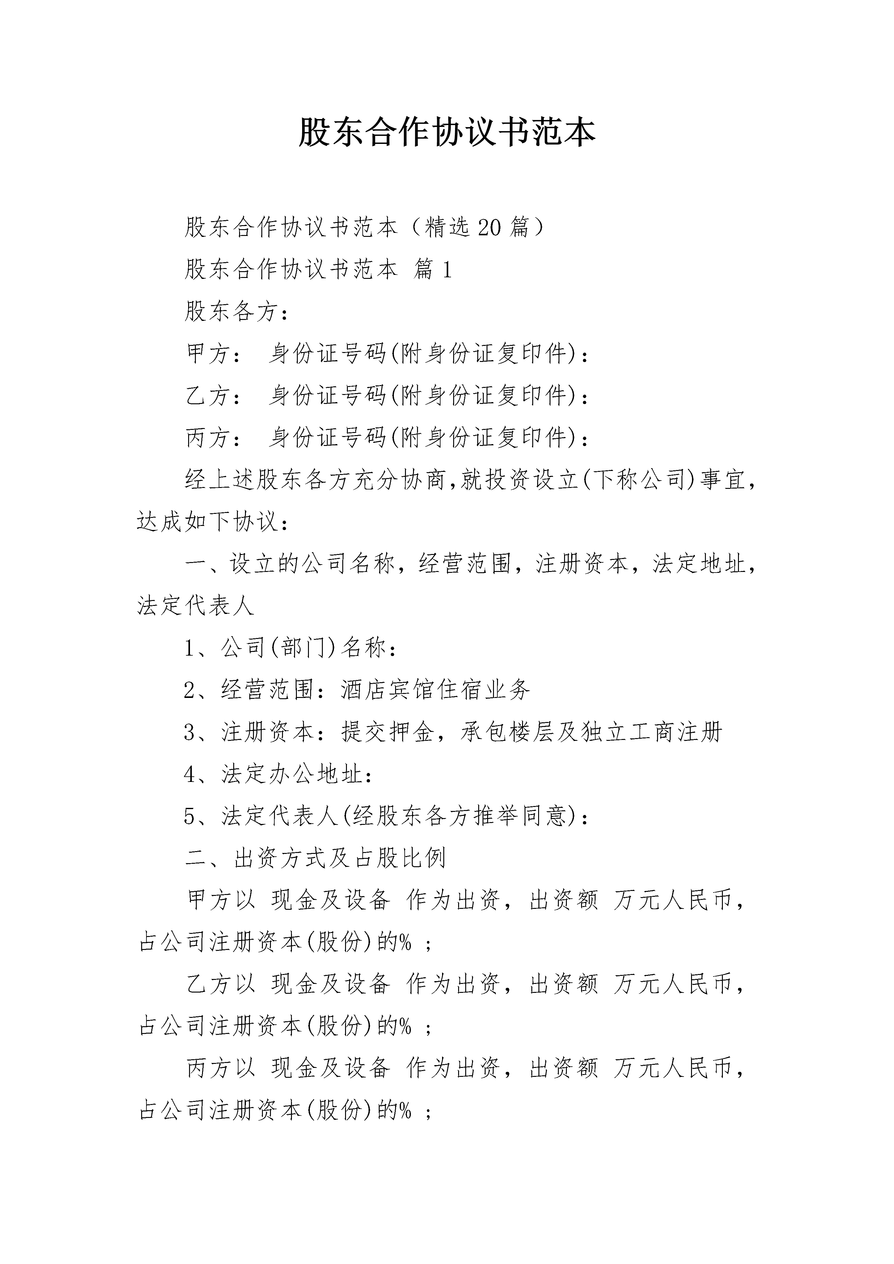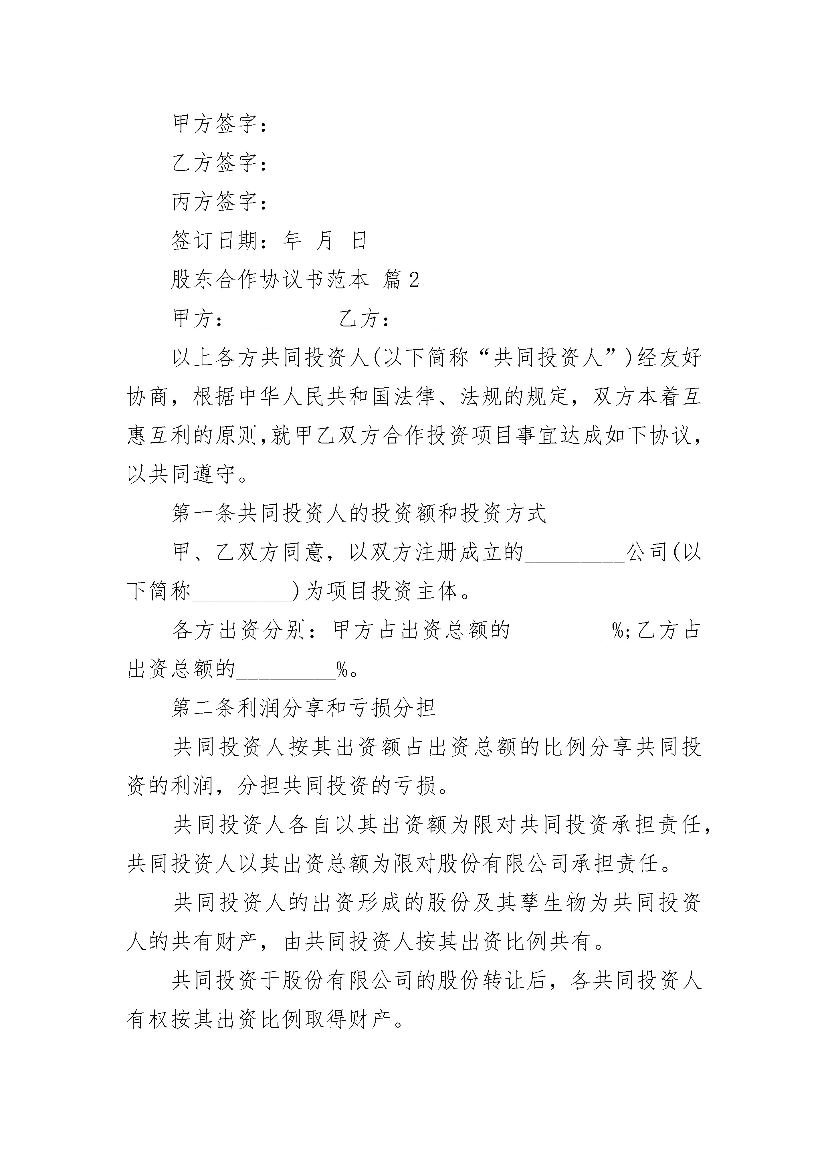 股东合作协议书范本股东合作协议书范本(精选20篇)股东合作协议书范本篇1股东各方:甲方:身份证号码(附身份证复印件):乙方:身份证号码(附身份证复印件):丙方:身份证号码(附身份证复印件):经上述股东各方充分协商,就投资设立(下称公司)事宜,达成如下协议:一、设立的公司名称,经营范围,注册资本,法定地址,法定代表人1、公司(部门)名称:2、经营范围:酒店宾馆住宿业务3、注册资本:提交押金,承包楼层及独立工商注册4、法定办公地址:5、法定代表人(经股东各方推举同意):二、出资方式及占股比例甲方以现金及设备作为出资,出资额万元人民币,占公司注册资本(股份)的%;乙方以现金及设备作为出资,出资额万元人民币,占公司注册资本(股份)的%;丙方以现金及设备作为出资,出资额万元人民币,占公司注册资本(股份)的%;出资中的设备以股东各方共同评定价值为准(本协议附设备评定书一份)。三、其它约定1、成立公司股东小组,成员由各股东方本人或派员组成,出任法人代表一方的股东代表为管理小组组长,组织计划投资新设备,扩大办公场所,装修及设立公司的各类文件;2、出任法人代表的股东方先行垫付各种筹办费用(并由各股东方在计划文件上签字确认),公司设立后该费用由公司承担;3、公司成立财务部门,统一流动资金管理,设立会计和出纳人员,设立公平合理的工资制度;4、股东在出资后十年内可以转移股权,但无权撤资退股;5、公司设立董事局,由占股份10%以上的股东组成董事,董事长由最大股东担任;6、公司重大投资由董事局民主决议,赞同率高于50%的可以通过并执行;7、分红方式:一月一结;8、上述各股东方委托出任法人代表方代理申办公司的各项日常工作事宜;9、本协议自各股东方签字盖章(画押)之日起生效。一式份,各方股东各执一份,以便共同遵守。10、备注内容:甲方签字:乙方签字:丙方签字:签订日期:年月日股东合作协议书范本篇2甲方:_________乙方:_________以上各方共同投资人(以下简称“共同投资人”)经友好协商,根据中华人民共和国法律、法规的规定,双方本着互惠互利的原则,就甲乙双方合作投资项目事宜达成如下协议,以共同遵守。第一条共同投资人的投资额和投资方式甲、乙双方同意,以双方注册成立的_________公司(以下简称_________)为项目投资主体。各方出资分别:甲方占出资总额的_________%;乙方占出资总额的_________%。第二条利润分享和亏损分担共同投资人按其出资额占出资总额的比例分享共同投资的利润,分担共同投资的亏损。共同投资人各自以其出资额为限对共同投资承担责任,共同投资人以其出资总额为限对股份有限公司承担责任。共同投资人的出资形成的股份及其孳生物为共同投资人的共有财产,由共同投资人按其出资比例共有。共同投资于股份有限公司的股份转让后,各共同投资人有权按其出资比例取得财产。第三条事务执行1.共同投资人委托甲方代表全体共同投资人执行共同投资的日常事务,包括但不限于:(1)在股份公司发起设立阶段,行使及履行作为股份有限公司发起人的权利和义务;(2)在股份公司成立后,行使其作为股份公司股东的权利、履行相应义务;(3)收集共同投资所产生的孳息,并按照本协议有关规定处置;2.其他投资人有权检查日常事务的执行情况,甲方有义务向其他投资人报告共同投资的经营状况和财务状况;3.甲方执行共同投资事务所产生的收益归全体共同投资人,所产生的亏损或者民事责任,由共同投资人承担;4.甲方在执行事务时如因其过失或不遵守本协议而造成其他共同投资人损失时,应承担赔偿责任;5.共同投资人可以对甲方执行共同投资事务提出异议。提出异议时,应暂停该项事务的执行。如果发生争议,由全体共同投资人共同决定。最新股东合作协议书范本合同范本6.共同投资的下列事务必须经全体共同投资人同意:(1)转让共同投资于股份有限公司的股份;(2)以上述股份对外出质;(3)更换事务执行人。第四条投资的转让1.共同投资人向共同投资人以外的人转让其在共同投资中的全部或部分出资额时,须经全部共同投资人同意;2.共同投资人之间转让在共同投资中的全部或部分投资额时,应当通知其他共同出资人;3.共同投资人依法转让其出资额的,在同等条件下,其他共同投资人有优先受让的权利。第五条其他权利和义务1.甲方及其他共同投资人不得私自转让或者处分共同投资的股份;2.共同投资人在股份有限公司登记之日起三年内,不得转让其持有的股份及出资额;3.股份有限公司成立后,任一共同投资人不得从共同投资中抽回出资额;4.股份有限公司不能成立时,对设立行为所产生的债务和费用按各共同投资人的出资比例分担。第六条违约责任为保证本协议的实际履行,甲方自愿提供其所有的向其他共同投资人提供担保。甲方承诺在其违约并造成其他共同投资人损失的情况下,以上述财产向其他共
