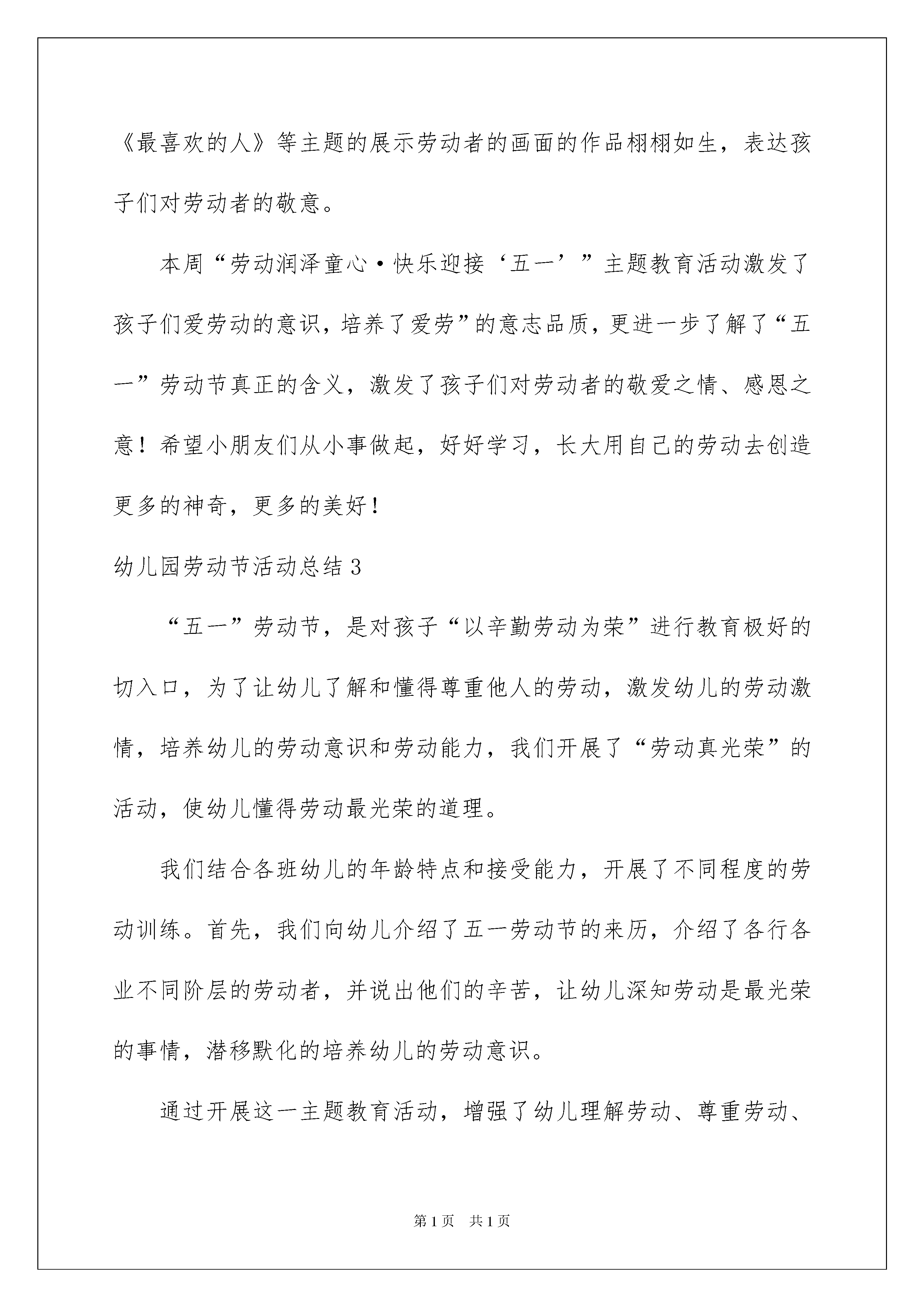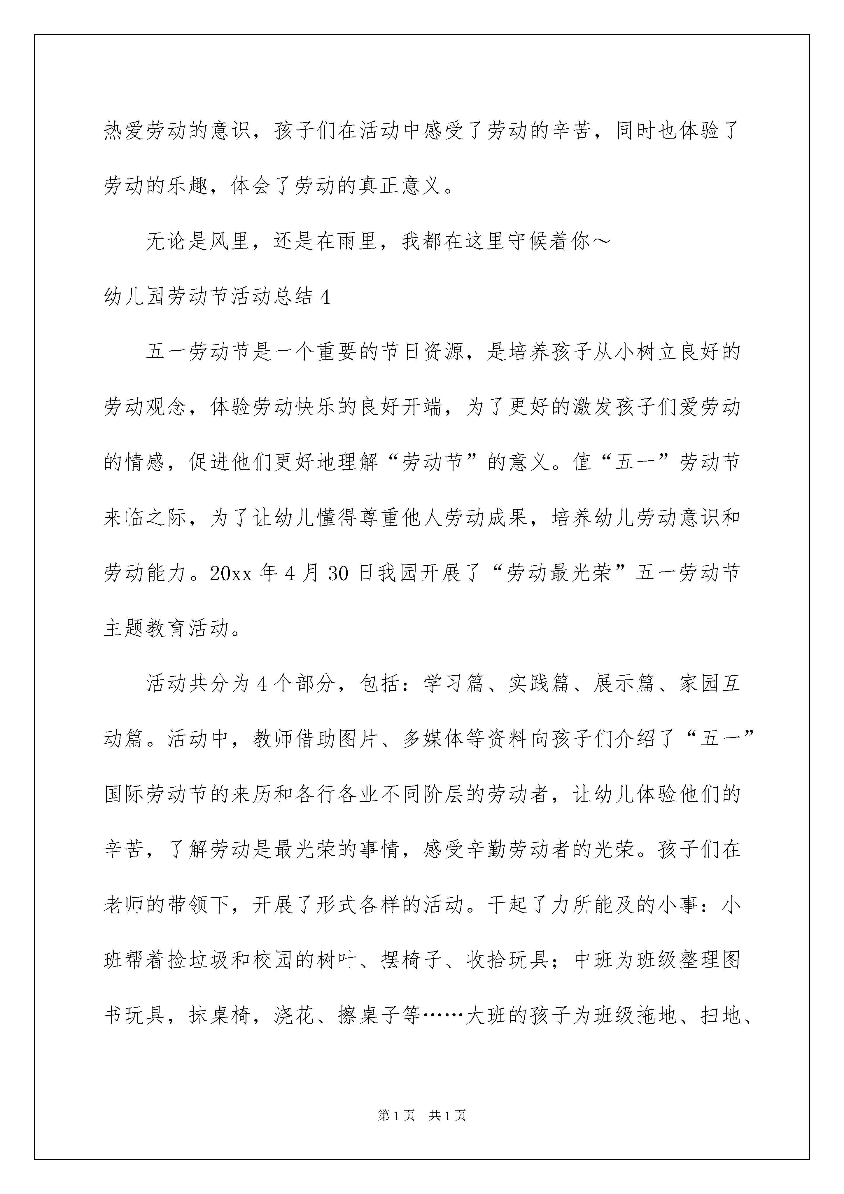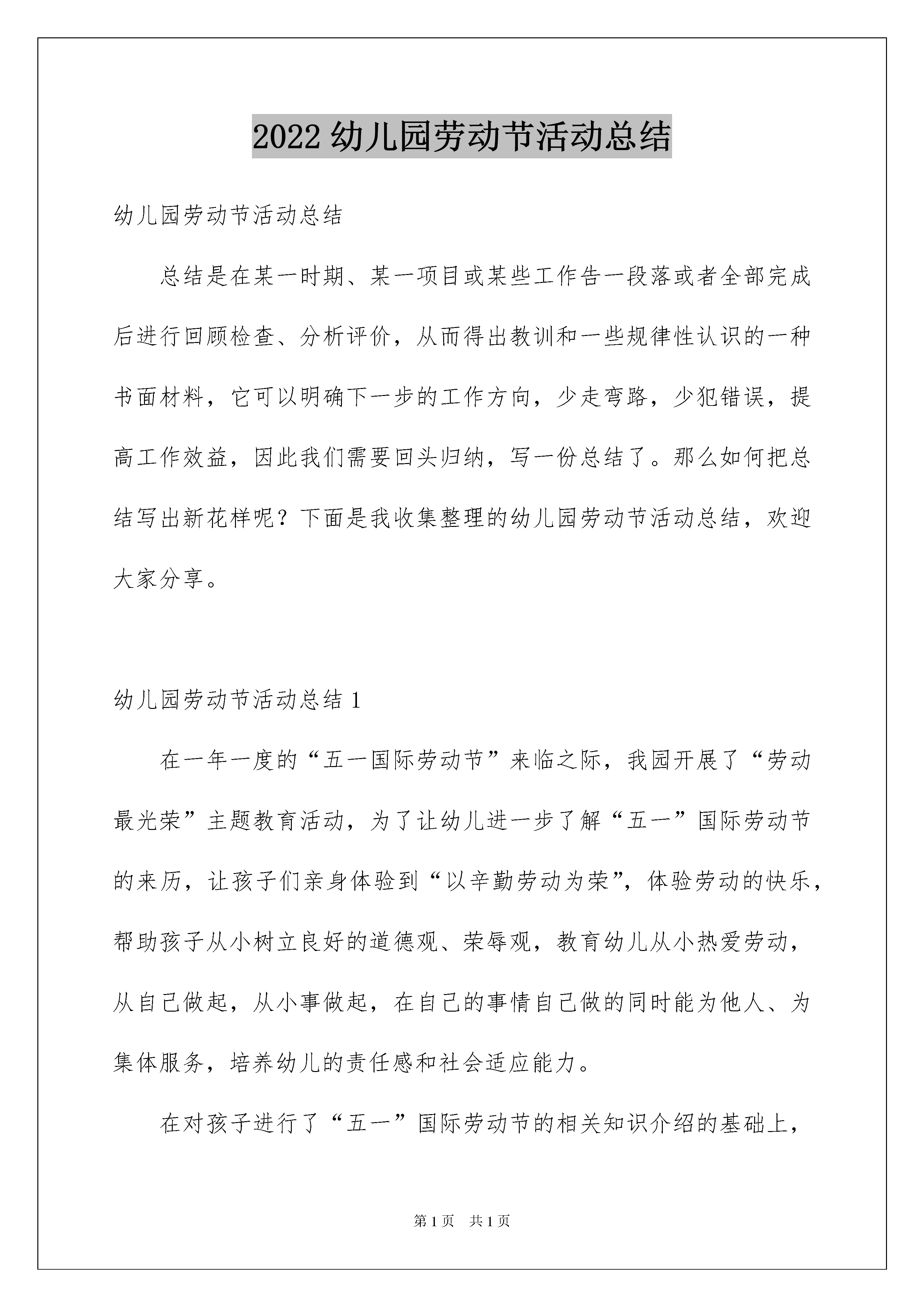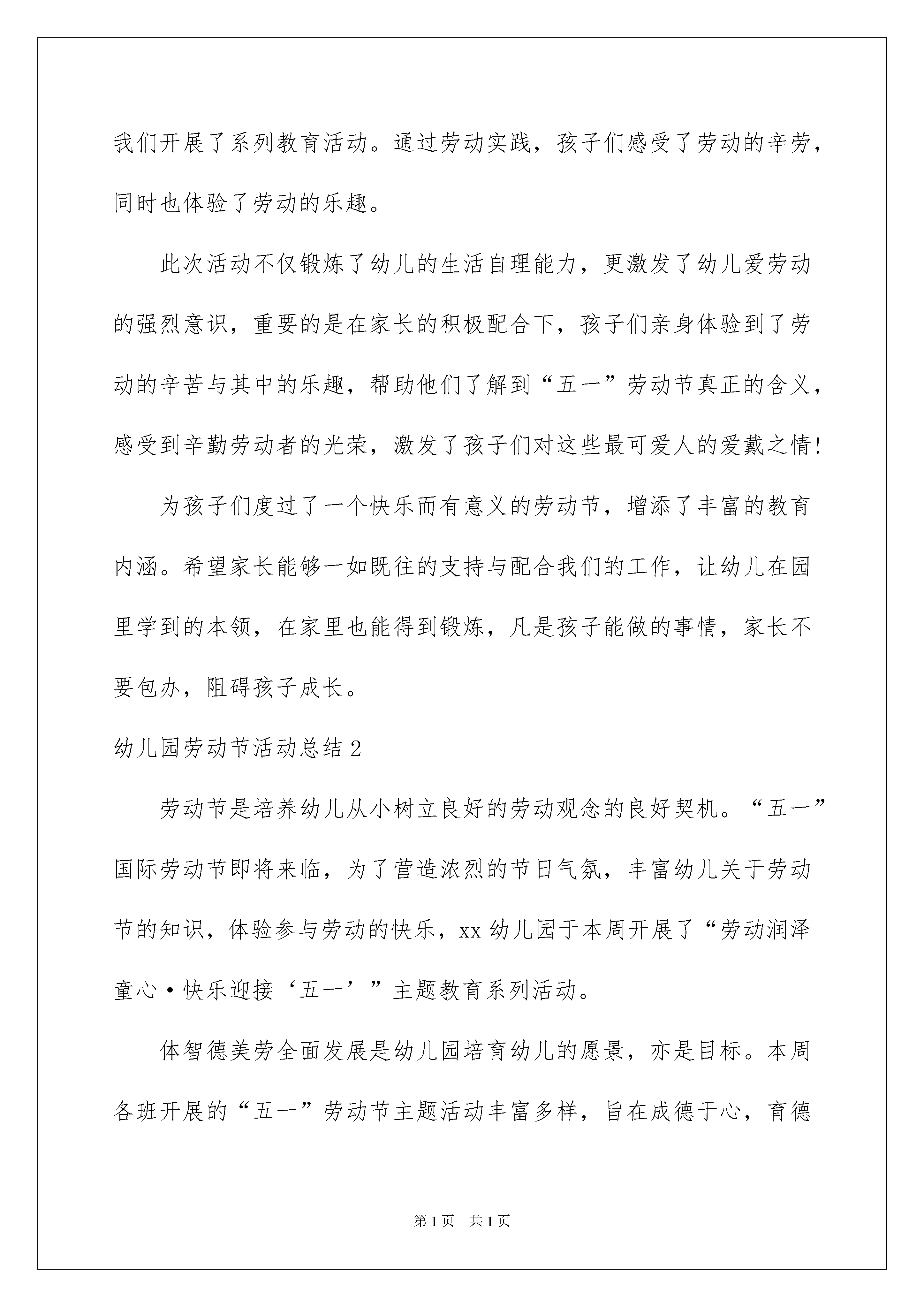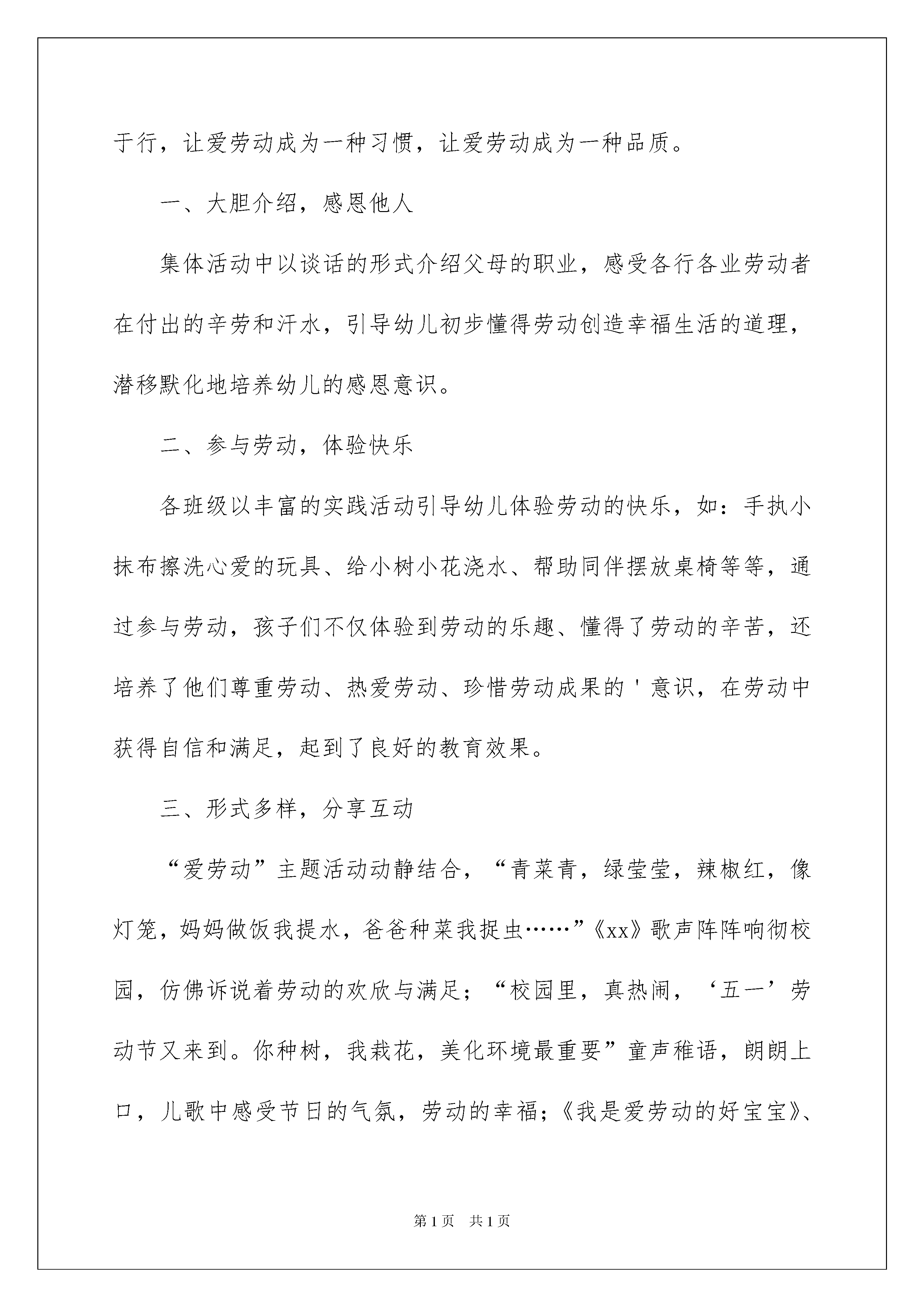 2022幼儿园劳动节活动总结幼儿园劳动节活动总结总结是在某一时期、某一项目或某些工作告一段落或者全部完成后进行回顾检查、分析评价,从而得出教训和一些规律性认识的一种书面材料,它可以明确下一步的工作方向,少走弯路,少犯错误,提高工作效益,因此我们需要回头归纳,写一份总结了。那么如何把总结写出新花样呢?下面是我收集整理的幼儿园劳动节活动总结,欢迎大家分享。幼儿园劳动节活动总结1在一年一度的“五一国际劳动节”来临之际,我园开展了“劳动最光荣”主题教育活动,为了让幼儿进一步了解“五一”国际劳动节的来历,让孩子们亲身体验到“以辛勤劳动为荣”,体验劳动的快乐,帮助孩子从小树立良好的道德观、荣辱观,教育幼儿从小热爱劳动,从自己做起,从小事做起,在自己的事情自己做的同时能为他人、为集体服务,培养幼儿的责任感和社会适应能力。在对孩子进行了“五一”国际劳动节的相关知识介绍的基础上,我们开展了系列教育活动。通过劳动实践,孩子们感受了劳动的辛劳,同时也体验了劳动的乐趣。此次活动不仅锻炼了幼儿的生活自理能力,更激发了幼儿爱劳动的强烈意识,重要的是在家长的积极配合下,孩子们亲身体验到了劳动的辛苦与其中的乐趣,帮助他们了解到“五一”劳动节真正的含义,感受到辛勤劳动者的光荣,激发了孩子们对这些最可爱人的爱戴之情!为孩子们度过了一个快乐而有意义的劳动节,增添了丰富的教育内涵。希望家长能够一如既往的支持与配合我们的工作,让幼儿在园里学到的本领,在家里也能得到锻炼,凡是孩子能做的事情,家长不要包办,阻碍孩子成长。幼儿园劳动节活动总结2劳动节是培养幼儿从小树立良好的劳动观念的良好契机。“五一”国际劳动节即将来临,为了营造浓烈的节日气氛,丰富幼儿关于劳动节的知识,体验参与劳动的快乐,xx幼儿园于本周开展了“劳动润泽童心·快乐迎接‘五一’”主题教育系列活动。体智德美劳全面发展是幼儿园培育幼儿的愿景,亦是目标。本周各班开展的“五一”劳动节主题活动丰富多样,旨在成德于心,育德于行,让爱劳动成为一种习惯,让爱劳动成为一种品质。一、大胆介绍,感恩他人集体活动中以谈话的形式介绍父母的职业,感受各行各业劳动者在付出的辛劳和汗水,引导幼儿初步懂得劳动创造幸福生活的道理,潜移默化地培养幼儿的感恩意识。二、参与劳动,体验快乐各班级以丰富的实践活动引导幼儿体验劳动的快乐,如:手执小抹布擦洗心爱的玩具、给小树小花浇水、帮助同伴摆放桌椅等等,通过参与劳动,孩子们不仅体验到劳动的乐趣、懂得了劳动的辛苦,还培养了他们尊重劳动、热爱劳动、珍惜劳动成果的'意识,在劳动中获得自信和满足,起到了良好的教育效果。三、形式多样,分享互动“爱劳动”主题活动动静结合,“青菜青,绿莹莹,辣椒红,像灯笼,妈妈做饭我提水,爸爸种菜我捉虫……”《xx》歌声阵阵响彻校园,仿佛诉说着劳动的欢欣与满足;“校园里,真热闹,‘五一’劳动节又来到。你种树,我栽花,美化环境最重要”童声稚语,朗朗上口,儿歌中感受节日的气氛,劳动的幸福;《我是爱劳动的好宝宝》、《最喜欢的人》等主题的展示劳动者的画面的作品栩栩如生,表达孩子们对劳动者的敬意。本周“劳动润泽童心·快乐迎接‘五一’”主题教育活动激发了孩子们爱劳动的意识,培养了爱劳”的意志品质,更进一步了解了“五一”劳动节真正的含义,激发了孩子们对劳动者的敬爱之情、感恩之意!希望小朋友们从小事做起,好好学习,长大用自己的劳动去创造更多的神奇,更多的美好!幼儿园劳动节活动总结3“五一”劳动节,是对孩子“以辛勤劳动为荣”进行教育极好的切入口,为了让幼儿了解和懂得尊重他人的劳动,激发幼儿的劳动激情,培养幼儿的劳动意识和劳动能力,我们开展了“劳动真光荣”的活动,使幼儿懂得劳动最光荣的道理。我们结合各班幼儿的年龄特点和接受能力,开展了不同程度的劳动训练。首先,我们向幼儿介绍了五一劳动节的来历,介绍了各行各业不同阶层的劳动者,并说出他们的辛苦,让幼儿深知劳动是最光荣的事情,潜移默化的培养幼儿的劳动意识。通过开展这一主题教育活动,增强了幼儿理解劳动、尊重劳动、热爱劳动的意识,孩子们在活动中感受了劳动的辛苦,同时也体验了劳动的乐趣,体会了劳动的真正意义。无论是风里,还是在雨里,我都在这里守候着你~幼儿园劳动节活动总结4五一劳动节是一个重要的节日资源,是培养孩子从小树立良好的劳动观念,体验劳动快乐的良好开端,为了更好的激发孩子们爱劳动的情感,促进他们更好地理解“劳动节”的意义。值“五一”劳动节来临之际,为了让幼儿懂得尊重他人劳动成果,培养幼儿劳动意识和劳动能力。20xx年4月30日我园开展了“劳动最光荣”五一劳动节主题教育活动。活动共分为4个部分,包括:学习