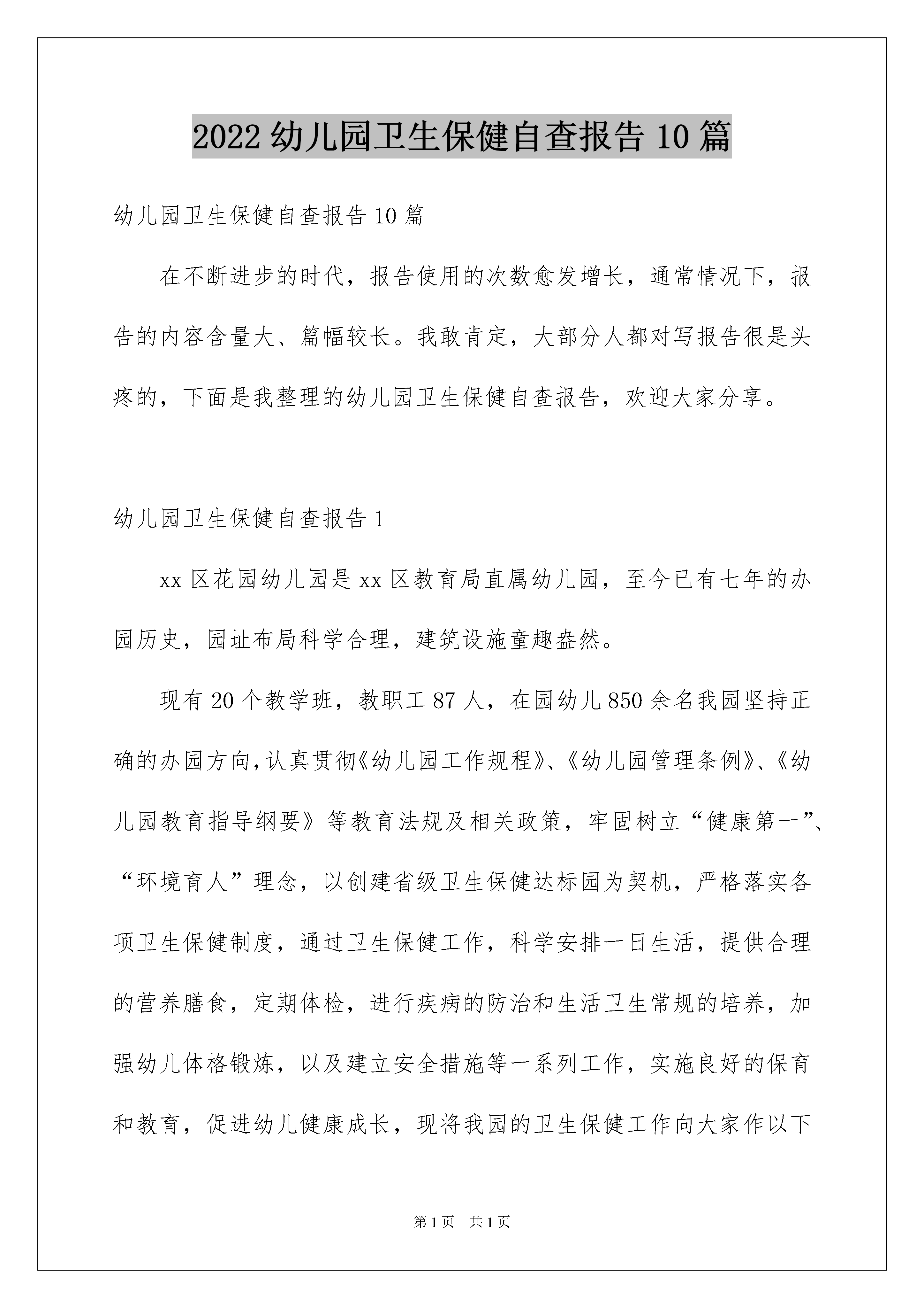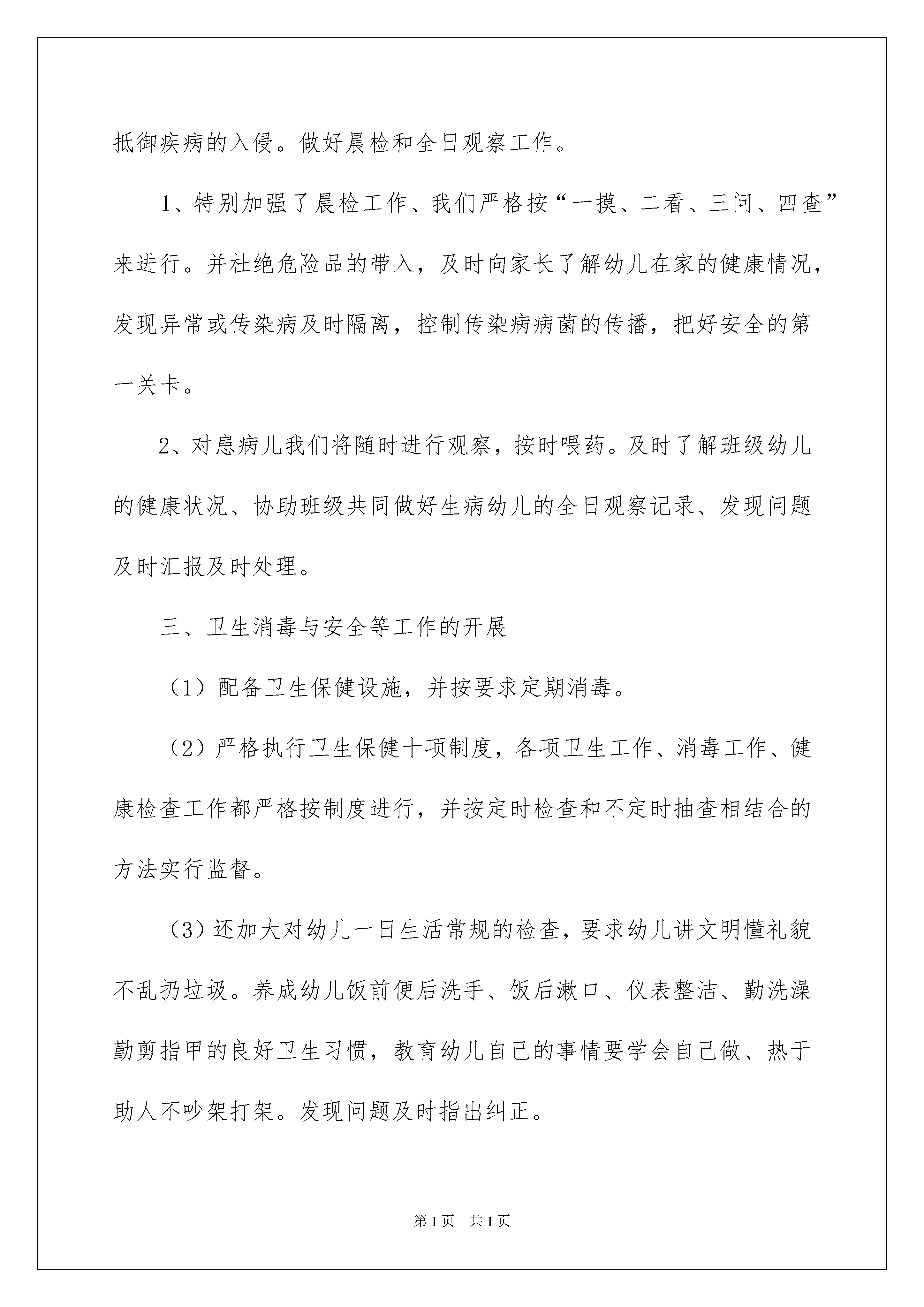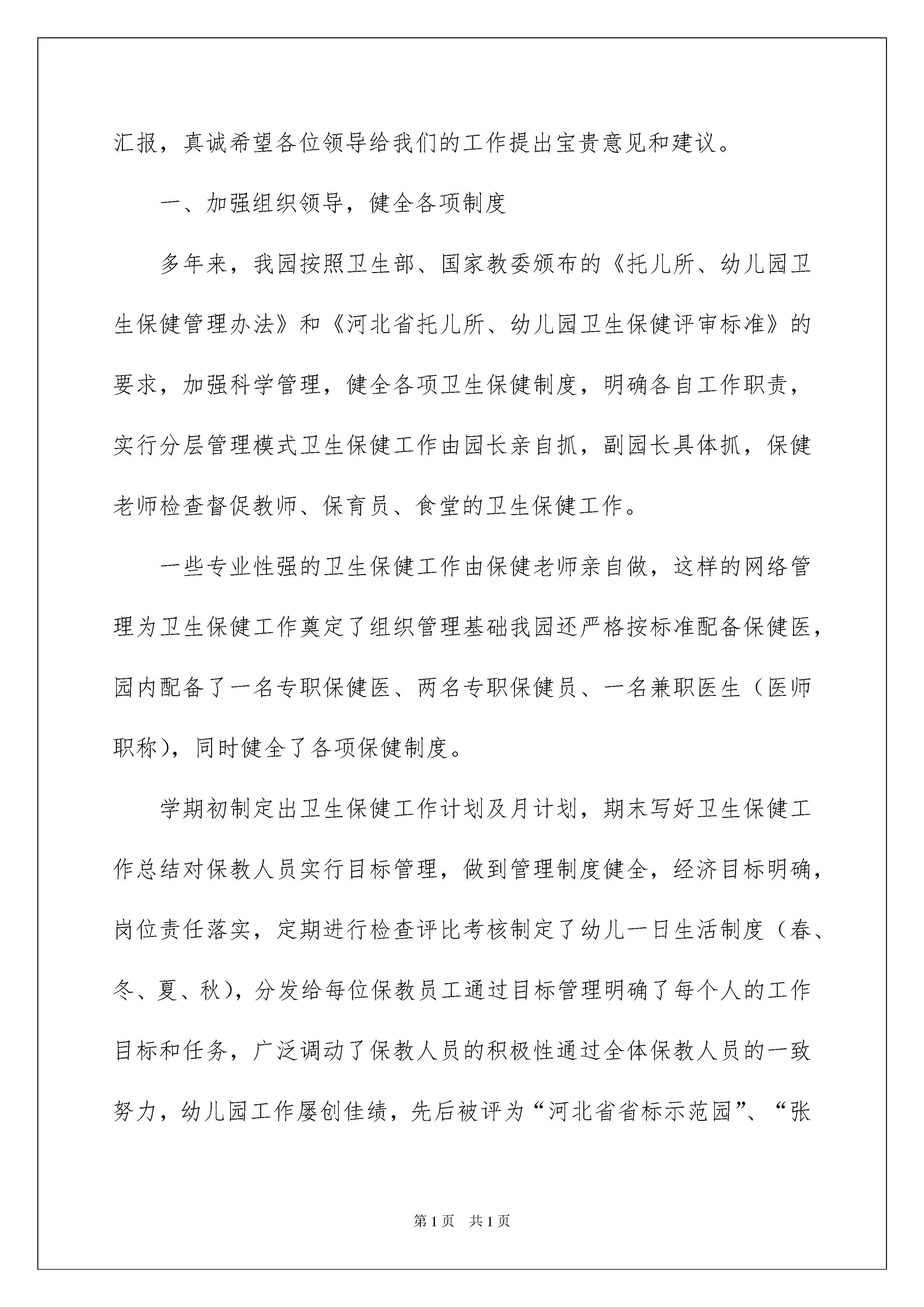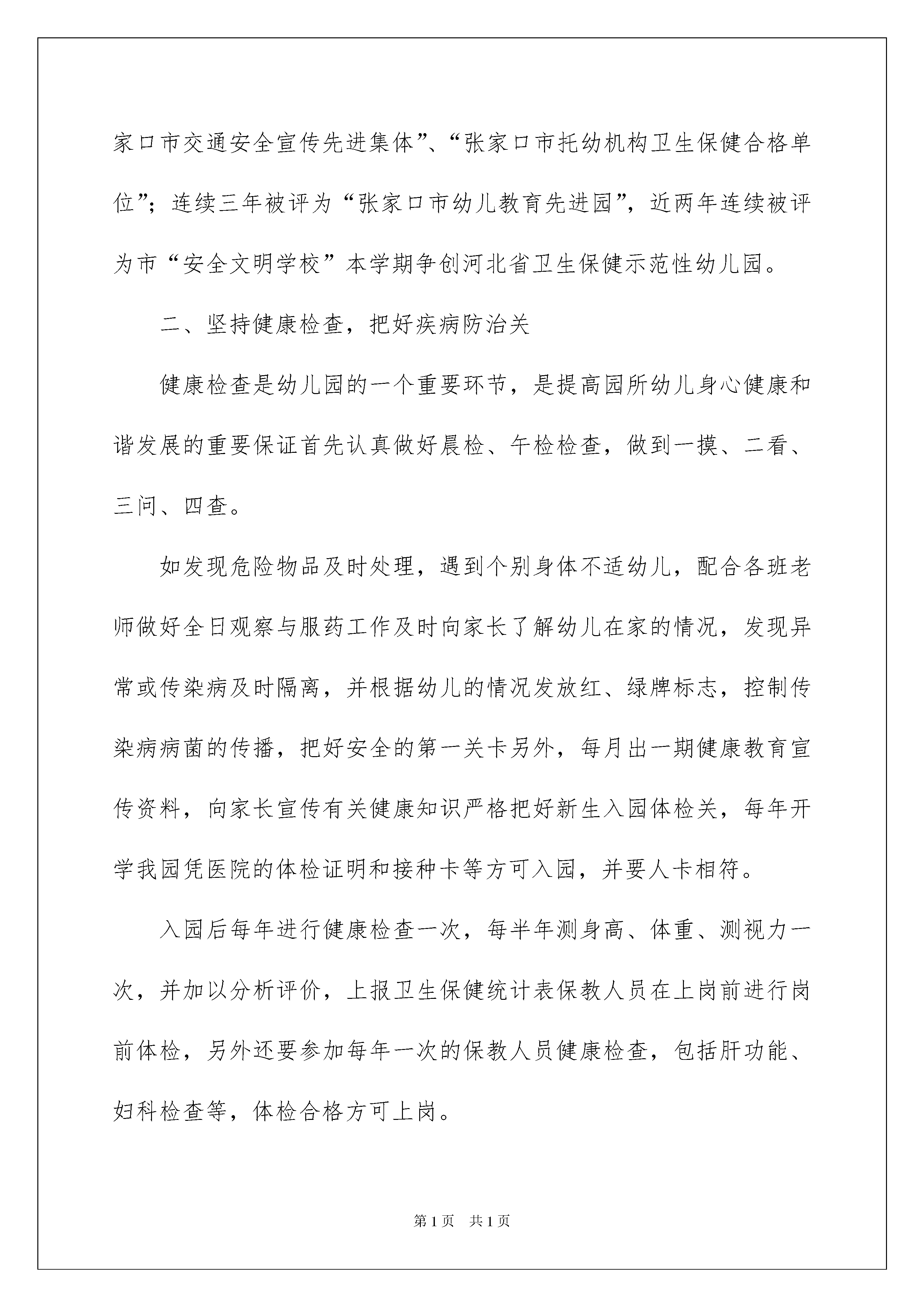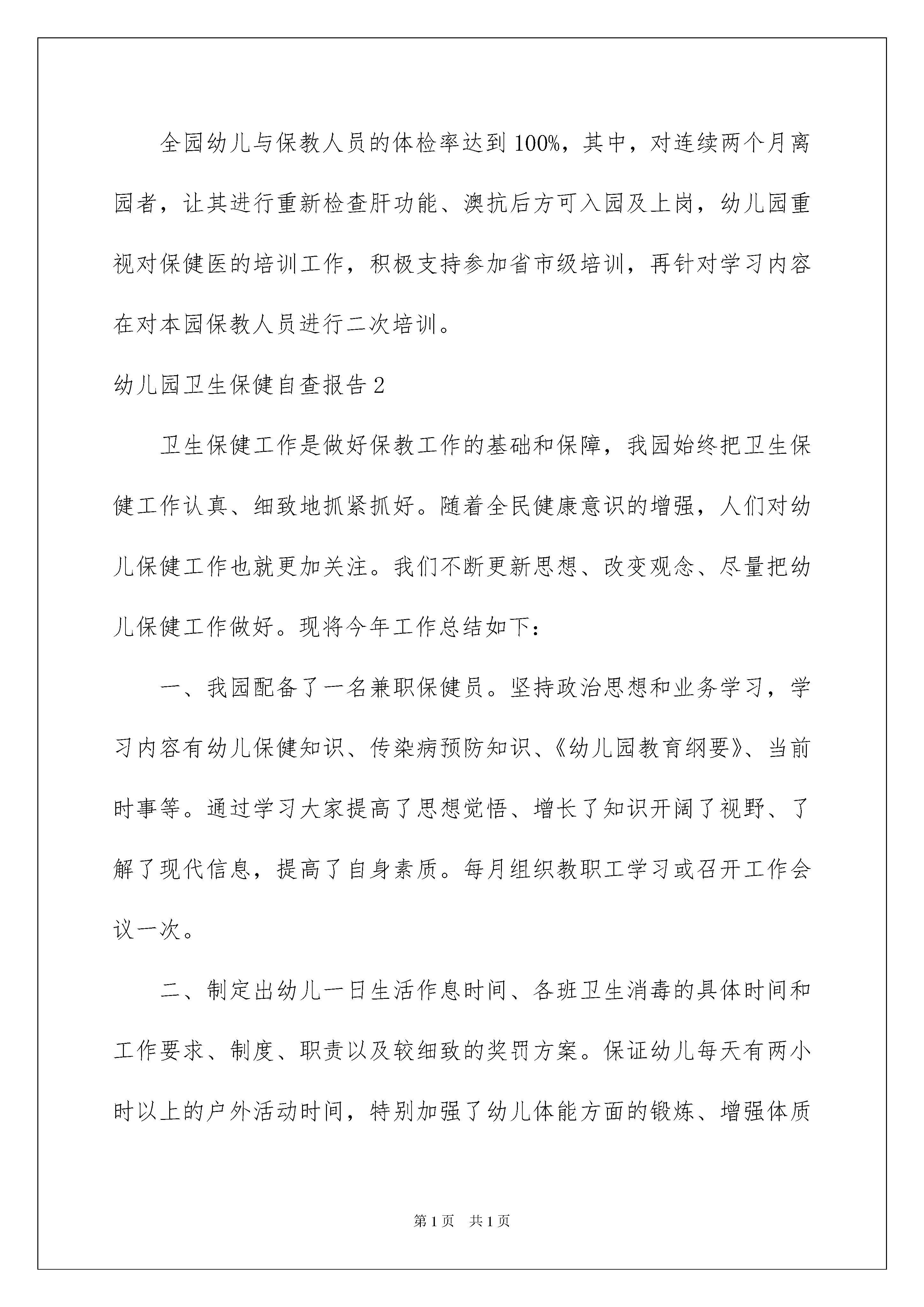 2022幼儿园卫生保健自查报告10篇幼儿园卫生保健自查报告10篇在不断进步的时代,报告使用的次数愈发增长,通常情况下,报告的内容含量大、篇幅较长。我敢肯定,大部分人都对写报告很是头疼的,下面是我整理的幼儿园卫生保健自查报告,欢迎大家分享。幼儿园卫生保健自查报告1xx区花园幼儿园是xx区教育局直属幼儿园,至今已有七年的办园历史,园址布局科学合理,建筑设施童趣盎然。现有20个教学班,教职工87人,在园幼儿850余名我园坚持正确的办园方向,认真贯彻《幼儿园工作规程》、《幼儿园管理条例》、《幼儿园教育指导纲要》等教育法规及相关政策,牢固树立“健康第一”、“环境育人”理念,以创建省级卫生保健达标园为契机,严格落实各项卫生保健制度,通过卫生保健工作,科学安排一日生活,提供合理的营养膳食,定期体检,进行疾病的防治和生活卫生常规的培养,加强幼儿体格锻炼,以及建立安全措施等一系列工作,实施良好的保育和教育,促进幼儿健康成长,现将我园的卫生保健工作向大家作以下汇报,真诚希望各位领导给我们的工作提出宝贵意见和建议。一、加强组织领导,健全各项制度多年来,我园按照卫生部、国家教委颁布的《托儿所、幼儿园卫生保健管理办法》和《河北省托儿所、幼儿园卫生保健评审标准》的要求,加强科学管理,健全各项卫生保健制度,明确各自工作职责,实行分层管理模式卫生保健工作由园长亲自抓,副园长具体抓,保健老师检查督促教师、保育员、食堂的卫生保健工作。一些专业性强的卫生保健工作由保健老师亲自做,这样的网络管理为卫生保健工作奠定了组织管理基础我园还严格按标准配备保健医,园内配备了一名专职保健医、两名专职保健员、一名兼职医生(医师职称),同时健全了各项保健制度。学期初制定出卫生保健工作计划及月计划,期末写好卫生保健工作总结对保教人员实行目标管理,做到管理制度健全,经济目标明确,岗位责任落实,定期进行检查评比考核制定了幼儿一日生活制度(春、冬、夏、秋),分发给每位保教员工通过目标管理明确了每个人的工作目标和任务,广泛调动了保教人员的积极性通过全体保教人员的一致努力,幼儿园工作屡创佳绩,先后被评为“河北省省标示范园”、“张家口市交通安全宣传先进集体”、“张家口市托幼机构卫生保健合格单位”;连续三年被评为“张家口市幼儿教育先进园”,近两年连续被评为市“安全文明学校”本学期争创河北省卫生保健示范性幼儿园。二、坚持健康检查,把好疾病防治关健康检查是幼儿园的一个重要环节,是提高园所幼儿身心健康和谐发展的重要保证首先认真做好晨检、午检检查,做到一摸、二看、三问、四查。如发现危险物品及时处理,遇到个别身体不适幼儿,配合各班老师做好全日观察与服药工作及时向家长了解幼儿在家的情况,发现异常或传染病及时隔离,并根据幼儿的情况发放红、绿牌标志,控制传染病病菌的传播,把好安全的第一关卡另外,每月出一期健康教育宣传资料,向家长宣传有关健康知识严格把好新生入园体检关,每年开学我园凭医院的体检证明和接种卡等方可入园,并要人卡相符。入园后每年进行健康检查一次,每半年测身高、体重、测视力一次,并加以分析评价,上报卫生保健统计表保教人员在上岗前进行岗前体检,另外还要参加每年一次的保教人员健康检查,包括肝功能、妇科检查等,体检合格方可上岗。全园幼儿与保教人员的体检率达到100%,其中,对连续两个月离园者,让其进行重新检查肝功能、澳抗后方可入园及上岗,幼儿园重视对保健医的培训工作,积极支持参加省市级培训,再针对学习内容在对本园保教人员进行二次培训。幼儿园卫生保健自查报告2卫生保健工作是做好保教工作的基础和保障,我园始终把卫生保健工作认真、细致地抓紧抓好。随着全民健康意识的增强,人们对幼儿保健工作也就更加关注。我们不断更新思想、改变观念、尽量把幼儿保健工作做好。现将今年工作总结如下:一、我园配备了一名兼职保健员。坚持政治思想和业务学习,学习内容有幼儿保健知识、传染病预防知识、《幼儿园教育纲要》、当前时事等。通过学习大家提高了思想觉悟、增长了知识开阔了视野、了解了现代信息,提高了自身素质。每月组织教职工学习或召开工作会议一次。二、制定出幼儿一日生活作息时间、各班卫生消毒的具体时间和工作要求、制度、职责以及较细致的奖罚方案。保证幼儿每天有两小时以上的户外活动时间,特别加强了幼儿体能方面的锻炼、增强体质抵御疾病的入侵。做好晨检和全日观察工作。1、特别加强了晨检工作、我们严格按“一摸、二看、三问、四查”来进行。并杜绝危险品的带入,及时向家长了解幼儿在家的健康情况,发现异常或传染病及时隔离,控制传染病病菌的传播,把好安全的第一关卡。2、对患病儿我们将随时进行观察,按时喂药。及时了解