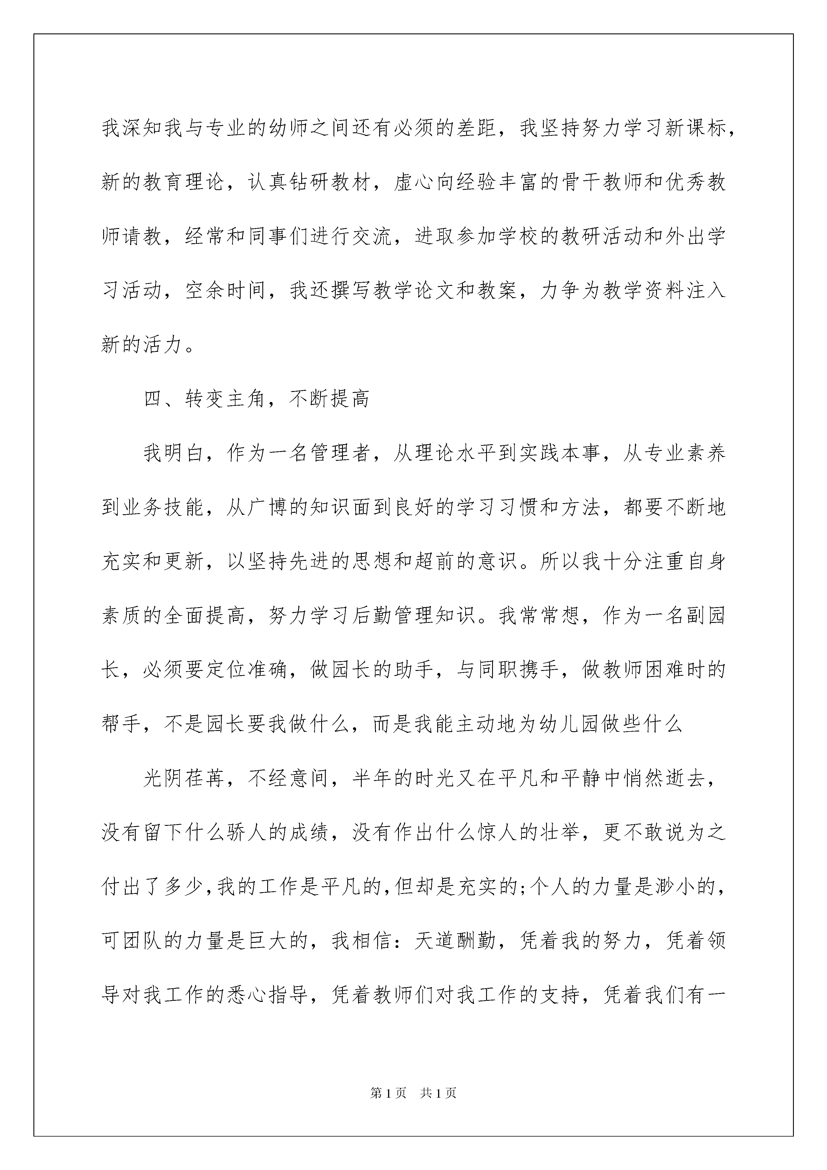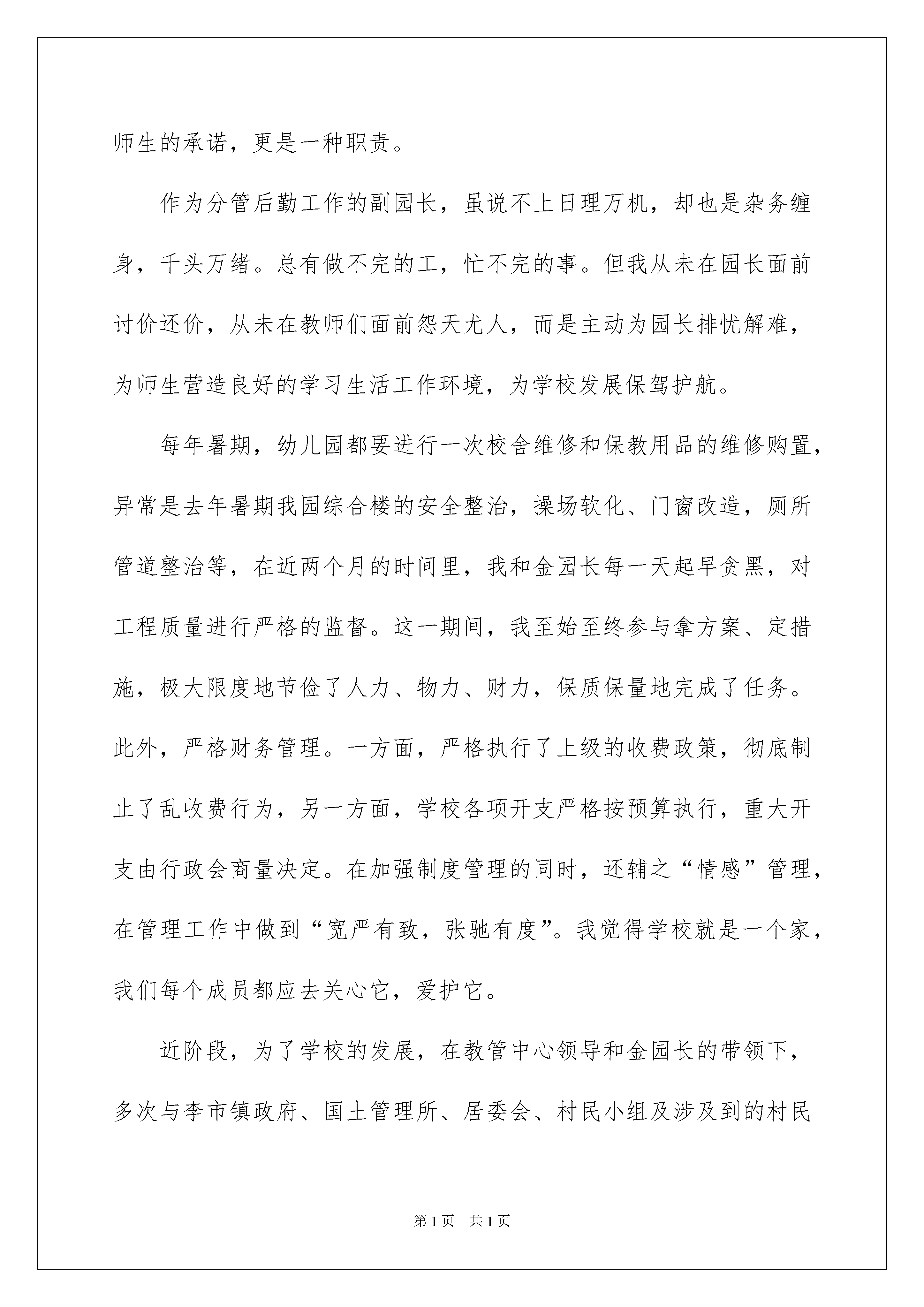2022幼儿园园长工作报告幼儿园园长工作报告随着个人的文明素养不断提升,报告的用途越来越大,报告包含标题、正文、结尾等。一听到写报告马上头昏脑涨?下面是我精心整理的幼儿园园长工作报告,欢迎大家借鉴与参考,希望对大家有所帮助。幼儿园园长工作报告1尊敬的各位领导、教师们:大家好!首先,我想说,我是个幸运的人,有人给我关怀,有人给我帮忙,有人给我支持,有人送我温暖,这些人就是你们,我的领导和同事们,今日我满怀感恩的心,对你们表示我最真诚的感激!20xx月8月对我来说是人生路上的一个转折,我被任命为李市幼儿园副园长,作为园长的助手,我肩挑着后勤的重担,追寻着“认真做事,勤谨做人”的不变信念,带着领导和全体教师的信任与期待,肩负的职责没有变,忙碌而充实的生活节奏没有变,对生活的热爱对工作的热情没有变,我依然是辛苦而欣慰、劳累而欢乐,享受着默默奉献的那份完美!为了在前行的路上走得更稳、更快,现将我所做的工作总结汇报如下:一、求真务实、廉洁自律作为一名共产党员,我始终坚持政治理论学习,重视理论联系实际,紧跟时代步伐,与时俱进,在思想与行动上努力发挥共产党员的先锋模范作用,抵制各种不良侵蚀,增强抗腐防变本事。在工作中,我以身作则、实事求是,忠于职守,爱岗敬业;在生活中,我与人为善,坦诚相待,以实际行动影响人,感染人,努力营造团结向上的工作氛围,和同事们建立了深厚的感情和友谊,在思想、言论、行为等方面进取为师生起好表率作用。二、甘于奉献,诚实敬业后勤工作琐碎而繁杂,没有甘于奉献,诚实敬业的精神,是难以胜任的。所以,我们进取树立职责意识,发扬高度负责的精神,自觉做到标准上求高,措施上求严,工作上求实,尽心尽力,尽职尽责,工作中虽然苦了一点,累了一点,可是幼儿和教师们的需要就是后勤工作的方向,为保教工作架桥铺路、为教职工服务不仅仅是我服务于师生的承诺,更是一种职责。作为分管后勤工作的副园长,虽说不上日理万机,却也是杂务缠身,千头万绪。总有做不完的工,忙不完的事。但我从未在园长面前讨价还价,从未在教师们面前怨天尤人,而是主动为园长排忧解难,为师生营造良好的学习生活工作环境,为学校发展保驾护航。每年暑期,幼儿园都要进行一次校舍维修和保教用品的维修购置,异常是去年暑期我园综合楼的安全整治,操场软化、门窗改造,厕所管道整治等,在近两个月的时间里,我和金园长每一天起早贪黑,对工程质量进行严格的监督。这一期间,我至始至终参与拿方案、定措施,极大限度地节俭了人力、物力、财力,保质保量地完成了任务。此外,严格财务管理。一方面,严格执行了上级的收费政策,彻底制止了乱收费行为,另一方面,学校各项开支严格按预算执行,重大开支由行政会商量决定。在加强制度管理的同时,还辅之“情感”管理,在管理工作中做到“宽严有致,张驰有度”。我觉得学校就是一个家,我们每个成员都应去关心它,爱护它。近阶段,为了学校的发展,在教管中心领导和金园长的带领下,多次与李市镇政府、国土管理所、居委会、村民小组及涉及到的村民进行协商征地事宜,做了很多艰苦而细致的工作,还与教委基建科领导联系,反复对各个地块勘测研究比较,为李市幼儿园最终的迁建工作奠定了坚实的基础。为了保证园内的固定资产不流失,保证保教工作的顺利进行,我还定期对固定资产进行清理,并建好固定资产帐和领物登记,属于班上固定使用的财产在每个学期开学前清点后移交给班主任,期末进行清理核实后交学校统一保管。同时,定期核对设备用具,定期检查及时维修、保证安全使用,学校很多设施虽然比较新,但毛病却不可避免。比如厕所和洗手池的水龙头,教室里的电灯、电扇,还有一些电教设备,如录音机、电脑等。我们放弃休息时间,自我对这些设施设备进行维修,虽然比较辛苦,但为学校节省了不少开支。看着师生们能够正常地使用这些设施、设备,我感到十分的高兴。此外,对领导临时安排的工作任务,不管是份内的、还是份外的,我都乐意理解,并认真完成,表现出了一名优秀共产党员应有的政治觉悟和优秀品格,发挥了党员的先锋模范作用。三、教书育人,为人师表在纷繁复杂的行政工作中,我还担任了大一班的健康教育工作。我深知我与专业的幼师之间还有必须的差距,我坚持努力学习新课标,新的教育理论,认真钻研教材,虚心向经验丰富的骨干教师和优秀教师请教,经常和同事们进行交流,进取参加学校的教研活动和外出学习活动,空余时间,我还撰写教学论文和教案,力争为教学资料注入新的活力。四、转变主角,不断提高我明白,作为一名管理者,从理论水平到实践本事,从专业素养到业务技能,从广博的知识面到良好的学习习惯和方法,都要不断地充实和更新,以坚持先进的思想和超前的意识。所以我十分注重自