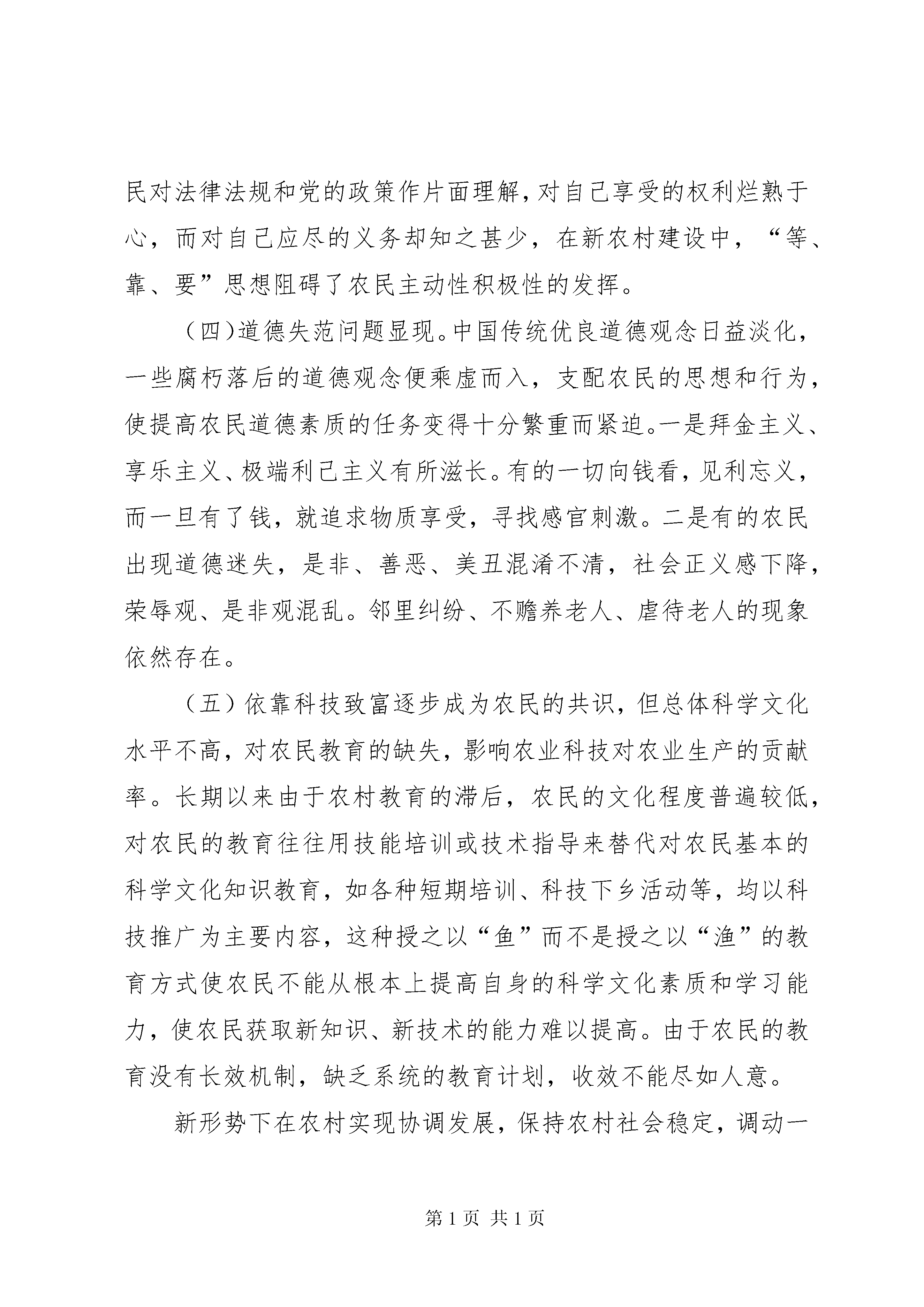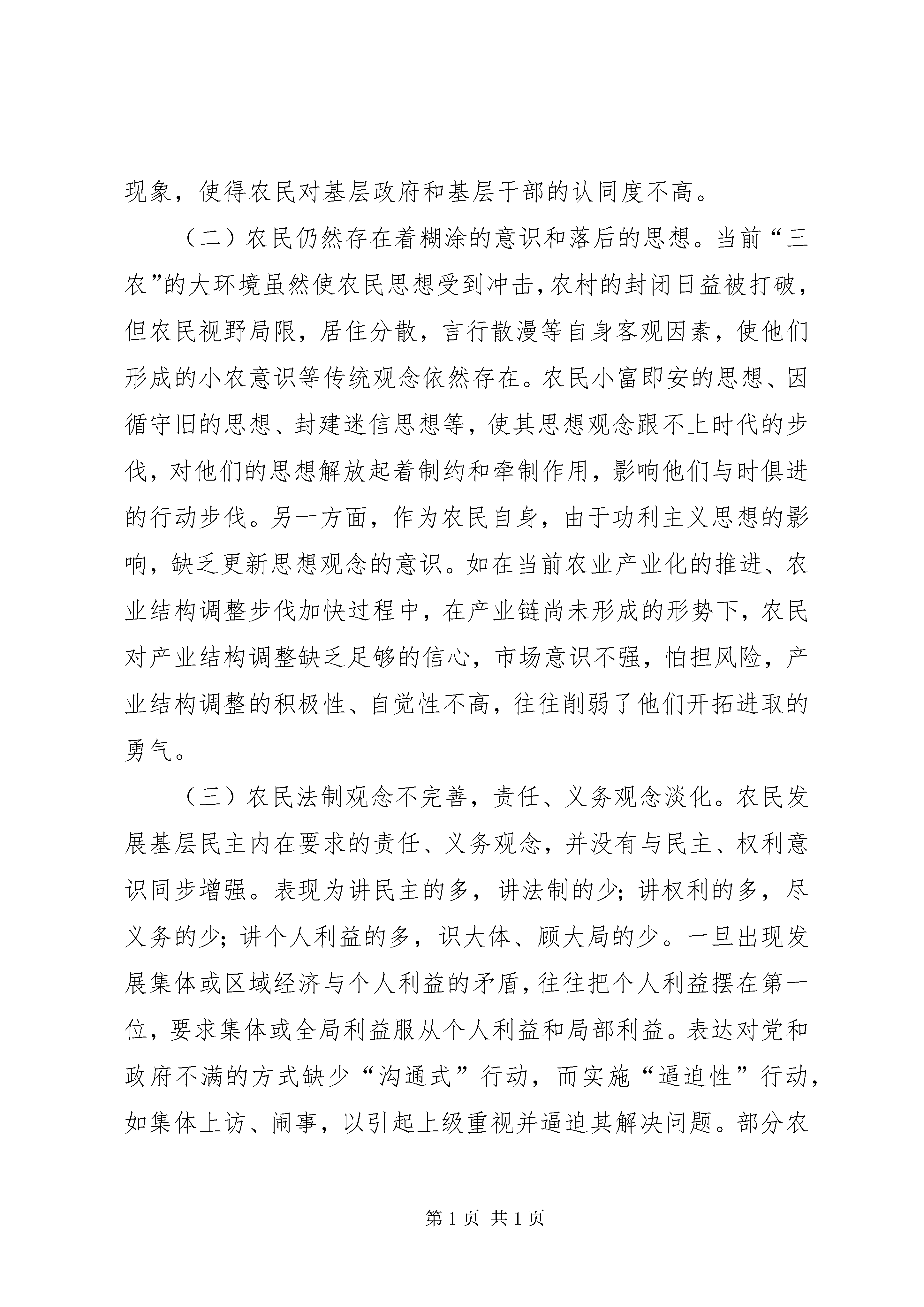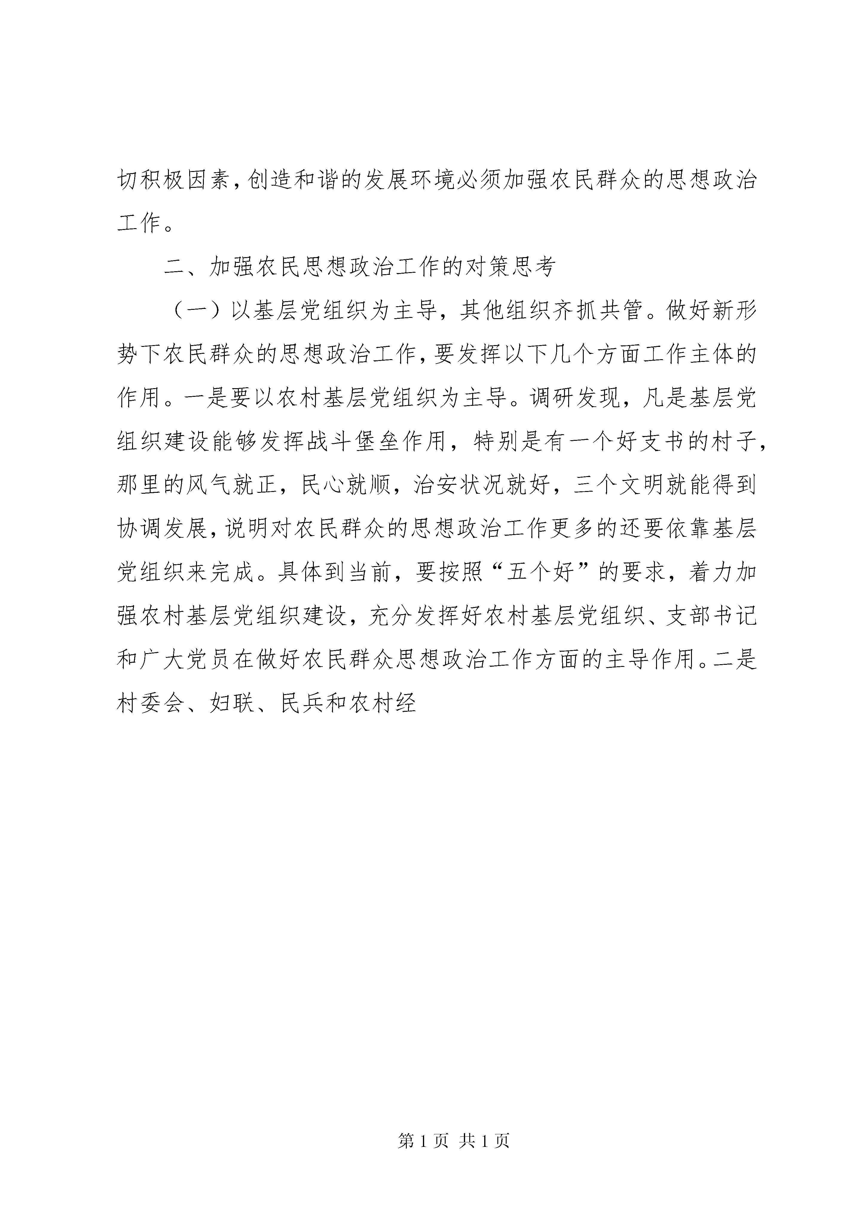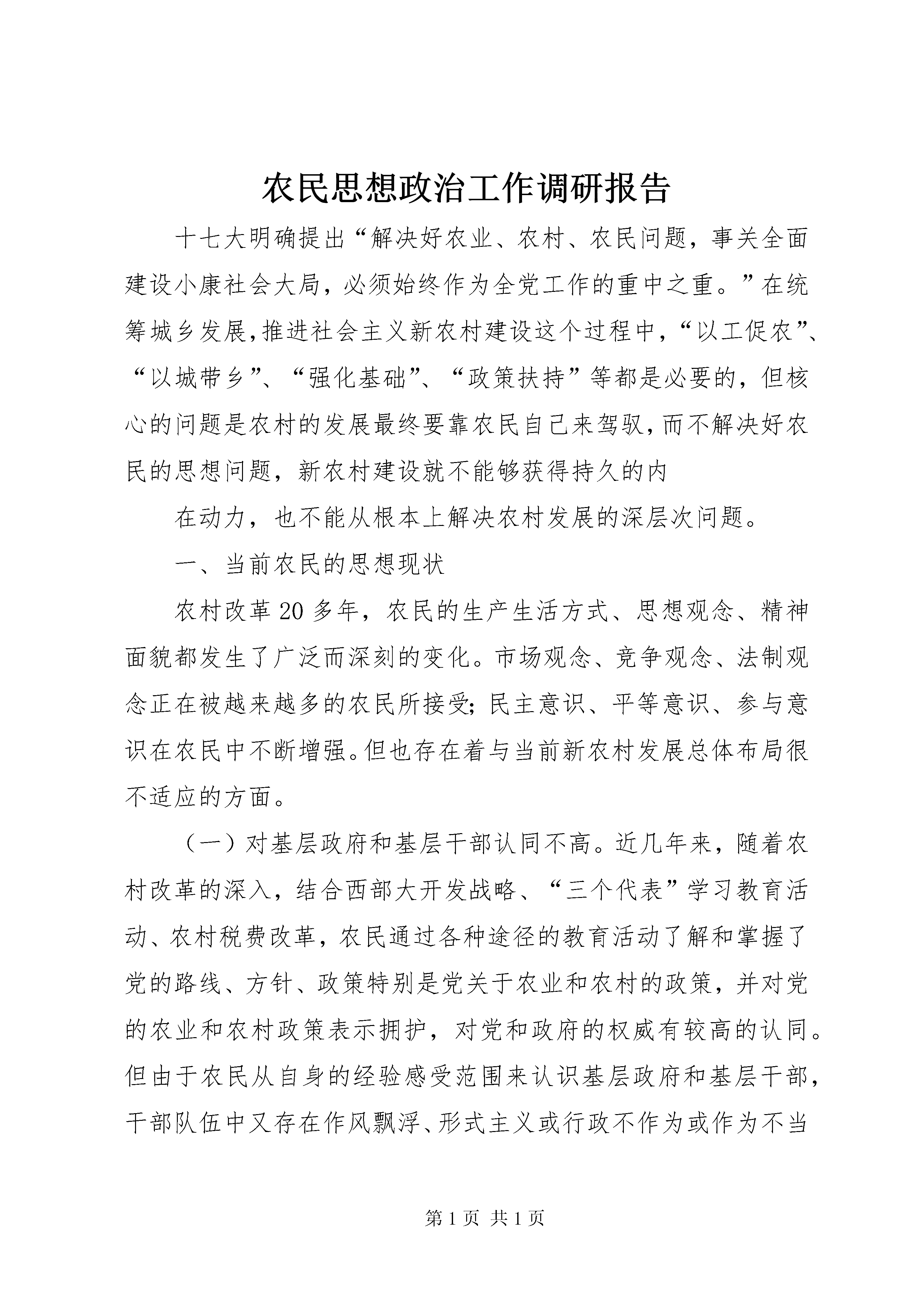 农民思想政治工作调研报告十七大明确提出“解决好农业、农村、农民问题,事关全面建设小康社会大局,必须始终作为全党工作的重中之重。”在统筹城乡发展,推进社会主义新农村建设这个过程中,“以工促农”、“以城带乡”、“强化基础”、“政策扶持”等都是必要的,但核心的问题是农村的发展最终要靠农民自己来驾驭,而不解决好农民的思想问题,新农村建设就不能够获得持久的内在动力,也不能从根本上解决农村发展的深层次问题。一、当前农民的思想现状农村改革20多年,农民的生产生活方式、思想观念、精神面貌都发生了广泛而深刻的变化。市场观念、竞争观念、法制观念正在被越来越多的农民所接受;民主意识、平等意识、参与意识在农民中不断增强。但也存在着与当前新农村发展总体布局很不适应的方面。(一)对基层政府和基层干部认同不高。近几年来,随着农村改革的深入,结合西部大开发战略、“三个代表”学习教育活动、农村税费改革,农民通过各种途径的教育活动了解和掌握了党的路线、方针、政策特别是党关于农业和农村的政策,并对党的农业和农村政策表示拥护,对党和政府的权威有较高的认同。但由于农民从自身的经验感受范围来认识基层政府和基层干部,干部队伍中又存在作风飘浮、形式主义或行政不作为或作为不当现象,使得农民对基层政府和基层干部的认同度不高。(二)农民仍然存在着糊涂的意识和落后的思想。当前“三农”的大环境虽然使农民思想受到冲击,农村的封闭日益被打破,但农民视野局限,居住分散,言行散漫等自身客观因素,使他们形成的小农意识等传统观念依然存在。农民小富即安的思想、因循守旧的思想、封建迷信思想等,使其思想观念跟不上时代的步伐,对他们的思想解放起着制约和牵制作用,影响他们与时俱进的行动步伐。另一方面,作为农民自身,由于功利主义思想的影响,缺乏更新思想观念的意识。如在当前农业产业化的推进、农业结构调整步伐加快过程中,在产业链尚未形成的形势下,农民对产业结构调整缺乏足够的信心,市场意识不强,怕担风险,产业结构调整的积极性、自觉性不高,往往削弱了他们开拓进取的勇气。(三)农民法制观念不完善,责任、义务观念淡化。农民发展基层民主内在要求的责任、义务观念,并没有与民主、权利意识同步增强。表现为讲民主的多,讲法制的少;讲权利的多,尽义务的少;讲个人利益的多,识大体、顾大局的少。一旦出现发展集体或区域经济与个人利益的矛盾,往往把个人利益摆在第一位,要求集体或全局利益服从个人利益和局部利益。表达对党和政府不满的方式缺少“沟通式”行动,而实施“逼迫性”行动,如集体上访、闹事,以引起上级重视并逼迫其解决问题。部分农民对法律法规和党的政策作片面理解,对自己享受的权利烂熟于心,而对自己应尽的义务却知之甚少,在新农村建设中,“等、靠、要”思想阻碍了农民主动性积极性的发挥。(四)道德失范问题显现。中国传统优良道德观念日益淡化,一些腐朽落后的道德观念便乘虚而入,支配农民的思想和行为,使提高农民道德素质的任务变得十分繁重而紧迫。一是拜金主义、享乐主义、极端利己主义有所滋长。有的一切向钱看,见利忘义,而一旦有了钱,就追求物质享受,寻找感官刺激。二是有的农民出现道德迷失,是非、善恶、美丑混淆不清,社会正义感下降,荣辱观、是非观混乱。邻里纠纷、不赡养老人、虐待老人的现象依然存在。(五)依靠科技致富逐步成为农民的共识,但总体科学文化水平不高,对农民教育的缺失,影响农业科技对农业生产的贡献率。长期以来由于农村教育的滞后,农民的文化程度普遍较低,对农民的教育往往用技能培训或技术指导来替代对农民基本的科学文化知识教育,如各种短期培训、科技下乡活动等,均以科技推广为主要内容,这种授之以“鱼”而不是授之以“渔”的教育方式使农民不能从根本上提高自身的科学文化素质和学习能力,使农民获取新知识、新技术的能力难以提高。由于农民的教育没有长效机制,缺乏系统的教育计划,收效不能尽如人意。新形势下在农村实现协调发展,保持农村社会稳定,调动一切积极因素,创造和谐的发展环境必须加强农民群众的思想政治工作。二、加强农民思想政治工作的对策思考(一)以基层党组织为主导,其他组织齐抓共管。做好新形势下农民群众的思想政治工作,要发挥以下几个方面工作主体的作用。一是要以农村基层党组织为主导。调研发现,凡是基层党组织建设能够发挥战斗堡垒作用,特别是有一个好支书的村子,那里的风气就正,民心就顺,治安状况就好,三个文明就能得到协调发展,说明对农民群众的思想政治工作更多的还要依靠基层党组织来完成。具体到当前,要按照“五个好”的要求,着力加强农村基层党组织建设,充分发挥好农村基层党组织、支部书记和广大党员在做好农民群众思想政治工作方面的主导作用。二是村委会、妇联、民兵和农村经