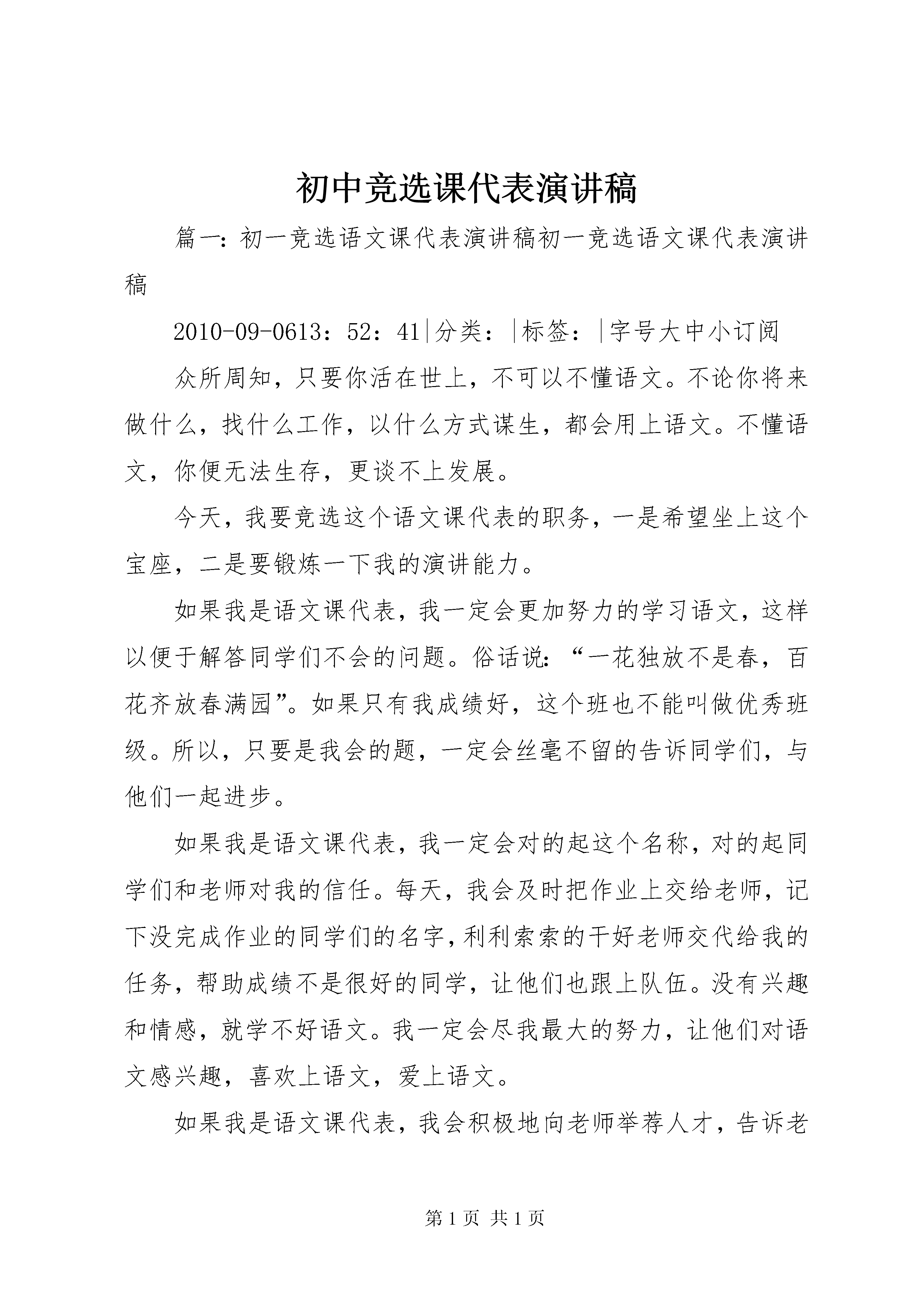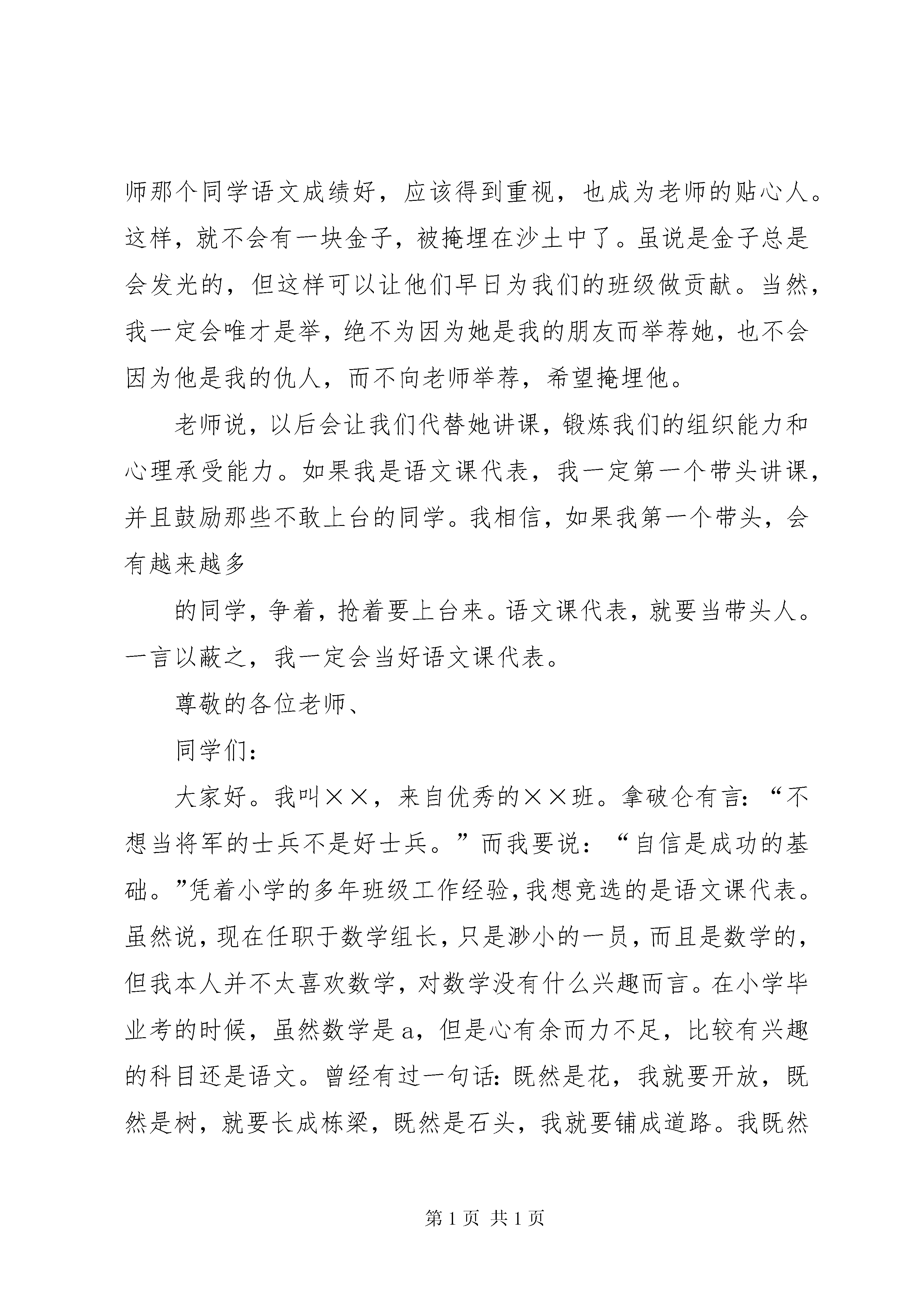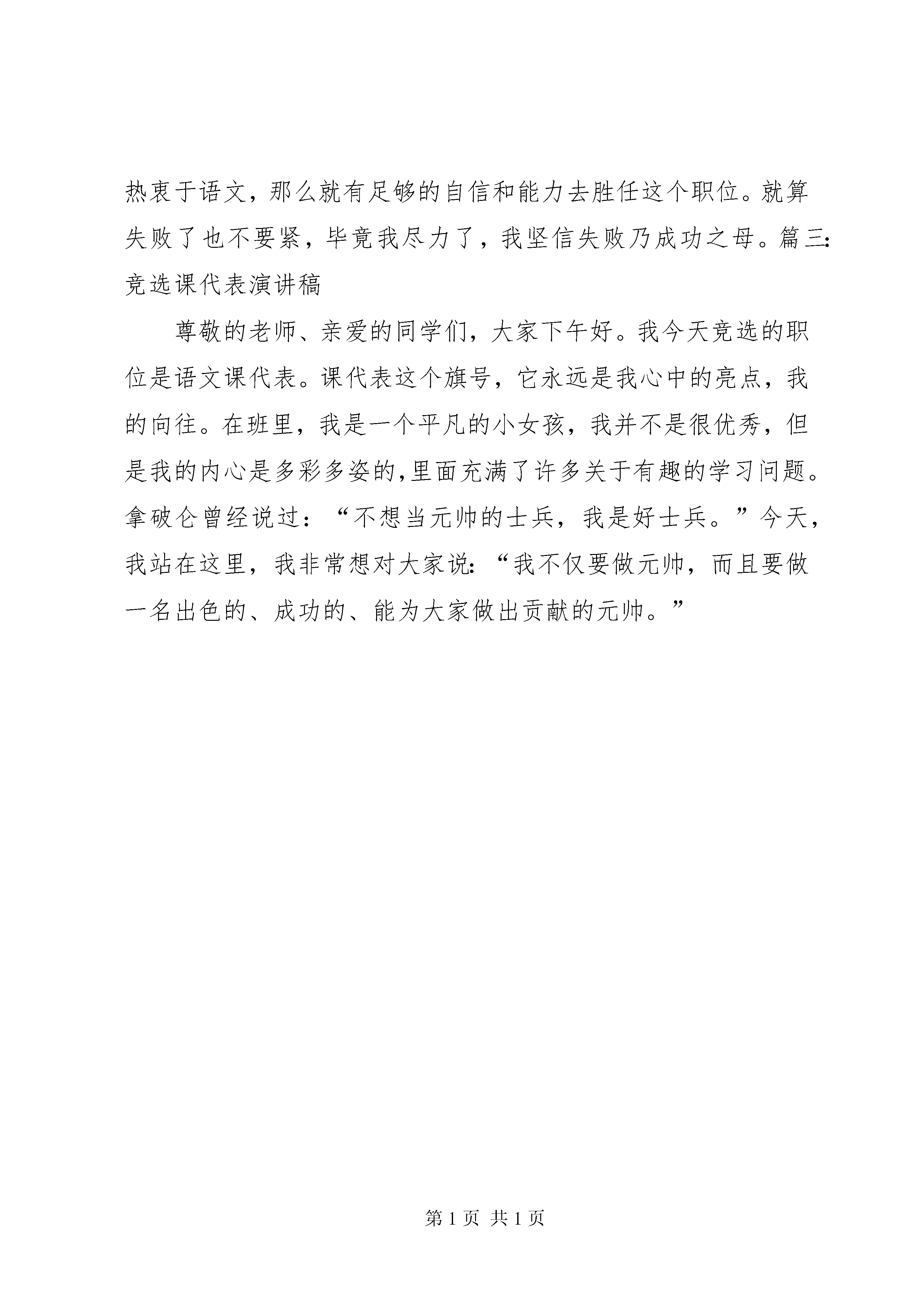 初中竞选课代表演讲稿篇一:初一竞选语文课代表演讲稿初一竞选语文课代表演讲稿2010-09-0613:52:41|分类:|标签:|字号大中小订阅众所周知,只要你活在世上,不可以不懂语文。不论你将来做什么,找什么工作,以什么方式谋生,都会用上语文。不懂语文,你便无法生存,更谈不上发展。今天,我要竞选这个语文课代表的职务,一是希望坐上这个宝座,二是要锻炼一下我的演讲能力。如果我是语文课代表,我一定会更加努力的学习语文,这样以便于解答同学们不会的问题。俗话说:“一花独放不是春,百花齐放春满园”。如果只有我成绩好,这个班也不能叫做优秀班级。所以,只要是我会的题,一定会丝毫不留的告诉同学们,与他们一起进步。如果我是语文课代表,我一定会对的起这个名称,对的起同学们和老师对我的信任。每天,我会及时把作业上交给老师,记下没完成作业的同学们的名字,利利索索的干好老师交代给我的任务,帮助成绩不是很好的同学,让他们也跟上队伍。没有兴趣和情感,就学不好语文。我一定会尽我最大的努力,让他们对语文感兴趣,喜欢上语文,爱上语文。如果我是语文课代表,我会积极地向老师举荐人才,告诉老师那个同学语文成绩好,应该得到重视,也成为老师的贴心人。这样,就不会有一块金子,被掩埋在沙土中了。虽说是金子总是会发光的,但这样可以让他们早日为我们的班级做贡献。当然,我一定会唯才是举,绝不为因为她是我的朋友而举荐她,也不会因为他是我的仇人,而不向老师举荐,希望掩埋他。老师说,以后会让我们代替她讲课,锻炼我们的组织能力和心理承受能力。如果我是语文课代表,我一定第一个带头讲课,并且鼓励那些不敢上台的同学。我相信,如果我第一个带头,会有越来越多的同学,争着,抢着要上台来。语文课代表,就要当带头人。一言以蔽之,我一定会当好语文课代表。尊敬的各位老师、同学们:大家好。我叫××,来自优秀的××班。拿破仑有言:“不想当将军的士兵不是好士兵。”而我要说:“自信是成功的基础。”凭着小学的多年班级工作经验,我想竞选的是语文课代表。虽然说,现在任职于数学组长,只是渺小的一员,而且是数学的,但我本人并不太喜欢数学,对数学没有什么兴趣而言。在小学毕业考的时候,虽然数学是a,但是心有余而力不足,比较有兴趣的科目还是语文。曾经有过一句话:既然是花,我就要开放,既然是树,就要长成栋梁,既然是石头,我就要铺成道路。我既然热衷于语文,那么就有足够的自信和能力去胜任这个职位。就算失败了也不要紧,毕竟我尽力了,我坚信失败乃成功之母。篇三:竞选课代表演讲稿尊敬的老师、亲爱的同学们,大家下午好。我今天竞选的职位是语文课代表。课代表这个旗号,它永远是我心中的亮点,我的向往。在班里,我是一个平凡的小女孩,我并不是很优秀,但是我的内心是多彩多姿的,里面充满了许多关于有趣的学习问题。拿破仑曾经说过:“不想当元帅的士兵,我是好士兵。”今天,我站在这里,我非常想对大家说:“我不仅要做元帅,而且要做一名出色的、成功的、能为大家做出贡献的元帅。”