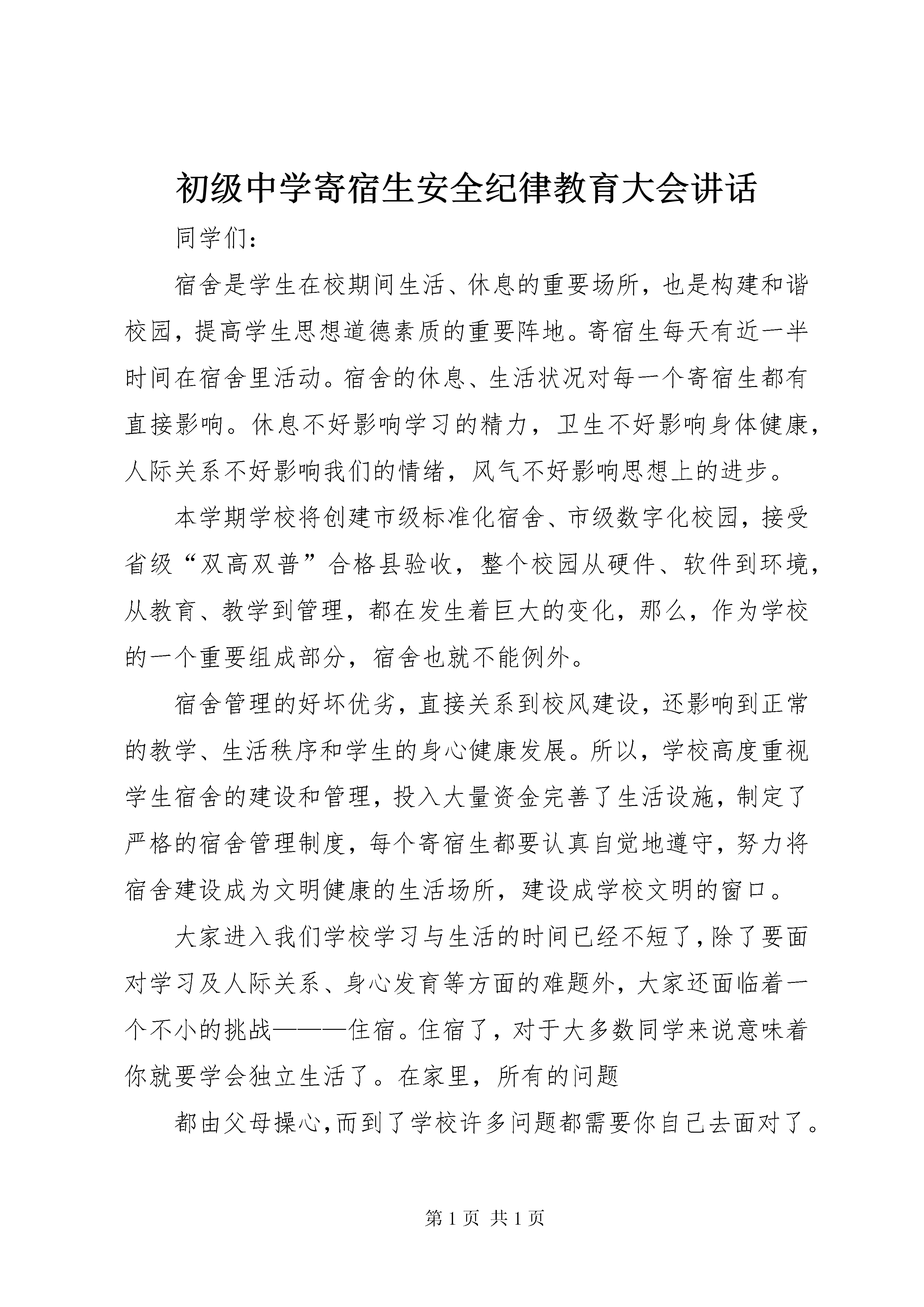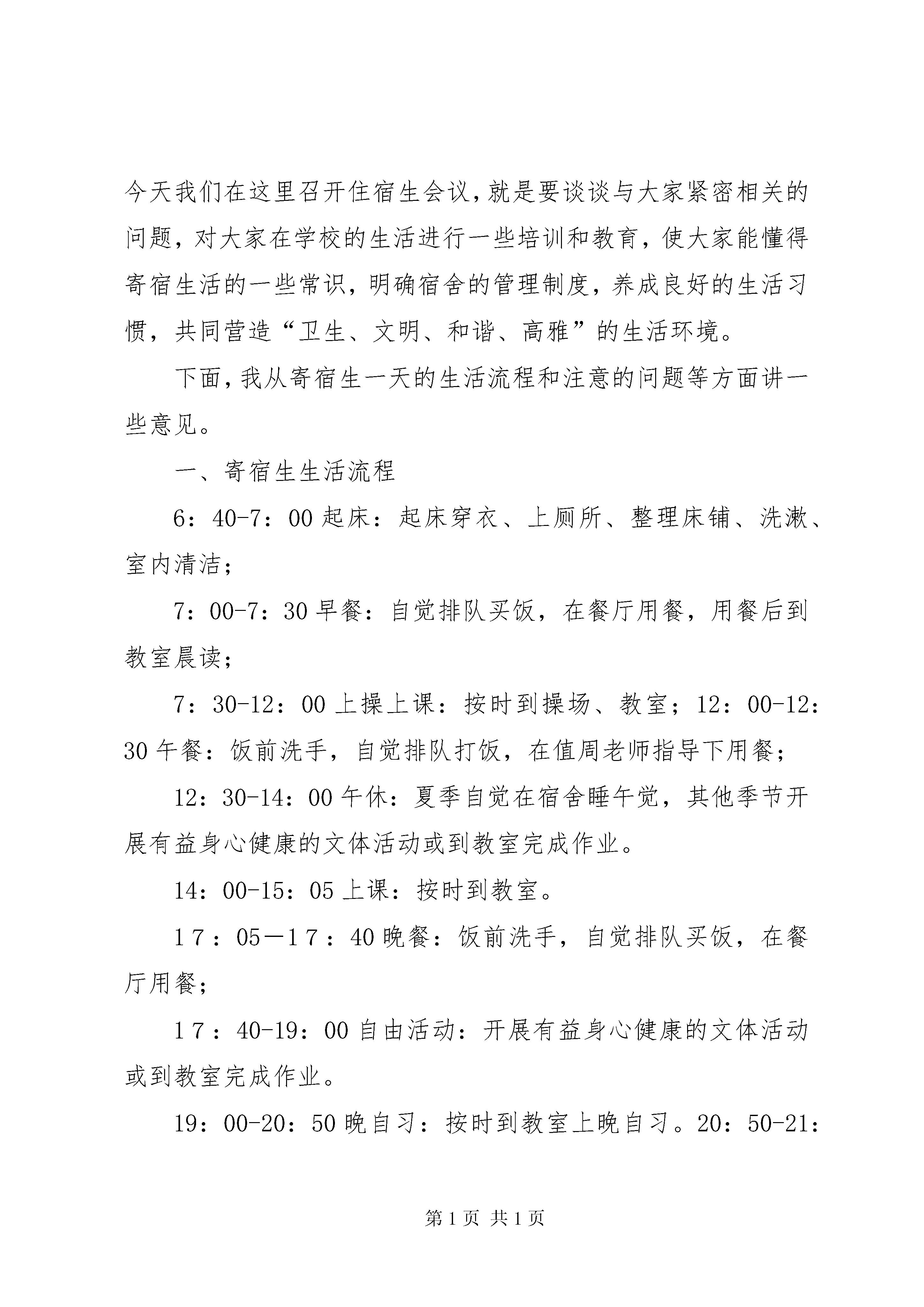 初级中学寄宿生安全纪律教育大会讲话同学们:宿舍是学生在校期间生活、休息的重要场所,也是构建和谐校园,提高学生思想道德素质的重要阵地。寄宿生每天有近一半时间在宿舍里活动。宿舍的休息、生活状况对每一个寄宿生都有直接影响。休息不好影响学习的精力,卫生不好影响身体健康,人际关系不好影响我们的情绪,风气不好影响思想上的进步。本学期学校将创建市级标准化宿舍、市级数字化校园,接受省级“双高双普”合格县验收,整个校园从硬件、软件到环境,从教育、教学到管理,都在发生着巨大的变化,那么,作为学校的一个重要组成部分,宿舍也就不能例外。宿舍管理的好坏优劣,直接关系到校风建设,还影响到正常的教学、生活秩序和学生的身心健康发展。所以,学校高度重视学生宿舍的建设和管理,投入大量资金完善了生活设施,制定了严格的宿舍管理制度,每个寄宿生都要认真自觉地遵守,努力将宿舍建设成为文明健康的生活场所,建设成学校文明的窗口。大家进入我们学校学习与生活的时间已经不短了,除了要面对学习及人际关系、身心发育等方面的难题外,大家还面临着一个不小的挑战———住宿。住宿了,对于大多数同学来说意味着你就要学会独立生活了。在家里,所有的问题都由父母操心,而到了学校许多问题都需要你自己去面对了。今天我们在这里召开住宿生会议,就是要谈谈与大家紧密相关的问题,对大家在学校的生活进行一些培训和教育,使大家能懂得寄宿生活的一些常识,明确宿舍的管理制度,养成良好的生活习惯,共同营造“卫生、文明、和谐、高雅”的生活环境。下面,我从寄宿生一天的生活流程和注意的问题等方面讲一些意见。一、寄宿生生活流程6:40-7:00起床:起床穿衣、上厕所、整理床铺、洗漱、室内清洁;7:00-7:30早餐:自觉排队买饭,在餐厅用餐,用餐后到教室晨读;7:30-12:00上操上课:按时到操场、教室;12:00-12:30午餐:饭前洗手,自觉排队打饭,在值周老师指导下用餐;12:30-14:00午休:夏季自觉在宿舍睡午觉,其他季节开展有益身心健康的文体活动或到教室完成作业。14:00-15:05上课:按时到教室。17:05-17:40晚餐:饭前洗手,自觉排队买饭,在餐厅用餐;17:40-19:00自由活动:开展有益身心健康的文体活动或到教室完成作业。19:00-20:50晚自习:按时到教室上晚自习。20:50-21:20就寝前准备:下晚自习后及时回宿舍洗漱。21:20-就寝。熄灯号响后,停止一切活动,马上就寝。二、寄宿生起床穿衣有什么要求。1、不喧哗打闹。2、不提前或推迟。3、穿衣由上到下,由内到外,穿着整洁,3分钟内完成。4、不穿奇装异服。5、根据天气情况增减衣服。6、上铺学生下床时要抓牢、踩稳,精力集中。三、学校对学生入厕有什么要求。1、有序出入,不拥挤,不喧哗。2、体位与坑槽对应,不将便溺拉于坑槽之外。3、将手纸丢入纸篓或槽内,便后冲水,及时洗手。4、不在墙壁上乱写乱画。5、不损坏卫生间设备。6、进入卫生间要注意防滑。三、怎样整理床铺。1、被子按要求折成方块,上下对称,封口对齐。2、被子放于床右,枕头放在床左,不压在被上。3、床单铺设平整、无污渍、无皱褶,床面无凸凹现象。4、备用鞋子放在床下左侧,鞋跟统一朝外,排成一条线。5、所有物品经过整理,物归其位。五、学校对学生洗漱有什么要求。1、有秩序完成洗漱,不喧闹、不拥挤。2、速度要快,一般8分钟内完成。3、污物、水迹不出槽(盆)外。4、洗漱后,清洁用品归位整齐。5、小流量用水,人走关水,无浪费。6、每周至少洗澡、洗头一次。六、怎样做好宿舍清洁工作。1、宿舍要有值日生表,轮流值日。2、值日生清洁时不能损坏、污秽相关的设施设备。3、门、窗、柜子、地面等部位要全面清洁干净,无死角和盲区。4、垃圾要日产日清,垃圾及时投入垃圾筒,垃圾筒及时清理,垃圾筒外壁要保持洁净。5、宿舍每日必须通风换气,使室内无异味。6、值日生要督查每个住宿学生的个人卫生、床铺平整及物品摆放情况。四、学生应遵守哪些就餐纪律。1、寄宿学生必须在学校食堂就餐。2、打饭要按先后顺序排队,不插队,不挤拉他人,不让他人代买饭菜。3、用餐要定时定量,不偏食,不暴饮暴食,不喝冷水、饮料,不吃生冷食物。4、饭前洗手,餐具要清洗干净,妥善保管,定期消毒。5、禁止浪费食物,养成节俭的习惯。6、爱护环境,严禁污染餐厅。7、有意见及时反映给生活指导老师。四十二、学校对早操有什么要求。1、早操在校内进行,在校的师生都要出早操。2、早操在相关老师组织下进行,要整齐、有序,保证足够的时间和运动量,达到健体目的。3、高、低年级运动量应该有差别。4、早操提倡科学多项目锻炼,促进体质体能全面发展,要保证学生安全。对课间活动的要求有哪些。1、学生在课间活动期间一般应在室外活动锻炼,达到舒缓筋骨、转换思维状态、吸收新鲜空