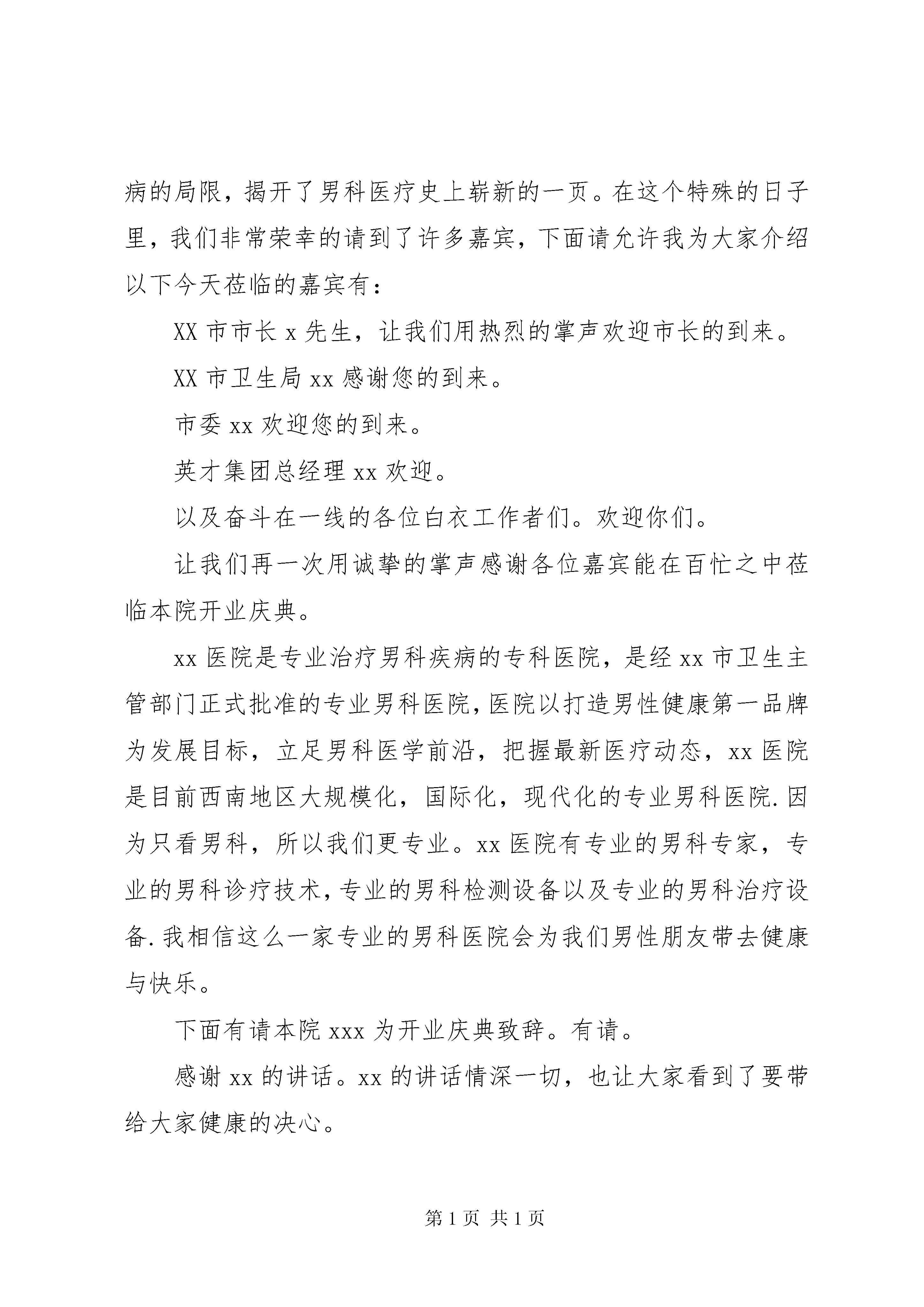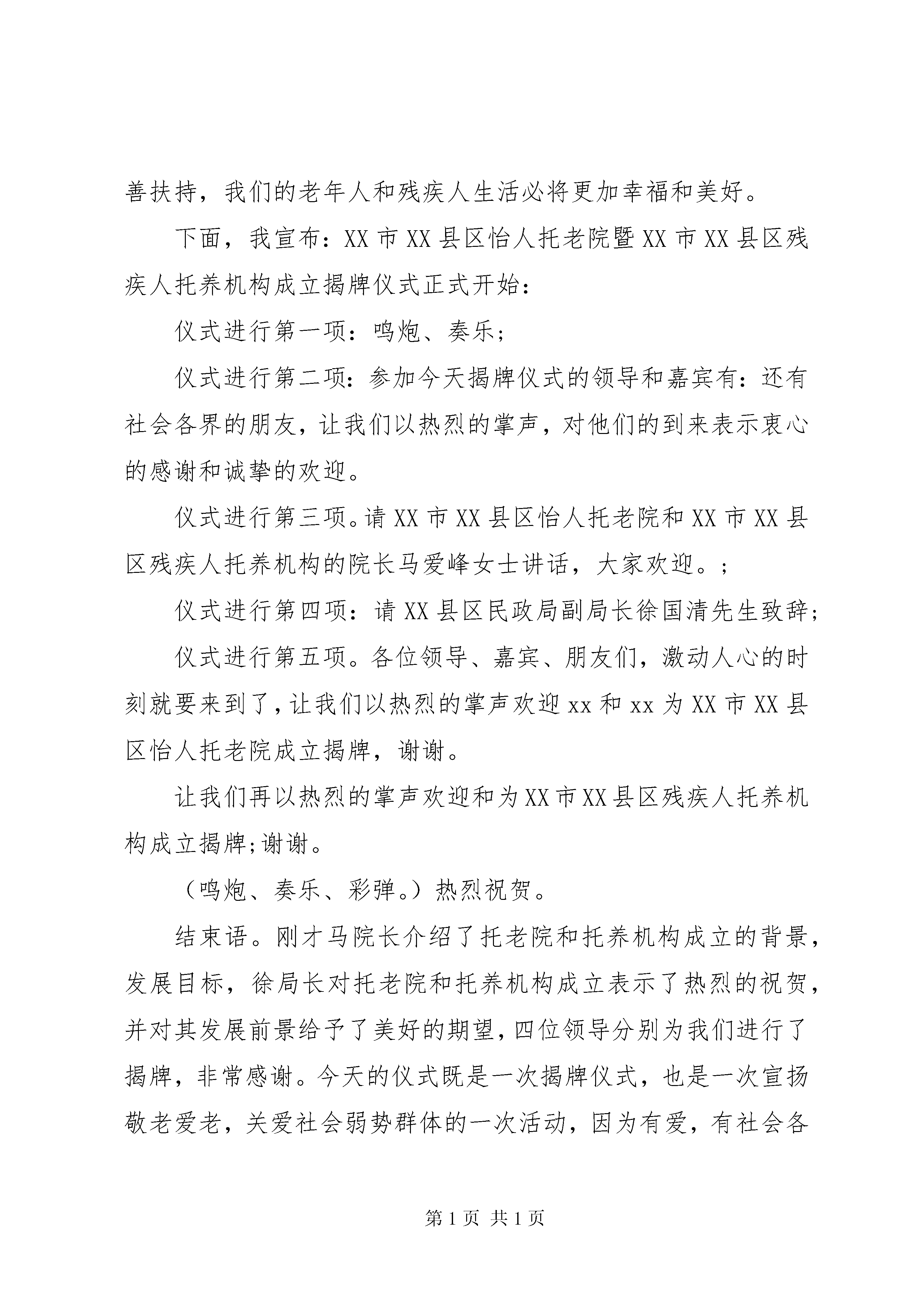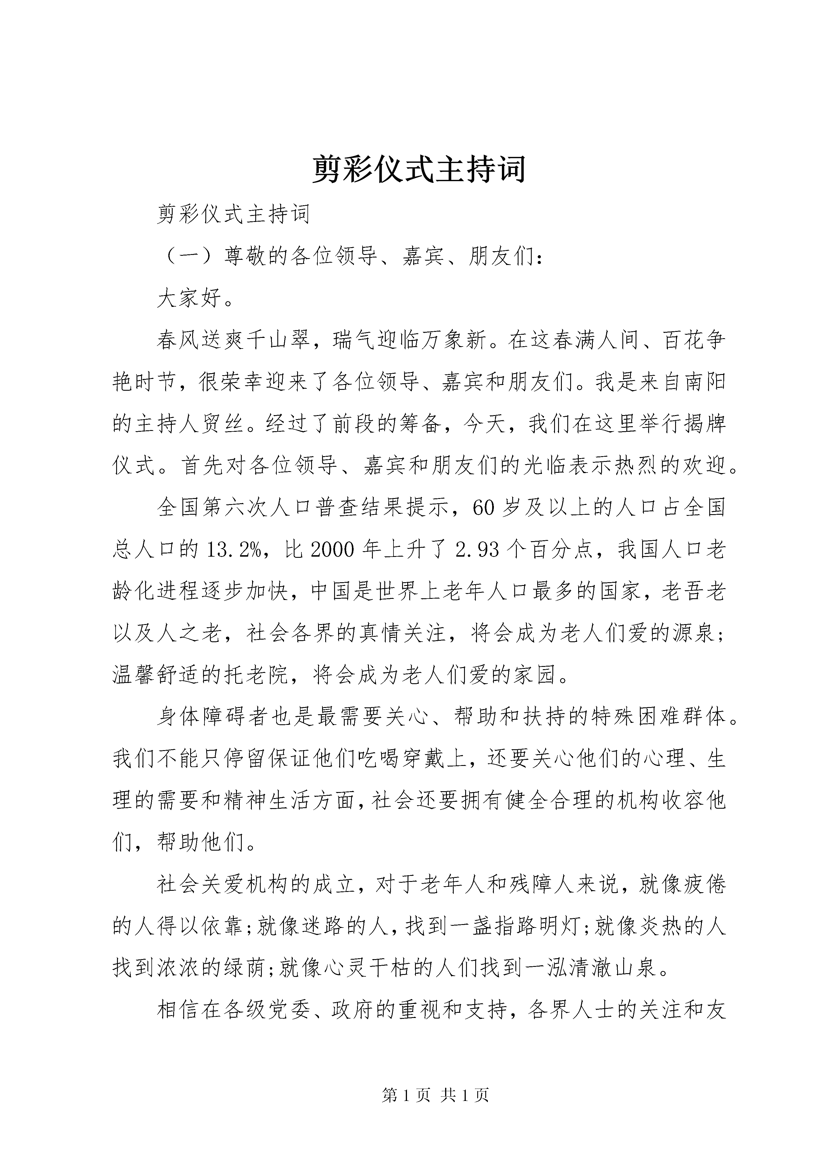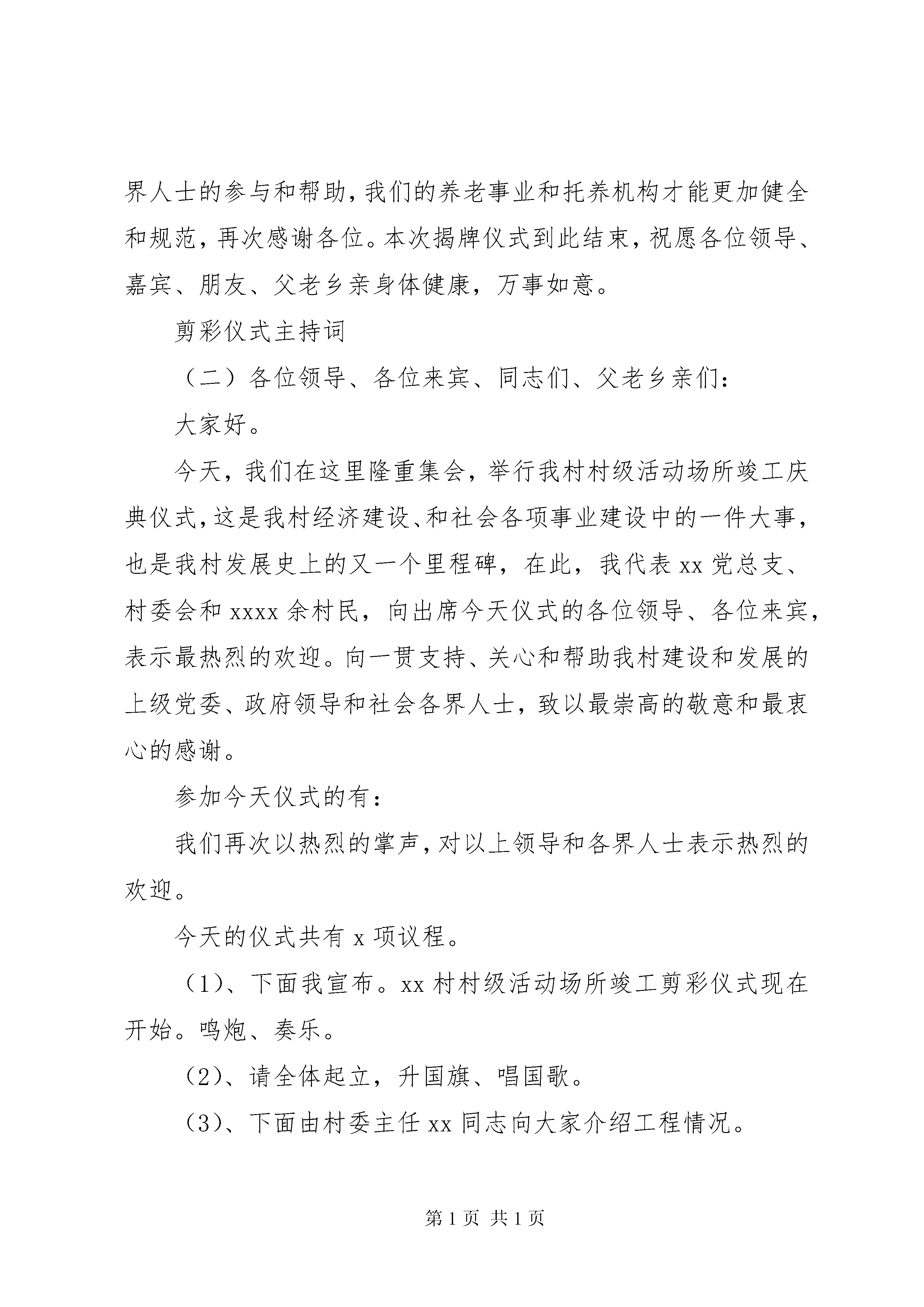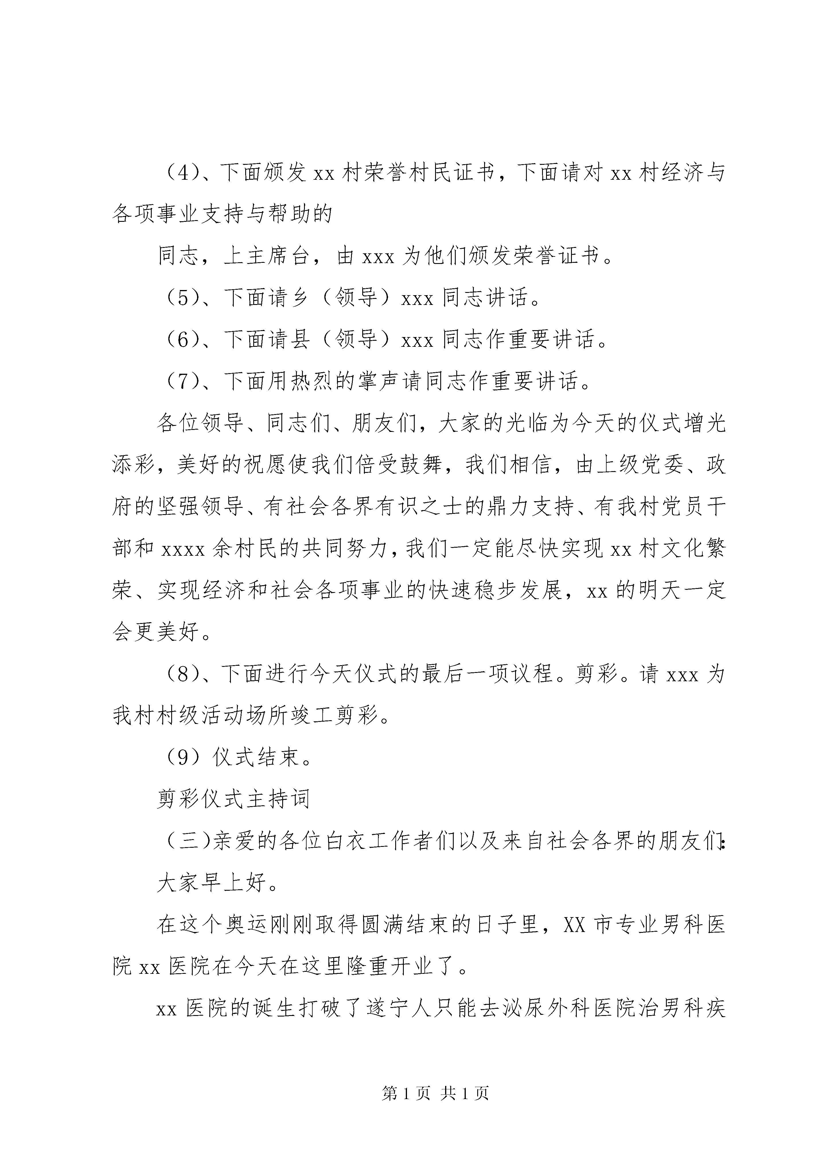 剪彩仪式主持词剪彩仪式主持词(一)尊敬的各位领导、嘉宾、朋友们:大家好。春风送爽千山翠,瑞气迎临万象新。在这春满人间、百花争艳时节,很荣幸迎来了各位领导、嘉宾和朋友们。我是来自南阳的主持人贸丝。经过了前段的筹备,今天,我们在这里举行揭牌仪式。首先对各位领导、嘉宾和朋友们的光临表示热烈的欢迎。全国第六次人口普查结果提示,60岁及以上的人口占全国总人口的13.2%,比2000年上升了2.93个百分点,我国人口老龄化进程逐步加快,中国是世界上老年人口最多的国家,老吾老以及人之老,社会各界的真情关注,将会成为老人们爱的源泉;温馨舒适的托老院,将会成为老人们爱的家园。身体障碍者也是最需要关心、帮助和扶持的特殊困难群体。我们不能只停留保证他们吃喝穿戴上,还要关心他们的心理、生理的需要和精神生活方面,社会还要拥有健全合理的机构收容他们,帮助他们。社会关爱机构的成立,对于老年人和残障人来说,就像疲倦的人得以依靠;就像迷路的人,找到一盏指路明灯;就像炎热的人找到浓浓的绿荫;就像心灵干枯的人们找到一泓清澈山泉。相信在各级党委、政府的重视和支持,各界人士的关注和友善扶持,我们的老年人和残疾人生活必将更加幸福和美好。下面,我宣布:XX市XX县区怡人托老院暨XX市XX县区残疾人托养机构成立揭牌仪式正式开始:仪式进行第一项:鸣炮、奏乐;仪式进行第二项:参加今天揭牌仪式的领导和嘉宾有:还有社会各界的朋友,让我们以热烈的掌声,对他们的到来表示衷心的感谢和诚挚的欢迎。仪式进行第三项。请XX市XX县区怡人托老院和XX市XX县区残疾人托养机构的院长马爱峰女士讲话,大家欢迎。;仪式进行第四项:请XX县区民政局副局长徐国清先生致辞;仪式进行第五项。各位领导、嘉宾、朋友们,激动人心的时刻就要来到了,让我们以热烈的掌声欢迎xx和xx为XX市XX县区怡人托老院成立揭牌,谢谢。让我们再以热烈的掌声欢迎和为XX市XX县区残疾人托养机构成立揭牌;谢谢。(鸣炮、奏乐、彩弹。)热烈祝贺。结束语。刚才马院长介绍了托老院和托养机构成立的背景,发展目标,徐局长对托老院和托养机构成立表示了热烈的祝贺,并对其发展前景给予了美好的期望,四位领导分别为我们进行了揭牌,非常感谢。今天的仪式既是一次揭牌仪式,也是一次宣扬敬老爱老,关爱社会弱势群体的一次活动,因为有爱,有社会各界人士的参与和帮助,我们的养老事业和托养机构才能更加健全和规范,再次感谢各位。本次揭牌仪式到此结束,祝愿各位领导、嘉宾、朋友、父老乡亲身体健康,万事如意。剪彩仪式主持词(二)各位领导、各位来宾、同志们、父老乡亲们:大家好。今天,我们在这里隆重集会,举行我村村级活动场所竣工庆典仪式,这是我村经济建设、和社会各项事业建设中的一件大事,也是我村发展史上的又一个里程碑,在此,我代表xx党总支、村委会和xxxx余村民,向出席今天仪式的各位领导、各位来宾,表示最热烈的欢迎。向一贯支持、关心和帮助我村建设和发展的上级党委、政府领导和社会各界人士,致以最崇高的敬意和最衷心的感谢。参加今天仪式的有:我们再次以热烈的掌声,对以上领导和各界人士表示热烈的欢迎。今天的仪式共有x项议程。(1)、下面我宣布。xx村村级活动场所竣工剪彩仪式现在开始。鸣炮、奏乐。(2)、请全体起立,升国旗、唱国歌。(3)、下面由村委主任xx同志向大家介绍工程情况。(4)、下面颁发xx村荣誉村民证书,下面请对xx村经济与各项事业支持与帮助的同志,上主席台,由xxx为他们颁发荣誉证书。(5)、下面请乡(领导)xxx同志讲话。(6)、下面请县(领导)xxx同志作重要讲话。(7)、下面用热烈的掌声请同志作重要讲话。各位领导、同志们、朋友们,大家的光临为今天的仪式增光添彩,美好的祝愿使我们倍受鼓舞,我们相信,由上级党委、政府的坚强领导、有社会各界有识之士的鼎力支持、有我村党员干部和xxxx余村民的共同努力,我们一定能尽快实现xx村文化繁荣、实现经济和社会各项事业的快速稳步发展,xx的明天一定会更美好。(8)、下面进行今天仪式的最后一项议程。剪彩。请xxx为我村村级活动场所竣工剪彩。(9)仪式结束。剪彩仪式主持词(三)亲爱的各位白衣工作者们以及来自社会各界的朋友们:大家早上好。在这个奥运刚刚取得圆满结束的日子里,XX市专业男科医院xx医院在今天在这里隆重开业了。xx医院的诞生打破了遂宁人只能去泌尿外科医院治男科疾病的局限,揭开了男科医疗史上崭新的一页。在这个特殊的日子里,我们非常荣幸的请到了许多嘉宾,下面请允许我为大家介绍以下今天莅临的嘉宾有:XX市市长x先生,让我们用热烈的掌声欢迎市长的到来。XX市卫生局xx感谢您的到来。市委xx欢迎您的到来。英才集团总经理xx欢迎。以及奋斗在一线的各位白衣工作者们。欢迎你们。让我们再一次用诚挚的掌声感谢各位嘉宾能在百忙之中莅临