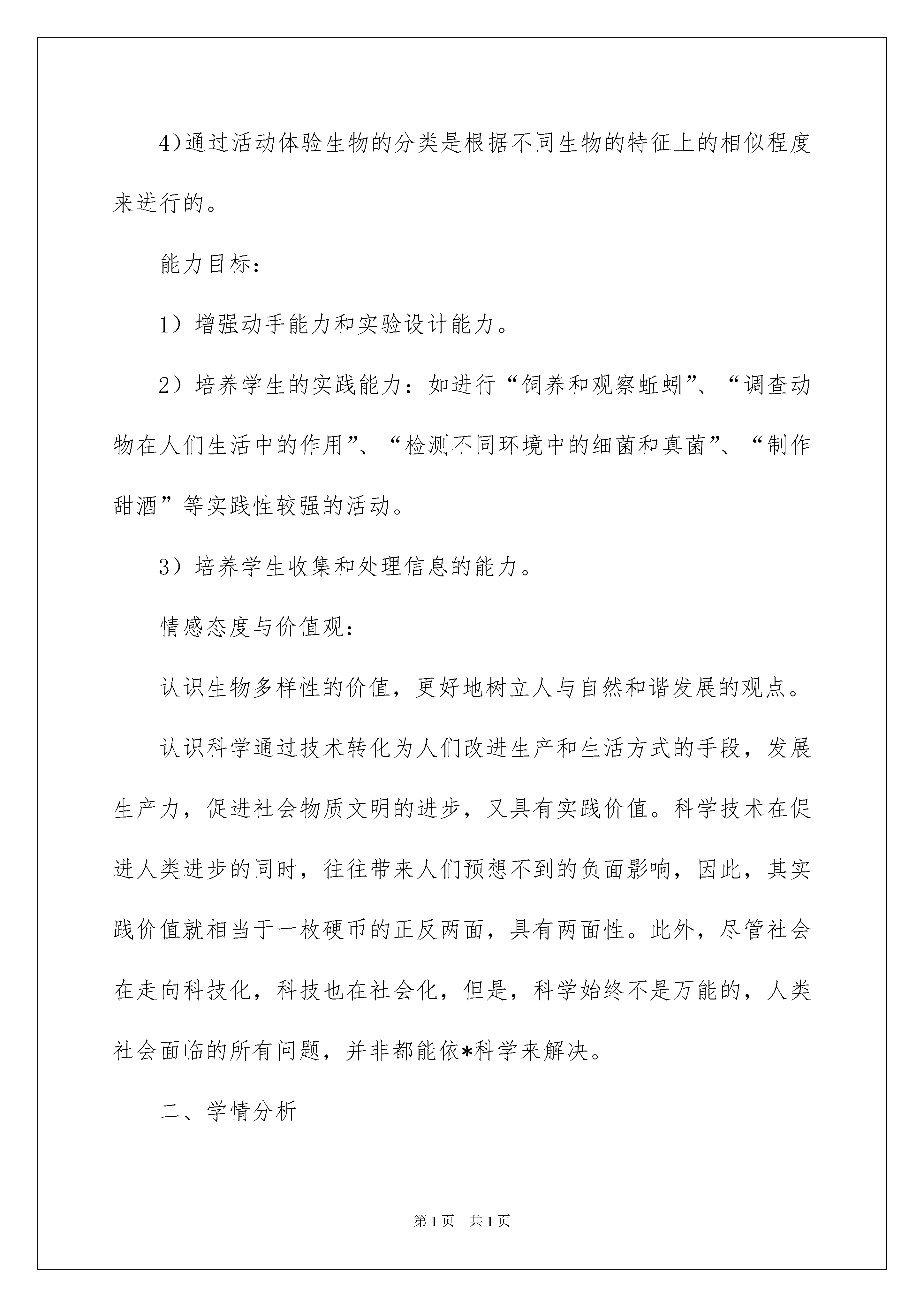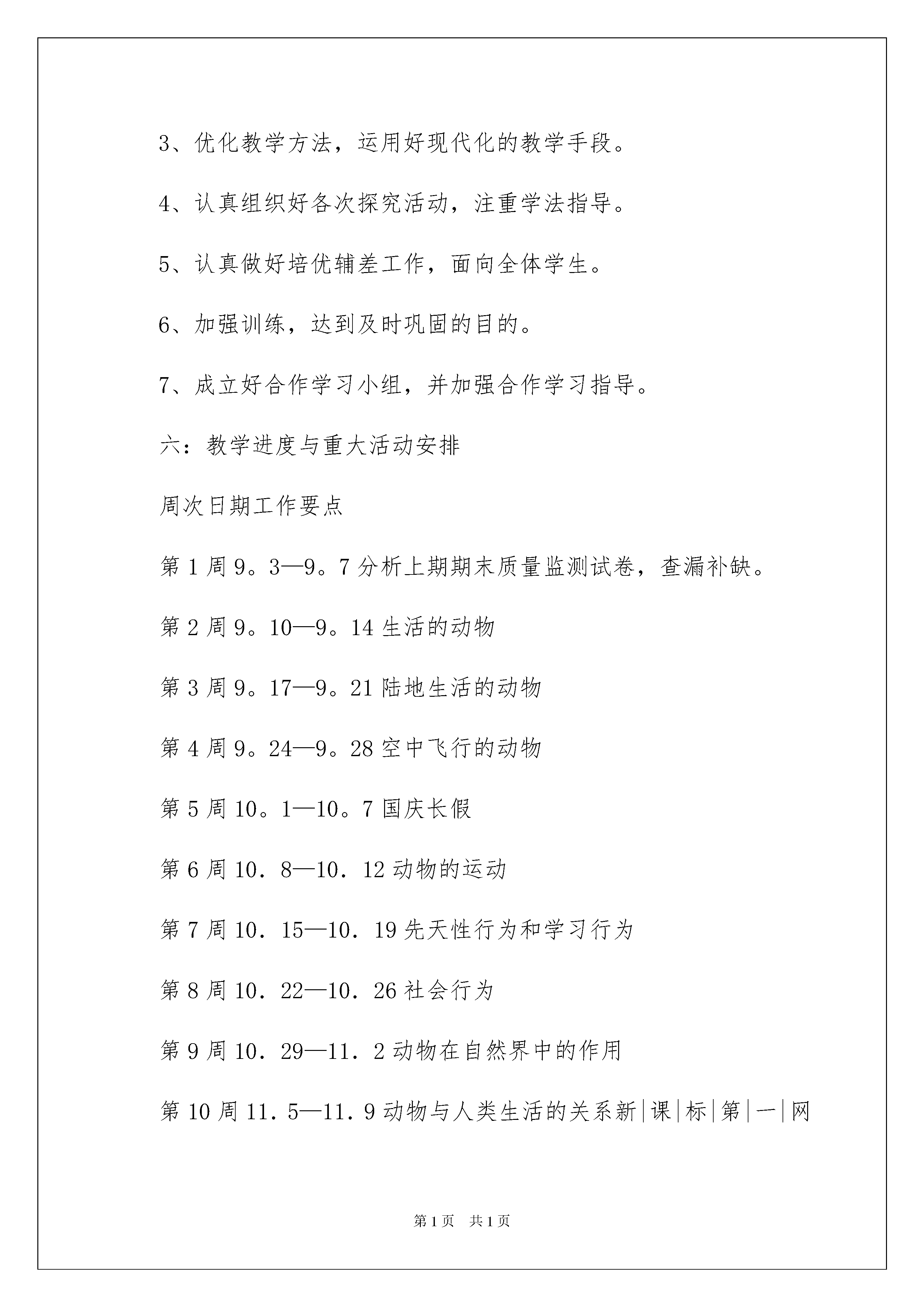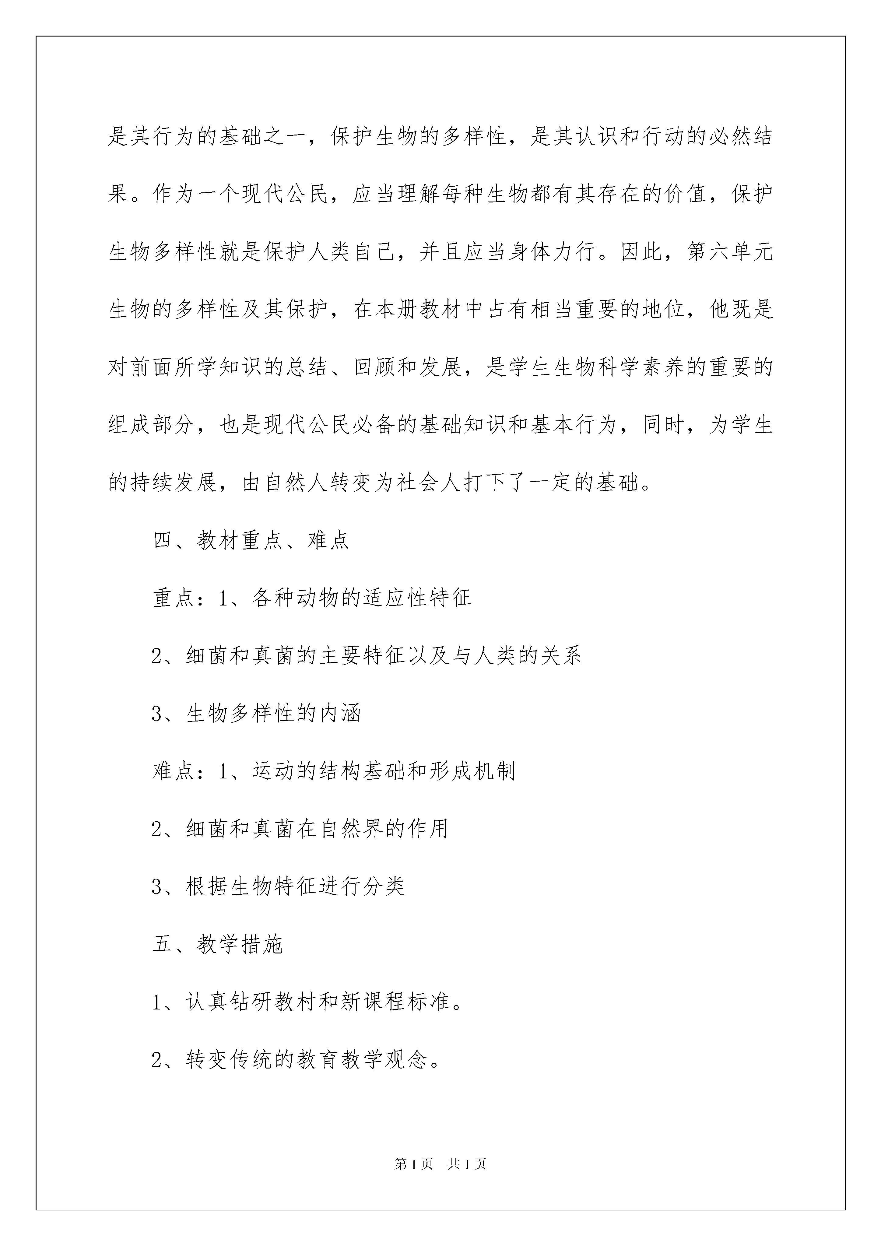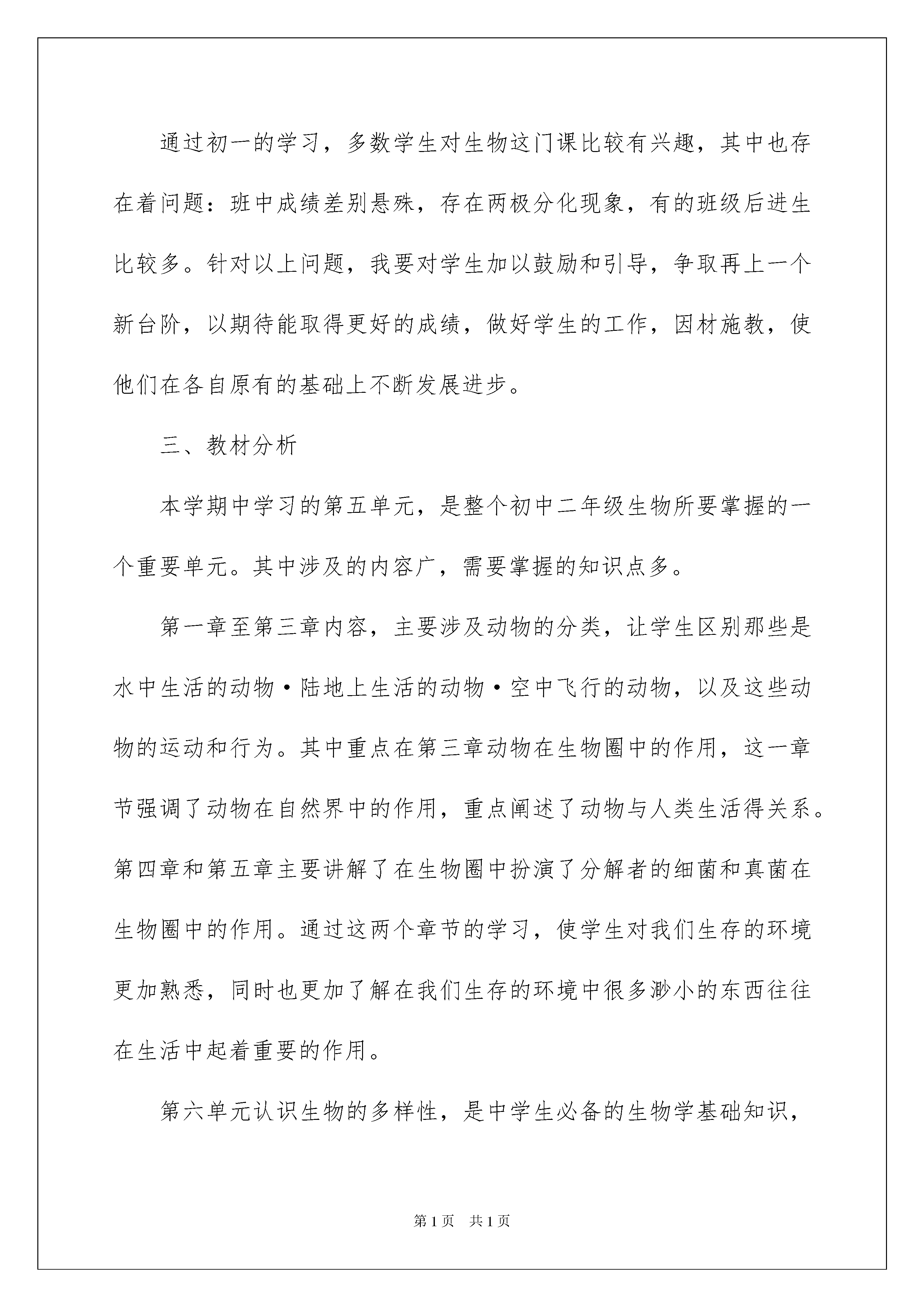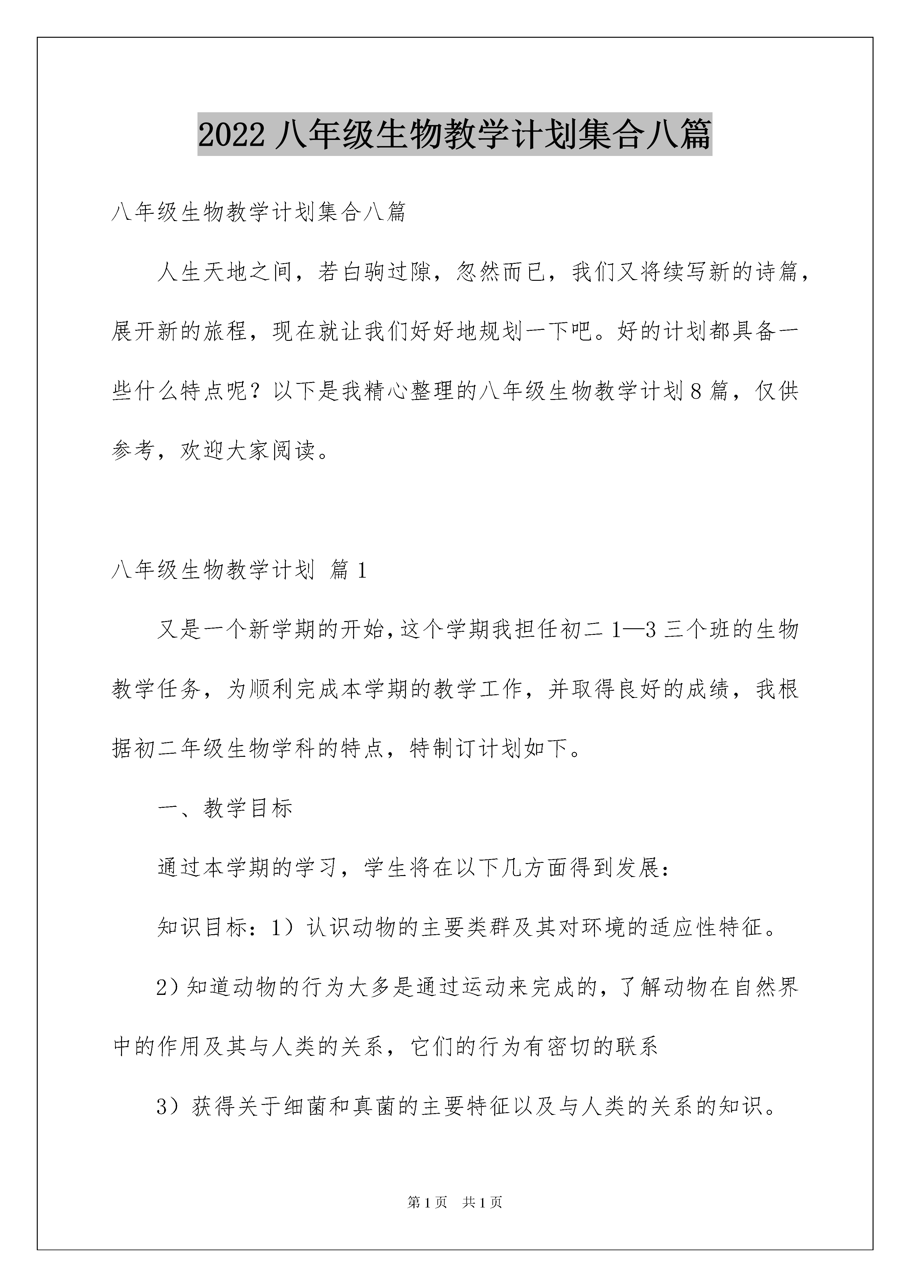 2022八年级生物教学计划集合八篇八年级生物教学计划集合八篇人生天地之间,若白驹过隙,忽然而已,我们又将续写新的诗篇,展开新的旅程,现在就让我们好好地规划一下吧。好的计划都具备一些什么特点呢?以下是我精心整理的八年级生物教学计划8篇,仅供参考,欢迎大家阅读。八年级生物教学计划篇1又是一个新学期的开始,这个学期我担任初二1—3三个班的生物教学任务,为顺利完成本学期的教学工作,并取得良好的成绩,我根据初二年级生物学科的特点,特制订计划如下。一、教学目标通过本学期的学习,学生将在以下几方面得到发展:知识目标:1)认识动物的主要类群及其对环境的适应性特征。2)知道动物的行为大多是通过运动来完成的,了解动物在自然界中的作用及其与人类的关系,它们的行为有密切的联系3)获得关于细菌和真菌的主要特征以及与人类的关系的知识。4)通过活动体验生物的分类是根据不同生物的特征上的相似程度来进行的。能力目标:1)增强动手能力和实验设计能力。2)培养学生的实践能力:如进行“饲养和观察蚯蚓”、“调查动物在人们生活中的作用”、“检测不同环境中的细菌和真菌”、“制作甜酒”等实践性较强的活动。3)培养学生收集和处理信息的能力。情感态度与价值观:认识生物多样性的价值,更好地树立人与自然和谐发展的观点。认识科学通过技术转化为人们改进生产和生活方式的手段,发展生产力,促进社会物质文明的进步,又具有实践价值。科学技术在促进人类进步的同时,往往带来人们预想不到的负面影响,因此,其实践价值就相当于一枚硬币的正反两面,具有两面性。此外,尽管社会在走向科技化,科技也在社会化,但是,科学始终不是万能的,人类社会面临的所有问题,并非都能依*科学来解决。二、学情分析通过初一的学习,多数学生对生物这门课比较有兴趣,其中也存在着问题:班中成绩差别悬殊,存在两极分化现象,有的班级后进生比较多。针对以上问题,我要对学生加以鼓励和引导,争取再上一个新台阶,以期待能取得更好的成绩,做好学生的工作,因材施教,使他们在各自原有的基础上不断发展进步。三、教材分析本学期中学习的第五单元,是整个初中二年级生物所要掌握的一个重要单元。其中涉及的内容广,需要掌握的知识点多。第一章至第三章内容,主要涉及动物的分类,让学生区别那些是水中生活的动物·陆地上生活的动物·空中飞行的动物,以及这些动物的运动和行为。其中重点在第三章动物在生物圈中的作用,这一章节强调了动物在自然界中的作用,重点阐述了动物与人类生活得关系。第四章和第五章主要讲解了在生物圈中扮演了分解者的细菌和真菌在生物圈中的作用。通过这两个章节的学习,使学生对我们生存的环境更加熟悉,同时也更加了解在我们生存的环境中很多渺小的东西往往在生活中起着重要的作用。第六单元认识生物的多样性,是中学生必备的生物学基础知识,是其行为的基础之一,保护生物的多样性,是其认识和行动的必然结果。作为一个现代公民,应当理解每种生物都有其存在的价值,保护生物多样性就是保护人类自己,并且应当身体力行。因此,第六单元生物的多样性及其保护,在本册教材中占有相当重要的地位,他既是对前面所学知识的总结、回顾和发展,是学生生物科学素养的重要的组成部分,也是现代公民必备的基础知识和基本行为,同时,为学生的持续发展,由自然人转变为社会人打下了一定的基础。四、教材重点、难点重点:1、各种动物的适应性特征2、细菌和真菌的主要特征以及与人类的关系3、生物多样性的内涵难点:1、运动的结构基础和形成机制2、细菌和真菌在自然界的作用3、根据生物特征进行分类五、教学措施1、认真钻研教村和新课程标准。2、转变传统的教育教学观念。3、优化教学方法,运用好现代化的教学手段。4、认真组织好各次探究活动,注重学法指导。5、认真做好培优辅差工作,面向全体学生。6、加强训练,达到及时巩固的目的。7、成立好合作学习小组,并加强合作学习指导。六:教学进度与重大活动安排周次日期工作要点第1周9。3—9。7分析上期期末质量监测试卷,查漏补缺。第2周9。10—9。14生活的动物第3周9。17—9。21陆地生活的动物第4周9。24—9。28空中飞行的动物第5周10。1—10。7国庆长假第6周10.8—10.12动物的运动第7周10.15—10.19先天性行为和学习行为第8周10.22—10.26社会行为第9周10.29—11.2动物在自然界中的作用第10周11.5—11.9动物与人类生活的关系新|课|标|第|一|网第11周11.12—11.16细菌和真菌的分布第12周11.19—11.23细菌第13周11.26—11.30真菌第14周12.3—12.7细菌和真菌在自然界中的作用第15