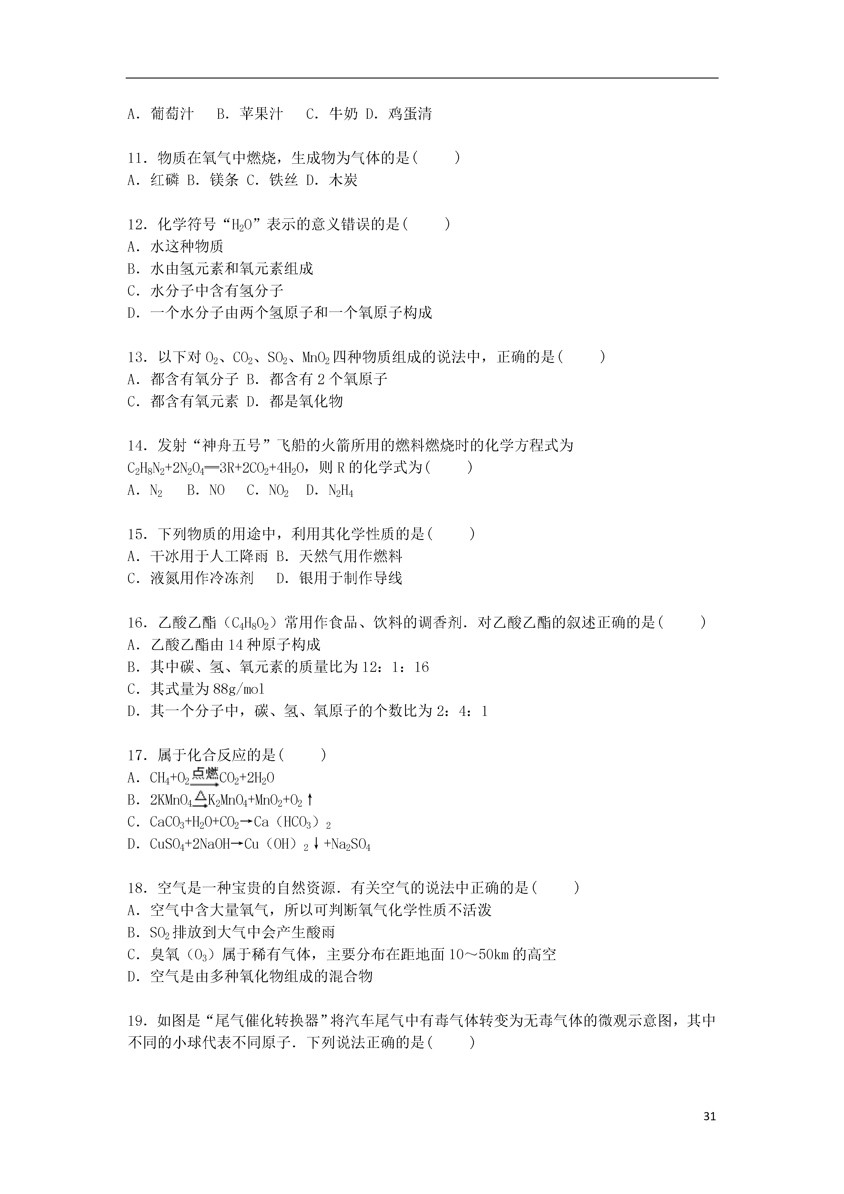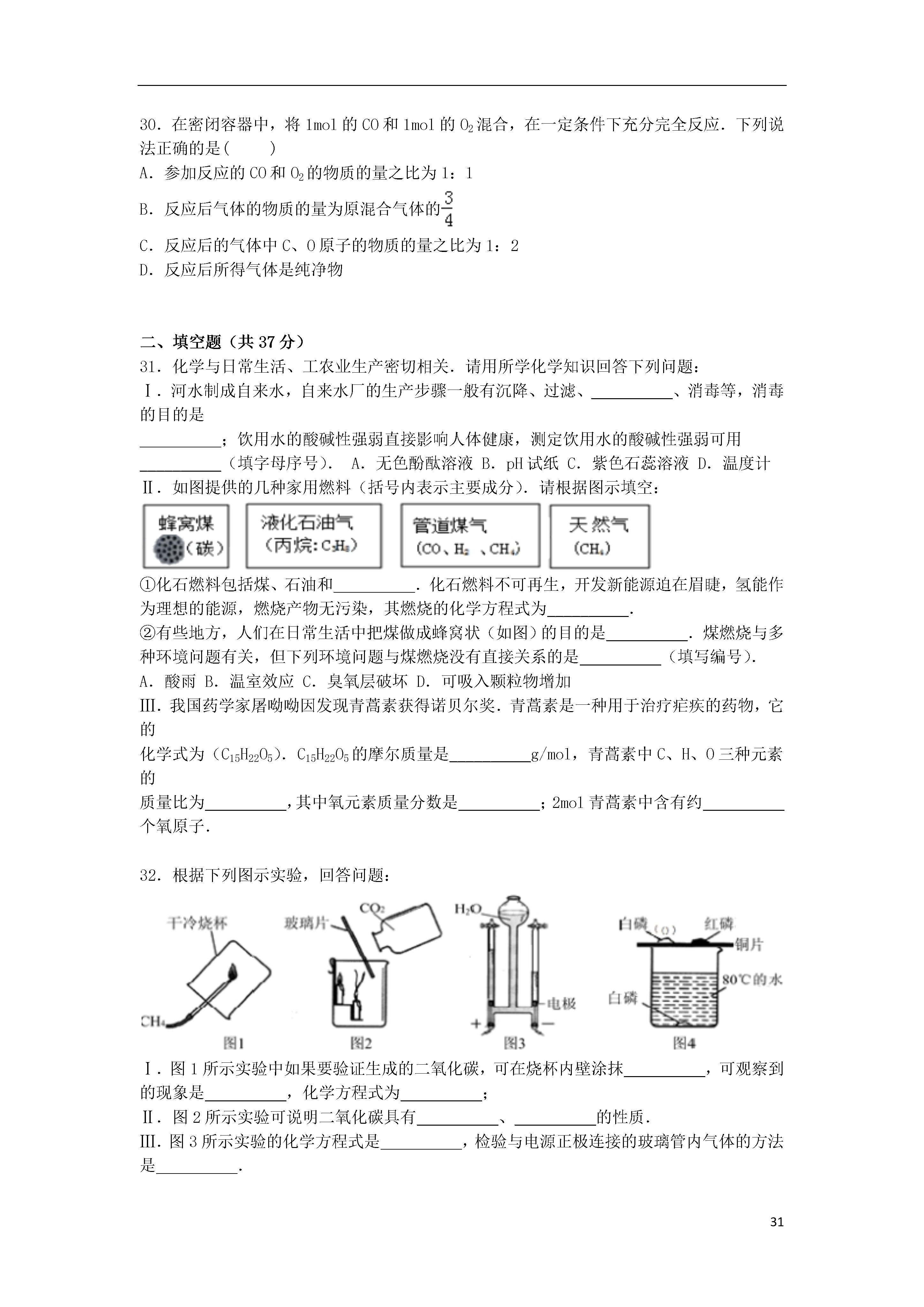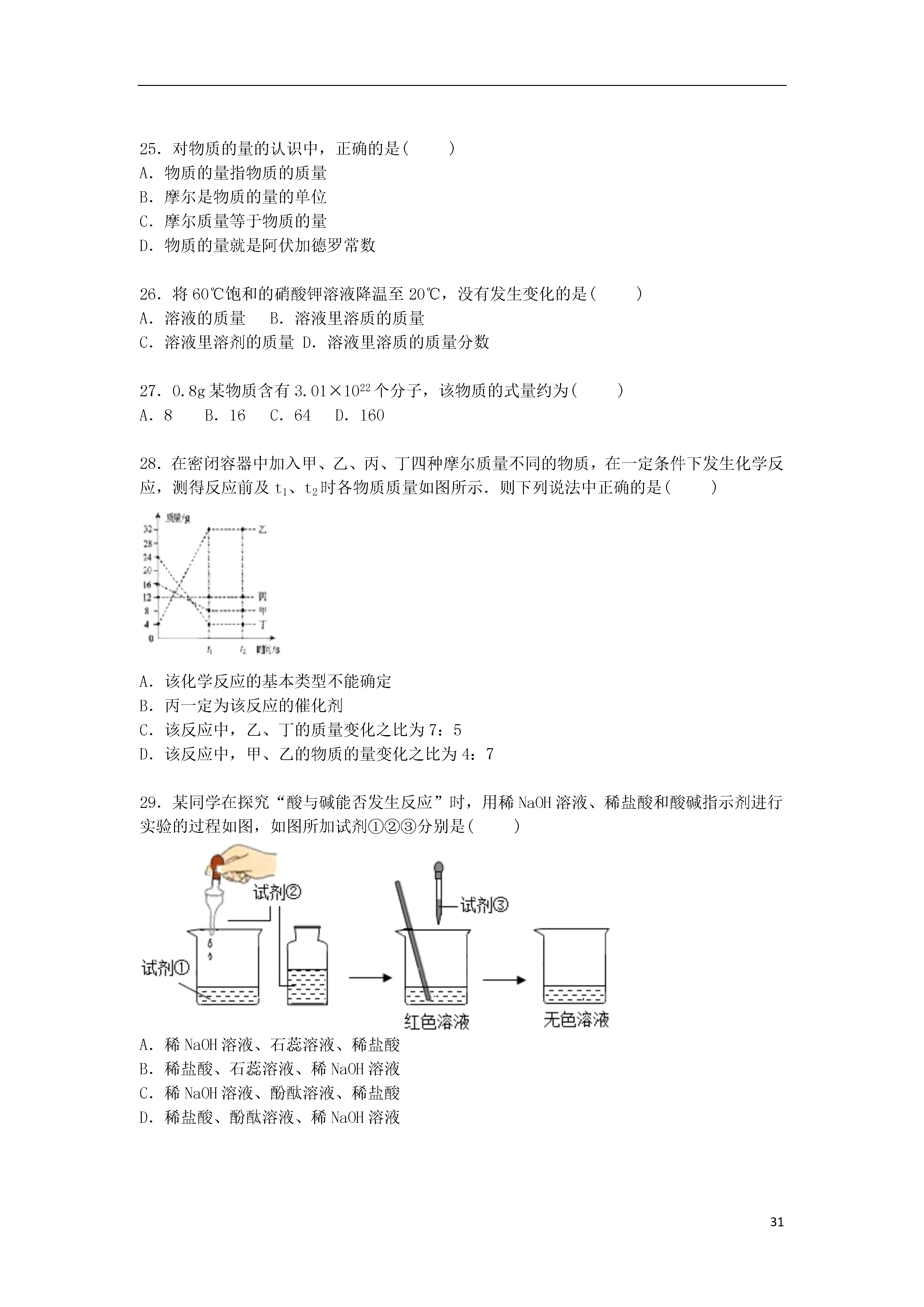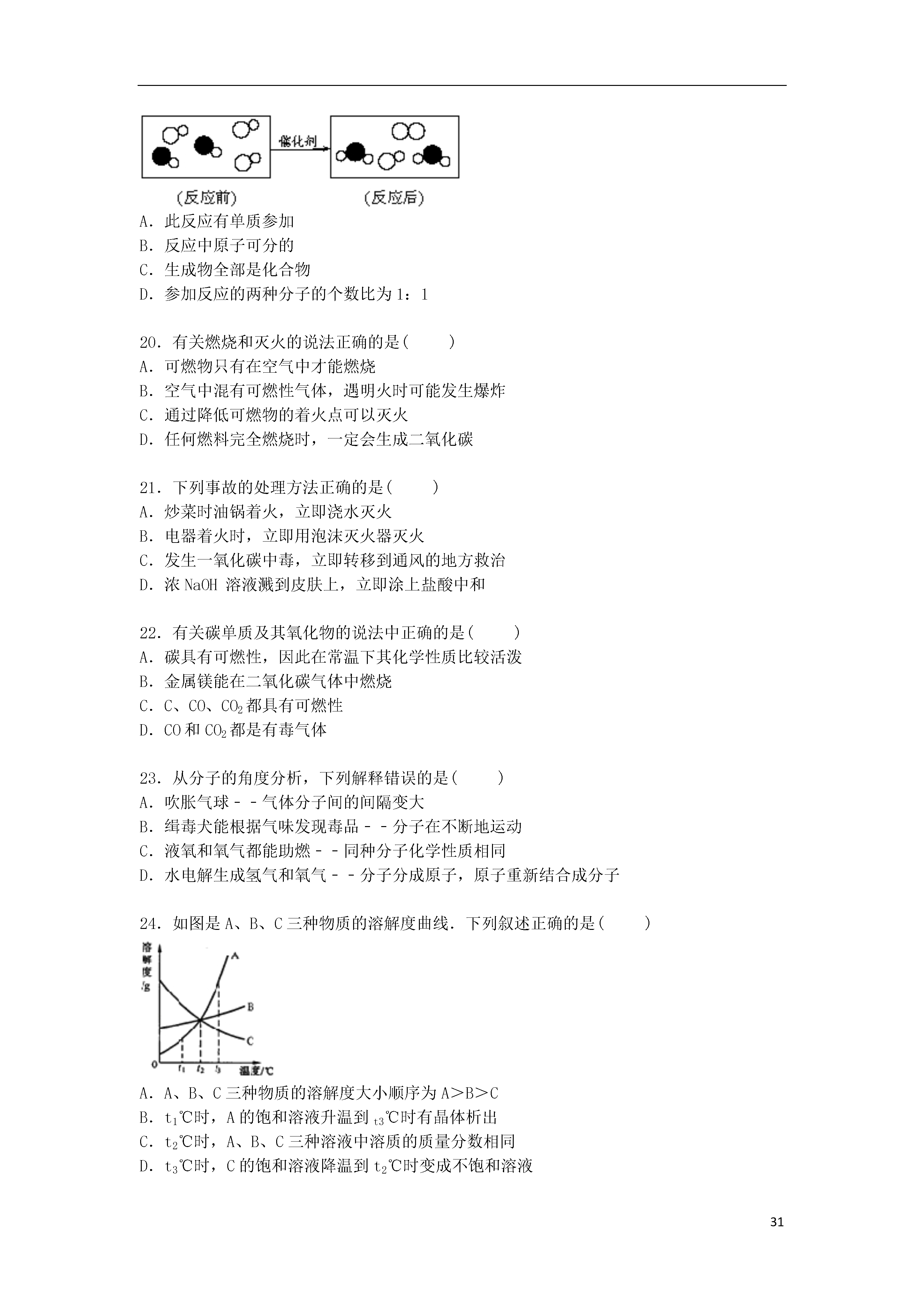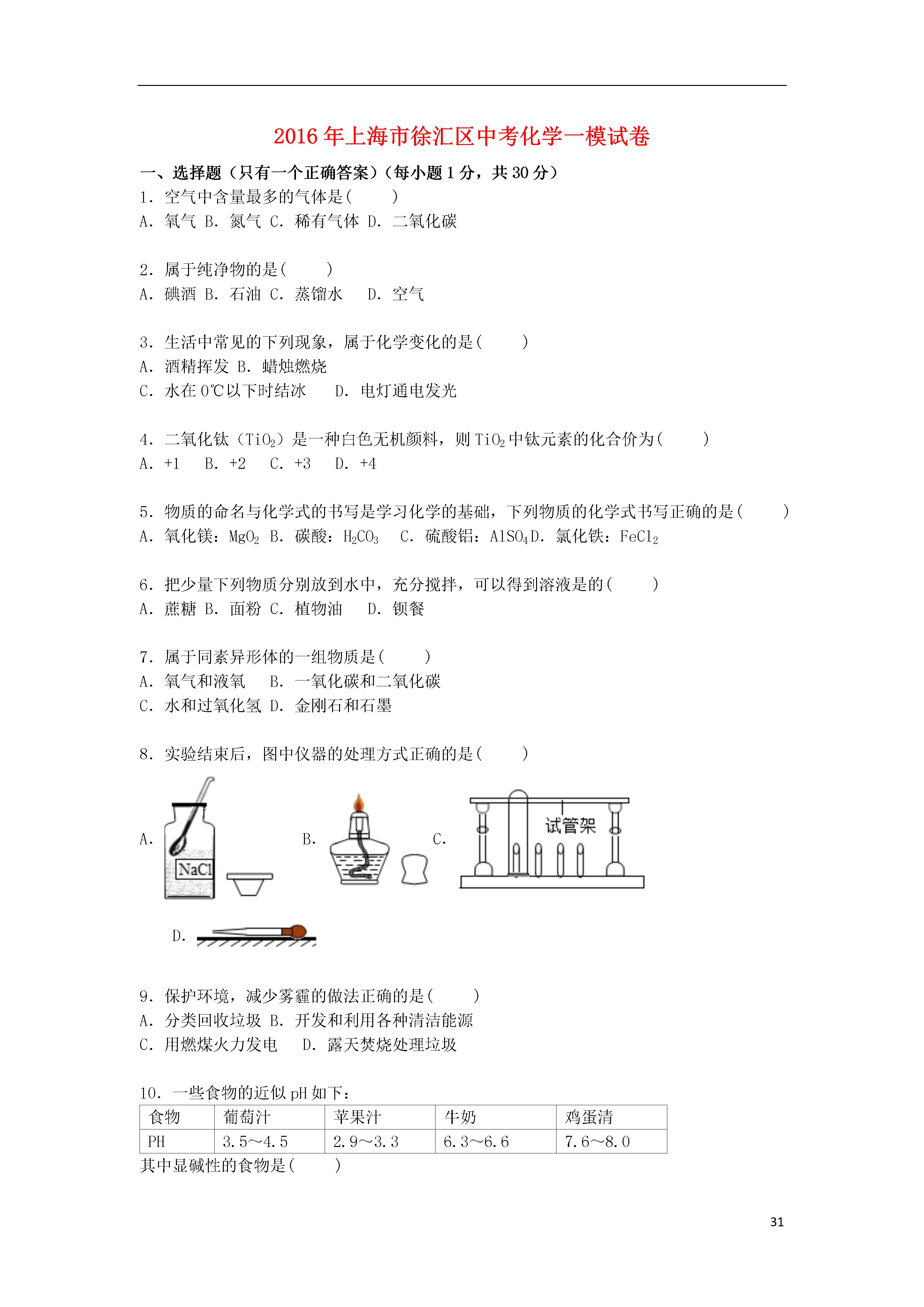 312016年上海市徐汇区中考化学一模试卷一、选择题(只有一个正确答案)(每小题1分,共30分)1.空气中含量最多的气体是()A.氧气B.氮气C.稀有气体D.二氧化碳2.属于纯净物的是()A.碘酒B.石油C.蒸馏水D.空气3.生活中常见的下列现象,属于化学变化的是()A.酒精挥发B.蜡烛燃烧C.水在0℃以下时结冰D.电灯通电发光4.二氧化钛(TiO2)是一种白色无机颜料,则TiO2中钛元素的化合价为()A.+1B.+2C.+3D.+45.物质的命名与化学式的书写是学习化学的基础,下列物质的化学式书写正确的是()A.氧化镁:MgO2B.碳酸:H2CO3C.硫酸铝:AlSO4D.氯化铁:FeCl26.把少量下列物质分别放到水中,充分搅拌,可以得到溶液是的()A.蔗糖B.面粉C.植物油D.钡餐7.属于同素异形体的一组物质是()A.氧气和液氧B.一氧化碳和二氧化碳C.水和过氧化氢D.金刚石和石墨8.实验结束后,图中仪器的处理方式正确的是()A.B.C.D.9.保护环境,减少雾霾的做法正确的是()A.分类回收垃圾B.开发和利用各种清洁能源C.用燃煤火力发电D.露天焚烧处理垃圾10.一些食物的近似pH如下:食物葡萄汁苹果汁牛奶鸡蛋清PH3.5~4.52.9~3.36.3~6.67.6~8.0其中显碱性的食物是()A.葡萄汁B.苹果汁C.牛奶D.鸡蛋清11.物质在氧气中燃烧,生成物为气体的是()A.红磷B.镁条C.铁丝D.木炭12.化学符号“H2O”表示的意义错误的是()A.水这种物质B.水由氢元素和氧元素组成C.水分子中含有氢分子D.一个水分子由两个氢原子和一个氧原子构成13.以下对O2、CO2、SO2、MnO2四种物质组成的说法中,正确的是()A.都含有氧分子B.都含有2个氧原子C.都含有氧元素D.都是氧化物14.发射“神舟五号”飞船的火箭所用的燃料燃烧时的化学方程式为C2H8N2+2N2O4═3R+2CO2+4H2O,则R的化学式为()A.N2B.NOC.NO2D.N2H415.下列物质的用途中,利用其化学性质的是()A.干冰用于人工降雨B.天然气用作燃料C.液氮用作冷冻剂D.银用于制作导线16.乙酸乙酯(C4H8O2)常用作食品、饮料的调香剂.对乙酸乙酯的叙述正确的是()A.乙酸乙酯由14种原子构成B.其中碳、氢、氧元素的质量比为12:1:16C.其式量为88g/molD.其一个分子中,碳、氢、氧原子的个数比为2:4:117.属于化合反应的是()A.CH4+O2CO2+2H2OB.2KMnO4K2MnO4+MnO2+O2↑C.CaCO3+H2O+CO2→Ca(HCO3)2D.CuSO4+2NaOH→Cu(OH)2↓+Na2SO418.空气是一种宝贵的自然资源.有关空气的说法中正确的是()A.空气中含大量氧气,所以可判断氧气化学性质不活泼B.SO2排放到大气中会产生酸雨C.臭氧(O3)属于稀有气体,主要分布在距地面10~50km的高空D.空气是由多种氧化物组成的混合物19.如图是“尾气催化转换器”将汽车尾气中有毒气体转变为无毒气体的微观示意图,其中不同的小球代表不同原子.下列说法正确的是()A.此反应有单质参加B.反应中原子可分的C.生成物全部是化合物D.参加反应的两种分子的个数比为1:120.有关燃烧和灭火的说法正确的是()A.可燃物只有在空气中才能燃烧B.空气中混有可燃性气体,遇明火时可能发生爆炸C.通过降低可燃物的着火点可以灭火D.任何燃料完全燃烧时,一定会生成二氧化碳21.下列事故的处理方法正确的是()A.炒菜时油锅着火,立即浇水灭火B.电器着火时,立即用泡沫灭火器灭火C.发生一氧化碳中毒,立即转移到通风的地方救治D.浓NaOH溶液溅到皮肤上,立即涂上盐酸中和22.有关碳单质及其氧化物的说法中正确的是()A.碳具有可燃性,因此在常温下其化学性质比较活泼B.金属镁能在二氧化碳气体中燃烧C.C、CO、CO2都具有可燃性D.CO和CO2都是有毒气体23.从分子的角度分析,下列解释错误的是()A.吹胀气球﹣﹣气体分子间的间隔变大B.缉毒犬能根据气味发现毒品﹣﹣分子在不断地运动C.液氧和氧气都能助燃﹣﹣同种分子化学性质相同D.水电解生成氢气和氧气﹣﹣分子分成原子,原子重新结合成分子24.如图是A、B、C三种物质的溶解度曲线.下列叙述正确的是()A.A、B、C三种物质的溶解度大小顺序为A>B>CB.t1℃时,A的饱和溶液升温到t3℃时有晶体析出C.t2℃时,A、B、C三种溶液中溶质的质量分数相同D.t3℃时