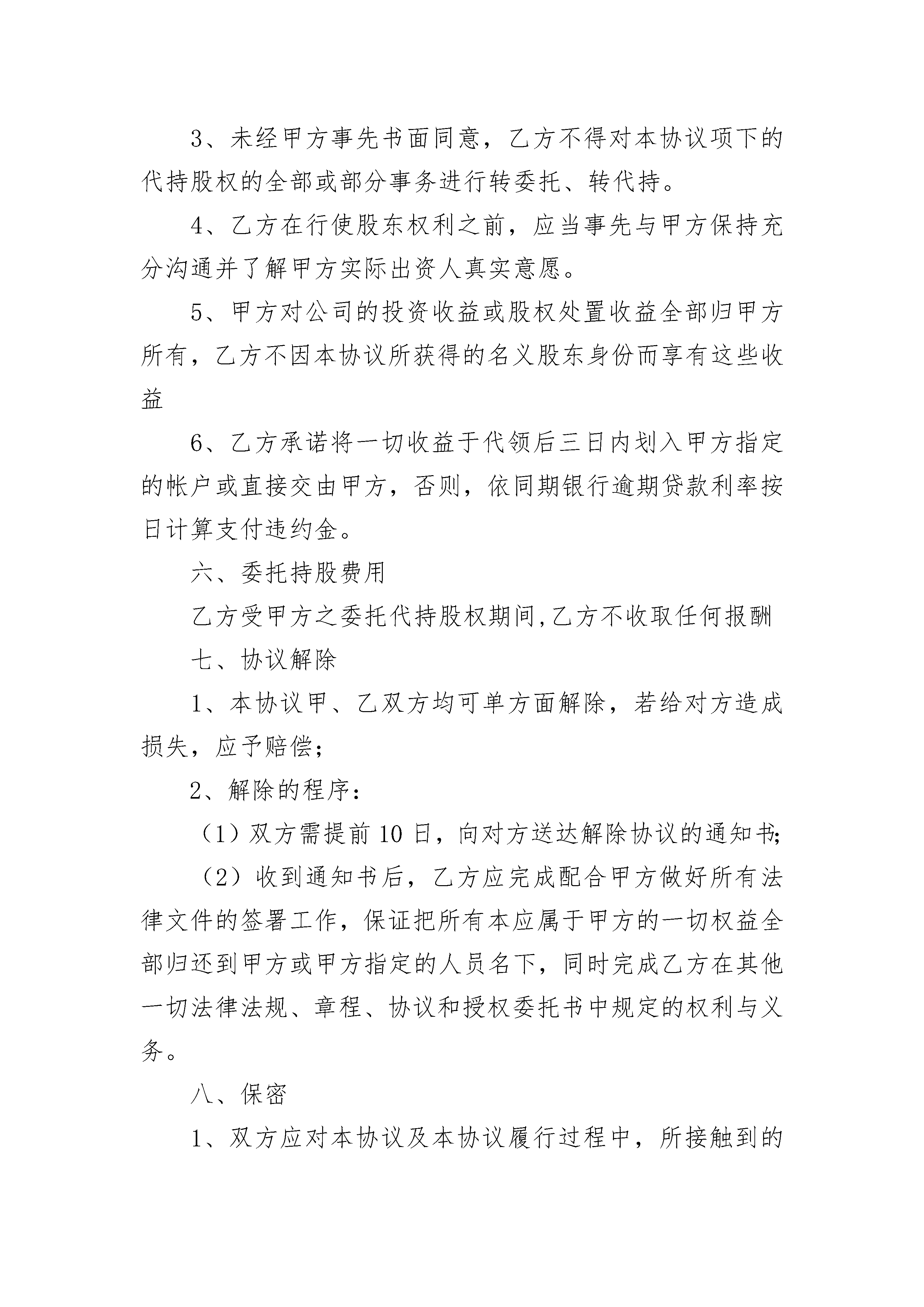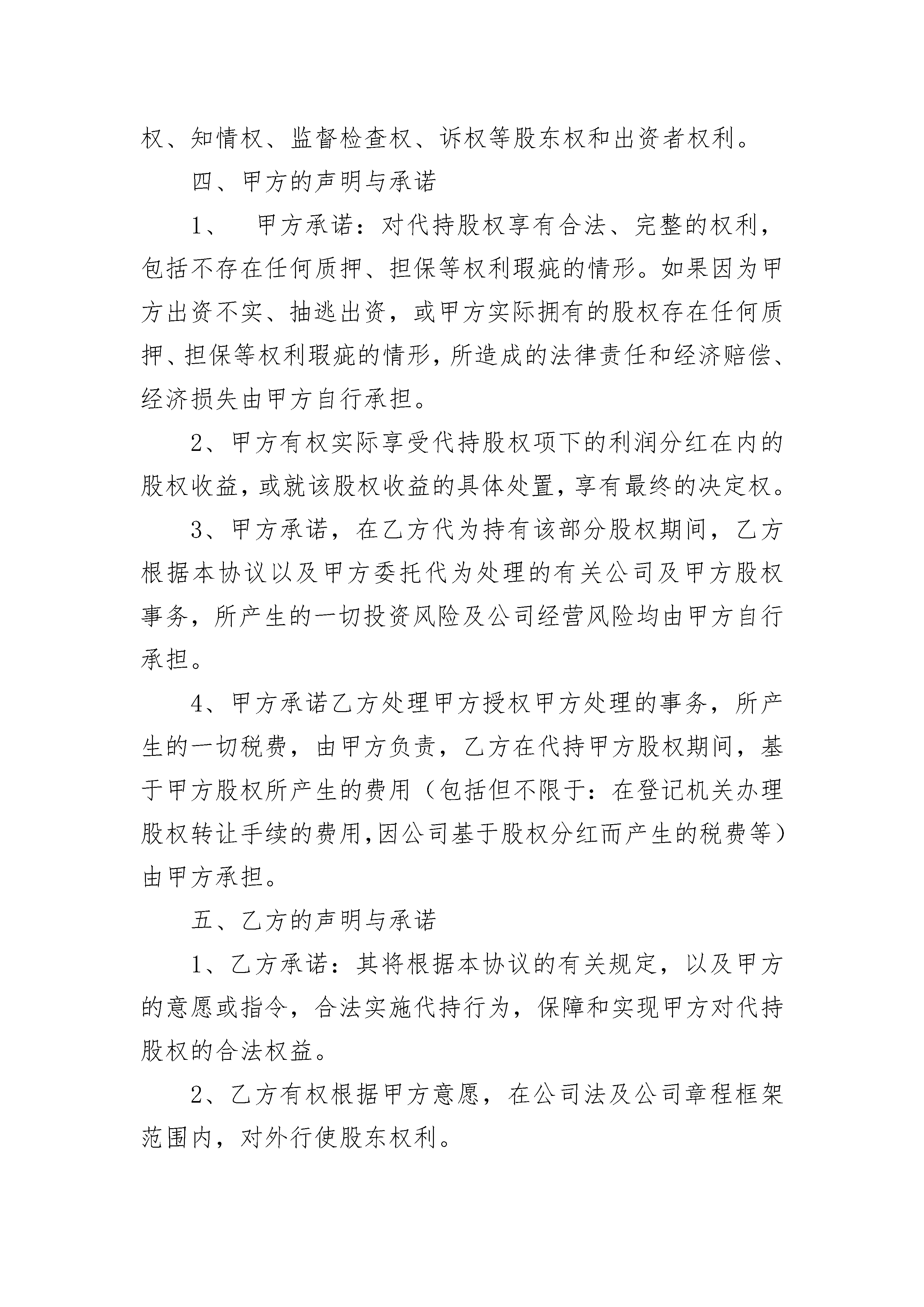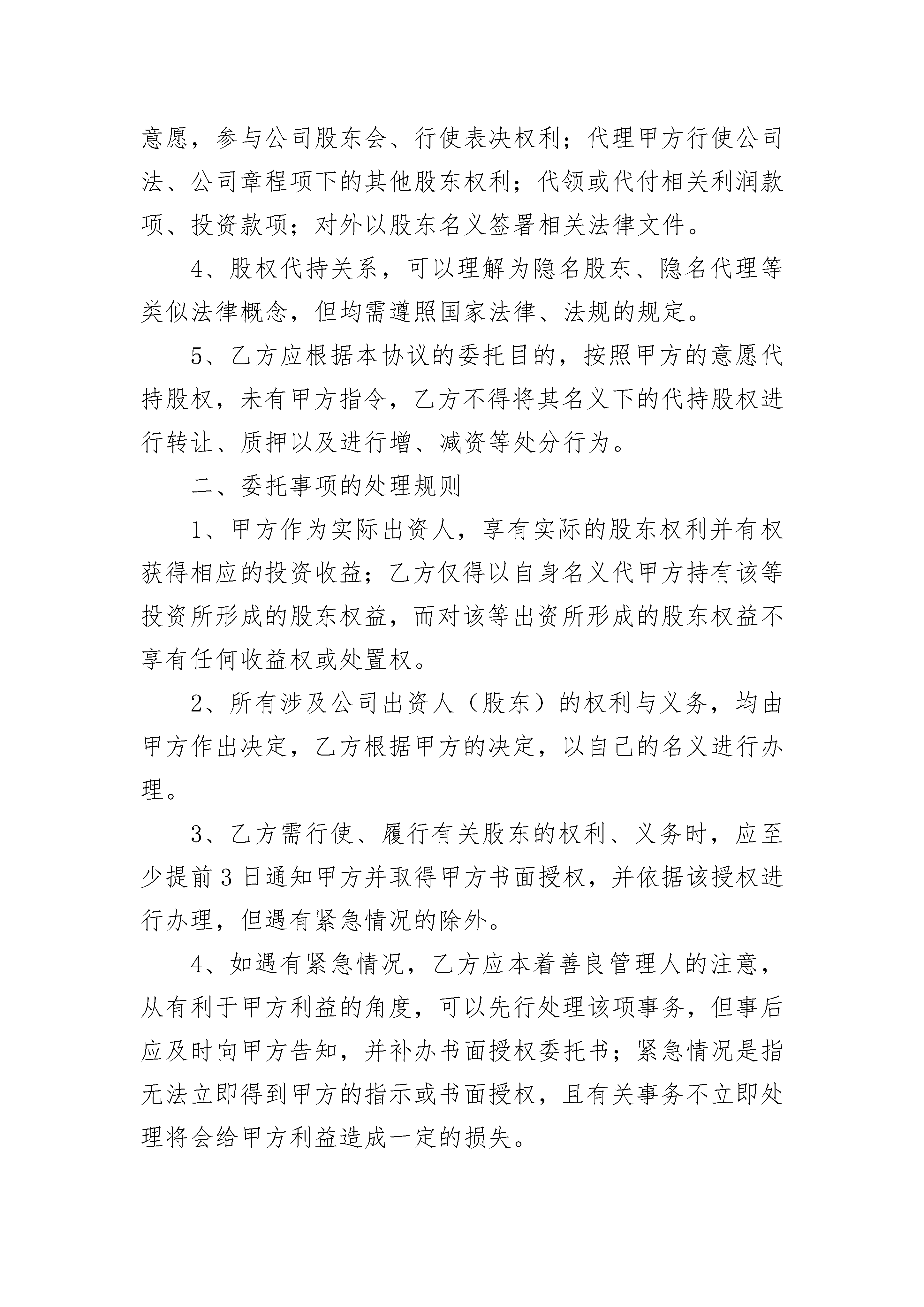 股权代持合伙协议股权代持合伙协议(精选21篇)股权代持合伙协议篇1股权代持协议甲方(实际出资人):身份证号码:住所:乙方(名义股东):身份证号码:住所:公司(以下简称“目标公司”)是根据相关法律法规合法设立并存续的,目标公司注册资本人民币万元。现甲方实际出资人民币万元,占公司注册资本的%。现甲、乙双方就甲方委托乙方代为持有上述目标公司%的股权(以下简称“代持股权”)事宜,经协商一致,达成如下协议:一、股权代持关系的界定及委托事项1、代持股权实际由甲方所有并实际出资,由乙方以乙方的名义持有。2、乙方代理甲方对外持有股权,并依据甲方意愿对外行使股东权利,由甲方实际享受股权收益。3、甲方委托乙方代为行使的股东权利包括:在工商登记、主管部门备案以及公司股东登记名册上具名;按照甲方意愿,参与公司股东会、行使表决权利;代理甲方行使公司法、公司章程项下的其他股东权利;代领或代付相关利润款项、投资款项;对外以股东名义签署相关法律文件。4、股权代持关系,可以理解为隐名股东、隐名代理等类似法律概念,但均需遵照国家法律、法规的规定。5、乙方应根据本协议的委托目的,按照甲方的意愿代持股权,未有甲方指令,乙方不得将其名义下的代持股权进行转让、质押以及进行增、减资等处分行为。二、委托事项的处理规则1、甲方作为实际出资人,享有实际的股东权利并有权获得相应的投资收益;乙方仅得以自身名义代甲方持有该等投资所形成的股东权益,而对该等出资所形成的股东权益不享有任何收益权或处置权。2、所有涉及公司出资人(股东)的权利与义务,均由甲方作出决定,乙方根据甲方的决定,以自己的名义进行办理。3、乙方需行使、履行有关股东的权利、义务时,应至少提前3日通知甲方并取得甲方书面授权,并依据该授权进行办理,但遇有紧急情况的除外。4、如遇有紧急情况,乙方应本着善良管理人的注意,从有利于甲方利益的角度,可以先行处理该项事务,但事后应及时向甲方告知,并补办书面授权委托书;紧急情况是指无法立即得到甲方的指示或书面授权,且有关事务不立即处理将会给甲方利益造成一定的损失。但无论在何种情况下,在未事先取得甲方书面授权时,乙方均不得对其所代持的股权及其所有收益进行转让、处分或设置任何形式的担保。5、乙方完成委托事项,必须亲自进行,除非另行得到甲方书面同意,不得转委托任何第三人。6、乙方根据授权委托书处理事务,若因以下行为对甲方、公司、公司其他股东及其他利益相关人造成损失的,应负赔偿责任:(1)乙方在没有授权委托书的情况下,所进行的任何行为;(2)未经甲方书面同意,而将甲方交办的事务转委托第三人;(3)在执行事务过程中存在故意或重大过失的,其中,乙方拒不执行甲方指示或未经甲方书面同意而改变甲方指示处理委托事项的,视为乙方故意或有重大过失。三、乙方协助甲方处分股权的义务1、在甲方拟将自己的股权及与该股权相关的一切权益进行法律上的处分(包括事实上的处分)时,乙方均应根据甲方的书面授权,并以自己的名义,对此提供必要的协助及便利,届时涉及到的相关法律文件,乙方应无条件接受并提供全面、及时的协助;2、甲方对自己股权及其相关权益进行法律上(含事实上)的处分,包括但不限于:股权的转让、设定各类担保措施、表决权、投资收益取得权、剩余财产请求权、主张优先购卖权、知情权、监督检查权、诉权等股东权和出资者权利。四、甲方的声明与承诺1、甲方承诺:对代持股权享有合法、完整的权利,包括不存在任何质押、担保等权利瑕疵的情形。如果因为甲方出资不实、抽逃出资,或甲方实际拥有的股权存在任何质押、担保等权利瑕疵的情形,所造成的法律责任和经济赔偿、经济损失由甲方自行承担。2、甲方有权实际享受代持股权项下的利润分红在内的股权收益,或就该股权收益的具体处置,享有最终的决定权。3、甲方承诺,在乙方代为持有该部分股权期间,乙方根据本协议以及甲方委托代为处理的有关公司及甲方股权事务,所产生的一切投资风险及公司经营风险均由甲方自行承担。4、甲方承诺乙方处理甲方授权甲方处理的事务,所产生的一切税费,由甲方负责,乙方在代持甲方股权期间,基于甲方股权所产生的费用(包括但不限于:在登记机关办理股权转让手续的费用,因公司基于股权分红而产生的税费等)由甲方承担。五、乙方的声明与承诺1、乙方承诺:其将根据本协议的有关规定,以及甲方的意愿或指令,合法实施代持行为,保障和实现甲方对代持股权的合法权益。2、乙方有权根据甲方意愿,在公司法及公司章程框架范围内,对外行使股东权利。3、未经甲方事先书面同意,乙方不得对本协议项下的代持股权的全部或部分事务进行转委托、转代持。4、乙方在行使股东权利之前,应当事先与甲方保持充分沟通并了解甲方实际出资人真实意愿。5、甲方对公司的投资收益或股权处置收益全