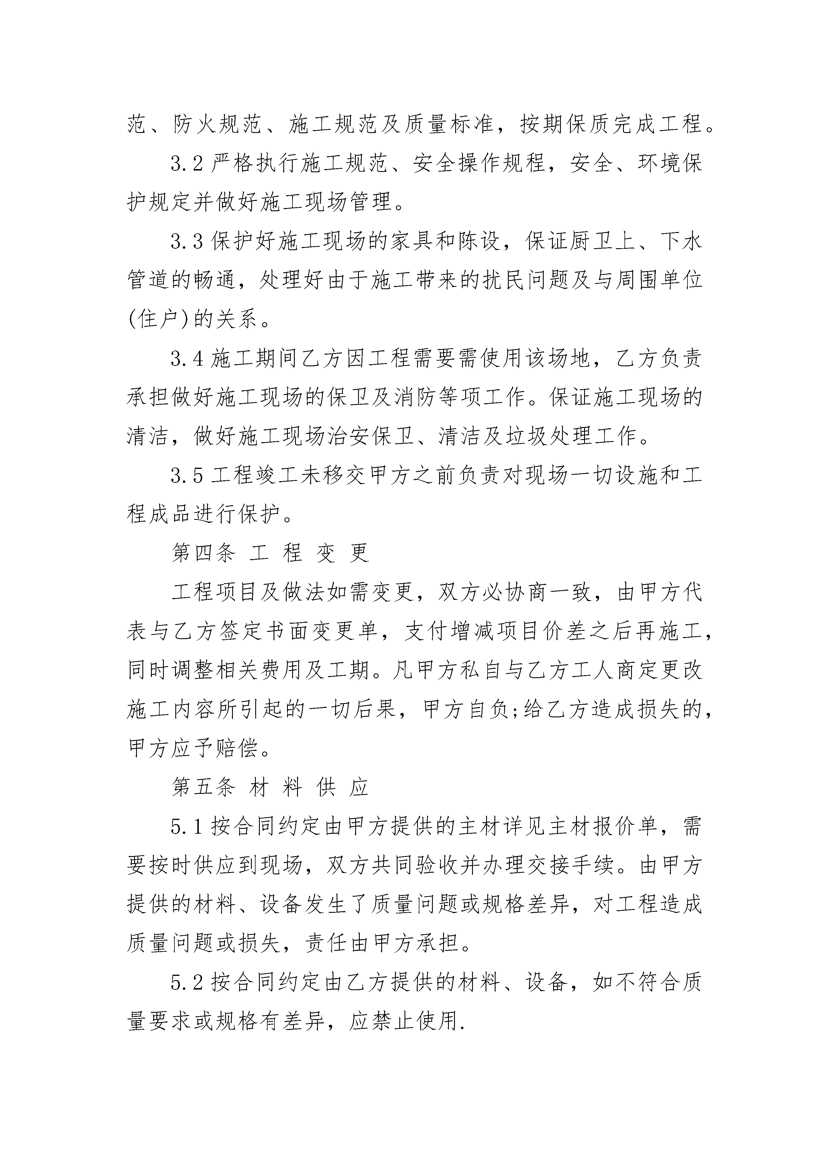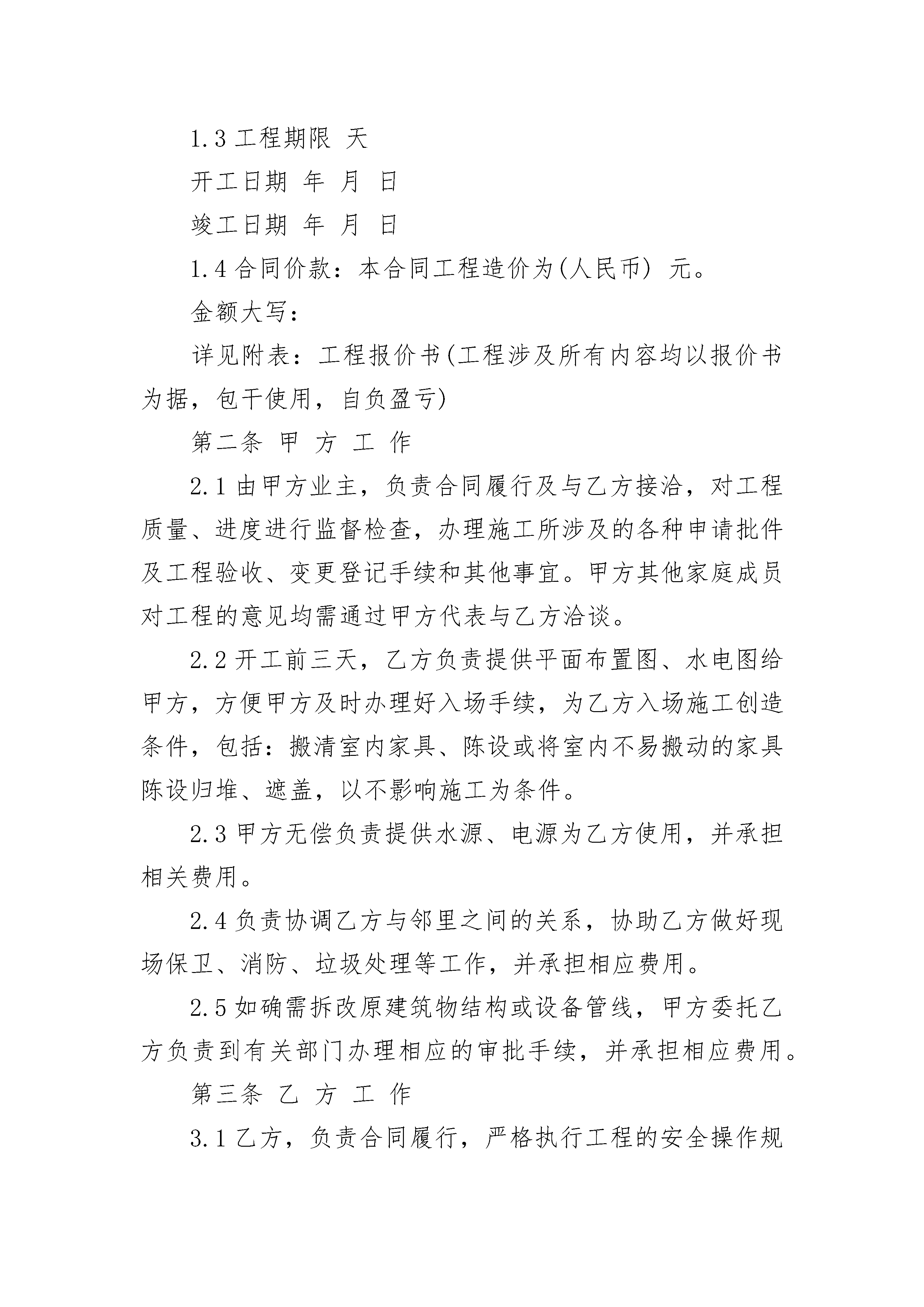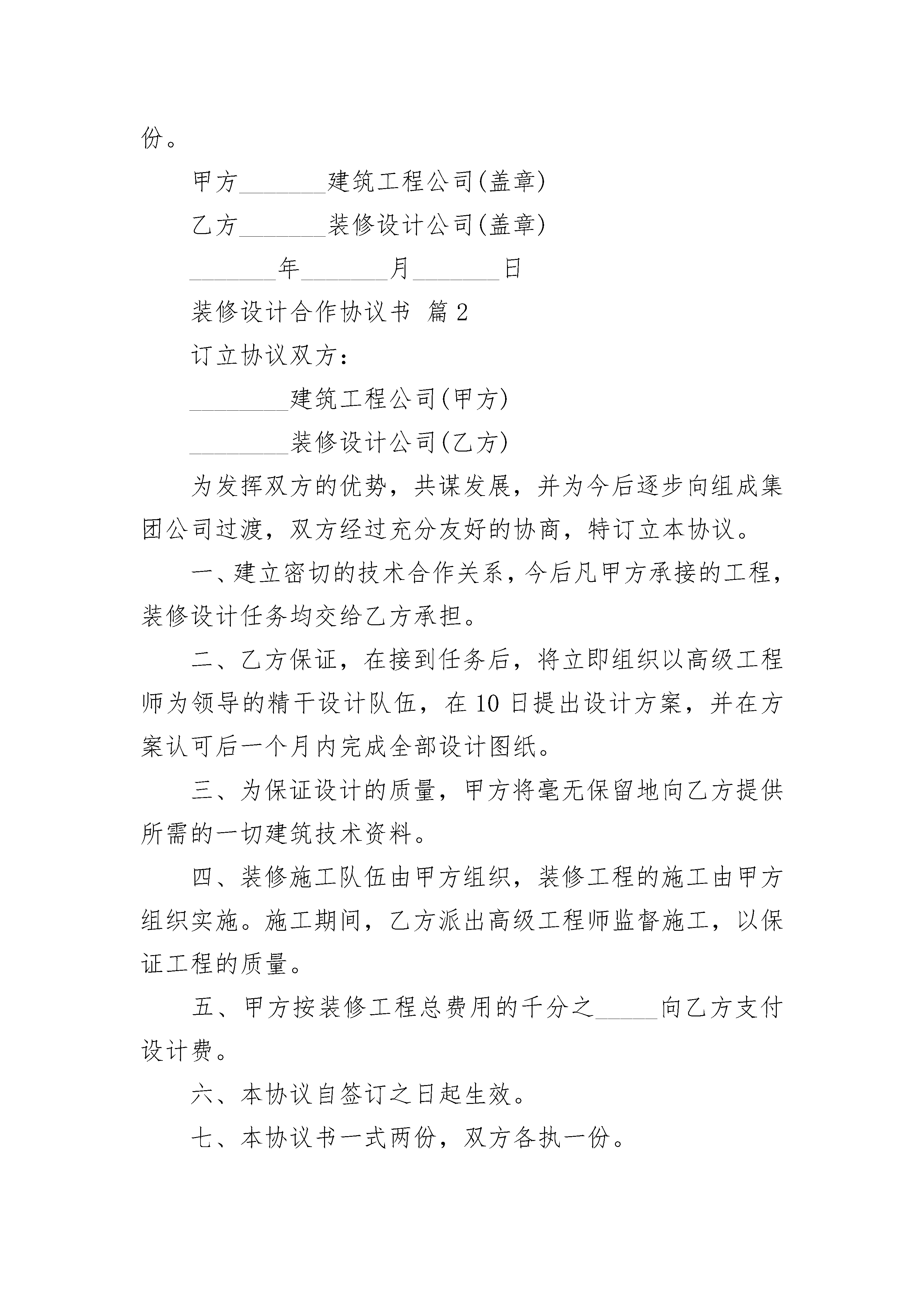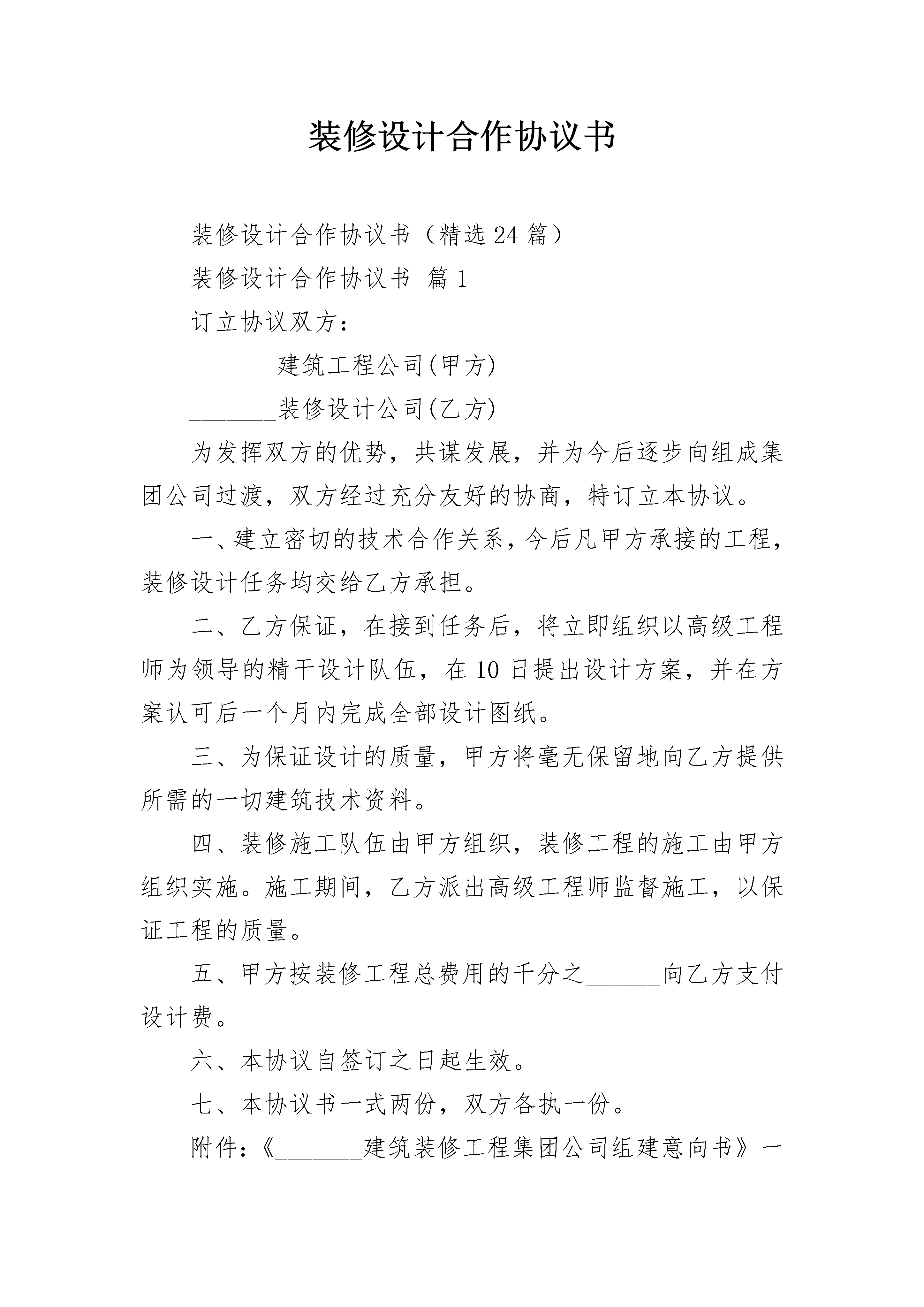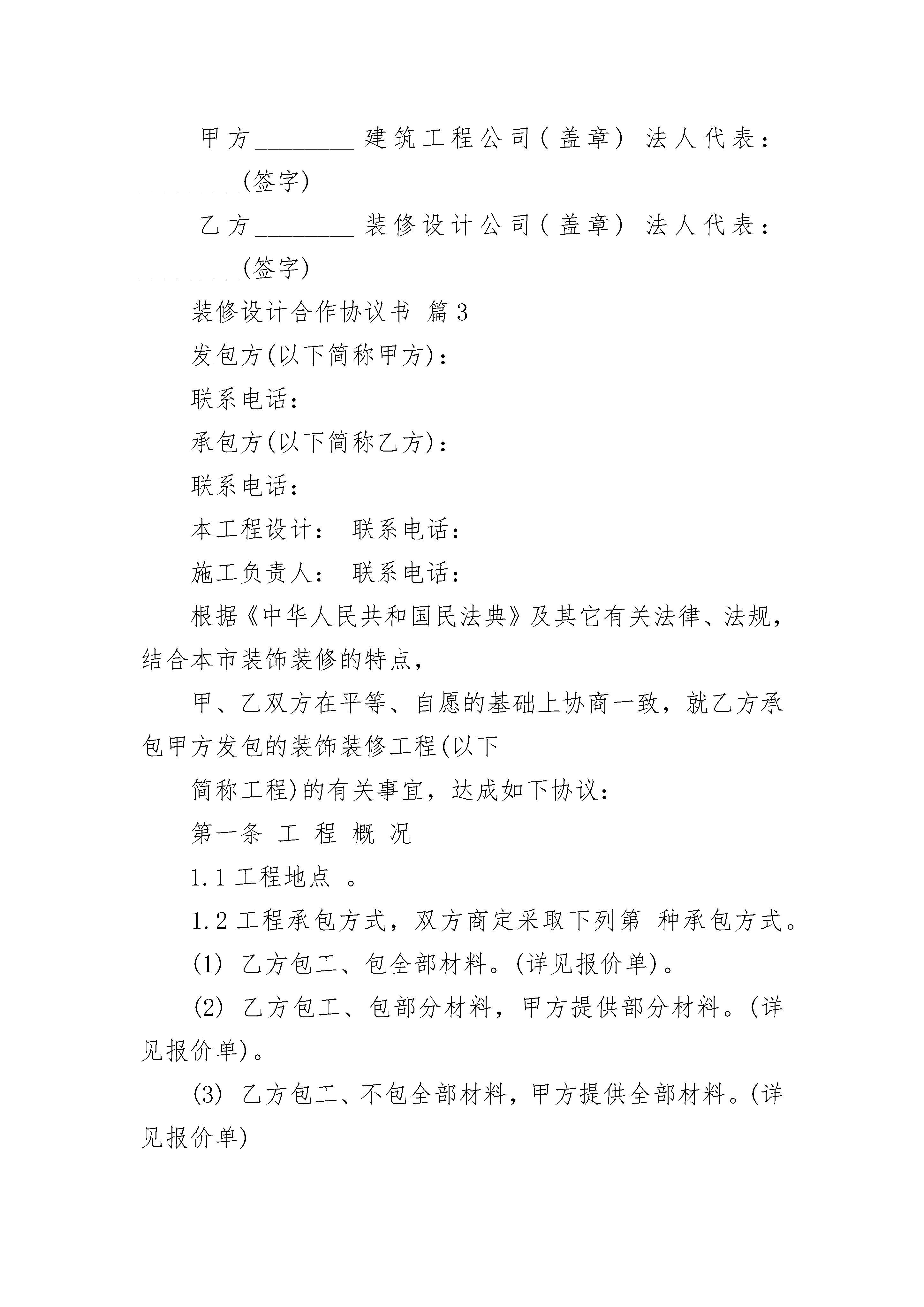 装修设计合作协议书装修设计合作协议书(精选24篇)装修设计合作协议书篇1订立协议双方:_______建筑工程公司(甲方)_______装修设计公司(乙方)为发挥双方的优势,共谋发展,并为今后逐步向组成集团公司过渡,双方经过充分友好的协商,特订立本协议。一、建立密切的技术合作关系,今后凡甲方承接的工程,装修设计任务均交给乙方承担。二、乙方保证,在接到任务后,将立即组织以高级工程师为领导的精干设计队伍,在10日提出设计方案,并在方案认可后一个月内完成全部设计图纸。三、为保证设计的质量,甲方将毫无保留地向乙方提供所需的一切建筑技术资料。四、装修施工队伍由甲方组织,装修工程的施工由甲方组织实施。施工期间,乙方派出高级工程师监督施工,以保证工程的质量。五、甲方按装修工程总费用的千分之______向乙方支付设计费。六、本协议自签订之日起生效。七、本协议书一式两份,双方各执一份。附件:《_______建筑装修工程集团公司组建意向书》一份。甲方_______建筑工程公司(盖章)乙方_______装修设计公司(盖章)_______年_______月_______日装修设计合作协议书篇2订立协议双方:________建筑工程公司(甲方)________装修设计公司(乙方)为发挥双方的优势,共谋发展,并为今后逐步向组成集团公司过渡,双方经过充分友好的协商,特订立本协议。一、建立密切的技术合作关系,今后凡甲方承接的工程,装修设计任务均交给乙方承担。二、乙方保证,在接到任务后,将立即组织以高级工程师为领导的精干设计队伍,在10日提出设计方案,并在方案认可后一个月内完成全部设计图纸。三、为保证设计的质量,甲方将毫无保留地向乙方提供所需的一切建筑技术资料。四、装修施工队伍由甲方组织,装修工程的施工由甲方组织实施。施工期间,乙方派出高级工程师监督施工,以保证工程的质量。五、甲方按装修工程总费用的千分之_____向乙方支付设计费。六、本协议自签订之日起生效。七、本协议书一式两份,双方各执一份。甲方________建筑工程公司(盖章)法人代表:________(签字)乙方________装修设计公司(盖章)法人代表:________(签字)装修设计合作协议书篇3发包方(以下简称甲方):联系电话:承包方(以下简称乙方):联系电话:本工程设计:联系电话:施工负责人:联系电话:根据《中华人民共和国民法典》及其它有关法律、法规,结合本市装饰装修的特点,甲、乙双方在平等、自愿的基础上协商一致,就乙方承包甲方发包的装饰装修工程(以下简称工程)的有关事宜,达成如下协议:第一条工程概况1.1工程地点。1.2工程承包方式,双方商定采取下列第种承包方式。(1)乙方包工、包全部材料。(详见报价单)。(2)乙方包工、包部分材料,甲方提供部分材料。(详见报价单)。(3)乙方包工、不包全部材料,甲方提供全部材料。(详见报价单)1.3工程期限天开工日期年月日竣工日期年月日1.4合同价款:本合同工程造价为(人民币)元。金额大写:详见附表:工程报价书(工程涉及所有内容均以报价书为据,包干使用,自负盈亏)第二条甲方工作2.1由甲方业主,负责合同履行及与乙方接洽,对工程质量、进度进行监督检查,办理施工所涉及的各种申请批件及工程验收、变更登记手续和其他事宜。甲方其他家庭成员对工程的意见均需通过甲方代表与乙方洽谈。2.2开工前三天,乙方负责提供平面布置图、水电图给甲方,方便甲方及时办理好入场手续,为乙方入场施工创造条件,包括:搬清室内家具、陈设或将室内不易搬动的家具陈设归堆、遮盖,以不影响施工为条件。2.3甲方无偿负责提供水源、电源为乙方使用,并承担相关费用。2.4负责协调乙方与邻里之间的关系,协助乙方做好现场保卫、消防、垃圾处理等工作,并承担相应费用。2.5如确需拆改原建筑物结构或设备管线,甲方委托乙方负责到有关部门办理相应的审批手续,并承担相应费用。第三条乙方工作3.1乙方,负责合同履行,严格执行工程的安全操作规范、防火规范、施工规范及质量标准,按期保质完成工程。3.2严格执行施工规范、安全操作规程,安全、环境保护规定并做好施工现场管理。3.3保护好施工现场的家具和陈设,保证厨卫上、下水管道的畅通,处理好由于施工带来的扰民问题及与周围单位(住户)的关系。3.4施工期间乙方因工程需要需使用该场地,乙方负责承担做好施工现场的保卫及消防等项工作。保证施工现场的清洁,做好施工现场治安保卫、清洁及垃圾处理工作。3.5工程竣工未移交甲方之前负责对现场一切设施和工程成品进行保护。第四条工程变更工程项目及做法如需变更,双方必协商一致,由甲方代表与乙方签定书面变更单,支付增减项目价差之后再施工,同时调整相关费用及工期。凡甲方私自与乙方工人商定更改施工内容所引起的一切后果,甲方自负;给乙方造成损失的,甲方应予赔偿。
