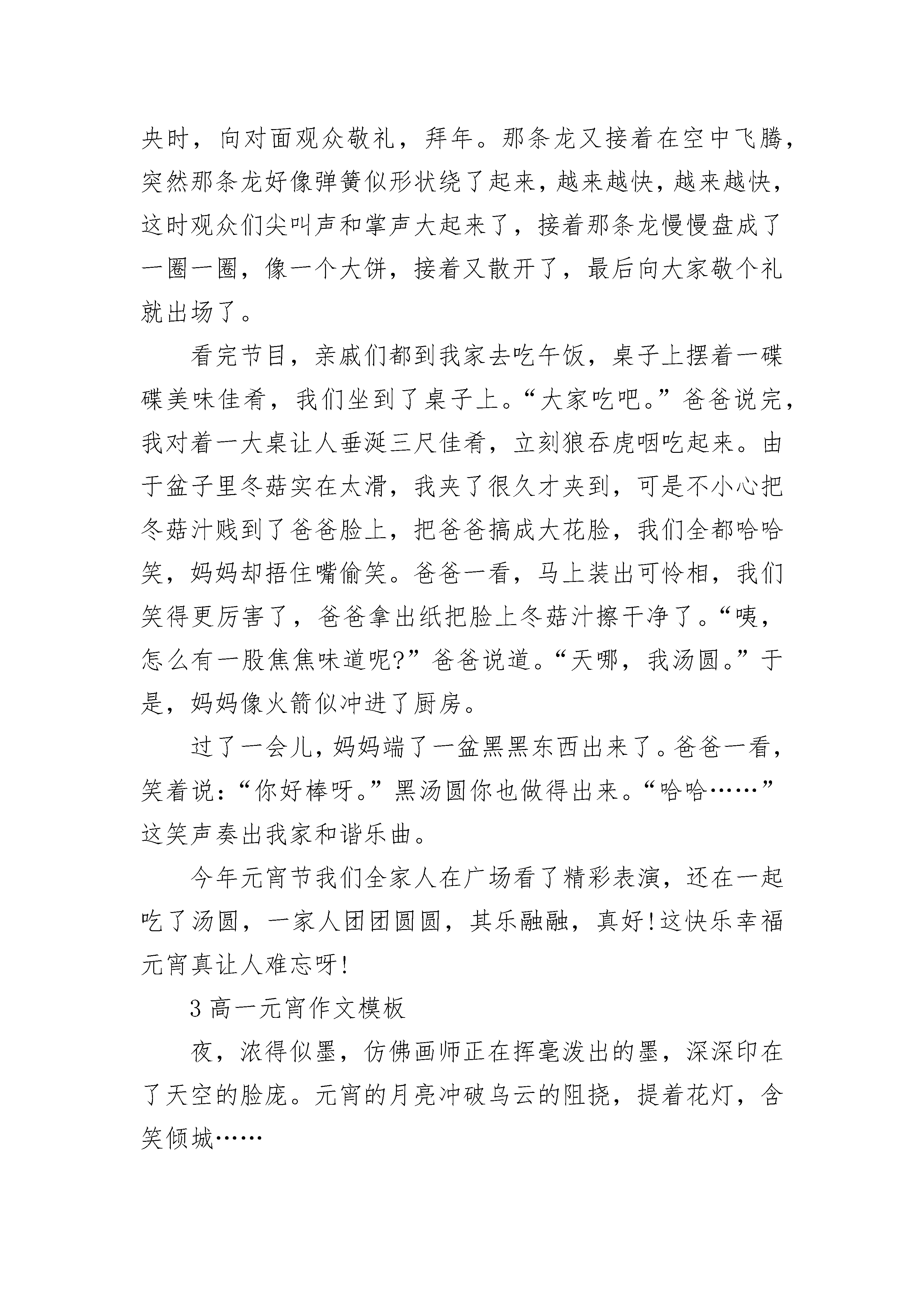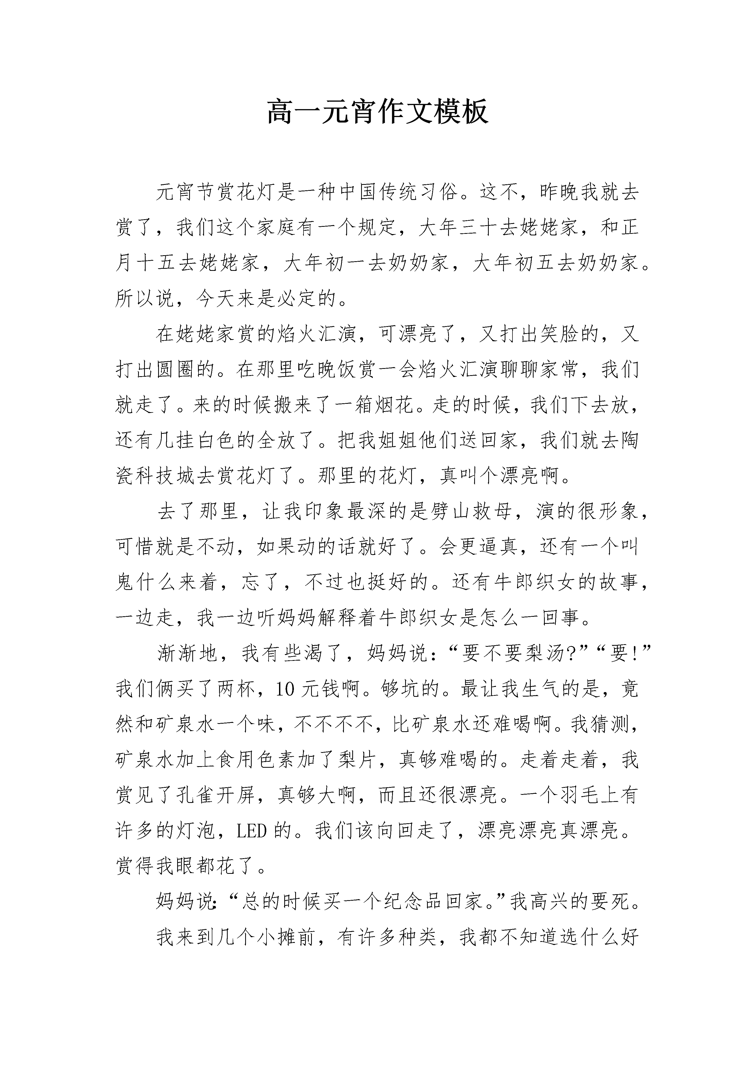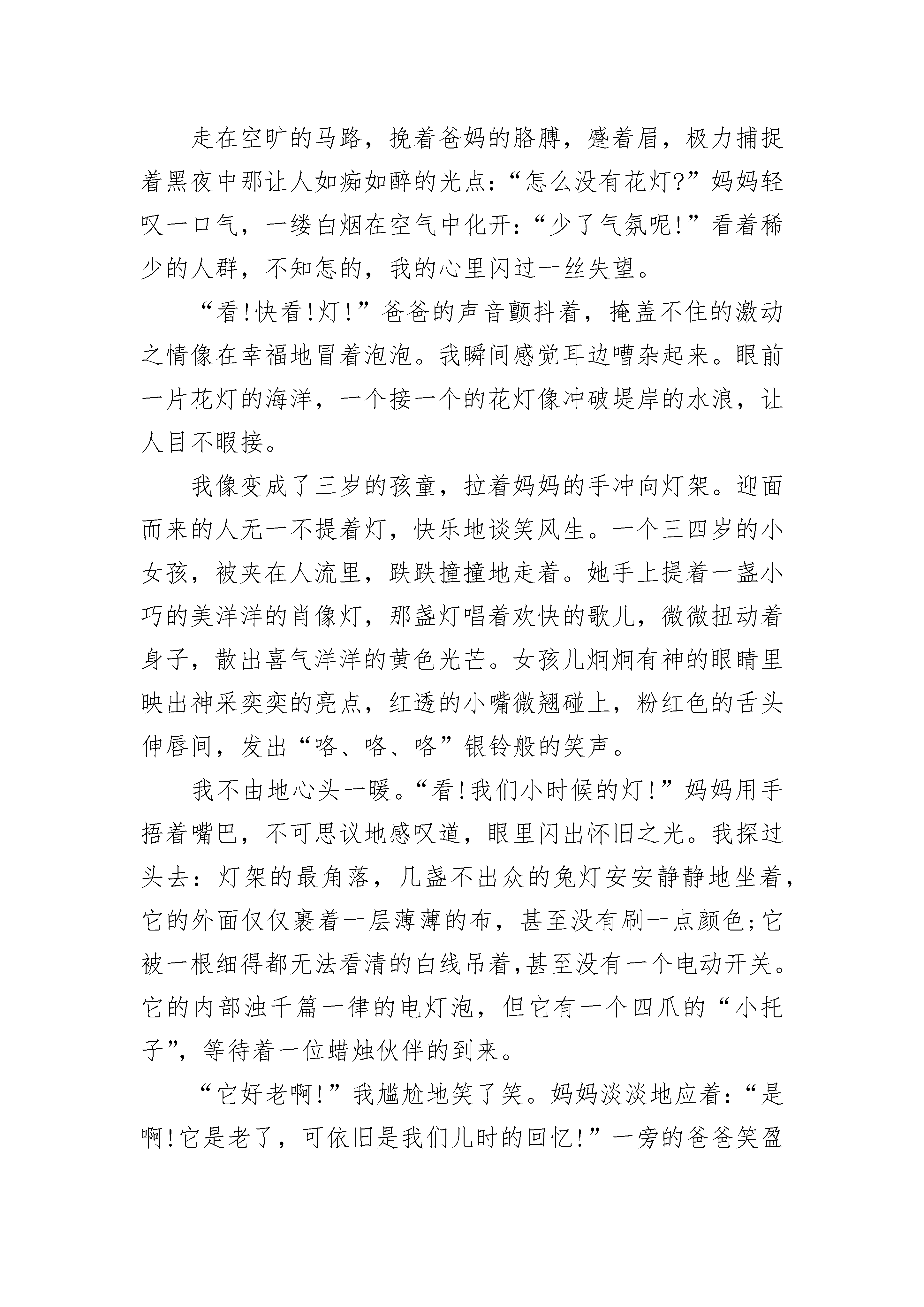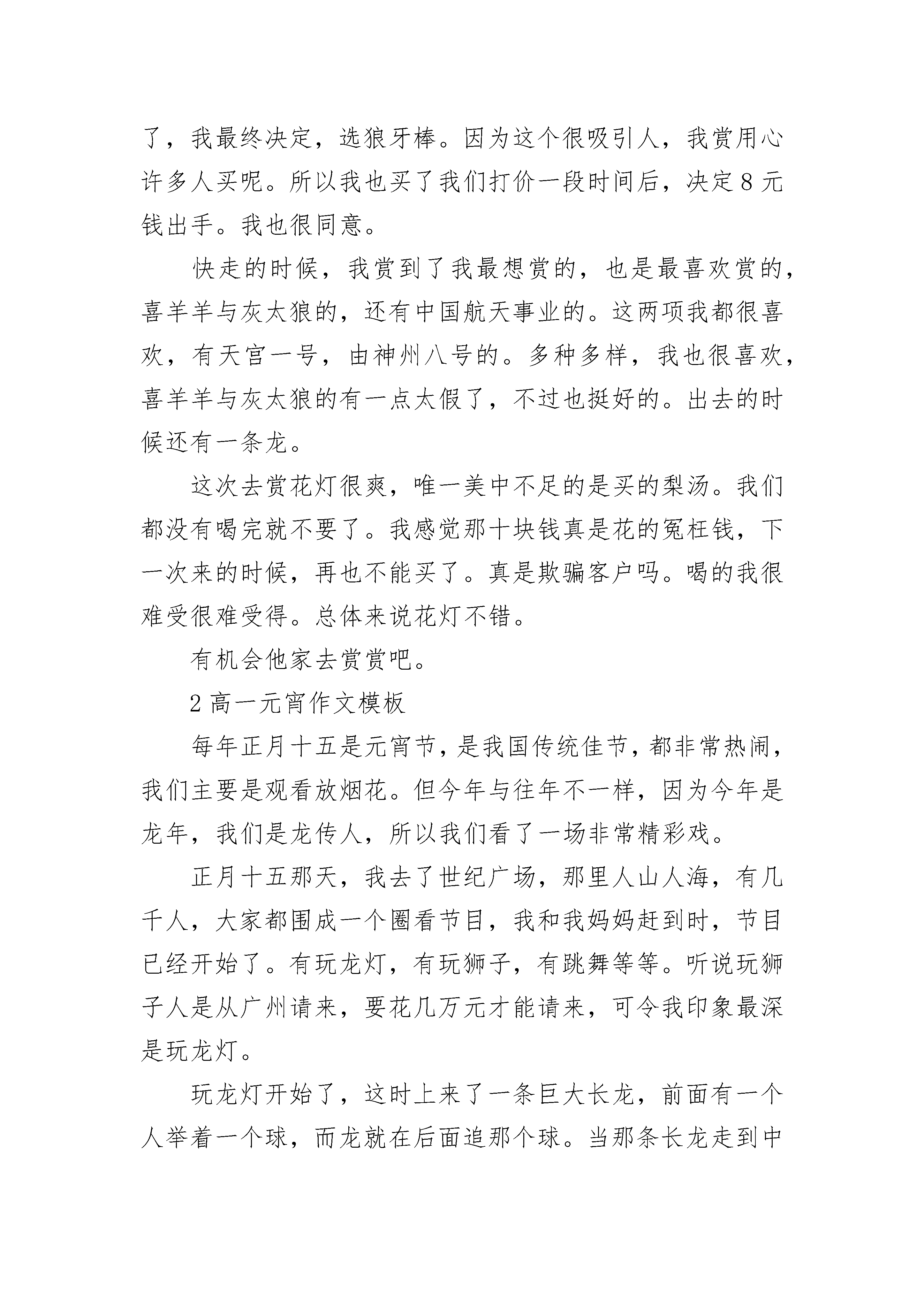 高一元宵作文模板元宵节赏花灯是一种中国传统习俗。这不,昨晚我就去赏了,我们这个家庭有一个规定,大年三十去姥姥家,和正月十五去姥姥家,大年初一去奶奶家,大年初五去奶奶家。所以说,今天来是必定的。在姥姥家赏的焰火汇演,可漂亮了,又打出笑脸的,又打出圆圈的。在那里吃晚饭赏一会焰火汇演聊聊家常,我们就走了。来的时候搬来了一箱烟花。走的时候,我们下去放,还有几挂白色的全放了。把我姐姐他们送回家,我们就去陶瓷科技城去赏花灯了。那里的花灯,真叫个漂亮啊。去了那里,让我印象最深的是劈山救母,演的很形象,可惜就是不动,如果动的话就好了。会更逼真,还有一个叫鬼什么来着,忘了,不过也挺好的。还有牛郎织女的故事,一边走,我一边听妈妈解释着牛郎织女是怎么一回事。渐渐地,我有些渴了,妈妈说:“要不要梨汤?”“要!”我们俩买了两杯,10元钱啊。够坑的。最让我生气的是,竟然和矿泉水一个味,不不不不,比矿泉水还难喝啊。我猜测,矿泉水加上食用色素加了梨片,真够难喝的。走着走着,我赏见了孔雀开屏,真够大啊,而且还很漂亮。一个羽毛上有许多的灯泡,LED的。我们该向回走了,漂亮漂亮真漂亮。赏得我眼都花了。妈妈说:“总的时候买一个纪念品回家。”我高兴的要死。我来到几个小摊前,有许多种类,我都不知道选什么好了,我最终决定,选狼牙棒。因为这个很吸引人,我赏用心许多人买呢。所以我也买了我们打价一段时间后,决定8元钱出手。我也很同意。快走的时候,我赏到了我最想赏的,也是最喜欢赏的,喜羊羊与灰太狼的,还有中国航天事业的。这两项我都很喜欢,有天宫一号,由神州八号的。多种多样,我也很喜欢,喜羊羊与灰太狼的有一点太假了,不过也挺好的。出去的时候还有一条龙。这次去赏花灯很爽,唯一美中不足的是买的梨汤。我们都没有喝完就不要了。我感觉那十块钱真是花的冤枉钱,下一次来的时候,再也不能买了。真是欺骗客户吗。喝的我很难受很难受得。总体来说花灯不错。有机会他家去赏赏吧。2高一元宵作文模板每年正月十五是元宵节,是我国传统佳节,都非常热闹,我们主要是观看放烟花。但今年与往年不一样,因为今年是龙年,我们是龙传人,所以我们看了一场非常精彩戏。正月十五那天,我去了世纪广场,那里人山人海,有几千人,大家都围成一个圈看节目,我和我妈妈赶到时,节目已经开始了。有玩龙灯,有玩狮子,有跳舞等等。听说玩狮子人是从广州请来,要花几万元才能请来,可令我印象最深是玩龙灯。玩龙灯开始了,这时上来了一条巨大长龙,前面有一个人举着一个球,而龙就在后面追那个球。当那条长龙走到中央时,向对面观众敬礼,拜年。那条龙又接着在空中飞腾,突然那条龙好像弹簧似形状绕了起来,越来越快,越来越快,这时观众们尖叫声和掌声大起来了,接着那条龙慢慢盘成了一圈一圈,像一个大饼,接着又散开了,最后向大家敬个礼就出场了。看完节目,亲戚们都到我家去吃午饭,桌子上摆着一碟碟美味佳肴,我们坐到了桌子上。“大家吃吧。”爸爸说完,我对着一大桌让人垂涎三尺佳肴,立刻狼吞虎咽吃起来。由于盆子里冬菇实在太滑,我夹了很久才夹到,可是不小心把冬菇汁贱到了爸爸脸上,把爸爸搞成大花脸,我们全都哈哈笑,妈妈却捂住嘴偷笑。爸爸一看,马上装出可怜相,我们笑得更厉害了,爸爸拿出纸把脸上冬菇汁擦干净了。“咦,怎么有一股焦焦味道呢?”爸爸说道。“天哪,我汤圆。”于是,妈妈像火箭似冲进了厨房。过了一会儿,妈妈端了一盆黑黑东西出来了。爸爸一看,笑着说:“你好棒呀。”黑汤圆你也做得出来。“哈哈……”这笑声奏出我家和谐乐曲。今年元宵节我们全家人在广场看了精彩表演,还在一起吃了汤圆,一家人团团圆圆,其乐融融,真好!这快乐幸福元宵真让人难忘呀!3高一元宵作文模板夜,浓得似墨,仿佛画师正在挥毫泼出的墨,深深印在了天空的脸庞。元宵的月亮冲破乌云的阻挠,提着花灯,含笑倾城……走在空旷的马路,挽着爸妈的胳膊,蹙着眉,极力捕捉着黑夜中那让人如痴如醉的光点:“怎么没有花灯?”妈妈轻叹一口气,一缕白烟在空气中化开:“少了气氛呢!”看着稀少的人群,不知怎的,我的心里闪过一丝失望。“看!快看!灯!”爸爸的声音颤抖着,掩盖不住的激动之情像在幸福地冒着泡泡。我瞬间感觉耳边嘈杂起来。眼前一片花灯的海洋,一个接一个的花灯像冲破堤岸的水浪,让人目不暇接。我像变成了三岁的孩童,拉着妈妈的手冲向灯架。迎面而来的人无一不提着灯,快乐地谈笑风生。一个三四岁的小女孩,被夹在人流里,跌跌撞撞地走着。她手上提着一盏小巧的美洋洋的肖像灯,那盏灯唱着欢快的歌儿,微微扭动着身子,散出喜气洋洋的黄色光芒。女孩儿炯炯有神的眼睛里映出神采奕奕的亮点,红透的小嘴微翘碰上,粉红色的舌头伸唇间,发出“咯、咯、咯”银铃般的笑声。我不由地心头一暖。“看!我们小时候的灯!”妈妈用手捂着嘴巴,不可思议地感叹道,眼里闪出怀旧之光。我探过头去:灯架的最角落,几盏不出众的兔灯安