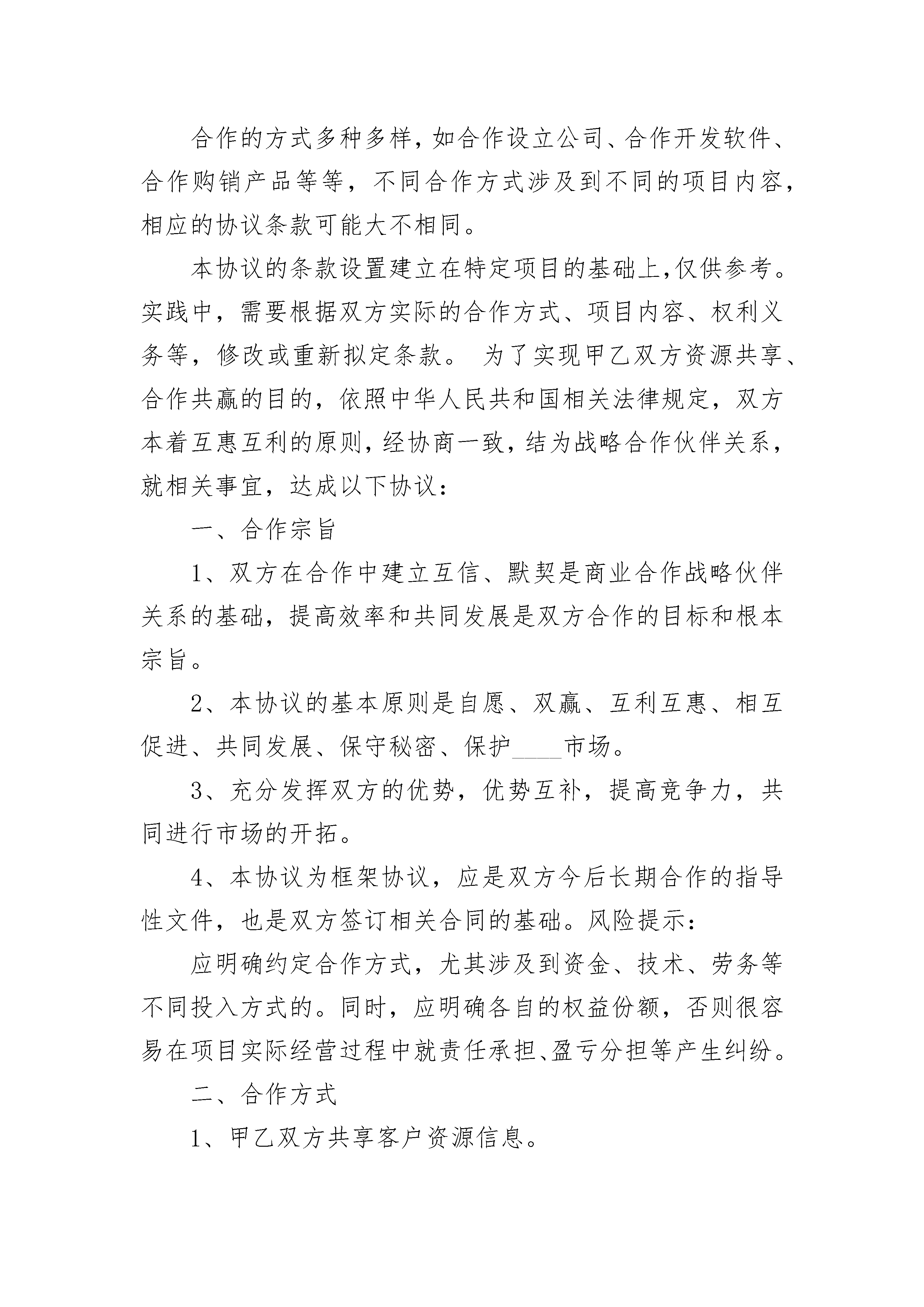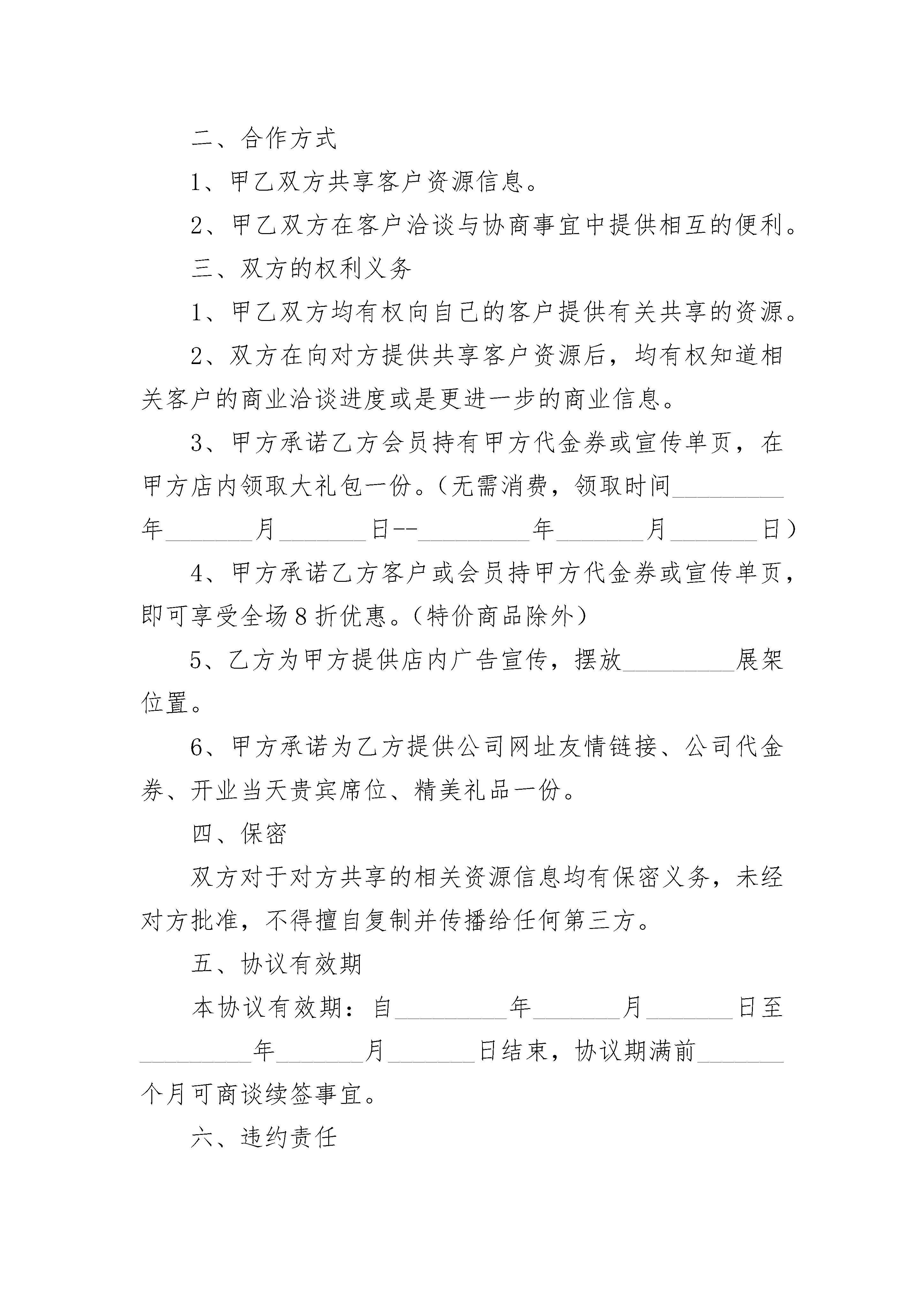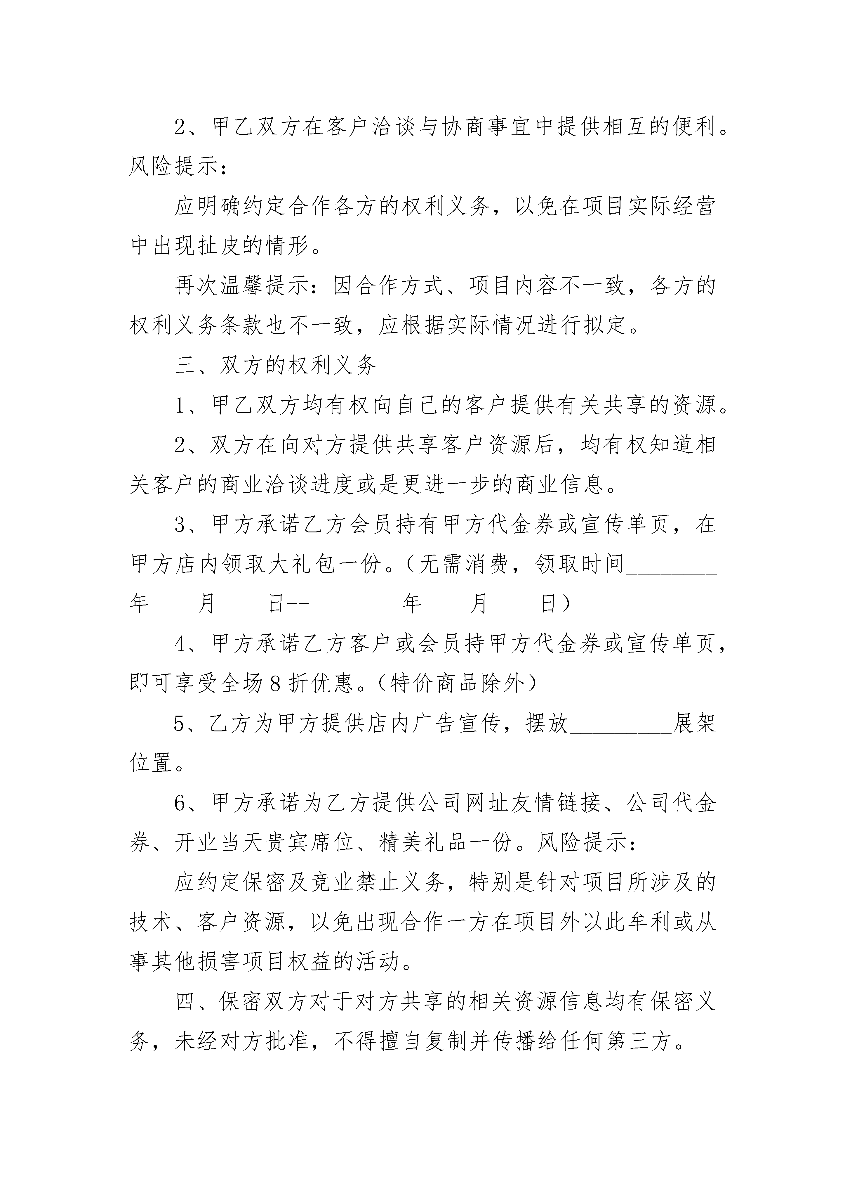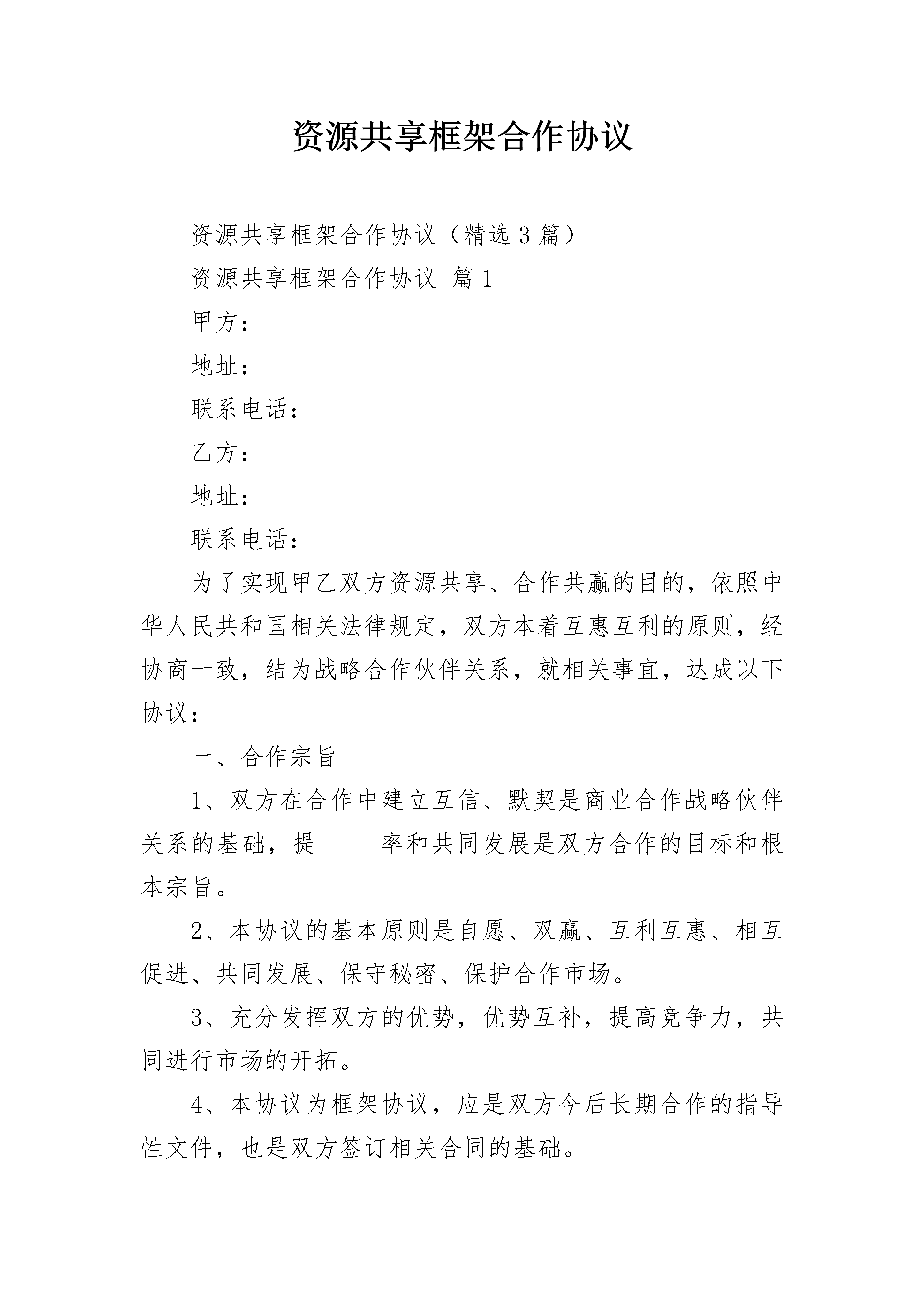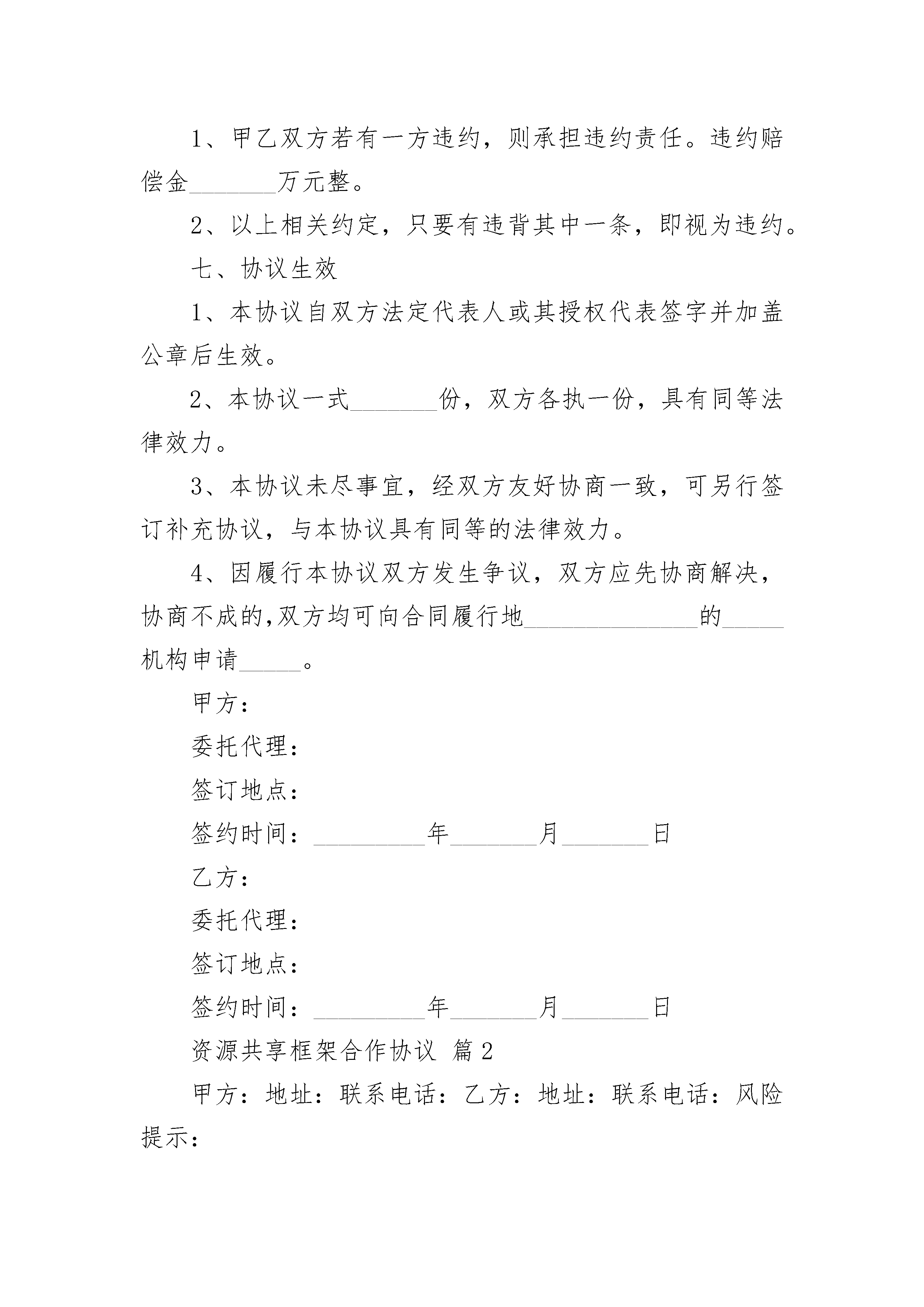 资源共享框架合作协议资源共享框架合作协议(精选3篇)资源共享框架合作协议篇1甲方:地址:联系电话:乙方:地址:联系电话:为了实现甲乙双方资源共享、合作共赢的目的,依照中华人民共和国相关法律规定,双方本着互惠互利的原则,经协商一致,结为战略合作伙伴关系,就相关事宜,达成以下协议:一、合作宗旨1、双方在合作中建立互信、默契是商业合作战略伙伴关系的基础,提_____率和共同发展是双方合作的目标和根本宗旨。2、本协议的基本原则是自愿、双赢、互利互惠、相互促进、共同发展、保守秘密、保护合作市场。3、充分发挥双方的优势,优势互补,提高竞争力,共同进行市场的开拓。4、本协议为框架协议,应是双方今后长期合作的指导性文件,也是双方签订相关合同的基础。二、合作方式1、甲乙双方共享客户资源信息。2、甲乙双方在客户洽谈与协商事宜中提供相互的便利。三、双方的权利义务1、甲乙双方均有权向自己的客户提供有关共享的资源。2、双方在向对方提供共享客户资源后,均有权知道相关客户的商业洽谈进度或是更进一步的商业信息。3、甲方承诺乙方会员持有甲方代金券或宣传单页,在甲方店内领取大礼包一份。(无需消费,领取时间_________年_______月_______日--_________年_______月_______日)4、甲方承诺乙方客户或会员持甲方代金券或宣传单页,即可享受全场8折优惠。(特价商品除外)5、乙方为甲方提供店内广告宣传,摆放_________展架位置。6、甲方承诺为乙方提供公司网址友情链接、公司代金券、开业当天贵宾席位、精美礼品一份。四、保密双方对于对方共享的相关资源信息均有保密义务,未经对方批准,不得擅自复制并传播给任何第三方。五、协议有效期本协议有效期:自_________年_______月_______日至_________年_______月_______日结束,协议期满前_______个月可商谈续签事宜。六、违约责任1、甲乙双方若有一方违约,则承担违约责任。违约赔偿金_______万元整。2、以上相关约定,只要有违背其中一条,即视为违约。七、协议生效1、本协议自双方法定代表人或其授权代表签字并加盖公章后生效。2、本协议一式_______份,双方各执一份,具有同等法律效力。3、本协议未尽事宜,经双方友好协商一致,可另行签订补充协议,与本协议具有同等的法律效力。4、因履行本协议双方发生争议,双方应先协商解决,协商不成的,双方均可向合同履行地______________的_____机构申请_____。甲方:委托代理:签订地点:签约时间:_________年_______月_______日乙方:委托代理:签订地点:签约时间:_________年_______月_______日资源共享框架合作协议篇2甲方:地址:联系电话:乙方:地址:联系电话:风险提示:合作的方式多种多样,如合作设立公司、合作开发软件、合作购销产品等等,不同合作方式涉及到不同的项目内容,相应的协议条款可能大不相同。本协议的条款设置建立在特定项目的基础上,仅供参考。实践中,需要根据双方实际的合作方式、项目内容、权利义务等,修改或重新拟定条款。为了实现甲乙双方资源共享、合作共赢的目的,依照中华人民共和国相关法律规定,双方本着互惠互利的原则,经协商一致,结为战略合作伙伴关系,就相关事宜,达成以下协议:一、合作宗旨1、双方在合作中建立互信、默契是商业合作战略伙伴关系的基础,提高效率和共同发展是双方合作的目标和根本宗旨。2、本协议的基本原则是自愿、双赢、互利互惠、相互促进、共同发展、保守秘密、保护____市场。3、充分发挥双方的优势,优势互补,提高竞争力,共同进行市场的开拓。4、本协议为框架协议,应是双方今后长期合作的指导性文件,也是双方签订相关合同的基础。风险提示:应明确约定合作方式,尤其涉及到资金、技术、劳务等不同投入方式的。同时,应明确各自的权益份额,否则很容易在项目实际经营过程中就责任承担、盈亏分担等产生纠纷。二、合作方式1、甲乙双方共享客户资源信息。2、甲乙双方在客户洽谈与协商事宜中提供相互的便利。风险提示:应明确约定合作各方的权利义务,以免在项目实际经营中出现扯皮的情形。再次温馨提示:因合作方式、项目内容不一致,各方的权利义务条款也不一致,应根据实际情况进行拟定。三、双方的权利义务1、甲乙双方均有权向自己的客户提供有关共享的资源。2、双方在向对方提供共享客户资源后,均有权知道相关客户的商业洽谈进度或是更进一步的商业信息。3、甲方承诺乙方会员持有甲方代金券或宣传单页,在甲方店内领取大礼包一份。(无需消费,领取时间________年____月____日--________年____月____日)4、甲方承诺乙方客户或会员持甲方代金券或宣传单页,即可享受全场8折优惠。(特价商品除外)5、