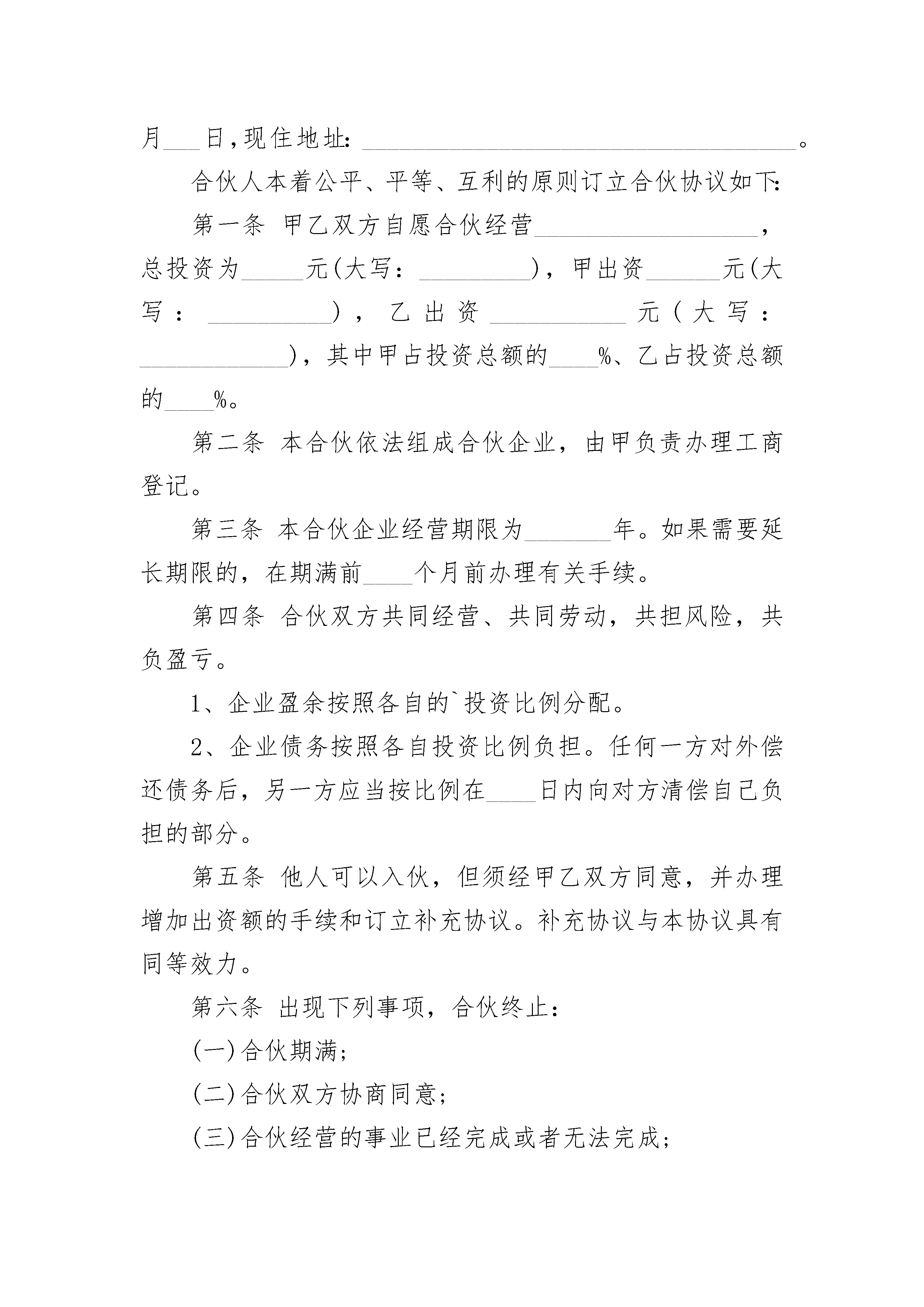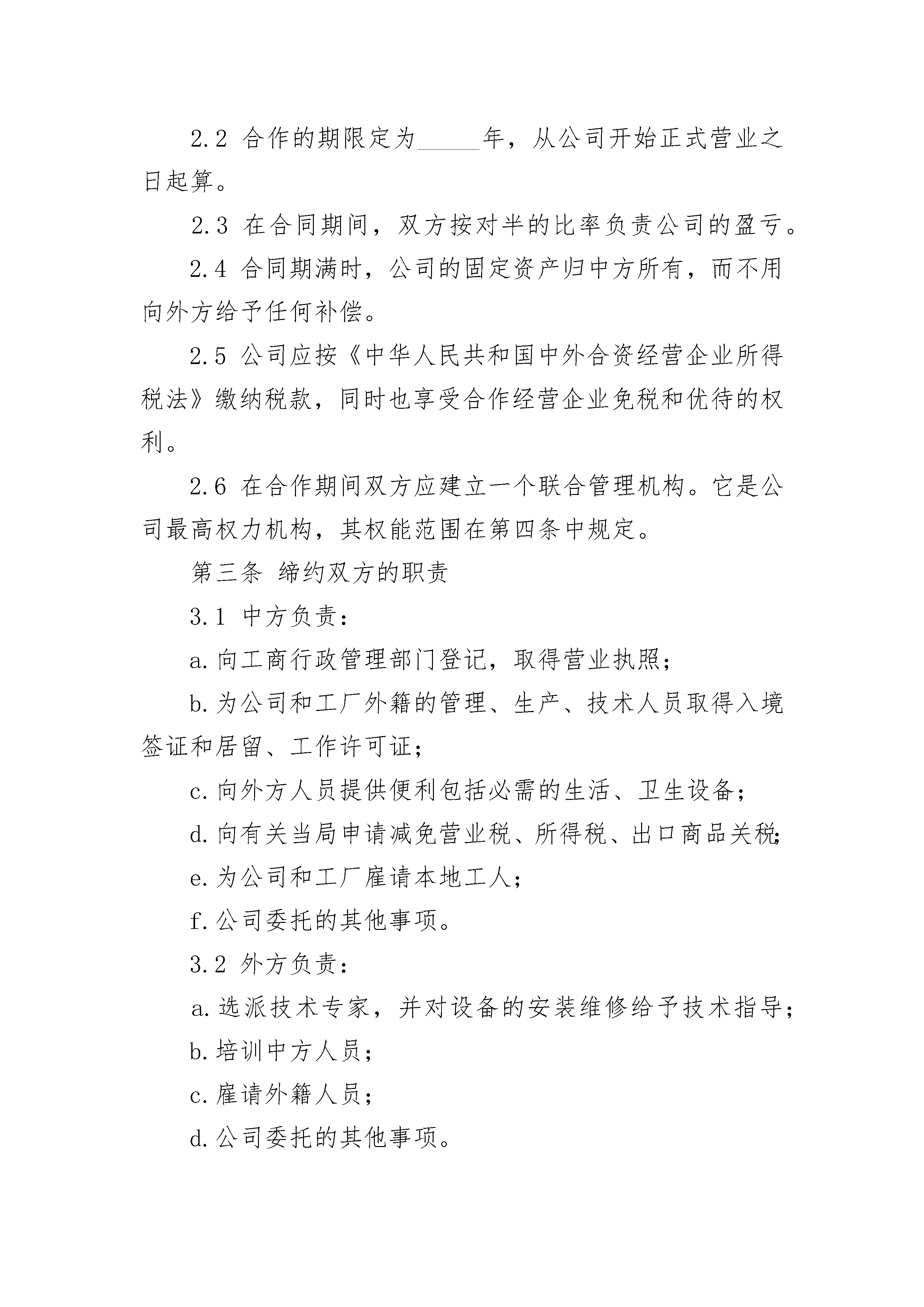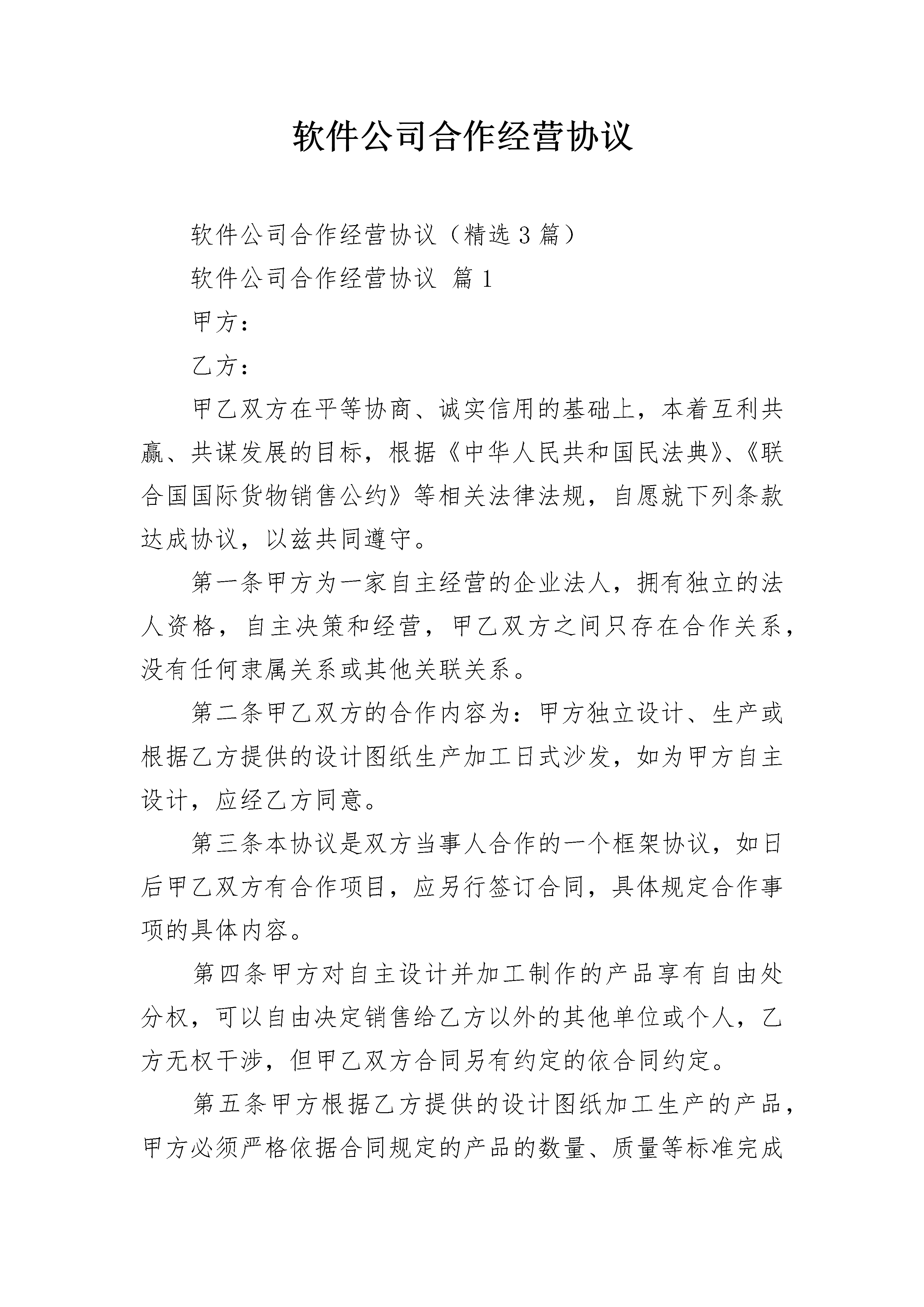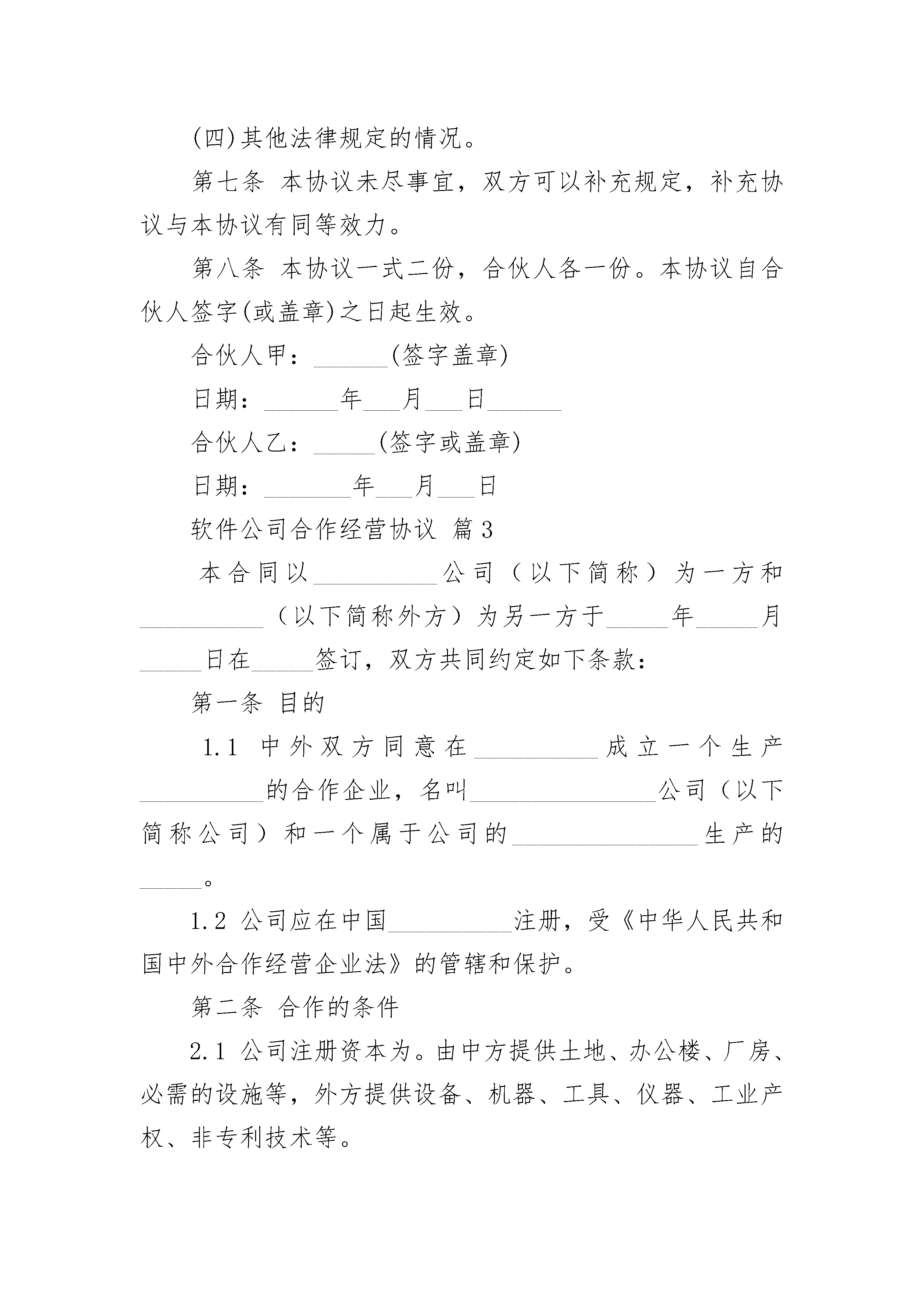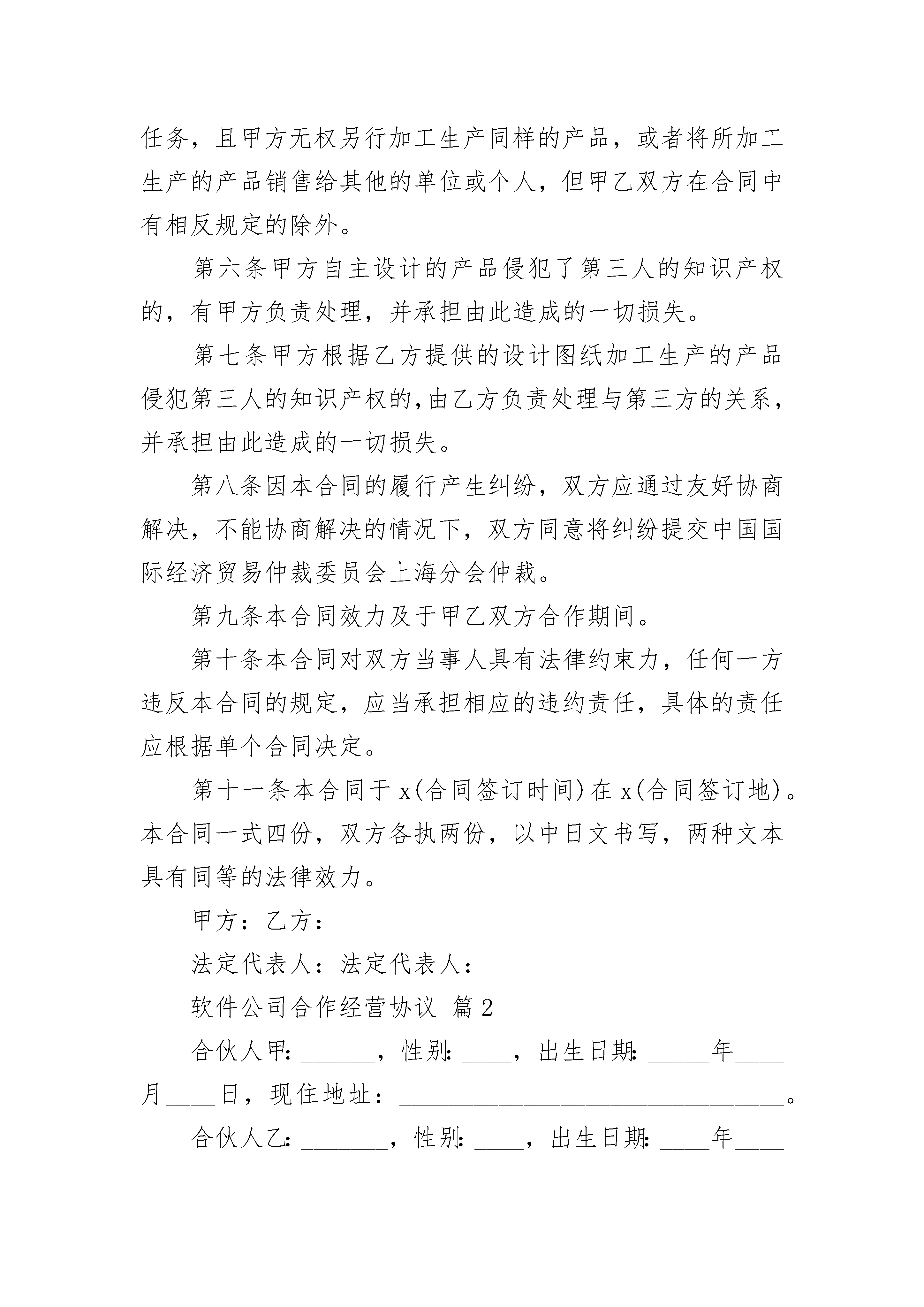 软件公司合作经营协议软件公司合作经营协议(精选3篇)软件公司合作经营协议篇1甲方:乙方:甲乙双方在平等协商、诚实信用的基础上,本着互利共赢、共谋发展的目标,根据《中华人民共和国民法典》、《联合国国际货物销售公约》等相关法律法规,自愿就下列条款达成协议,以兹共同遵守。第一条甲方为一家自主经营的企业法人,拥有独立的法人资格,自主决策和经营,甲乙双方之间只存在合作关系,没有任何隶属关系或其他关联关系。第二条甲乙双方的合作内容为:甲方独立设计、生产或根据乙方提供的设计图纸生产加工日式沙发,如为甲方自主设计,应经乙方同意。第三条本协议是双方当事人合作的一个框架协议,如日后甲乙双方有合作项目,应另行签订合同,具体规定合作事项的具体内容。第四条甲方对自主设计并加工制作的产品享有自由处分权,可以自由决定销售给乙方以外的其他单位或个人,乙方无权干涉,但甲乙双方合同另有约定的依合同约定。第五条甲方根据乙方提供的设计图纸加工生产的产品,甲方必须严格依据合同规定的产品的数量、质量等标准完成任务,且甲方无权另行加工生产同样的产品,或者将所加工生产的产品销售给其他的单位或个人,但甲乙双方在合同中有相反规定的除外。第六条甲方自主设计的产品侵犯了第三人的知识产权的,有甲方负责处理,并承担由此造成的一切损失。第七条甲方根据乙方提供的设计图纸加工生产的产品侵犯第三人的知识产权的,由乙方负责处理与第三方的关系,并承担由此造成的一切损失。第八条因本合同的履行产生纠纷,双方应通过友好协商解决,不能协商解决的情况下,双方同意将纠纷提交中国国际经济贸易仲裁委员会上海分会仲裁。第九条本合同效力及于甲乙双方合作期间。第十条本合同对双方当事人具有法律约束力,任何一方违反本合同的规定,应当承担相应的违约责任,具体的责任应根据单个合同决定。第十一条本合同于x(合同签订时间)在x(合同签订地)。本合同一式四份,双方各执两份,以中日文书写,两种文本具有同等的法律效力。甲方:乙方:法定代表人:法定代表人:软件公司合作经营协议篇2合伙人甲:______,性别:____,出生日期:_____年____月____日,现住地址:_______________________________。合伙人乙:_______,性别:____,出生日期:____年____月___日,现住地址:___________________________________。合伙人本着公平、平等、互利的原则订立合伙协议如下:第一条甲乙双方自愿合伙经营__________________,总投资为_____元(大写:_________),甲出资______元(大写:__________),乙出资___________元(大写:____________),其中甲占投资总额的____%、乙占投资总额的____%。第二条本合伙依法组成合伙企业,由甲负责办理工商登记。第三条本合伙企业经营期限为_______年。如果需要延长期限的,在期满前____个月前办理有关手续。第四条合伙双方共同经营、共同劳动,共担风险,共负盈亏。1、企业盈余按照各自的`投资比例分配。2、企业债务按照各自投资比例负担。任何一方对外偿还债务后,另一方应当按比例在____日内向对方清偿自己负担的部分。第五条他人可以入伙,但须经甲乙双方同意,并办理增加出资额的手续和订立补充协议。补充协议与本协议具有同等效力。第六条出现下列事项,合伙终止:(一)合伙期满;(二)合伙双方协商同意;(三)合伙经营的事业已经完成或者无法完成;(四)其他法律规定的情况。第七条本协议未尽事宜,双方可以补充规定,补充协议与本协议有同等效力。第八条本协议一式二份,合伙人各一份。本协议自合伙人签字(或盖章)之日起生效。合伙人甲:______(签字盖章)日期:______年___月___日______合伙人乙:_____(签字或盖章)日期:_______年___月___日软件公司合作经营协议篇3本合同以__________公司(以下简称)为一方和__________(以下简称外方)为另一方于_____年_____月_____日在_____签订,双方共同约定如下条款:第一条目的1.1中外双方同意在__________成立一个生产__________的合作企业,名叫_______________公司(以下简称公司)和一个属于公司的_______________生产的_____。1.2公司应在中国__________注册,受《中华人民共和国中外合作经营企业法》的管辖和保护。第二条合作的条件2.1公司注册资本为。由中方提供土地、办公楼、厂房、必需的设施等,外方提供设备、机器、工具、仪器、工业产权、非专利技术等。2.2合作的期限定为_____年,从公司开始正式营业之日起算。2.3在合同期间,双方按对半的比