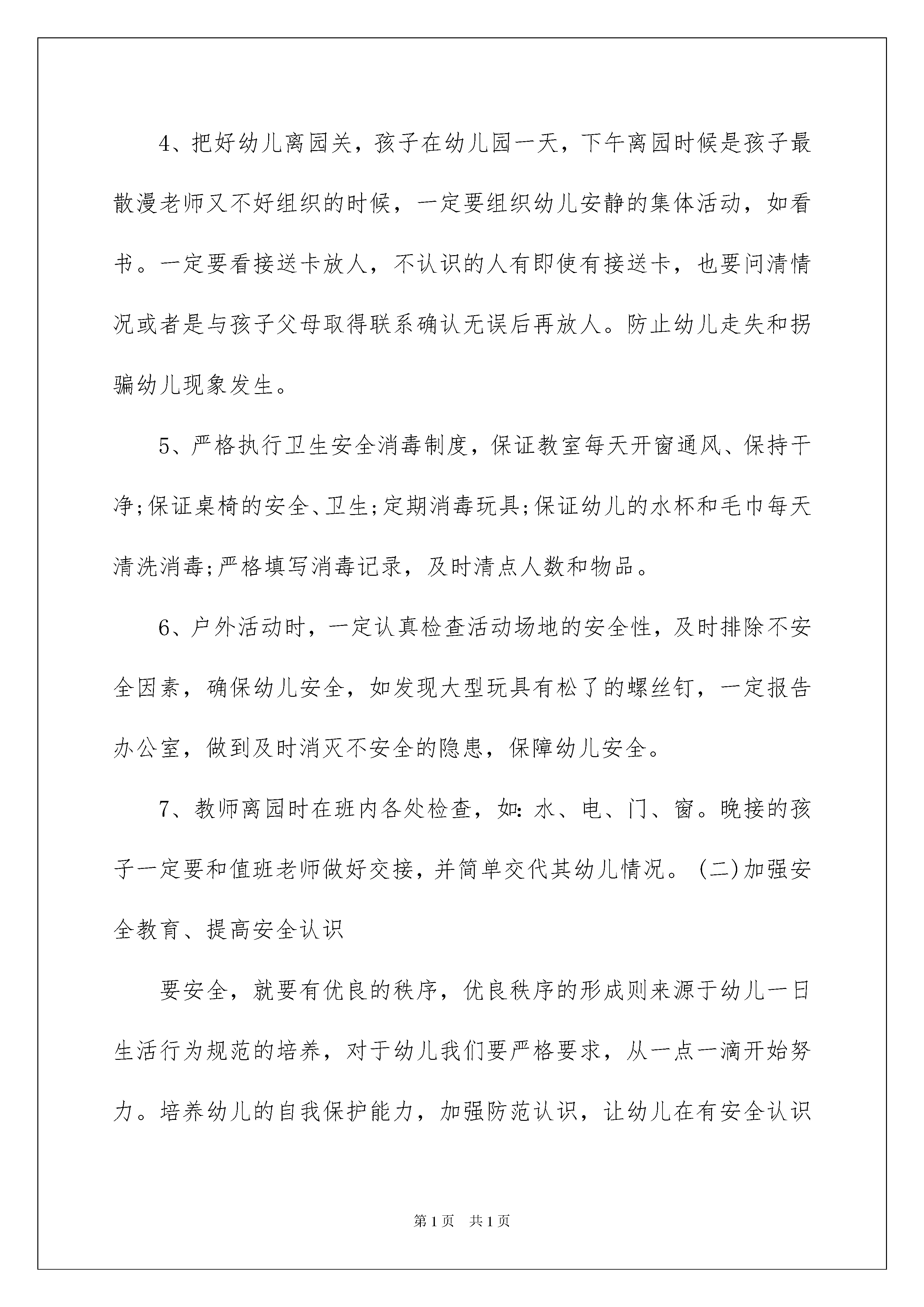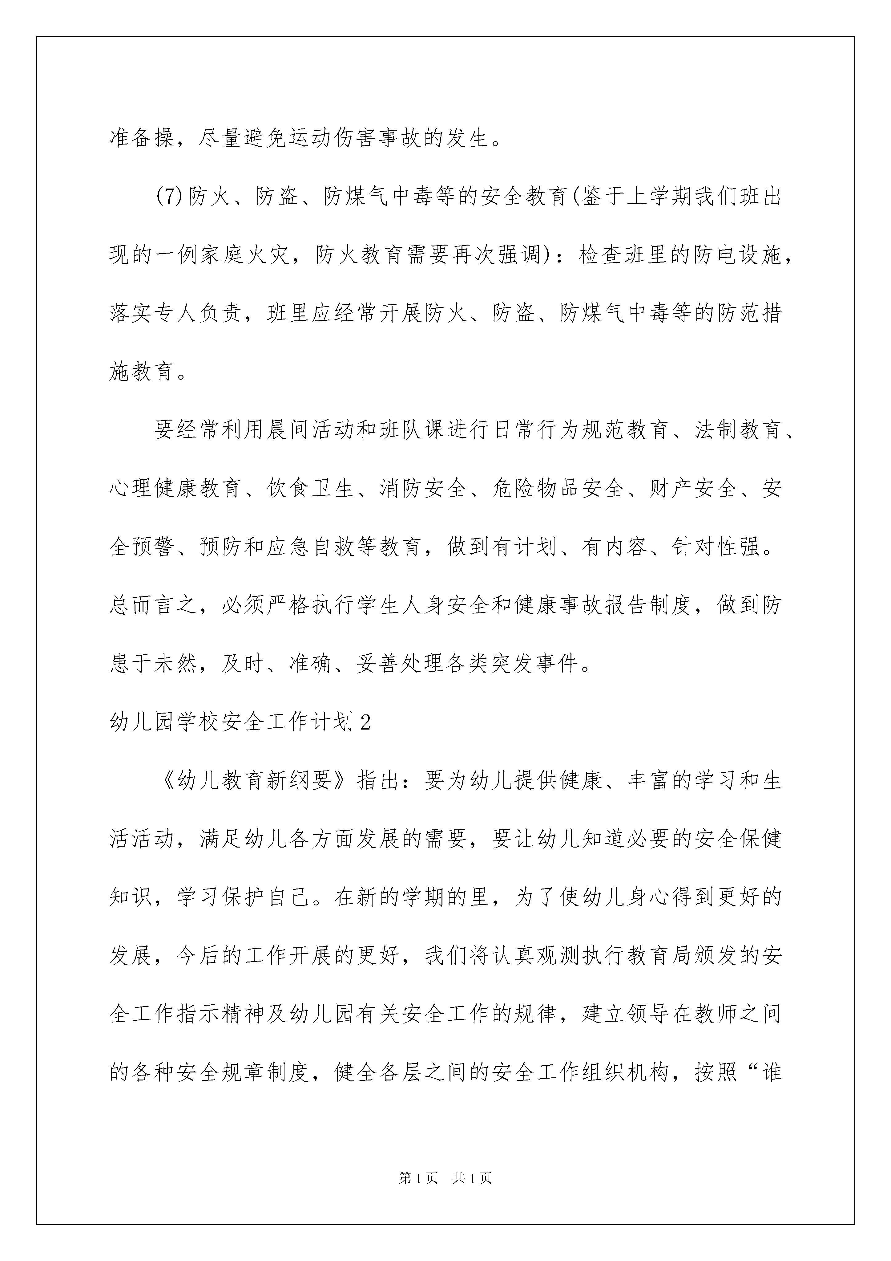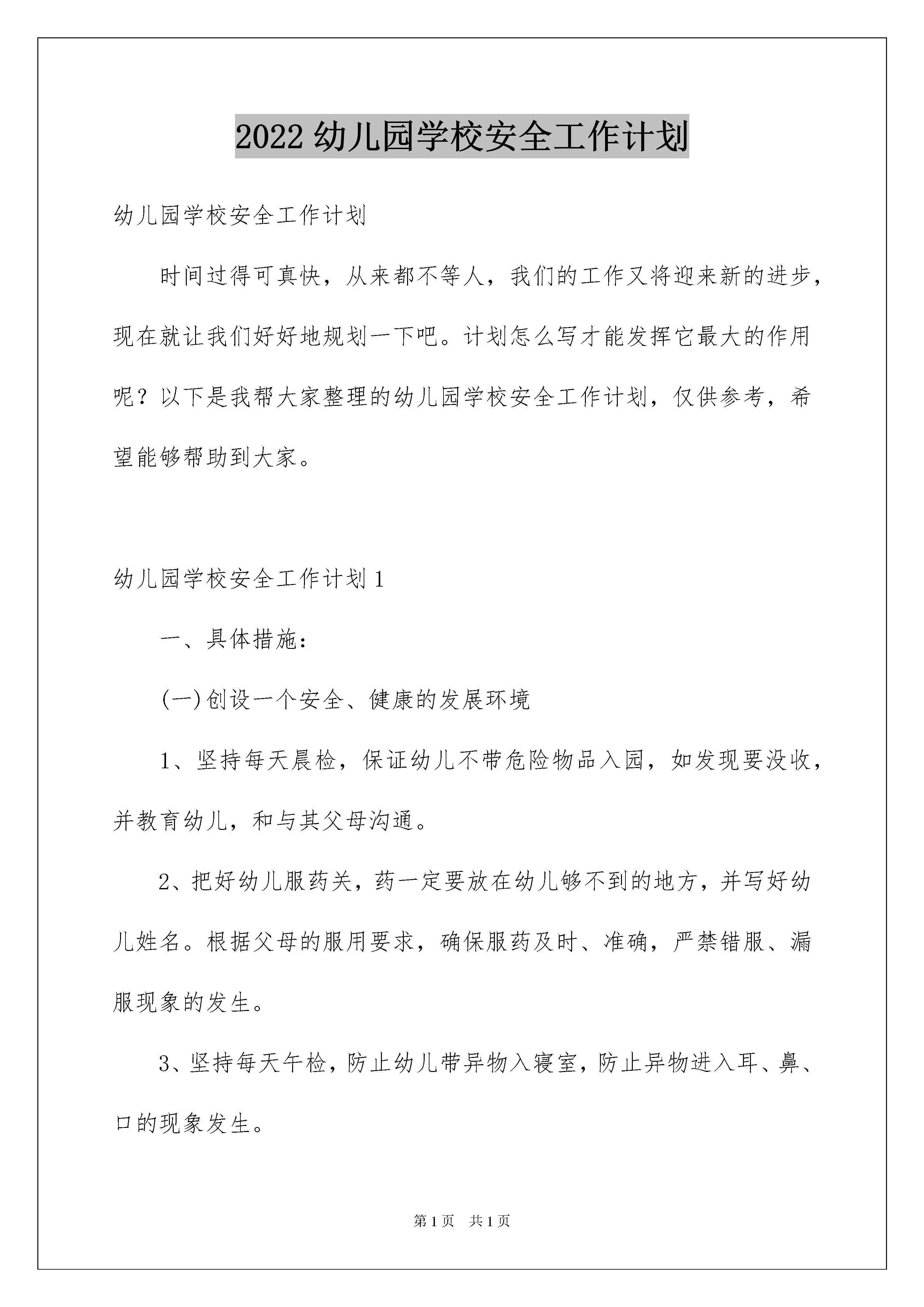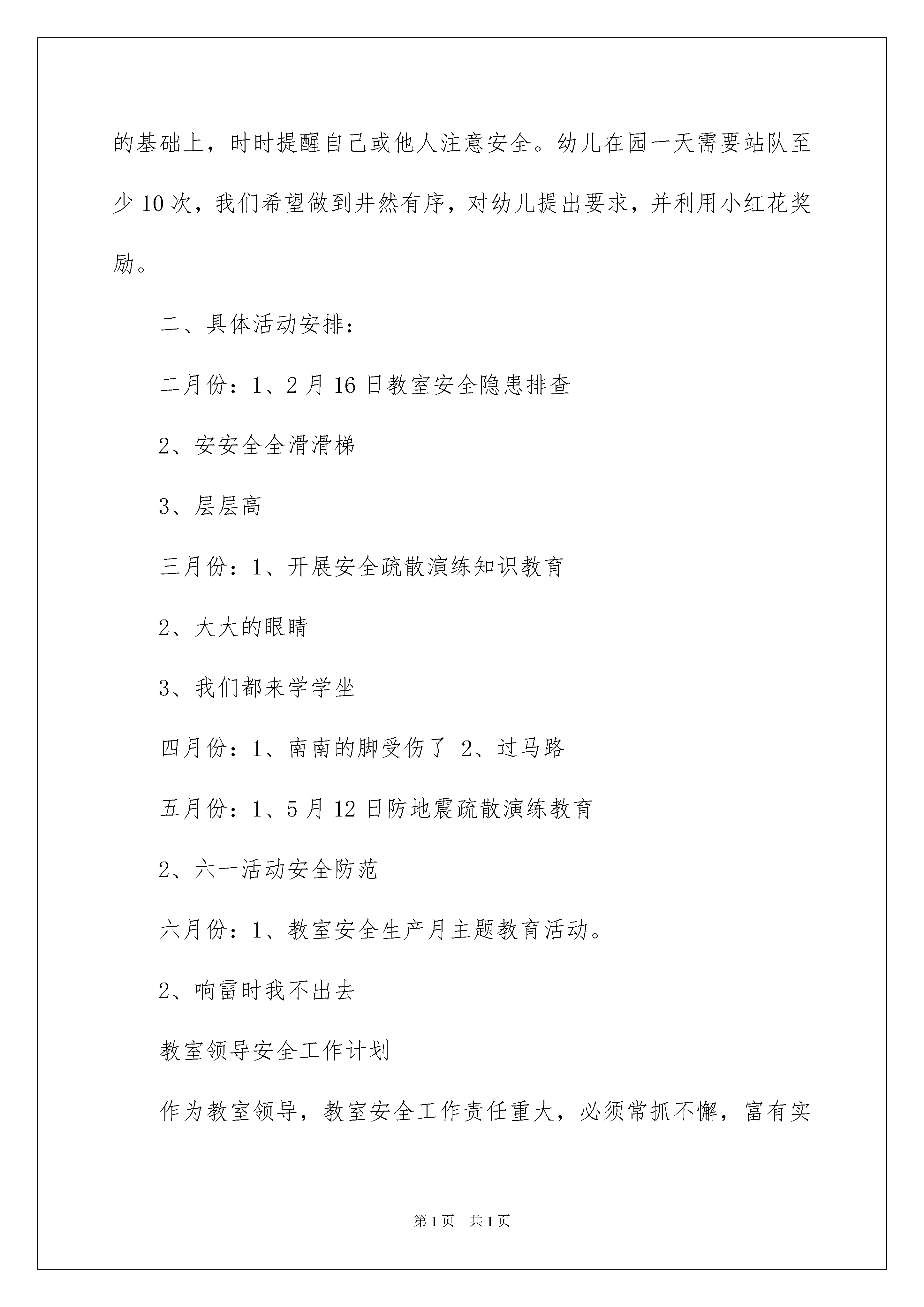 2022幼儿园学校安全工作计划幼儿园学校安全工作计划时间过得可真快,从来都不等人,我们的工作又将迎来新的进步,现在就让我们好好地规划一下吧。计划怎么写才能发挥它最大的作用呢?以下是我帮大家整理的幼儿园学校安全工作计划,仅供参考,希望能够帮助到大家。幼儿园学校安全工作计划1一、具体措施:(一)创设一个安全、健康的发展环境1、坚持每天晨检,保证幼儿不带危险物品入园,如发现要没收,并教育幼儿,和与其父母沟通。2、把好幼儿服药关,药一定要放在幼儿够不到的地方,并写好幼儿姓名。根据父母的服用要求,确保服药及时、准确,严禁错服、漏服现象的发生。3、坚持每天午检,防止幼儿带异物入寝室,防止异物进入耳、鼻、口的现象发生。4、把好幼儿离园关,孩子在幼儿园一天,下午离园时候是孩子最散漫老师又不好组织的时候,一定要组织幼儿安静的集体活动,如看书。一定要看接送卡放人,不认识的人有即使有接送卡,也要问清情况或者是与孩子父母取得联系确认无误后再放人。防止幼儿走失和拐骗幼儿现象发生。5、严格执行卫生安全消毒制度,保证教室每天开窗通风、保持干净;保证桌椅的安全、卫生;定期消毒玩具;保证幼儿的水杯和毛巾每天清洗消毒;严格填写消毒记录,及时清点人数和物品。6、户外活动时,一定认真检查活动场地的安全性,及时排除不安全因素,确保幼儿安全,如发现大型玩具有松了的螺丝钉,一定报告办公室,做到及时消灭不安全的隐患,保障幼儿安全。7、教师离园时在班内各处检查,如:水、电、门、窗。晚接的孩子一定要和值班老师做好交接,并简单交代其幼儿情况。(二)加强安全教育、提高安全认识要安全,就要有优良的秩序,优良秩序的形成则来源于幼儿一日生活行为规范的培养,对于幼儿我们要严格要求,从一点一滴开始努力。培养幼儿的自我保护能力,加强防范认识,让幼儿在有安全认识的基础上,时时提醒自己或他人注意安全。幼儿在园一天需要站队至少10次,我们希望做到井然有序,对幼儿提出要求,并利用小红花奖励。二、具体活动安排:二月份:1、2月16日教室安全隐患排查2、安安全全滑滑梯3、层层高三月份:1、开展安全疏散演练知识教育2、大大的眼睛3、我们都来学学坐四月份:1、南南的脚受伤了2、过马路五月份:1、5月12日防地震疏散演练教育2、六一活动安全防范六月份:1、教室安全生产月主题教育活动。2、响雷时我不出去教室领导安全工作计划作为教室领导,教室安全工作责任重大,必须常抓不懈,富有实效。今年,我班将进一步认真学习贯彻加强学校安全工作的有关文件,以学生安全工作为中心,避免各类事故的发生。这个学期我结合本班实际以及最近发生的一些情况,制定安全工作计划如下:(1)交通安全教育:交通安全教育是安全教育重中之重的教育,要把交通安全教育摆在十分突出的位置、必须做上、下学路安全的管理。(2)防课间意外的教育,在学校时,玩耍、做游戏应到操场上,教室里追跑、疯打。不做有害身体健康的游戏。做广播操,学生排队时,不要拥挤,要有序进场、进班。(3)防溺水教育,要进行防溺水的教育,开展以溺水后自救,溺水者的救护为主要内容的教育。(4)防触电的教育,对同学们进行电的基本知识讲座,预防触电事故的发生以及对触电后急救常用知识的了解和应用。(5)防食物中毒的教育,多宣传饮食卫生和防止食物中毒的教育,以杜绝同学们食物中毒的事件发生。(6)防病、防体育运动伤害的教育:重视同学们身体健康教育,建立个人健康档案,体育活动应重视安全保护措施,主动做好运动前的准备操,尽量避免运动伤害事故的发生。(7)防火、防盗、防煤气中毒等的安全教育(鉴于上学期我们班出现的一例家庭火灾,防火教育需要再次强调):检查班里的防电设施,落实专人负责,班里应经常开展防火、防盗、防煤气中毒等的防范措施教育。要经常利用晨间活动和班队课进行日常行为规范教育、法制教育、心理健康教育、饮食卫生、消防安全、危险物品安全、财产安全、安全预警、预防和应急自救等教育,做到有计划、有内容、针对性强。总而言之,必须严格执行学生人身安全和健康事故报告制度,做到防患于未然,及时、准确、妥善处理各类突发事件。幼儿园学校安全工作计划2《幼儿教育新纲要》指出:要为幼儿提供健康、丰富的学习和生活活动,满足幼儿各方面发展的需要,要让幼儿知道必要的安全保健知识,学习保护自己。在新的学期的里,为了使幼儿身心得到更好的发展,今后的工作开展的更好,我们将认真观测执行教育局颁发的安全工作指示精神及幼儿园有关安全工作的规律,建立领导在教师之间的各种安全规章制度,健全各层之间的安全工作组织机构,按照“谁主管,谁负责”的原则,层层落实签订安全目标工作,责任书,做到各项到位,责任到位。