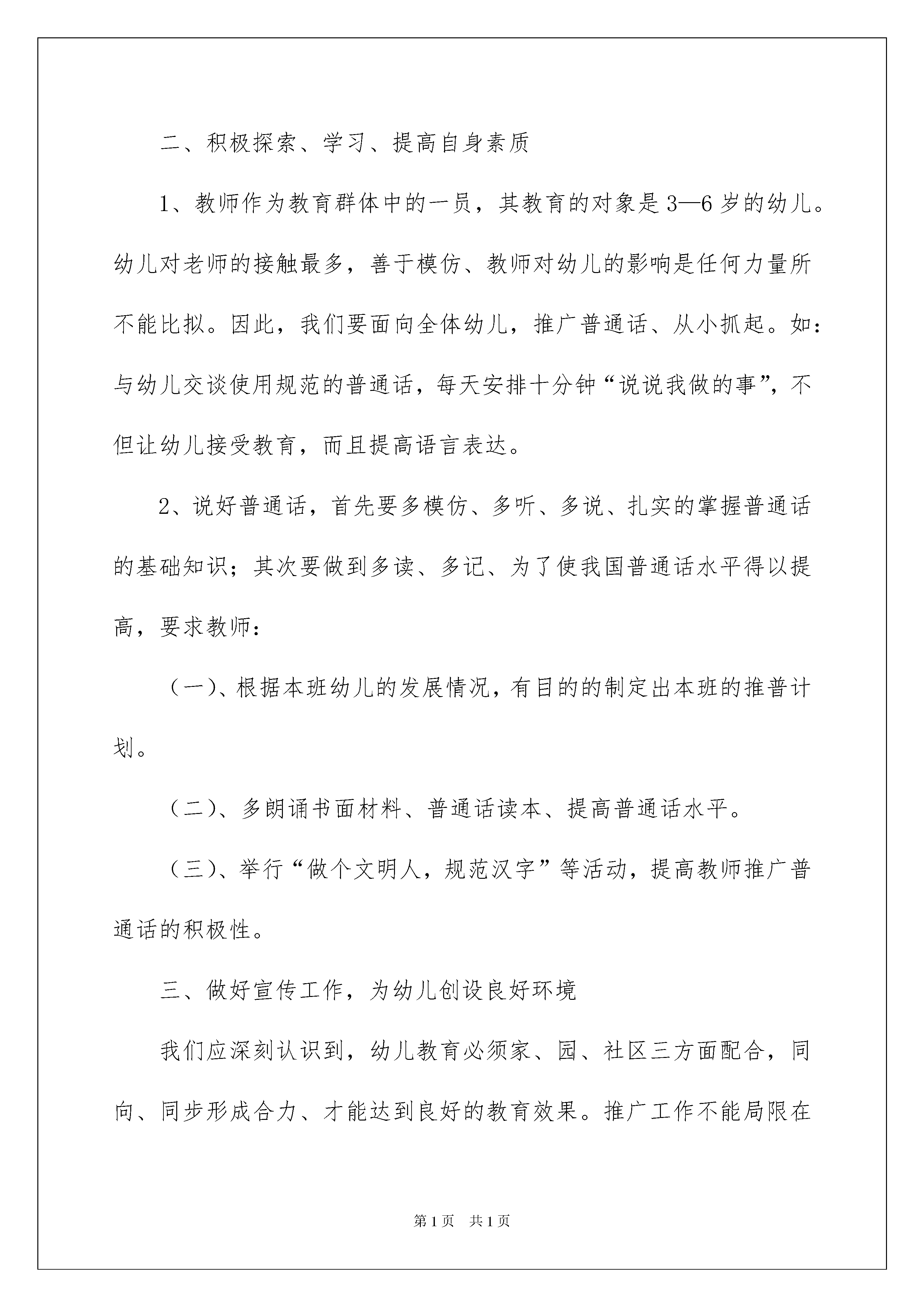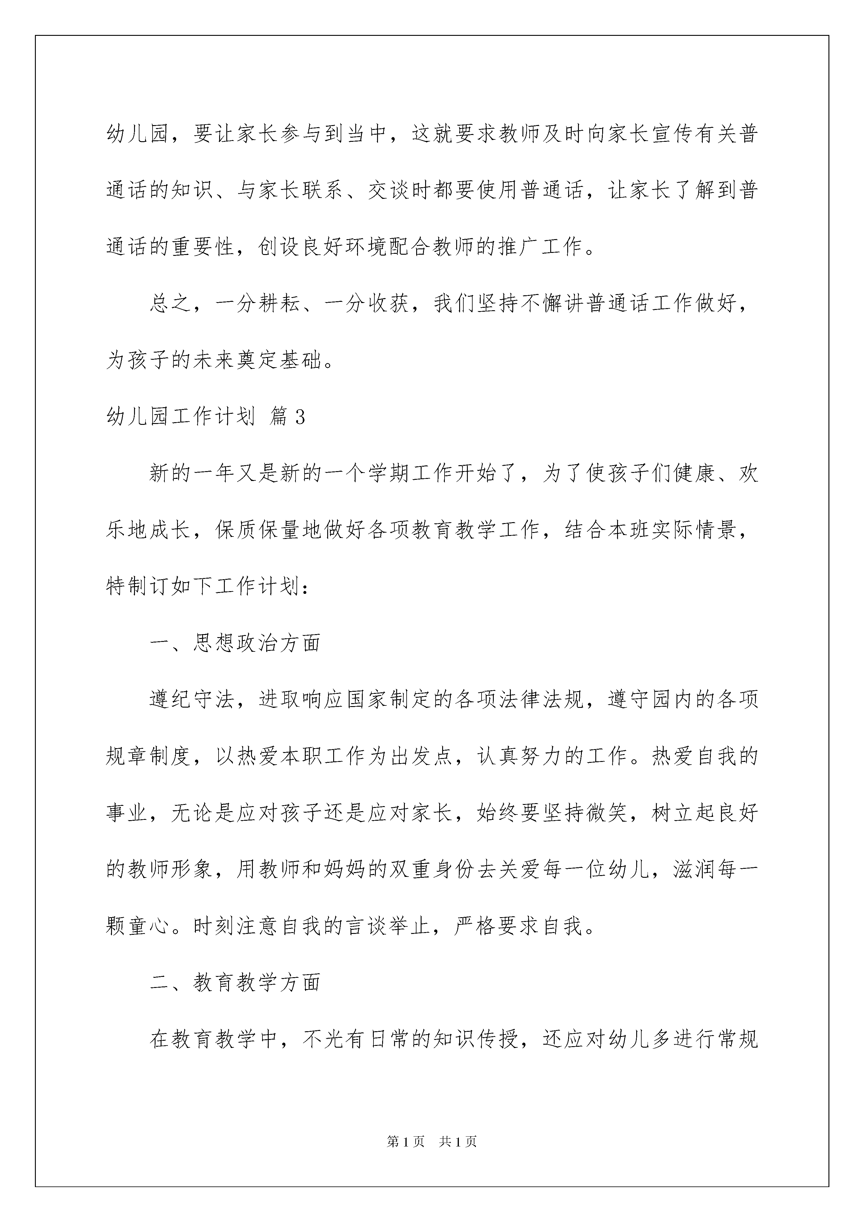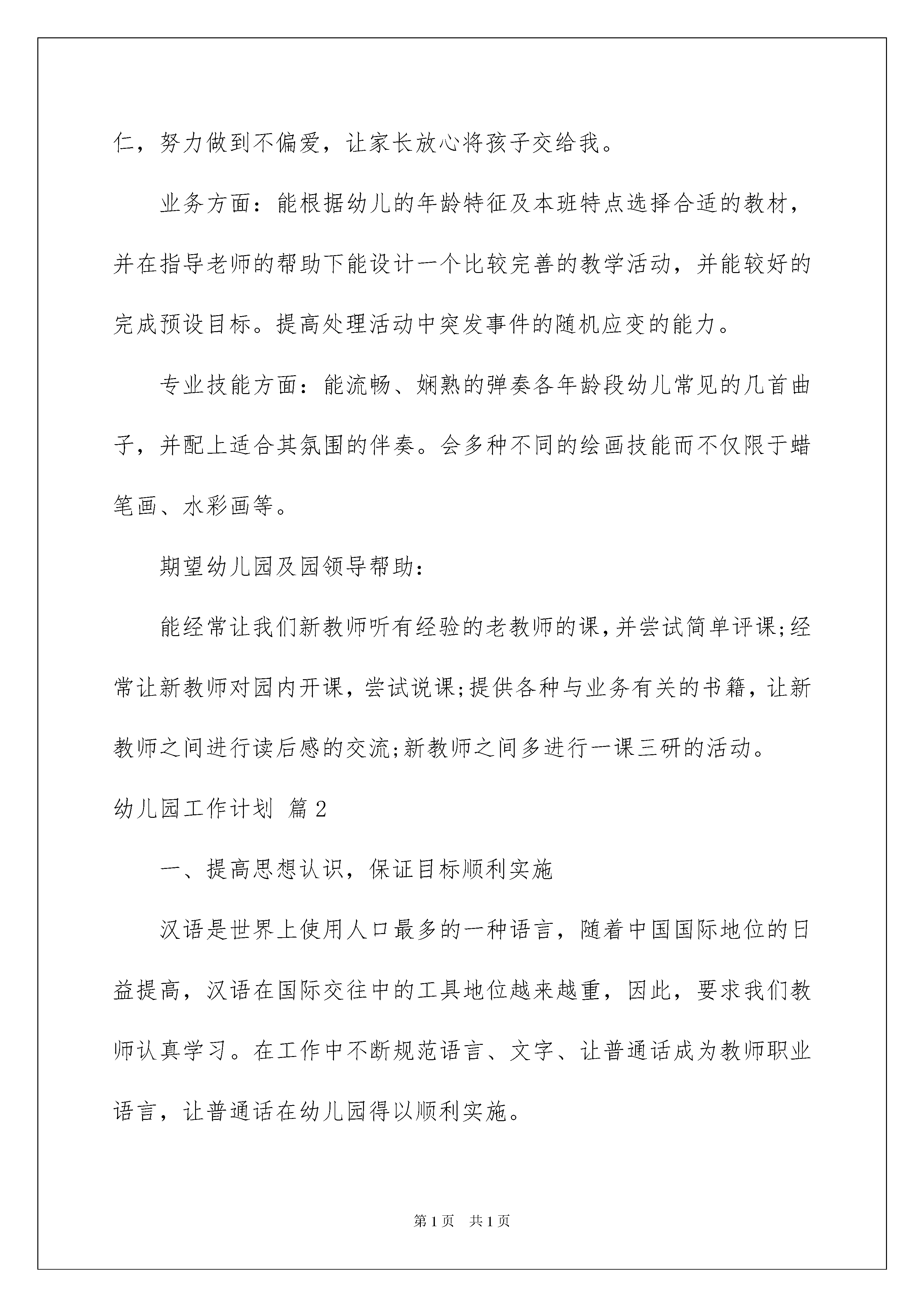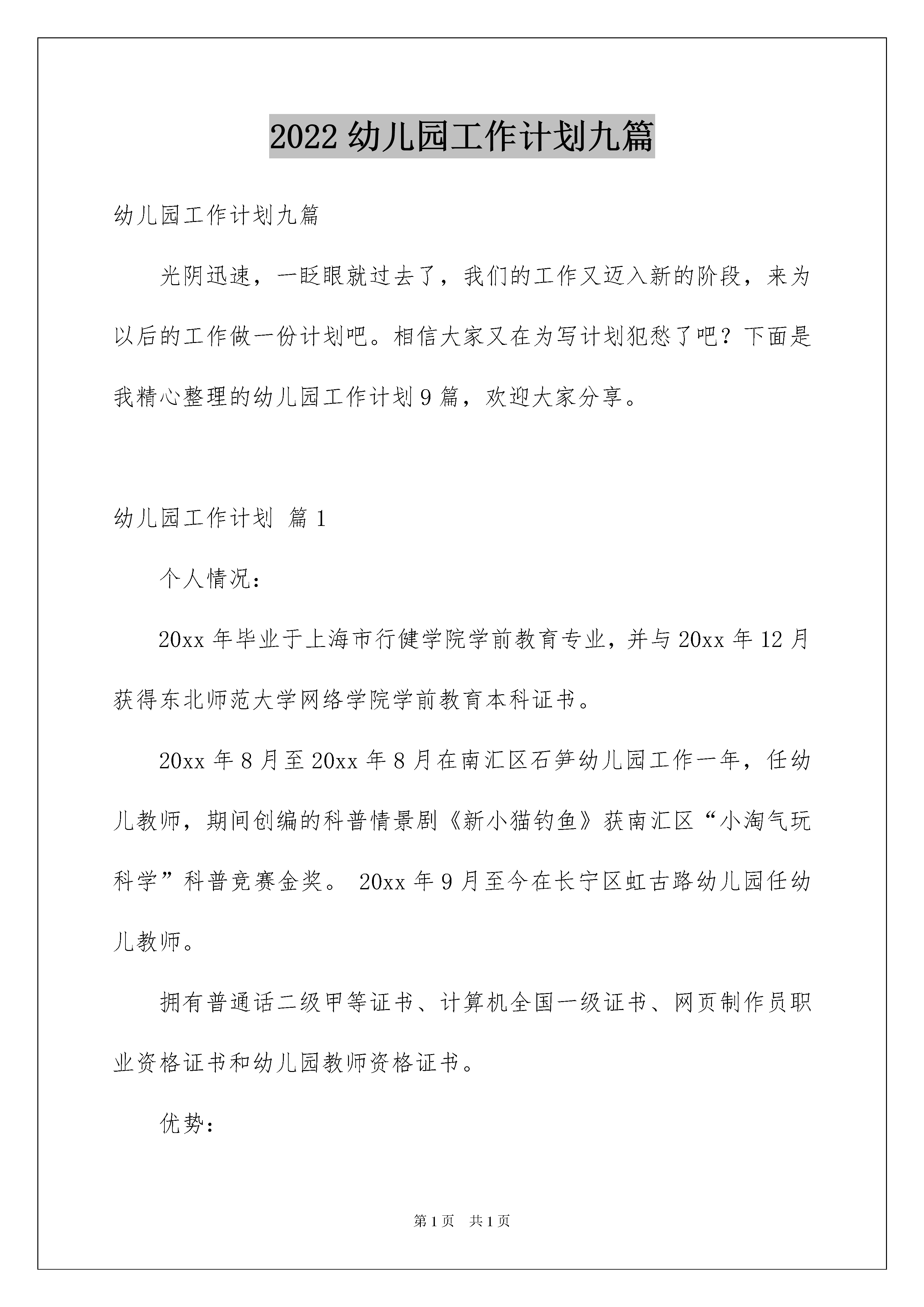 2022幼儿园工作计划九篇幼儿园工作计划九篇光阴迅速,一眨眼就过去了,我们的工作又迈入新的阶段,来为以后的工作做一份计划吧。相信大家又在为写计划犯愁了吧?下面是我精心整理的幼儿园工作计划9篇,欢迎大家分享。幼儿园工作计划篇1个人情况:20xx年毕业于上海市行健学院学前教育专业,并与20xx年12月获得东北师范大学网络学院学前教育本科证书。20xx年8月至20xx年8月在南汇区石笋幼儿园工作一年,任幼儿教师,期间创编的科普情景剧《新小猫钓鱼》获南汇区“小淘气玩科学”科普竞赛金奖。20xx年9月至今在长宁区虹古路幼儿园任幼儿教师。拥有普通话二级甲等证书、计算机全国一级证书、网页制作员职业资格证书和幼儿园教师资格证书。优势:1)经过了系统的学前教育专业的学习,并且有2年多的工作经验。在实习和实际工作中与各年龄段的幼儿都有一定的接触,对他们的能力发展的要求有一定的了解。2)计算机方面使用较为熟练,能娴熟的操作各种常用软件,能运用多媒体技术开展丰富的教学活动。3)有好学精神,敢于接受新事物的挑战,乐于接受教学新理念的冲击。不足:1)工作年限较短,缺少对各年龄段幼儿的管理和教学经验。2)我虽然在学校中系统的学习过乐器、舞蹈、手工、绘画、讲故事等技能技巧,但是每样都不精专,无法较好的融合应用在日常教学中,让幼儿感受多样化的艺术美。3)观察事物仅仅停留在表面,对于幼儿表现出的种种活动迹象不能主动发现、反思、研究后制定出有效地策略。期望一年中的进步:师德方面:热爱幼教事业,热爱幼儿,以积极地心态投入到工作中,时刻以幼儿教师的师德规范要求自己。做到对每个孩子都一视同仁,努力做到不偏爱,让家长放心将孩子交给我。业务方面:能根据幼儿的年龄特征及本班特点选择合适的教材,并在指导老师的帮助下能设计一个比较完善的教学活动,并能较好的完成预设目标。提高处理活动中突发事件的随机应变的能力。专业技能方面:能流畅、娴熟的弹奏各年龄段幼儿常见的几首曲子,并配上适合其氛围的伴奏。会多种不同的绘画技能而不仅限于蜡笔画、水彩画等。期望幼儿园及园领导帮助:能经常让我们新教师听有经验的老教师的课,并尝试简单评课;经常让新教师对园内开课,尝试说课;提供各种与业务有关的书籍,让新教师之间进行读后感的交流;新教师之间多进行一课三研的活动。幼儿园工作计划篇2一、提高思想认识,保证目标顺利实施汉语是世界上使用人口最多的一种语言,随着中国国际地位的日益提高,汉语在国际交往中的工具地位越来越重,因此,要求我们教师认真学习。在工作中不断规范语言、文字、让普通话成为教师职业语言,让普通话在幼儿园得以顺利实施。二、积极探索、学习、提高自身素质1、教师作为教育群体中的一员,其教育的对象是3—6岁的幼儿。幼儿对老师的接触最多,善于模仿、教师对幼儿的影响是任何力量所不能比拟。因此,我们要面向全体幼儿,推广普通话、从小抓起。如:与幼儿交谈使用规范的普通话,每天安排十分钟“说说我做的事”,不但让幼儿接受教育,而且提高语言表达。2、说好普通话,首先要多模仿、多听、多说、扎实的掌握普通话的基础知识;其次要做到多读、多记、为了使我国普通话水平得以提高,要求教师:(一)、根据本班幼儿的发展情况,有目的的制定出本班的推普计划。(二)、多朗诵书面材料、普通话读本、提高普通话水平。(三)、举行“做个文明人,规范汉字”等活动,提高教师推广普通话的积极性。三、做好宣传工作,为幼儿创设良好环境我们应深刻认识到,幼儿教育必须家、园、社区三方面配合,同向、同步形成合力、才能达到良好的教育效果。推广工作不能局限在幼儿园,要让家长参与到当中,这就要求教师及时向家长宣传有关普通话的知识、与家长联系、交谈时都要使用普通话,让家长了解到普通话的重要性,创设良好环境配合教师的推广工作。总之,一分耕耘、一分收获,我们坚持不懈讲普通话工作做好,为孩子的未来奠定基础。幼儿园工作计划篇3新的一年又是新的一个学期工作开始了,为了使孩子们健康、欢乐地成长,保质保量地做好各项教育教学工作,结合本班实际情景,特制订如下工作计划:一、思想政治方面遵纪守法,进取响应国家制定的各项法律法规,遵守园内的各项规章制度,以热爱本职工作为出发点,认真努力的工作。热爱自我的事业,无论是应对孩子还是应对家长,始终要坚持微笑,树立起良好的教师形象,用教师和妈妈的双重身份去关爱每一位幼儿,滋润每一颗童心。时刻注意自我的言谈举止,严格要求自我。二、教育教学方面在教育教学中,不光有日常的知识传授,还应对幼儿多进行常规教育,所以我将用爱心和耐心,对待每个幼儿,培养幼儿良好的常规。不断总结积累自身经验的同时,吸取别人的经验与长处,