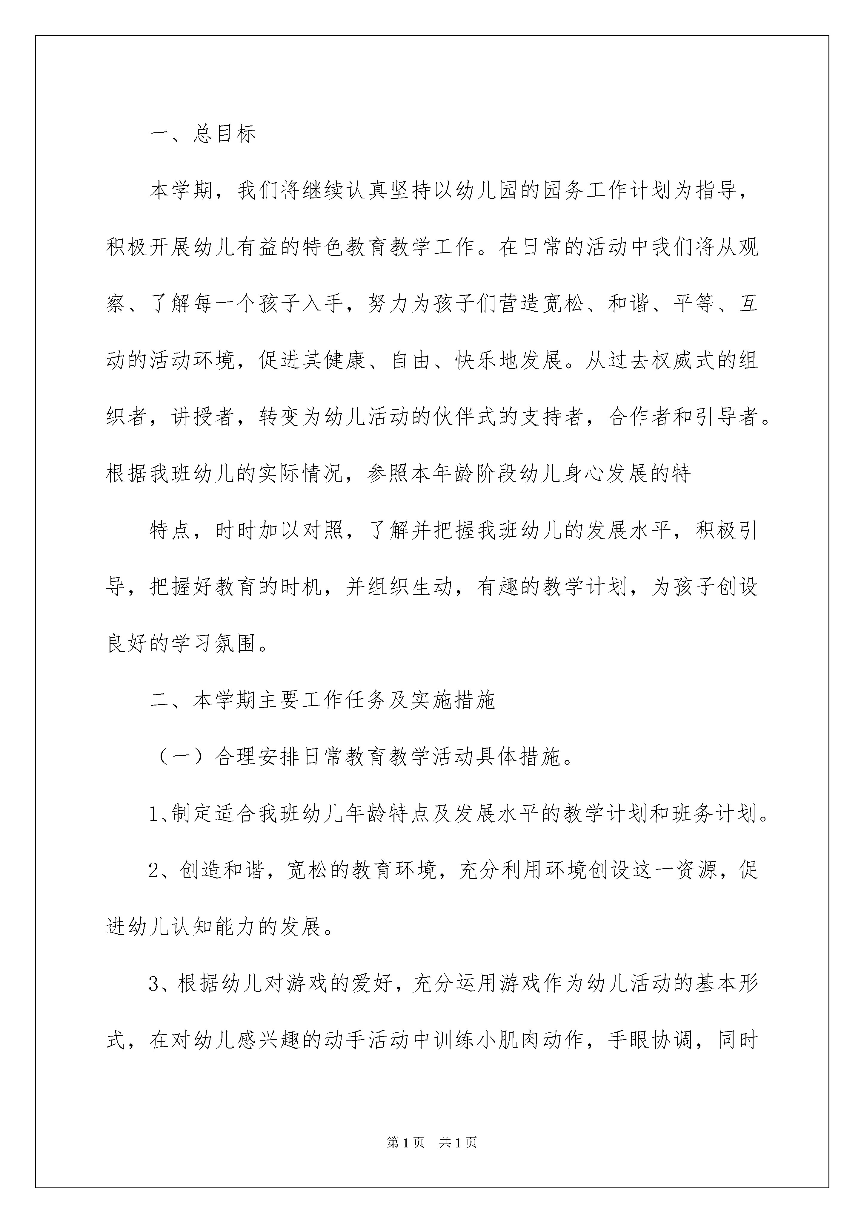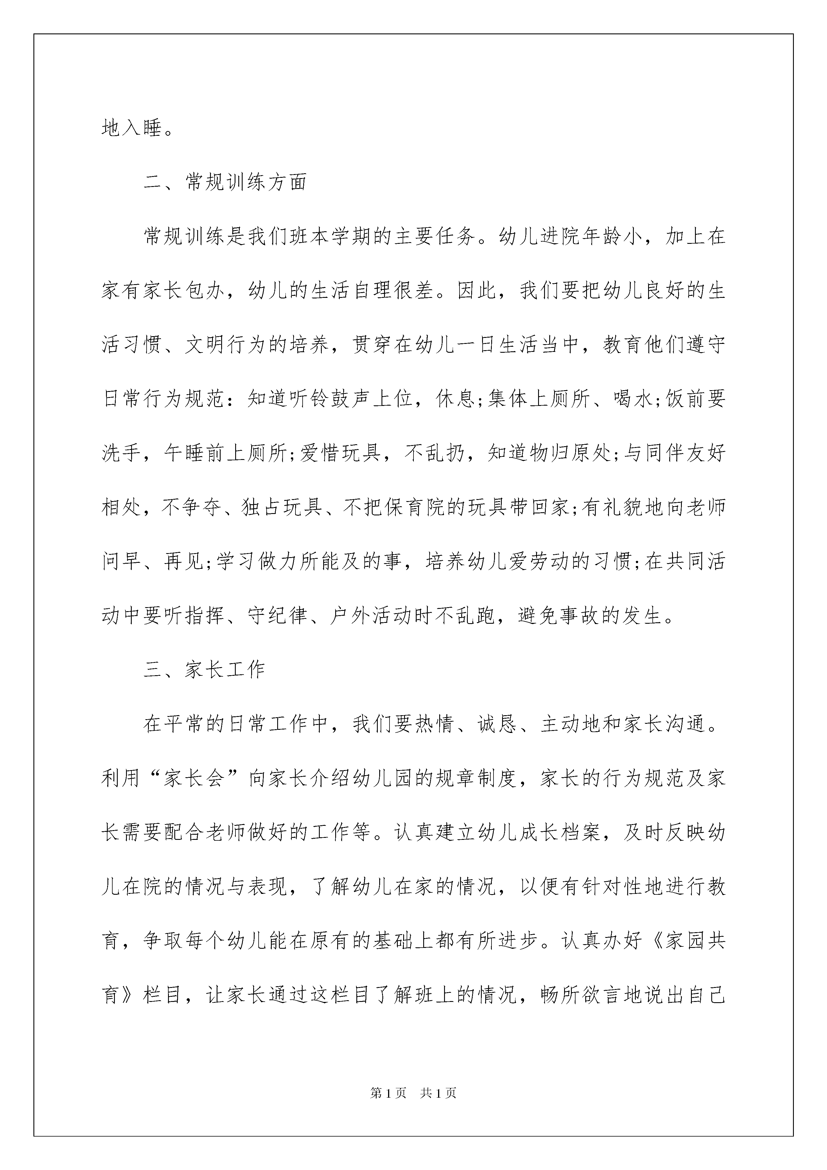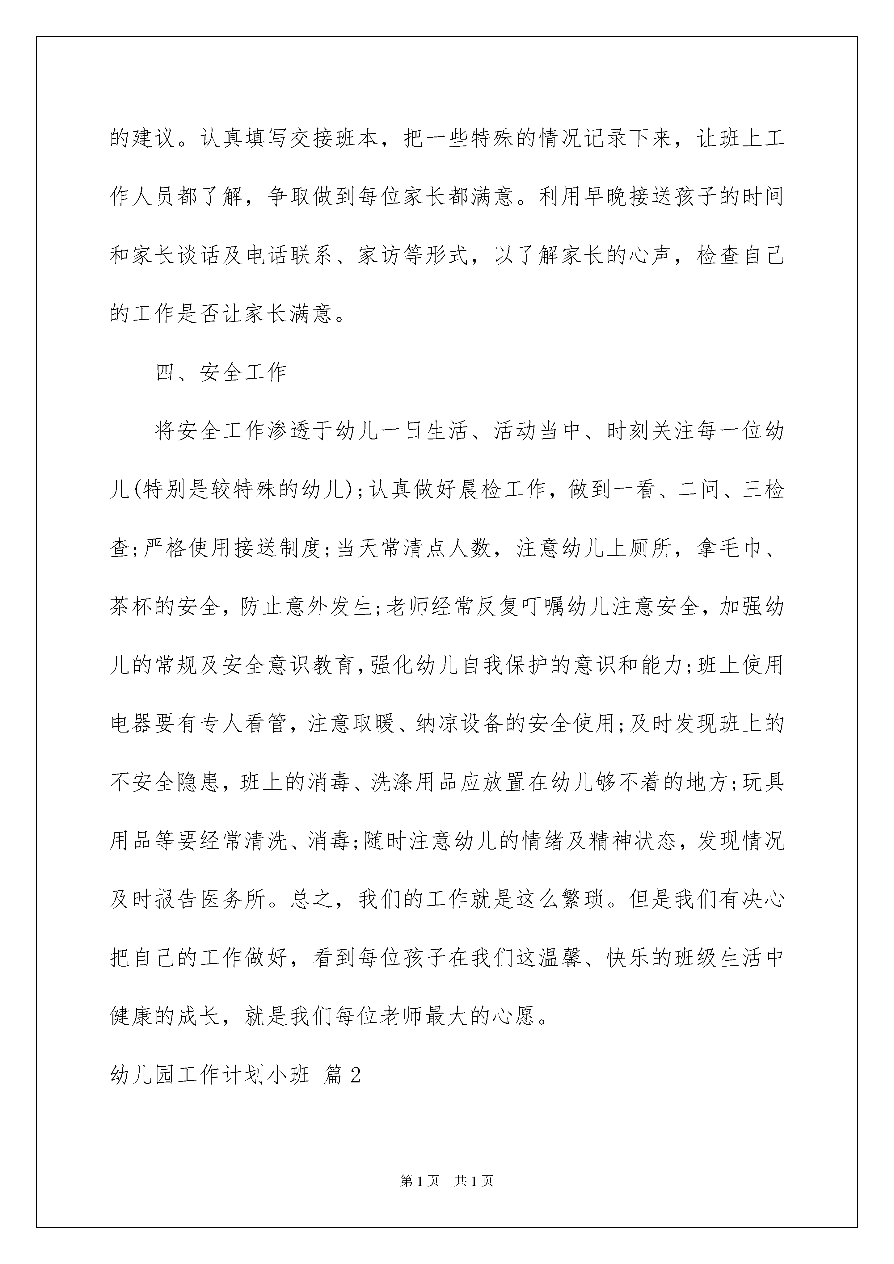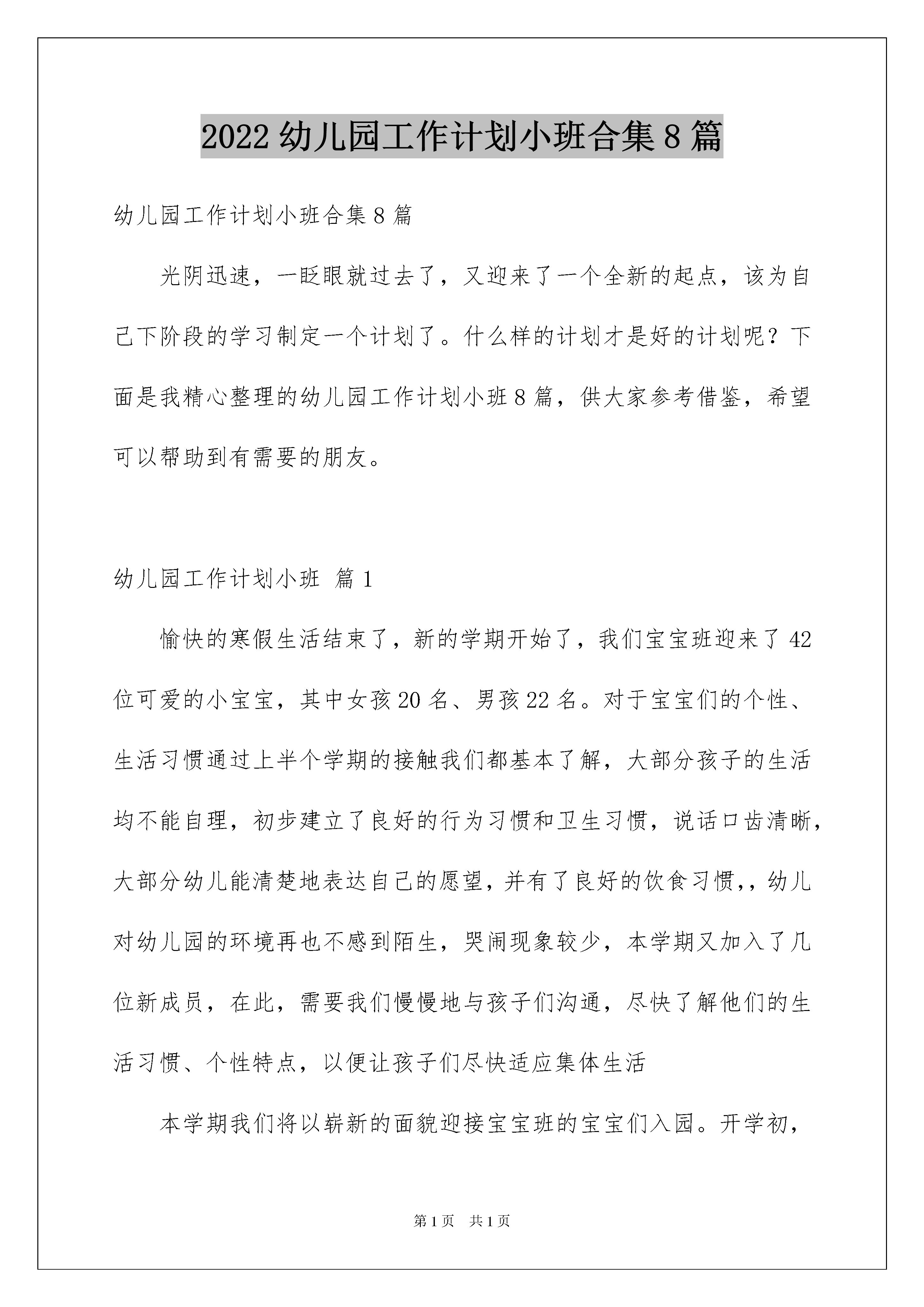2022幼儿园工作计划小班合集8篇幼儿园工作计划小班合集8篇光阴迅速,一眨眼就过去了,又迎来了一个全新的起点,该为自己下阶段的学习制定一个计划了。什么样的计划才是好的计划呢?下面是我精心整理的幼儿园工作计划小班8篇,供大家参考借鉴,希望可以帮助到有需要的朋友。幼儿园工作计划小班篇1愉快的寒假生活结束了,新的学期开始了,我们宝宝班迎来了42位可爱的小宝宝,其中女孩20名、男孩22名。对于宝宝们的个性、生活习惯通过上半个学期的接触我们都基本了解,大部分孩子的生活均不能自理,初步建立了良好的行为习惯和卫生习惯,说话口齿清晰,大部分幼儿能清楚地表达自己的愿望,并有了良好的饮食习惯,,幼儿对幼儿园的环境再也不感到陌生,哭闹现象较少,本学期又加入了几位新成员,在此,需要我们慢慢地与孩子们沟通,尽快了解他们的生活习惯、个性特点,以便让孩子们尽快适应集体生活本学期我们将以崭新的面貌迎接宝宝班的宝宝们入园。开学初,我们的班级工作重点坚持以新纲要为指南,以解读为指导,树立服务意识,抓好常规训练的培养,重视教育教学环境的创设,注重幼儿良好生活、卫生习惯的培养。因此,本学期我班将从常规训练;生活、卫生习惯;家长工作和安全工作几个方面去开展工作.一、生活管理方面孩子们由于年龄小,大部分幼儿生活不能自理,这样无形中我们的工作压力就特别大。因此,我们在培养幼儿生活习惯方面,就要加强日常生活习惯的培养,做到不辞辛苦,反复训练幼儿定时拉尿,拉屎:如自己穿脱衣裤,有尿、有屎、会及时告诉老师,并在老师的帮助下,学习正确地拉尿、拉屎的方法。如果有个别幼儿拉在身上,老师必须做到立即给幼儿换上干净的衣裤,并及时把脏的衣裤洗干净。小朋友在吃饭的时候,情绪也特别不稳定。有的幼儿以为吃了饭,爸爸、妈妈就会来接。因此,一想到自己的爸爸,妈妈、难免又会伤心地哭了起来,这时候小朋友吃起饭来就很困难。老师在午饭期间必须做到保证每个小朋友都要进食一定的饭量,让他们在安静声中愉快的进餐。并逐渐培养幼儿自己独立进餐,用鼓励的语言去鼓励。睡觉的时候,必须做到安抚每一位哭闹的幼儿,使他们都能安静地入睡。二、常规训练方面常规训练是我们班本学期的主要任务。幼儿进院年龄小,加上在家有家长包办,幼儿的生活自理很差。因此,我们要把幼儿良好的生活习惯、文明行为的培养,贯穿在幼儿一日生活当中,教育他们遵守日常行为规范:知道听铃鼓声上位,休息;集体上厕所、喝水;饭前要洗手,午睡前上厕所;爱惜玩具,不乱扔,知道物归原处;与同伴友好相处,不争夺、独占玩具、不把保育院的玩具带回家;有礼貌地向老师问早、再见;学习做力所能及的事,培养幼儿爱劳动的习惯;在共同活动中要听指挥、守纪律、户外活动时不乱跑,避免事故的发生。三、家长工作在平常的日常工作中,我们要热情、诚恳、主动地和家长沟通。利用“家长会”向家长介绍幼儿园的规章制度,家长的行为规范及家长需要配合老师做好的工作等。认真建立幼儿成长档案,及时反映幼儿在院的情况与表现,了解幼儿在家的情况,以便有针对性地进行教育,争取每个幼儿能在原有的基础上都有所进步。认真办好《家园共育》栏目,让家长通过这栏目了解班上的情况,畅所欲言地说出自己的建议。认真填写交接班本,把一些特殊的情况记录下来,让班上工作人员都了解,争取做到每位家长都满意。利用早晚接送孩子的时间和家长谈话及电话联系、家访等形式,以了解家长的心声,检查自己的工作是否让家长满意。四、安全工作将安全工作渗透于幼儿一日生活、活动当中、时刻关注每一位幼儿(特别是较特殊的幼儿);认真做好晨检工作,做到一看、二问、三检查;严格使用接送制度;当天常清点人数,注意幼儿上厕所,拿毛巾、茶杯的安全,防止意外发生;老师经常反复叮嘱幼儿注意安全,加强幼儿的常规及安全意识教育,强化幼儿自我保护的意识和能力;班上使用电器要有专人看管,注意取暖、纳凉设备的安全使用;及时发现班上的不安全隐患,班上的消毒、洗涤用品应放置在幼儿够不着的地方;玩具用品等要经常清洗、消毒;随时注意幼儿的情绪及精神状态,发现情况及时报告医务所。总之,我们的工作就是这么繁琐。但是我们有决心把自己的工作做好,看到每位孩子在我们这温馨、快乐的班级生活中健康的成长,就是我们每位老师最大的心愿。幼儿园工作计划小班篇2一、总目标本学期,我们将继续认真坚持以幼儿园的园务工作计划为指导,积极开展幼儿有益的特色教育教学工作。在日常的活动中我们将从观察、了解每一个孩子入手,努力为孩子们营造宽松、和谐、平等、互动的活动环境,促进其健康、自由、快乐地发展。从过去权威式的组织者,讲授者,转变为幼儿活动的伙伴式的支持者,合作者和引导者。根据我班幼儿的实