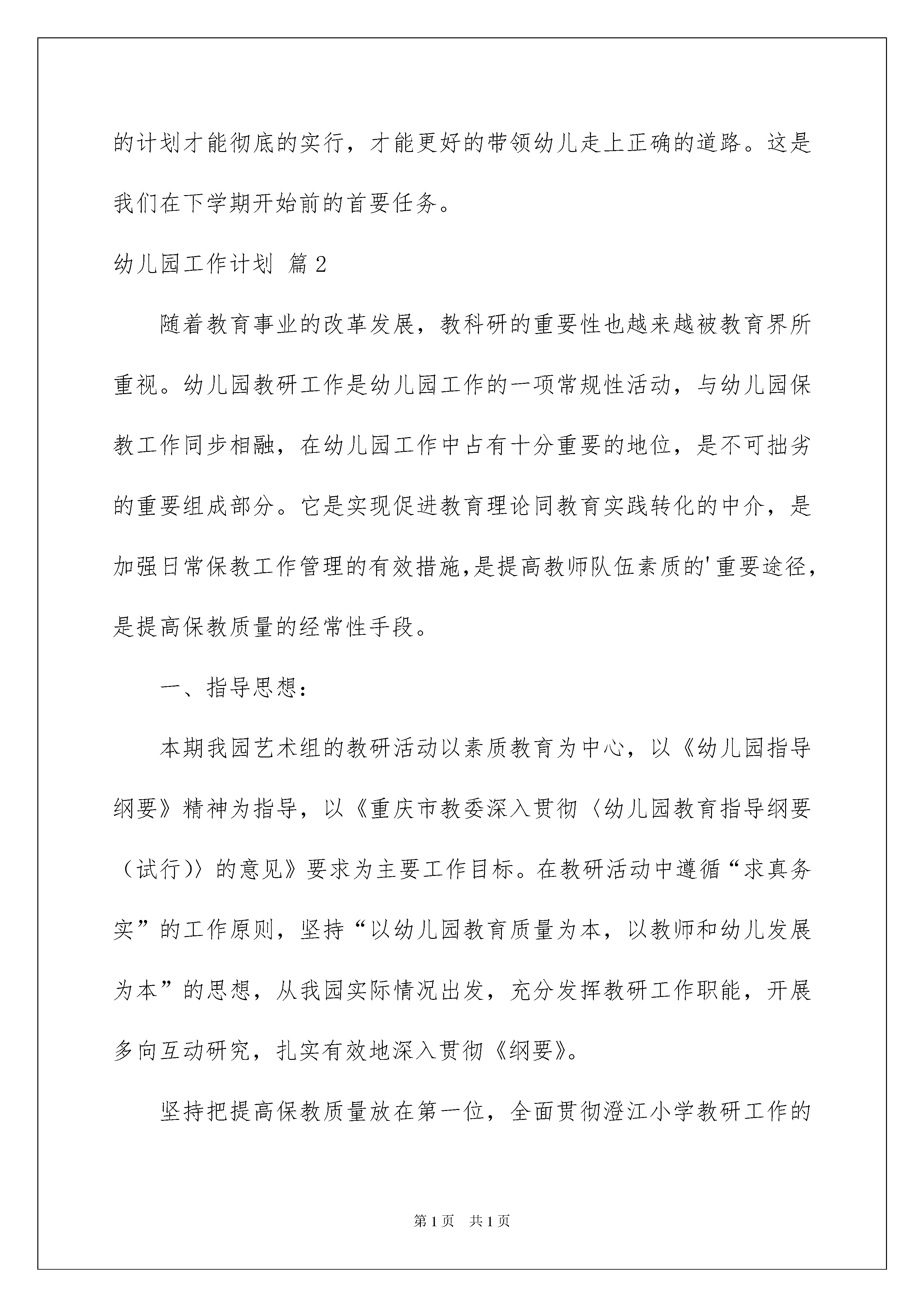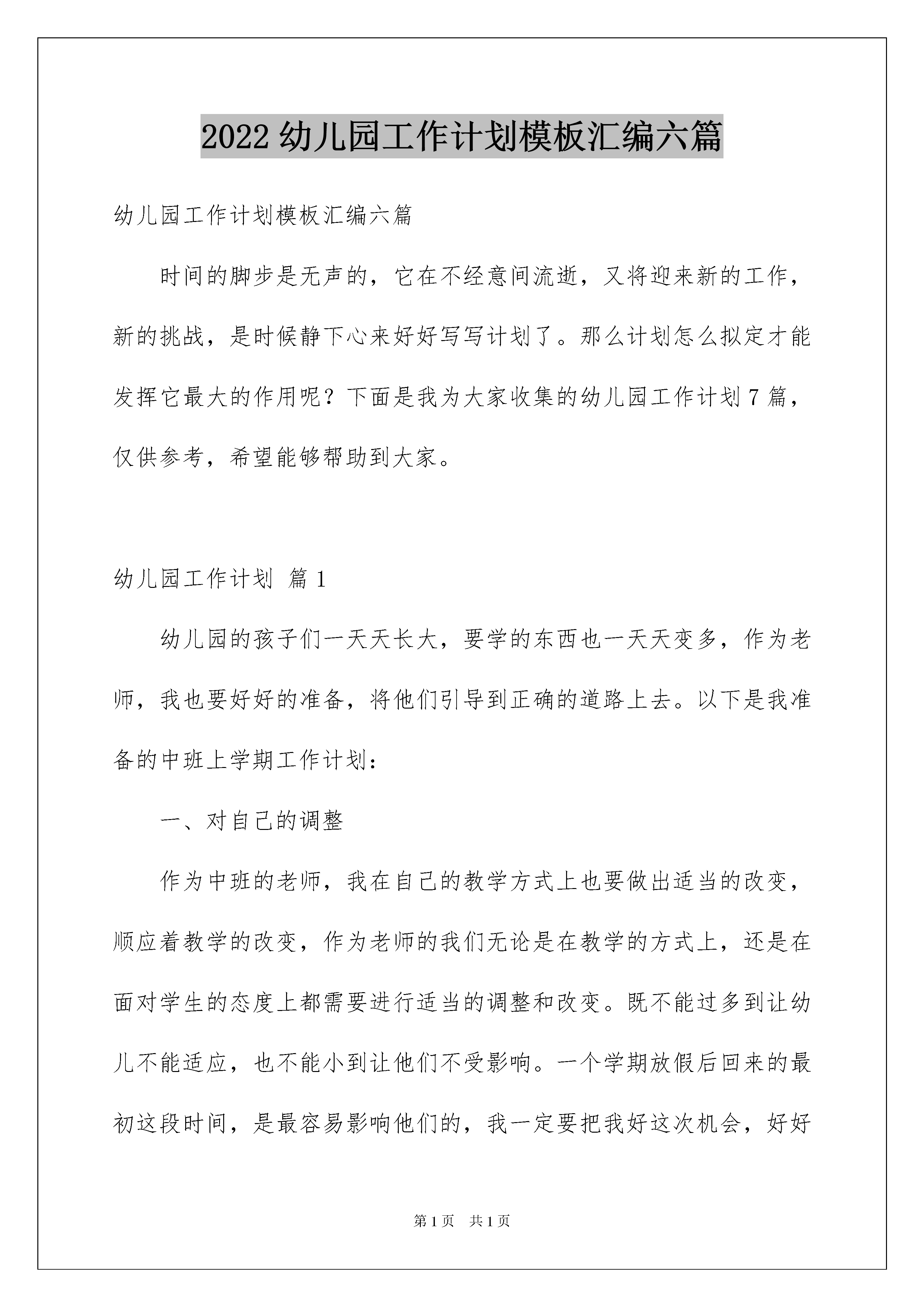 2022幼儿园工作计划模板汇编六篇幼儿园工作计划模板汇编六篇时间的脚步是无声的,它在不经意间流逝,又将迎来新的工作,新的挑战,是时候静下心来好好写写计划了。那么计划怎么拟定才能发挥它最大的作用呢?下面是我为大家收集的幼儿园工作计划7篇,仅供参考,希望能够帮助到大家。幼儿园工作计划篇1幼儿园的孩子们一天天长大,要学的东西也一天天变多,作为老师,我也要好好的准备,将他们引导到正确的道路上去。以下是我准备的中班上学期工作计划:一、对自己的调整作为中班的老师,我在自己的教学方式上也要做出适当的改变,顺应着教学的改变,作为老师的我们无论是在教学的方式上,还是在面对学生的态度上都需要进行适当的调整和改变。既不能过多到让幼儿不能适应,也不能小到让他们不受影响。一个学期放假后回来的最初这段时间,是最容易影响他们的,我一定要把我好这次机会,好好的带动幼儿们的改变。二、引导的方向在中班的教学中吗,我们主要是让幼儿培养自己的责任心以及在对团队的贡献的意识。现在在游戏中组成的小队,几乎每个幼儿都有极强的争夺意识,想去当最好的、想去当最高的……这个学期我们的主题也就是“礼貌和谦让”,同时,我们也打算在教学中让幼儿们学会在团队中发现自己的作用,尊重他人的选择,也就是学会团结协作。三、对与单独几个学生的引导但是这项教学也依然有不少的难点,最主要的可能就是我们班上那个最不爱说话的xxx小朋友。要让他进入团队一起游戏似乎不容易。但是作为老师,这种孩子看似不愿一起游戏,其实是最需要关注的,做为老师,我要夺取注意这些同学的想法,多给鼓励,多给夸奖,对不对的事情也不能一昧说教,要夺取引导。希望能在这段团结协作的教学中能让xxx变的更加的开朗。四、班级整体的方向班级的方向,我们自然是希望向着好的方向发展,但是何为好的方向呢?我想这需要我们几位老师好好的对班级的规划做出一个详细的计划才能彻底的实行,才能更好的带领幼儿走上正确的道路。这是我们在下学期开始前的首要任务。幼儿园工作计划篇2随着教育事业的改革发展,教科研的重要性也越来越被教育界所重视。幼儿园教研工作是幼儿园工作的一项常规性活动,与幼儿园保教工作同步相融,在幼儿园工作中占有十分重要的地位,是不可拙劣的重要组成部分。它是实现促进教育理论同教育实践转化的中介,是加强日常保教工作管理的有效措施,是提高教师队伍素质的'重要途径,是提高保教质量的经常性手段。一、指导思想:本期我园艺术组的教研活动以素质教育为中心,以《幼儿园指导纲要》精神为指导,以《重庆市教委深入贯彻〈幼儿园教育指导纲要(试行)〉的意见》要求为主要工作目标。在教研活动中遵循“求真务实”的工作原则,坚持“以幼儿园教育质量为本,以教师和幼儿发展为本”的思想,从我园实际情况出发,充分发挥教研工作职能,开展多向互动研究,扎实有效地深入贯彻《纲要》。坚持把提高保教质量放在第一位,全面贯彻澄江小学教研工作的思路,通过各种活动的开展,积极地促进幼教事业向前发展。二、主要工作思路:本学期艺术组的教研工作要从以下几个方面来开展:1、强化自身建设,努力提高教研整体水平。本着精干高效,结合实际的原则,制定完整的教研计划,确定每一次教研活动的内容和具体的安排,让各位教师有时间和精力来参加,切实提高教师们的教研水平。与园领导共同商量,努力安排好各位参研的教职工的工作,让参加活动的教职工全心投入到教研活动中,解决他们的后顾之忧。2、抓好学习,努力提高教师的专业素质。幼儿园教育“质量就是生命”,教研组根据相应的学习制度,形成一种学习氛围。教研组作为教师学习的阵地,提高保教水平的重要手段之一,在艺术组的教研活动中,主持人都引导参研教师学习幼儿教育的理论知识,以此提高教师们的专业知识水平,让教师们从各个层面上了解了幼儿教育的特点,加强教师们的理论基础。3、发挥教研职能,关注我园在实施《纲要》中的具体、真实、关键问题进行研究。我园在实施《纲要》的过程中,曾出现过许多的问题,这些问题在教师们的共同努力下,有所改善。随着时代不断的进步,新的问题会不断的出现在我们的教育教学工作中,那么,我园的教师们要切实提高解决各种各样教育教学过程中出现的问题的能力。我组将通过以下活动促进教师在以下几个能力上得到提高:设计集中教育教学活动的能力。我组将引导教师根据《幼儿园教育指导纲要》要求,领悟其艺术领域的指导精神,精心设计一次艺术领域的集中教育活动。设计制作说课演示文稿的操作能力。我组将引导教师学会运用现代教育技术,学习相应的制作演示文稿的知识,并积极进行说课演示文稿的操作练习,将自己所设计的集中教育教学活动制作成一个说课的演示文稿。说课与开展教育教育活动的