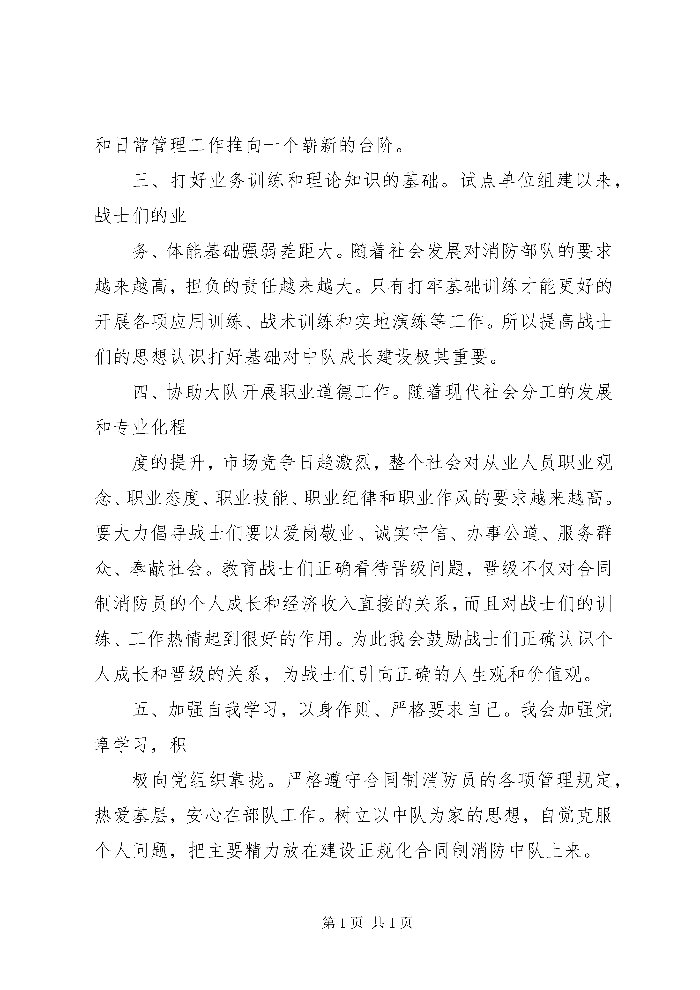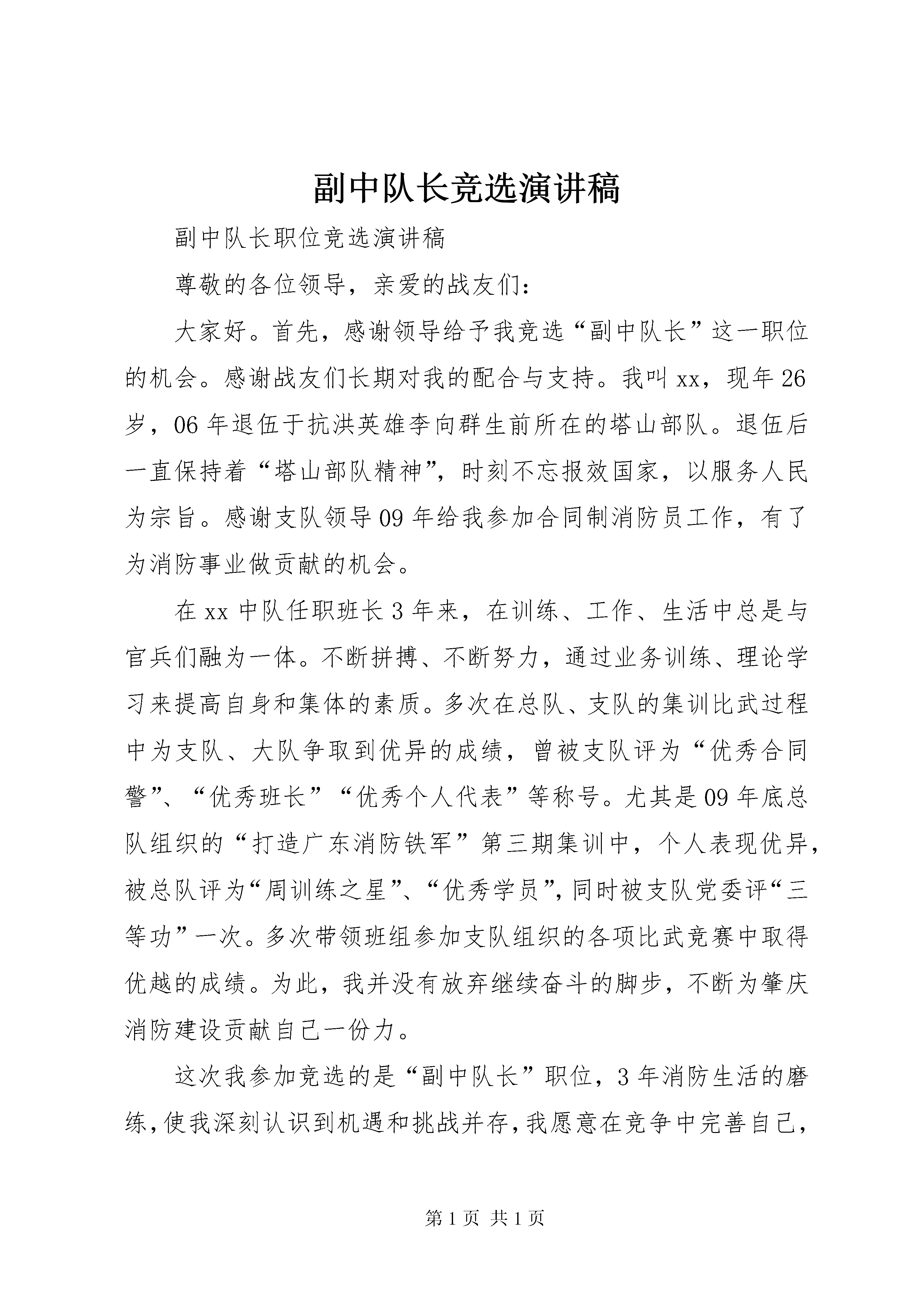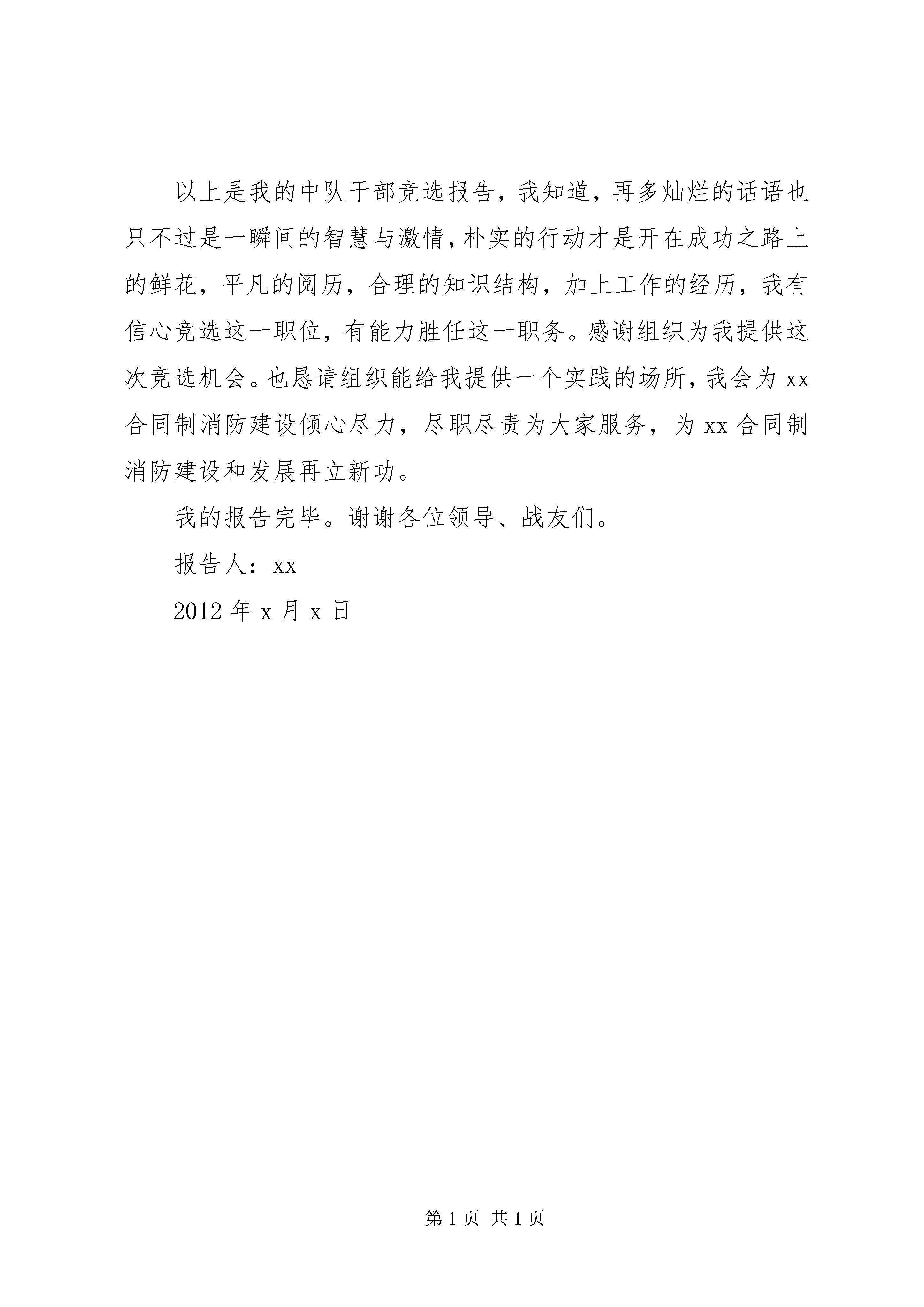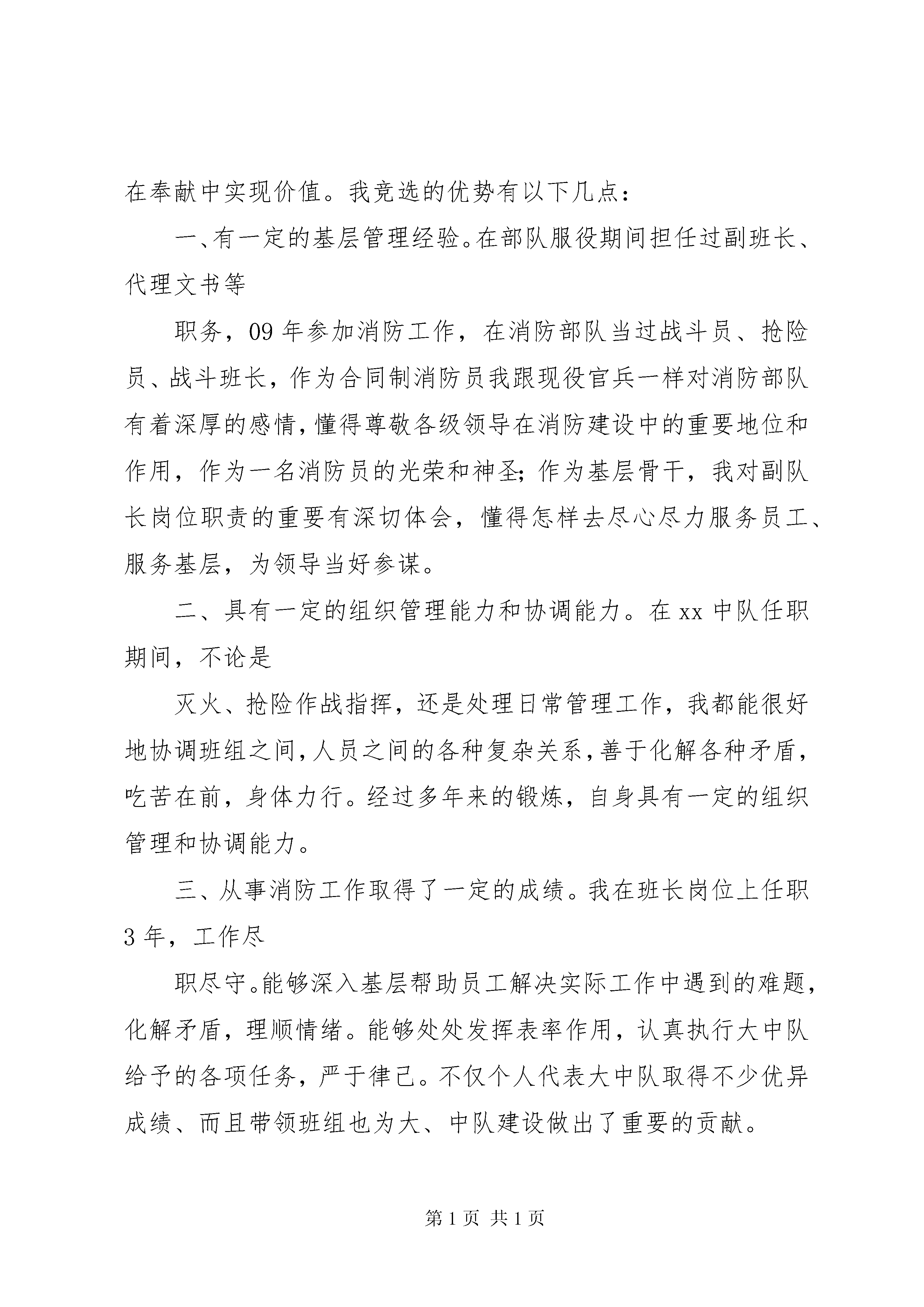 副中队长竞选演讲稿副中队长职位竞选演讲稿尊敬的各位领导,亲爱的战友们:大家好。首先,感谢领导给予我竞选“副中队长”这一职位的机会。感谢战友们长期对我的配合与支持。我叫xx,现年26岁,06年退伍于抗洪英雄李向群生前所在的塔山部队。退伍后一直保持着“塔山部队精神”,时刻不忘报效国家,以服务人民为宗旨。感谢支队领导09年给我参加合同制消防员工作,有了为消防事业做贡献的机会。在xx中队任职班长3年来,在训练、工作、生活中总是与官兵们融为一体。不断拼搏、不断努力,通过业务训练、理论学习来提高自身和集体的素质。多次在总队、支队的集训比武过程中为支队、大队争取到优异的成绩,曾被支队评为“优秀合同警”、“优秀班长”“优秀个人代表”等称号。尤其是09年底总队组织的“打造广东消防铁军”第三期集训中,个人表现优异,被总队评为“周训练之星”、“优秀学员”,同时被支队党委评“三等功”一次。多次带领班组参加支队组织的各项比武竞赛中取得优越的成绩。为此,我并没有放弃继续奋斗的脚步,不断为肇庆消防建设贡献自己一份力。这次我参加竞选的是“副中队长”职位,3年消防生活的磨练,使我深刻认识到机遇和挑战并存,我愿意在竞争中完善自己,在奉献中实现价值。我竞选的优势有以下几点:一、有一定的基层管理经验。在部队服役期间担任过副班长、代理文书等职务,09年参加消防工作,在消防部队当过战斗员、抢险员、战斗班长,作为合同制消防员我跟现役官兵一样对消防部队有着深厚的感情,懂得尊敬各级领导在消防建设中的重要地位和作用,作为一名消防员的光荣和神圣;作为基层骨干,我对副队长岗位职责的重要有深切体会,懂得怎样去尽心尽力服务员工、服务基层,为领导当好参谋。二、具有一定的组织管理能力和协调能力。在xx中队任职期间,不论是灭火、抢险作战指挥,还是处理日常管理工作,我都能很好地协调班组之间,人员之间的各种复杂关系,善于化解各种矛盾,吃苦在前,身体力行。经过多年来的锻炼,自身具有一定的组织管理和协调能力。三、从事消防工作取得了一定的成绩。我在班长岗位上任职3年,工作尽职尽守。能够深入基层帮助员工解决实际工作中遇到的难题,化解矛盾,理顺情绪。能够处处发挥表率作用,认真执行大中队给予的各项任务,严于律己。不仅个人代表大中队取得不少优异成绩、而且带领班组也为大、中队建设做出了重要的贡献。希望各级领导能够给予我晋级,继续为xx消防合同制消防部队发展再创佳绩。如果我是中队副队长,我会协助中队干部抓好中队的业务训练、执勤灭火工作以及做好各项安全稳定工作和安全防事故工作;协助政治指导员做好政治思想工作。同时也要不断加强自身的党章学习,带领大家贯彻执行党的路线、方针、政策和国家的宪法、法律,贯彻执行消防部队的各项规章制度以及上级的决议、命令、指示。关心爱护战士,在训练、生活、工作中给予最大限度的帮助和支持。如果我是中队干部,根据试点单位的现状,我会做到以下几点:一、加强班组的建设。试点单位的战士基本是由前xx中队和xx中队的合同制消防员合拼建成,且刚组建不久,很多规章制度还不够完善。所以,组建一帮有实力的带兵骨干十分重要,只有不断提高带兵骨干的素质,协调内部团结一致,中队才能够形成战斗力。同时加强官兵间的沟通、交流共同探讨管理和建设部队的思路和方法,总结经验,寻找不足,商量对策。发挥出最好的状态帮助大队完成试点的工作。二、紧紧围绕合同制消防中队正规化建设和贯彻落实支队各项合同制消防员管理规定来开展工作,把合同制消防中队的正规化建设和日常管理工作推向一个崭新的台阶。三、打好业务训练和理论知识的基础。试点单位组建以来,战士们的业务、体能基础强弱差距大。随着社会发展对消防部队的要求越来越高,担负的责任越来越大。只有打牢基础训练才能更好的开展各项应用训练、战术训练和实地演练等工作。所以提高战士们的思想认识打好基础对中队成长建设极其重要。四、协助大队开展职业道德工作。随着现代社会分工的发展和专业化程度的提升,市场竞争日趋激烈,整个社会对从业人员职业观念、职业态度、职业技能、职业纪律和职业作风的要求越来越高。要大力倡导战士们要以爱岗敬业、诚实守信、办事公道、服务群众、奉献社会。教育战士们正确看待晋级问题,晋级不仅对合同制消防员的个人成长和经济收入直接的关系,而且对战士们的训练、工作热情起到很好的作用。为此我会鼓励战士们正确认识个人成长和晋级的关系,为战士们引向正确的人生观和价值观。五、加强自我学习,以身作则、严格要求自己。我会加强党章学习,积极向党组织靠拢。严格遵守合同制消防员的各项管理规定,热爱基层,安心在部队工作。树立以中队为家的思想,自觉克服个人问题,把主要精力放在建设正规化合同制消防中队上来。以上是我的中队干部竞选报告,我知道,再多灿烂的话语也只不过是一瞬间的智慧与激情,朴实的行动才是开在