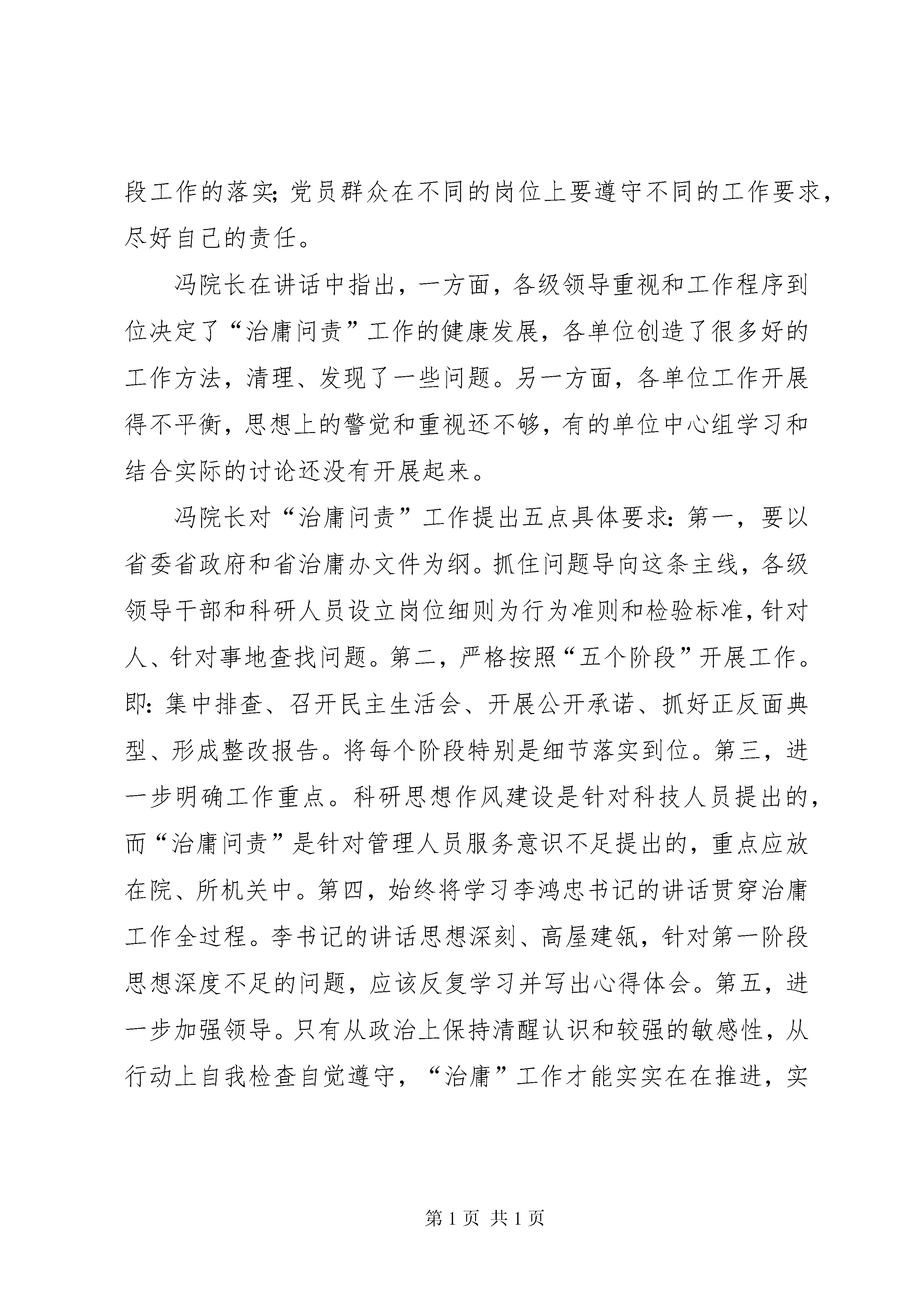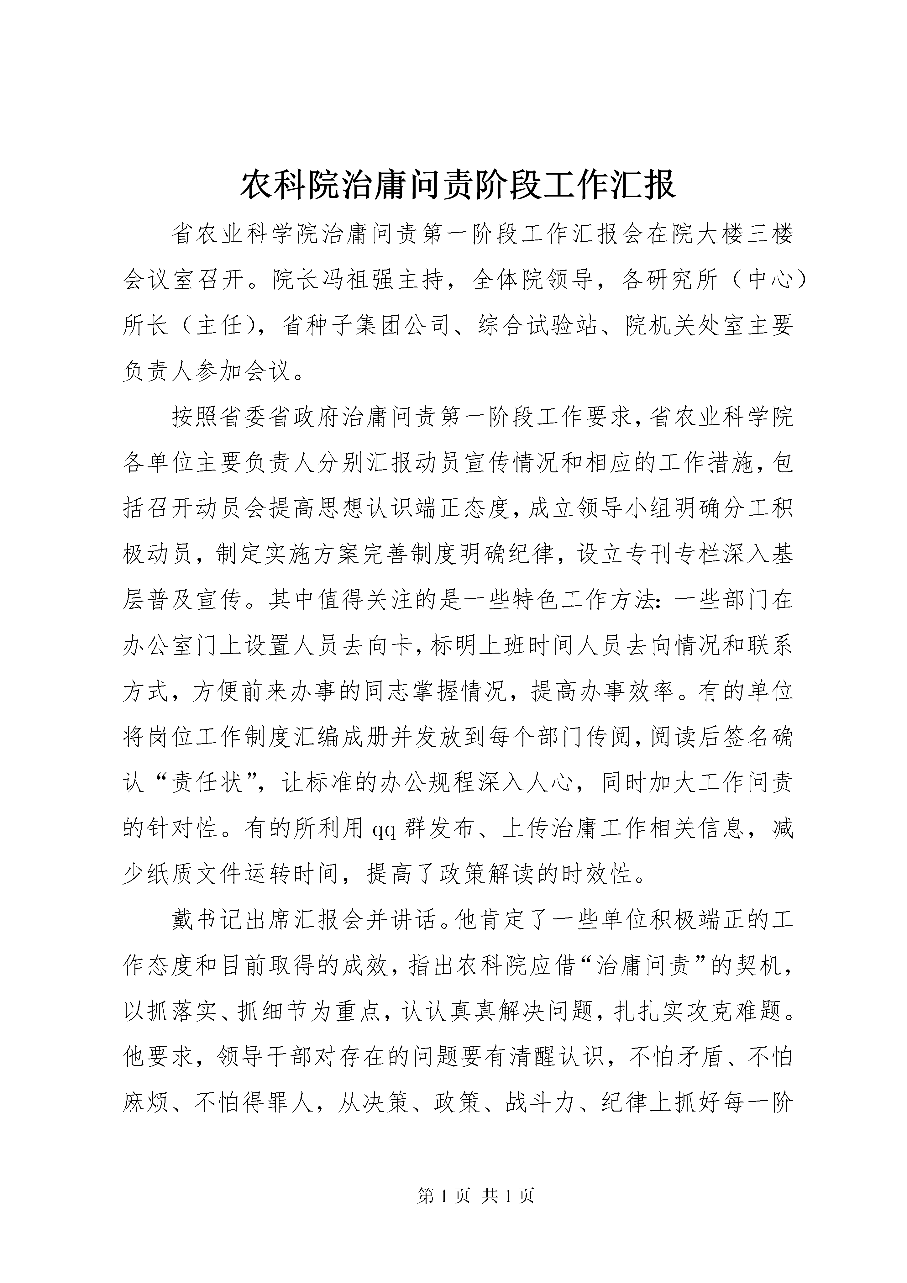 农科院治庸问责阶段工作汇报省农业科学院治庸问责第一阶段工作汇报会在院大楼三楼会议室召开。院长冯祖强主持,全体院领导,各研究所(中心)所长(主任),省种子集团公司、综合试验站、院机关处室主要负责人参加会议。按照省委省政府治庸问责第一阶段工作要求,省农业科学院各单位主要负责人分别汇报动员宣传情况和相应的工作措施,包括召开动员会提高思想认识端正态度,成立领导小组明确分工积极动员,制定实施方案完善制度明确纪律,设立专刊专栏深入基层普及宣传。其中值得关注的是一些特色工作方法:一些部门在办公室门上设置人员去向卡,标明上班时间人员去向情况和联系方式,方便前来办事的同志掌握情况,提高办事效率。有的单位将岗位工作制度汇编成册并发放到每个部门传阅,阅读后签名确认“责任状”,让标准的办公规程深入人心,同时加大工作问责的针对性。有的所利用qq群发布、上传治庸工作相关信息,减少纸质文件运转时间,提高了政策解读的时效性。戴书记出席汇报会并讲话。他肯定了一些单位积极端正的工作态度和目前取得的成效,指出农科院应借“治庸问责”的契机,以抓落实、抓细节为重点,认认真真解决问题,扎扎实攻克难题。他要求,领导干部对存在的问题要有清醒认识,不怕矛盾、不怕麻烦、不怕得罪人,从决策、政策、战斗力、纪律上抓好每一阶段工作的落实;党员群众在不同的岗位上要遵守不同的工作要求,尽好自己的责任。冯院长在讲话中指出,一方面,各级领导重视和工作程序到位决定了“治庸问责”工作的健康发展,各单位创造了很多好的工作方法,清理、发现了一些问题。另一方面,各单位工作开展得不平衡,思想上的警觉和重视还不够,有的单位中心组学习和结合实际的讨论还没有开展起来。冯院长对“治庸问责”工作提出五点具体要求:第一,要以省委省政府和省治庸办文件为纲。抓住问题导向这条主线,各级领导干部和科研人员设立岗位细则为行为准则和检验标准,针对人、针对事地查找问题。第二,严格按照“五个阶段”开展工作。即:集中排查、召开民主生活会、开展公开承诺、抓好正反面典型、形成整改报告。将每个阶段特别是细节落实到位。第三,进一步明确工作重点。科研思想作风建设是针对科技人员提出的,而“治庸问责”是针对管理人员服务意识不足提出的,重点应放在院、所机关中。第四,始终将学习李鸿忠书记的讲话贯穿治庸工作全过程。李书记的讲话思想深刻、高屋建瓴,针对第一阶段思想深度不足的问题,应该反复学习并写出心得体会。第五,进一步加强领导。只有从政治上保持清醒认识和较强的敏感性,从行动上自我检查自觉遵守,“治庸”工作才能实实在在推进,实现省农业科学院“十二五”跨越式发展。
