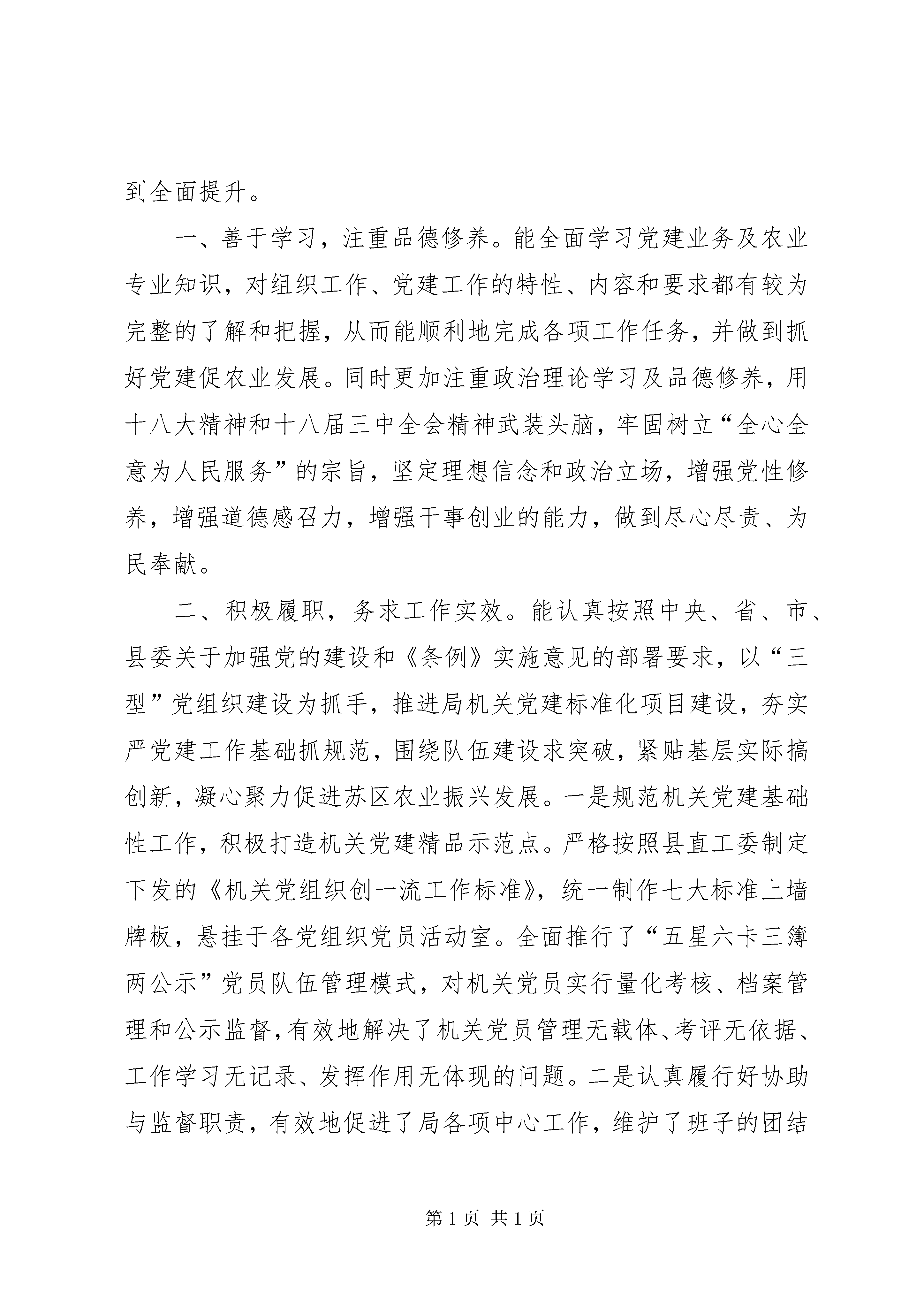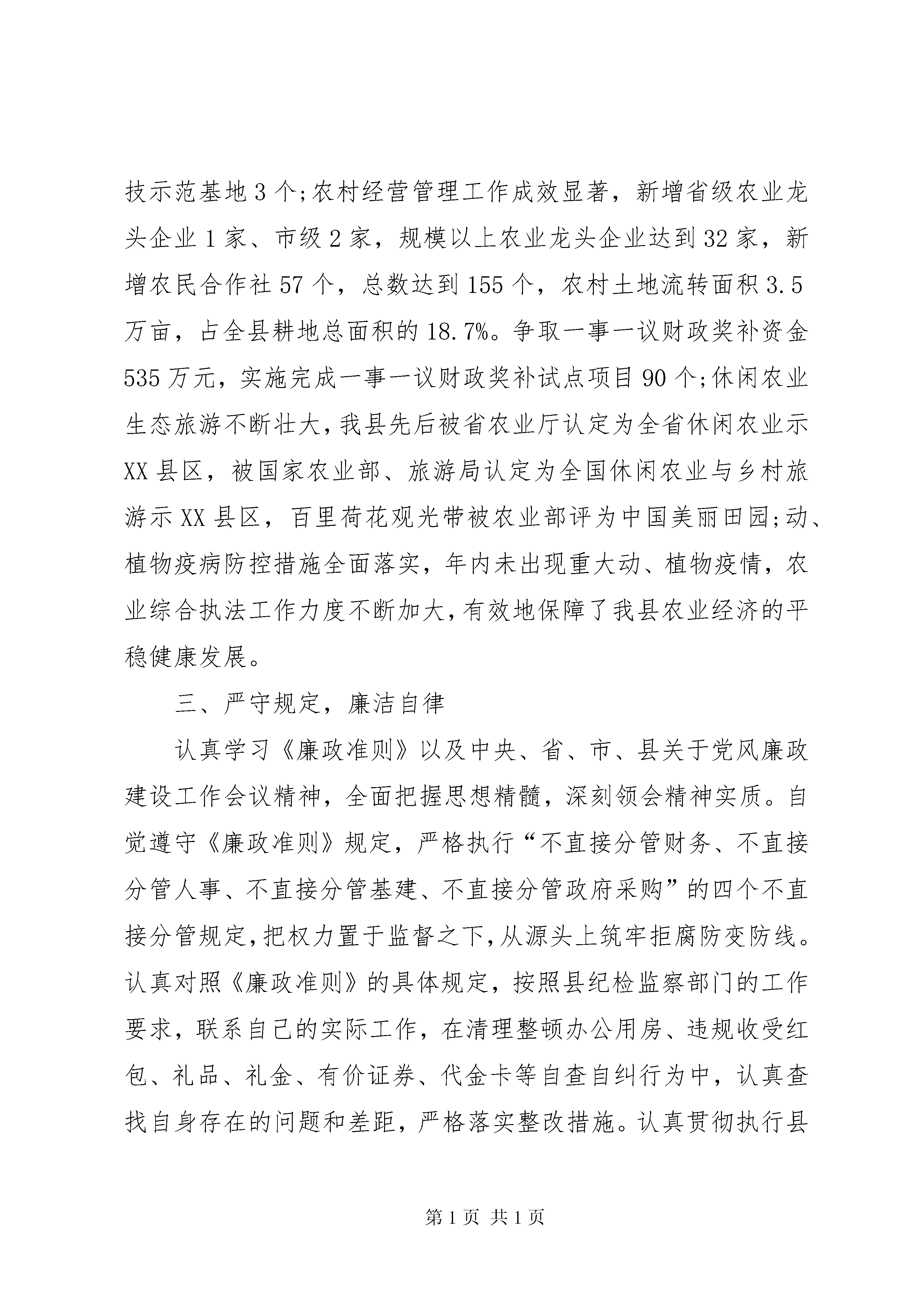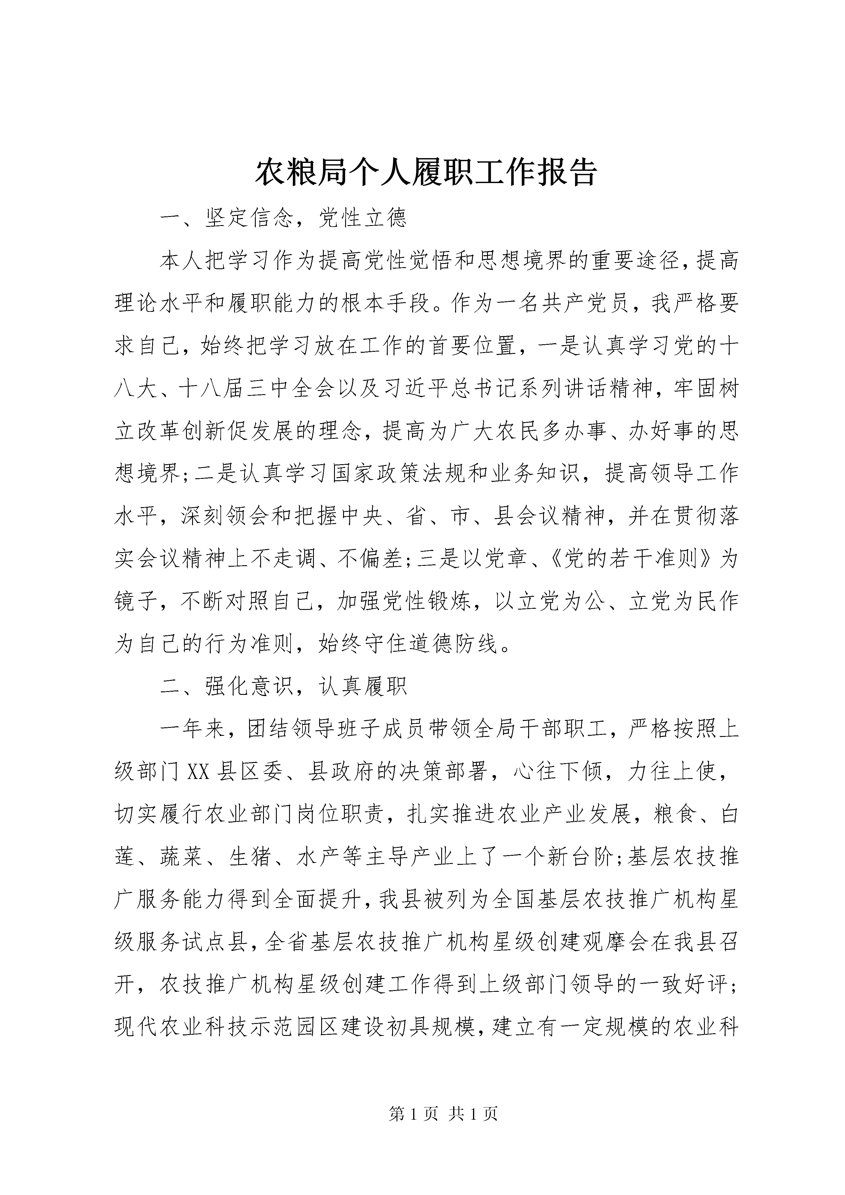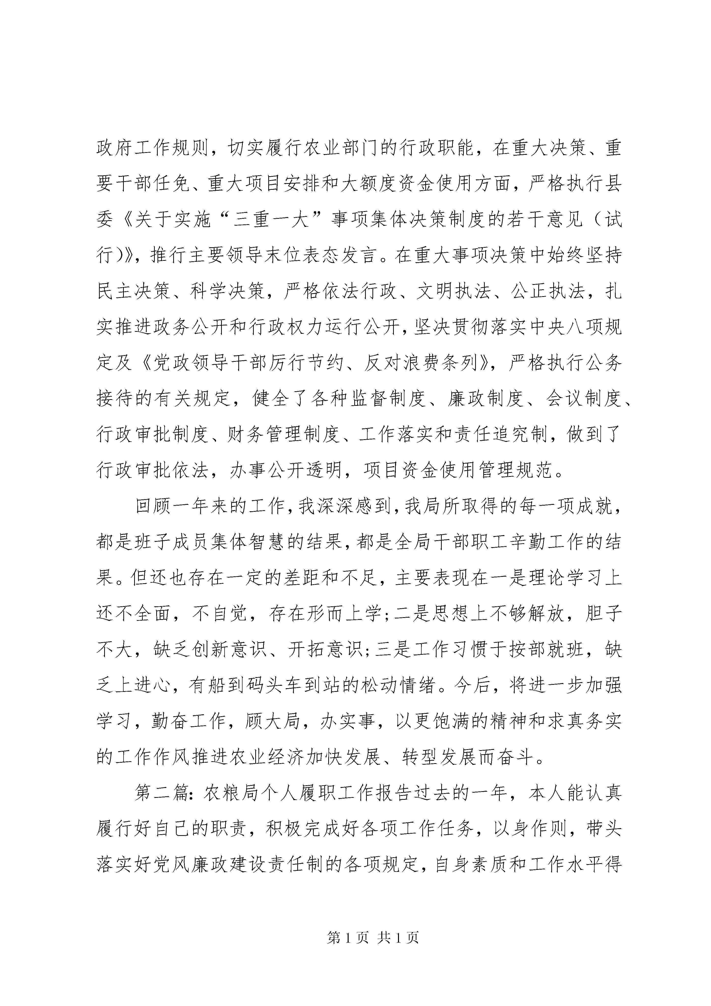 农粮局个人履职工作报告一、坚定信念,党性立德本人把学习作为提高党性觉悟和思想境界的重要途径,提高理论水平和履职能力的根本手段。作为一名共产党员,我严格要求自己,始终把学习放在工作的首要位置,一是认真学习党的十八大、十八届三中全会以及习近平总书记系列讲话精神,牢固树立改革创新促发展的理念,提高为广大农民多办事、办好事的思想境界;二是认真学习国家政策法规和业务知识,提高领导工作水平,深刻领会和把握中央、省、市、县会议精神,并在贯彻落实会议精神上不走调、不偏差;三是以党章、《党的若干准则》为镜子,不断对照自己,加强党性锻炼,以立党为公、立党为民作为自己的行为准则,始终守住道德防线。二、强化意识,认真履职一年来,团结领导班子成员带领全局干部职工,严格按照上级部门XX县区委、县政府的决策部署,心往下倾,力往上使,切实履行农业部门岗位职责,扎实推进农业产业发展,粮食、白莲、蔬菜、生猪、水产等主导产业上了一个新台阶;基层农技推广服务能力得到全面提升,我县被列为全国基层农技推广机构星级服务试点县,全省基层农技推广机构星级创建观摩会在我县召开,农技推广机构星级创建工作得到上级部门领导的一致好评;现代农业科技示范园区建设初具规模,建立有一定规模的农业科技示范基地3个;农村经营管理工作成效显著,新增省级农业龙头企业1家、市级2家,规模以上农业龙头企业达到32家,新增农民合作社57个,总数达到155个,农村土地流转面积3.5万亩,占全县耕地总面积的18.7%。争取一事一议财政奖补资金535万元,实施完成一事一议财政奖补试点项目90个;休闲农业生态旅游不断壮大,我县先后被省农业厅认定为全省休闲农业示XX县区,被国家农业部、旅游局认定为全国休闲农业与乡村旅游示XX县区,百里荷花观光带被农业部评为中国美丽田园;动、植物疫病防控措施全面落实,年内未出现重大动、植物疫情,农业综合执法工作力度不断加大,有效地保障了我县农业经济的平稳健康发展。三、严守规定,廉洁自律认真学习《廉政准则》以及中央、省、市、县关于党风廉政建设工作会议精神,全面把握思想精髓,深刻领会精神实质。自觉遵守《廉政准则》规定,严格执行“不直接分管财务、不直接分管人事、不直接分管基建、不直接分管政府采购”的四个不直接分管规定,把权力置于监督之下,从源头上筑牢拒腐防变防线。认真对照《廉政准则》的具体规定,按照县纪检监察部门的工作要求,联系自己的实际工作,在清理整顿办公用房、违规收受红包、礼品、礼金、有价证券、代金卡等自查自纠行为中,认真查找自身存在的问题和差距,严格落实整改措施。认真贯彻执行县政府工作规则,切实履行农业部门的行政职能,在重大决策、重要干部任免、重大项目安排和大额度资金使用方面,严格执行县委《关于实施“三重一大”事项集体决策制度的若干意见(试行)》,推行主要领导末位表态发言。在重大事项决策中始终坚持民主决策、科学决策,严格依法行政、文明执法、公正执法,扎实推进政务公开和行政权力运行公开,坚决贯彻落实中央八项规定及《党政领导干部厉行节约、反对浪费条列》,严格执行公务接待的有关规定,健全了各种监督制度、廉政制度、会议制度、行政审批制度、财务管理制度、工作落实和责任追究制,做到了行政审批依法,办事公开透明,项目资金使用管理规范。回顾一年来的工作,我深深感到,我局所取得的每一项成就,都是班子成员集体智慧的结果,都是全局干部职工辛勤工作的结果。但还也存在一定的差距和不足,主要表现在一是理论学习上还不全面,不自觉,存在形而上学;二是思想上不够解放,胆子不大,缺乏创新意识、开拓意识;三是工作习惯于按部就班,缺乏上进心,有船到码头车到站的松动情绪。今后,将进一步加强学习,勤奋工作,顾大局,办实事,以更饱满的精神和求真务实的工作作风推进农业经济加快发展、转型发展而奋斗。第二篇:农粮局个人履职工作报告过去的一年,本人能认真履行好自己的职责,积极完成好各项工作任务,以身作则,带头落实好党风廉政建设责任制的各项规定,自身素质和工作水平得到全面提升。一、善于学习,注重品德修养。能全面学习党建业务及农业专业知识,对组织工作、党建工作的特性、内容和要求都有较为完整的了解和把握,从而能顺利地完成各项工作任务,并做到抓好党建促农业发展。同时更加注重政治理论学习及品德修养,用十八大精神和十八届三中全会精神武装头脑,牢固树立“全心全意为人民服务”的宗旨,坚定理想信念和政治立场,增强党性修养,增强道德感召力,增强干事创业的能力,做到尽心尽责、为民奉献。二、积极履职,务求工作实效。能认真按照中央、省、市、县委关于加强党的建设和《条例》实施意见的部署要求,以“三型”党组织建设为抓手,推进局机关党建标准化项目建设,夯实严党建工作基础抓规范,围绕队伍建设求突破,紧贴基层实际搞创新,凝心聚力促进苏区农业振兴发