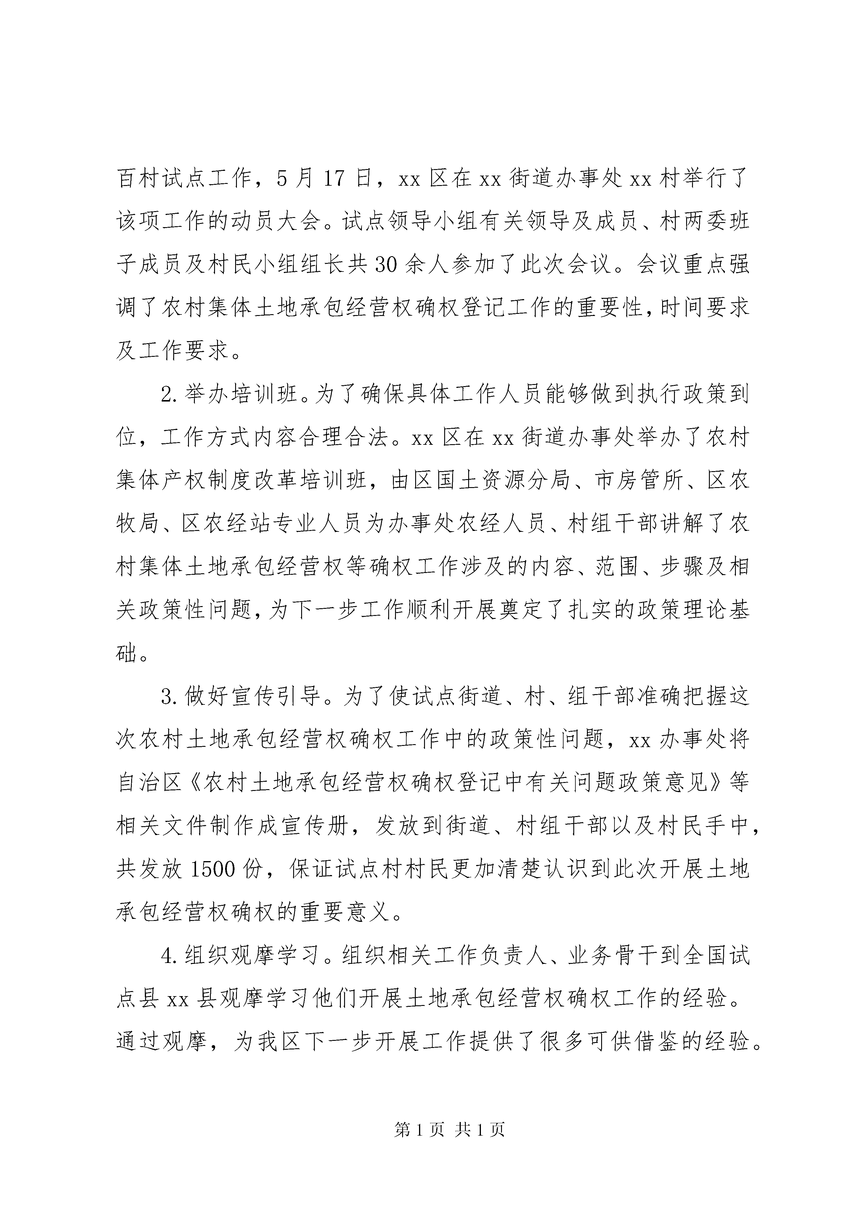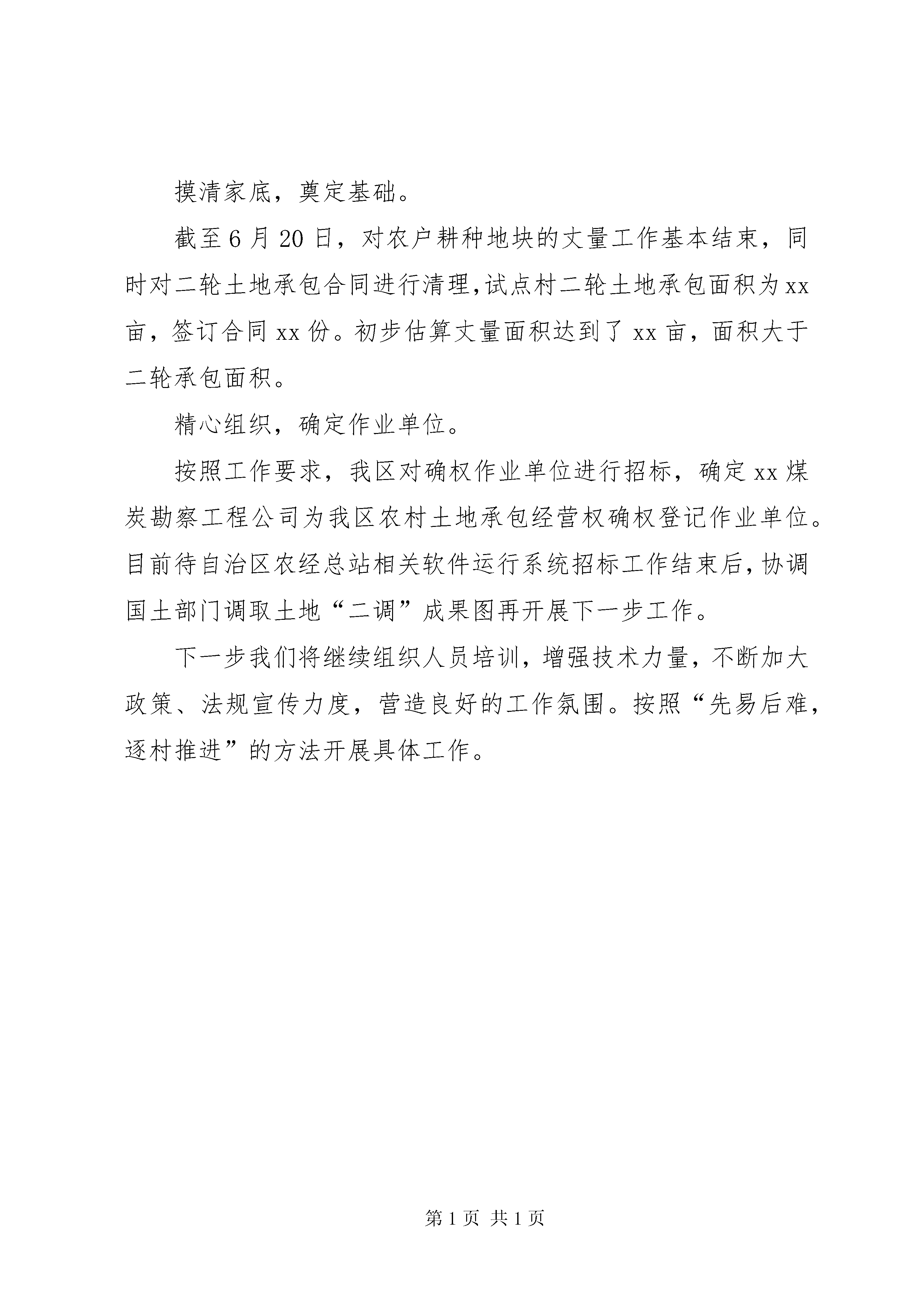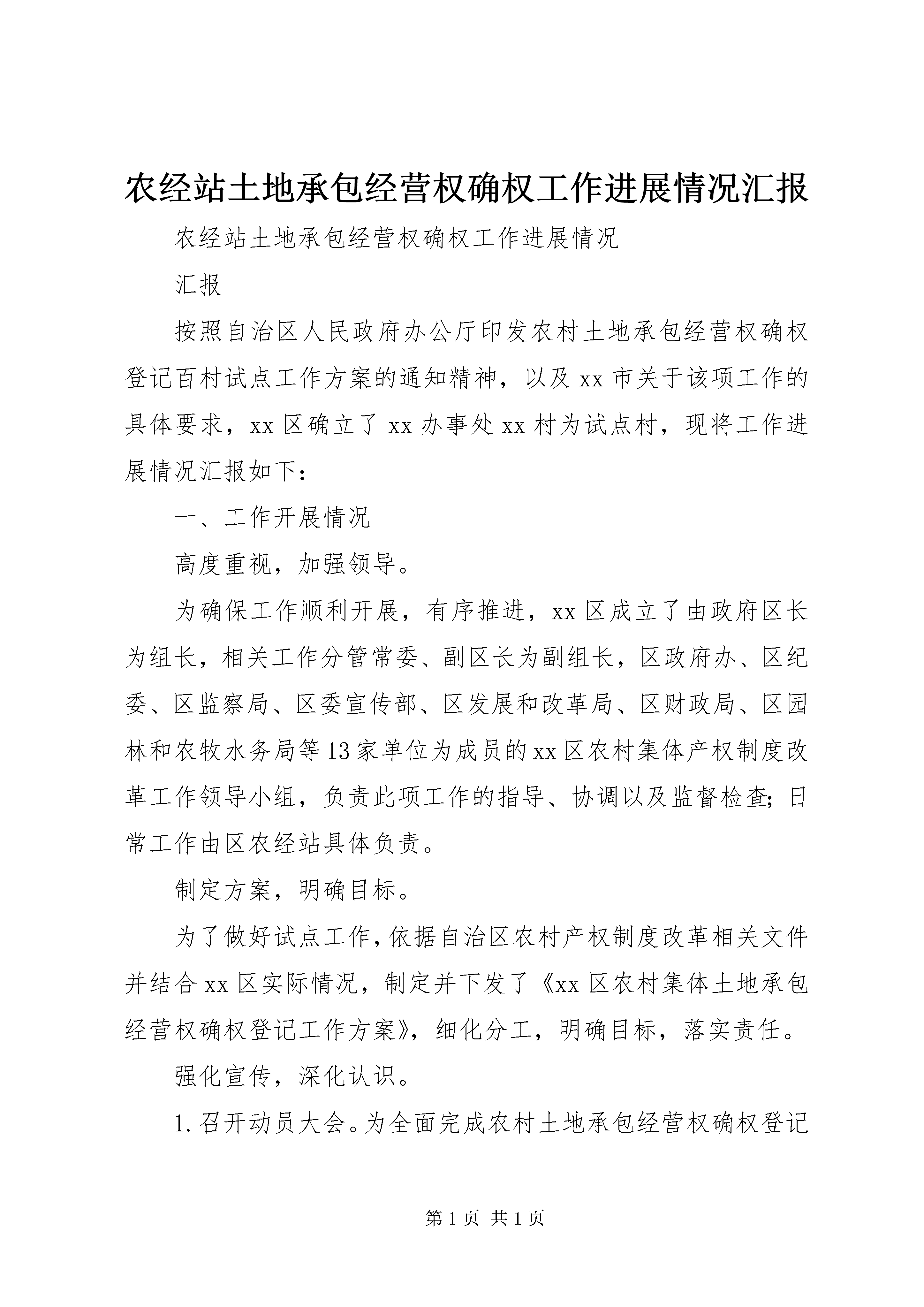 农经站土地承包经营权确权工作进展情况汇报农经站土地承包经营权确权工作进展情况汇报按照自治区人民政府办公厅印发农村土地承包经营权确权登记百村试点工作方案的通知精神,以及xx市关于该项工作的具体要求,xx区确立了xx办事处xx村为试点村,现将工作进展情况汇报如下:一、工作开展情况高度重视,加强领导。为确保工作顺利开展,有序推进,xx区成立了由政府区长为组长,相关工作分管常委、副区长为副组长,区政府办、区纪委、区监察局、区委宣传部、区发展和改革局、区财政局、区园林和农牧水务局等13家单位为成员的xx区农村集体产权制度改革工作领导小组,负责此项工作的指导、协调以及监督检查;日常工作由区农经站具体负责。制定方案,明确目标。为了做好试点工作,依据自治区农村产权制度改革相关文件并结合xx区实际情况,制定并下发了《xx区农村集体土地承包经营权确权登记工作方案》,细化分工,明确目标,落实责任。强化宣传,深化认识。1.召开动员大会。为全面完成农村土地承包经营权确权登记百村试点工作,5月17日,xx区在xx街道办事处xx村举行了该项工作的动员大会。试点领导小组有关领导及成员、村两委班子成员及村民小组组长共30余人参加了此次会议。会议重点强调了农村集体土地承包经营权确权登记工作的重要性,时间要求及工作要求。2.举办培训班。为了确保具体工作人员能够做到执行政策到位,工作方式内容合理合法。xx区在xx街道办事处举办了农村集体产权制度改革培训班,由区国土资源分局、市房管所、区农牧局、区农经站专业人员为办事处农经人员、村组干部讲解了农村集体土地承包经营权等确权工作涉及的内容、范围、步骤及相关政策性问题,为下一步工作顺利开展奠定了扎实的政策理论基础。3.做好宣传引导。为了使试点街道、村、组干部准确把握这次农村土地承包经营权确权工作中的政策性问题,xx办事处将自治区《农村土地承包经营权确权登记中有关问题政策意见》等相关文件制作成宣传册,发放到街道、村组干部以及村民手中,共发放1500份,保证试点村村民更加清楚认识到此次开展土地承包经营权确权的重要意义。4.组织观摩学习。组织相关工作负责人、业务骨干到全国试点县xx县观摩学习他们开展土地承包经营权确权工作的经验。通过观摩,为我区下一步开展工作提供了很多可供借鉴的经验。摸清家底,奠定基础。截至6月20日,对农户耕种地块的丈量工作基本结束,同时对二轮土地承包合同进行清理,试点村二轮土地承包面积为xx亩,签订合同xx份。初步估算丈量面积达到了xx亩,面积大于二轮承包面积。精心组织,确定作业单位。按照工作要求,我区对确权作业单位进行招标,确定xx煤炭勘察工程公司为我区农村土地承包经营权确权登记作业单位。目前待自治区农经总站相关软件运行系统招标工作结束后,协调国土部门调取土地“二调”成果图再开展下一步工作。下一步我们将继续组织人员培训,增强技术力量,不断加大政策、法规宣传力度,营造良好的工作氛围。按照“先易后难,逐村推进”的方法开展具体工作。