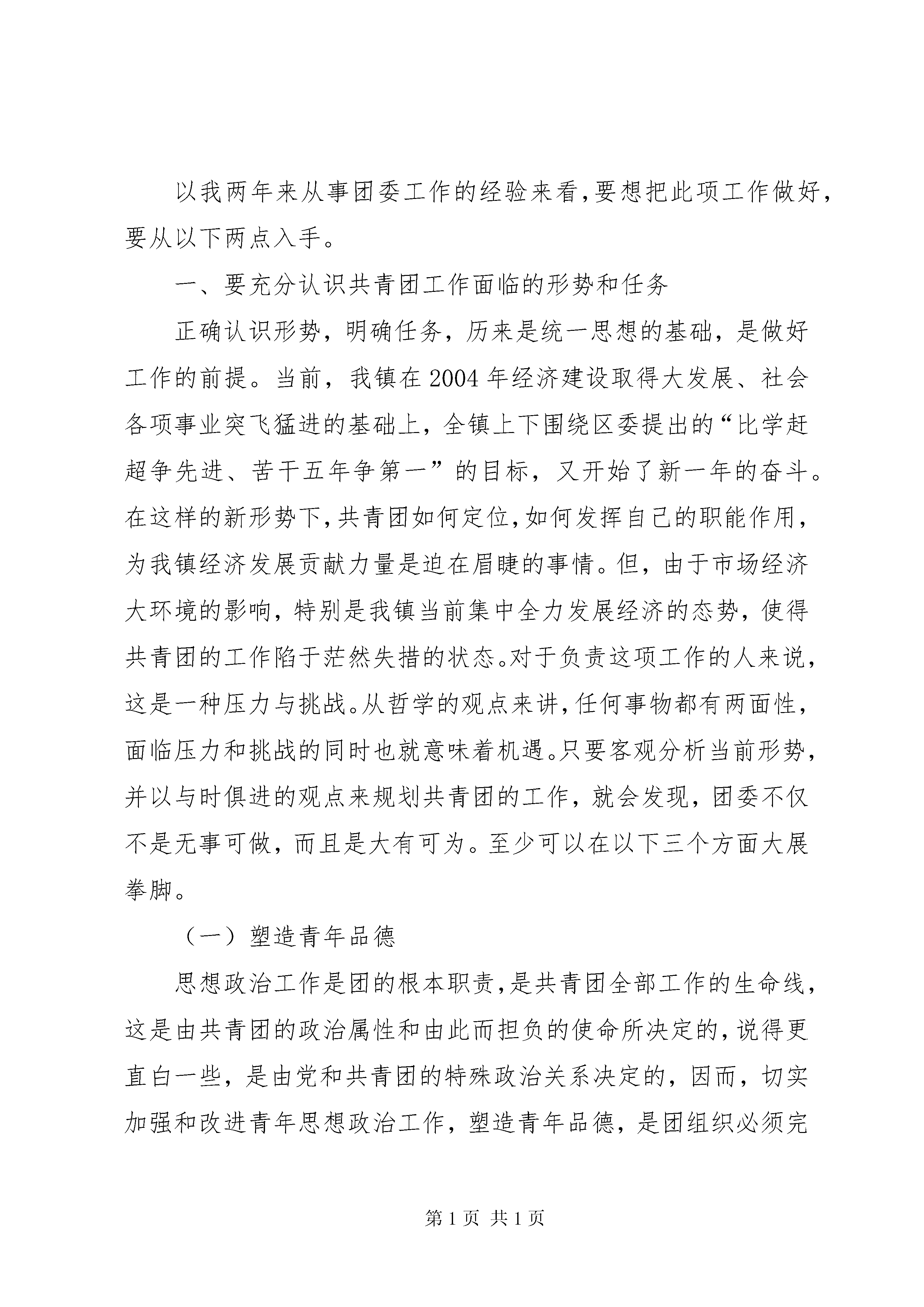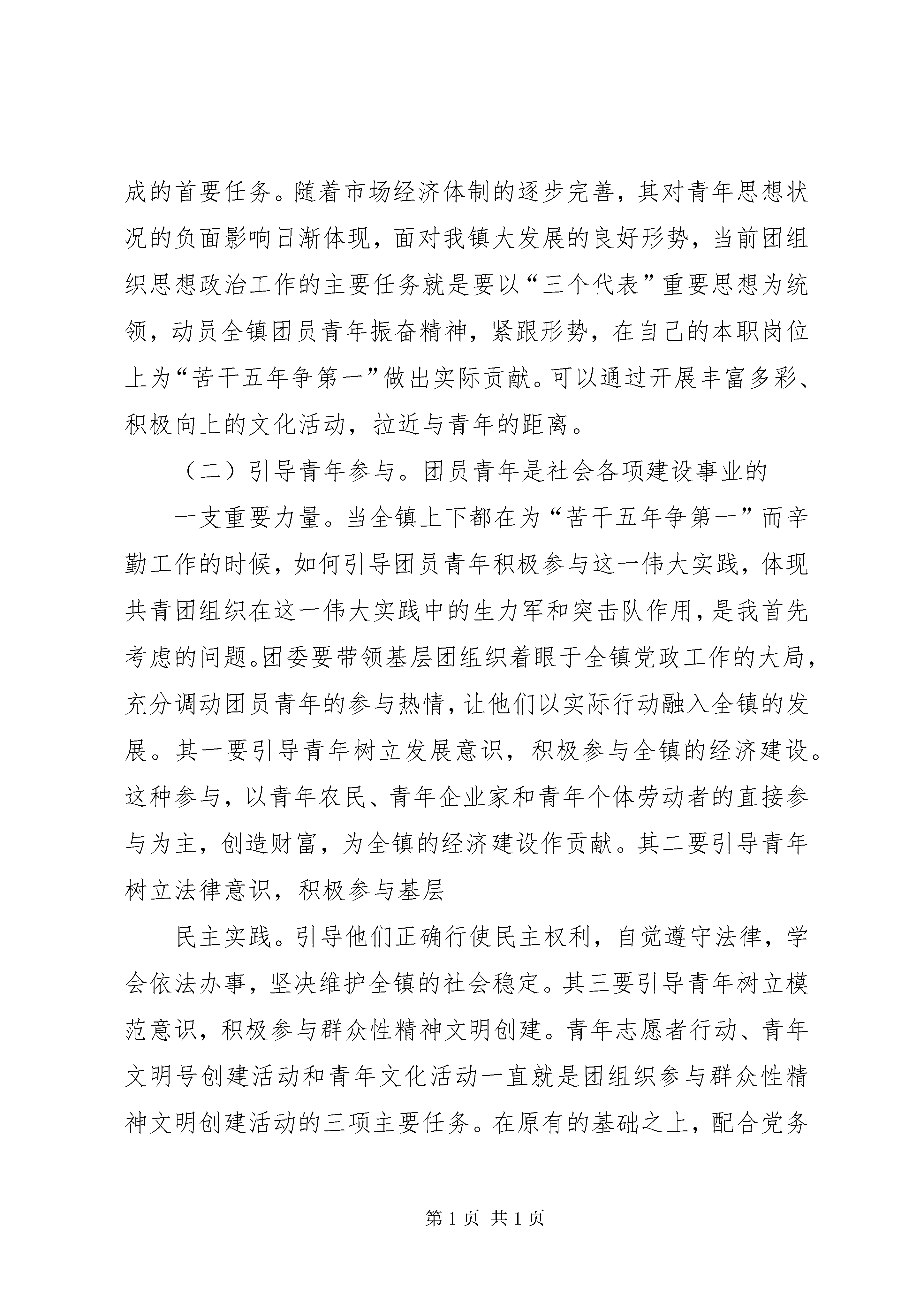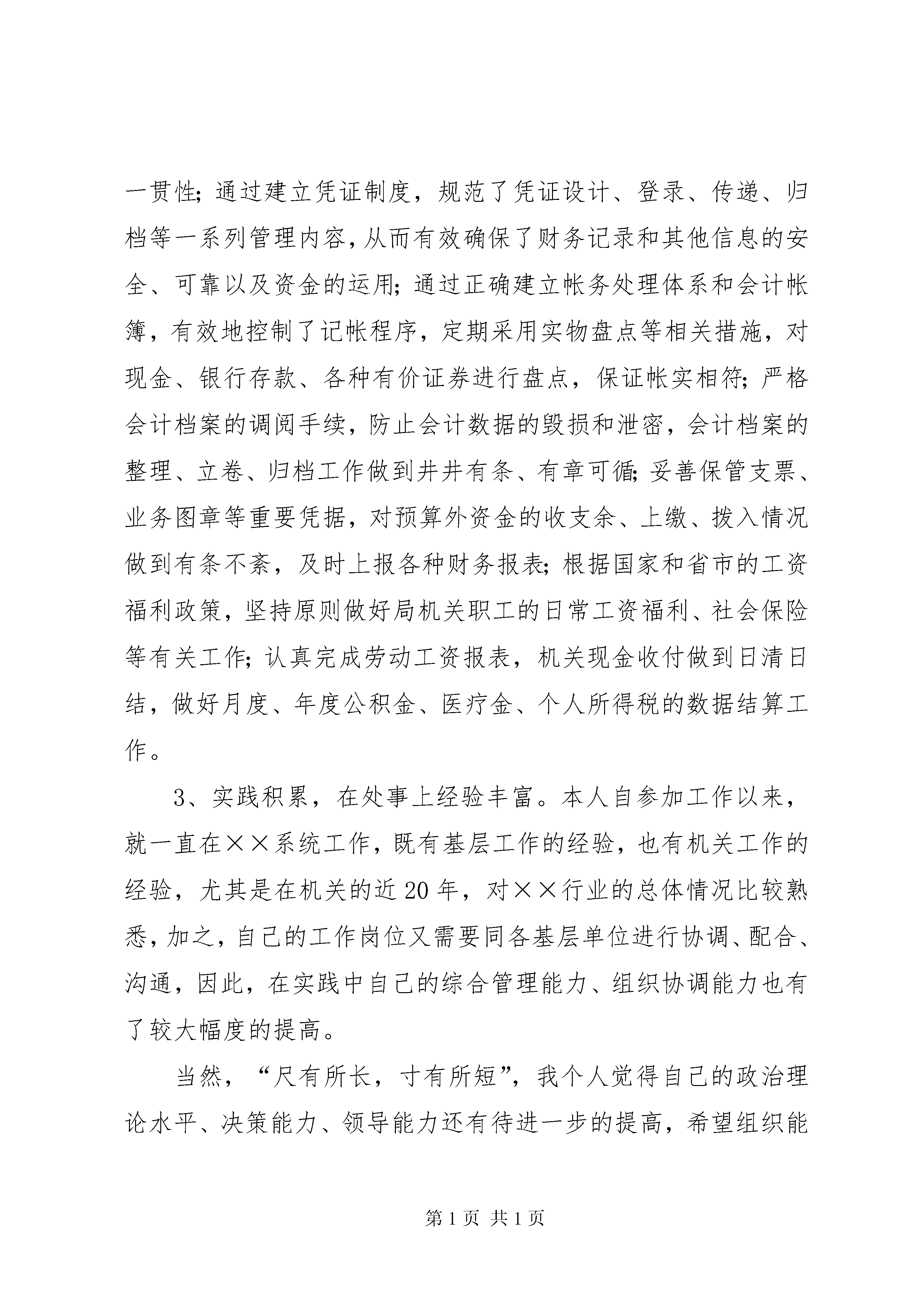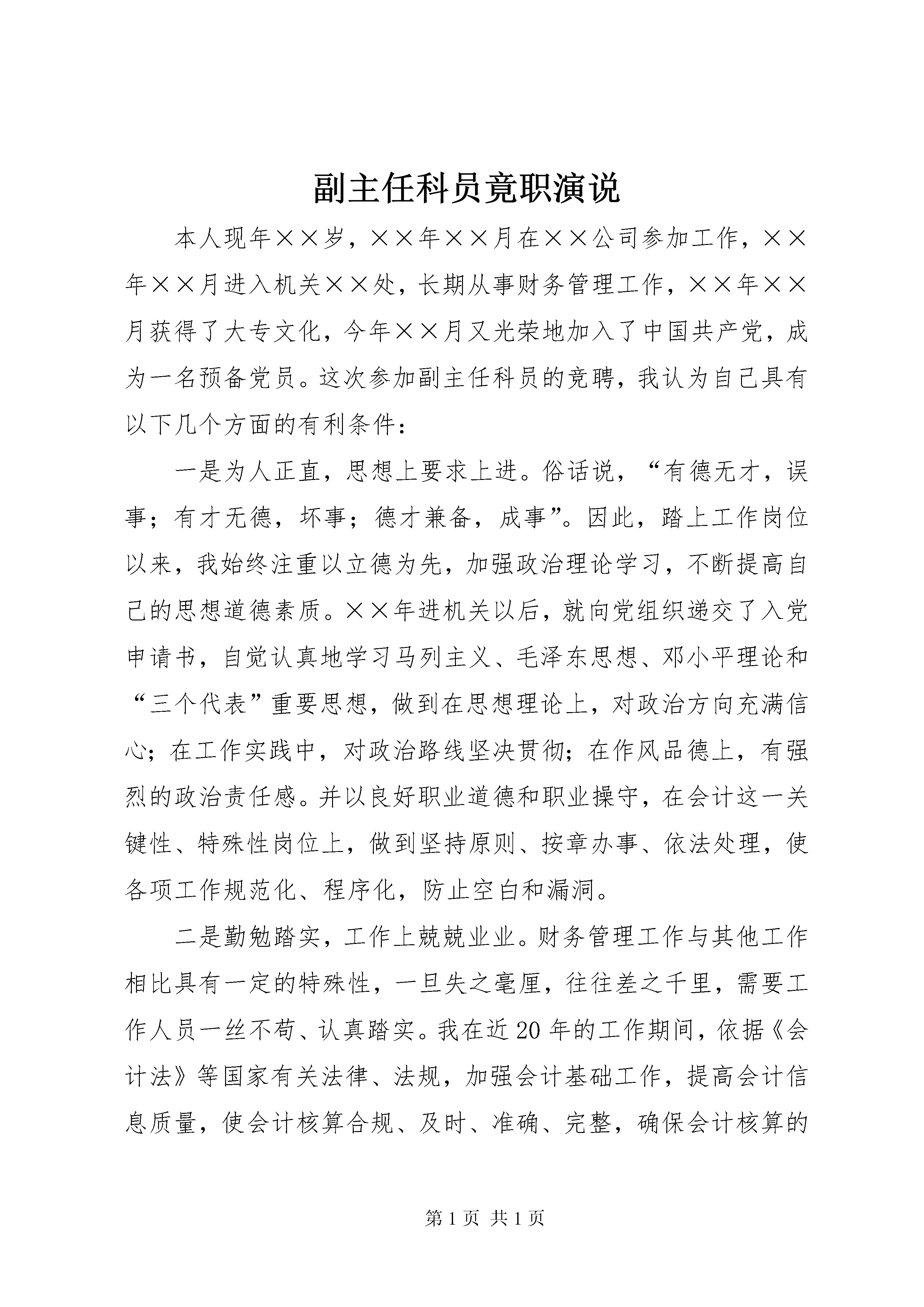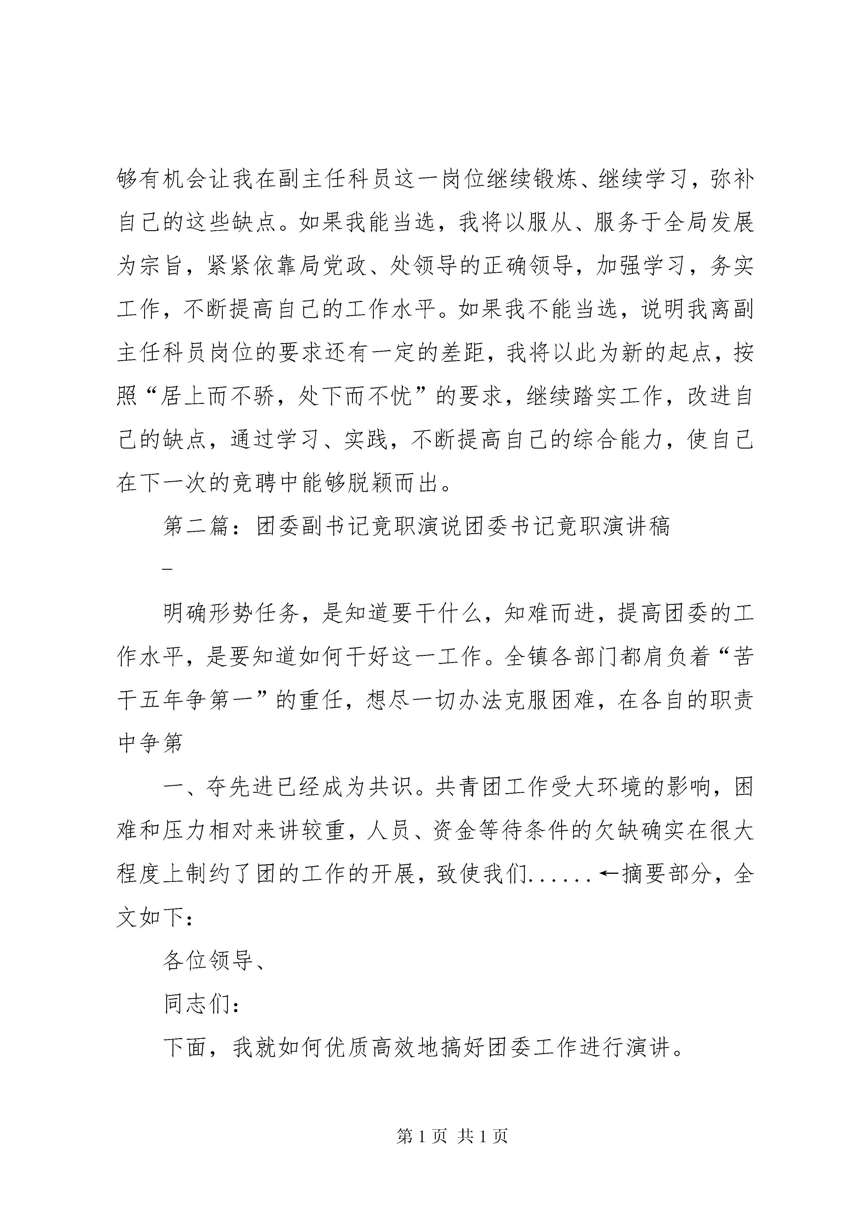 副主任科员竟职演说本人现年××岁,××年××月在××公司参加工作,××年××月进入机关××处,长期从事财务管理工作,××年××月获得了大专文化,今年××月又光荣地加入了中国共产党,成为一名预备党员。这次参加副主任科员的竞聘,我认为自己具有以下几个方面的有利条件:一是为人正直,思想上要求上进。俗话说,“有德无才,误事;有才无德,坏事;德才兼备,成事”。因此,踏上工作岗位以来,我始终注重以立德为先,加强政治理论学习,不断提高自己的思想道德素质。××年进机关以后,就向党组织递交了入党申请书,自觉认真地学习马列主义、毛泽东思想、邓小平理论和“三个代表”重要思想,做到在思想理论上,对政治方向充满信心;在工作实践中,对政治路线坚决贯彻;在作风品德上,有强烈的政治责任感。并以良好职业道德和职业操守,在会计这一关键性、特殊性岗位上,做到坚持原则、按章办事、依法处理,使各项工作规范化、程序化,防止空白和漏洞。二是勤勉踏实,工作上兢兢业业。财务管理工作与其他工作相比具有一定的特殊性,一旦失之毫厘,往往差之千里,需要工作人员一丝不苟、认真踏实。我在近20年的工作期间,依据《会计法》等国家有关法律、法规,加强会计基础工作,提高会计信息质量,使会计核算合规、及时、准确、完整,确保会计核算的一贯性;通过建立凭证制度,规范了凭证设计、登录、传递、归档等一系列管理内容,从而有效确保了财务记录和其他信息的安全、可靠以及资金的运用;通过正确建立帐务处理体系和会计帐簿,有效地控制了记帐程序,定期采用实物盘点等相关措施,对现金、银行存款、各种有价证券进行盘点,保证帐实相符;严格会计档案的调阅手续,防止会计数据的毁损和泄密,会计档案的整理、立卷、归档工作做到井井有条、有章可循;妥善保管支票、业务图章等重要凭据,对预算外资金的收支余、上缴、拨入情况做到有条不紊,及时上报各种财务报表;根据国家和省市的工资福利政策,坚持原则做好局机关职工的日常工资福利、社会保险等有关工作;认真完成劳动工资报表,机关现金收付做到日清日结,做好月度、年度公积金、医疗金、个人所得税的数据结算工作。3、实践积累,在处事上经验丰富。本人自参加工作以来,就一直在××系统工作,既有基层工作的经验,也有机关工作的经验,尤其是在机关的近20年,对××行业的总体情况比较熟悉,加之,自己的工作岗位又需要同各基层单位进行协调、配合、沟通,因此,在实践中自己的综合管理能力、组织协调能力也有了较大幅度的提高。当然,“尺有所长,寸有所短”,我个人觉得自己的政治理论水平、决策能力、领导能力还有待进一步的提高,希望组织能够有机会让我在副主任科员这一岗位继续锻炼、继续学习,弥补自己的这些缺点。如果我能当选,我将以服从、服务于全局发展为宗旨,紧紧依靠局党政、处领导的正确领导,加强学习,务实工作,不断提高自己的工作水平。如果我不能当选,说明我离副主任科员岗位的要求还有一定的差距,我将以此为新的起点,按照“居上而不骄,处下而不忧”的要求,继续踏实工作,改进自己的缺点,通过学习、实践,不断提高自己的综合能力,使自己在下一次的竞聘中能够脱颖而出。第二篇:团委副书记竟职演说团委书记竟职演讲稿-明确形势任务,是知道要干什么,知难而进,提高团委的工作水平,是要知道如何干好这一工作。全镇各部门都肩负着“苦干五年争第一”的重任,想尽一切办法克服困难,在各自的职责中争第一、夺先进已经成为共识。共青团工作受大环境的影响,困难和压力相对来讲较重,人员、资金等待条件的欠缺确实在很大程度上制约了团的工作的开展,致使我们......←摘要部分,全文如下:各位领导、同志们:下面,我就如何优质高效地搞好团委工作进行演讲。以我两年来从事团委工作的经验来看,要想把此项工作做好,要从以下两点入手。一、要充分认识共青团工作面临的形势和任务正确认识形势,明确任务,历来是统一思想的基础,是做好工作的前提。当前,我镇在2004年经济建设取得大发展、社会各项事业突飞猛进的基础上,全镇上下围绕区委提出的“比学赶超争先进、苦干五年争第一”的目标,又开始了新一年的奋斗。在这样的新形势下,共青团如何定位,如何发挥自己的职能作用,为我镇经济发展贡献力量是迫在眉睫的事情。但,由于市场经济大环境的影响,特别是我镇当前集中全力发展经济的态势,使得共青团的工作陷于茫然失措的状态。对于负责这项工作的人来说,这是一种压力与挑战。从哲学的观点来讲,任何事物都有两面性,面临压力和挑战的同时也就意味着机遇。只要客观分析当前形势,并以与时俱进的观点来规划共青团的工作,就会发现,团委不仅不是无事可做,而且是大有可为。至少可以在以下三个方面大展拳脚。(一)塑造青年品德思想政治工作是团的根本职责,是共青团全部工作的生命线,这是由共青团的政治属性和由此而担负的使命所决定的,说得更直白一些