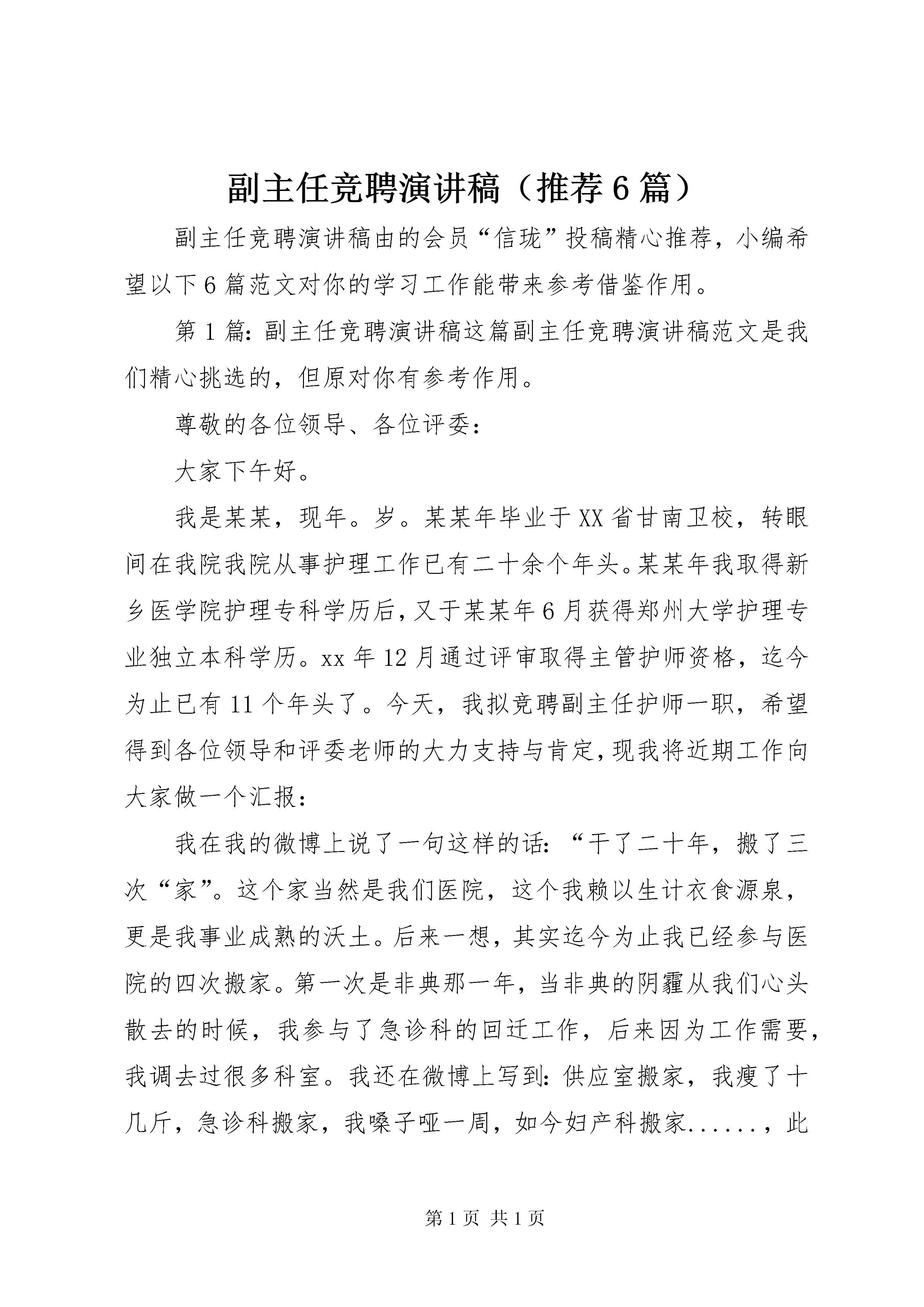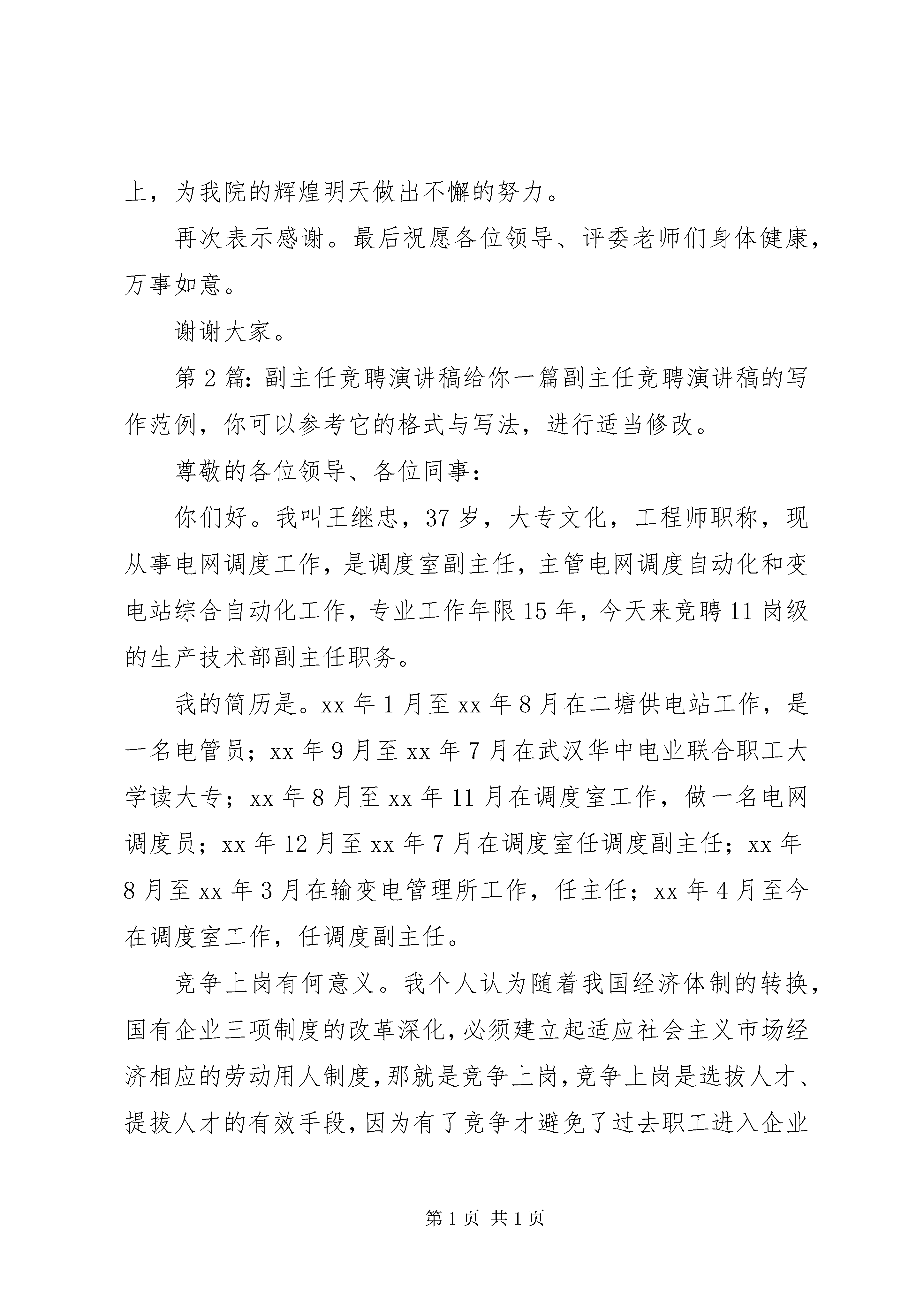 副主任竞聘演讲稿(推荐6篇)副主任竞聘演讲稿由的会员“信珑”投稿精心推荐,小编希望以下6篇范文对你的学习工作能带来参考借鉴作用。第1篇:副主任竞聘演讲稿这篇副主任竞聘演讲稿范文是我们精心挑选的,但原对你有参考作用。尊敬的各位领导、各位评委:大家下午好。我是某某,现年。岁。某某年毕业于XX省甘南卫校,转眼间在我院我院从事护理工作已有二十余个年头。某某年我取得新乡医学院护理专科学历后,又于某某年6月获得郑州大学护理专业独立本科学历。xx年12月通过评审取得主管护师资格,迄今为止已有11个年头了。今天,我拟竞聘副主任护师一职,希望得到各位领导和评委老师的大力支持与肯定,现我将近期工作向大家做一个汇报:我在我的微博上说了一句这样的话:“干了二十年,搬了三次“家”。这个家当然是我们医院,这个我赖以生计衣食源泉,更是我事业成熟的沃土。后来一想,其实迄今为止我已经参与医院的四次搬家。第一次是非典那一年,当非典的阴霾从我们心头散去的时候,我参与了急诊科的回迁工作,后来因为工作需要,我调去过很多科室。我还在微博上写到:供应室搬家,我瘦了十几斤,急诊科搬家,我嗓子哑一周,如今妇产科搬家......,此时,我的内心更有一种悲壮之情,这琐碎而又平凡的工作,使我每一天在忙碌中度过,可回过头来,却仿佛什么也没有做,可我依然在这个岗位上一干就是二十余年.其实我更想表达的是,我的成长是伴随着我们县医院日新月异的变化。在医院工作的这二十余年,我在各位老师的帮助下,就像我们医院一样发生着质的飞跃。回想过去,当初的懵懂仿佛历历在目,现如今的成熟难道不是这多年的历练积累的成果。我先后在医院的很多科室工作过,如果没有这些工作经历,我怎么能够积累这么多多学科的知识,如果不是在座很多老师的帮助,我怎么能有今日的这些成就。如果把我们医院比喻成为一个人,那我们的各个科室,就是人身上的肌肉、神经、皮肤、内脏等等、等等。而我们每一个人就像这些器官的细胞中一样,在自己不同的岗位上发挥着自己的机能,使我们县医院,这个我县卫生系统的“巨人”才能站得更稳,走的更远。回想工作的这么多年,我确实感谢领导给我不断锻炼的机会。临床科室之间的转换,使我对人体各个系统的疾病都有了一定的掌握,短暂的行政参与为我走上护士长岗位打下了坚实的基础,不断的参与各种活动、竞赛,使我的的语言组织能力、沟通协调应变能力不断的得到了提升。不去神内,我怎么能写出《老年高血压患者手术治疗的护理体会》论文发表,不去外科工作,我怎么能够总结出《外科胃肠减压的护理体会》被杂志刊登,不去供应室我怎会对多种器械包、手术包了如指掌,不去急诊科,我又怎会对呼吸机的使用和人工气道的管理有了深刻的体会。虽然我承受着巨大的工作压力,但我也收获了更多的知识与技能。每一个岗位就像一部精密仪器上的零件,各有各的特色,也各有各的专长,缺一不可。我常对科室的护士们说:“我们不能收获安逸,至少我们该收获认可,同事的认可、病患的认可、领导的认可。只有在我们自己的岗位上发挥了自己的作用,就会得到大家的肯定;我们不能收获金钱,至少我们该收获知识,收获技能,这是我们这一生最大的财富,是谁也夺不走的宝贵财富。”爸爸曾经对我说:“人贵有知,贵为人知。”我把它理解为,人应该具备一定的知识和能力,更应该把这些知识和能力施展出来,去服务他人,实现价值。我很庆幸我不断增长了我的能力,并使他有机会施展开来,我认真的去做每一件事情,并不是想证明我有多能,而是想告诉自己我能行。我一直坚持努力的做好我的工作,不论在什么岗位,当然我的努力付出也得到了肯定与奖励。那一本本红彤彤的荣誉证书就像是领导投来的鼓励而又信任的目光,激励着我在护理事业的道路上不断前进。现如今我站在了护理岗位的又一个更高的起点,我想我已具备这样的能力,并做好了充分的准备,我希望得到在坐的各位领导和评委老师们能给予我更多的肯定与鼓励,我相信,在你们温暖而又有力的双手的推动下,我一定会在这个更高更严的新起点上,为我院的辉煌明天做出不懈的努力。再次表示感谢。最后祝愿各位领导、评委老师们身体健康,万事如意。谢谢大家。第2篇:副主任竞聘演讲稿给你一篇副主任竞聘演讲稿的写作范例,你可以参考它的格式与写法,进行适当修改。尊敬的各位领导、各位同事:你们好。我叫王继忠,37岁,大专文化,工程师职称,现从事电网调度工作,是调度室副主任,主管电网调度自动化和变电站综合自动化工作,专业工作年限15年,今天来竞聘11岗级的生产技术部副主任职务。我的简历是。xx年1月至xx年8月在二塘供电站工作,是一名电管员;xx年9月至xx年7月在武汉华中电业联合职工大学读大专;xx年8月至xx年11月在调度室工作,做一名电网调度员;xx年12月至xx年7月在调度室任调度副主任;xx年8月至xx年3月在输变电管理所工作,任主任;