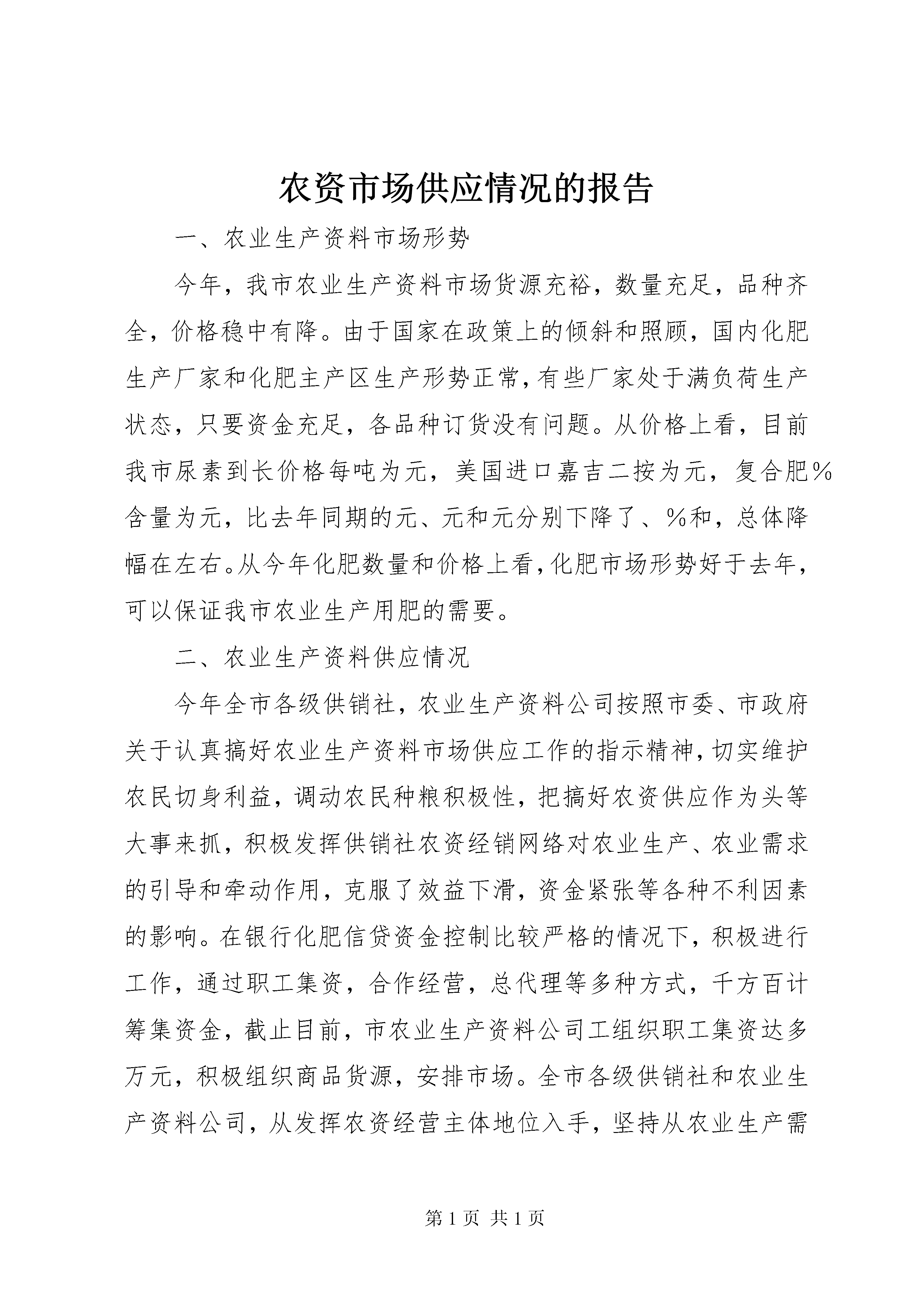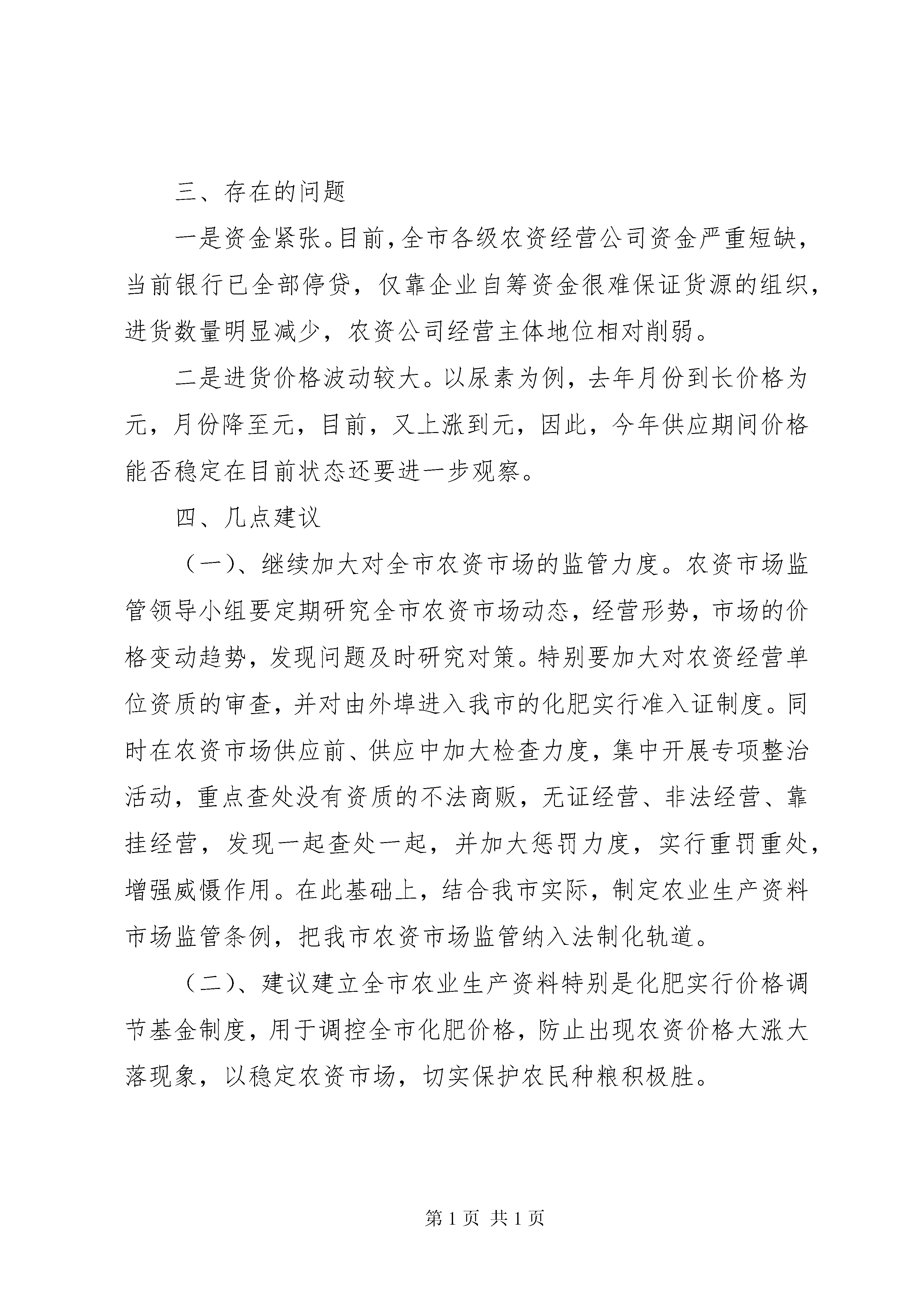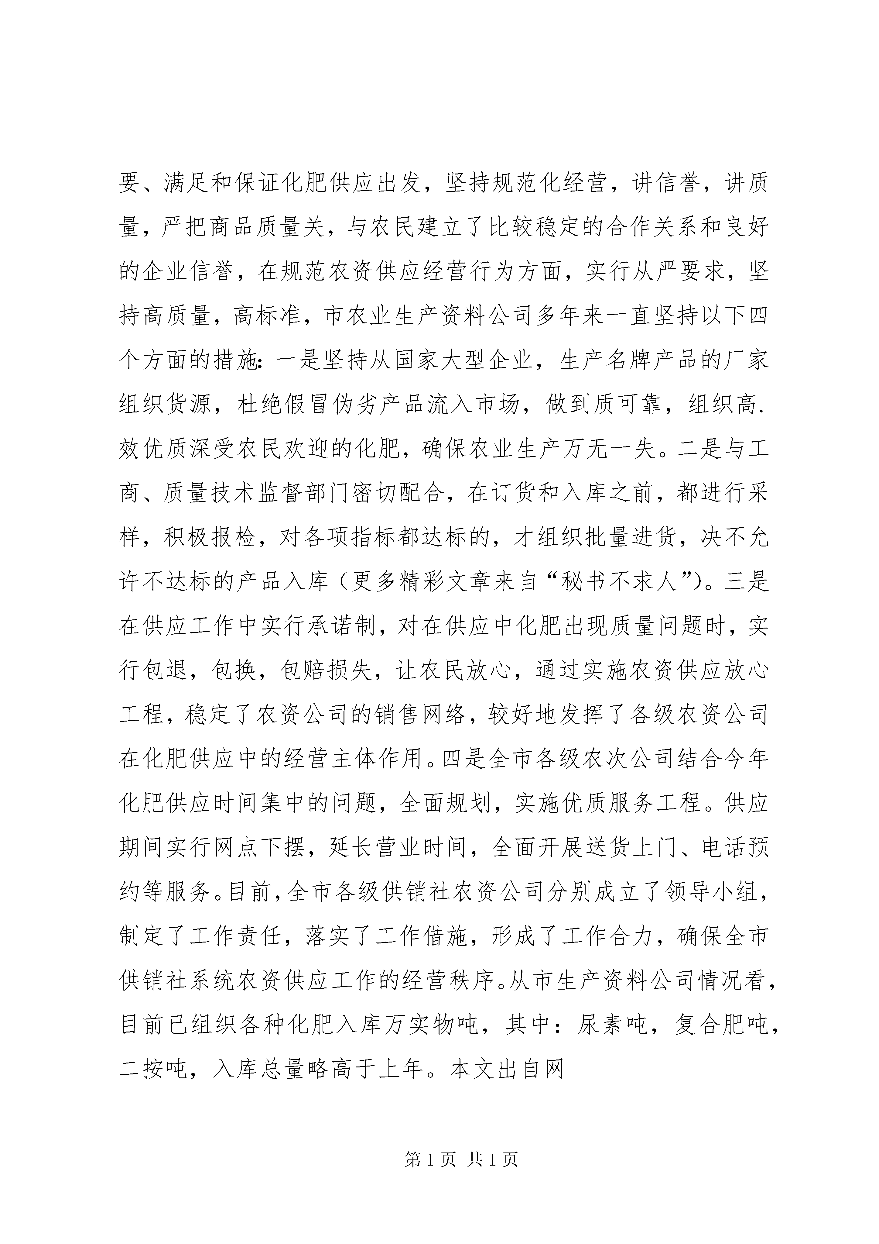 农资市场供应情况的报告一、农业生产资料市场形势今年,我市农业生产资料市场货源充裕,数量充足,品种齐全,价格稳中有降。由于国家在政策上的倾斜和照顾,国内化肥生产厂家和化肥主产区生产形势正常,有些厂家处于满负荷生产状态,只要资金充足,各品种订货没有问题。从价格上看,目前我市尿素到长价格每吨为元,美国进口嘉吉二按为元,复合肥%含量为元,比去年同期的元、元和元分别下降了、%和,总体降幅在左右。从今年化肥数量和价格上看,化肥市场形势好于去年,可以保证我市农业生产用肥的需要。二、农业生产资料供应情况今年全市各级供销社,农业生产资料公司按照市委、市政府关于认真搞好农业生产资料市场供应工作的指示精神,切实维护农民切身利益,调动农民种粮积极性,把搞好农资供应作为头等大事来抓,积极发挥供销社农资经销网络对农业生产、农业需求的引导和牵动作用,克服了效益下滑,资金紧张等各种不利因素的影响。在银行化肥信贷资金控制比较严格的情况下,积极进行工作,通过职工集资,合作经营,总代理等多种方式,千方百计筹集资金,截止目前,市农业生产资料公司工组织职工集资达多万元,积极组织商品货源,安排市场。全市各级供销社和农业生产资料公司,从发挥农资经营主体地位入手,坚持从农业生产需要、满足和保证化肥供应出发,坚持规范化经营,讲信誉,讲质量,严把商品质量关,与农民建立了比较稳定的合作关系和良好的企业信誉,在规范农资供应经营行为方面,实行从严要求,坚持高质量,高标准,市农业生产资料公司多年来一直坚持以下四个方面的措施:一是坚持从国家大型企业,生产名牌产品的厂家组织货源,杜绝假冒伪劣产品流入市场,做到质可靠,组织高.效优质深受农民欢迎的化肥,确保农业生产万无一失。二是与工商、质量技术监督部门密切配合,在订货和入库之前,都进行采样,积极报检,对各项指标都达标的,才组织批量进货,决不允许不达标的产品入库(更多精彩文章来自“秘书不求人”)。三是在供应工作中实行承诺制,对在供应中化肥出现质量问题时,实行包退,包换,包赔损失,让农民放心,通过实施农资供应放心工程,稳定了农资公司的销售网络,较好地发挥了各级农资公司在化肥供应中的经营主体作用。四是全市各级农次公司结合今年化肥供应时间集中的问题,全面规划,实施优质服务工程。供应期间实行网点下摆,延长营业时间,全面开展送货上门、电话预约等服务。目前,全市各级供销社农资公司分别成立了领导小组,制定了工作责任,落实了工作借施,形成了工作合力,确保全市供销社系统农资供应工作的经营秩序。从市生产资料公司情况看,目前已组织各种化肥入库万实物吨,其中:尿素吨,复合肥吨,二按吨,入库总量略高于上年。本文出自网三、存在的问题一是资金紧张。目前,全市各级农资经营公司资金严重短缺,当前银行已全部停贷,仅靠企业自筹资金很难保证货源的组织,进货数量明显减少,农资公司经营主体地位相对削弱。二是进货价格波动较大。以尿素为例,去年月份到长价格为元,月份降至元,目前,又上涨到元,因此,今年供应期间价格能否稳定在目前状态还要进一步观察。四、几点建议(一)、继续加大对全市农资市场的监管力度。农资市场监管领导小组要定期研究全市农资市场动态,经营形势,市场的价格变动趋势,发现问题及时研究对策。特别要加大对农资经营单位资质的审查,并对由外埠进入我市的化肥实行准入证制度。同时在农资市场供应前、供应中加大检查力度,集中开展专项整治活动,重点查处没有资质的不法商贩,无证经营、非法经营、靠挂经营,发现一起查处一起,并加大惩罚力度,实行重罚重处,增强威慑作用。在此基础上,结合我市实际,制定农业生产资料市场监管条例,把我市农资市场监管纳入法制化轨道。(二)、建议建立全市农业生产资料特别是化肥实行价格调节基金制度,用于调控全市化肥价格,防止出现农资价格大涨大落现象,以稳定农资市场,切实保护农民种粮积极胜。