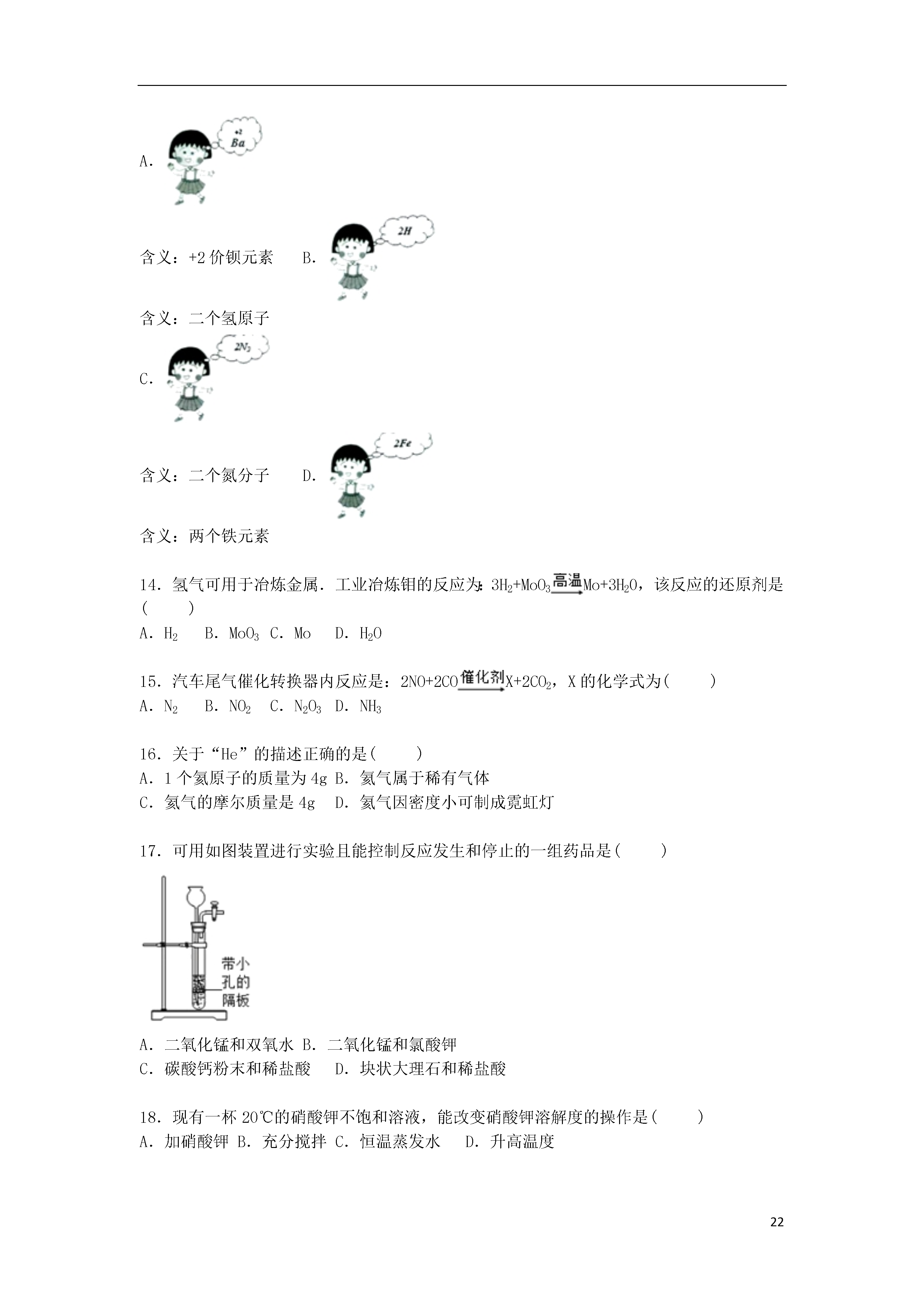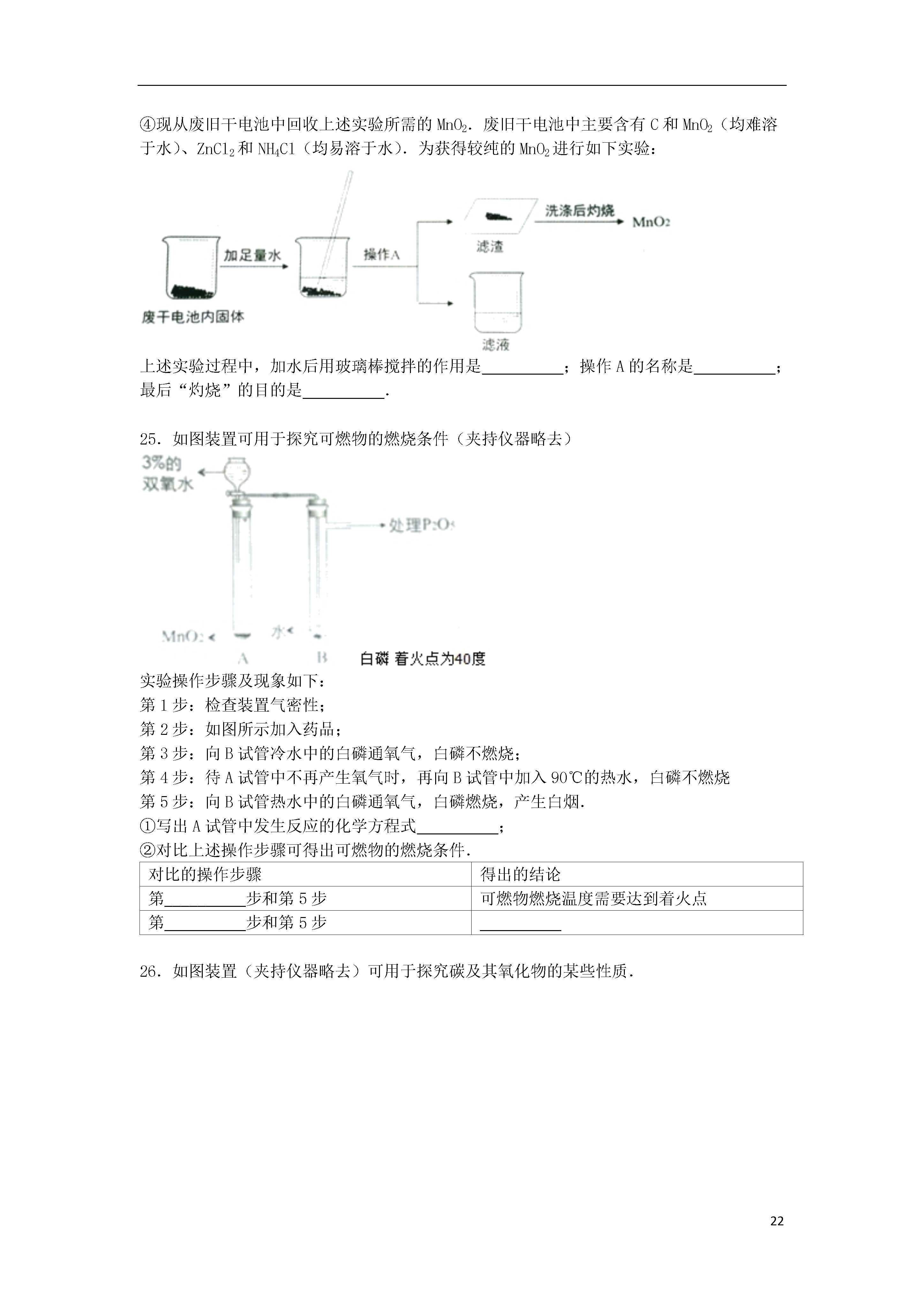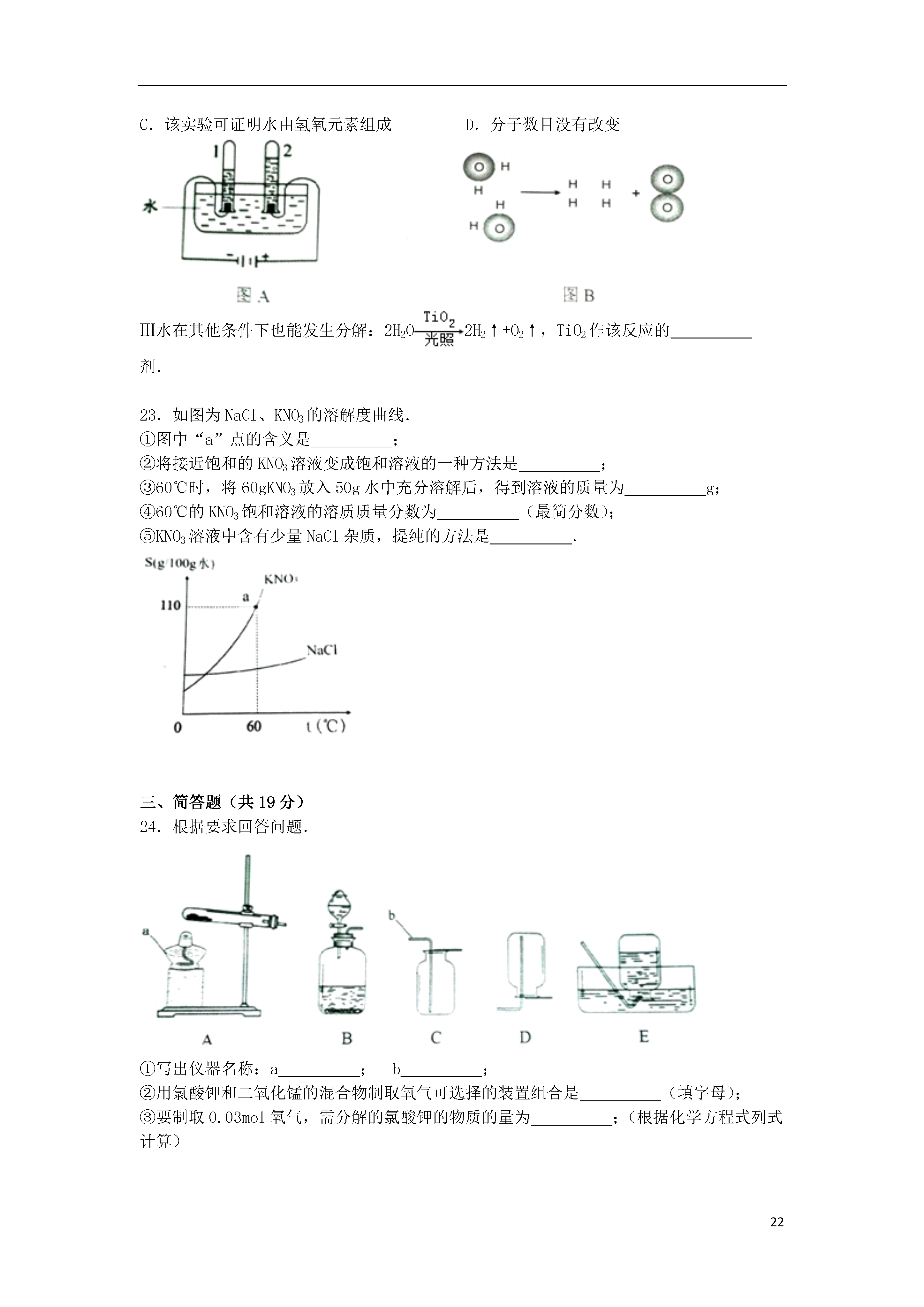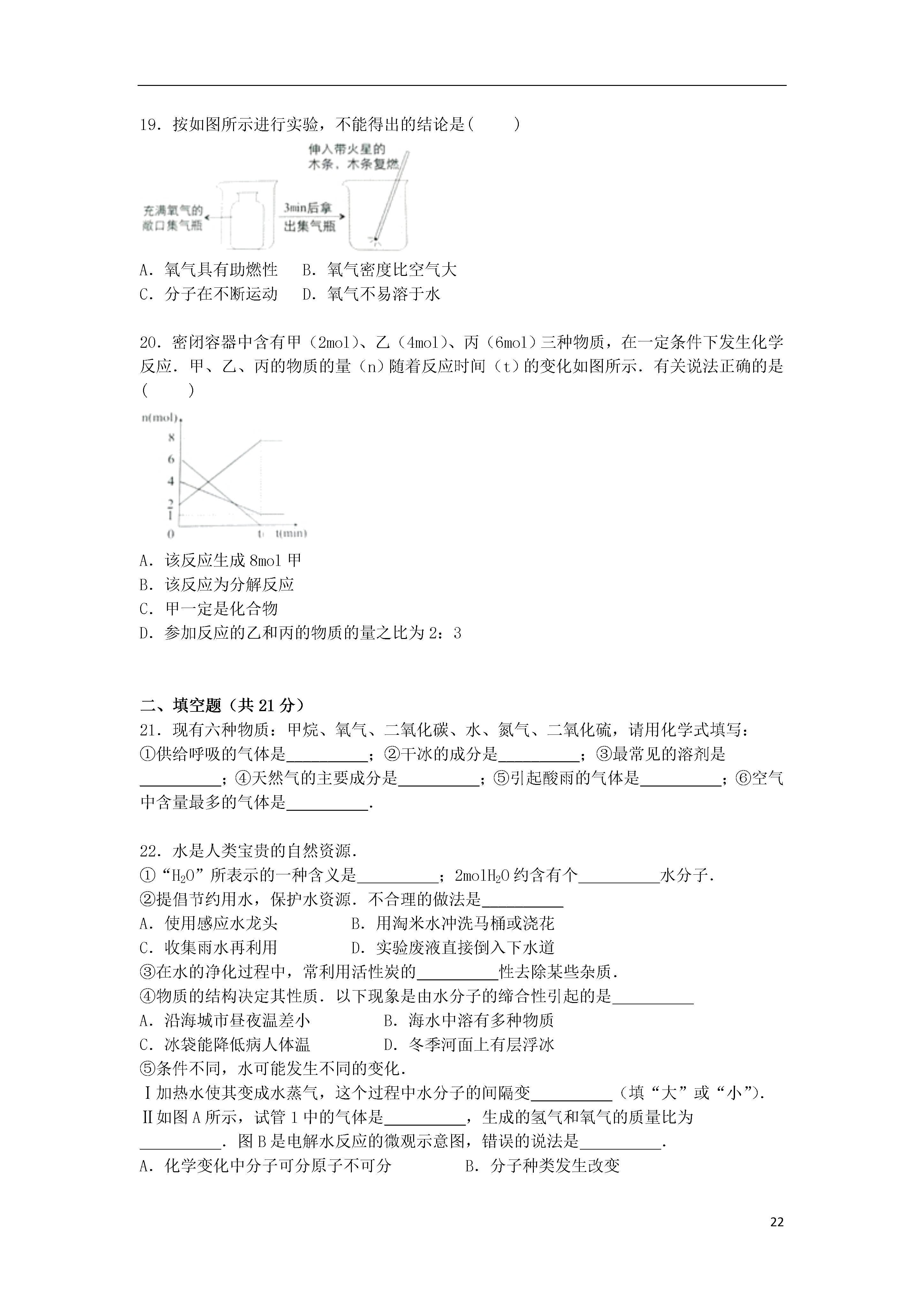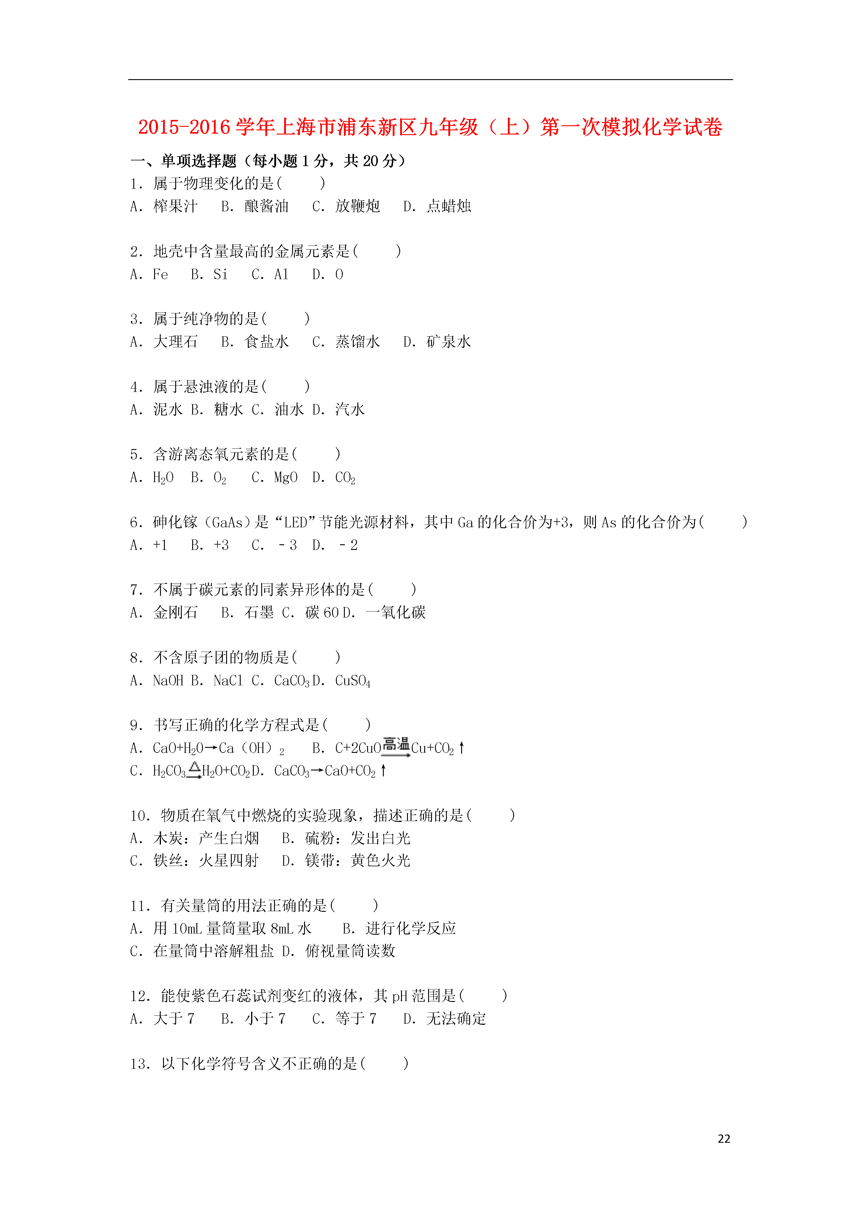 222015-2016学年上海市浦东新区九年级(上)第一次模拟化学试卷一、单项选择题(每小题1分,共20分)1.属于物理变化的是()A.榨果汁B.酿酱油C.放鞭炮D.点蜡烛2.地壳中含量最高的金属元素是()A.FeB.SiC.AlD.O3.属于纯净物的是()A.大理石B.食盐水C.蒸馏水D.矿泉水4.属于悬浊液的是()A.泥水B.糖水C.油水D.汽水5.含游离态氧元素的是()A.H2OB.O2C.MgOD.CO26.砷化镓(GaAs)是“LED”节能光源材料,其中Ga的化合价为+3,则As的化合价为()A.+1B.+3C.﹣3D.﹣27.不属于碳元素的同素异形体的是()A.金刚石B.石墨C.碳60D.一氧化碳8.不含原子团的物质是()A.NaOHB.NaClC.CaCO3D.CuSO49.书写正确的化学方程式是()A.CaO+H20→Ca(OH)2B.C+2CuOCu+CO2↑C.H2CO3H2O+CO2D.CaCO3→CaO+CO2↑10.物质在氧气中燃烧的实验现象,描述正确的是()A.木炭:产生白烟B.硫粉:发出白光C.铁丝:火星四射D.镁带:黄色火光11.有关量筒的用法正确的是()A.用10mL量筒量取8mL水B.进行化学反应C.在量筒中溶解粗盐D.俯视量筒读数12.能使紫色石蕊试剂变红的液体,其pH范围是()A.大于7B.小于7C.等于7D.无法确定13.以下化学符号含义不正确的是()A.含义:+2价钡元素B.含义:二个氢原子C.含义:二个氮分子D.含义:两个铁元素14.氢气可用于冶炼金属.工业冶炼钼的反应为:3H2+MoO3Mo+3H20,该反应的还原剂是()A.H2B.MoO3C.MoD.H2O15.汽车尾气催化转换器内反应是:2NO+2COX+2CO2,X的化学式为()A.N2B.NO2C.N2O3D.NH316.关于“He”的描述正确的是()A.1个氦原子的质量为4gB.氦气属于稀有气体C.氦气的摩尔质量是4gD.氦气因密度小可制成霓虹灯17.可用如图装置进行实验且能控制反应发生和停止的一组药品是()A.二氧化锰和双氧水B.二氧化锰和氯酸钾C.碳酸钙粉末和稀盐酸D.块状大理石和稀盐酸18.现有一杯20℃的硝酸钾不饱和溶液,能改变硝酸钾溶解度的操作是()A.加硝酸钾B.充分搅拌C.恒温蒸发水D.升高温度19.按如图所示进行实验,不能得出的结论是()A.氧气具有助燃性B.氧气密度比空气大C.分子在不断运动D.氧气不易溶于水20.密闭容器中含有甲(2mol)、乙(4mol)、丙(6mol)三种物质,在一定条件下发生化学反应.甲、乙、丙的物质的量(n)随着反应时间(t)的变化如图所示.有关说法正确的是()A.该反应生成8mol甲B.该反应为分解反应C.甲一定是化合物D.参加反应的乙和丙的物质的量之比为2:3二、填空题(共21分)21.现有六种物质:甲烷、氧气、二氧化碳、水、氮气、二氧化硫,请用化学式填写:①供给呼吸的气体是__________;②干冰的成分是__________;③最常见的溶剂是__________;④天然气的主要成分是__________;⑤引起酸雨的气体是__________;⑥空气中含量最多的气体是__________.22.水是人类宝贵的自然资源.①“H2O”所表示的一种含义是__________;2molH2O约含有个__________水分子.②提倡节约用水,保护水资源.不合理的做法是__________A.使用感应水龙头B.用淘米水冲洗马桶或浇花C.收集雨水再利用D.实验废液直接倒入下水道③在水的净化过程中,常利用活性炭的__________性去除某些杂质.④物质的结构决定其性质.以下现象是由水分子的缔合性引起的是__________A.沿海城市昼夜温差小B.海水中溶有多种物质C.冰袋能降低病人体温D.冬季河面上有层浮冰⑤条件不同,水可能发生不同的变化.Ⅰ加热水使其变成水蒸气,这个过程中水分子的间隔变__________(填“大”或“小”).Ⅱ如图A所示,试管1中的气体是__________,生成的氢气和氧气的质量比为__________.图B是电解水反应的微观示意图,错误的说法是__________.A.化学变化中分子可分原子不可分B.分子种类发生改变C.该实验可证明水由氢氧元素组成D.分子数目没有改变Ⅲ水在其他条件下也能发生分解:2H2O2H2↑+O2↑,TiO2作该反应的__________剂.23.如图为NaCl、KNO3的溶解度曲线.①图中“a”点的含义是____