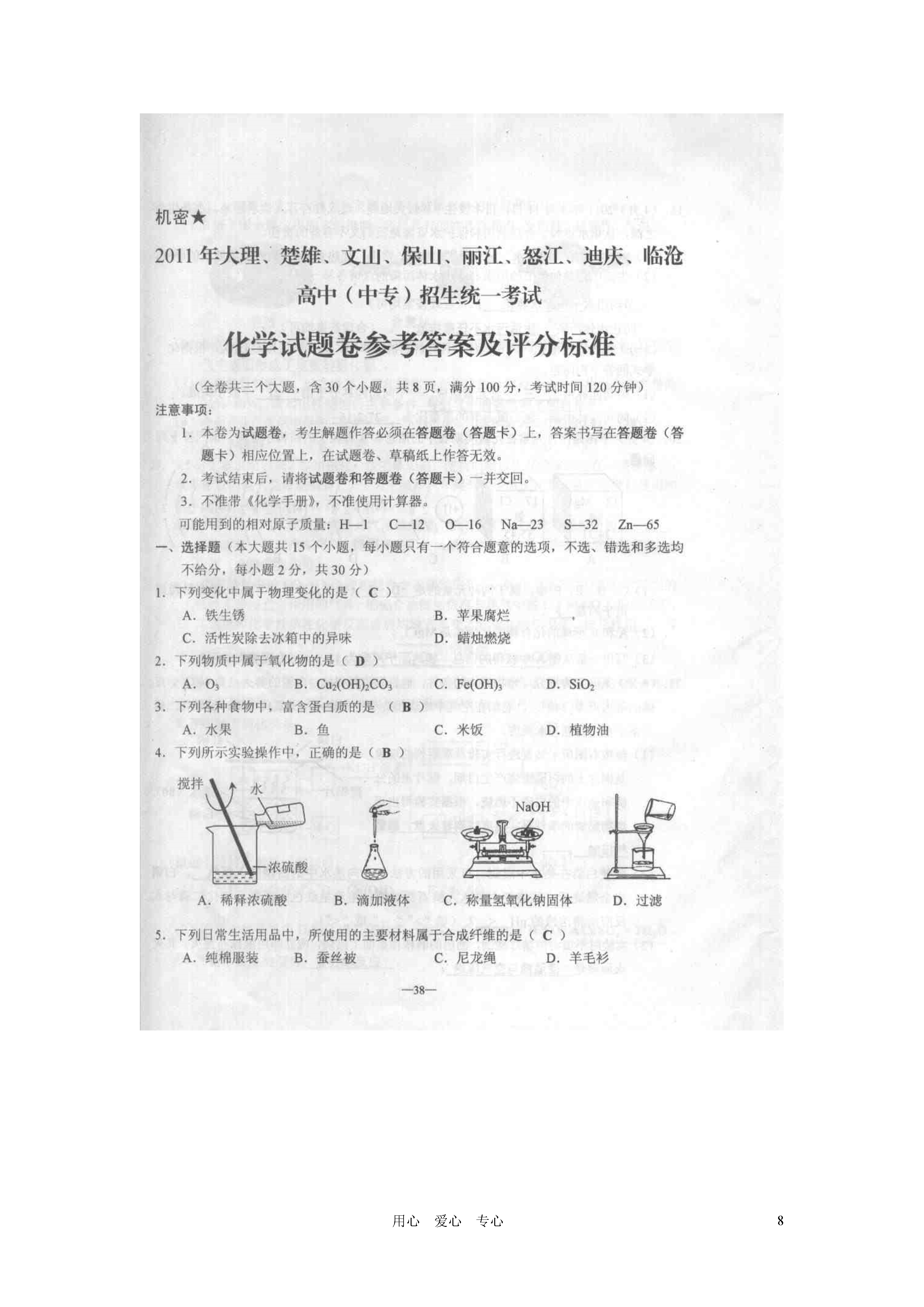 云南省大理、楚雄、文山、保山、丽江、怒江、迪庆、临沧高中 2011年中考化学真题试卷(扫描版).doc