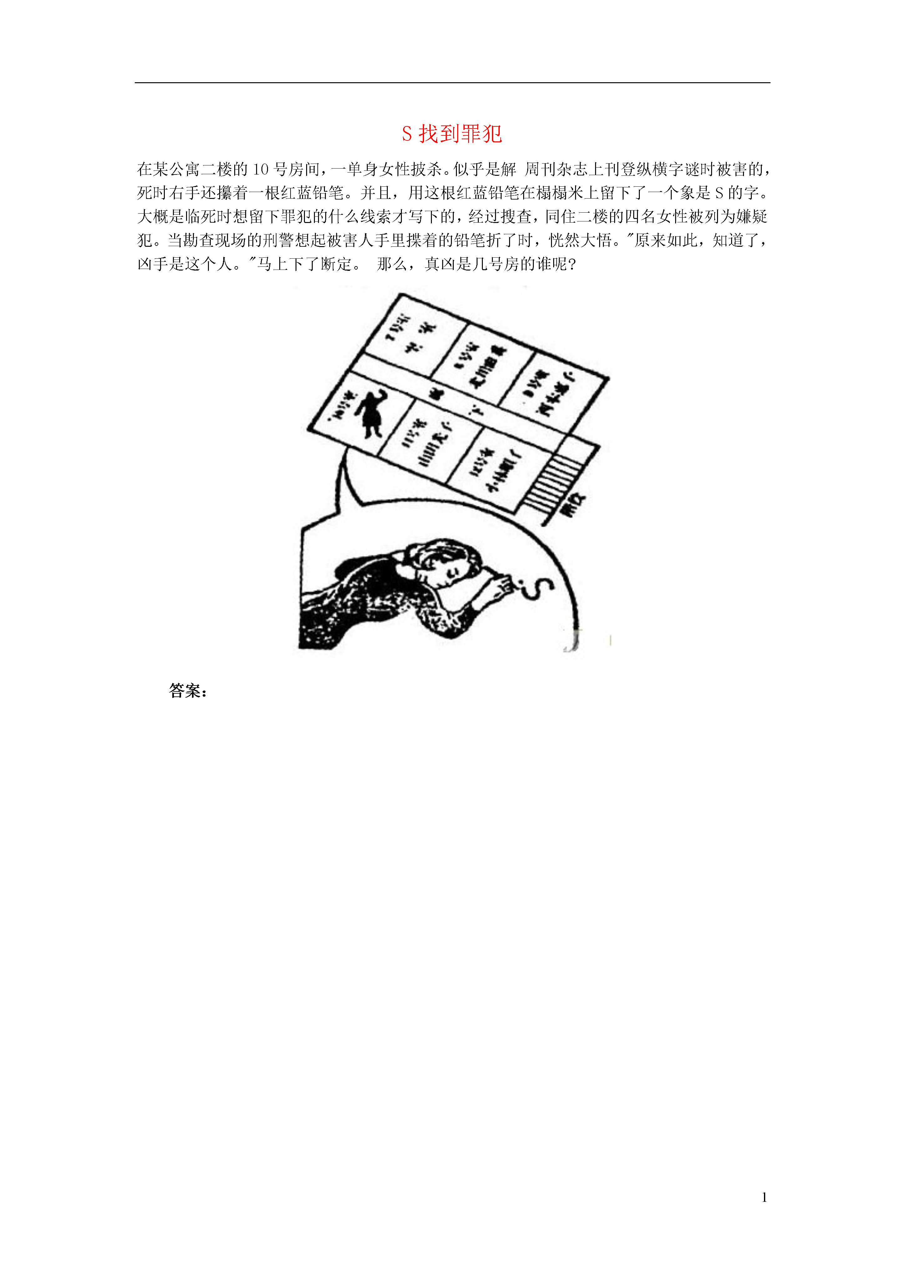 1S找到罪犯在某公寓二楼的10号房间,一单身女性披杀。似乎是解周刊杂志上刊登纵横字谜时被害的,死时右手还攥着一根红蓝铅笔。并且,用这根红蓝铅笔在榻榻米上留下了一个象是S的字。大概是临死时想留下罪犯的什么线索才写下的,经过搜查,同住二楼的四名女性被列为嫌疑犯。当勘查现场的刑警想起被害人手里揲着的铅笔折了时,恍然大悟。"原来如此,知道了,凶手是这个人。"马上下了断定。那么,真凶是几号房的谁呢?答案: