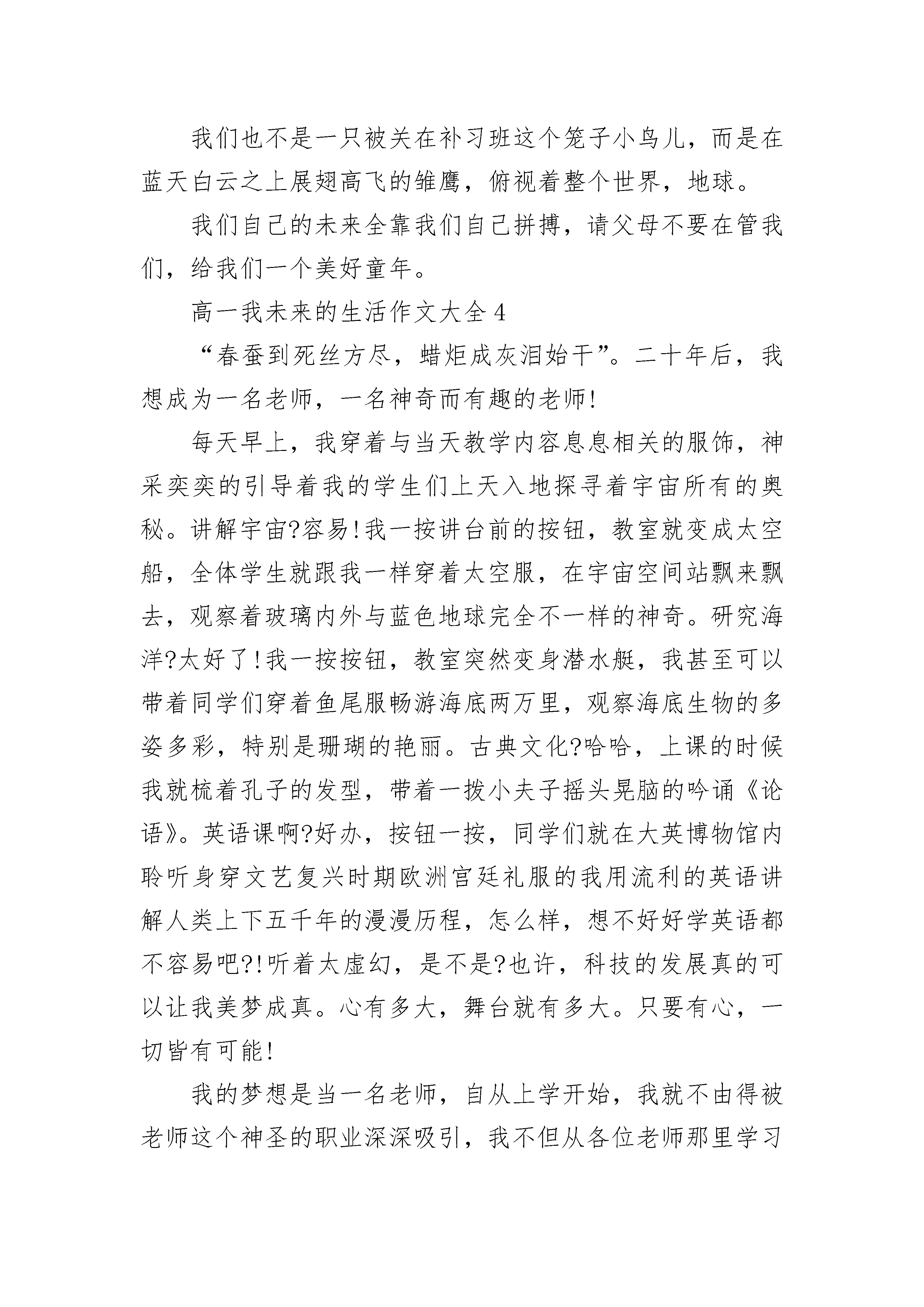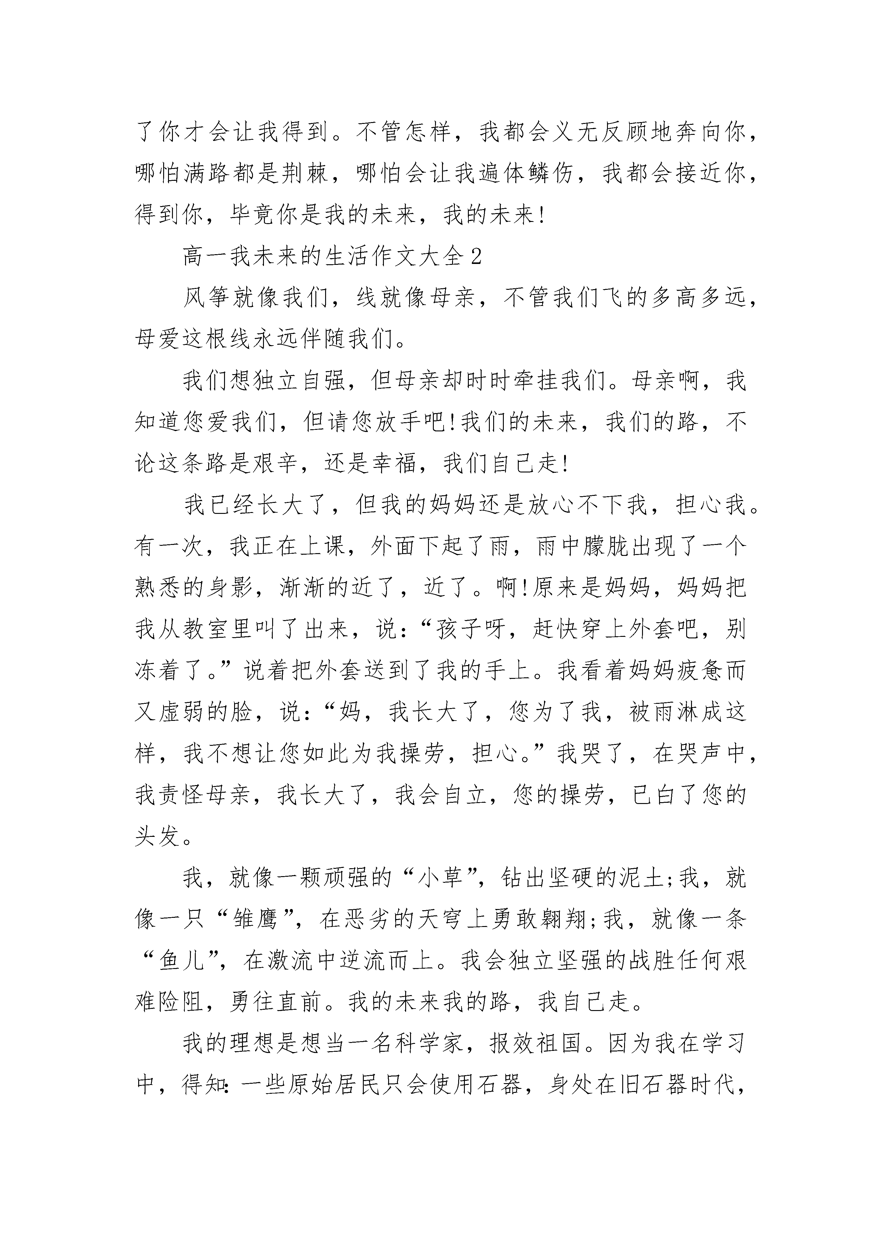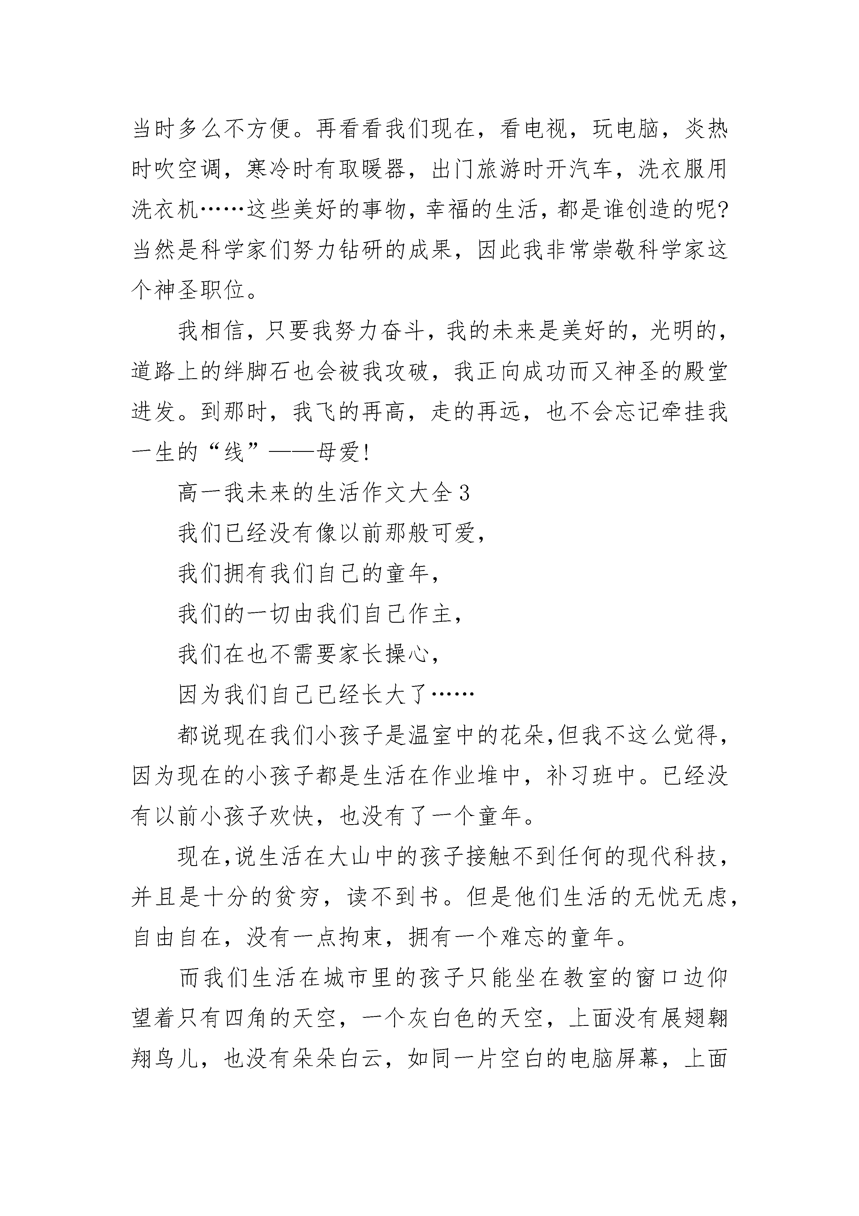 高一我未来的生活作文“我知道我的未来不是梦,我认真的过每一分钟,我的未来不是梦,我的心跟着希望在动……”一首耳熟能详的歌曲,谱写出了多少个人坚持梦想不放弃,描绘出了多少个人坚定自己的路不后悔。我也知道啊,我的未来不是梦,但是前提是我得认真的过每一分钟,让心跟着希望跳动,就似歌词里说的一样。小时候,常常45°角仰望天空,望着一片一片的云彩飘过,他们也去找寻自己的梦啊!下雨的时候便常常透过玻璃看雨滴落下,他们也来人间找寻自己的梦啊!小小的蚂蚁也自己的梦,他们也都一直在找寻着找寻着!一棵棵小树苗也有梦啊,他们也一直在坚持着自己的梦!连马路也有自己的梦,他们都在为自己的梦努力着!我也有梦啊,我那小小的梦装在小小的脑子里,一点点慢慢的发芽。渐渐地,我也长大了啊,随着我那小小的梦,一起长大。为了我的梦,一直在不断的做着努力啊。从一个任性的孩子变成了一个懂事的小大人,从一个不爱读书的孩子变成了一个喜欢学习的小大人。现在我一直在好好学习,为的是证明我的未来并不是梦啊!中华上下五千年,多少人都在找寻着自己的梦啊。上到一国之君,下到平民百姓,都有自己的梦。不在乎大小,不在乎轻重,在乎的是实现梦。我的未来,我知道你就在我的前面,就在我的身边,不是遥不可及,而是触手可得,可是你也要我付出。只有付出了你才会让我得到。不管怎样,我都会义无反顾地奔向你,哪怕满路都是荆棘,哪怕会让我遍体鳞伤,我都会接近你,得到你,毕竟你是我的未来,我的未来!高一我未来的生活作文大全2风筝就像我们,线就像母亲,不管我们飞的多高多远,母爱这根线永远伴随我们。我们想独立自强,但母亲却时时牵挂我们。母亲啊,我知道您爱我们,但请您放手吧!我们的未来,我们的路,不论这条路是艰辛,还是幸福,我们自己走!我已经长大了,但我的妈妈还是放心不下我,担心我。有一次,我正在上课,外面下起了雨,雨中朦胧出现了一个熟悉的身影,渐渐的近了,近了。啊!原来是妈妈,妈妈把我从教室里叫了出来,说:“孩子呀,赶快穿上外套吧,别冻着了。”说着把外套送到了我的手上。我看着妈妈疲惫而又虚弱的脸,说:“妈,我长大了,您为了我,被雨淋成这样,我不想让您如此为我操劳,担心。”我哭了,在哭声中,我责怪母亲,我长大了,我会自立,您的操劳,已白了您的头发。我,就像一颗顽强的“小草”,钻出坚硬的泥土;我,就像一只“雏鹰”,在恶劣的天穹上勇敢翱翔;我,就像一条“鱼儿”,在激流中逆流而上。我会独立坚强的战胜任何艰难险阻,勇往直前。我的未来我的路,我自己走。我的理想是想当一名科学家,报效祖国。因为我在学习中,得知:一些原始居民只会使用石器,身处在旧石器时代,当时多么不方便。再看看我们现在,看电视,玩电脑,炎热时吹空调,寒冷时有取暖器,出门旅游时开汽车,洗衣服用洗衣机……这些美好的事物,幸福的生活,都是谁创造的呢?当然是科学家们努力钻研的成果,因此我非常崇敬科学家这个神圣职位。我相信,只要我努力奋斗,我的未来是美好的,光明的,道路上的绊脚石也会被我攻破,我正向成功而又神圣的殿堂进发。到那时,我飞的再高,走的再远,也不会忘记牵挂我一生的“线”——母爱!高一我未来的生活作文大全3我们已经没有像以前那般可爱,我们拥有我们自己的童年,我们的一切由我们自己作主,我们在也不需要家长操心,因为我们自己已经长大了……都说现在我们小孩子是温室中的花朵,但我不这么觉得,因为现在的小孩子都是生活在作业堆中,补习班中。已经没有以前小孩子欢快,也没有了一个童年。现在,说生活在大山中的孩子接触不到任何的现代科技,并且是十分的贫穷,读不到书。但是他们生活的无忧无虑,自由自在,没有一点拘束,拥有一个难忘的童年。而我们生活在城市里的孩子只能坐在教室的窗口边仰望着只有四角的天空,一个灰白色的天空,上面没有展翅翱翔鸟儿,也没有朵朵白云,如同一片空白的电脑屏幕,上面没有任何东西。或只能坐在家里院子里遥望被大楼挡的只有一点的白色天空。也可以说现在的小孩子是一个个的蜗牛,书包就是那个蜗牛壳,那个里面装满了书籍,辅导书的书包,压的我们抬不起来肩,渐渐成了驼背。所以不要说农村的孩子苦,因为他们有我们用千金都换不到的东西-----快乐,自由……我们要有一个快乐的童年,拥有一个令自己长大以后都值得怀念的美好童年。又有一些家长会说,这样会使自己的孩子直接的输在起跑线上,被远远的甩在后面,到时候想追也追不到了。是这样,但这比一个孩子的心理是留下美好的回忆,还是内心深处的阴影。就是因为现在的竞争十分的强烈,所以才会有那么多的家长给孩子报那么多的补习班,哪个家长会希望自己的孩子比别人的孩子学习成绩差呢?但是家长们从来没有想过孩子们的想法只是一味给他们报各种各样的补习班,却没有报一些兴趣爱好班,让孩子们的生活枯燥,乏味,就像一篇作文里没有一点的修辞手法,一点好词好句。家长不是孩子的秘书,也不是他