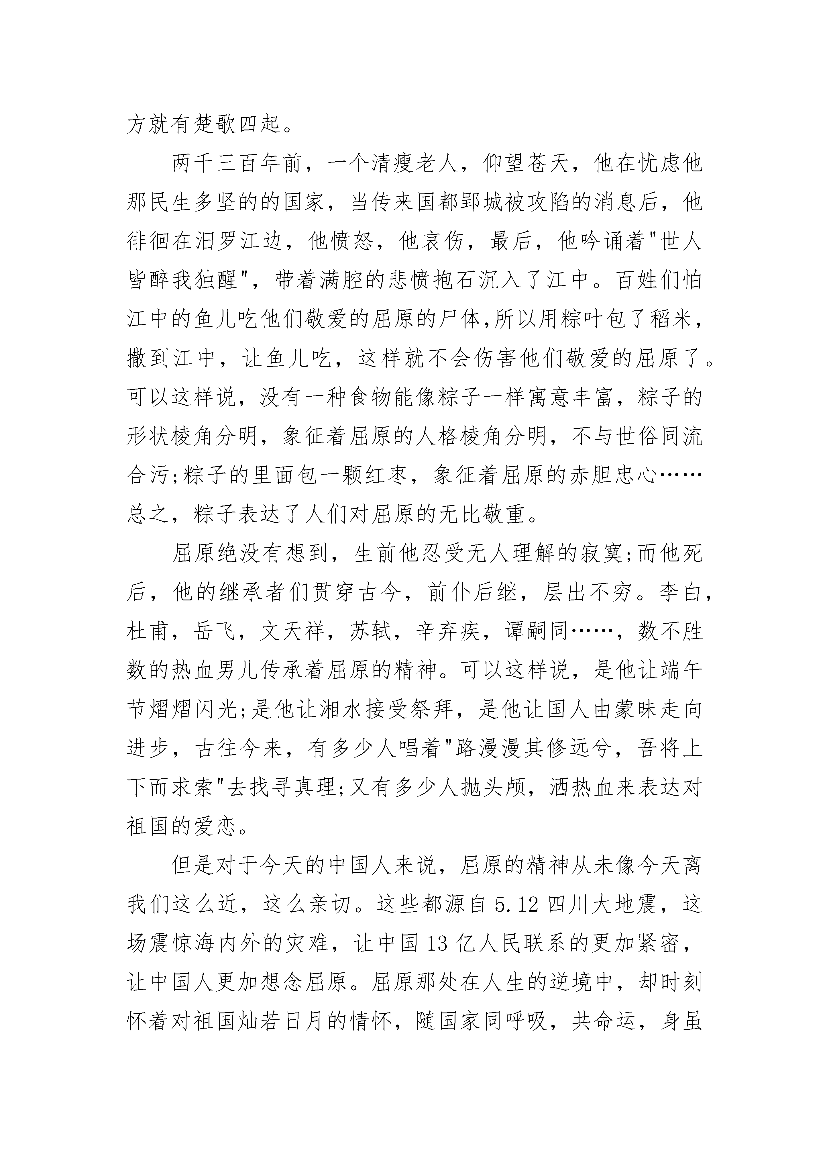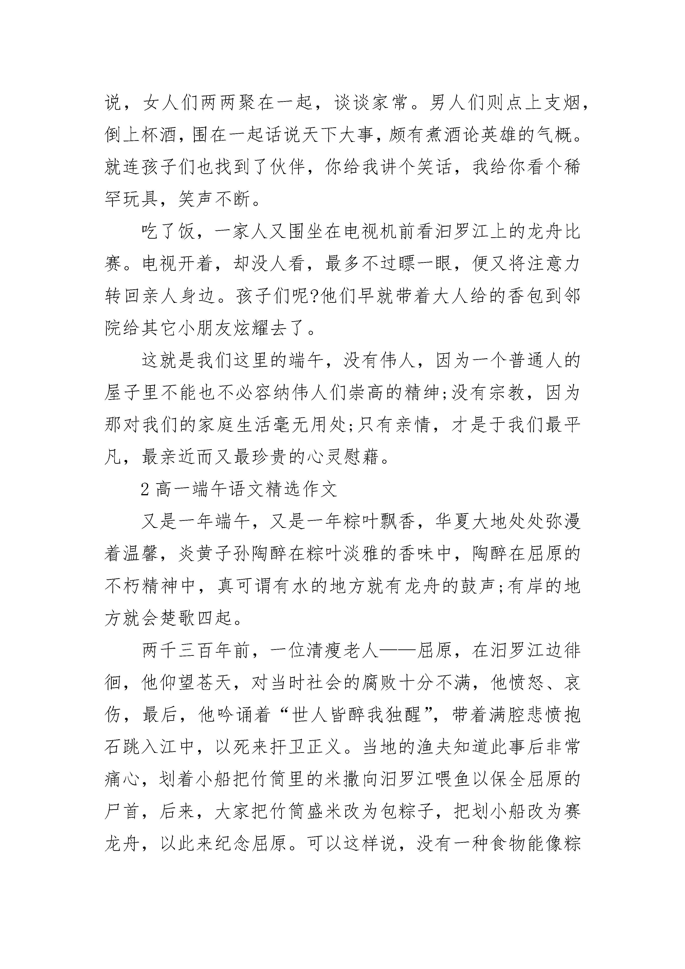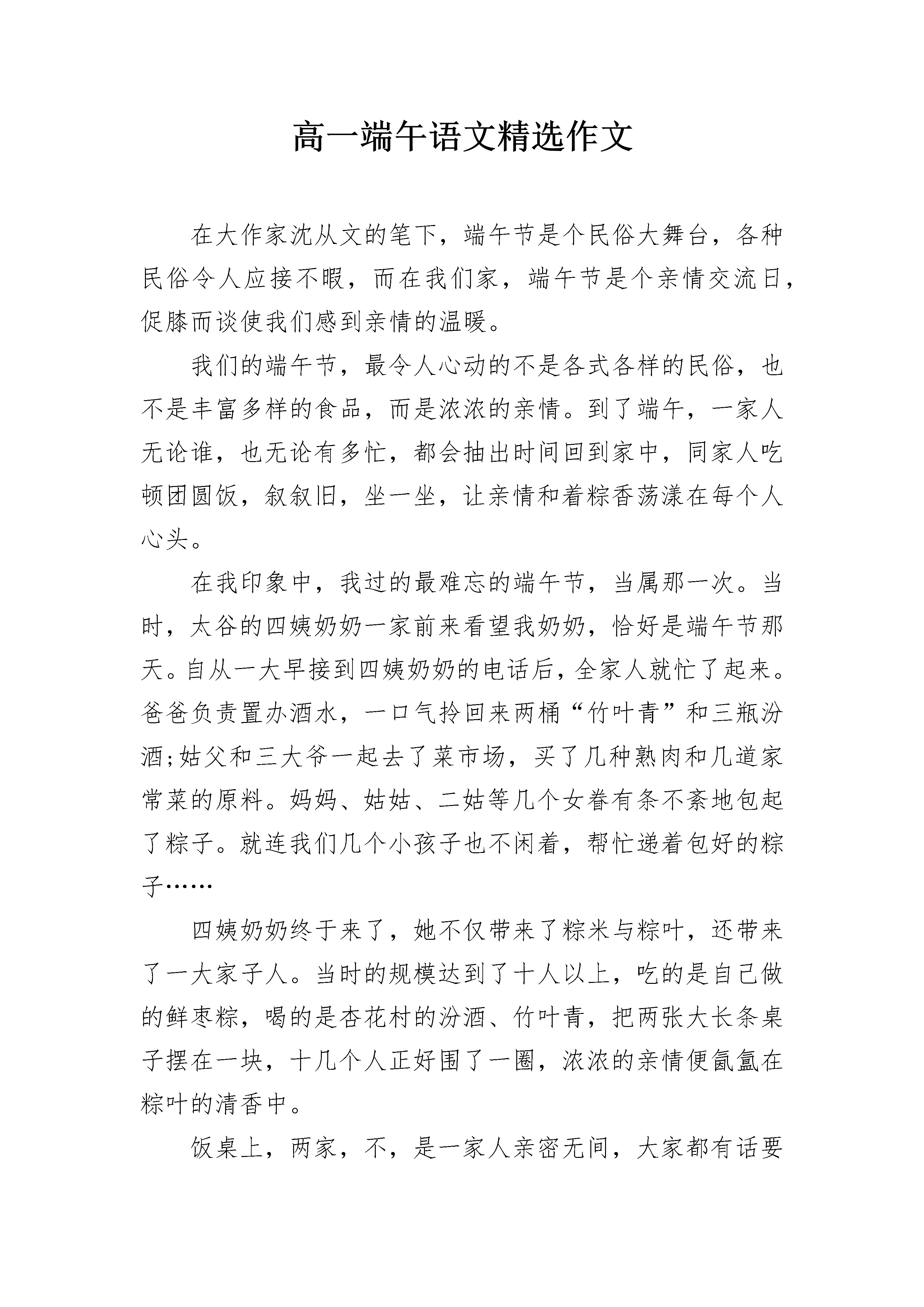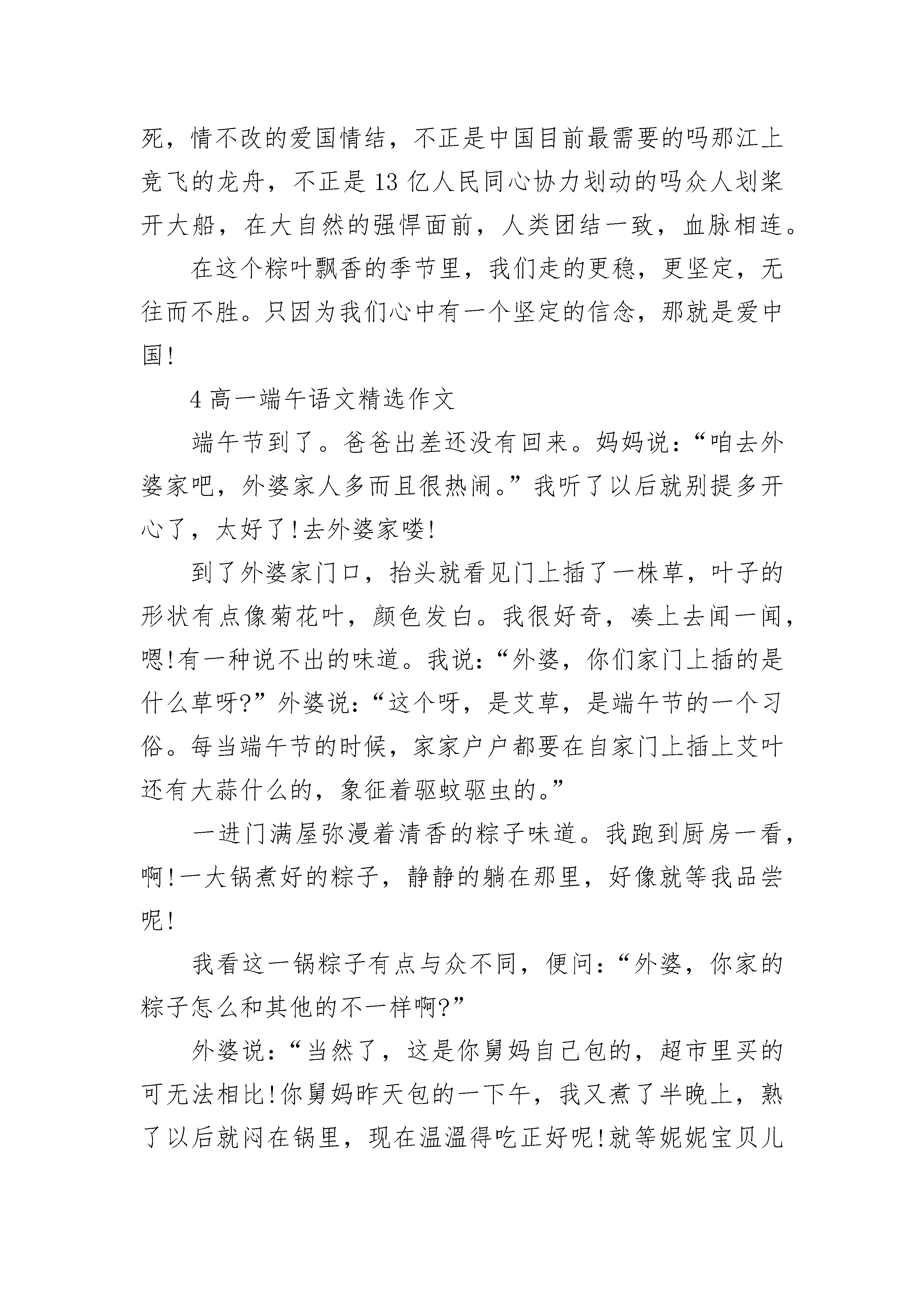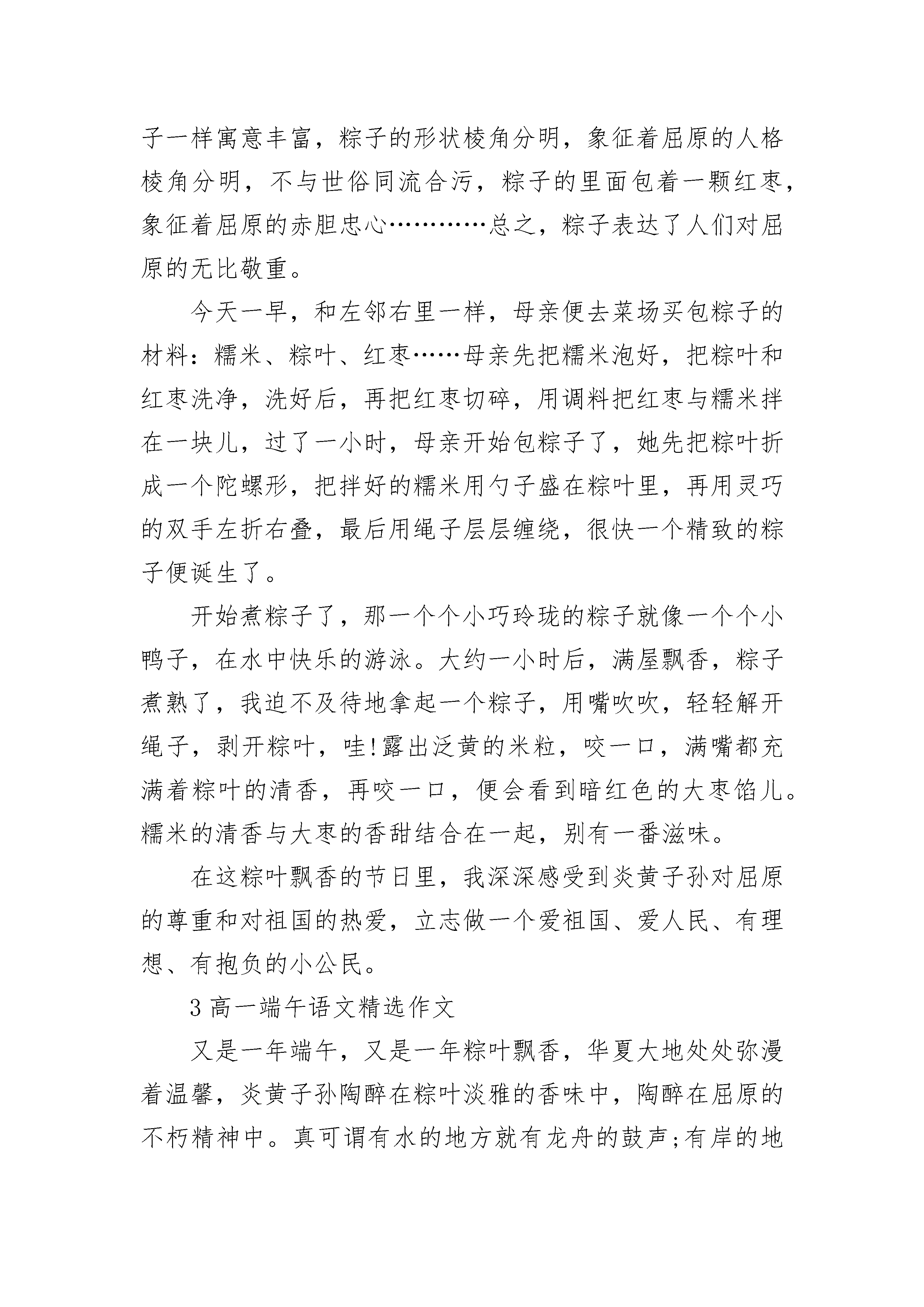 高一端午语文精选作文在大作家沈从文的笔下,端午节是个民俗大舞台,各种民俗令人应接不暇,而在我们家,端午节是个亲情交流日,促膝而谈使我们感到亲情的温暖。我们的端午节,最令人心动的不是各式各样的民俗,也不是丰富多样的食品,而是浓浓的亲情。到了端午,一家人无论谁,也无论有多忙,都会抽出时间回到家中,同家人吃顿团圆饭,叙叙旧,坐一坐,让亲情和着粽香荡漾在每个人心头。在我印象中,我过的最难忘的端午节,当属那一次。当时,太谷的四姨奶奶一家前来看望我奶奶,恰好是端午节那天。自从一大早接到四姨奶奶的电话后,全家人就忙了起来。爸爸负责置办酒水,一口气拎回来两桶“竹叶青”和三瓶汾酒;姑父和三大爷一起去了菜市场,买了几种熟肉和几道家常菜的原料。妈妈、姑姑、二姑等几个女眷有条不紊地包起了粽子。就连我们几个小孩子也不闲着,帮忙递着包好的粽子……四姨奶奶终于来了,她不仅带来了粽米与粽叶,还带来了一大家子人。当时的规模达到了十人以上,吃的是自己做的鲜枣粽,喝的是杏花村的汾酒、竹叶青,把两张大长条桌子摆在一块,十几个人正好围了一圈,浓浓的亲情便氤氲在粽叶的清香中。饭桌上,两家,不,是一家人亲密无间,大家都有话要说,女人们两两聚在一起,谈谈家常。男人们则点上支烟,倒上杯酒,围在一起话说天下大事,颇有煮酒论英雄的气概。就连孩子们也找到了伙伴,你给我讲个笑话,我给你看个稀罕玩具,笑声不断。吃了饭,一家人又围坐在电视机前看汩罗江上的龙舟比赛。电视开着,却没人看,最多不过瞟一眼,便又将注意力转回亲人身边。孩子们呢?他们早就带着大人给的香包到邻院给其它小朋友炫耀去了。这就是我们这里的端午,没有伟人,因为一个普通人的屋子里不能也不必容纳伟人们崇高的精绅;没有宗教,因为那对我们的家庭生活毫无用处;只有亲情,才是于我们最平凡,最亲近而又最珍贵的心灵慰藉。2高一端午语文精选作文又是一年端午,又是一年粽叶飘香,华夏大地处处弥漫着温馨,炎黄子孙陶醉在粽叶淡雅的香味中,陶醉在屈原的不朽精神中,真可谓有水的地方就有龙舟的鼓声;有岸的地方就会楚歌四起。两千三百年前,一位清瘦老人——屈原,在汨罗江边徘徊,他仰望苍天,对当时社会的腐败十分不满,他愤怒、哀伤,最后,他吟诵着“世人皆醉我独醒”,带着满腔悲愤抱石跳入江中,以死来扞卫正义。当地的渔夫知道此事后非常痛心,划着小船把竹筒里的米撒向汨罗江喂鱼以保全屈原的尸首,后来,大家把竹筒盛米改为包粽子,把划小船改为赛龙舟,以此来纪念屈原。可以这样说,没有一种食物能像粽子一样寓意丰富,粽子的形状棱角分明,象征着屈原的人格棱角分明,不与世俗同流合污,粽子的里面包着一颗红枣,象征着屈原的赤胆忠心…………总之,粽子表达了人们对屈原的无比敬重。今天一早,和左邻右里一样,母亲便去菜场买包粽子的材料:糯米、粽叶、红枣……母亲先把糯米泡好,把粽叶和红枣洗净,洗好后,再把红枣切碎,用调料把红枣与糯米拌在一块儿,过了一小时,母亲开始包粽子了,她先把粽叶折成一个陀螺形,把拌好的糯米用勺子盛在粽叶里,再用灵巧的双手左折右叠,最后用绳子层层缠绕,很快一个精致的粽子便诞生了。开始煮粽子了,那一个个小巧玲珑的粽子就像一个个小鸭子,在水中快乐的游泳。大约一小时后,满屋飘香,粽子煮熟了,我迫不及待地拿起一个粽子,用嘴吹吹,轻轻解开绳子,剥开粽叶,哇!露出泛黄的米粒,咬一口,满嘴都充满着粽叶的清香,再咬一口,便会看到暗红色的大枣馅儿。糯米的清香与大枣的香甜结合在一起,别有一番滋味。在这粽叶飘香的节日里,我深深感受到炎黄子孙对屈原的尊重和对祖国的热爱,立志做一个爱祖国、爱人民、有理想、有抱负的小公民。3高一端午语文精选作文又是一年端午,又是一年粽叶飘香,华夏大地处处弥漫着温馨,炎黄子孙陶醉在粽叶淡雅的香味中,陶醉在屈原的不朽精神中。真可谓有水的地方就有龙舟的鼓声;有岸的地方就有楚歌四起。两千三百年前,一个清瘦老人,仰望苍天,他在忧虑他那民生多坚的的国家,当传来国都郢城被攻陷的消息后,他徘徊在汨罗江边,他愤怒,他哀伤,最后,他吟诵着"世人皆醉我独醒",带着满腔的悲愤抱石沉入了江中。百姓们怕江中的鱼儿吃他们敬爱的屈原的尸体,所以用粽叶包了稻米,撒到江中,让鱼儿吃,这样就不会伤害他们敬爱的屈原了。可以这样说,没有一种食物能像粽子一样寓意丰富,粽子的形状棱角分明,象征着屈原的人格棱角分明,不与世俗同流合污;粽子的里面包一颗红枣,象征着屈原的赤胆忠心……总之,粽子表达了人们对屈原的无比敬重。屈原绝没有想到,生前他忍受无人理解的寂寞;而他死后,他的继承者们贯穿古今,前仆后继,层出不穷。李白,杜甫,岳飞,文天祥,苏轼,辛弃疾,谭嗣同……,数不胜数的热血男儿传承着屈原的精神。可以这样说,是他让端午节熠熠闪光;是他让湘水接受祭拜,是他让国人由蒙昧走向进步,古往今来,有多少人唱着"路漫漫其修远兮,吾将上