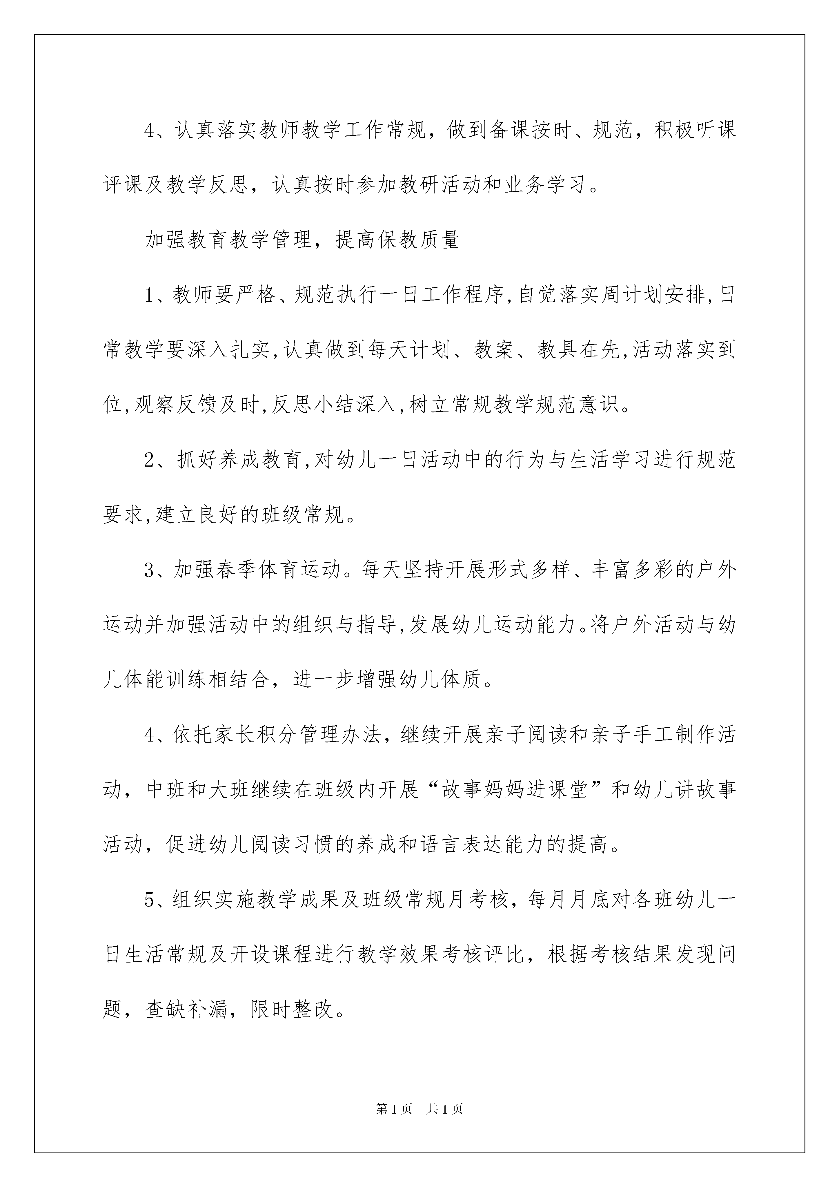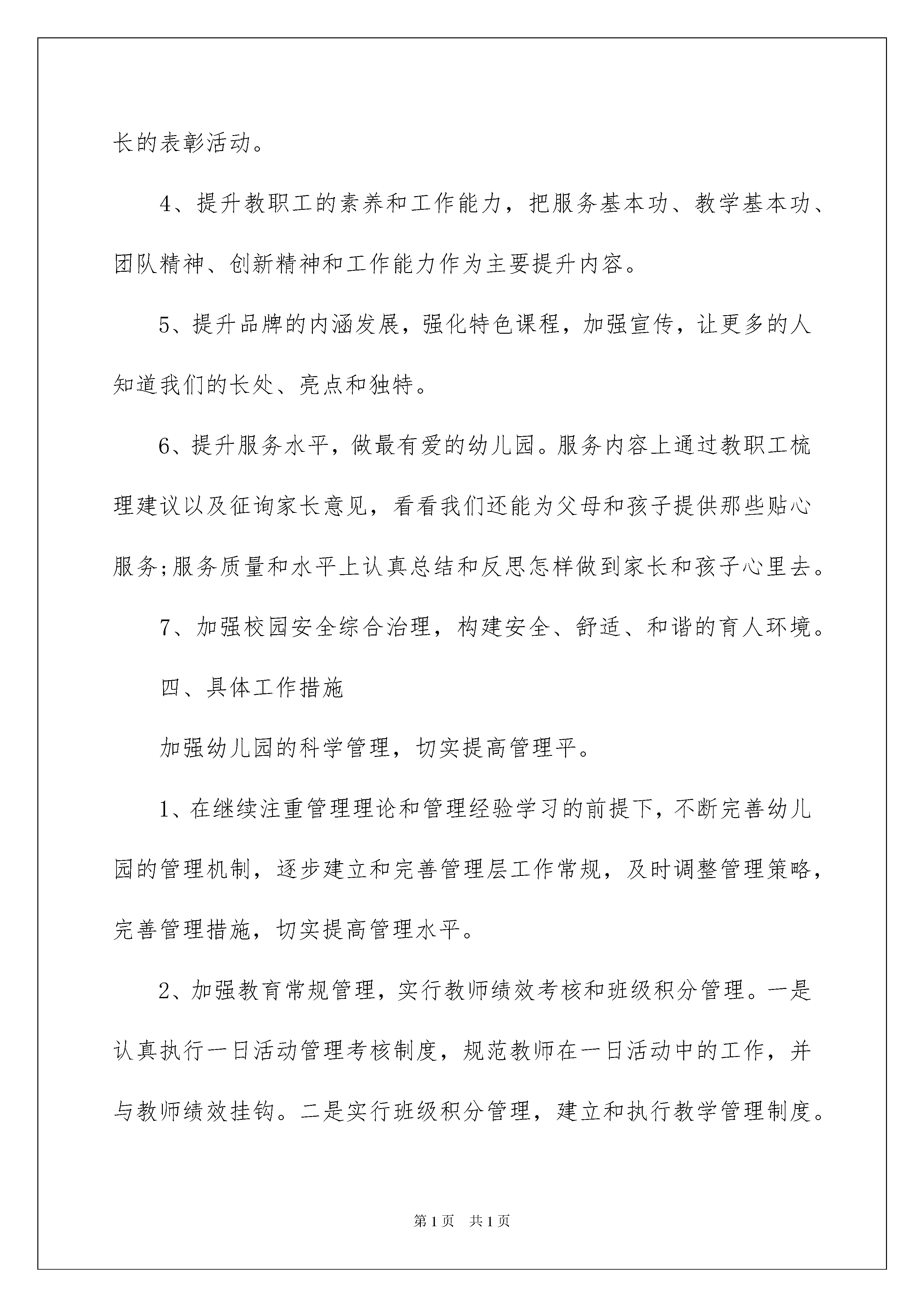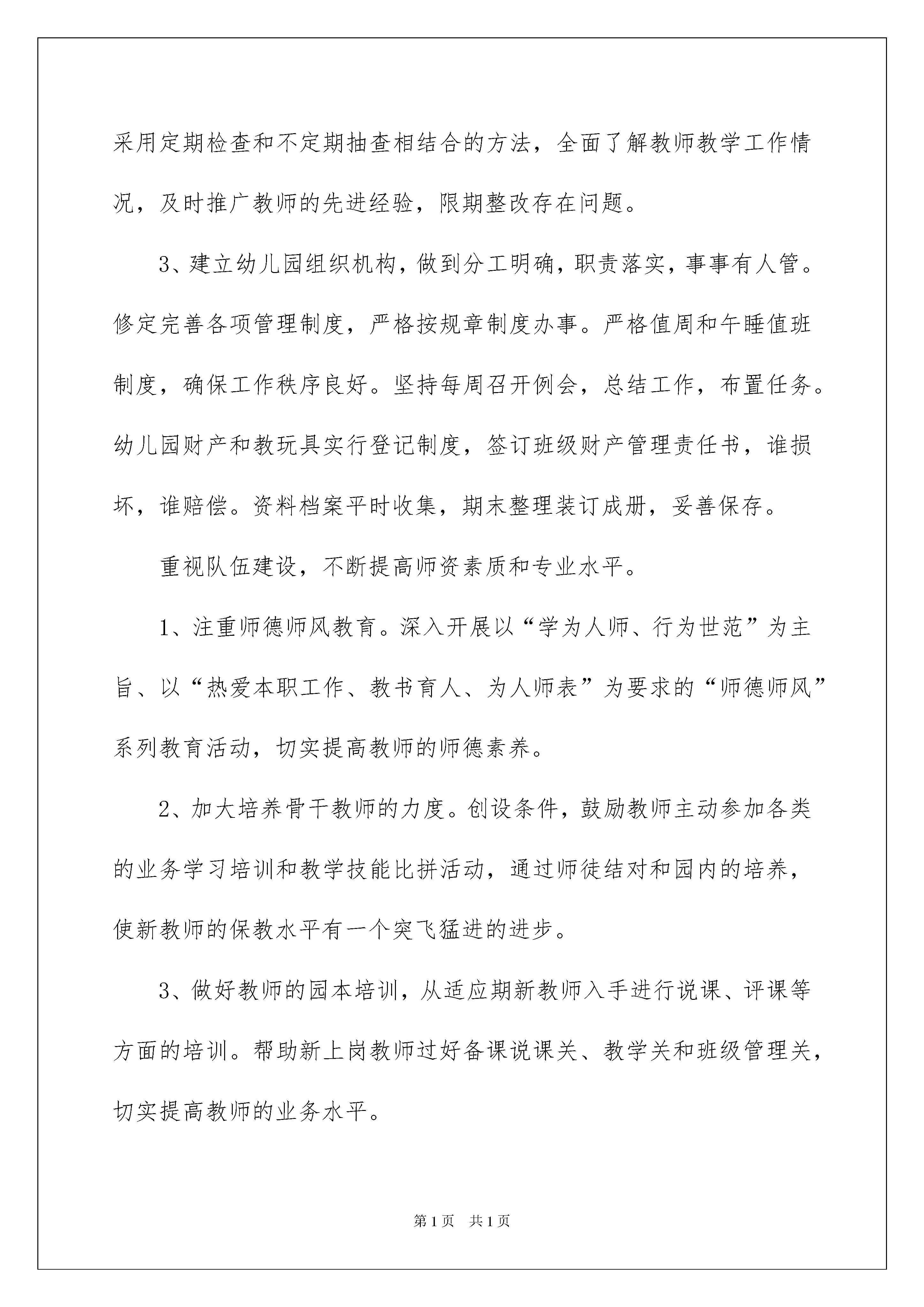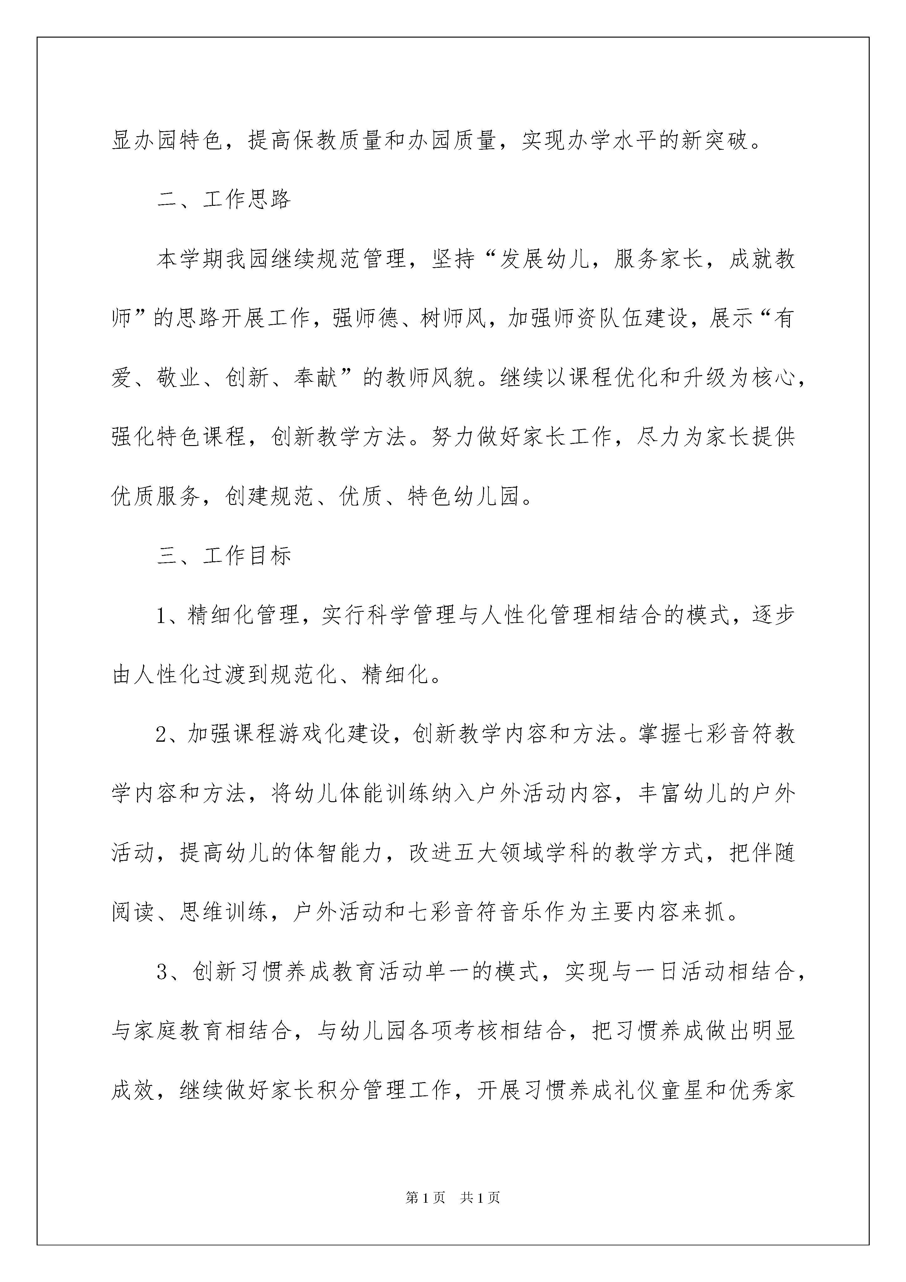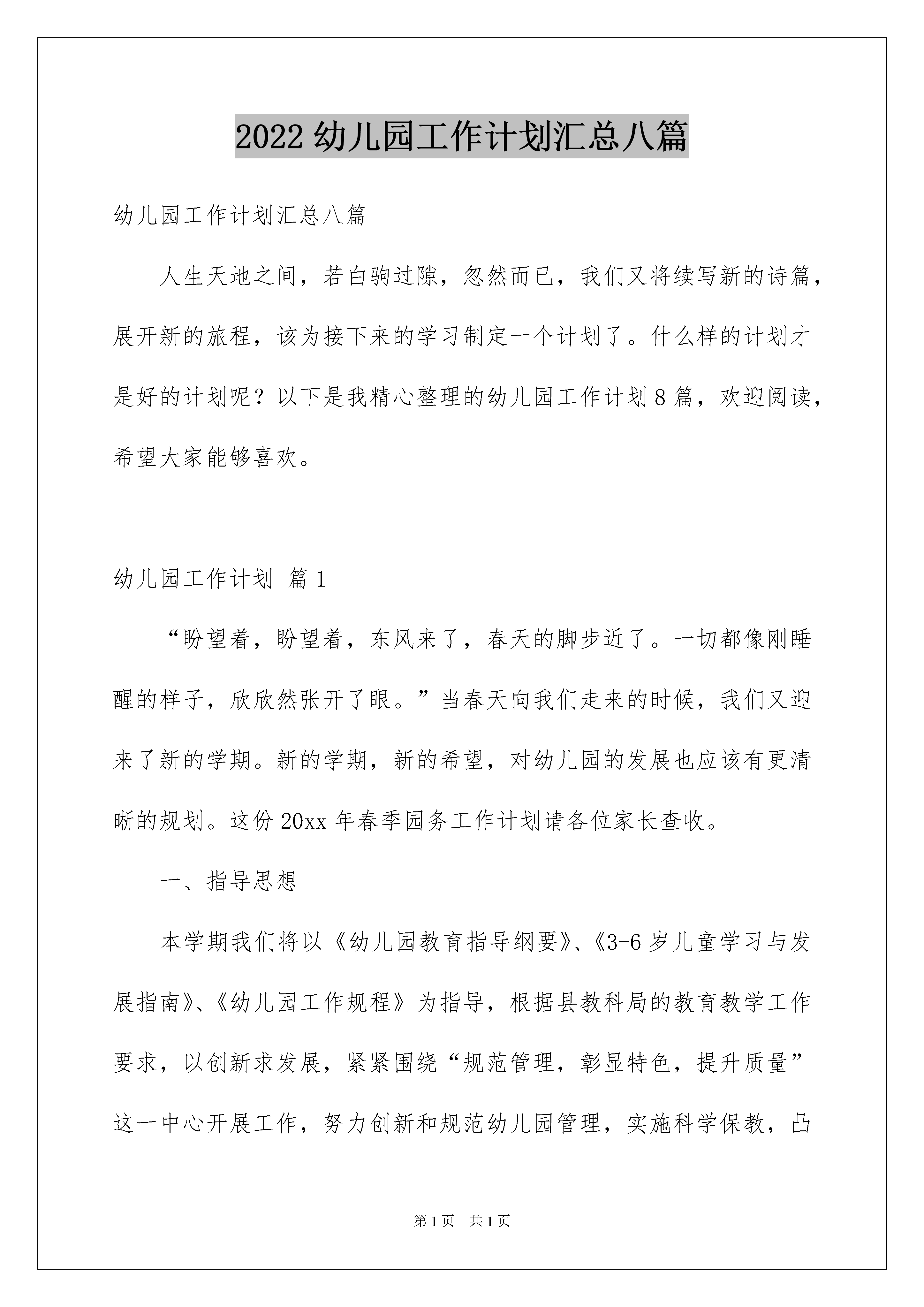 2022幼儿园工作计划汇总八篇幼儿园工作计划汇总八篇人生天地之间,若白驹过隙,忽然而已,我们又将续写新的诗篇,展开新的旅程,该为接下来的学习制定一个计划了。什么样的计划才是好的计划呢?以下是我精心整理的幼儿园工作计划8篇,欢迎阅读,希望大家能够喜欢。幼儿园工作计划篇1“盼望着,盼望着,东风来了,春天的脚步近了。一切都像刚睡醒的样子,欣欣然张开了眼。”当春天向我们走来的时候,我们又迎来了新的学期。新的学期,新的希望,对幼儿园的发展也应该有更清晰的规划。这份20xx年春季园务工作计划请各位家长查收。一、指导思想本学期我们将以《幼儿园教育指导纲要》、《3-6岁儿童学习与发展指南》、《幼儿园工作规程》为指导,根据县教科局的教育教学工作要求,以创新求发展,紧紧围绕“规范管理,彰显特色,提升质量”这一中心开展工作,努力创新和规范幼儿园管理,实施科学保教,凸显办园特色,提高保教质量和办园质量,实现办学水平的新突破。二、工作思路本学期我园继续规范管理,坚持“发展幼儿,服务家长,成就教师”的思路开展工作,强师德、树师风,加强师资队伍建设,展示“有爱、敬业、创新、奉献”的教师风貌。继续以课程优化和升级为核心,强化特色课程,创新教学方法。努力做好家长工作,尽力为家长提供优质服务,创建规范、优质、特色幼儿园。三、工作目标1、精细化管理,实行科学管理与人性化管理相结合的模式,逐步由人性化过渡到规范化、精细化。2、加强课程游戏化建设,创新教学内容和方法。掌握七彩音符教学内容和方法,将幼儿体能训练纳入户外活动内容,丰富幼儿的户外活动,提高幼儿的体智能力,改进五大领域学科的教学方式,把伴随阅读、思维训练,户外活动和七彩音符音乐作为主要内容来抓。3、创新习惯养成教育活动单一的模式,实现与一日活动相结合,与家庭教育相结合,与幼儿园各项考核相结合,把习惯养成做出明显成效,继续做好家长积分管理工作,开展习惯养成礼仪童星和优秀家长的表彰活动。4、提升教职工的素养和工作能力,把服务基本功、教学基本功、团队精神、创新精神和工作能力作为主要提升内容。5、提升品牌的内涵发展,强化特色课程,加强宣传,让更多的人知道我们的长处、亮点和独特。6、提升服务水平,做最有爱的幼儿园。服务内容上通过教职工梳理建议以及征询家长意见,看看我们还能为父母和孩子提供那些贴心服务;服务质量和水平上认真总结和反思怎样做到家长和孩子心里去。7、加强校园安全综合治理,构建安全、舒适、和谐的育人环境。四、具体工作措施加强幼儿园的科学管理,切实提高管理平。1、在继续注重管理理论和管理经验学习的前提下,不断完善幼儿园的管理机制,逐步建立和完善管理层工作常规,及时调整管理策略,完善管理措施,切实提高管理水平。2、加强教育常规管理,实行教师绩效考核和班级积分管理。一是认真执行一日活动管理考核制度,规范教师在一日活动中的工作,并与教师绩效挂钩。二是实行班级积分管理,建立和执行教学管理制度。采用定期检查和不定期抽查相结合的方法,全面了解教师教学工作情况,及时推广教师的先进经验,限期整改存在问题。3、建立幼儿园组织机构,做到分工明确,职责落实,事事有人管。修定完善各项管理制度,严格按规章制度办事。严格值周和午睡值班制度,确保工作秩序良好。坚持每周召开例会,总结工作,布置任务。幼儿园财产和教玩具实行登记制度,签订班级财产管理责任书,谁损坏,谁赔偿。资料档案平时收集,期末整理装订成册,妥善保存。重视队伍建设,不断提高师资素质和专业水平。1、注重师德师风教育。深入开展以“学为人师、行为世范”为主旨、以“热爱本职工作、教书育人、为人师表”为要求的“师德师风”系列教育活动,切实提高教师的师德素养。2、加大培养骨干教师的力度。创设条件,鼓励教师主动参加各类的业务学习培训和教学技能比拼活动,通过师徒结对和园内的培养,使新教师的保教水平有一个突飞猛进的进步。3、做好教师的园本培训,从适应期新教师入手进行说课、评课等方面的培训。帮助新上岗教师过好备课说课关、教学关和班级管理关,切实提高教师的业务水平。4、认真落实教师教学工作常规,做到备课按时、规范,积极听课评课及教学反思,认真按时参加教研活动和业务学习。加强教育教学管理,提高保教质量1、教师要严格、规范执行一日工作程序,自觉落实周计划安排,日常教学要深入扎实,认真做到每天计划、教案、教具在先,活动落实到位,观察反馈及时,反思小结深入,树立常规教学规范意识。2、抓好养成教育,对幼儿一日活动中的行为与生活学习进行规范要求,建立良好的班级常规。3、加强春季体育运动。每天坚持开展形式多样、丰富多彩的户外运动并加强活动中的组织与指导,发展幼儿