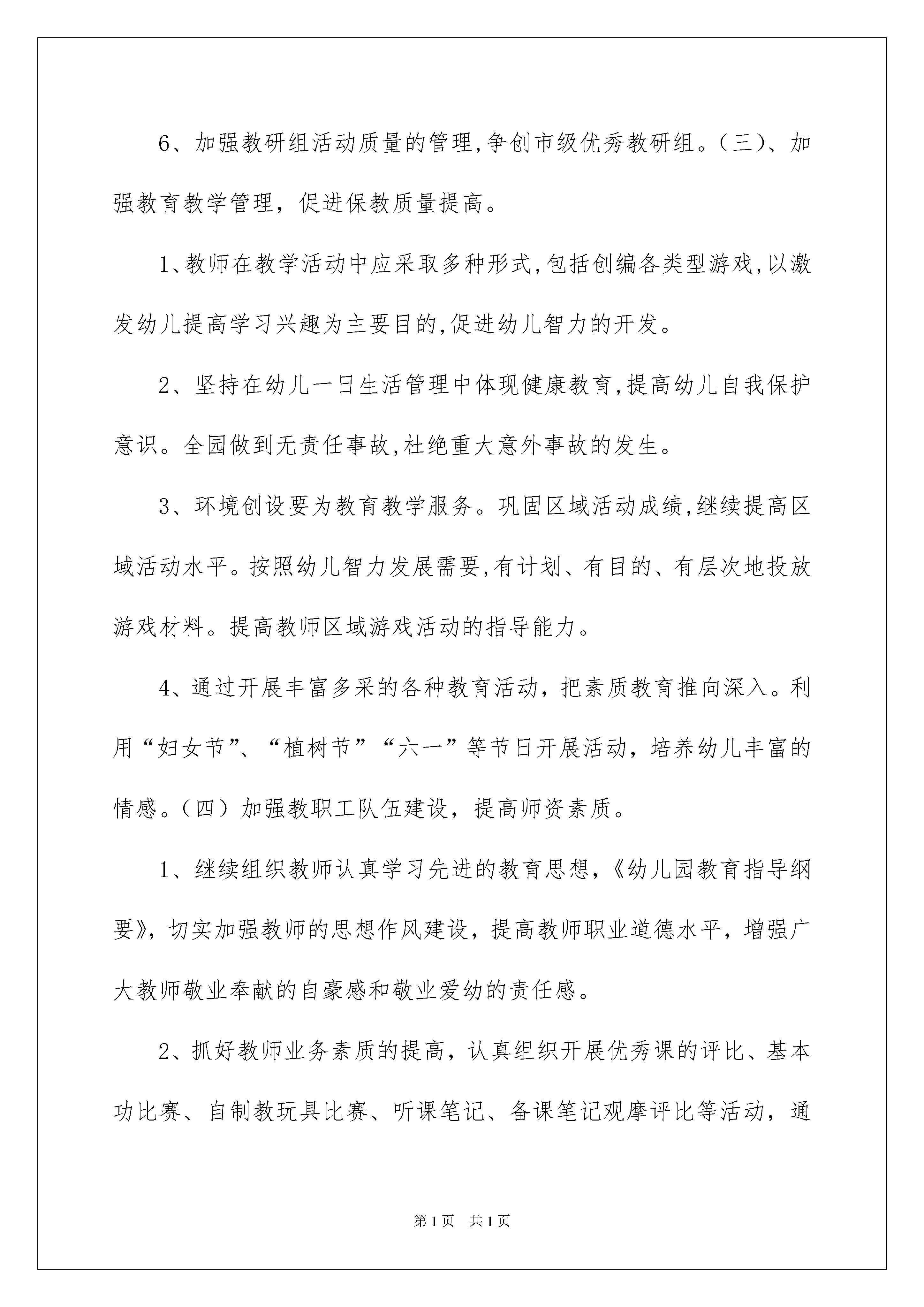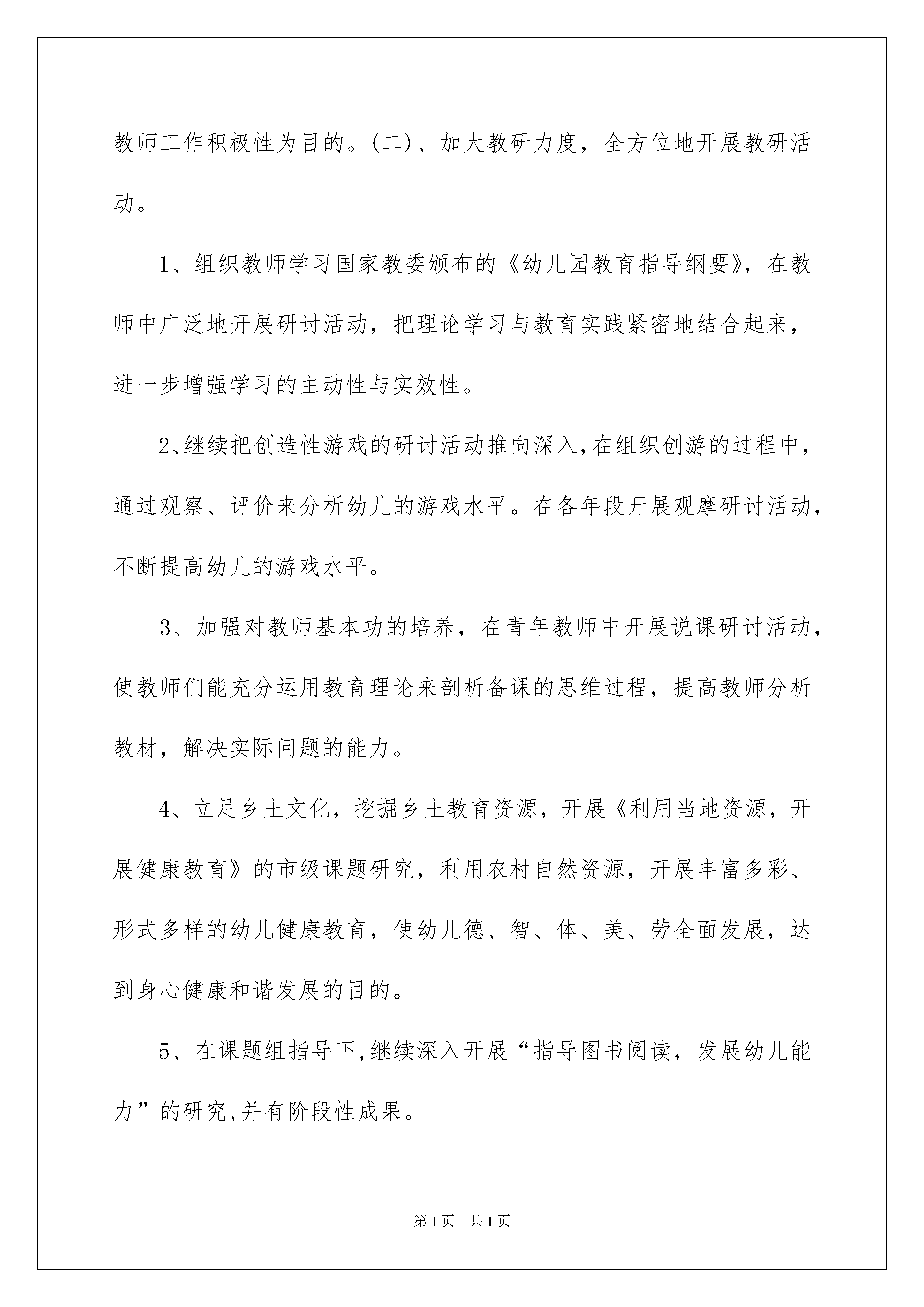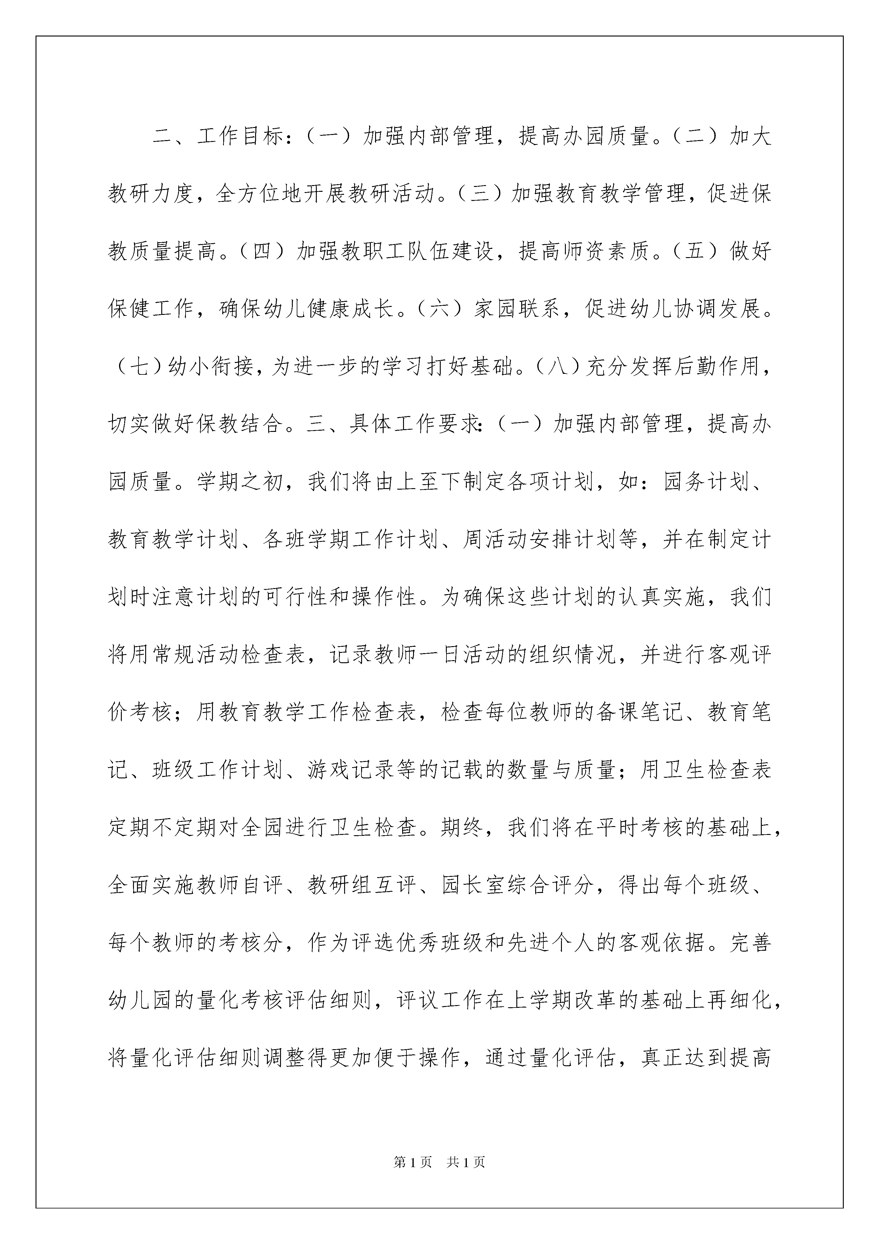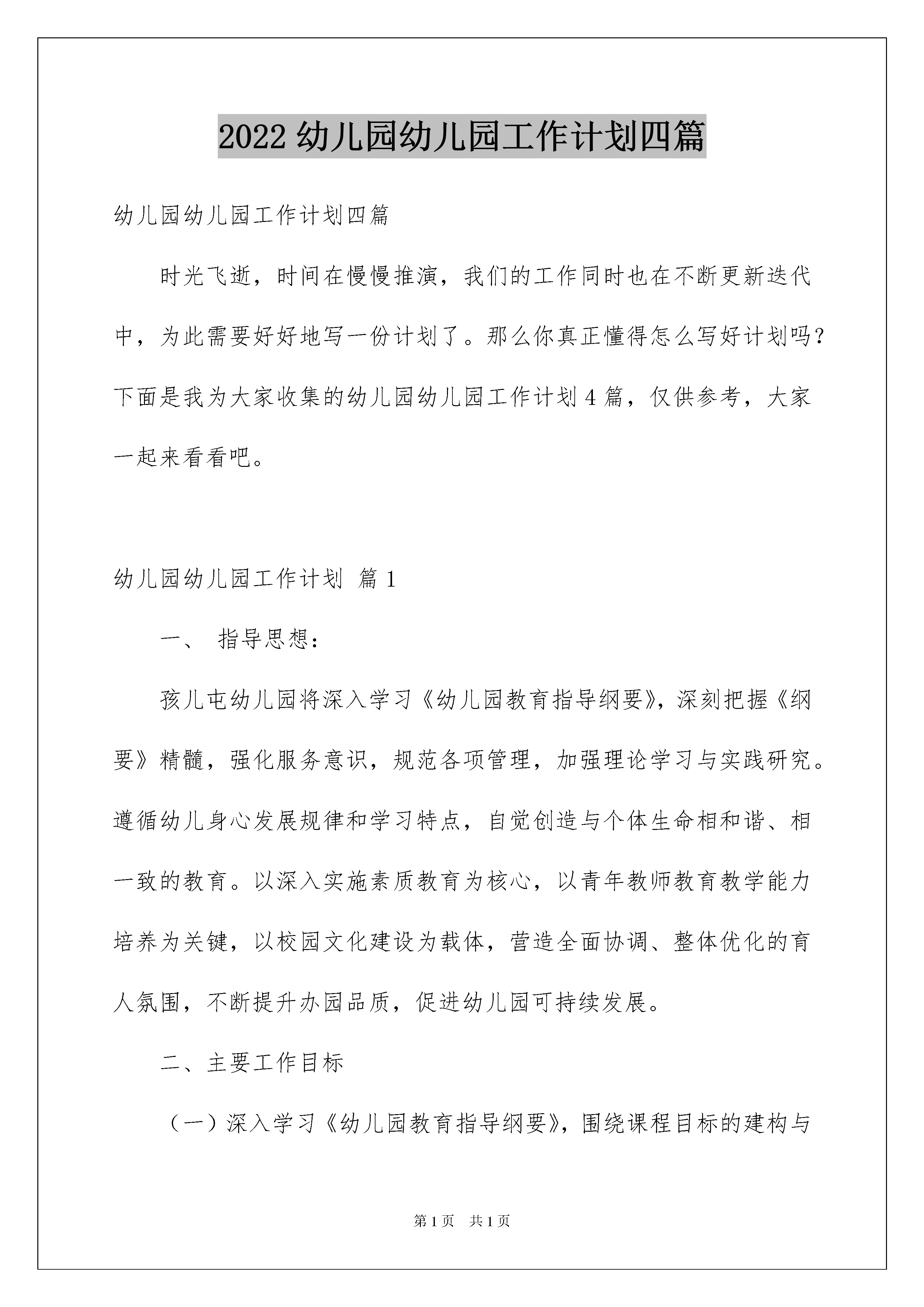 2022幼儿园幼儿园工作计划四篇幼儿园幼儿园工作计划四篇时光飞逝,时间在慢慢推演,我们的工作同时也在不断更新迭代中,为此需要好好地写一份计划了。那么你真正懂得怎么写好计划吗?下面是我为大家收集的幼儿园幼儿园工作计划4篇,仅供参考,大家一起来看看吧。幼儿园幼儿园工作计划篇1一、指导思想:孩儿屯幼儿园将深入学习《幼儿园教育指导纲要》,深刻把握《纲要》精髓,强化服务意识,规范各项管理,加强理论学习与实践研究。遵循幼儿身心发展规律和学习特点,自觉创造与个体生命相和谐、相一致的教育。以深入实施素质教育为核心,以青年教师教育教学能力培养为关键,以校园文化建设为载体,营造全面协调、整体优化的育人氛围,不断提升办园品质,促进幼儿园可持续发展。二、主要工作目标(一)深入学习《幼儿园教育指导纲要》,围绕课程目标的建构与落实,加强研讨,强化幼儿一日生活管理,提高幼儿来园活动质量。(二)加强师资队伍,引导全体教师敬业爱岗,勤奋工作,提高他们职业道德水平,树立我园教师的良好形象。通过幼儿园课题研究计划及各年龄段课程活动,提高教师教学研讨水平,进一步明确办园目标。(三)加强教师“专业”的培训、培养,促进青年教师内涵的发展,使教师的专业水平有明显地提高。尝试结合小学段开展园内绘本和素听故事小课题的研究。并就课题研究由史兰香老师尝试上一节研究课。(四)广泛听取家长建议,努力探索家教指导的途径与方法,不断提高家长工作的质量,办好家长学校,争创优秀家长学校。(五)积极争取参加市、区级各类竞赛。幼儿园幼儿园工作计划篇2一、指导思想:以《纲要》为指导方针,落实教育局和教研室工作精神,树立正确的教育观、儿童观,积极开展教学科研工作,以科研为先导,努力提高工作成效。加强教育队伍建设,提升教师整体素质。二、工作目标:(一)加强内部管理,提高办园质量。(二)加大教研力度,全方位地开展教研活动。(三)加强教育教学管理,促进保教质量提高。(四)加强教职工队伍建设,提高师资素质。(五)做好保健工作,确保幼儿健康成长。(六)家园联系,促进幼儿协调发展。(七)幼小衔接,为进一步的学习打好基础。(八)充分发挥后勤作用,切实做好保教结合。三、具体工作要求:(一)加强内部管理,提高办园质量。学期之初,我们将由上至下制定各项计划,如:园务计划、教育教学计划、各班学期工作计划、周活动安排计划等,并在制定计划时注意计划的可行性和操作性。为确保这些计划的认真实施,我们将用常规活动检查表,记录教师一日活动的组织情况,并进行客观评价考核;用教育教学工作检查表,检查每位教师的备课笔记、教育笔记、班级工作计划、游戏记录等的记载的数量与质量;用卫生检查表定期不定期对全园进行卫生检查。期终,我们将在平时考核的基础上,全面实施教师自评、教研组互评、园长室综合评分,得出每个班级、每个教师的考核分,作为评选优秀班级和先进个人的客观依据。完善幼儿园的量化考核评估细则,评议工作在上学期改革的基础上再细化,将量化评估细则调整得更加便于操作,通过量化评估,真正达到提高教师工作积极性为目的。(二)、加大教研力度,全方位地开展教研活动。1、组织教师学习国家教委颁布的《幼儿园教育指导纲要》,在教师中广泛地开展研讨活动,把理论学习与教育实践紧密地结合起来,进一步增强学习的主动性与实效性。2、继续把创造性游戏的研讨活动推向深入,在组织创游的过程中,通过观察、评价来分析幼儿的游戏水平。在各年段开展观摩研讨活动,不断提高幼儿的游戏水平。3、加强对教师基本功的培养,在青年教师中开展说课研讨活动,使教师们能充分运用教育理论来剖析备课的思维过程,提高教师分析教材,解决实际问题的能力。4、立足乡土文化,挖掘乡土教育资源,开展《利用当地资源,开展健康教育》的市级课题研究,利用农村自然资源,开展丰富多彩、形式多样的幼儿健康教育,使幼儿德、智、体、美、劳全面发展,达到身心健康和谐发展的目的。5、在课题组指导下,继续深入开展“指导图书阅读,发展幼儿能力”的研究,并有阶段性成果。6、加强教研组活动质量的管理,争创市级优秀教研组。(三)、加强教育教学管理,促进保教质量提高。1、教师在教学活动中应采取多种形式,包括创编各类型游戏,以激发幼儿提高学习兴趣为主要目的,促进幼儿智力的开发。2、坚持在幼儿一日生活管理中体现健康教育,提高幼儿自我保护意识。全园做到无责任事故,杜绝重大意外事故的发生。3、环境创设要为教育教学服务。巩固区域活动成绩,继续提高区域活动水平。按照幼儿智力发展需要,有计划、有目的、有层次地投放游戏材料。提高教师区域游戏活动的指导能力。4、通过开展丰富多采的各种教育活动,把素质教育推向深入。