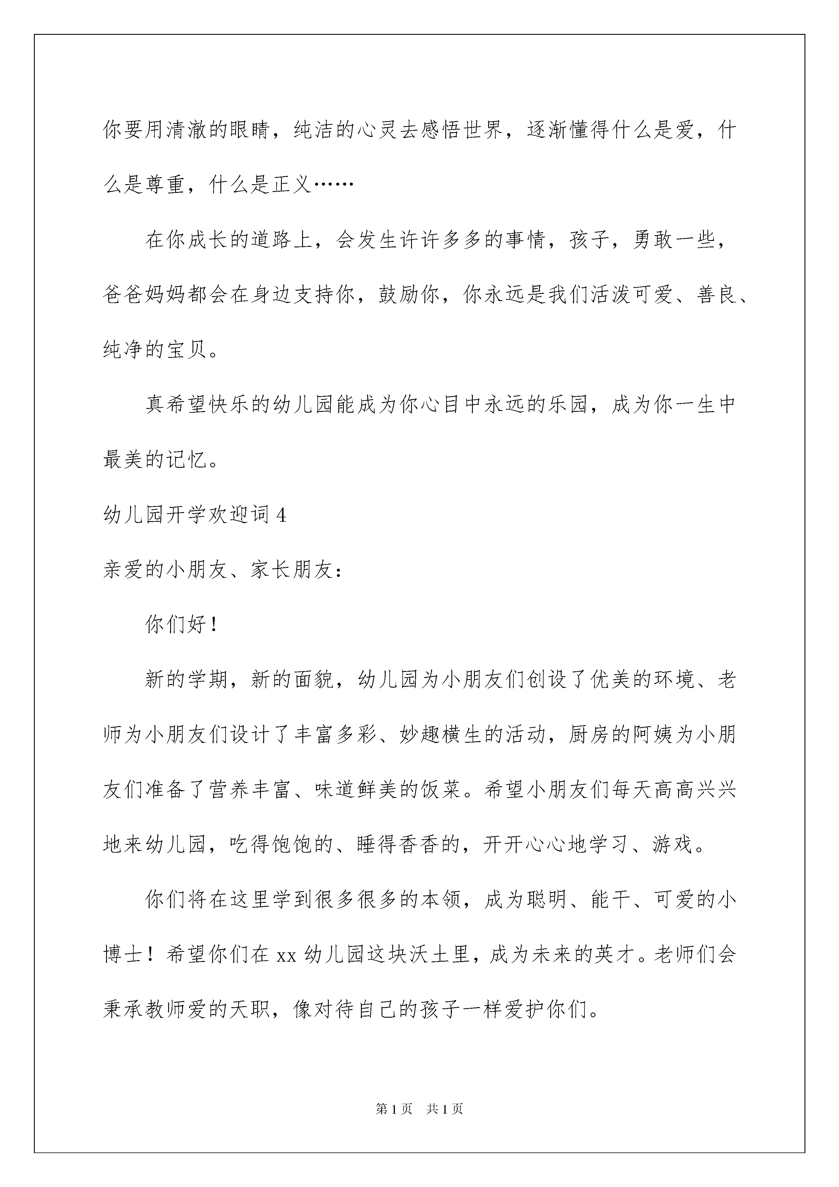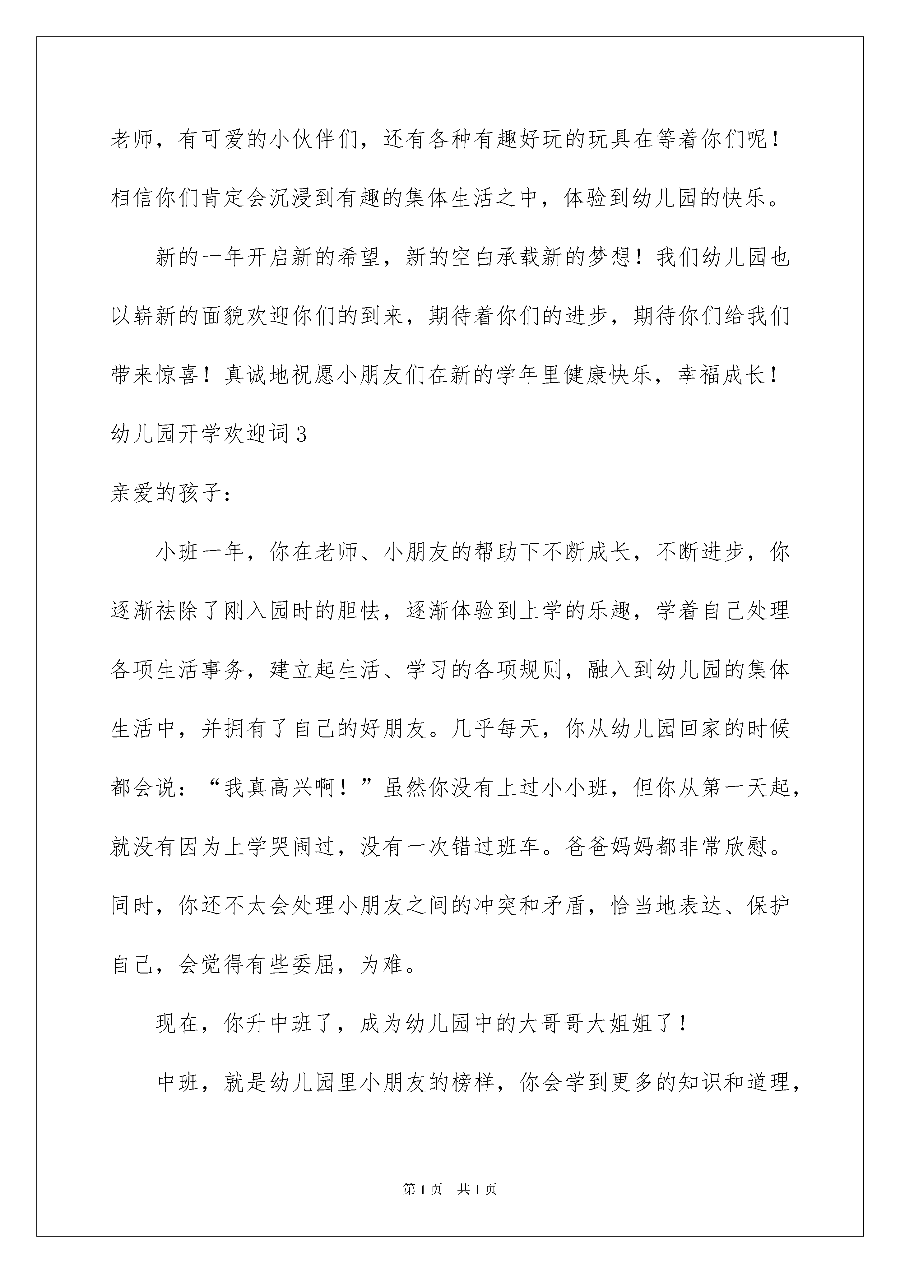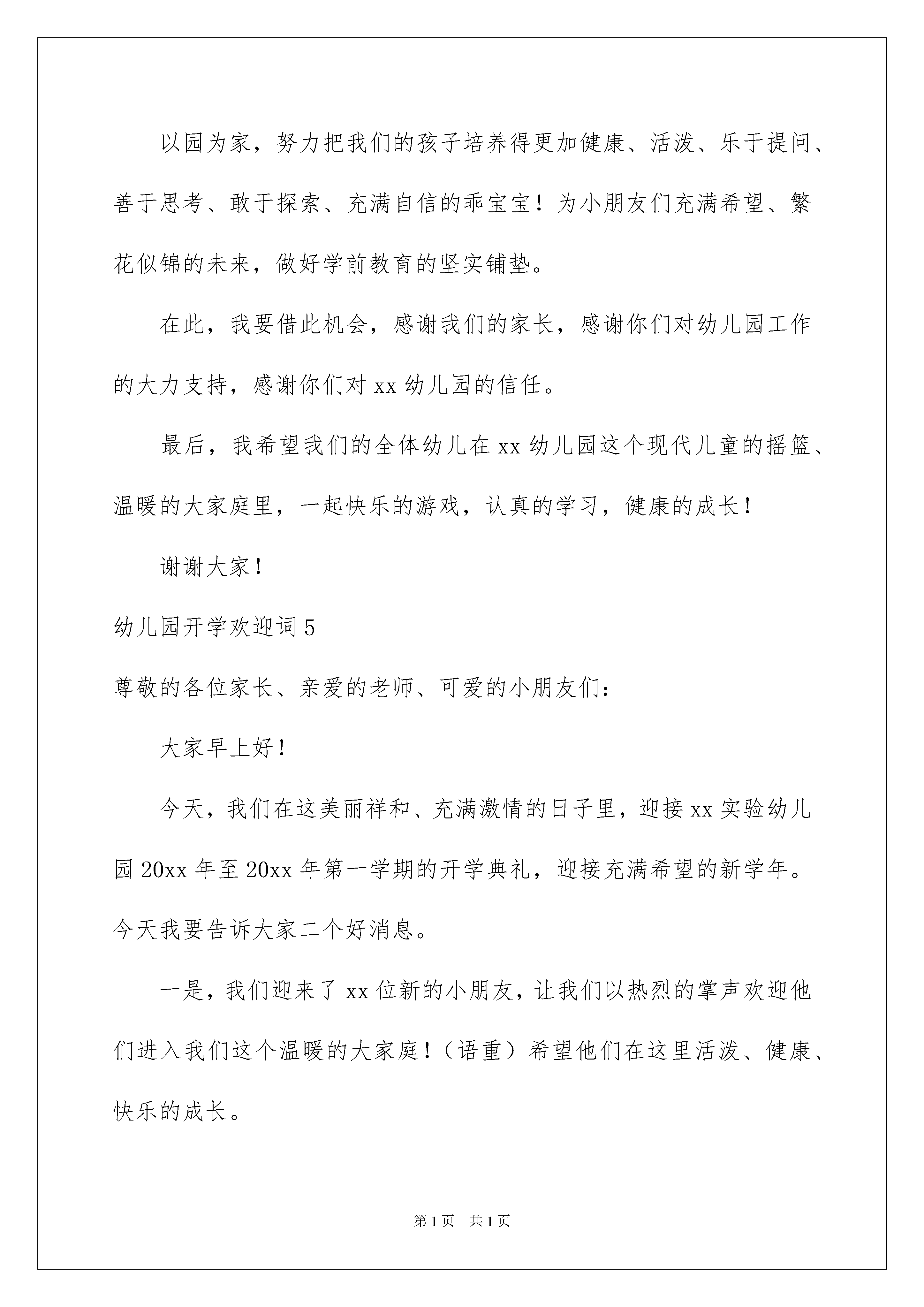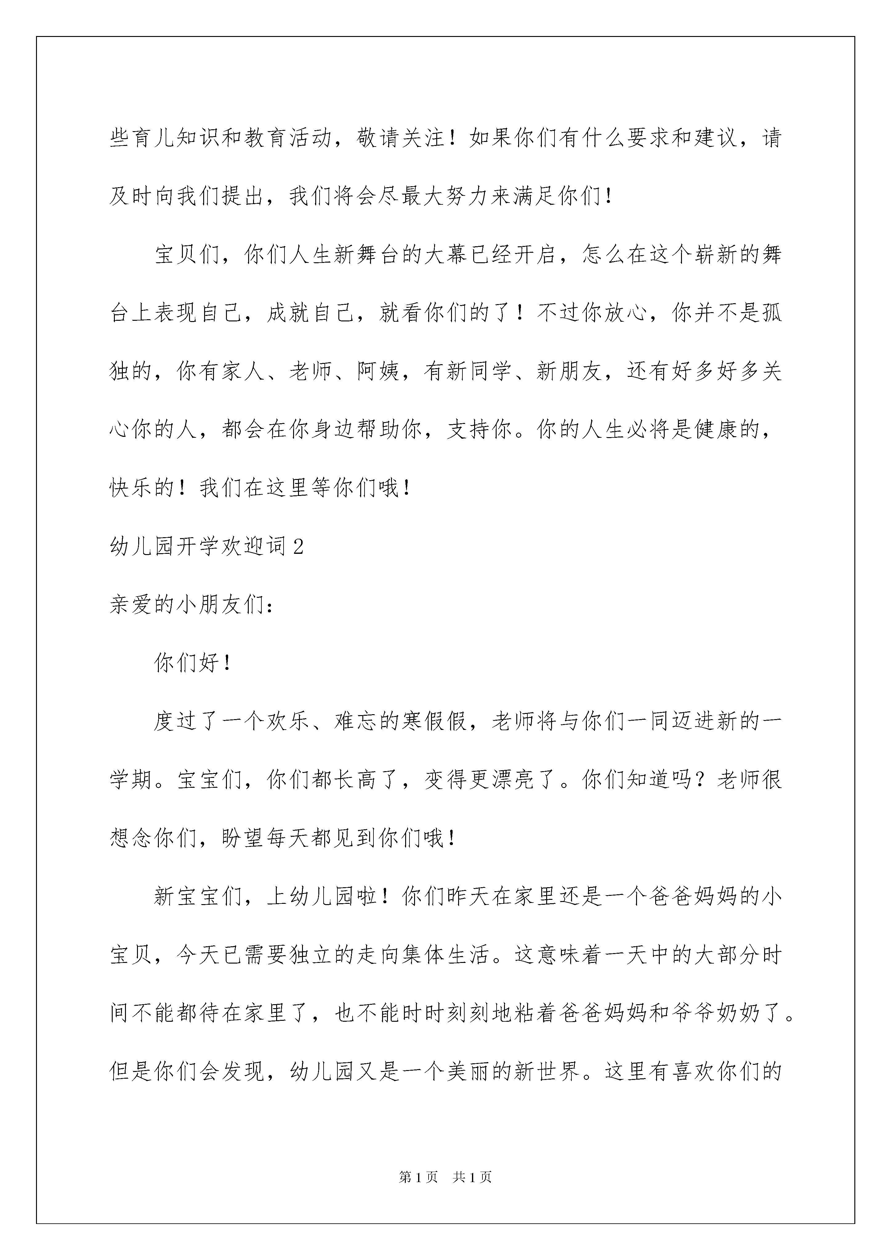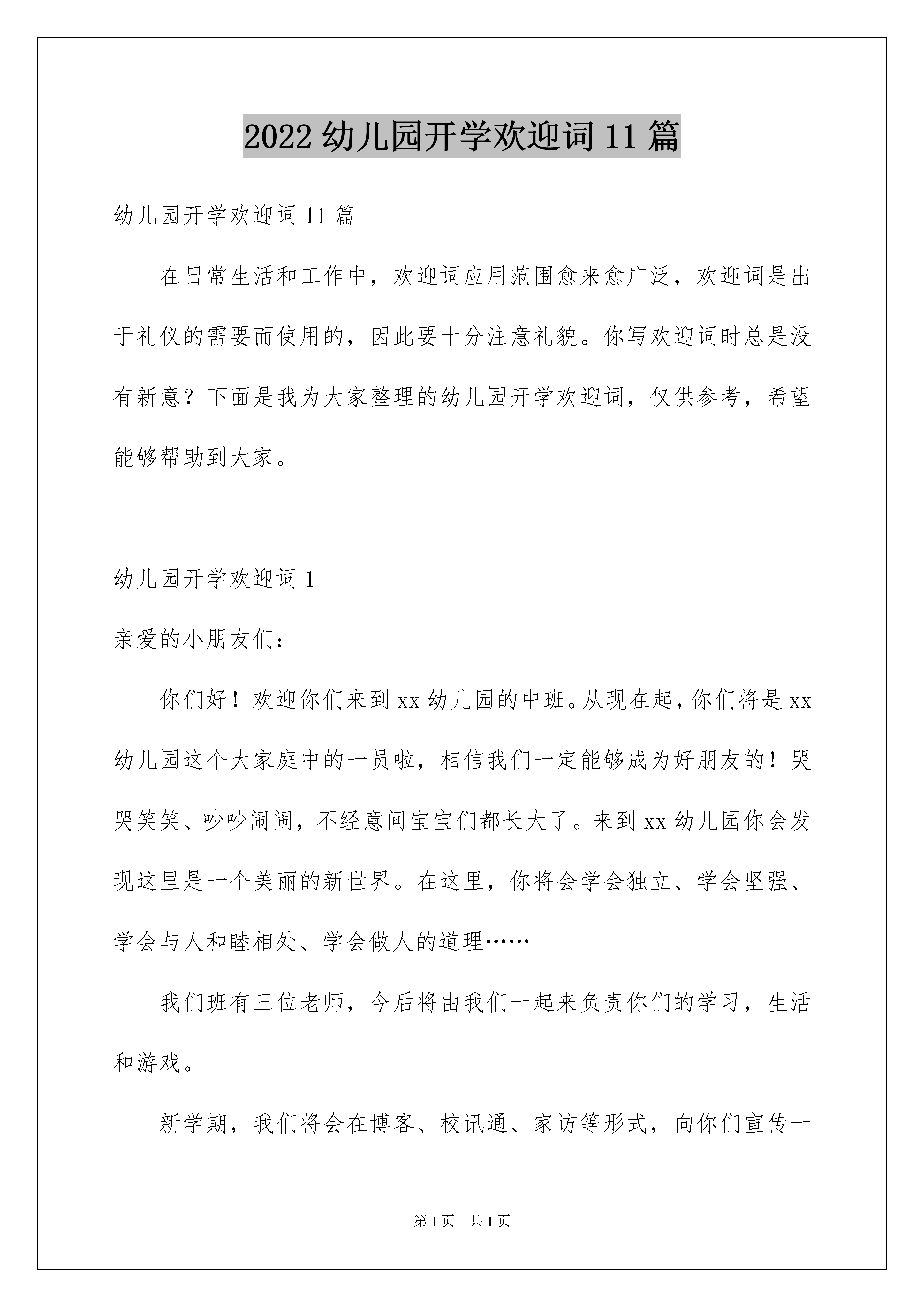 2022幼儿园开学欢迎词11篇幼儿园开学欢迎词11篇在日常生活和工作中,欢迎词应用范围愈来愈广泛,欢迎词是出于礼仪的需要而使用的,因此要十分注意礼貌。你写欢迎词时总是没有新意?下面是我为大家整理的幼儿园开学欢迎词,仅供参考,希望能够帮助到大家。幼儿园开学欢迎词1亲爱的小朋友们:你们好!欢迎你们来到xx幼儿园的中班。从现在起,你们将是xx幼儿园这个大家庭中的一员啦,相信我们一定能够成为好朋友的!哭哭笑笑、吵吵闹闹,不经意间宝宝们都长大了。来到xx幼儿园你会发现这里是一个美丽的新世界。在这里,你将会学会独立、学会坚强、学会与人和睦相处、学会做人的道理……我们班有三位老师,今后将由我们一起来负责你们的学习,生活和游戏。新学期,我们将会在博客、校讯通、家访等形式,向你们宣传一些育儿知识和教育活动,敬请关注!如果你们有什么要求和建议,请及时向我们提出,我们将会尽最大努力来满足你们!宝贝们,你们人生新舞台的大幕已经开启,怎么在这个崭新的舞台上表现自己,成就自己,就看你们的了!不过你放心,你并不是孤独的,你有家人、老师、阿姨,有新同学、新朋友,还有好多好多关心你的人,都会在你身边帮助你,支持你。你的人生必将是健康的,快乐的!我们在这里等你们哦!幼儿园开学欢迎词2亲爱的小朋友们:你们好!度过了一个欢乐、难忘的寒假假,老师将与你们一同迈进新的一学期。宝宝们,你们都长高了,变得更漂亮了。你们知道吗?老师很想念你们,盼望每天都见到你们哦!新宝宝们,上幼儿园啦!你们昨天在家里还是一个爸爸妈妈的小宝贝,今天已需要独立的走向集体生活。这意味着一天中的大部分时间不能都待在家里了,也不能时时刻刻地粘着爸爸妈妈和爷爷奶奶了。但是你们会发现,幼儿园又是一个美丽的新世界。这里有喜欢你们的老师,有可爱的小伙伴们,还有各种有趣好玩的玩具在等着你们呢!相信你们肯定会沉浸到有趣的集体生活之中,体验到幼儿园的快乐。新的一年开启新的希望,新的空白承载新的梦想!我们幼儿园也以崭新的面貌欢迎你们的到来,期待着你们的进步,期待你们给我们带来惊喜!真诚地祝愿小朋友们在新的学年里健康快乐,幸福成长!幼儿园开学欢迎词3亲爱的孩子:小班一年,你在老师、小朋友的帮助下不断成长,不断进步,你逐渐祛除了刚入园时的胆怯,逐渐体验到上学的乐趣,学着自己处理各项生活事务,建立起生活、学习的各项规则,融入到幼儿园的集体生活中,并拥有了自己的好朋友。几乎每天,你从幼儿园回家的时候都会说:“我真高兴啊!”虽然你没有上过小小班,但你从第一天起,就没有因为上学哭闹过,没有一次错过班车。爸爸妈妈都非常欣慰。同时,你还不太会处理小朋友之间的冲突和矛盾,恰当地表达、保护自己,会觉得有些委屈,为难。现在,你升中班了,成为幼儿园中的大哥哥大姐姐了!中班,就是幼儿园里小朋友的榜样,你会学到更多的知识和道理,你要用清澈的眼睛,纯洁的心灵去感悟世界,逐渐懂得什么是爱,什么是尊重,什么是正义……在你成长的道路上,会发生许许多多的事情,孩子,勇敢一些,爸爸妈妈都会在身边支持你,鼓励你,你永远是我们活泼可爱、善良、纯净的宝贝。真希望快乐的幼儿园能成为你心目中永远的乐园,成为你一生中最美的记忆。幼儿园开学欢迎词4亲爱的小朋友、家长朋友:你们好!新的学期,新的面貌,幼儿园为小朋友们创设了优美的环境、老师为小朋友们设计了丰富多彩、妙趣横生的活动,厨房的阿姨为小朋友们准备了营养丰富、味道鲜美的饭菜。希望小朋友们每天高高兴兴地来幼儿园,吃得饱饱的、睡得香香的,开开心心地学习、游戏。你们将在这里学到很多很多的本领,成为聪明、能干、可爱的小博士!希望你们在xx幼儿园这块沃土里,成为未来的英才。老师们会秉承教师爱的天职,像对待自己的孩子一样爱护你们。以园为家,努力把我们的孩子培养得更加健康、活泼、乐于提问、善于思考、敢于探索、充满自信的乖宝宝!为小朋友们充满希望、繁花似锦的未来,做好学前教育的坚实铺垫。在此,我要借此机会,感谢我们的家长,感谢你们对幼儿园工作的大力支持,感谢你们对xx幼儿园的信任。最后,我希望我们的全体幼儿在xx幼儿园这个现代儿童的摇篮、温暖的大家庭里,一起快乐的游戏,认真的学习,健康的成长!谢谢大家!幼儿园开学欢迎词5尊敬的各位家长、亲爱的老师、可爱的小朋友们:大家早上好!今天,我们在这美丽祥和、充满激情的日子里,迎接xx实验幼儿园20xx年至20xx年第一学期的开学典礼,迎接充满希望的新学年。今天我要告诉大家二个好消息。一是,我们迎来了xx位新的小朋友,让我们以热烈的掌声欢迎他们进入我们这个温暖的大家庭!(语重)希望他们在这里活泼、健康、快乐的成长。二是,原来在幼儿园上学的