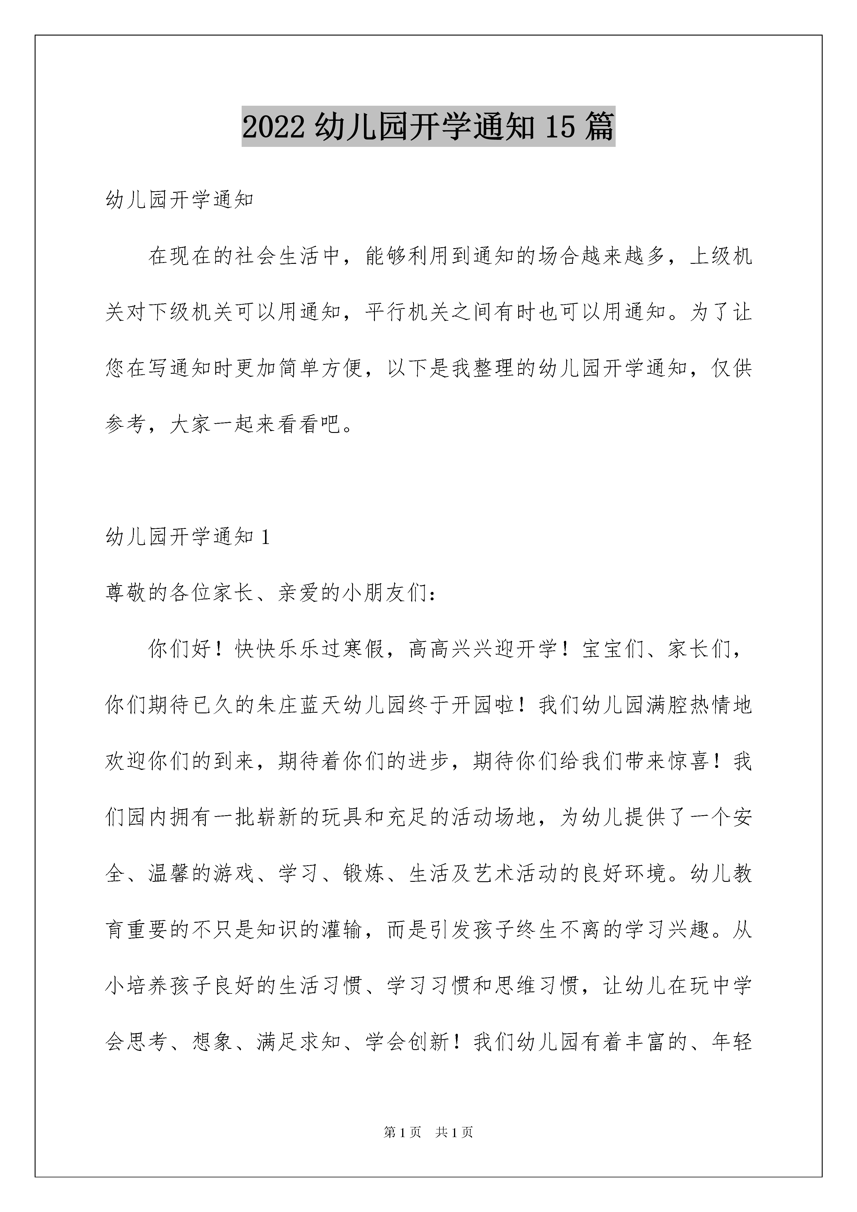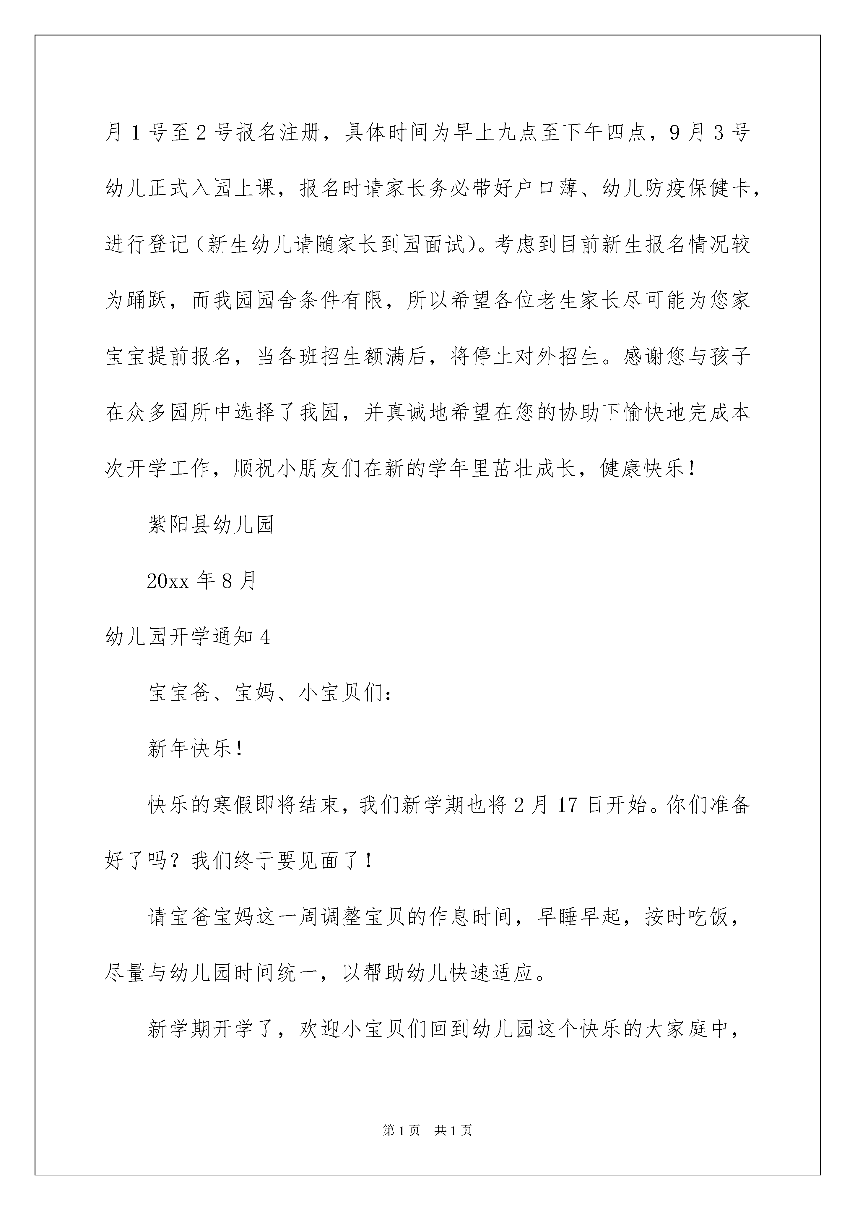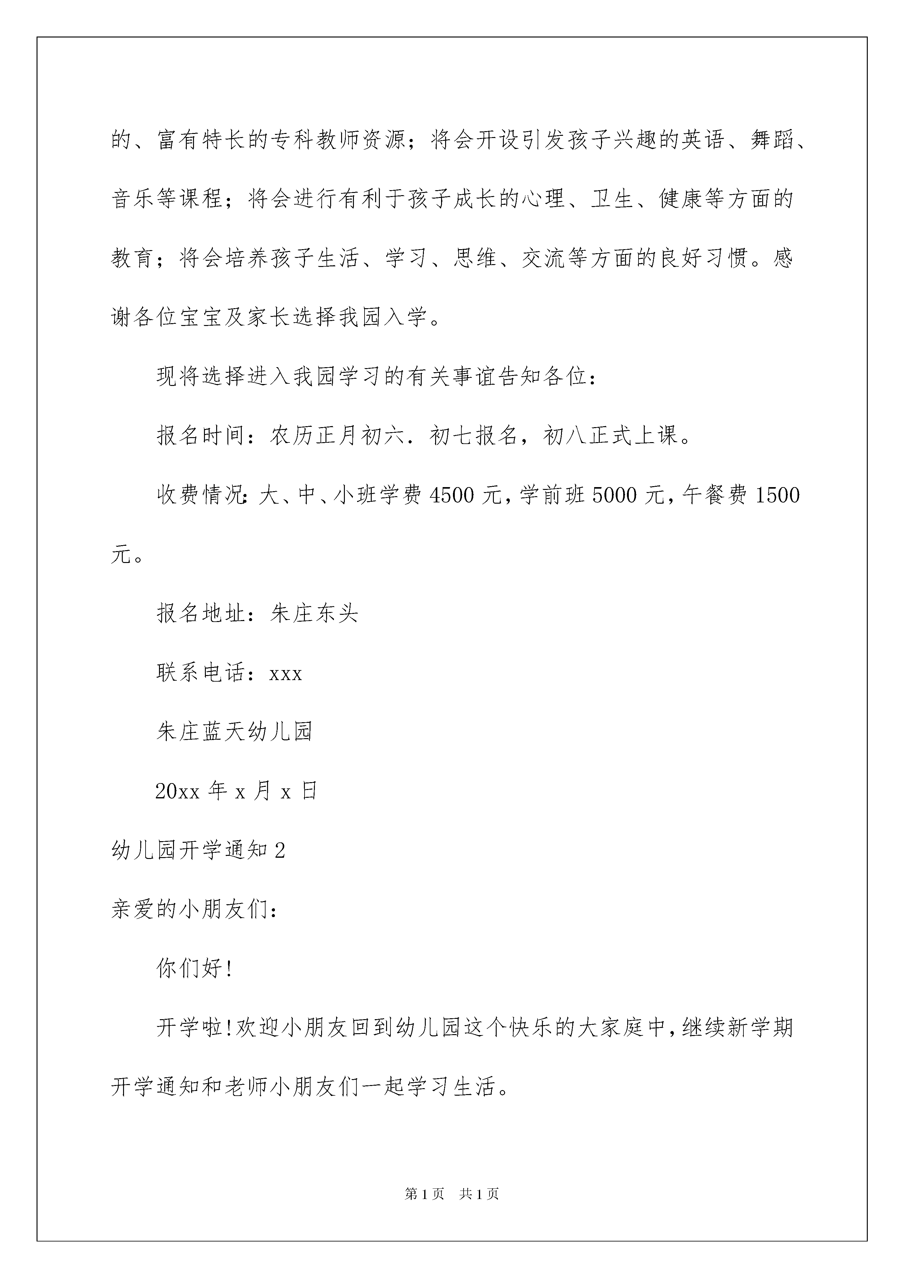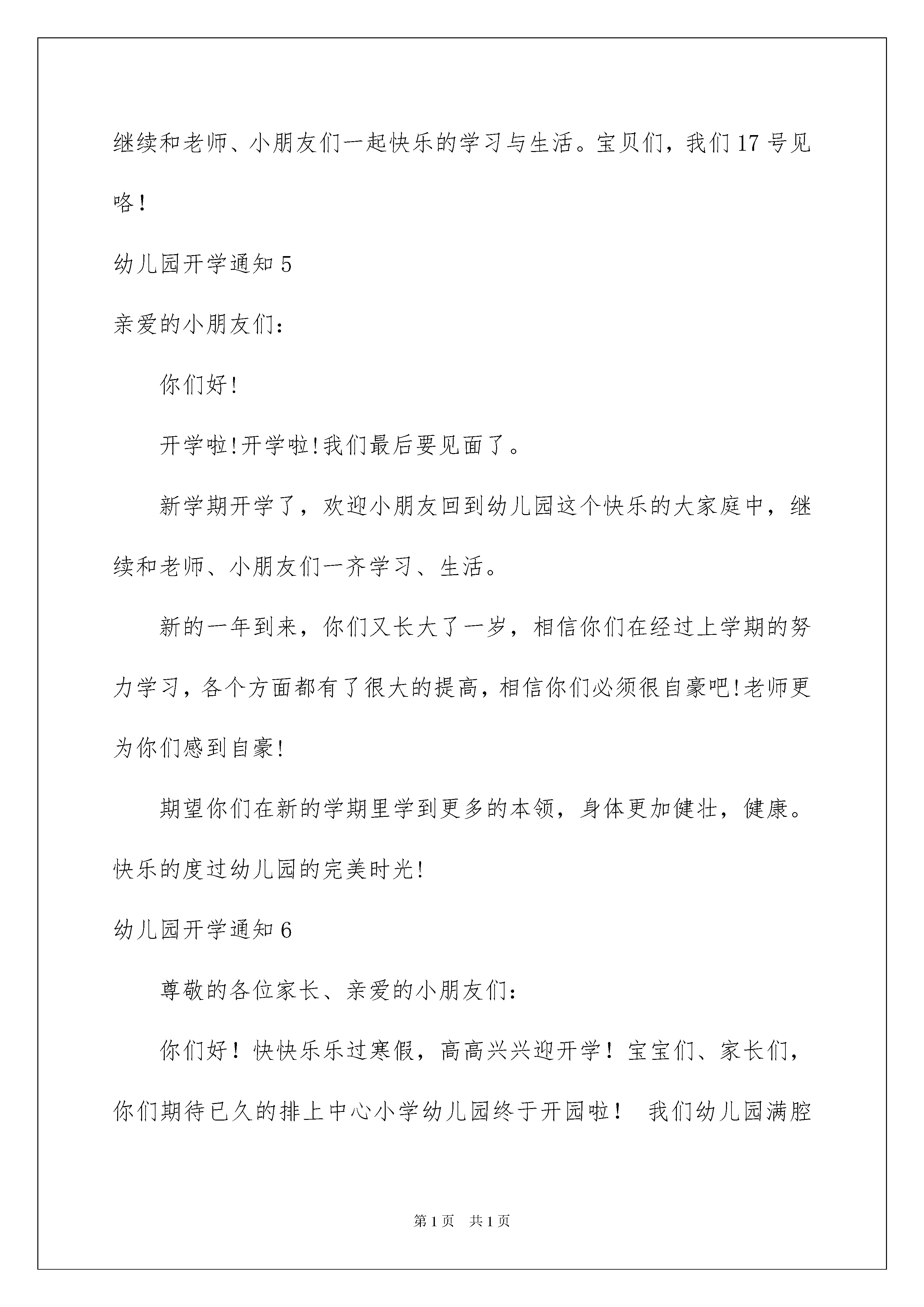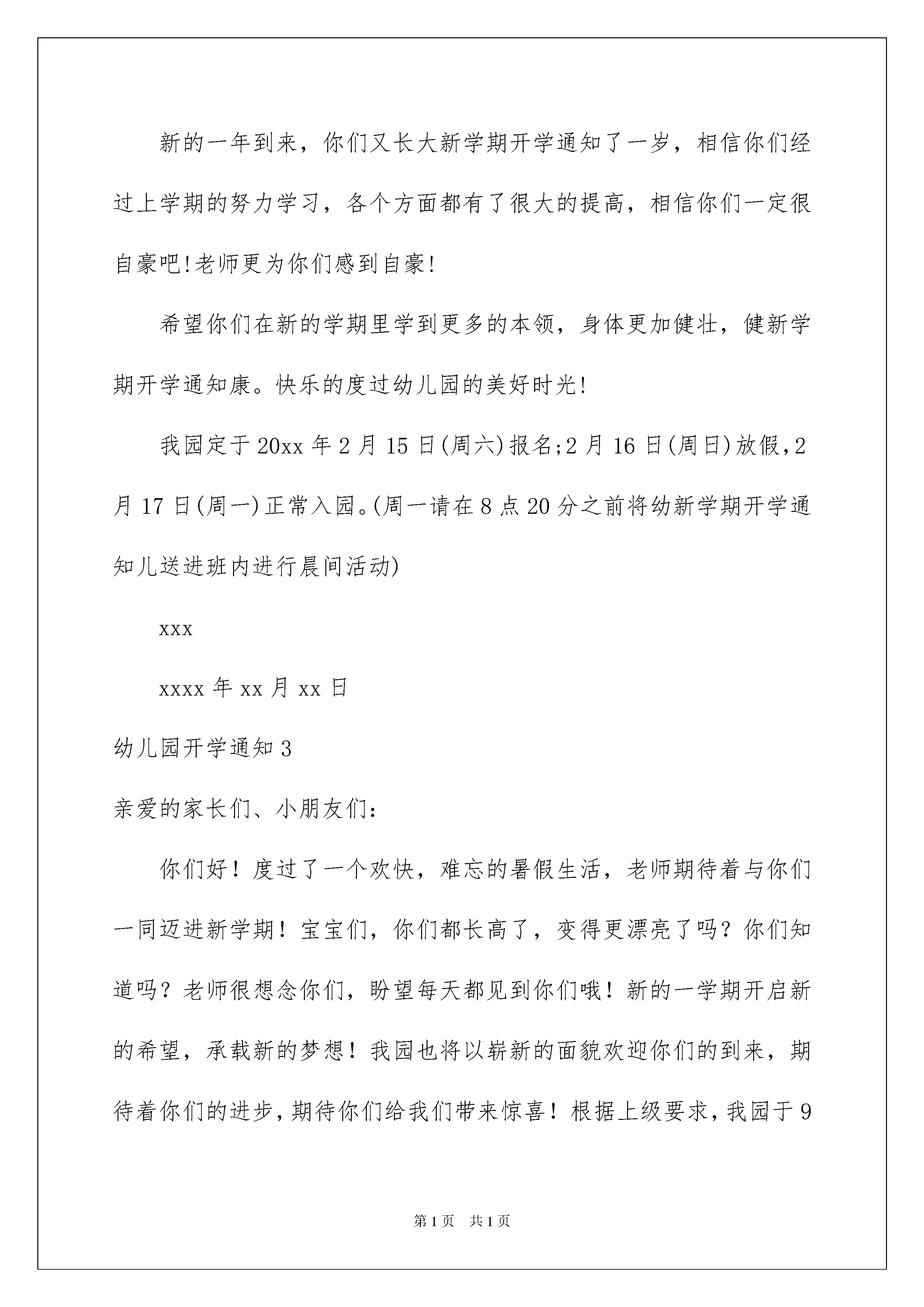 2022幼儿园开学通知15篇幼儿园开学通知在现在的社会生活中,能够利用到通知的场合越来越多,上级机关对下级机关可以用通知,平行机关之间有时也可以用通知。为了让您在写通知时更加简单方便,以下是我整理的幼儿园开学通知,仅供参考,大家一起来看看吧。幼儿园开学通知1尊敬的各位家长、亲爱的小朋友们:你们好!快快乐乐过寒假,高高兴兴迎开学!宝宝们、家长们,你们期待已久的朱庄蓝天幼儿园终于开园啦!我们幼儿园满腔热情地欢迎你们的到来,期待着你们的进步,期待你们给我们带来惊喜!我们园内拥有一批崭新的玩具和充足的活动场地,为幼儿提供了一个安全、温馨的游戏、学习、锻炼、生活及艺术活动的良好环境。幼儿教育重要的不只是知识的灌输,而是引发孩子终生不离的学习兴趣。从小培养孩子良好的生活习惯、学习习惯和思维习惯,让幼儿在玩中学会思考、想象、满足求知、学会创新!我们幼儿园有着丰富的、年轻的、富有特长的专科教师资源;将会开设引发孩子兴趣的英语、舞蹈、音乐等课程;将会进行有利于孩子成长的心理、卫生、健康等方面的教育;将会培养孩子生活、学习、思维、交流等方面的良好习惯。感谢各位宝宝及家长选择我园入学。现将选择进入我园学习的有关事谊告知各位:报名时间:农历正月初六.初七报名,初八正式上课。收费情况:大、中、小班学费4500元,学前班5000元,午餐费1500元。报名地址:朱庄东头联系电话:xxx朱庄蓝天幼儿园20xx年x月x日幼儿园开学通知2亲爱的小朋友们:你们好!开学啦!欢迎小朋友回到幼儿园这个快乐的大家庭中,继续新学期开学通知和老师小朋友们一起学习生活。新的一年到来,你们又长大新学期开学通知了一岁,相信你们经过上学期的努力学习,各个方面都有了很大的提高,相信你们一定很自豪吧!老师更为你们感到自豪!希望你们在新的学期里学到更多的本领,身体更加健壮,健新学期开学通知康。快乐的度过幼儿园的美好时光!我园定于20xx年2月15日(周六)报名;2月16日(周日)放假,2月17日(周一)正常入园。(周一请在8点20分之前将幼新学期开学通知儿送进班内进行晨间活动)xxxxxxx年xx月xx日幼儿园开学通知3亲爱的家长们、小朋友们:你们好!度过了一个欢快,难忘的暑假生活,老师期待着与你们一同迈进新学期!宝宝们,你们都长高了,变得更漂亮了吗?你们知道吗?老师很想念你们,盼望每天都见到你们哦!新的一学期开启新的希望,承载新的梦想!我园也将以崭新的面貌欢迎你们的到来,期待着你们的进步,期待你们给我们带来惊喜!根据上级要求,我园于9月1号至2号报名注册,具体时间为早上九点至下午四点,9月3号幼儿正式入园上课,报名时请家长务必带好户口薄、幼儿防疫保健卡,进行登记(新生幼儿请随家长到园面试)。考虑到目前新生报名情况较为踊跃,而我园园舍条件有限,所以希望各位老生家长尽可能为您家宝宝提前报名,当各班招生额满后,将停止对外招生。感谢您与孩子在众多园所中选择了我园,并真诚地希望在您的协助下愉快地完成本次开学工作,顺祝小朋友们在新的学年里茁壮成长,健康快乐!紫阳县幼儿园20xx年8月幼儿园开学通知4宝宝爸、宝妈、小宝贝们:新年快乐!快乐的寒假即将结束,我们新学期也将2月17日开始。你们准备好了吗?我们终于要见面了!请宝爸宝妈这一周调整宝贝的作息时间,早睡早起,按时吃饭,尽量与幼儿园时间统一,以帮助幼儿快速适应。新学期开学了,欢迎小宝贝们回到幼儿园这个快乐的大家庭中,继续和老师、小朋友们一起快乐的学习与生活。宝贝们,我们17号见咯!幼儿园开学通知5亲爱的小朋友们:你们好!开学啦!开学啦!我们最后要见面了。新学期开学了,欢迎小朋友回到幼儿园这个快乐的大家庭中,继续和老师、小朋友们一齐学习、生活。新的一年到来,你们又长大了一岁,相信你们在经过上学期的努力学习,各个方面都有了很大的提高,相信你们必须很自豪吧!老师更为你们感到自豪!期望你们在新的学期里学到更多的本领,身体更加健壮,健康。快乐的度过幼儿园的完美时光!幼儿园开学通知6尊敬的各位家长、亲爱的小朋友们:你们好!快快乐乐过寒假,高高兴兴迎开学!宝宝们、家长们,你们期待已久的排上中心小学幼儿园终于开园啦!我们幼儿园满腔热情地欢迎你们的到来,期待着你们的进步,期待你们给我们带来惊喜!我们园内拥有一批崭新的玩具和充足的活动场地,为幼儿提供了一个安全、温馨的游戏、学习、锻炼、生活及艺术活动的良好环境。幼儿教育重要的不只是知识的灌输,而是引发孩子终生不离的学习兴趣。从小培养孩子良好的生活习惯、学习习惯和思维习惯,让幼儿在玩中学会思考、想象、满足求知、学会创新!我们幼儿园有着丰富的、年轻的、富有特长的专科教师